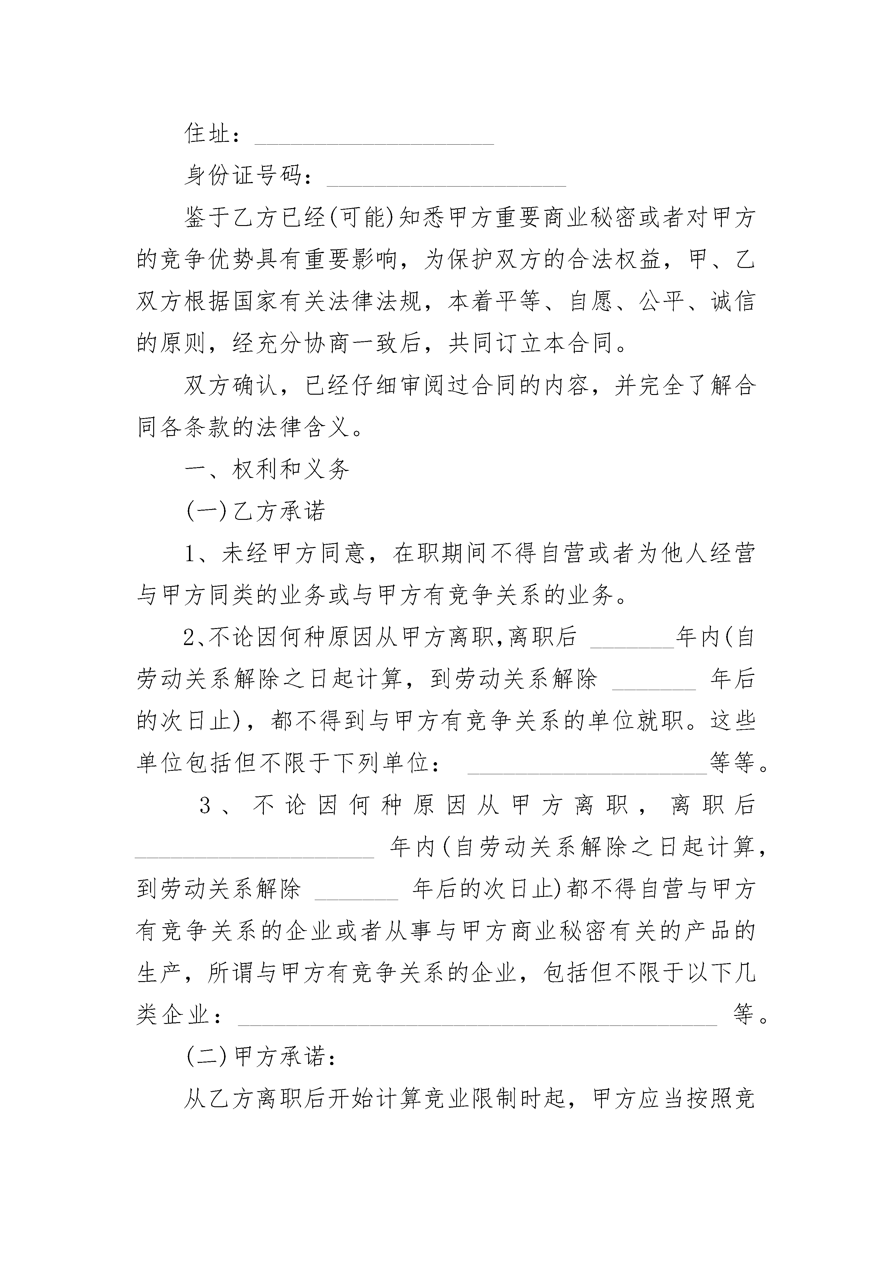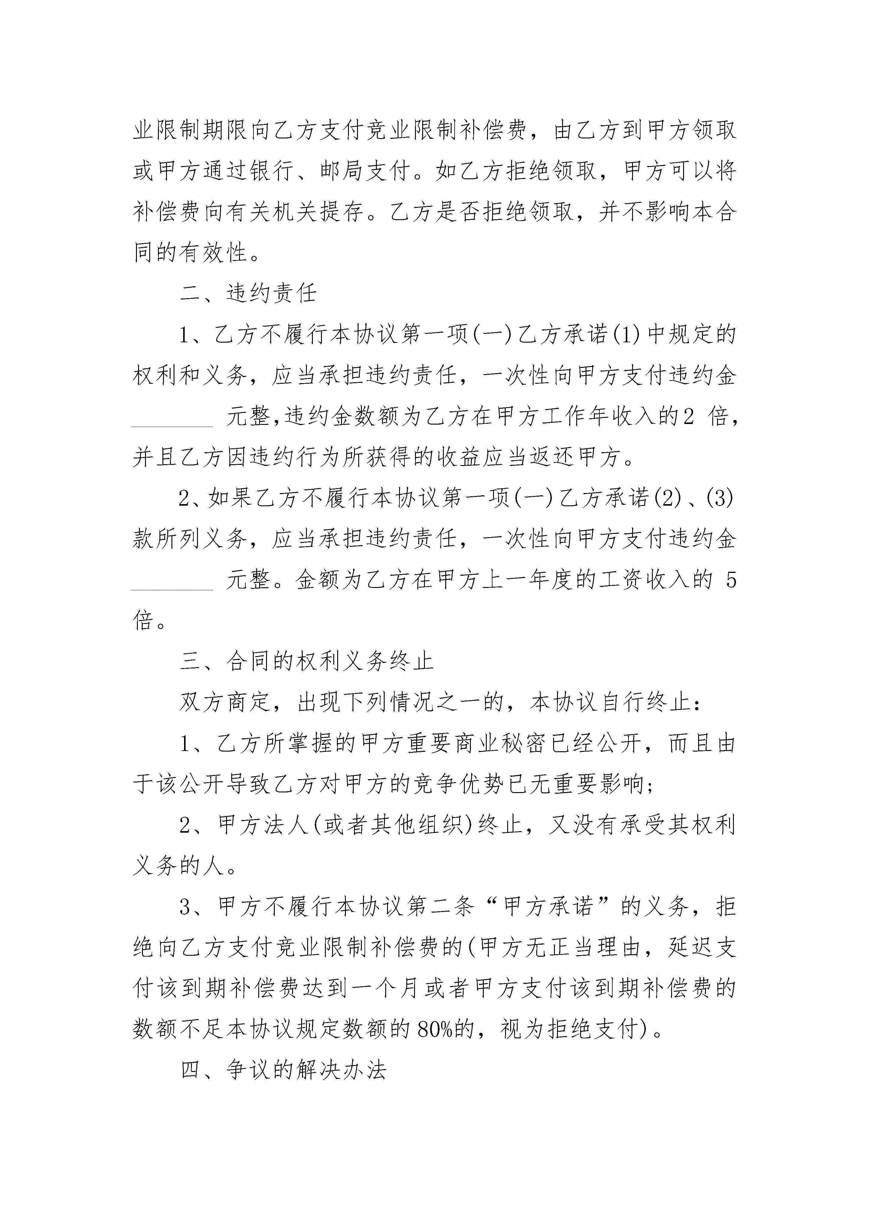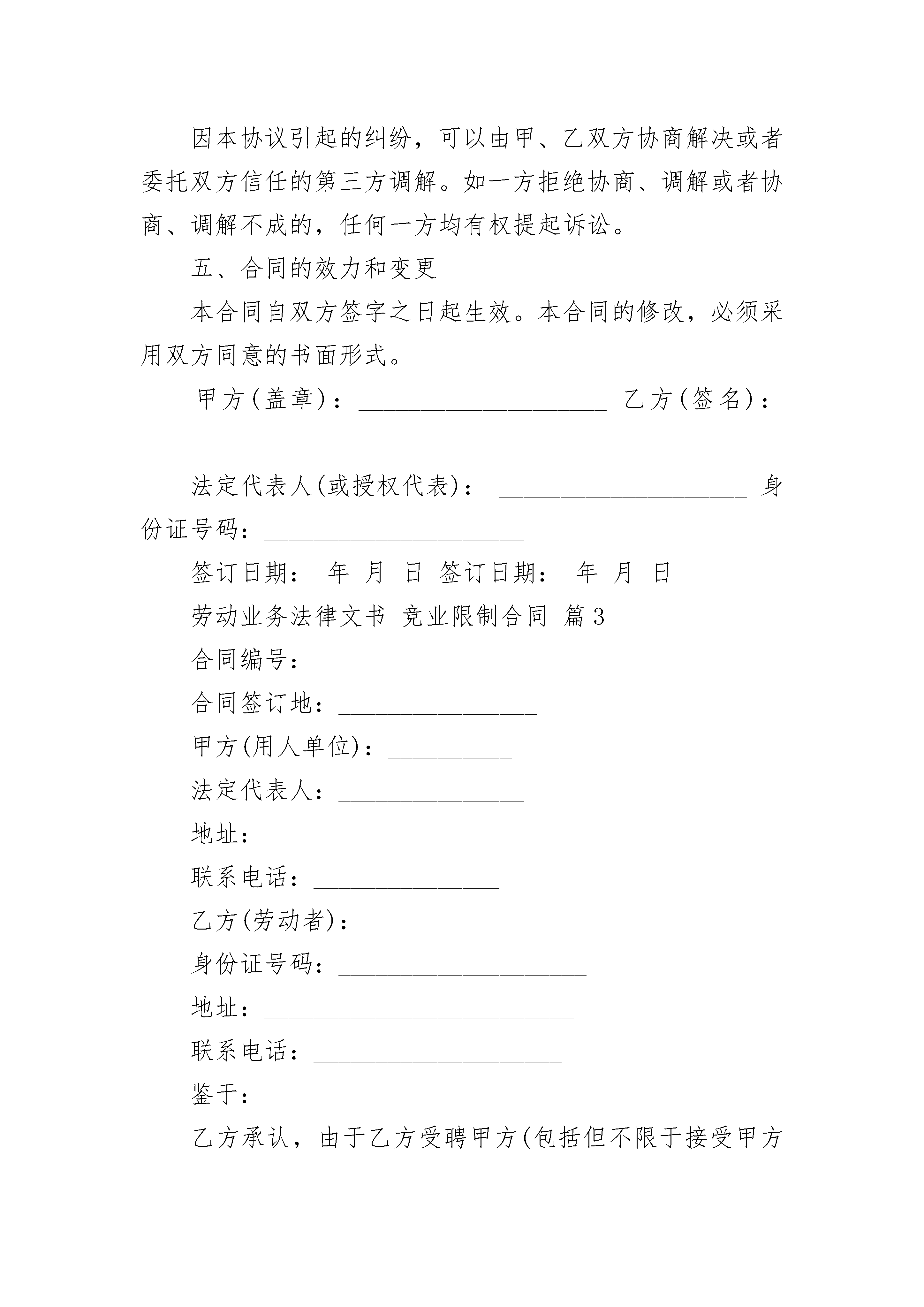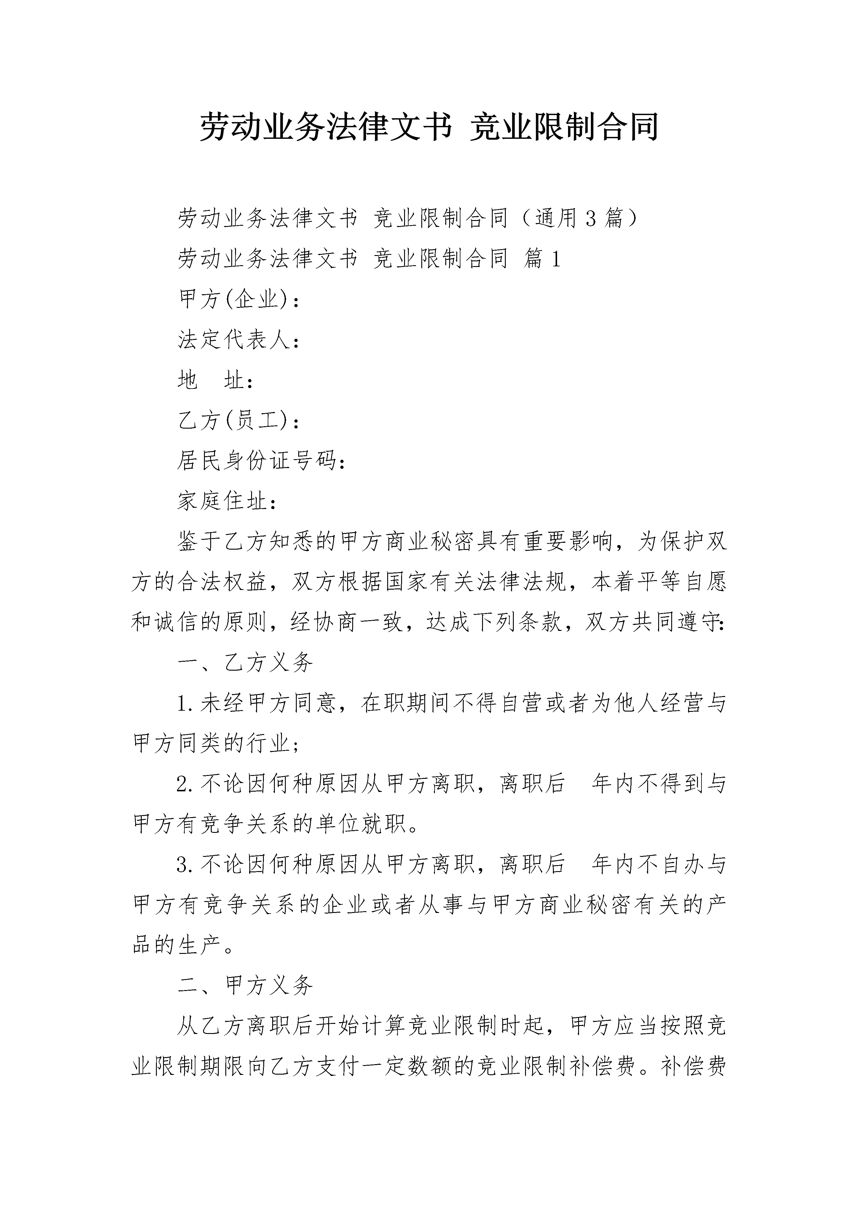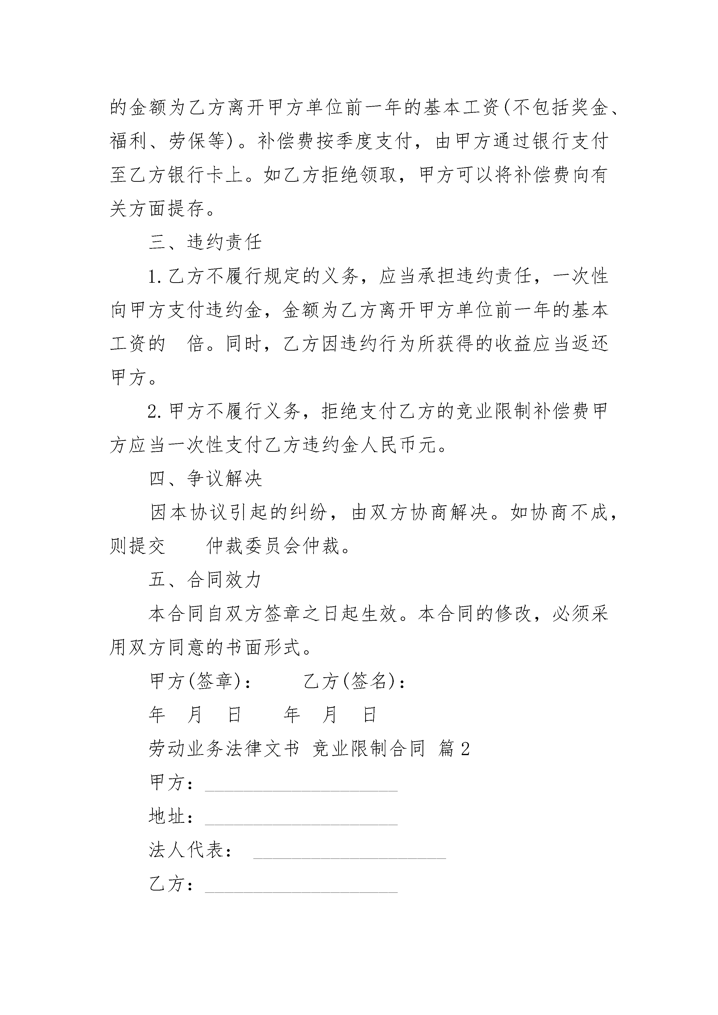 劳动业务法律文书竞业限制合同劳动业务法律文书竞业限制合同(通用3篇)劳动业务法律文书竞业限制合同篇1甲方(企业):法定代表人:地址:乙方(员工):居民身份证号码:家庭住址:鉴于乙方知悉的甲方商业秘密具有重要影响,为保护双方的合法权益,双方根据国家有关法律法规,本着平等自愿和诚信的原则,经协商一致,达成下列条款,双方共同遵守:一、乙方义务1.未经甲方同意,在职期间不得自营或者为他人经营与甲方同类的行业;2.不论因何种原因从甲方离职,离职后年内不得到与甲方有竞争关系的单位就职。3.不论因何种原因从甲方离职,离职后年内不自办与甲方有竞争关系的企业或者从事与甲方商业秘密有关的产品的生产。二、甲方义务从乙方离职后开始计算竞业限制时起,甲方应当按照竞业限制期限向乙方支付一定数额的竞业限制补偿费。补偿费的金额为乙方离开甲方单位前一年的基本工资(不包括奖金、福利、劳保等)。补偿费按季度支付,由甲方通过银行支付至乙方银行卡上。如乙方拒绝领取,甲方可以将补偿费向有关方面提存。三、违约责任1.乙方不履行规定的义务,应当承担违约责任,一次性向甲方支付违约金,金额为乙方离开甲方单位前一年的基本工资的倍。同时,乙方因违约行为所获得的收益应当返还甲方。2.甲方不履行义务,拒绝支付乙方的竞业限制补偿费甲方应当一次性支付乙方违约金人民币元。四、争议解决因本协议引起的纠纷,由双方协商解决。如协商不成,则提交仲裁委员会仲裁。五、合同效力本合同自双方签章之日起生效。本合同的修改,必须采用双方同意的书面形式。甲方(签章):乙方(签名):年月日年月日劳动业务法律文书竞业限制合同篇2甲方:____________________地址:____________________法人代表:____________________乙方:____________________住址:____________________身份证号码:____________________鉴于乙方已经(可能)知悉甲方重要商业秘密或者对甲方的竞争优势具有重要影响,为保护双方的合法权益,甲、乙双方根据国家有关法律法规,本着平等、自愿、公平、诚信的原则,经充分协商一致后,共同订立本合同。双方确认,已经仔细审阅过合同的内容,并完全了解合同各条款的法律含义。一、权利和义务(一)乙方承诺1、未经甲方同意,在职期间不得自营或者为他人经营与甲方同类的业务或与甲方有竞争关系的业务。2、不论因何种原因从甲方离职,离职后_______年内(自劳动关系解除之日起计算,到劳动关系解除_______年后的次日止),都不得到与甲方有竞争关系的单位就职。这些单位包括但不限于下列单位:____________________等等。3、不论因何种原因从甲方离职,离职后____________________年内(自劳动关系解除之日起计算,到劳动关系解除_______年后的次日止)都不得自营与甲方有竞争关系的企业或者从事与甲方商业秘密有关的产品的生产,所谓与甲方有竞争关系的企业,包括但不限于以下几类企业:________________________________________等。(二)甲方承诺:从乙方离职后开始计算竞业限制时起,甲方应当按照竞业限制期限向乙方支付竞业限制补偿费,由乙方到甲方领取或甲方通过银行、邮局支付。如乙方拒绝领取,甲方可以将补偿费向有关机关提存。乙方是否拒绝领取,并不影响本合同的有效性。二、违约责任1、乙方不履行本协议第一项(一)乙方承诺(1)中规定的权利和义务,应当承担违约责任,一次性向甲方支付违约金_______元整,违约金数额为乙方在甲方工作年收入的2倍,并且乙方因违约行为所获得的收益应当返还甲方。2、如果乙方不履行本协议第一项(一)乙方承诺(2)、(3)款所列义务,应当承担违约责任,一次性向甲方支付违约金_______元整。金额为乙方在甲方上一年度的工资收入的5倍。三、合同的权利义务终止双方商定,出现下列情况之一的,本协议自行终止:1、乙方所掌握的甲方重要商业秘密已经公开,而且由于该公开导致乙方对甲方的竞争优势已无重要影响;2、甲方法人(或者其他组织)终止,又没有承受其权利义务的人。3、甲方不履行本协议第二条“甲方承诺”的义务,拒绝向乙方支付竞业限制补偿费的(甲方无正当理由,延迟支付该到期补偿费达到一个月或者甲方支付该到期补偿费的数额不足本协议规定数额的80%的,视为拒绝支付)。四、争议的解决办法因本协议引起的纠纷,可以由甲、乙双方协商解决或者委托双方信任的第三方调解。如一方拒绝协商、调解或者协商、调解不成的,任何一方均有权提起诉讼。五、合同的效力和变更本合同自双方签字之日起生效。本合同的修改,必须采用双方同意的书面形式。甲方(盖章):__________