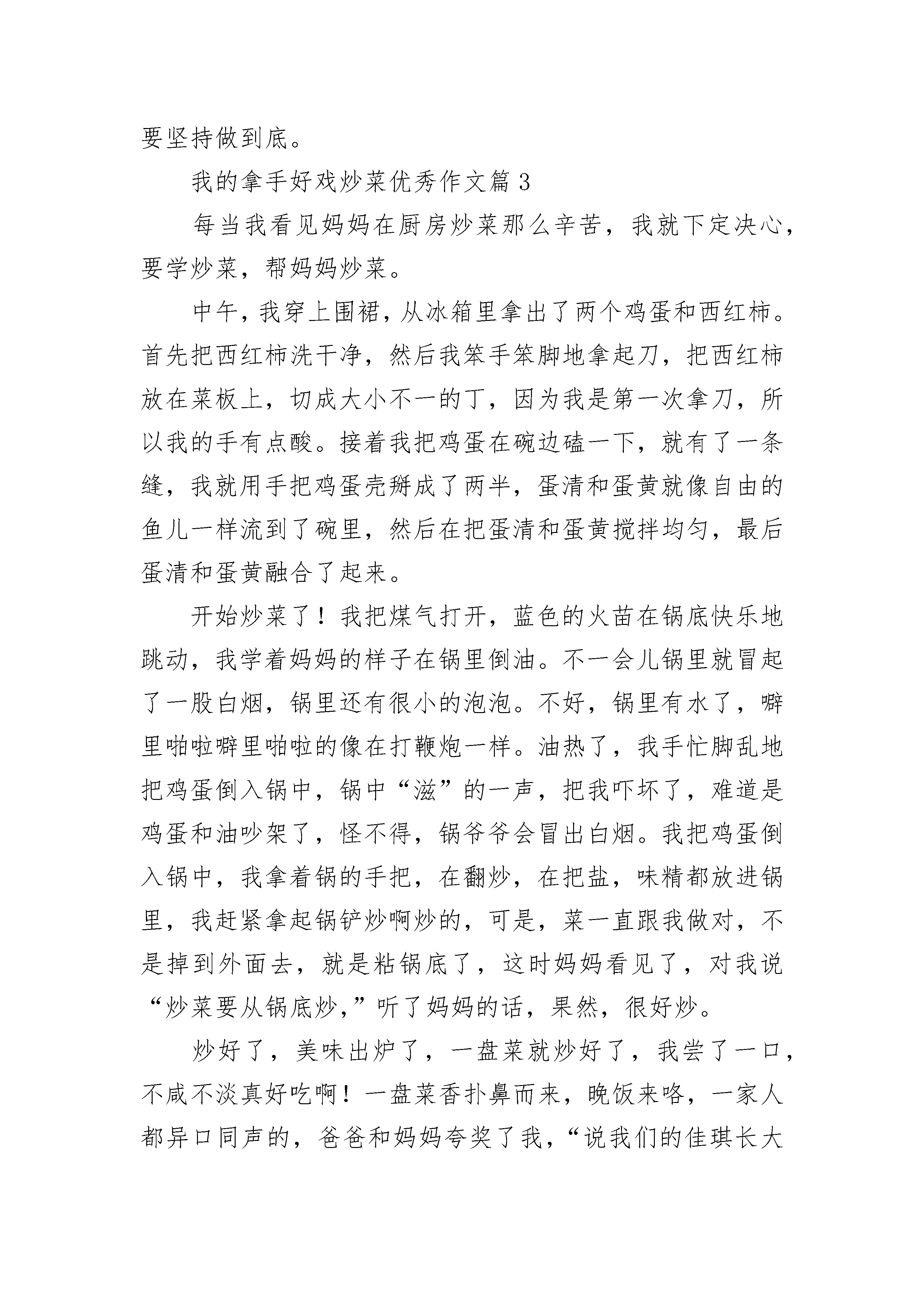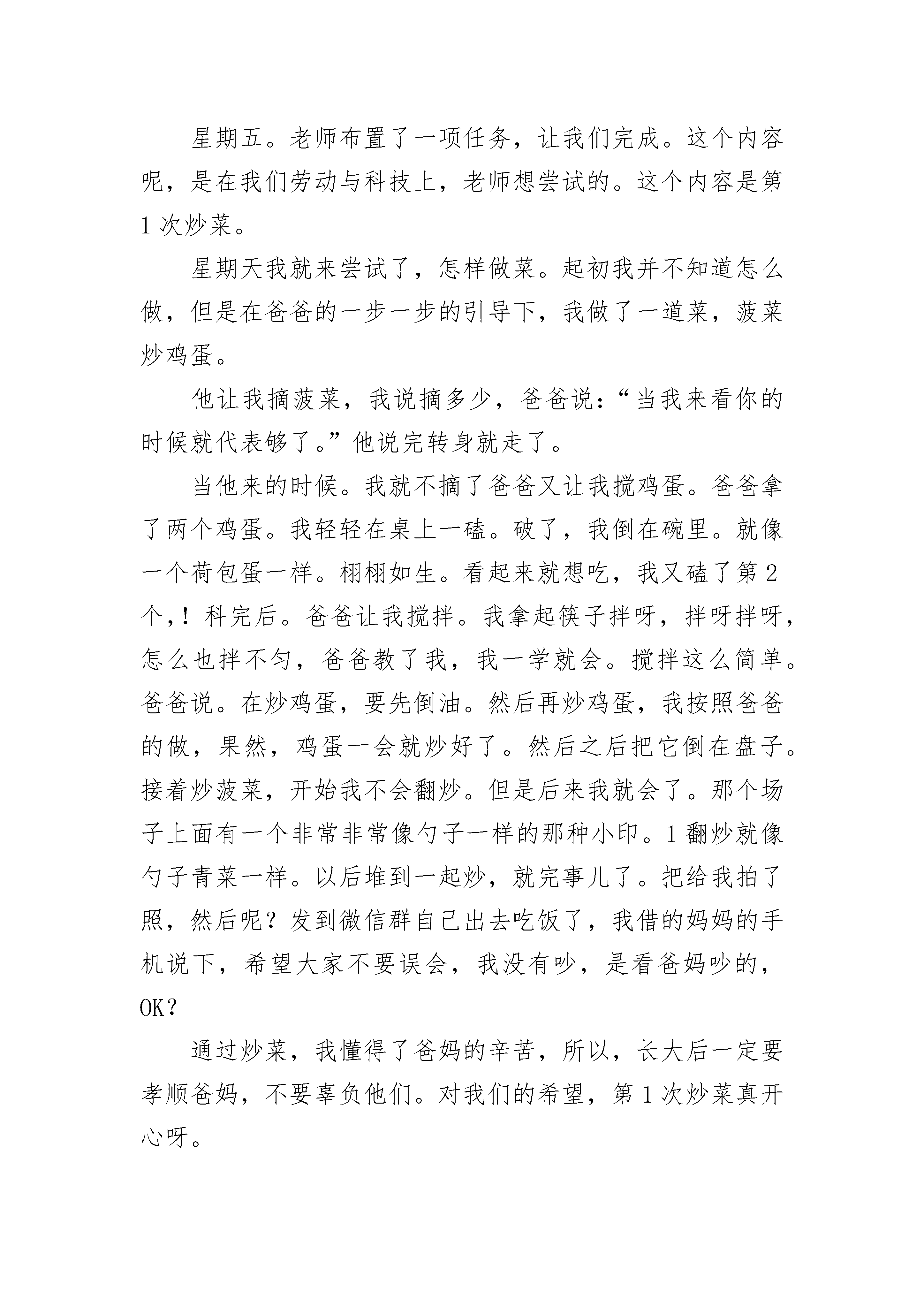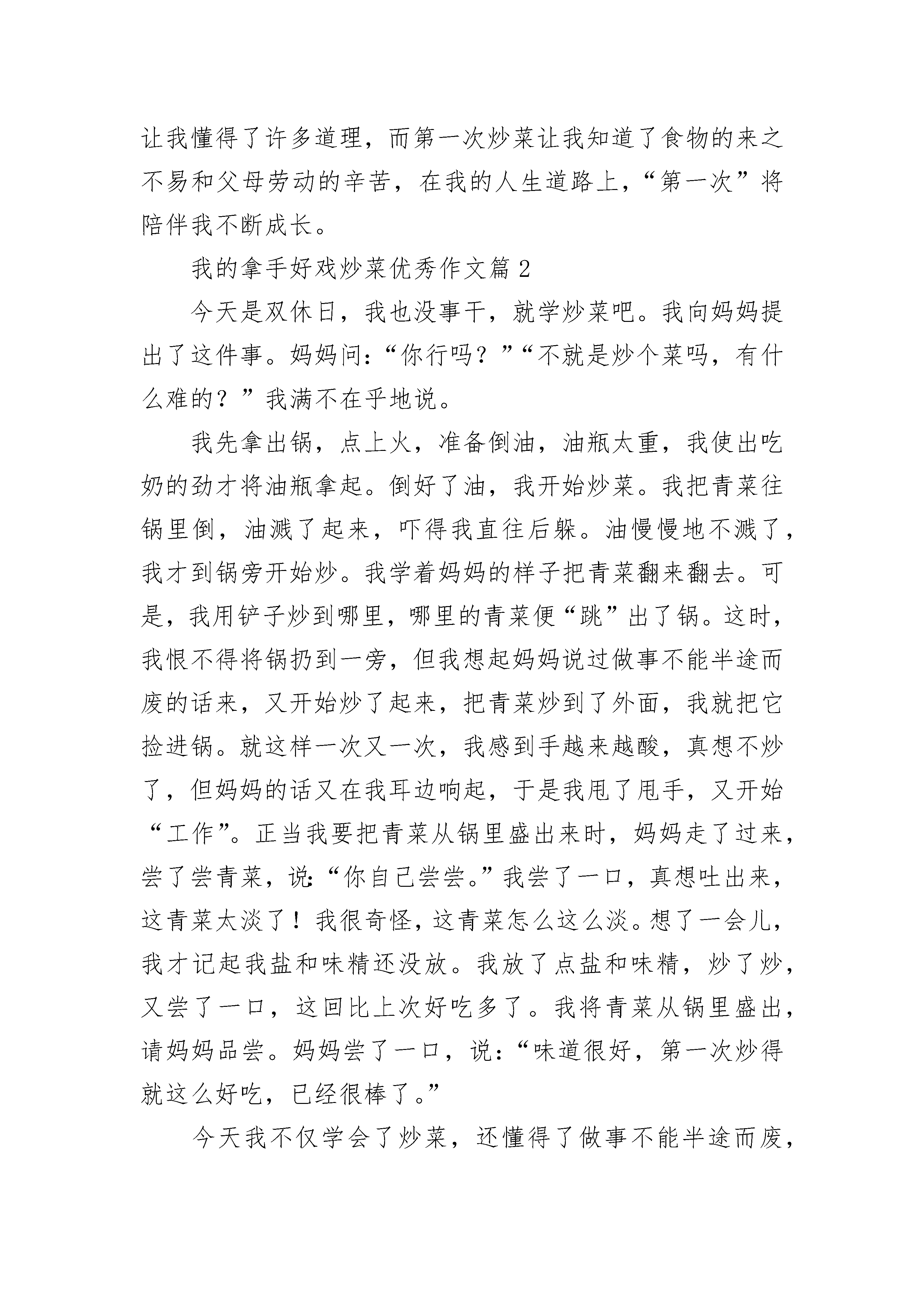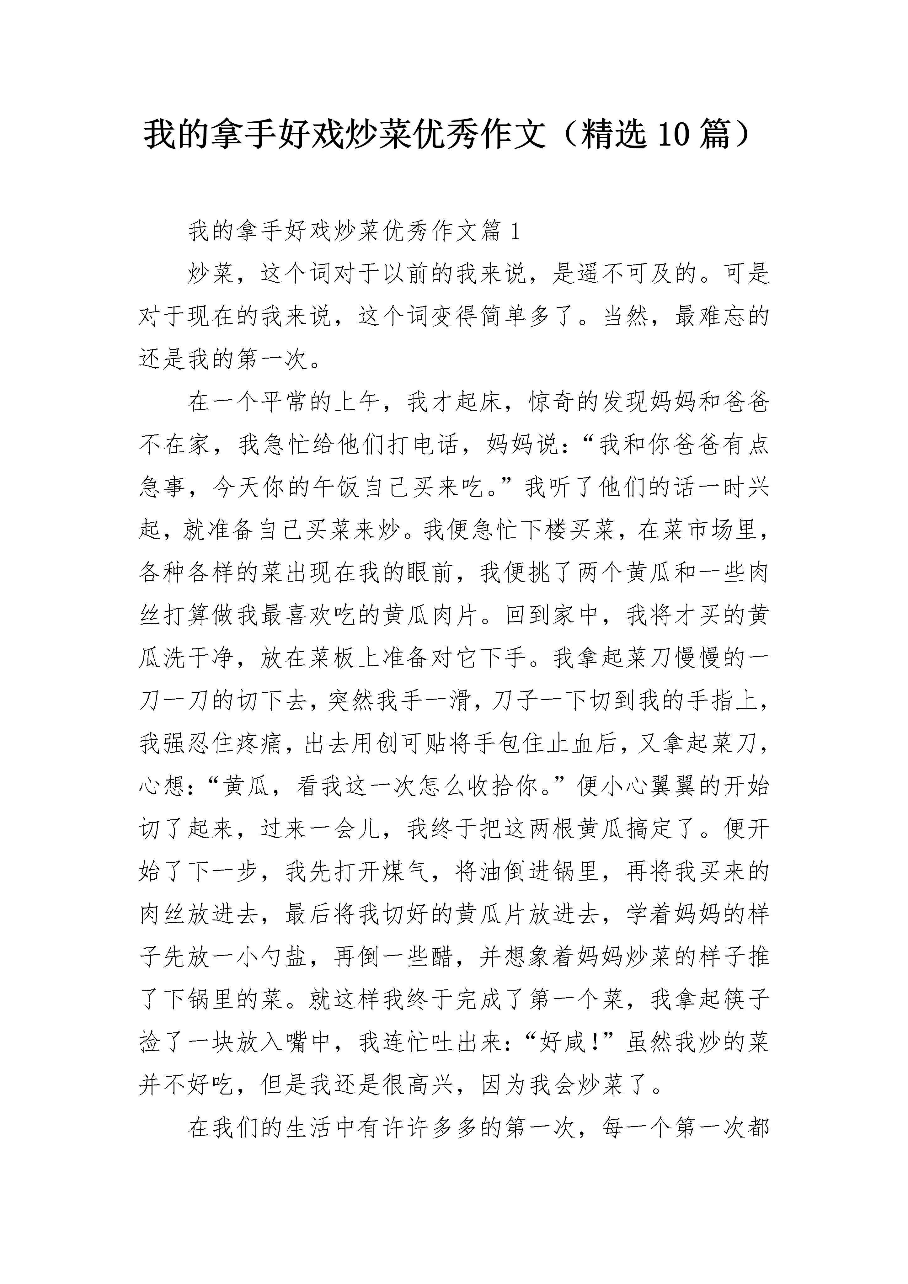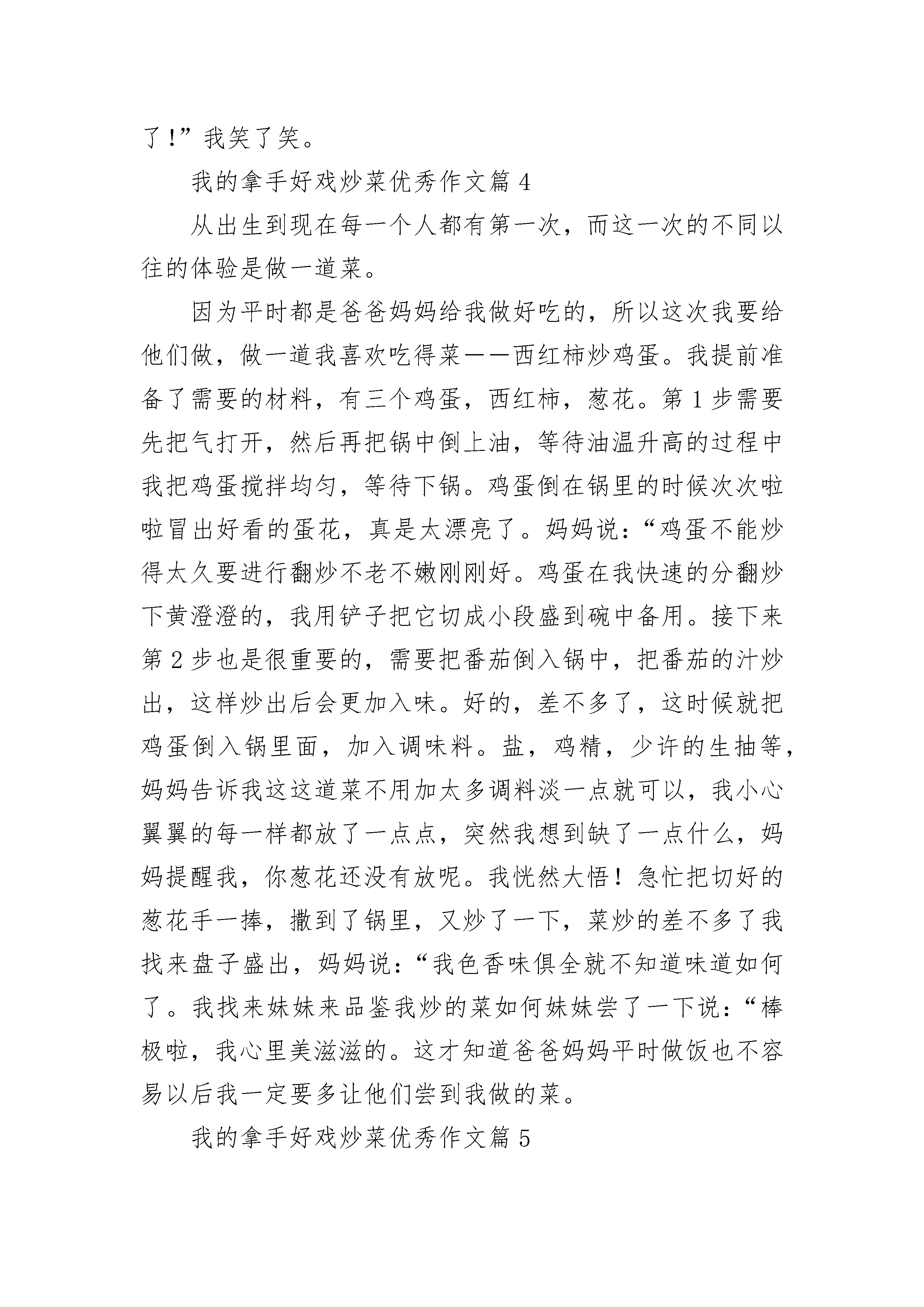 我的拿手好戏炒菜优秀作文(精选10篇)我的拿手好戏炒菜优秀作文篇1炒菜,这个词对于以前的我来说,是遥不可及的。可是对于现在的我来说,这个词变得简单多了。当然,最难忘的还是我的第一次。在一个平常的上午,我才起床,惊奇的发现妈妈和爸爸不在家,我急忙给他们打电话,妈妈说:“我和你爸爸有点急事,今天你的午饭自己买来吃。”我听了他们的话一时兴起,就准备自己买菜来炒。我便急忙下楼买菜,在菜市场里,各种各样的菜出现在我的眼前,我便挑了两个黄瓜和一些肉丝打算做我最喜欢吃的黄瓜肉片。回到家中,我将才买的黄瓜洗干净,放在菜板上准备对它下手。我拿起菜刀慢慢的一刀一刀的切下去,突然我手一滑,刀子一下切到我的手指上,我强忍住疼痛,出去用创可贴将手包住止血后,又拿起菜刀,心想:“黄瓜,看我这一次怎么收拾你。”便小心翼翼的开始切了起来,过来一会儿,我终于把这两根黄瓜搞定了。便开始了下一步,我先打开煤气,将油倒进锅里,再将我买来的肉丝放进去,最后将我切好的黄瓜片放进去,学着妈妈的样子先放一小勺盐,再倒一些醋,并想象着妈妈炒菜的样子推了下锅里的菜。就这样我终于完成了第一个菜,我拿起筷子捡了一块放入嘴中,我连忙吐出来:“好咸!”虽然我炒的菜并不好吃,但是我还是很高兴,因为我会炒菜了。在我们的生活中有许许多多的第一次,每一个第一次都让我懂得了许多道理,而第一次炒菜让我知道了食物的来之不易和父母劳动的辛苦,在我的人生道路上,“第一次”将陪伴我不断成长。我的拿手好戏炒菜优秀作文篇2今天是双休日,我也没事干,就学炒菜吧。我向妈妈提出了这件事。妈妈问:“你行吗?”“不就是炒个菜吗,有什么难的?”我满不在乎地说。我先拿出锅,点上火,准备倒油,油瓶太重,我使出吃奶的劲才将油瓶拿起。倒好了油,我开始炒菜。我把青菜往锅里倒,油溅了起来,吓得我直往后躲。油慢慢地不溅了,我才到锅旁开始炒。我学着妈妈的样子把青菜翻来翻去。可是,我用铲子炒到哪里,哪里的青菜便“跳”出了锅。这时,我恨不得将锅扔到一旁,但我想起妈妈说过做事不能半途而废的话来,又开始炒了起来,把青菜炒到了外面,我就把它捡进锅。就这样一次又一次,我感到手越来越酸,真想不炒了,但妈妈的话又在我耳边响起,于是我甩了甩手,又开始“工作”。正当我要把青菜从锅里盛出来时,妈妈走了过来,尝了尝青菜,说:“你自己尝尝。”我尝了一口,真想吐出来,这青菜太淡了!我很奇怪,这青菜怎么这么淡。想了一会儿,我才记起我盐和味精还没放。我放了点盐和味精,炒了炒,又尝了一口,这回比上次好吃多了。我将青菜从锅里盛出,请妈妈品尝。妈妈尝了一口,说:“味道很好,第一次炒得就这么好吃,已经很棒了。”今天我不仅学会了炒菜,还懂得了做事不能半途而废,要坚持做到底。我的拿手好戏炒菜优秀作文篇3每当我看见妈妈在厨房炒菜那么辛苦,我就下定决心,要学炒菜,帮妈妈炒菜。中午,我穿上围裙,从冰箱里拿出了两个鸡蛋和西红柿。首先把西红柿洗干净,然后我笨手笨脚地拿起刀,把西红柿放在菜板上,切成大小不一的丁,因为我是第一次拿刀,所以我的手有点酸。接着我把鸡蛋在碗边磕一下,就有了一条缝,我就用手把鸡蛋壳掰成了两半,蛋清和蛋黄就像自由的鱼儿一样流到了碗里,然后在把蛋清和蛋黄搅拌均匀,最后蛋清和蛋黄融合了起来。开始炒菜了!我把煤气打开,蓝色的火苗在锅底快乐地跳动,我学着妈妈的样子在锅里倒油。不一会儿锅里就冒起了一股白烟,锅里还有很小的泡泡。不好,锅里有水了,噼里啪啦噼里啪啦的像在打鞭炮一样。油热了,我手忙脚乱地把鸡蛋倒入锅中,锅中“滋”的一声,把我吓坏了,难道是鸡蛋和油吵架了,怪不得,锅爷爷会冒出白烟。我把鸡蛋倒入锅中,我拿着锅的手把,在翻炒,在把盐,味精都放进锅里,我赶紧拿起锅铲炒啊炒的,可是,菜一直跟我做对,不是掉到外面去,就是粘锅底了,这时妈妈看见了,对我说“炒菜要从锅底炒,”听了妈妈的话,果然,很好炒。炒好了,美味出炉了,一盘菜就炒好了,我尝了一口,不咸不淡真好吃啊!一盘菜香扑鼻而来,晚饭来咯,一家人都异口同声的,爸爸和妈妈夸奖了我,“说我们的佳琪长大了!”我笑了笑。我的拿手好戏炒菜优秀作文篇4从出生到现在每一个人都有第一次,而这一次的不同以往的体验是做一道菜。因为平时都是爸爸妈妈给我做好吃的,所以这次我要给他们做,做一道我喜欢吃得菜――西红柿炒鸡蛋。我提前准备了需要的材料,有三个鸡蛋,西红柿,葱花。第1步需要先把气打开,然后再把锅中倒上油,等待油温升高的过程中我把鸡蛋搅拌均匀,等待下锅。鸡蛋倒在锅里的时候次次啦啦冒出好看的蛋花,真是太漂亮了。妈妈说:“鸡蛋不能炒得太久要进行翻炒不老不嫩刚刚好。鸡蛋在我快速的分翻炒下黄澄澄的,我用铲子把它切成小段盛到碗中备用。接下来第2步也是很重要的,需要把番茄倒入锅中,把番茄的汁炒出,这样炒出后会更加入味。好的,差不多了,这时候就把鸡蛋倒入锅里面