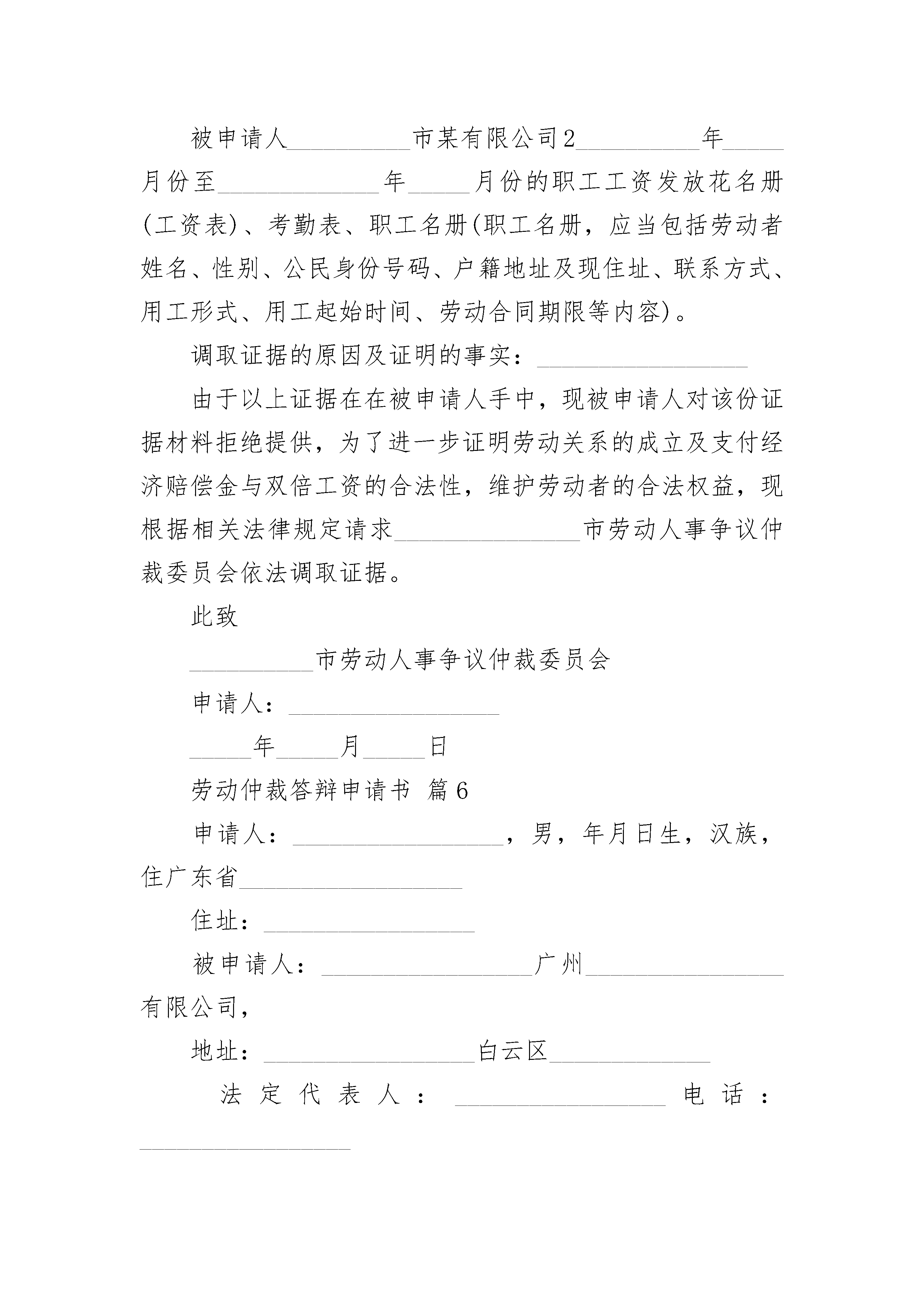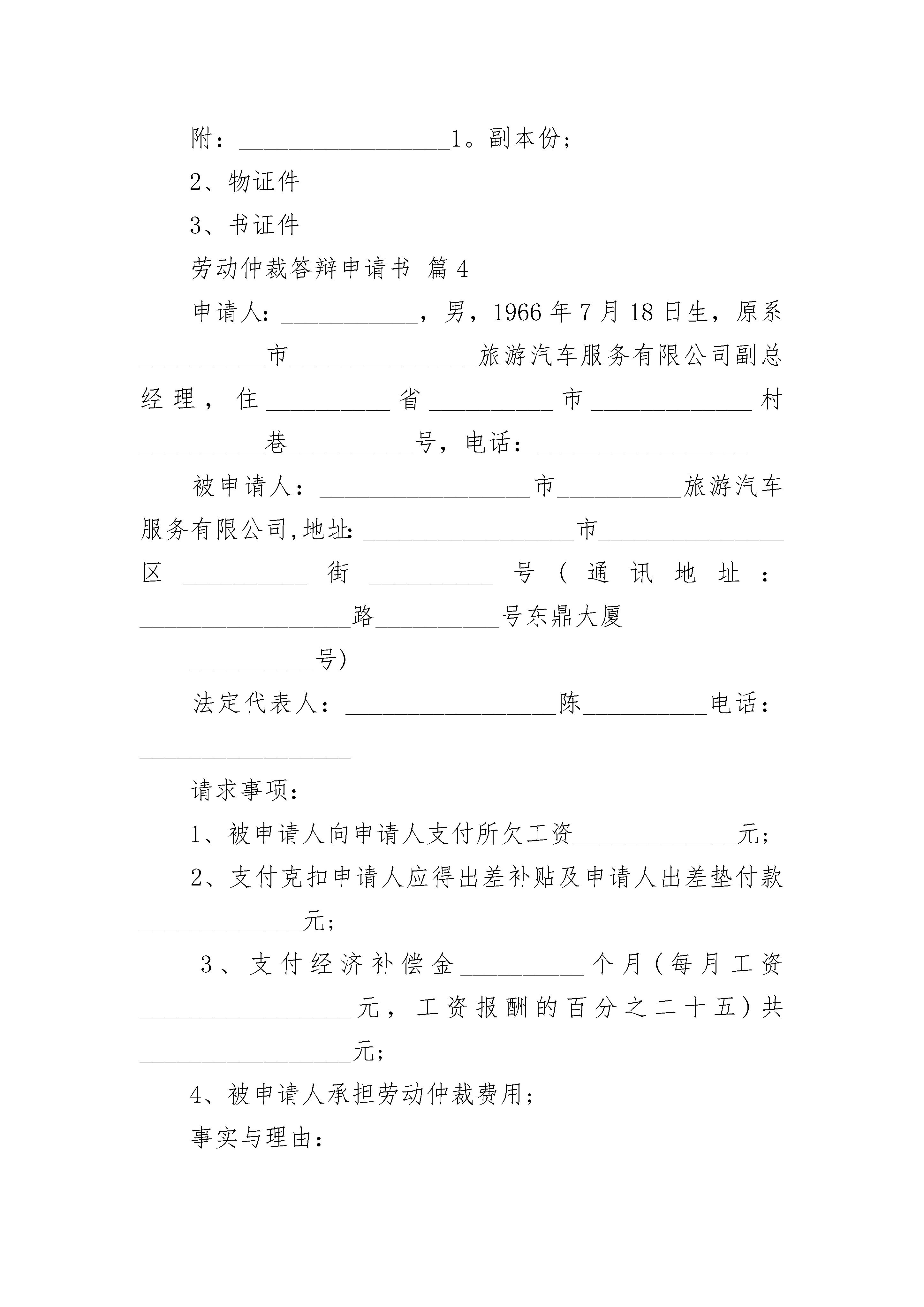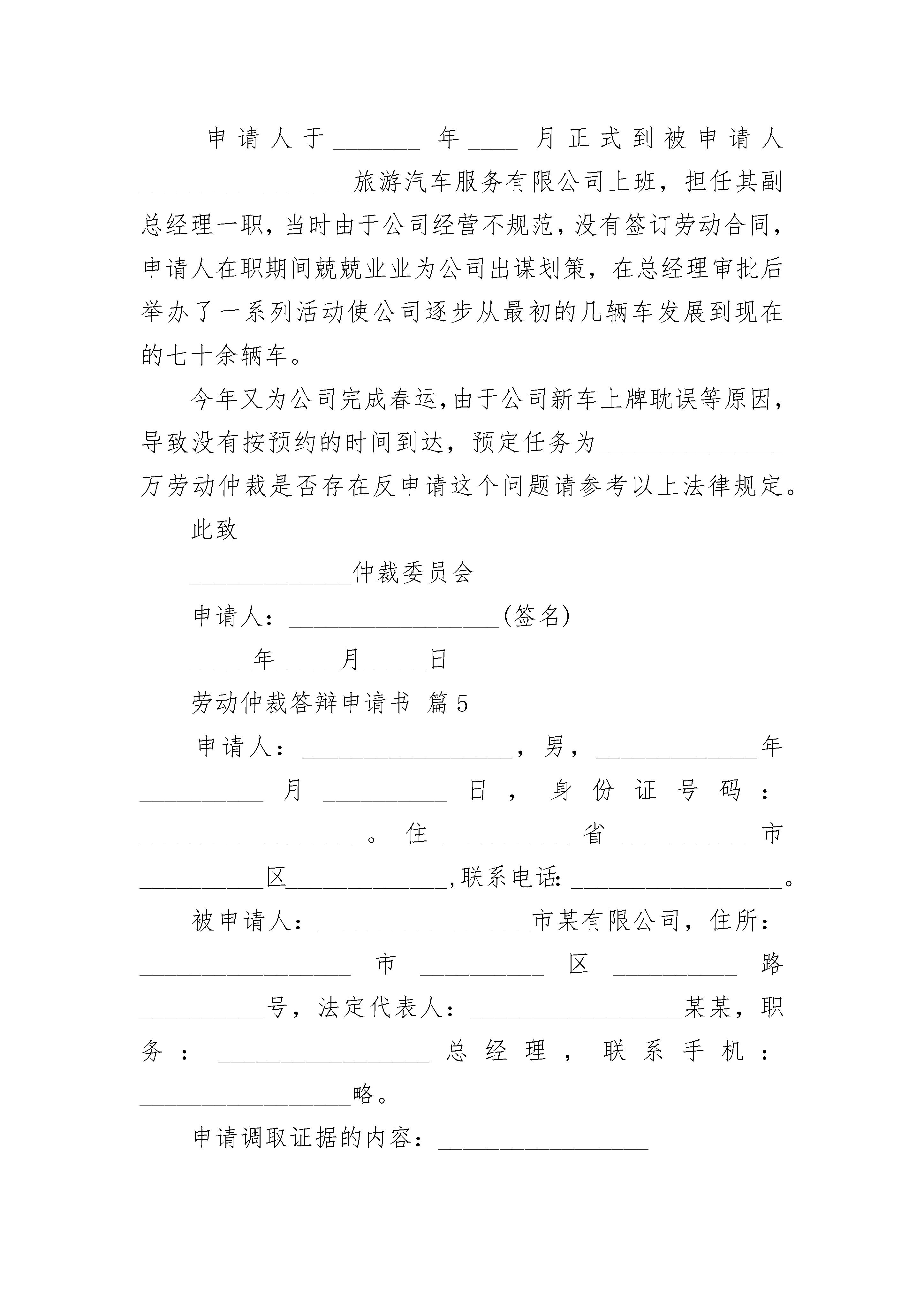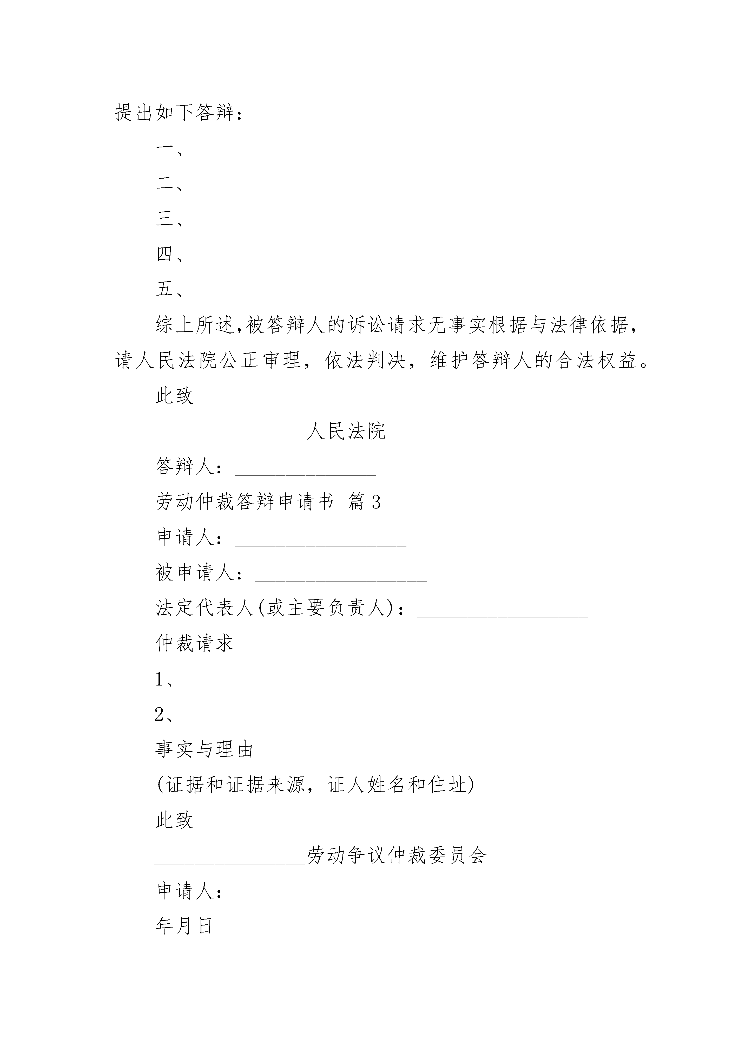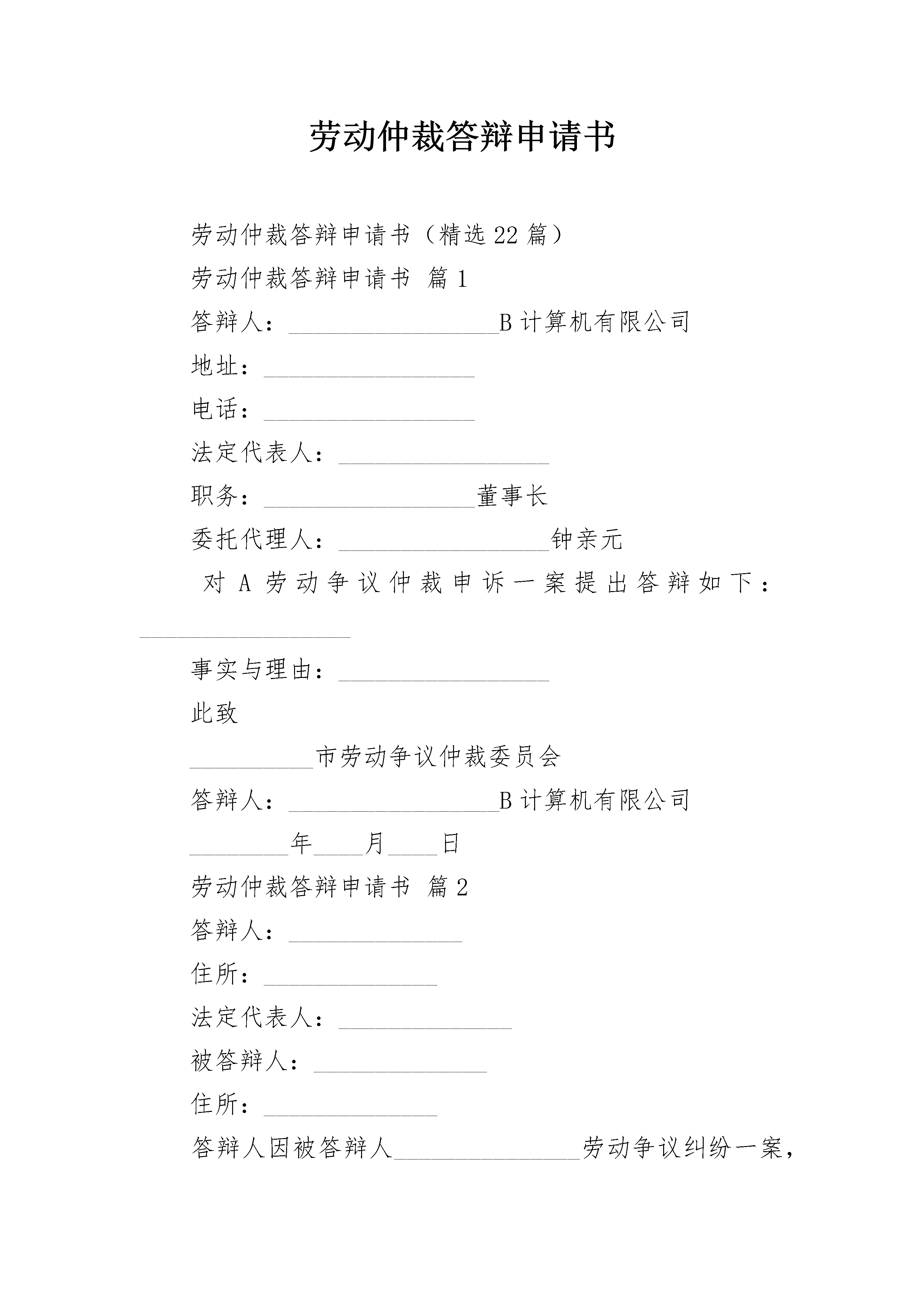 劳动仲裁答辩申请书劳动仲裁答辩申请书(精选22篇)劳动仲裁答辩申请书篇1答辩人:_________________B计算机有限公司地址:_________________电话:_________________法定代表人:_________________职务:_________________董事长委托代理人:_________________钟亲元对A劳动争议仲裁申诉一案提出答辩如下:_________________事实与理由:_________________此致__________市劳动争议仲裁委员会答辩人:_________________B计算机有限公司________年____月____日劳动仲裁答辩申请书篇2答辩人:______________住所:______________法定代表人:______________被答辩人:______________住所:______________答辩人因被答辩人_______________劳动争议纠纷一案,提出如下答辩:_________________一、二、三、四、五、综上所述,被答辩人的诉讼请求无事实根据与法律依据,请人民法院公正审理,依法判决,维护答辩人的合法权益。此致_______________人民法院答辩人:______________劳动仲裁答辩申请书篇3申请人:_________________被申请人:_________________法定代表人(或主要负责人):_________________仲裁请求1、2、事实与理由(证据和证据来源,证人姓名和住址)此致_______________劳动争议仲裁委员会申请人:_________________年月日附:_________________1。副本份;2、物证件3、书证件劳动仲裁答辩申请书篇4申请人:___________,男,1966年7月18日生,原系__________市_______________旅游汽车服务有限公司副总经理,住__________省__________市_____________村__________巷__________号,电话:_________________被申请人:_________________市__________旅游汽车服务有限公司,地址:_________________市_______________区__________街__________号(通讯地址:_________________路__________号东鼎大厦__________号)法定代表人:_________________陈__________电话:_________________请求事项:1、被申请人向申请人支付所欠工资_____________元;2、支付克扣申请人应得出差补贴及申请人出差垫付款_____________元;3、支付经济补偿金__________个月(每月工资_________________元,工资报酬的百分之二十五)共_________________元;4、被申请人承担劳动仲裁费用;事实与理由:申请人于_______年____月正式到被申请人_________________旅游汽车服务有限公司上班,担任其副总经理一职,当时由于公司经营不规范,没有签订劳动合同,申请人在职期间兢兢业业为公司出谋划策,在总经理审批后举办了一系列活动使公司逐步从最初的几辆车发展到现在的七十余辆车。今年又为公司完成春运,由于公司新车上牌耽误等原因,导致没有按预约的时间到达,预定任务为_______________万劳动仲裁是否存在反申请这个问题请参考以上法律规定。此致_____________仲裁委员会申请人:_________________(签名)_____年_____月_____日劳动仲裁答辩申请书篇5申请人:_________________,男,_____________年__________月__________日,身份证号码:_________________。住__________省__________市__________区_____________,联系电话:_________________。被申请人:_________________市某有限公司,住所:_________________市__________区__________路__________号,法定代表人:_________________某某,职务:_________________总经理,联系手机:_________________略。申请调取证据的内容:_________________被申请人__________市某有限公司2__________年_____月份至_______