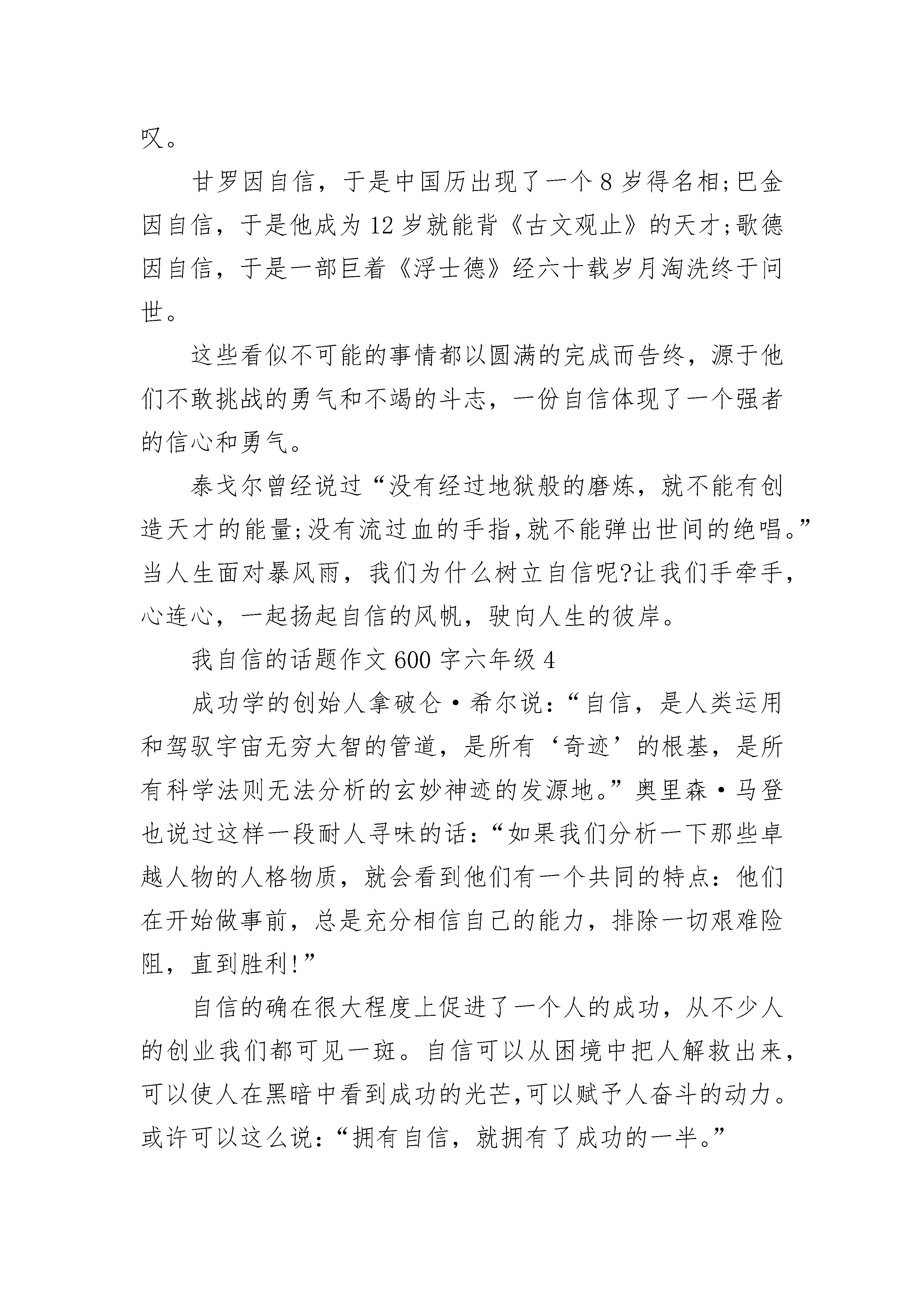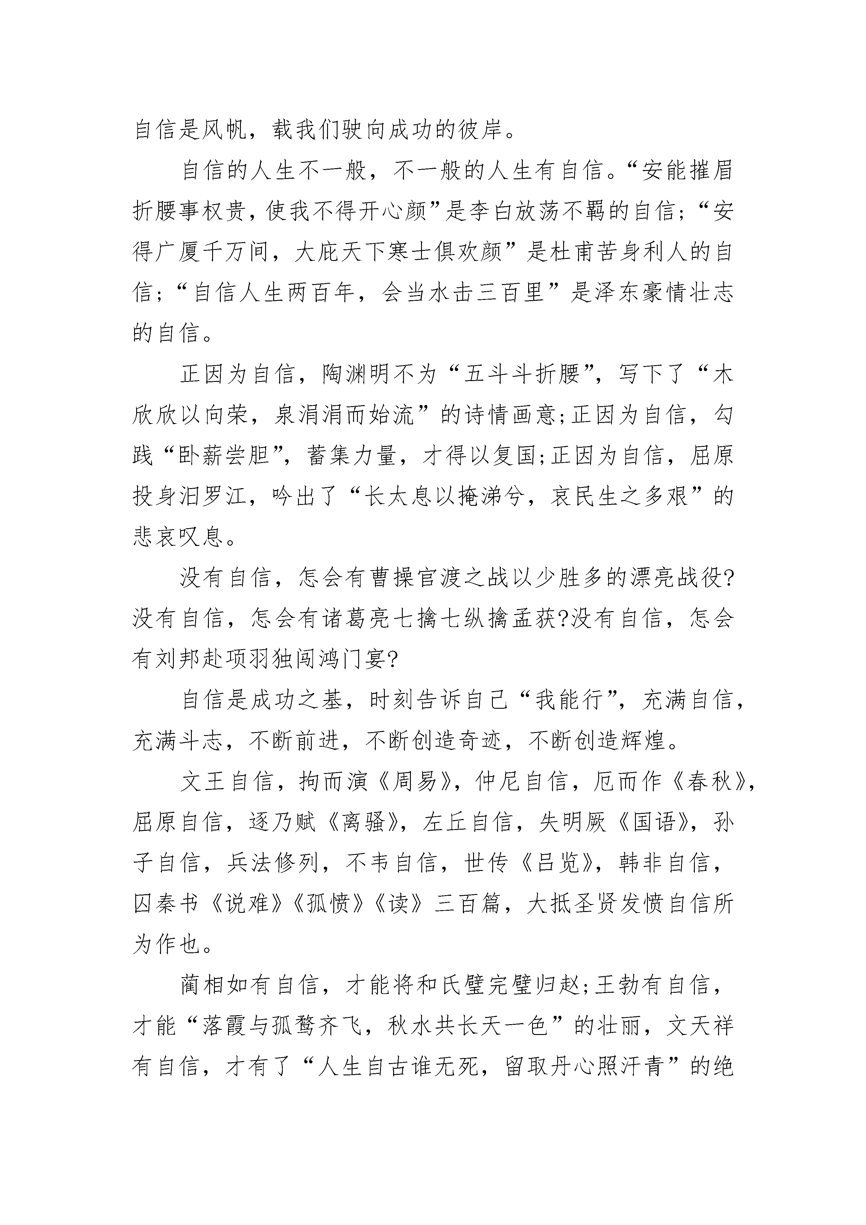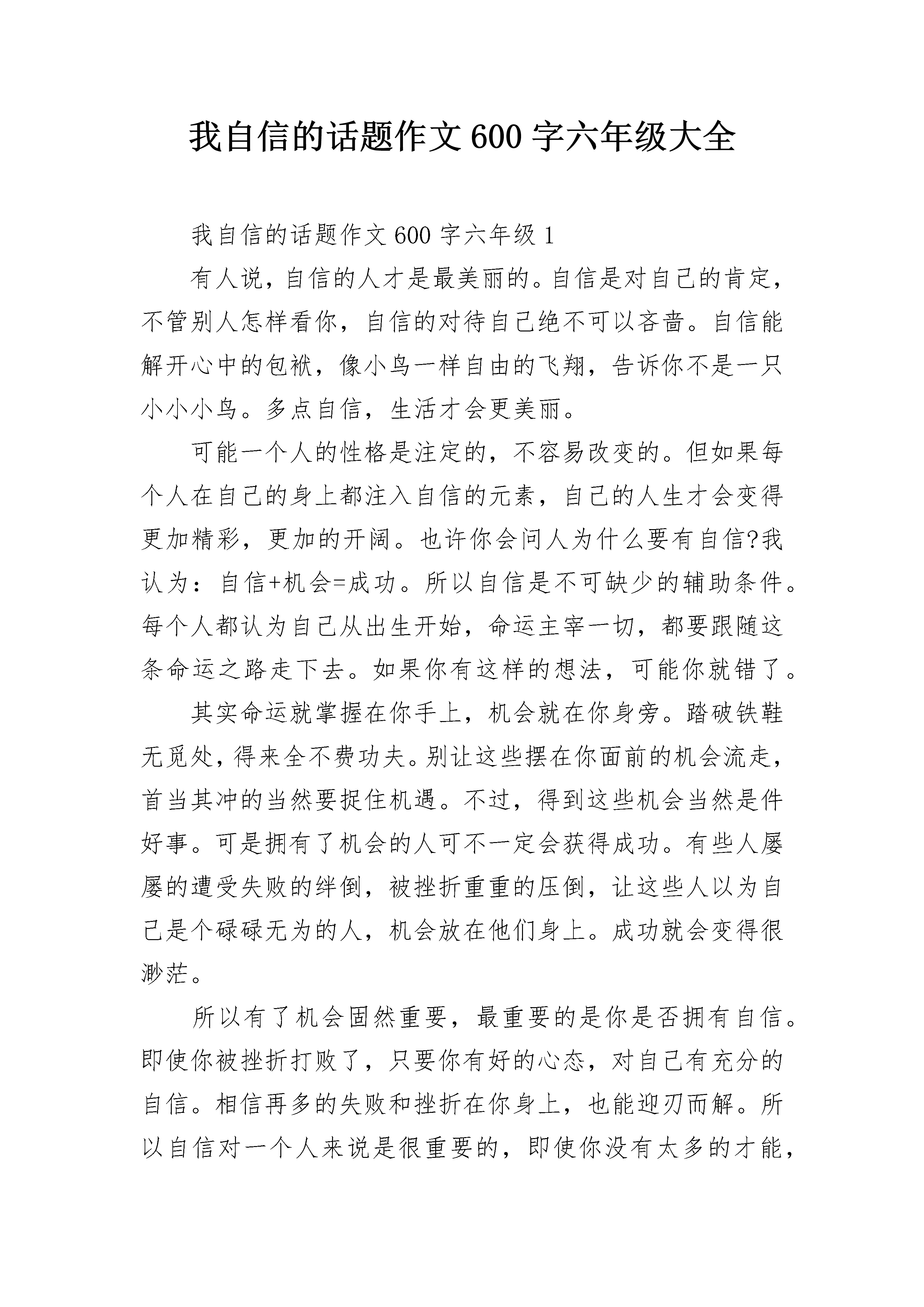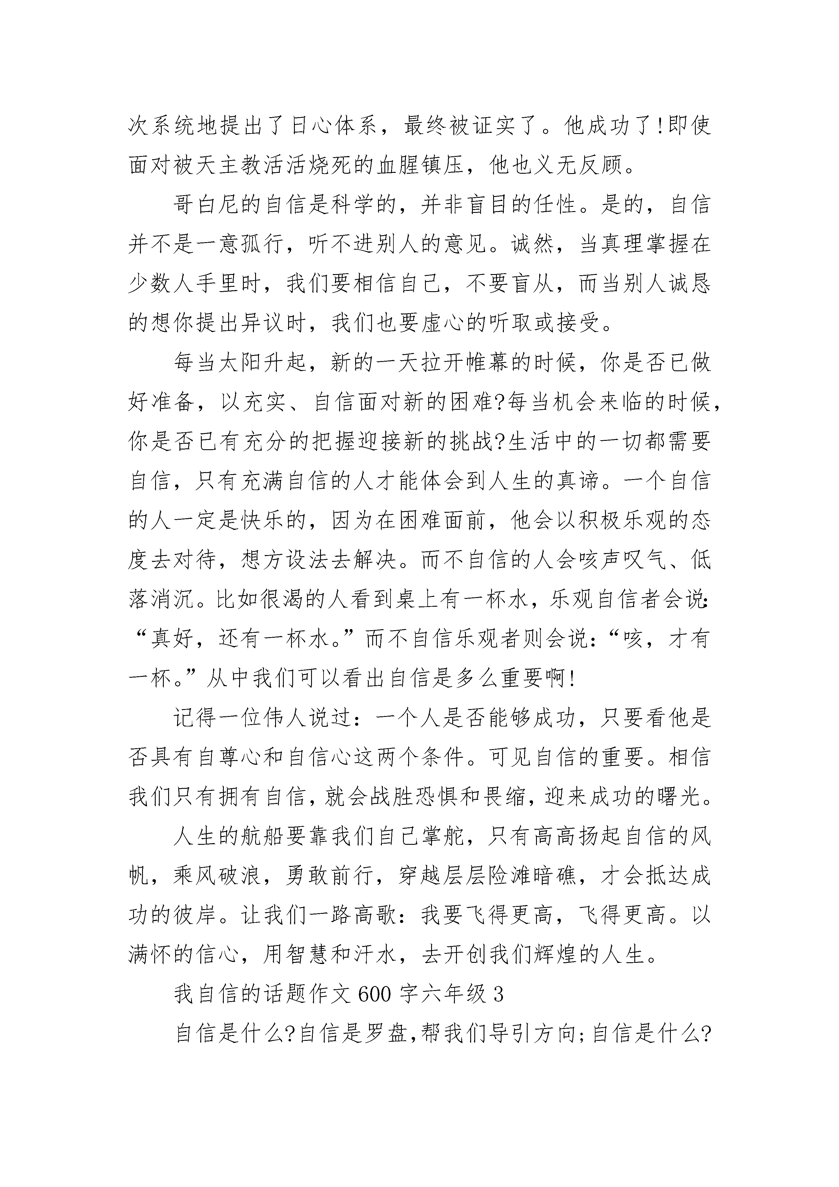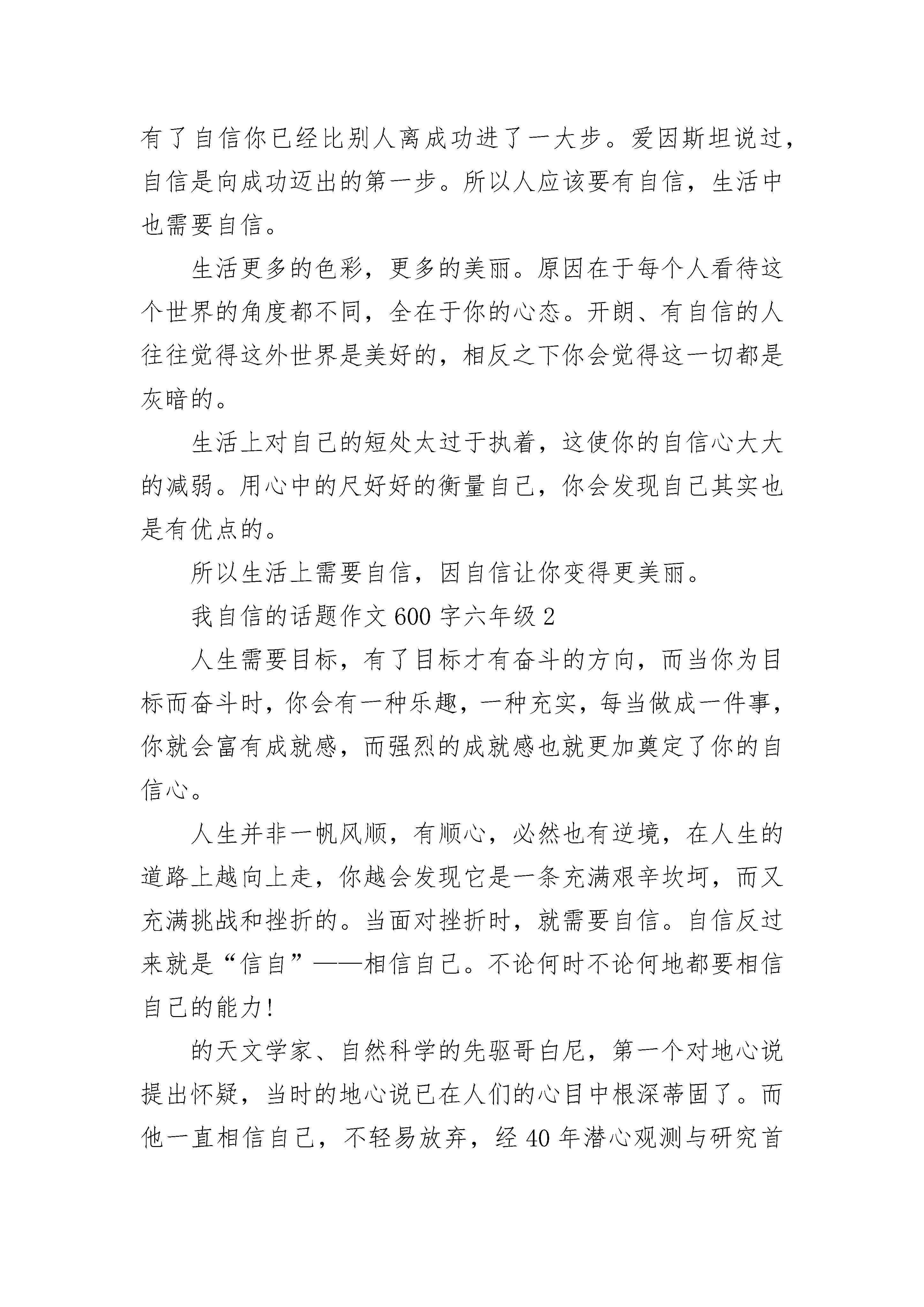 我自信的话题作文600字六年级大全我自信的话题作文600字六年级1有人说,自信的人才是最美丽的。自信是对自己的肯定,不管别人怎样看你,自信的对待自己绝不可以吝啬。自信能解开心中的包袱,像小鸟一样自由的飞翔,告诉你不是一只小小小鸟。多点自信,生活才会更美丽。可能一个人的性格是注定的,不容易改变的。但如果每个人在自己的身上都注入自信的元素,自己的人生才会变得更加精彩,更加的开阔。也许你会问人为什么要有自信?我认为:自信+机会=成功。所以自信是不可缺少的辅助条件。每个人都认为自己从出生开始,命运主宰一切,都要跟随这条命运之路走下去。如果你有这样的想法,可能你就错了。其实命运就掌握在你手上,机会就在你身旁。踏破铁鞋无觅处,得来全不费功夫。别让这些摆在你面前的机会流走,首当其冲的当然要捉住机遇。不过,得到这些机会当然是件好事。可是拥有了机会的人可不一定会获得成功。有些人屡屡的遭受失败的绊倒,被挫折重重的压倒,让这些人以为自己是个碌碌无为的人,机会放在他们身上。成功就会变得很渺茫。所以有了机会固然重要,最重要的是你是否拥有自信。即使你被挫折打败了,只要你有好的心态,对自己有充分的自信。相信再多的失败和挫折在你身上,也能迎刃而解。所以自信对一个人来说是很重要的,即使你没有太多的才能,有了自信你已经比别人离成功进了一大步。爱因斯坦说过,自信是向成功迈出的第一步。所以人应该要有自信,生活中也需要自信。生活更多的色彩,更多的美丽。原因在于每个人看待这个世界的角度都不同,全在于你的心态。开朗、有自信的人往往觉得这外世界是美好的,相反之下你会觉得这一切都是灰暗的。生活上对自己的短处太过于执着,这使你的自信心大大的减弱。用心中的尺好好的衡量自己,你会发现自己其实也是有优点的。所以生活上需要自信,因自信让你变得更美丽。我自信的话题作文600字六年级2人生需要目标,有了目标才有奋斗的方向,而当你为目标而奋斗时,你会有一种乐趣,一种充实,每当做成一件事,你就会富有成就感,而强烈的成就感也就更加奠定了你的自信心。人生并非一帆风顺,有顺心,必然也有逆境,在人生的道路上越向上走,你越会发现它是一条充满艰辛坎坷,而又充满挑战和挫折的。当面对挫折时,就需要自信。自信反过来就是“信自”——相信自己。不论何时不论何地都要相信自己的能力!的天文学家、自然科学的先驱哥白尼,第一个对地心说提出怀疑,当时的地心说已在人们的心目中根深蒂固了。而他一直相信自己,不轻易放弃,经40年潜心观测与研究首次系统地提出了日心体系,最终被证实了。他成功了!即使面对被天主教活活烧死的血腥镇压,他也义无反顾。哥白尼的自信是科学的,并非盲目的任性。是的,自信并不是一意孤行,听不进别人的意见。诚然,当真理掌握在少数人手里时,我们要相信自己,不要盲从,而当别人诚恳的想你提出异议时,我们也要虚心的听取或接受。每当太阳升起,新的一天拉开帷幕的时候,你是否已做好准备,以充实、自信面对新的困难?每当机会来临的时候,你是否已有充分的把握迎接新的挑战?生活中的一切都需要自信,只有充满自信的人才能体会到人生的真谛。一个自信的人一定是快乐的,因为在困难面前,他会以积极乐观的态度去对待,想方设法去解决。而不自信的人会咳声叹气、低落消沉。比如很渴的人看到桌上有一杯水,乐观自信者会说:“真好,还有一杯水。”而不自信乐观者则会说:“咳,才有一杯。”从中我们可以看出自信是多么重要啊!记得一位伟人说过:一个人是否能够成功,只要看他是否具有自尊心和自信心这两个条件。可见自信的重要。相信我们只有拥有自信,就会战胜恐惧和畏缩,迎来成功的曙光。人生的航船要靠我们自己掌舵,只有高高扬起自信的风帆,乘风破浪,勇敢前行,穿越层层险滩暗礁,才会抵达成功的彼岸。让我们一路高歌:我要飞得更高,飞得更高。以满怀的信心,用智慧和汗水,去开创我们辉煌的人生。我自信的话题作文600字六年级3自信是什么?自信是罗盘,帮我们导引方向;自信是什么?自信是风帆,载我们驶向成功的彼岸。自信的人生不一般,不一般的人生有自信。“安能摧眉折腰事权贵,使我不得开心颜”是李白放荡不羁的自信;“安得广厦千万间,大庇天下寒士俱欢颜”是杜甫苦身利人的自信;“自信人生两百年,会当水击三百里”是泽东豪情壮志的自信。正因为自信,陶渊明不为“五斗斗折腰”,写下了“木欣欣以向荣,泉涓涓而始流”的诗情画意;正因为自信,勾践“卧薪尝胆”,蓄集力量,才得以复国;正因为自信,屈原投身汨罗江,吟出了“长太息以掩涕兮,哀民生之多艰”的悲哀叹息。没有自信,怎会有曹操官渡之战以少胜多的漂亮战役?没有自信,怎会有诸葛亮七擒七纵擒孟获?没有自信,怎会有刘邦赴项羽独闯鸿门宴?自信是成功之基,时刻告诉自己“我能行”,充满自信,充满斗志,不断前进,不断创造奇迹,不断创造辉煌。文王自信,拘而演《周易》,仲尼自信,厄而作