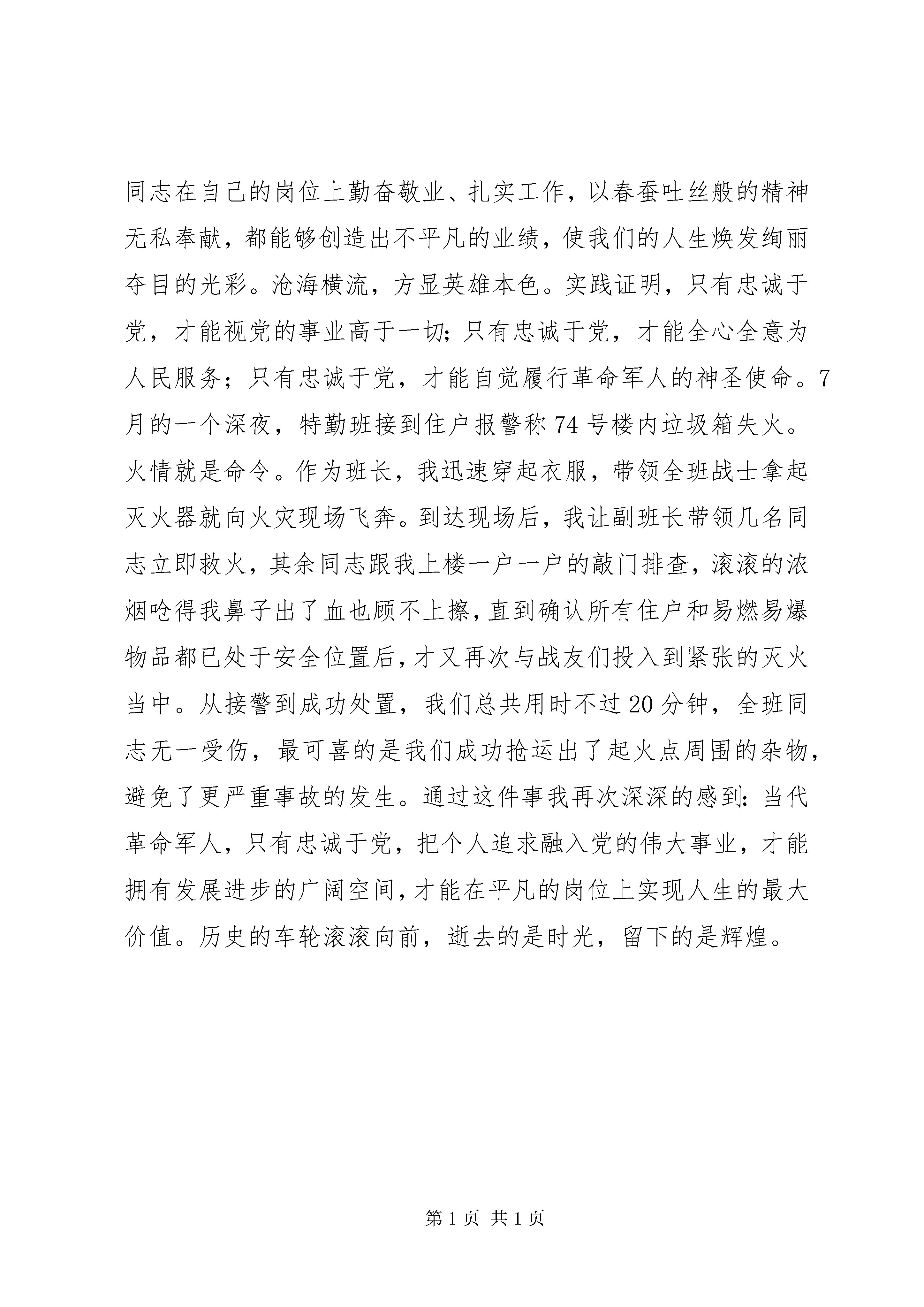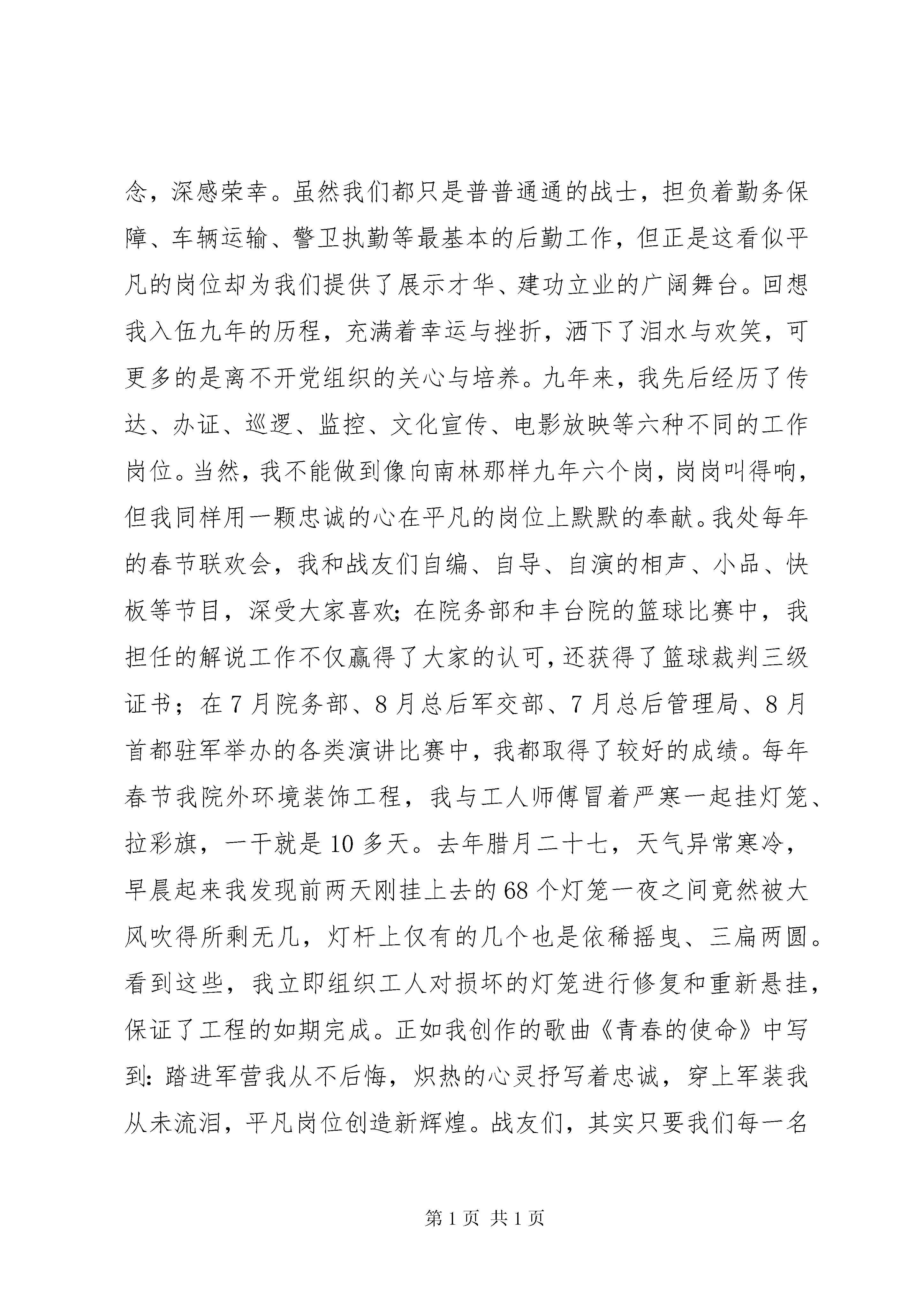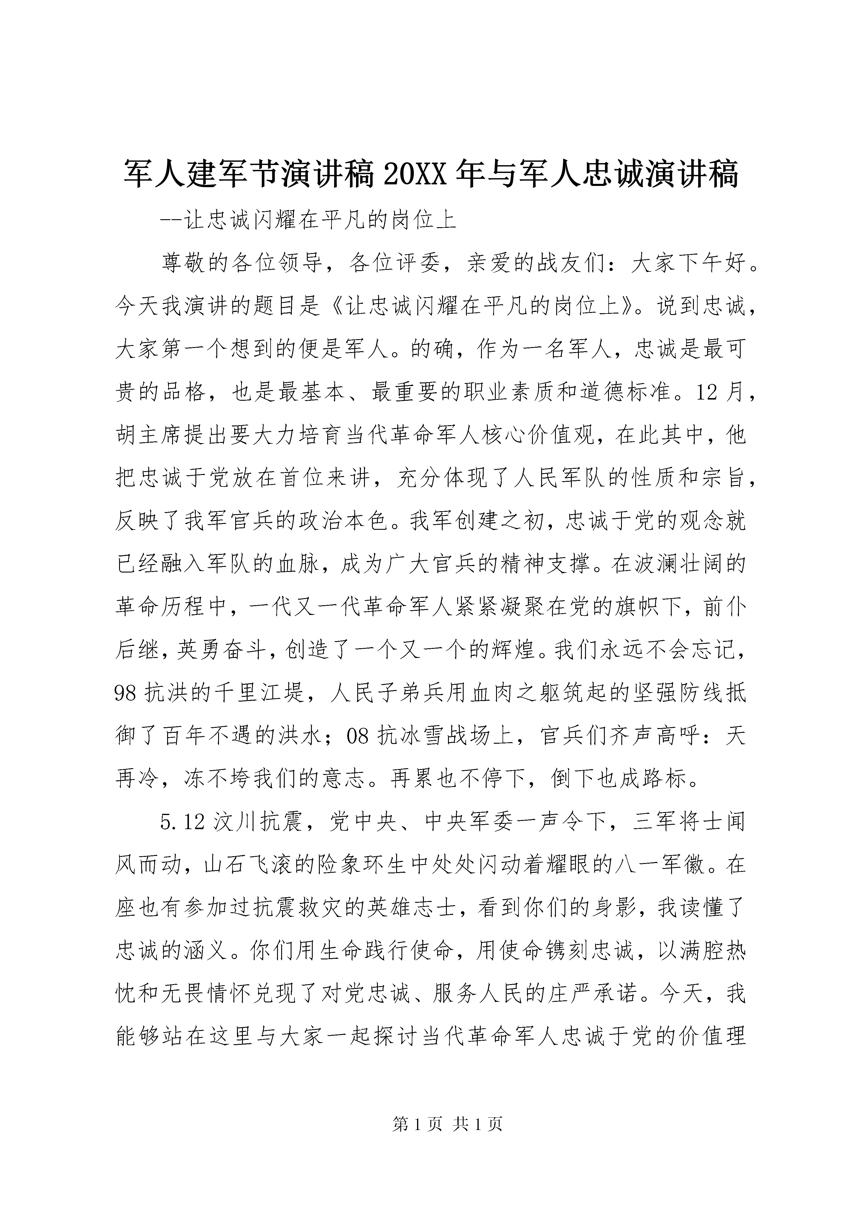 军人建军节演讲稿20XX年与军人忠诚演讲稿--让忠诚闪耀在平凡的岗位上尊敬的各位领导,各位评委,亲爱的战友们:大家下午好。今天我演讲的题目是《让忠诚闪耀在平凡的岗位上》。说到忠诚,大家第一个想到的便是军人。的确,作为一名军人,忠诚是最可贵的品格,也是最基本、最重要的职业素质和道德标准。12月,胡主席提出要大力培育当代革命军人核心价值观,在此其中,他把忠诚于党放在首位来讲,充分体现了人民军队的性质和宗旨,反映了我军官兵的政治本色。我军创建之初,忠诚于党的观念就已经融入军队的血脉,成为广大官兵的精神支撑。在波澜壮阔的革命历程中,一代又一代革命军人紧紧凝聚在党的旗帜下,前仆后继,英勇奋斗,创造了一个又一个的辉煌。我们永远不会忘记,98抗洪的千里江堤,人民子弟兵用血肉之躯筑起的坚强防线抵御了百年不遇的洪水;08抗冰雪战场上,官兵们齐声高呼:天再冷,冻不垮我们的意志。再累也不停下,倒下也成路标。5.12汶川抗震,党中央、中央军委一声令下,三军将士闻风而动,山石飞滚的险象环生中处处闪动着耀眼的八一军徽。在座也有参加过抗震救灾的英雄志士,看到你们的身影,我读懂了忠诚的涵义。你们用生命践行使命,用使命镌刻忠诚,以满腔热忱和无畏情怀兑现了对党忠诚、服务人民的庄严承诺。今天,我能够站在这里与大家一起探讨当代革命军人忠诚于党的价值理念,深感荣幸。虽然我们都只是普普通通的战士,担负着勤务保障、车辆运输、警卫执勤等最基本的后勤工作,但正是这看似平凡的岗位却为我们提供了展示才华、建功立业的广阔舞台。回想我入伍九年的历程,充满着幸运与挫折,洒下了泪水与欢笑,可更多的是离不开党组织的关心与培养。九年来,我先后经历了传达、办证、巡逻、监控、文化宣传、电影放映等六种不同的工作岗位。当然,我不能做到像向南林那样九年六个岗,岗岗叫得响,但我同样用一颗忠诚的心在平凡的岗位上默默的奉献。我处每年的春节联欢会,我和战友们自编、自导、自演的相声、小品、快板等节目,深受大家喜欢;在院务部和丰台院的篮球比赛中,我担任的解说工作不仅赢得了大家的认可,还获得了篮球裁判三级证书;在7月院务部、8月总后军交部、7月总后管理局、8月首都驻军举办的各类演讲比赛中,我都取得了较好的成绩。每年春节我院外环境装饰工程,我与工人师傅冒着严寒一起挂灯笼、拉彩旗,一干就是10多天。去年腊月二十七,天气异常寒冷,早晨起来我发现前两天刚挂上去的68个灯笼一夜之间竟然被大风吹得所剩无几,灯杆上仅有的几个也是依稀摇曳、三扁两圆。看到这些,我立即组织工人对损坏的灯笼进行修复和重新悬挂,保证了工程的如期完成。正如我创作的歌曲《青春的使命》中写到:踏进军营我从不后悔,炽热的心灵抒写着忠诚,穿上军装我从未流泪,平凡岗位创造新辉煌。战友们,其实只要我们每一名同志在自己的岗位上勤奋敬业、扎实工作,以春蚕吐丝般的精神无私奉献,都能够创造出不平凡的业绩,使我们的人生焕发绚丽夺目的光彩。沧海横流,方显英雄本色。实践证明,只有忠诚于党,才能视党的事业高于一切;只有忠诚于党,才能全心全意为人民服务;只有忠诚于党,才能自觉履行革命军人的神圣使命。7月的一个深夜,特勤班接到住户报警称74号楼内垃圾箱失火。火情就是命令。作为班长,我迅速穿起衣服,带领全班战士拿起灭火器就向火灾现场飞奔。到达现场后,我让副班长带领几名同志立即救火,其余同志跟我上楼一户一户的敲门排查,滚滚的浓烟呛得我鼻子出了血也顾不上擦,直到确认所有住户和易燃易爆物品都已处于安全位置后,才又再次与战友们投入到紧张的灭火当中。从接警到成功处置,我们总共用时不过20分钟,全班同志无一受伤,最可喜的是我们成功抢运出了起火点周围的杂物,避免了更严重事故的发生。通过这件事我再次深深的感到:当代革命军人,只有忠诚于党,把个人追求融入党的伟大事业,才能拥有发展进步的广阔空间,才能在平凡的岗位上实现人生的最大价值。历史的车轮滚滚向前,逝去的是时光,留下的是辉煌。