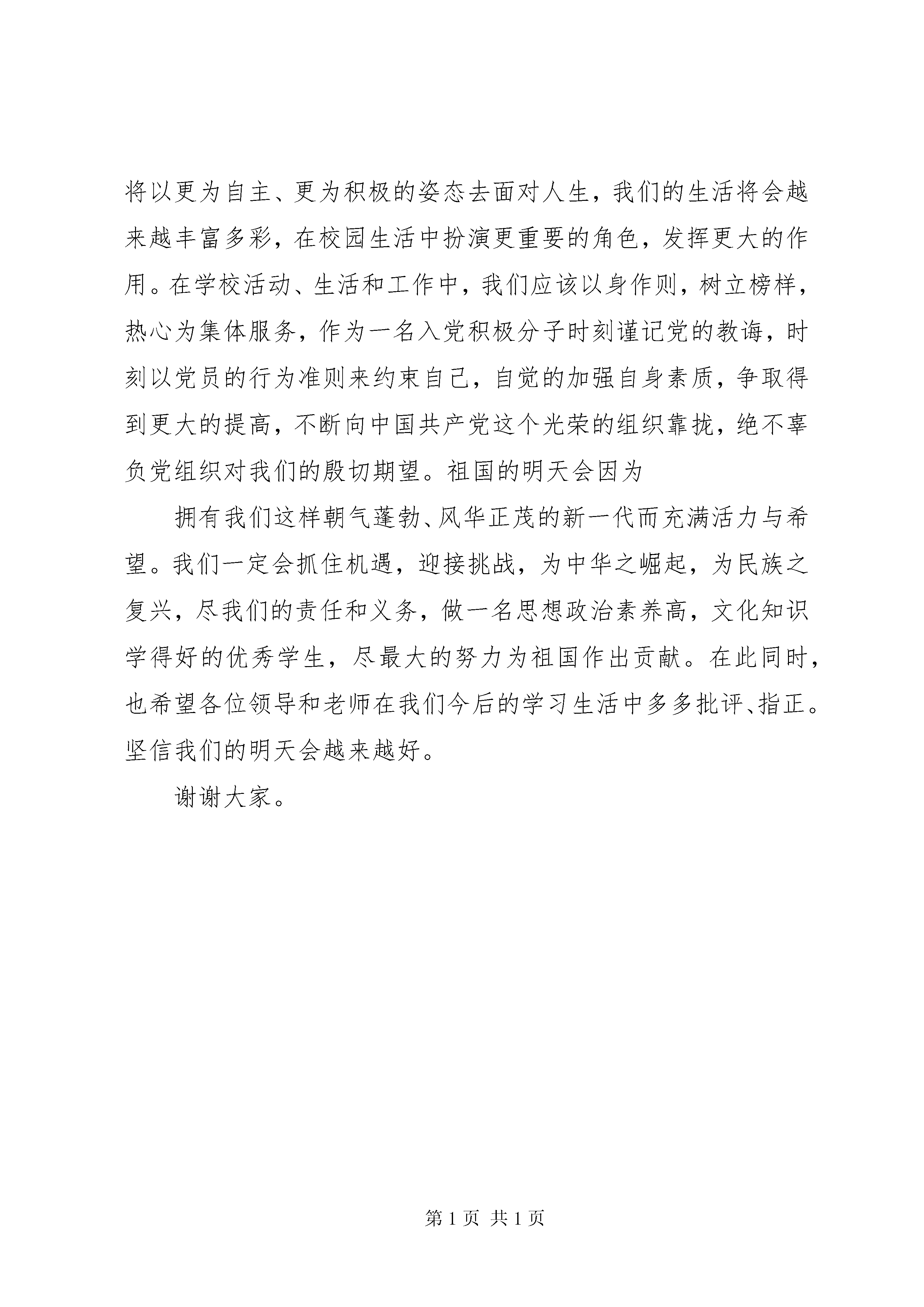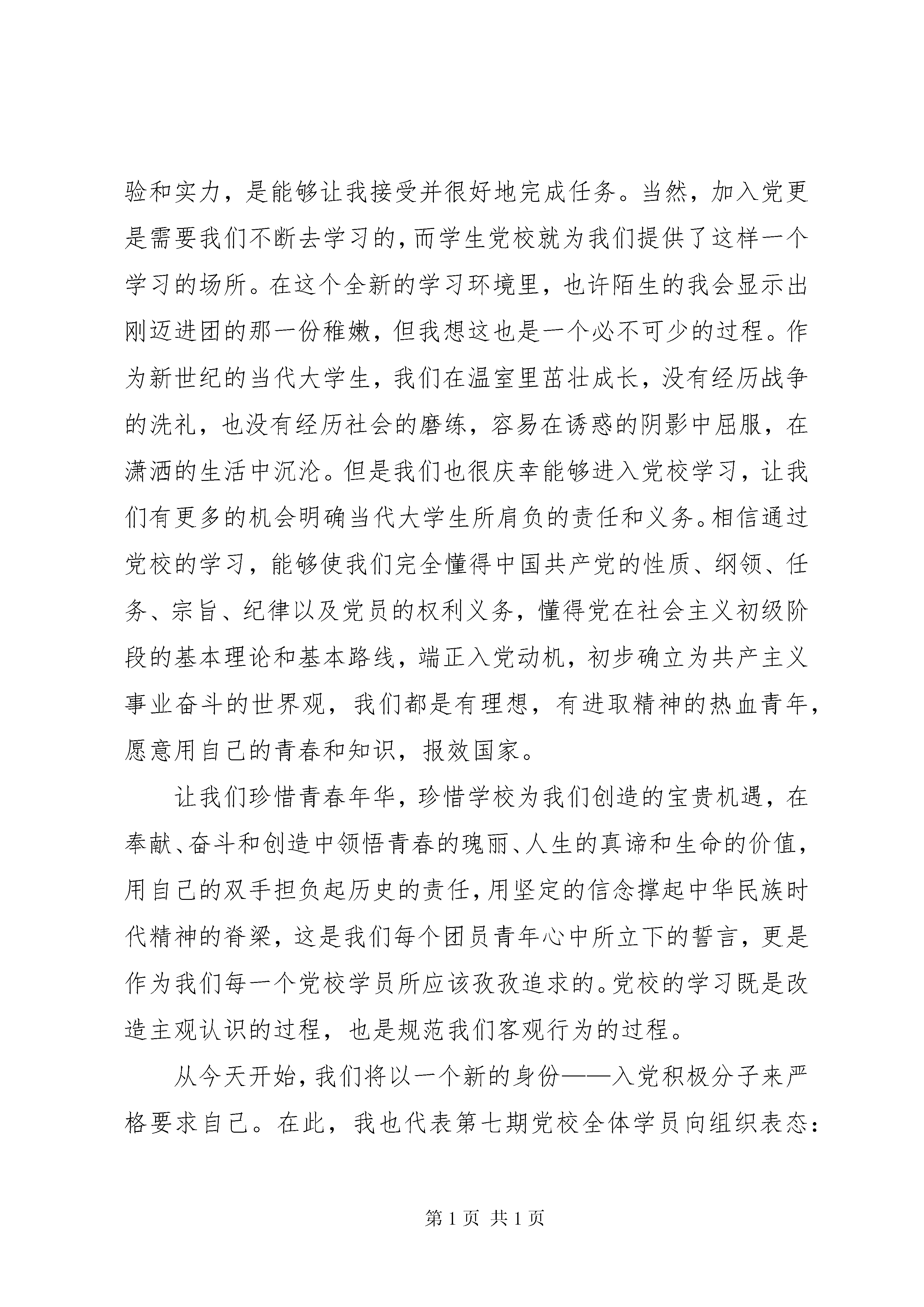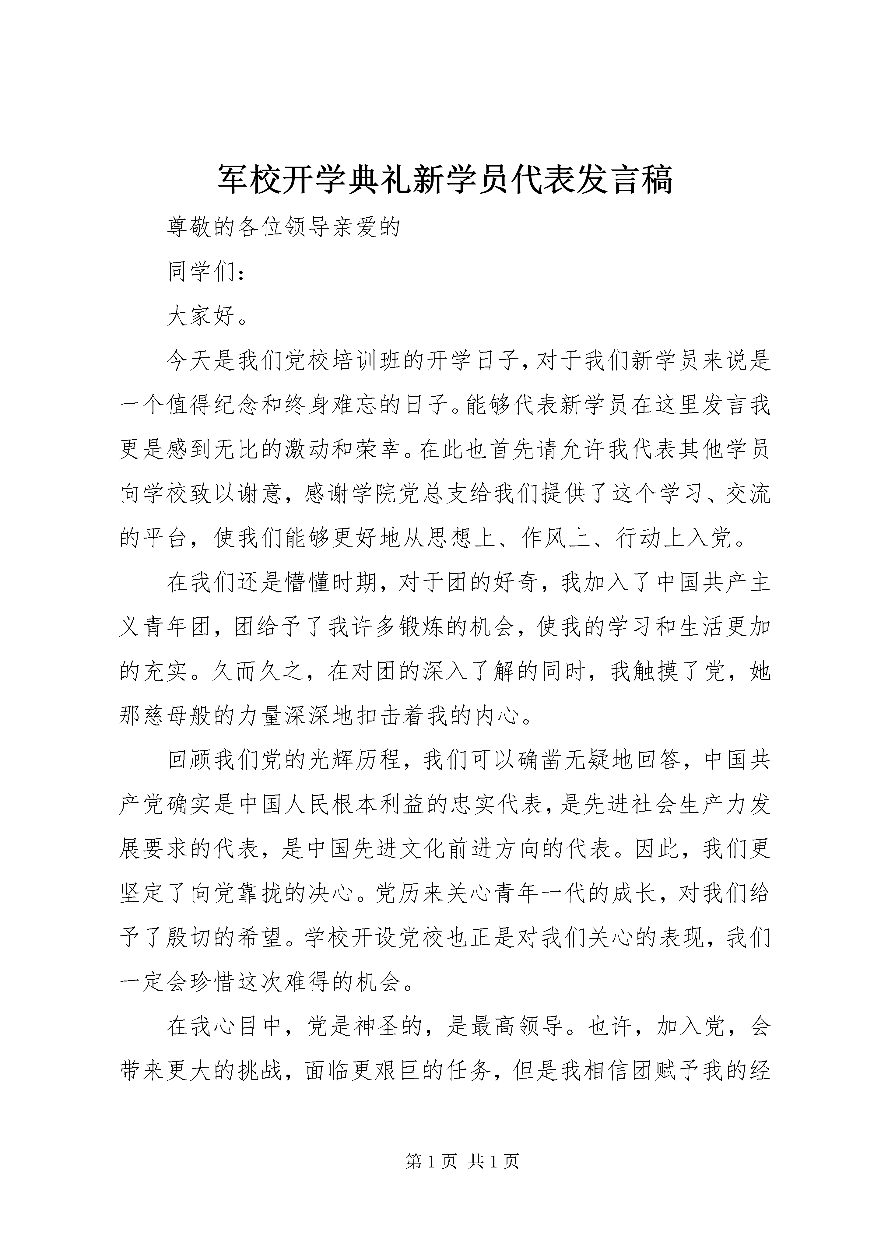 军校开学典礼新学员代表发言稿尊敬的各位领导亲爱的同学们:大家好。今天是我们党校培训班的开学日子,对于我们新学员来说是一个值得纪念和终身难忘的日子。能够代表新学员在这里发言我更是感到无比的激动和荣幸。在此也首先请允许我代表其他学员向学校致以谢意,感谢学院党总支给我们提供了这个学习、交流的平台,使我们能够更好地从思想上、作风上、行动上入党。在我们还是懵懂时期,对于团的好奇,我加入了中国共产主义青年团,团给予了我许多锻炼的机会,使我的学习和生活更加的充实。久而久之,在对团的深入了解的同时,我触摸了党,她那慈母般的力量深深地扣击着我的内心。回顾我们党的光辉历程,我们可以确凿无疑地回答,中国共产党确实是中国人民根本利益的忠实代表,是先进社会生产力发展要求的代表,是中国先进文化前进方向的代表。因此,我们更坚定了向党靠拢的决心。党历来关心青年一代的成长,对我们给予了殷切的希望。学校开设党校也正是对我们关心的表现,我们一定会珍惜这次难得的机会。在我心目中,党是神圣的,是最高领导。也许,加入党,会带来更大的挑战,面临更艰巨的任务,但是我相信团赋予我的经验和实力,是能够让我接受并很好地完成任务。当然,加入党更是需要我们不断去学习的,而学生党校就为我们提供了这样一个学习的场所。在这个全新的学习环境里,也许陌生的我会显示出刚迈进团的那一份稚嫩,但我想这也是一个必不可少的过程。作为新世纪的当代大学生,我们在温室里茁壮成长,没有经历战争的洗礼,也没有经历社会的磨练,容易在诱惑的阴影中屈服,在潇洒的生活中沉沦。但是我们也很庆幸能够进入党校学习,让我们有更多的机会明确当代大学生所肩负的责任和义务。相信通过党校的学习,能够使我们完全懂得中国共产党的性质、纲领、任务、宗旨、纪律以及党员的权利义务,懂得党在社会主义初级阶段的基本理论和基本路线,端正入党动机,初步确立为共产主义事业奋斗的世界观,我们都是有理想,有进取精神的热血青年,愿意用自己的青春和知识,报效国家。让我们珍惜青春年华,珍惜学校为我们创造的宝贵机遇,在奉献、奋斗和创造中领悟青春的瑰丽、人生的真谛和生命的价值,用自己的双手担负起历史的责任,用坚定的信念撑起中华民族时代精神的脊梁,这是我们每个团员青年心中所立下的誓言,更是作为我们每一个党校学员所应该孜孜追求的。党校的学习既是改造主观认识的过程,也是规范我们客观行为的过程。从今天开始,我们将以一个新的身份——入党积极分子来严格要求自己。在此,我也代表第七期党校全体学员向组织表态:将以更为自主、更为积极的姿态去面对人生,我们的生活将会越来越丰富多彩,在校园生活中扮演更重要的角色,发挥更大的作用。在学校活动、生活和工作中,我们应该以身作则,树立榜样,热心为集体服务,作为一名入党积极分子时刻谨记党的教诲,时刻以党员的行为准则来约束自己,自觉的加强自身素质,争取得到更大的提高,不断向中国共产党这个光荣的组织靠拢,绝不辜负党组织对我们的殷切期望。祖国的明天会因为拥有我们这样朝气蓬勃、风华正茂的新一代而充满活力与希望。我们一定会抓住机遇,迎接挑战,为中华之崛起,为民族之复兴,尽我们的责任和义务,做一名思想政治素养高,文化知识学得好的优秀学生,尽最大的努力为祖国作出贡献。在此同时,也希望各位领导和老师在我们今后的学习生活中多多批评、指正。坚信我们的明天会越来越好。谢谢大家。
