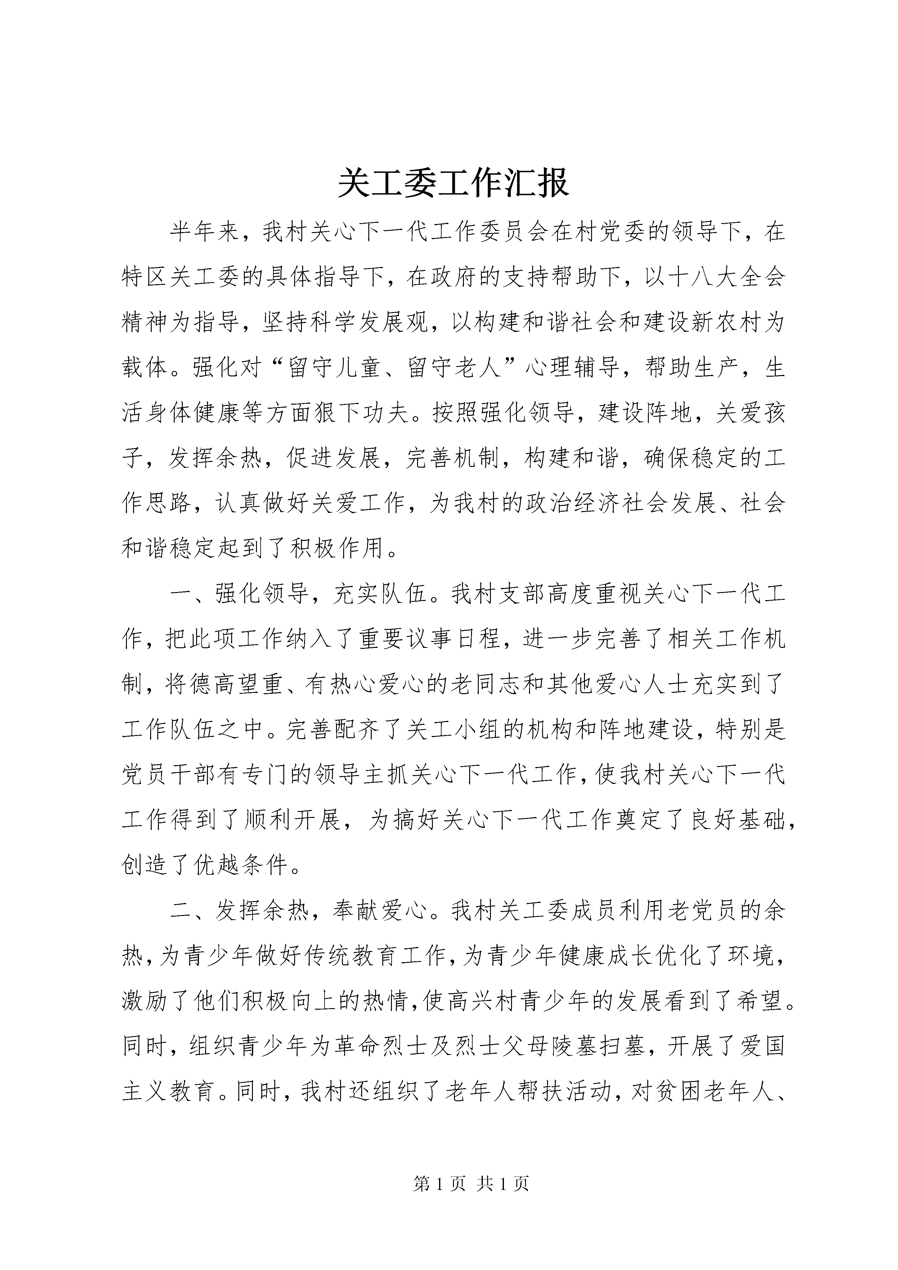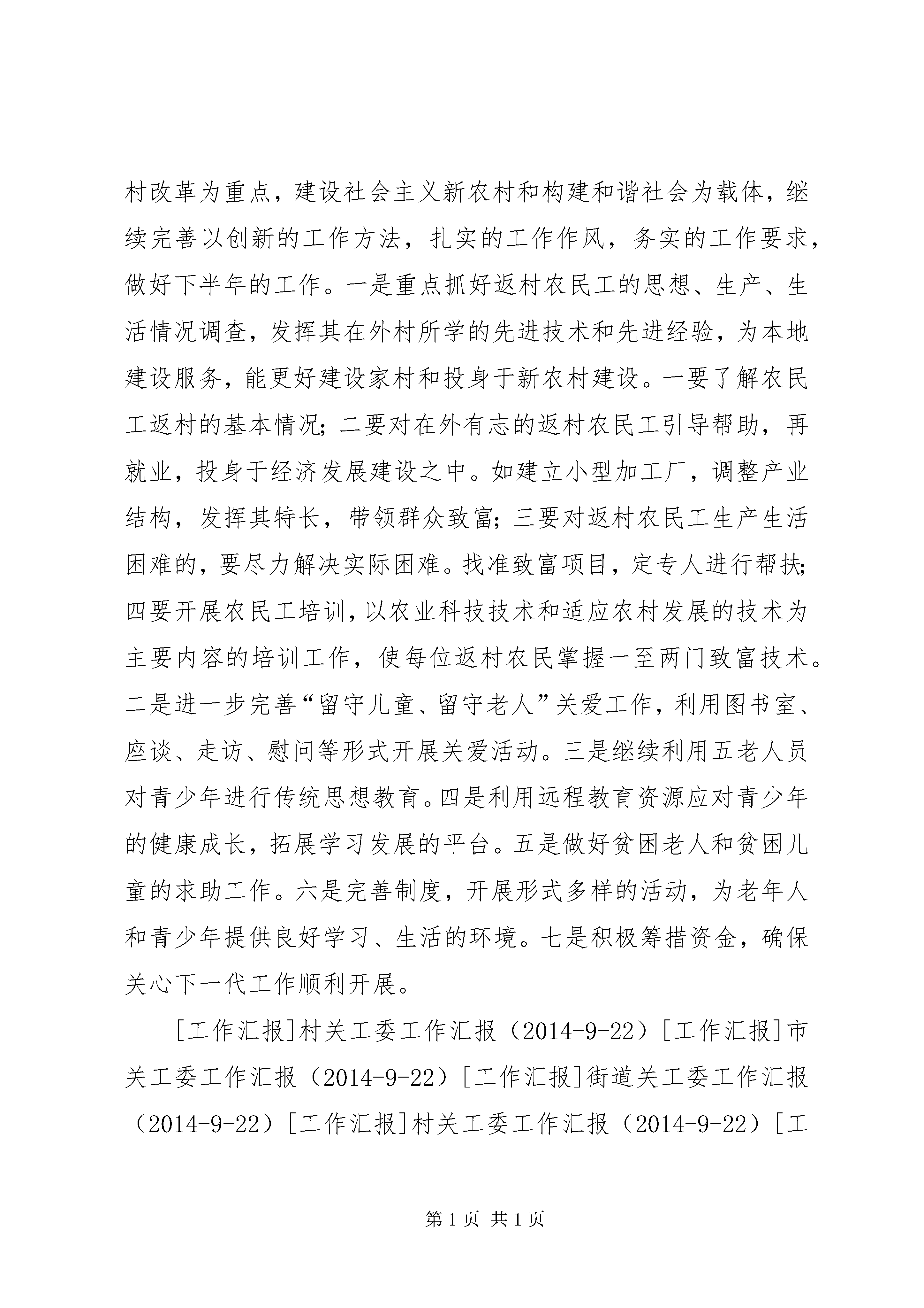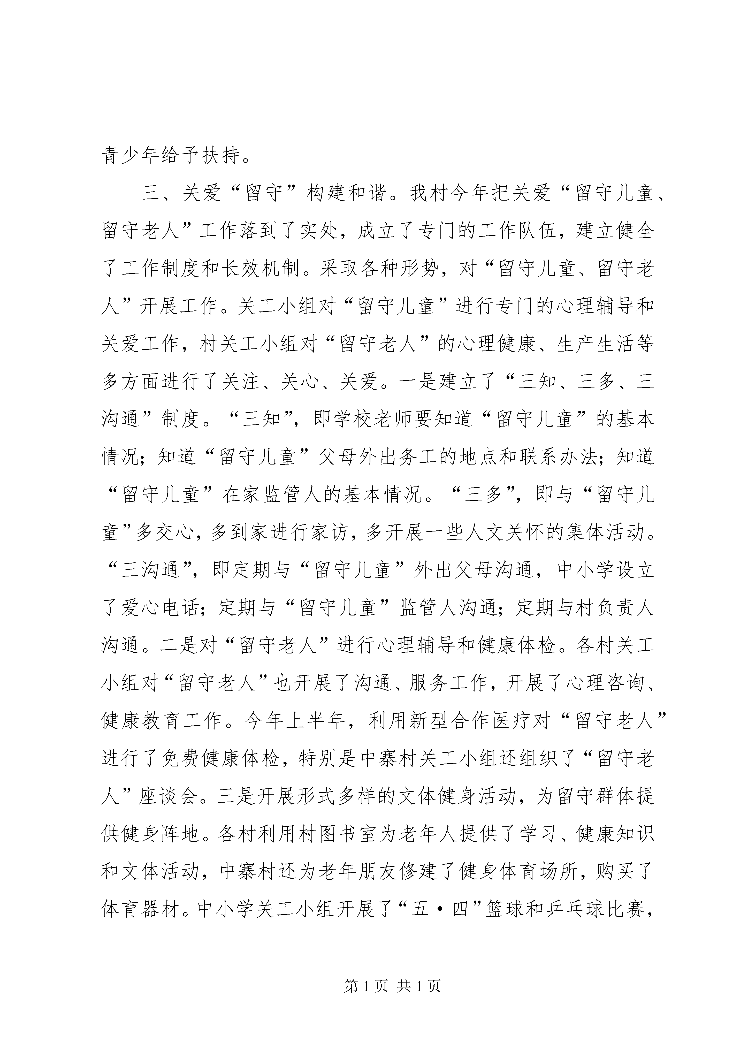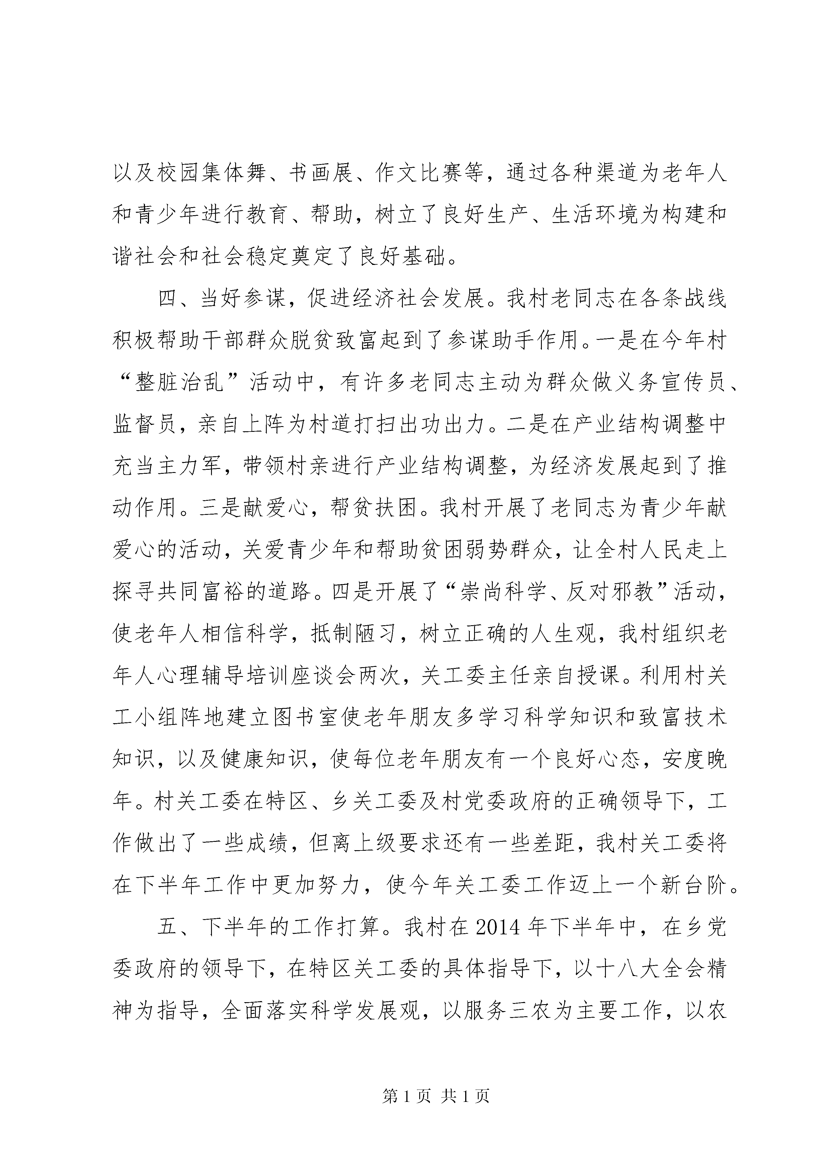 关工委工作汇报半年来,我村关心下一代工作委员会在村党委的领导下,在特区关工委的具体指导下,在政府的支持帮助下,以十八大全会精神为指导,坚持科学发展观,以构建和谐社会和建设新农村为载体。强化对“留守儿童、留守老人”心理辅导,帮助生产,生活身体健康等方面狠下功夫。按照强化领导,建设阵地,关爱孩子,发挥余热,促进发展,完善机制,构建和谐,确保稳定的工作思路,认真做好关爱工作,为我村的政治经济社会发展、社会和谐稳定起到了积极作用。一、强化领导,充实队伍。我村支部高度重视关心下一代工作,把此项工作纳入了重要议事日程,进一步完善了相关工作机制,将德高望重、有热心爱心的老同志和其他爱心人士充实到了工作队伍之中。完善配齐了关工小组的机构和阵地建设,特别是党员干部有专门的领导主抓关心下一代工作,使我村关心下一代工作得到了顺利开展,为搞好关心下一代工作奠定了良好基础,创造了优越条件。二、发挥余热,奉献爱心。我村关工委成员利用老党员的余热,为青少年做好传统教育工作,为青少年健康成长优化了环境,激励了他们积极向上的热情,使高兴村青少年的发展看到了希望。同时,组织青少年为革命烈士及烈士父母陵墓扫墓,开展了爱国主义教育。同时,我村还组织了老年人帮扶活动,对贫困老年人、青少年给予扶持。三、关爱“留守”构建和谐。我村今年把关爱“留守儿童、留守老人”工作落到了实处,成立了专门的工作队伍,建立健全了工作制度和长效机制。采取各种形势,对“留守儿童、留守老人”开展工作。关工小组对“留守儿童”进行专门的心理辅导和关爱工作,村关工小组对“留守老人”的心理健康、生产生活等多方面进行了关注、关心、关爱。一是建立了“三知、三多、三沟通”制度。“三知”,即学校老师要知道“留守儿童”的基本情况;知道“留守儿童”父母外出务工的地点和联系办法;知道“留守儿童”在家监管人的基本情况。“三多”,即与“留守儿童”多交心,多到家进行家访,多开展一些人文关怀的集体活动。“三沟通”,即定期与“留守儿童”外出父母沟通,中小学设立了爱心电话;定期与“留守儿童”监管人沟通;定期与村负责人沟通。二是对“留守老人”进行心理辅导和健康体检。各村关工小组对“留守老人”也开展了沟通、服务工作,开展了心理咨询、健康教育工作。今年上半年,利用新型合作医疗对“留守老人”进行了免费健康体检,特别是中寨村关工小组还组织了“留守老人”座谈会。三是开展形式多样的文体健身活动,为留守群体提供健身阵地。各村利用村图书室为老年人提供了学习、健康知识和文体活动,中寨村还为老年朋友修建了健身体育场所,购买了体育器材。中小学关工小组开展了“五·四”篮球和乒乓球比赛,以及校园集体舞、书画展、作文比赛等,通过各种渠道为老年人和青少年进行教育、帮助,树立了良好生产、生活环境为构建和谐社会和社会稳定奠定了良好基础。四、当好参谋,促进经济社会发展。我村老同志在各条战线积极帮助干部群众脱贫致富起到了参谋助手作用。一是在今年村“整脏治乱”活动中,有许多老同志主动为群众做义务宣传员、监督员,亲自上阵为村道打扫出功出力。二是在产业结构调整中充当主力军,带领村亲进行产业结构调整,为经济发展起到了推动作用。三是献爱心,帮贫扶困。我村开展了老同志为青少年献爱心的活动,关爱青少年和帮助贫困弱势群众,让全村人民走上探寻共同富裕的道路。四是开展了“崇尚科学、反对邪教”活动,使老年人相信科学,抵制陋习,树立正确的人生观,我村组织老年人心理辅导培训座谈会两次,关工委主任亲自授课。利用村关工小组阵地建立图书室使老年朋友多学习科学知识和致富技术知识,以及健康知识,使每位老年朋友有一个良好心态,安度晚年。村关工委在特区、乡关工委及村党委政府的正确领导下,工作做出了一些成绩,但离上级要求还有一些差距,我村关工委将在下半年工作中更加努力,使今年关工委工作迈上一个新台阶。五、下半年的工作打算。我村在2014年下半年中,在乡党委政府的领导下,在特区关工委的具体指导下,以十八大全会精神为指导,全面落实科学发展观,以服务三农为主要工作,以农村改革为重点,建设社会主义新农村和构建和谐社会为载体,继续完善以创新的工作方法,扎实的工作作风,务实的工作要求,做好下半年的工作。一是重点抓好返村农民工的思想、生产、生活情况调查,发挥其在外村所学的先进技术和先进经验,为本地建设服务,能更好建设家村和投身于新农村建设。一要了解农民工返村的基本情况;二要对在外有志的返村农民工引导帮助,再就业,投身于经济发展建设之中。如建立小型加工厂,调整产业结构,发挥其特长,带领群众致富;三要对返村农民工生产生活困难的,要尽力解决实际困难。找准致富项目,定专人进行帮扶;四要开展农民工培训,以农业科技技术和适应农村发展的技术为主要内容的培训工作,使每位返村农民掌握一至两门致富技术。二是进一步完善“