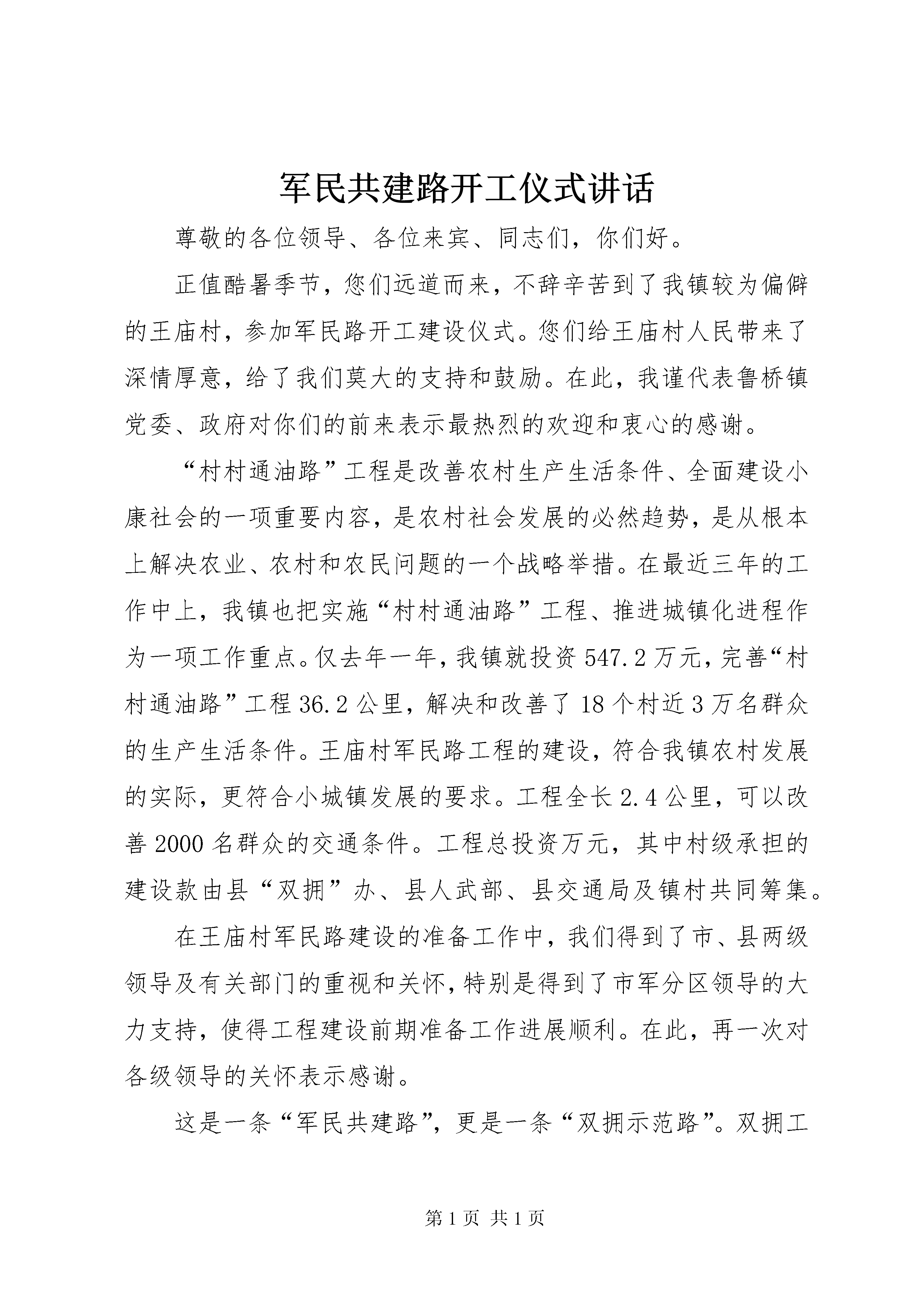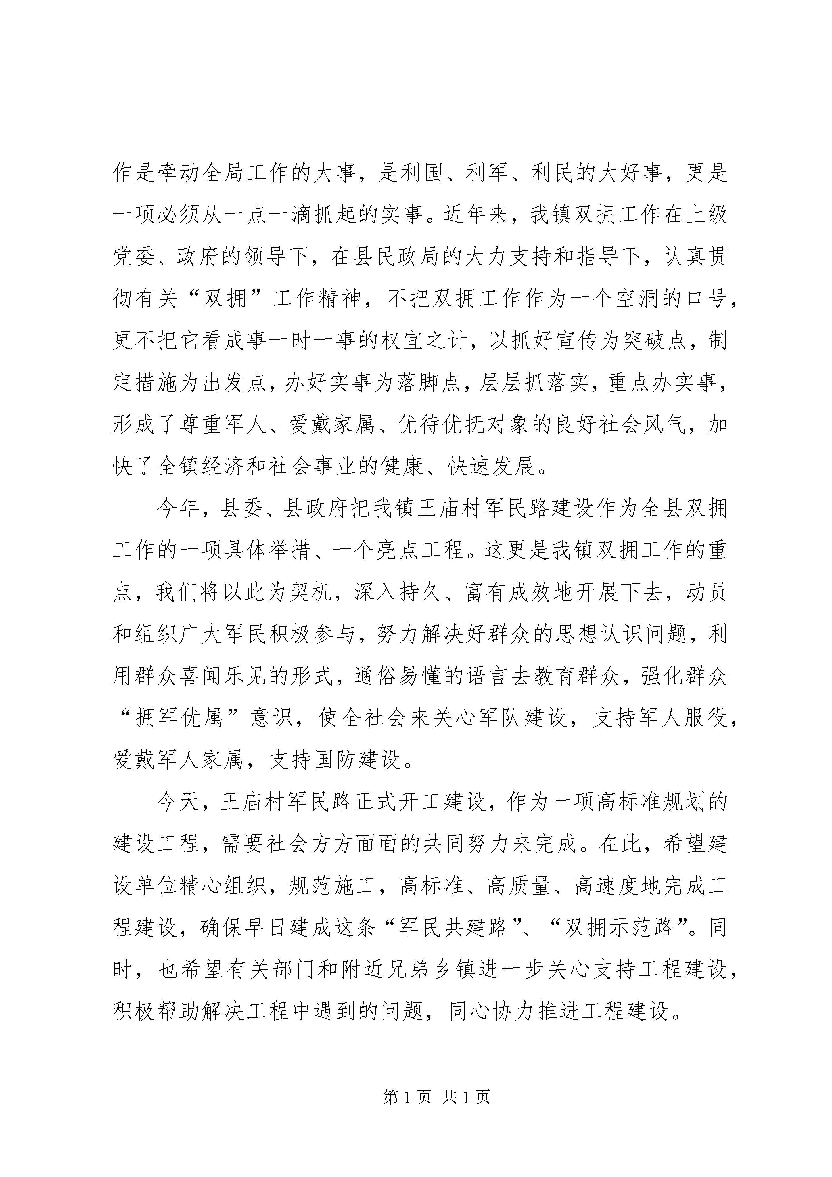军民共建路开工仪式讲话尊敬的各位领导、各位来宾、同志们,你们好。正值酷暑季节,您们远道而来,不辞辛苦到了我镇较为偏僻的王庙村,参加军民路开工建设仪式。您们给王庙村人民带来了深情厚意,给了我们莫大的支持和鼓励。在此,我谨代表鲁桥镇党委、政府对你们的前来表示最热烈的欢迎和衷心的感谢。“村村通油路”工程是改善农村生产生活条件、全面建设小康社会的一项重要内容,是农村社会发展的必然趋势,是从根本上解决农业、农村和农民问题的一个战略举措。在最近三年的工作中上,我镇也把实施“村村通油路”工程、推进城镇化进程作为一项工作重点。仅去年一年,我镇就投资547.2万元,完善“村村通油路”工程36.2公里,解决和改善了18个村近3万名群众的生产生活条件。王庙村军民路工程的建设,符合我镇农村发展的实际,更符合小城镇发展的要求。工程全长2.4公里,可以改善2000名群众的交通条件。工程总投资万元,其中村级承担的建设款由县“双拥”办、县人武部、县交通局及镇村共同筹集。在王庙村军民路建设的准备工作中,我们得到了市、县两级领导及有关部门的重视和关怀,特别是得到了市军分区领导的大力支持,使得工程建设前期准备工作进展顺利。在此,再一次对各级领导的关怀表示感谢。这是一条“军民共建路”,更是一条“双拥示范路”。双拥工作是牵动全局工作的大事,是利国、利军、利民的大好事,更是一项必须从一点一滴抓起的实事。近年来,我镇双拥工作在上级党委、政府的领导下,在县民政局的大力支持和指导下,认真贯彻有关“双拥”工作精神,不把双拥工作作为一个空洞的口号,更不把它看成事一时一事的权宜之计,以抓好宣传为突破点,制定措施为出发点,办好实事为落脚点,层层抓落实,重点办实事,形成了尊重军人、爱戴家属、优待优抚对象的良好社会风气,加快了全镇经济和社会事业的健康、快速发展。今年,县委、县政府把我镇王庙村军民路建设作为全县双拥工作的一项具体举措、一个亮点工程。这更是我镇双拥工作的重点,我们将以此为契机,深入持久、富有成效地开展下去,动员和组织广大军民积极参与,努力解决好群众的思想认识问题,利用群众喜闻乐见的形式,通俗易懂的语言去教育群众,强化群众“拥军优属”意识,使全社会来关心军队建设,支持军人服役,爱戴军人家属,支持国防建设。今天,王庙村军民路正式开工建设,作为一项高标准规划的建设工程,需要社会方方面面的共同努力来完成。在此,希望建设单位精心组织,规范施工,高标准、高质量、高速度地完成工程建设,确保早日建成这条“军民共建路”、“双拥示范路”。同时,也希望有关部门和附近兄弟乡镇进一步关心支持工程建设,积极帮助解决工程中遇到的问题,同心协力推进工程建设。最后,预祝工程建设进展顺利。衷心祝愿各位领导、各位来宾、同志们工作顺利、身体健康、全家幸福。谢谢大家。