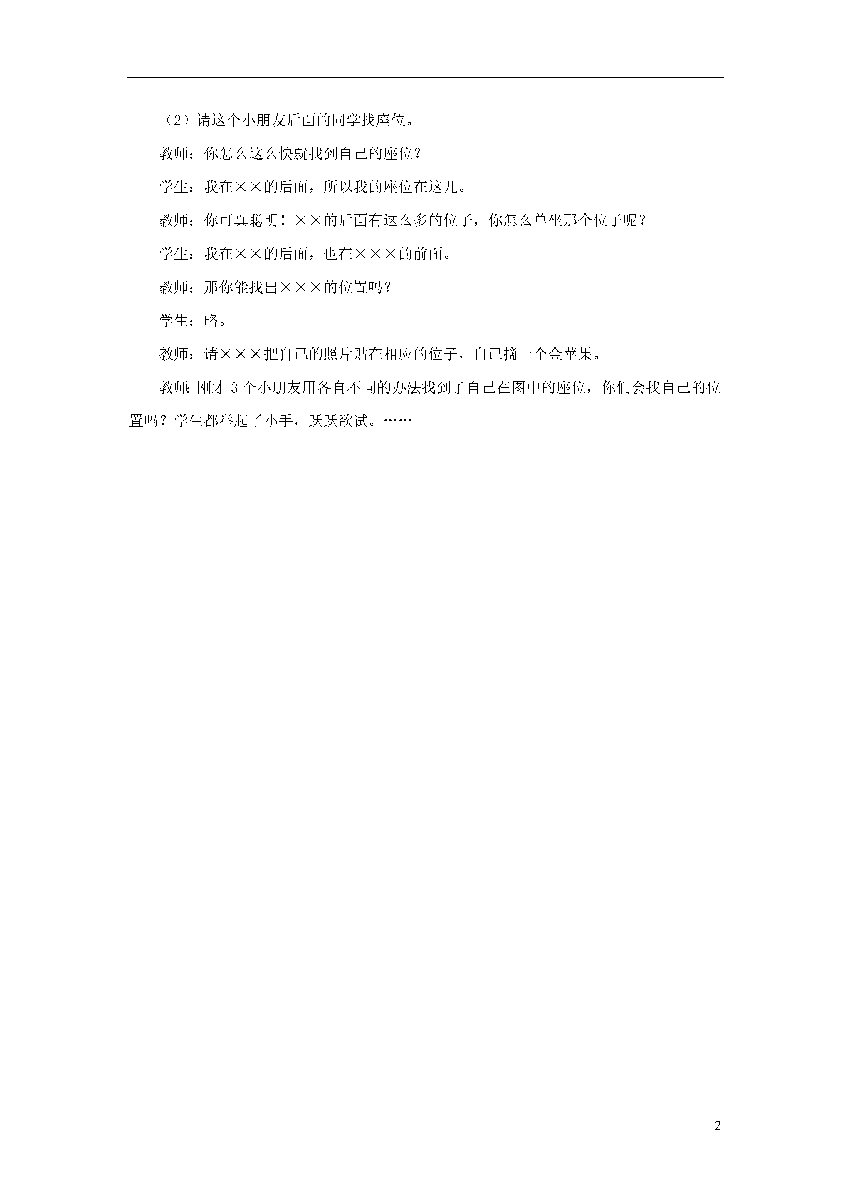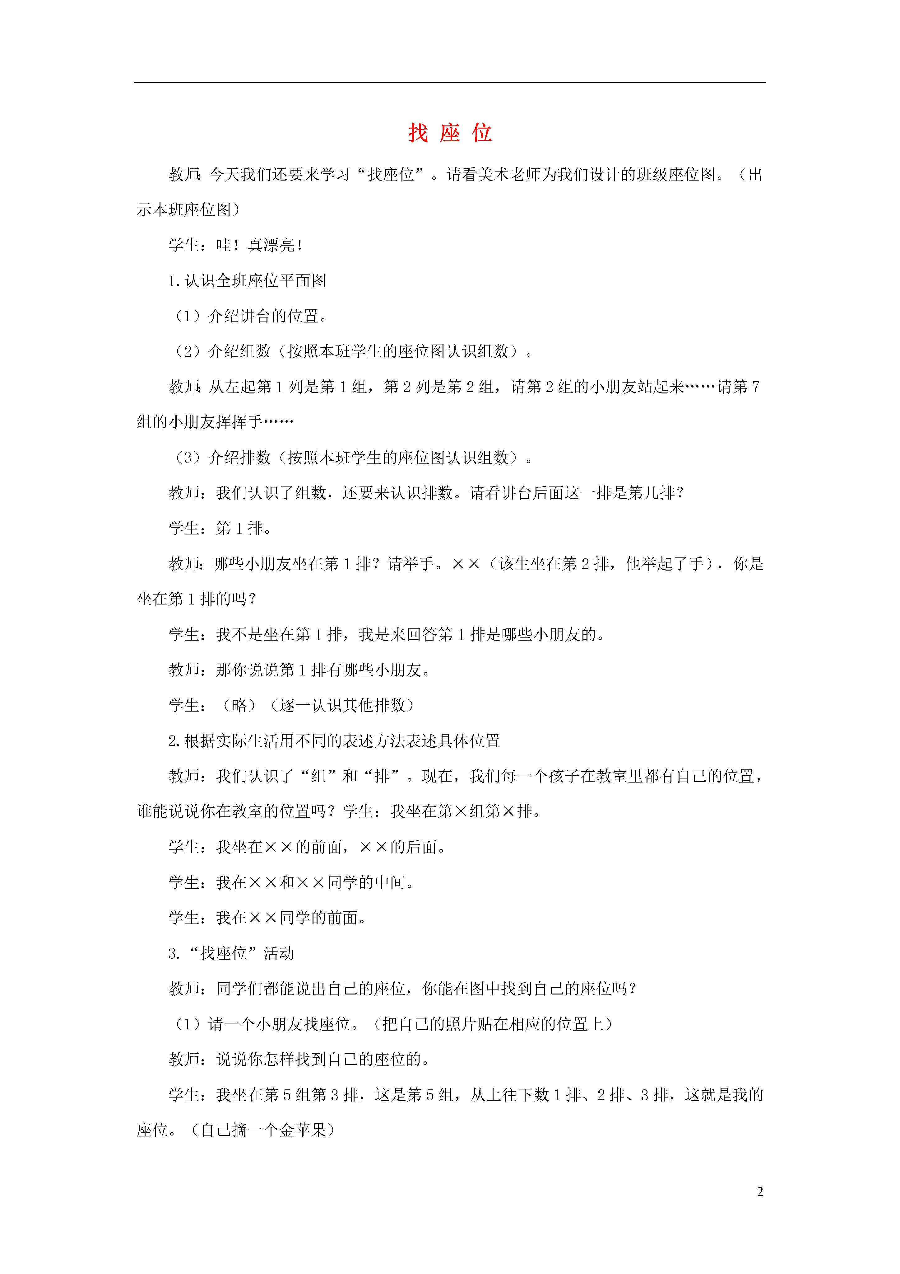 2找座位教师:今天我们还要来学习“找座位”。请看美术老师为我们设计的班级座位图。(出示本班座位图)学生:哇!真漂亮!1.认识全班座位平面图(1)介绍讲台的位置。(2)介绍组数(按照本班学生的座位图认识组数)。教师:从左起第1列是第1组,第2列是第2组,请第2组的小朋友站起来……请第7组的小朋友挥挥手……(3)介绍排数(按照本班学生的座位图认识组数)。教师:我们认识了组数,还要来认识排数。请看讲台后面这一排是第几排?学生:第1排。教师:哪些小朋友坐在第1排?请举手。××(该生坐在第2排,他举起了手),你是坐在第1排的吗?学生:我不是坐在第1排,我是来回答第1排是哪些小朋友的。教师:那你说说第1排有哪些小朋友。学生:(略)(逐一认识其他排数)2.根据实际生活用不同的表述方法表述具体位置教师:我们认识了“组”和“排”。现在,我们每一个孩子在教室里都有自己的位置,谁能说说你在教室的位置吗?学生:我坐在第×组第×排。学生:我坐在××的前面,××的后面。学生:我在××和××同学的中间。学生:我在××同学的前面。3.“找座位”活动教师:同学们都能说出自己的座位,你能在图中找到自己的座位吗?(1)请一个小朋友找座位。(把自己的照片贴在相应的位置上)教师:说说你怎样找到自己的座位的。学生:我坐在第5组第3排,这是第5组,从上往下数1排、2排、3排,这就是我的座位。(自己摘一个金苹果)(2)请这个小朋友后面的同学找座位。教师:你怎么这么快就找到自己的座位?学生:我在××的后面,所以我的座位在这儿。教师:你可真聪明!××的后面有这么多的位子,你怎么单坐那个位子呢?学生:我在××的后面,也在×××的前面。教师:那你能找出×××的位置吗?学生:略。教师:请×××把自己的照片贴在相应的位子,自己摘一个金苹果。教师:刚才3个小朋友用各自不同的办法找到了自己在图中的座位,你们会找自己的位置吗?学生都举起了小手,跃跃欲试。……