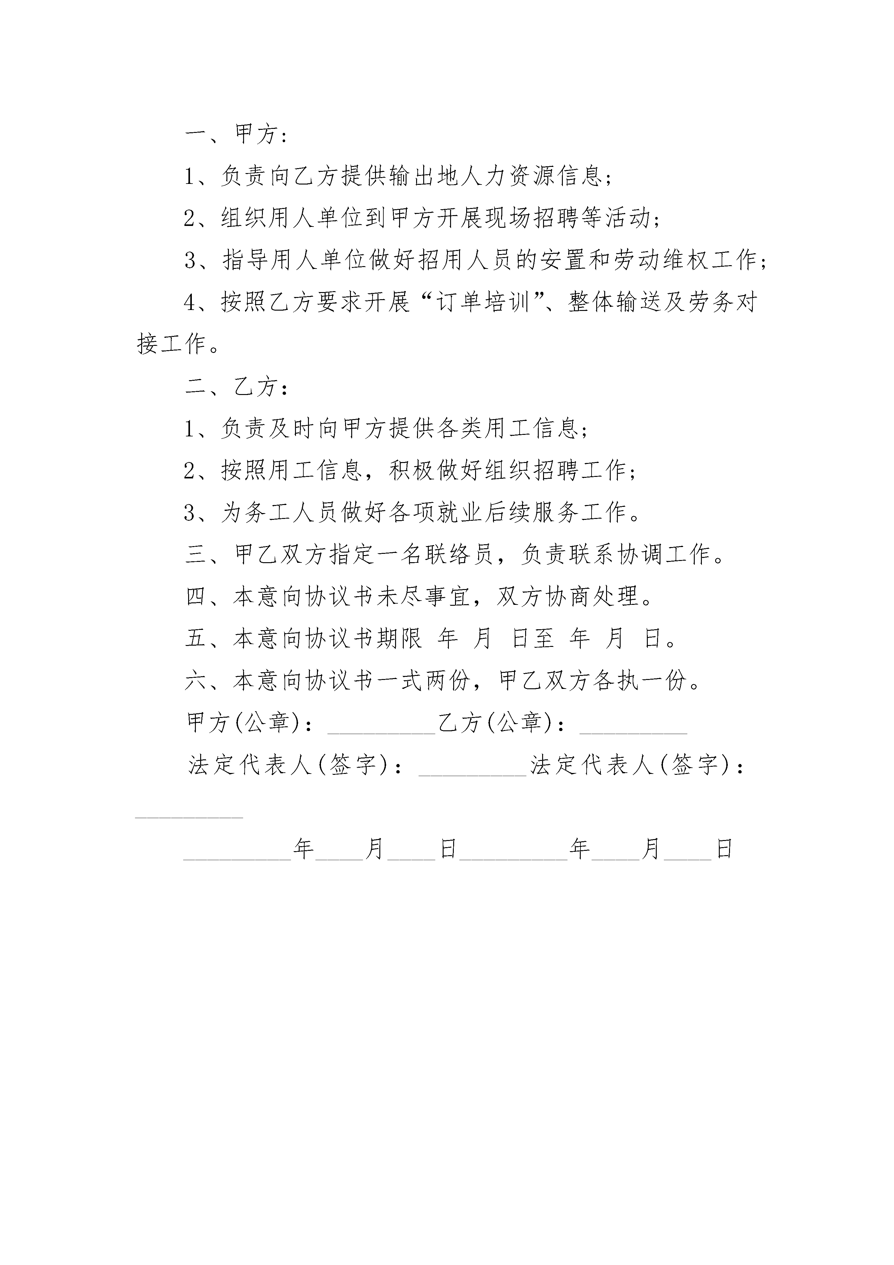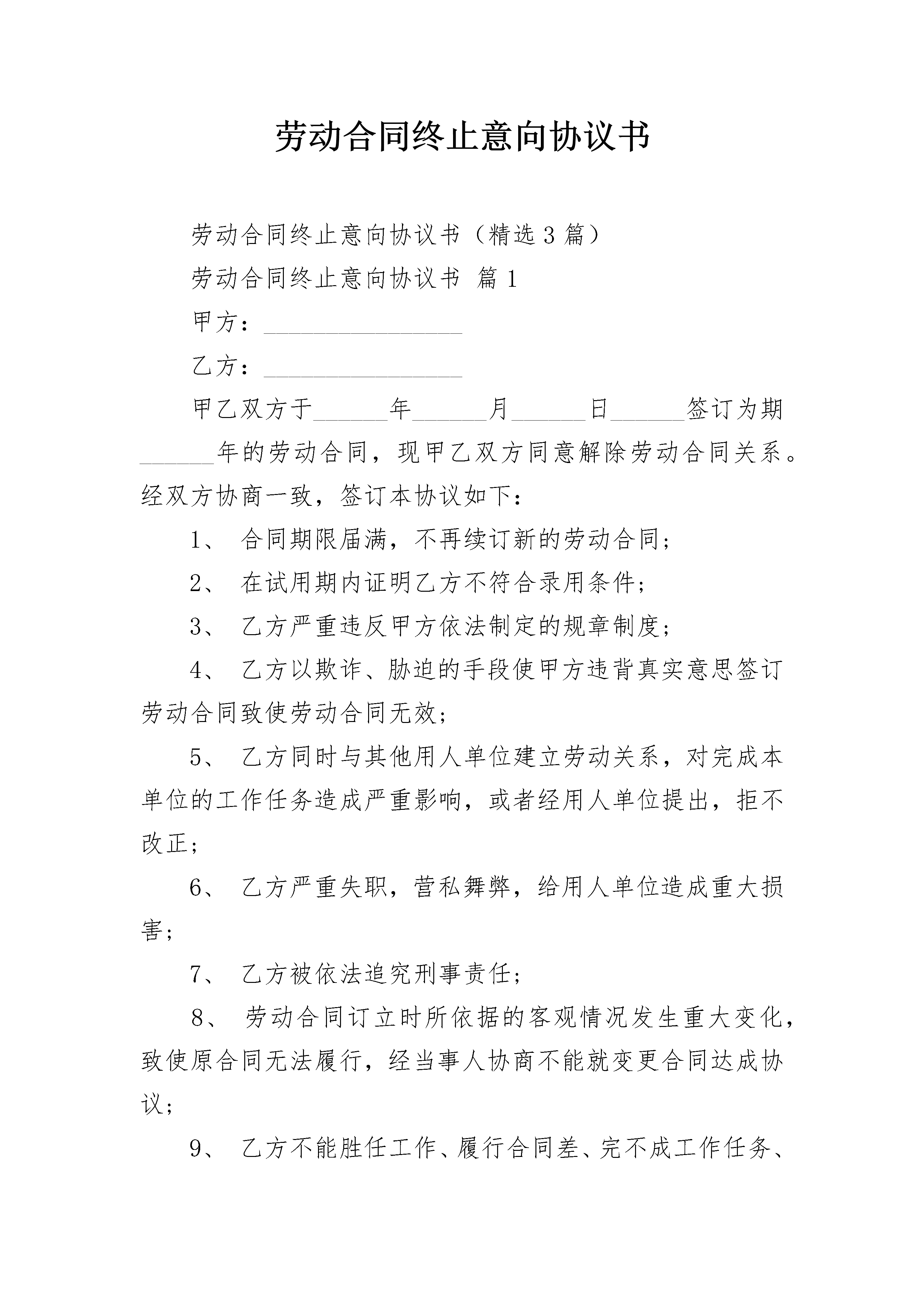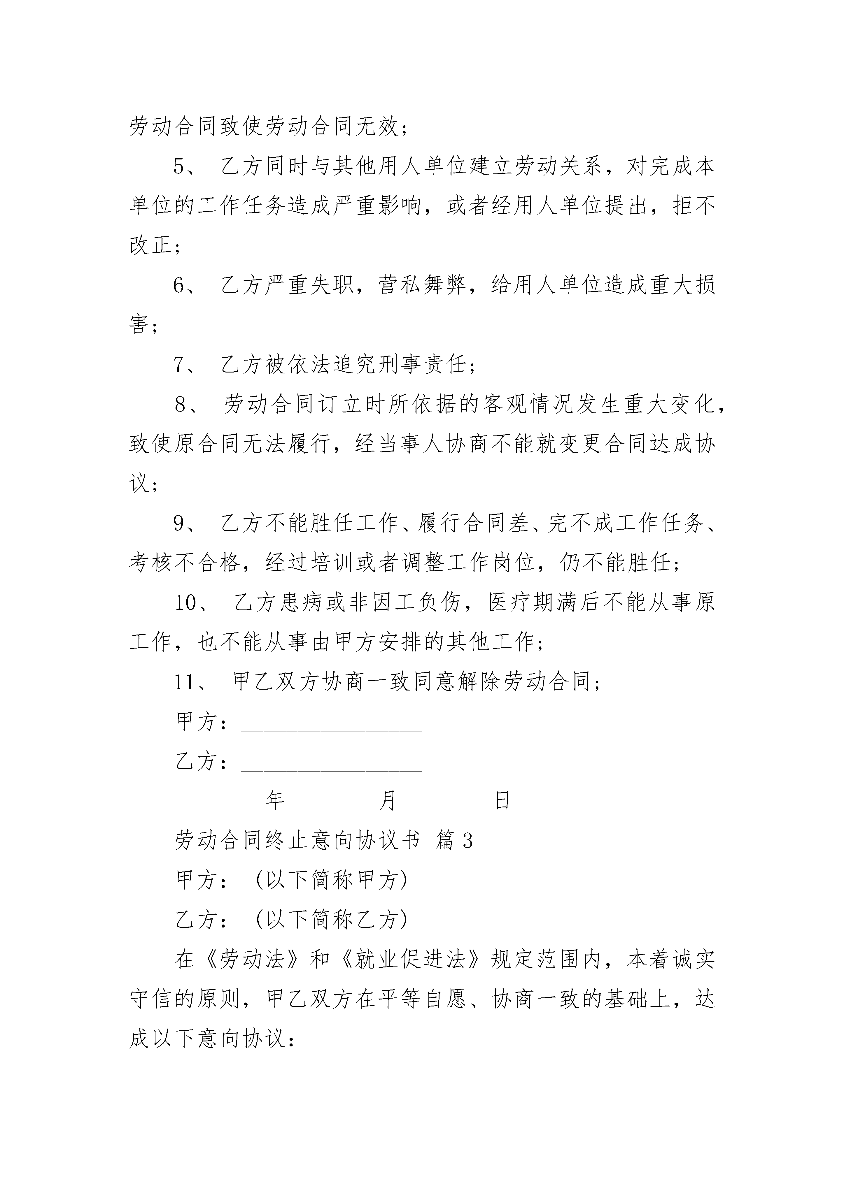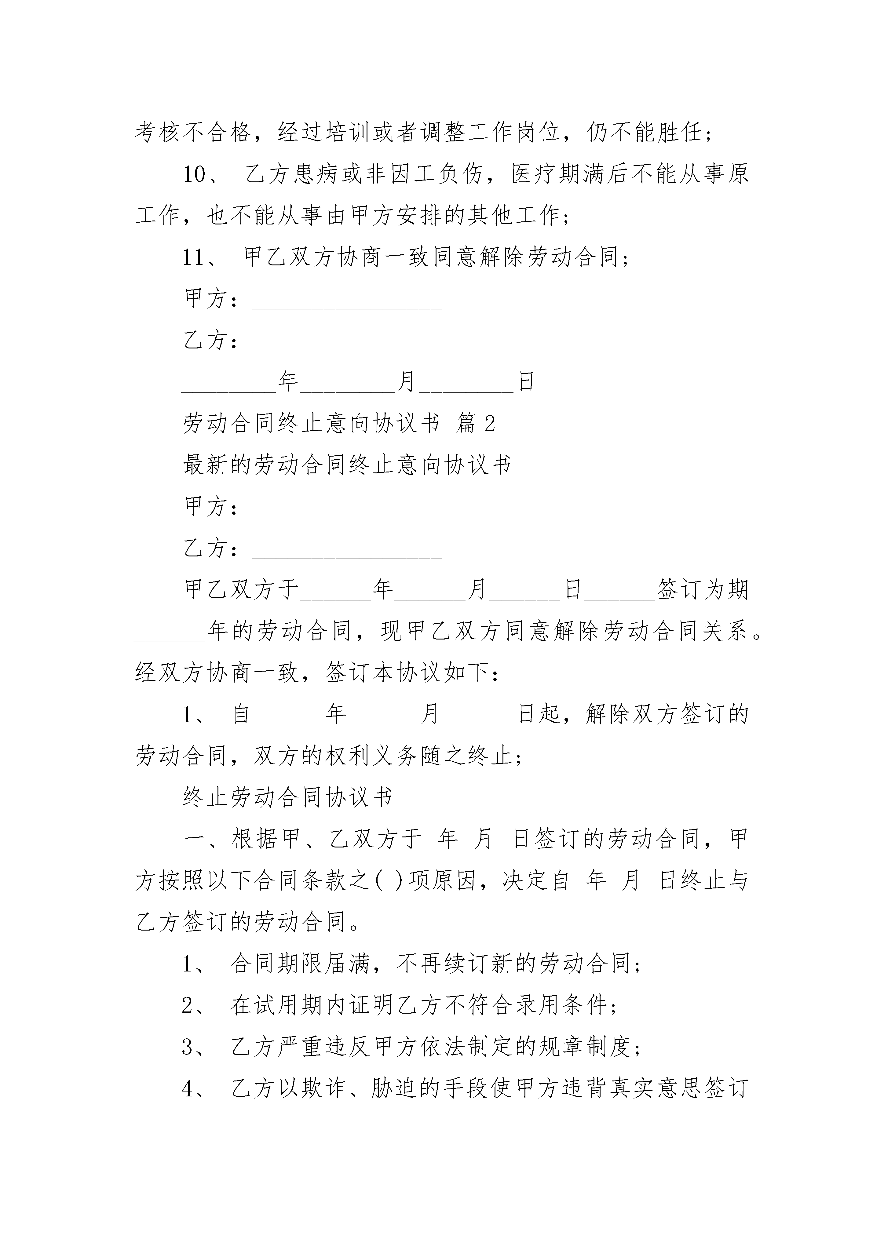 劳动合同终止意向协议书劳动合同终止意向协议书(精选3篇)劳动合同终止意向协议书篇1甲方:________________乙方:________________甲乙双方于______年______月______日______签订为期______年的劳动合同,现甲乙双方同意解除劳动合同关系。经双方协商一致,签订本协议如下:1、合同期限届满,不再续订新的劳动合同;2、在试用期内证明乙方不符合录用条件;3、乙方严重违反甲方依法制定的规章制度;4、乙方以欺诈、胁迫的手段使甲方违背真实意思签订劳动合同致使劳动合同无效;5、乙方同时与其他用人单位建立劳动关系,对完成本单位的工作任务造成严重影响,或者经用人单位提出,拒不改正;6、乙方严重失职,营私舞弊,给用人单位造成重大损害;7、乙方被依法追究刑事责任;8、劳动合同订立时所依据的客观情况发生重大变化,致使原合同无法履行,经当事人协商不能就变更合同达成协议;9、乙方不能胜任工作、履行合同差、完不成工作任务、考核不合格,经过培训或者调整工作岗位,仍不能胜任;10、乙方患病或非因工负伤,医疗期满后不能从事原工作,也不能从事由甲方安排的其他工作;11、甲乙双方协商一致同意解除劳动合同;甲方:________________乙方:________________________年________月________日劳动合同终止意向协议书篇2最新的劳动合同终止意向协议书甲方:________________乙方:________________甲乙双方于______年______月______日______签订为期______年的劳动合同,现甲乙双方同意解除劳动合同关系。经双方协商一致,签订本协议如下:1、自______年______月______日起,解除双方签订的劳动合同,双方的权利义务随之终止;终止劳动合同协议书一、根据甲、乙双方于年月日签订的劳动合同,甲方按照以下合同条款之()项原因,决定自年月日终止与乙方签订的劳动合同。1、合同期限届满,不再续订新的劳动合同;2、在试用期内证明乙方不符合录用条件;3、乙方严重违反甲方依法制定的规章制度;4、乙方以欺诈、胁迫的手段使甲方违背真实意思签订劳动合同致使劳动合同无效;5、乙方同时与其他用人单位建立劳动关系,对完成本单位的工作任务造成严重影响,或者经用人单位提出,拒不改正;6、乙方严重失职,营私舞弊,给用人单位造成重大损害;7、乙方被依法追究刑事责任;8、劳动合同订立时所依据的客观情况发生重大变化,致使原合同无法履行,经当事人协商不能就变更合同达成协议;9、乙方不能胜任工作、履行合同差、完不成工作任务、考核不合格,经过培训或者调整工作岗位,仍不能胜任;10、乙方患病或非因工负伤,医疗期满后不能从事原工作,也不能从事由甲方安排的其他工作;11、甲乙双方协商一致同意解除劳动合同;甲方:________________乙方:________________________年________月________日劳动合同终止意向协议书篇3甲方:(以下简称甲方)乙方:(以下简称乙方)在《劳动法》和《就业促进法》规定范围内,本着诚实守信的原则,甲乙双方在平等自愿、协商一致的基础上,达成以下意向协议:一、甲方:1、负责向乙方提供输出地人力资源信息;2、组织用人单位到甲方开展现场招聘等活动;3、指导用人单位做好招用人员的安置和劳动维权工作;4、按照乙方要求开展“订单培训”、整体输送及劳务对接工作。二、乙方:1、负责及时向甲方提供各类用工信息;2、按照用工信息,积极做好组织招聘工作;3、为务工人员做好各项就业后续服务工作。三、甲乙双方指定一名联络员,负责联系协调工作。四、本意向协议书未尽事宜,双方协商处理。五、本意向协议书期限年月日至年月日。六、本意向协议书一式两份,甲乙双方各执一份。甲方(公章):_________乙方(公章):_________法定代表人(签字):_________法定代表人(签字):__________________年____月____日_________年____月____日