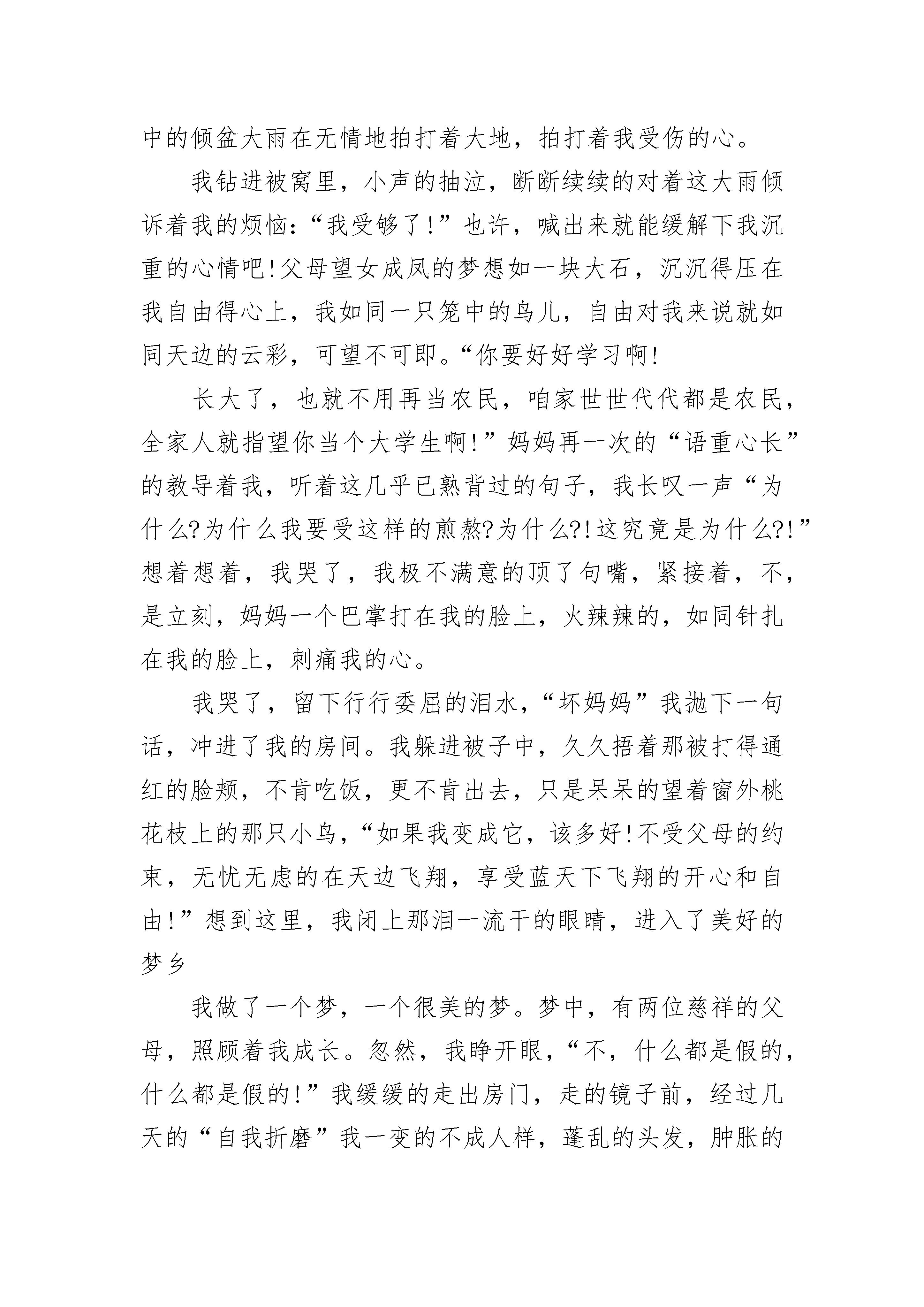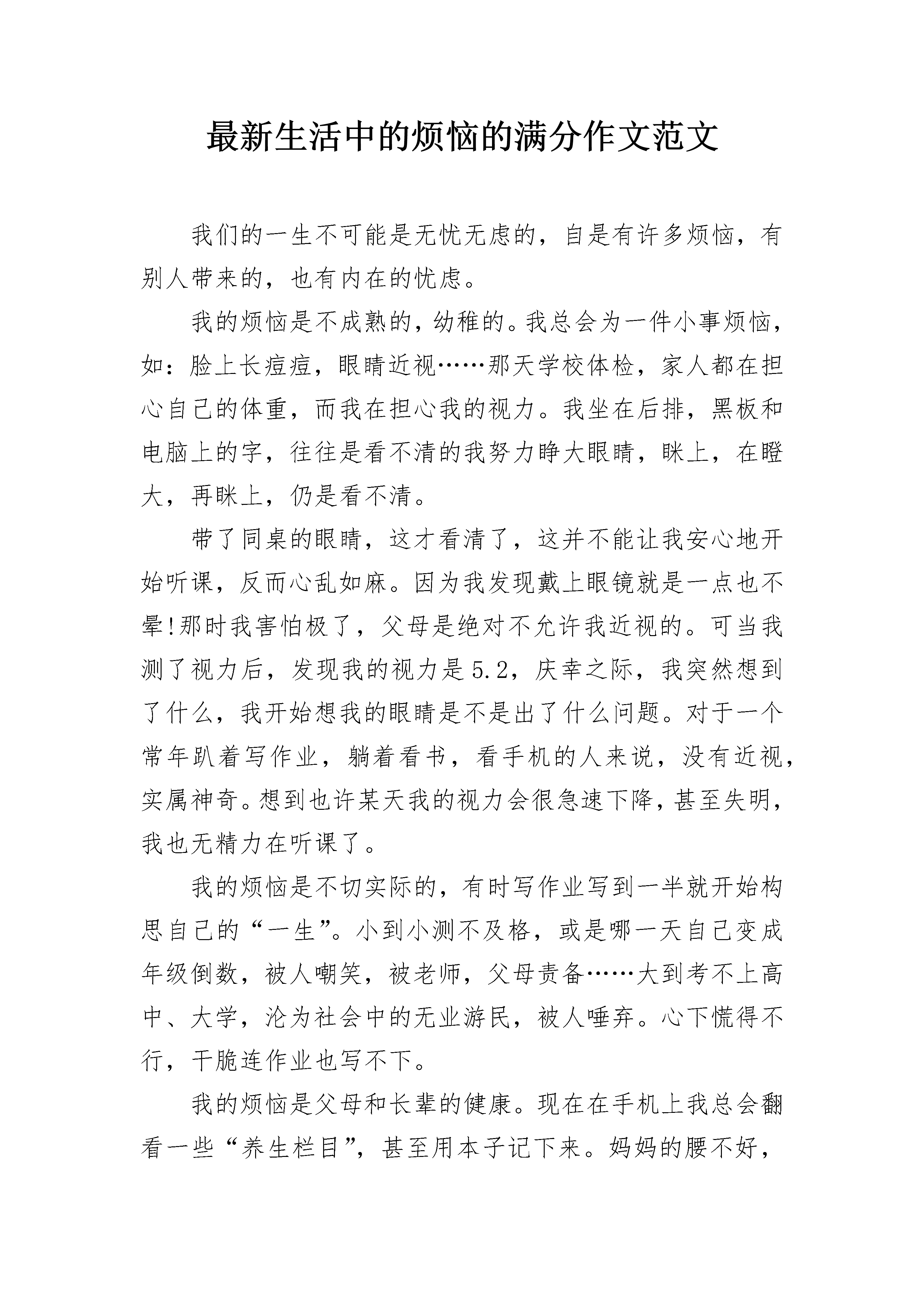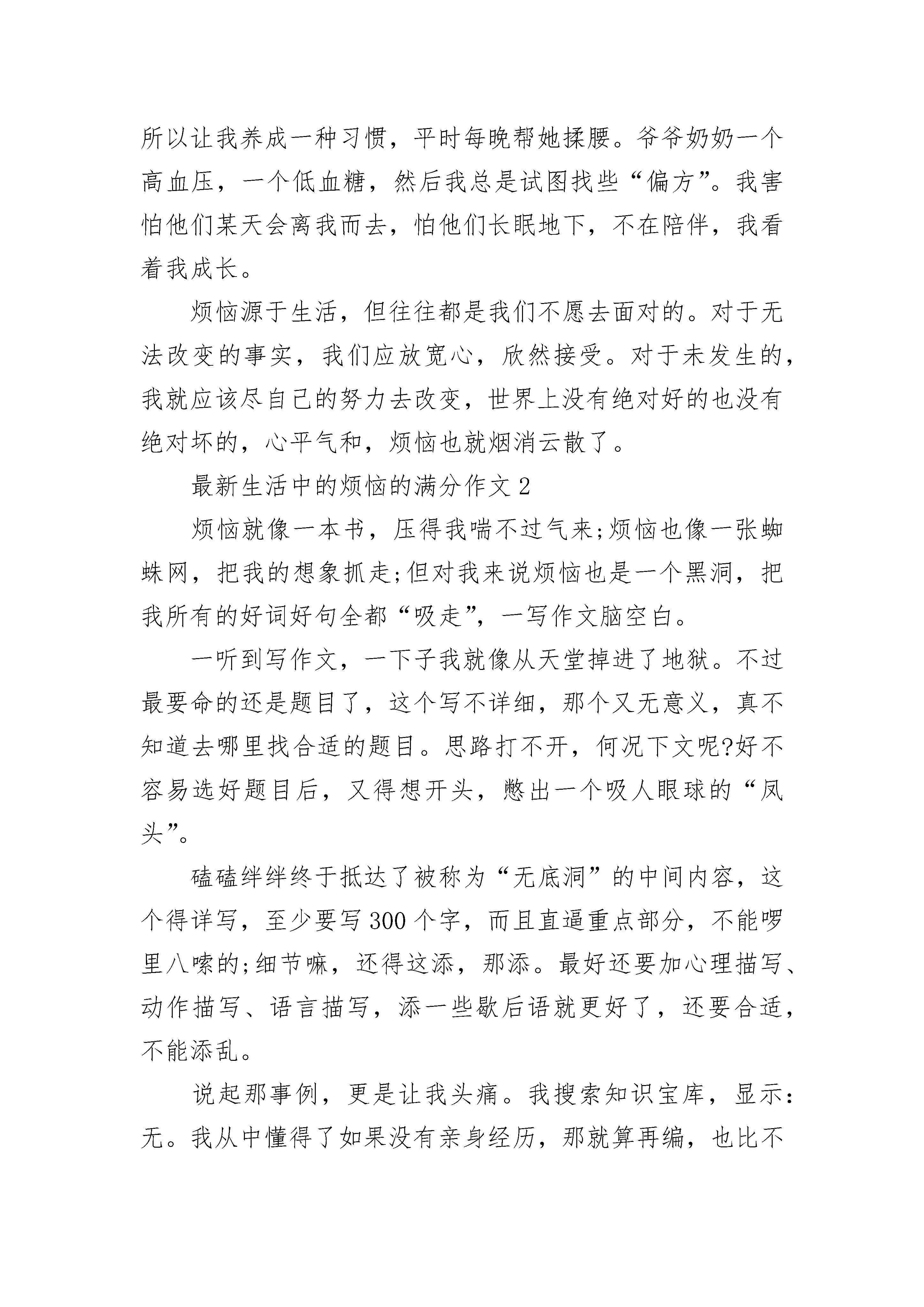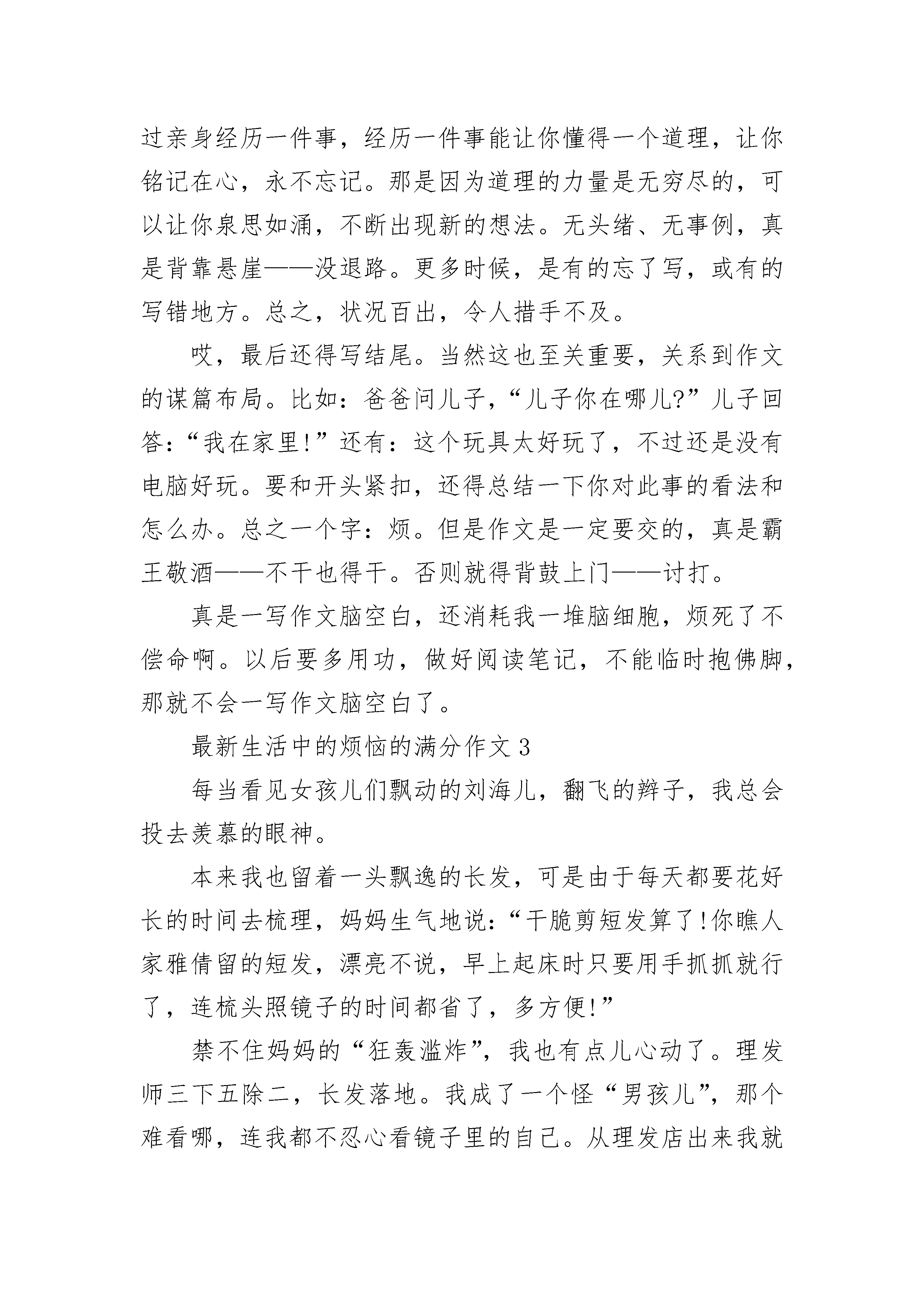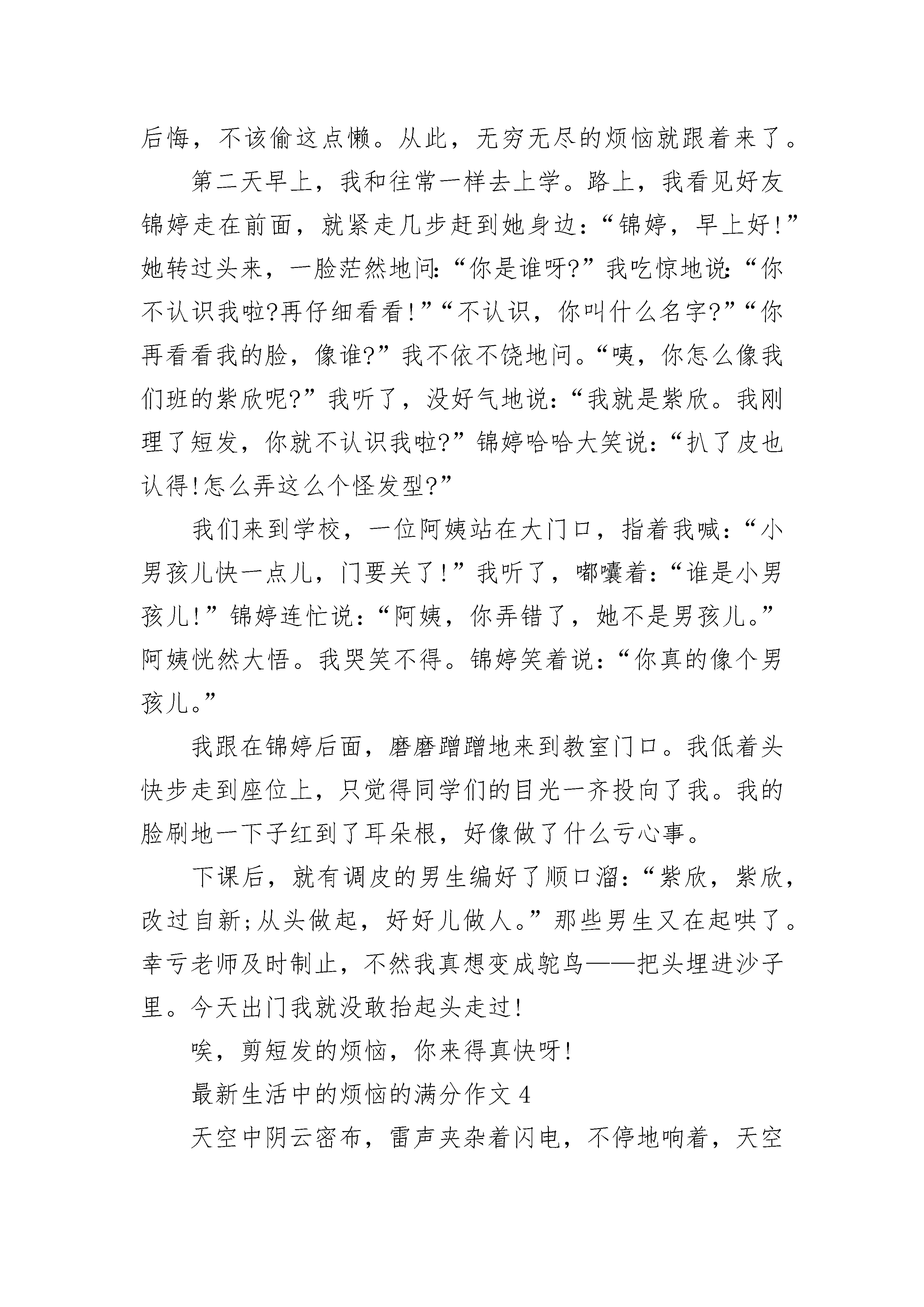 最新生活中的烦恼的满分作文范文我们的一生不可能是无忧无虑的,自是有许多烦恼,有别人带来的,也有内在的忧虑。我的烦恼是不成熟的,幼稚的。我总会为一件小事烦恼,如:脸上长痘痘,眼睛近视……那天学校体检,家人都在担心自己的体重,而我在担心我的视力。我坐在后排,黑板和电脑上的字,往往是看不清的我努力睁大眼睛,眯上,在瞪大,再眯上,仍是看不清。带了同桌的眼睛,这才看清了,这并不能让我安心地开始听课,反而心乱如麻。因为我发现戴上眼镜就是一点也不晕!那时我害怕极了,父母是绝对不允许我近视的。可当我测了视力后,发现我的视力是5.2,庆幸之际,我突然想到了什么,我开始想我的眼睛是不是出了什么问题。对于一个常年趴着写作业,躺着看书,看手机的人来说,没有近视,实属神奇。想到也许某天我的视力会很急速下降,甚至失明,我也无精力在听课了。我的烦恼是不切实际的,有时写作业写到一半就开始构思自己的“一生”。小到小测不及格,或是哪一天自己变成年级倒数,被人嘲笑,被老师,父母责备……大到考不上高中、大学,沦为社会中的无业游民,被人唾弃。心下慌得不行,干脆连作业也写不下。我的烦恼是父母和长辈的健康。现在在手机上我总会翻看一些“养生栏目”,甚至用本子记下来。妈妈的腰不好,所以让我养成一种习惯,平时每晚帮她揉腰。爷爷奶奶一个高血压,一个低血糖,然后我总是试图找些“偏方”。我害怕他们某天会离我而去,怕他们长眠地下,不在陪伴,我看着我成长。烦恼源于生活,但往往都是我们不愿去面对的。对于无法改变的事实,我们应放宽心,欣然接受。对于未发生的,我就应该尽自己的努力去改变,世界上没有绝对好的也没有绝对坏的,心平气和,烦恼也就烟消云散了。最新生活中的烦恼的满分作文2烦恼就像一本书,压得我喘不过气来;烦恼也像一张蜘蛛网,把我的想象抓走;但对我来说烦恼也是一个黑洞,把我所有的好词好句全都“吸走”,一写作文脑空白。一听到写作文,一下子我就像从天堂掉进了地狱。不过最要命的还是题目了,这个写不详细,那个又无意义,真不知道去哪里找合适的题目。思路打不开,何况下文呢?好不容易选好题目后,又得想开头,憋出一个吸人眼球的“凤头”。磕磕绊绊终于抵达了被称为“无底洞”的中间内容,这个得详写,至少要写300个字,而且直逼重点部分,不能啰里八嗦的;细节嘛,还得这添,那添。最好还要加心理描写、动作描写、语言描写,添一些歇后语就更好了,还要合适,不能添乱。说起那事例,更是让我头痛。我搜索知识宝库,显示:无。我从中懂得了如果没有亲身经历,那就算再编,也比不过亲身经历一件事,经历一件事能让你懂得一个道理,让你铭记在心,永不忘记。那是因为道理的力量是无穷尽的,可以让你泉思如涌,不断出现新的想法。无头绪、无事例,真是背靠悬崖——没退路。更多时候,是有的忘了写,或有的写错地方。总之,状况百出,令人措手不及。哎,最后还得写结尾。当然这也至关重要,关系到作文的谋篇布局。比如:爸爸问儿子,“儿子你在哪儿?”儿子回答:“我在家里!”还有:这个玩具太好玩了,不过还是没有电脑好玩。要和开头紧扣,还得总结一下你对此事的看法和怎么办。总之一个字:烦。但是作文是一定要交的,真是霸王敬酒——不干也得干。否则就得背鼓上门——讨打。真是一写作文脑空白,还消耗我一堆脑细胞,烦死了不偿命啊。以后要多用功,做好阅读笔记,不能临时抱佛脚,那就不会一写作文脑空白了。最新生活中的烦恼的满分作文3每当看见女孩儿们飘动的刘海儿,翻飞的辫子,我总会投去羡慕的眼神。本来我也留着一头飘逸的长发,可是由于每天都要花好长的时间去梳理,妈妈生气地说:“干脆剪短发算了!你瞧人家雅倩留的短发,漂亮不说,早上起床时只要用手抓抓就行了,连梳头照镜子的时间都省了,多方便!”禁不住妈妈的“狂轰滥炸”,我也有点儿心动了。理发师三下五除二,长发落地。我成了一个怪“男孩儿”,那个难看哪,连我都不忍心看镜子里的自己。从理发店出来我就后悔,不该偷这点懒。从此,无穷无尽的烦恼就跟着来了。第二天早上,我和往常一样去上学。路上,我看见好友锦婷走在前面,就紧走几步赶到她身边:“锦婷,早上好!”她转过头来,一脸茫然地问:“你是谁呀?”我吃惊地说:“你不认识我啦?再仔细看看!”“不认识,你叫什么名字?”“你再看看我的脸,像谁?”我不依不饶地问。“咦,你怎么像我们班的紫欣呢?”我听了,没好气地说:“我就是紫欣。我刚理了短发,你就不认识我啦?”锦婷哈哈大笑说:“扒了皮也认得!怎么弄这么个怪发型?”我们来到学校,一位阿姨站在大门口,指着我喊:“小男孩儿快一点儿,门要关了!”我听了,嘟囔着:“谁是小男孩儿!”锦婷连忙说:“阿姨,你弄错了,她不是男孩儿。”阿姨恍然大悟。我哭笑不得。锦婷笑着说:“你真的像个男孩儿。”我跟在锦婷后面,磨磨蹭蹭地来到教室门口。我低着头快步走到座位上,只觉得同学们的目光一齐投向了我。我