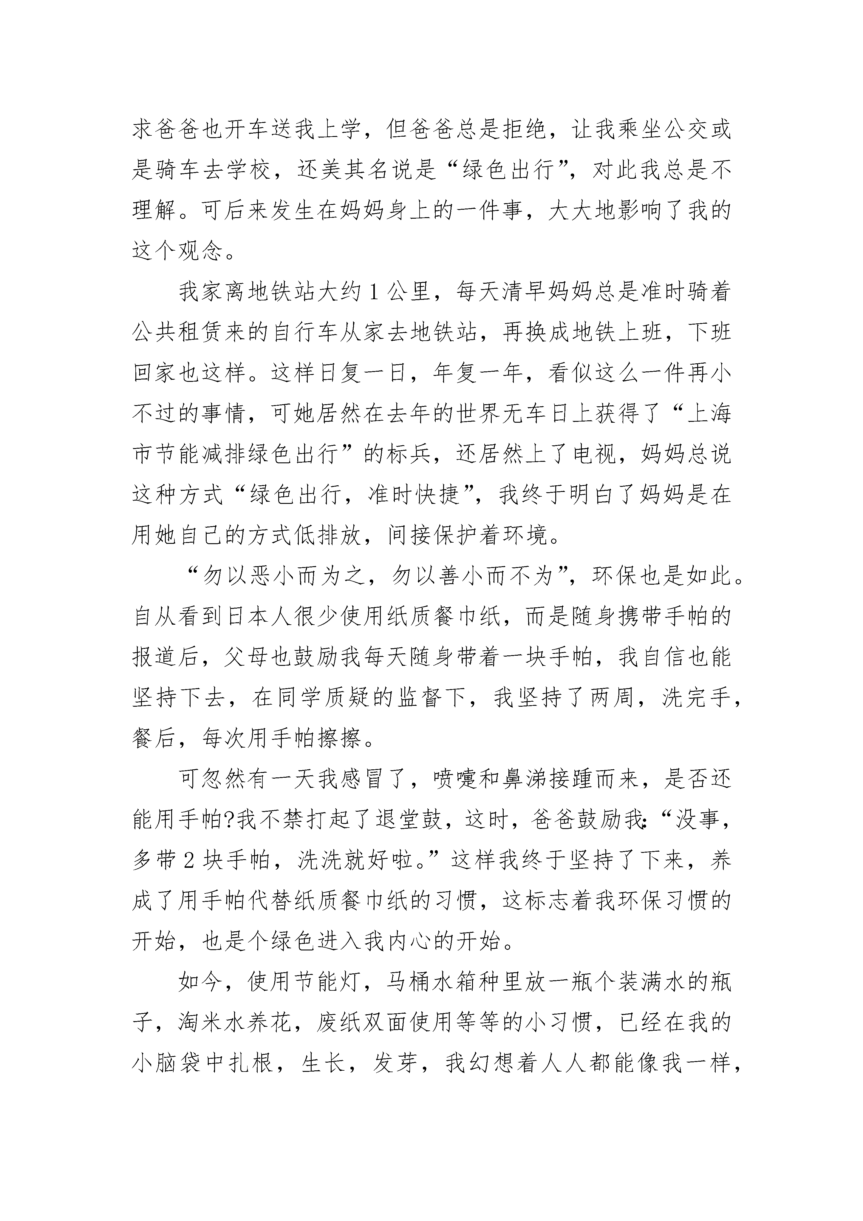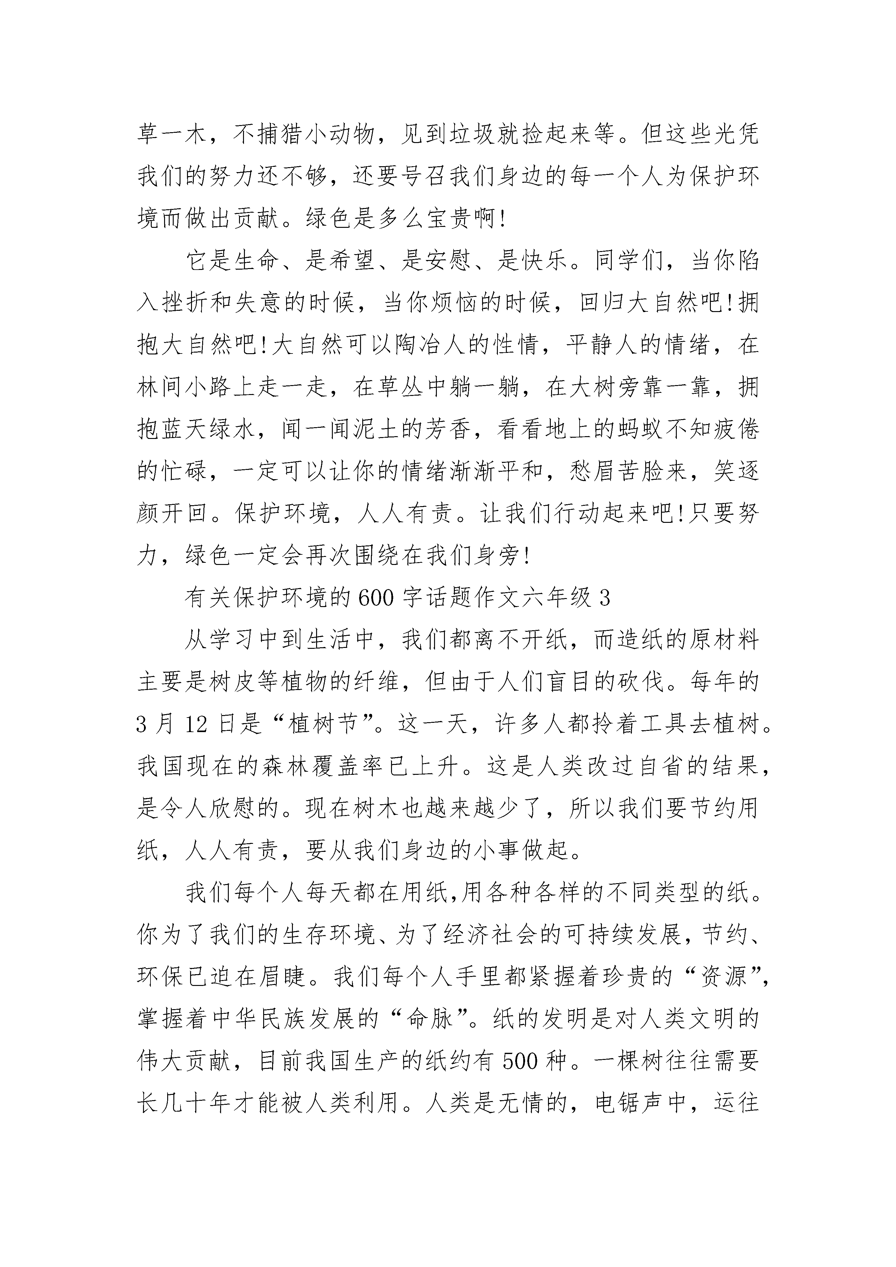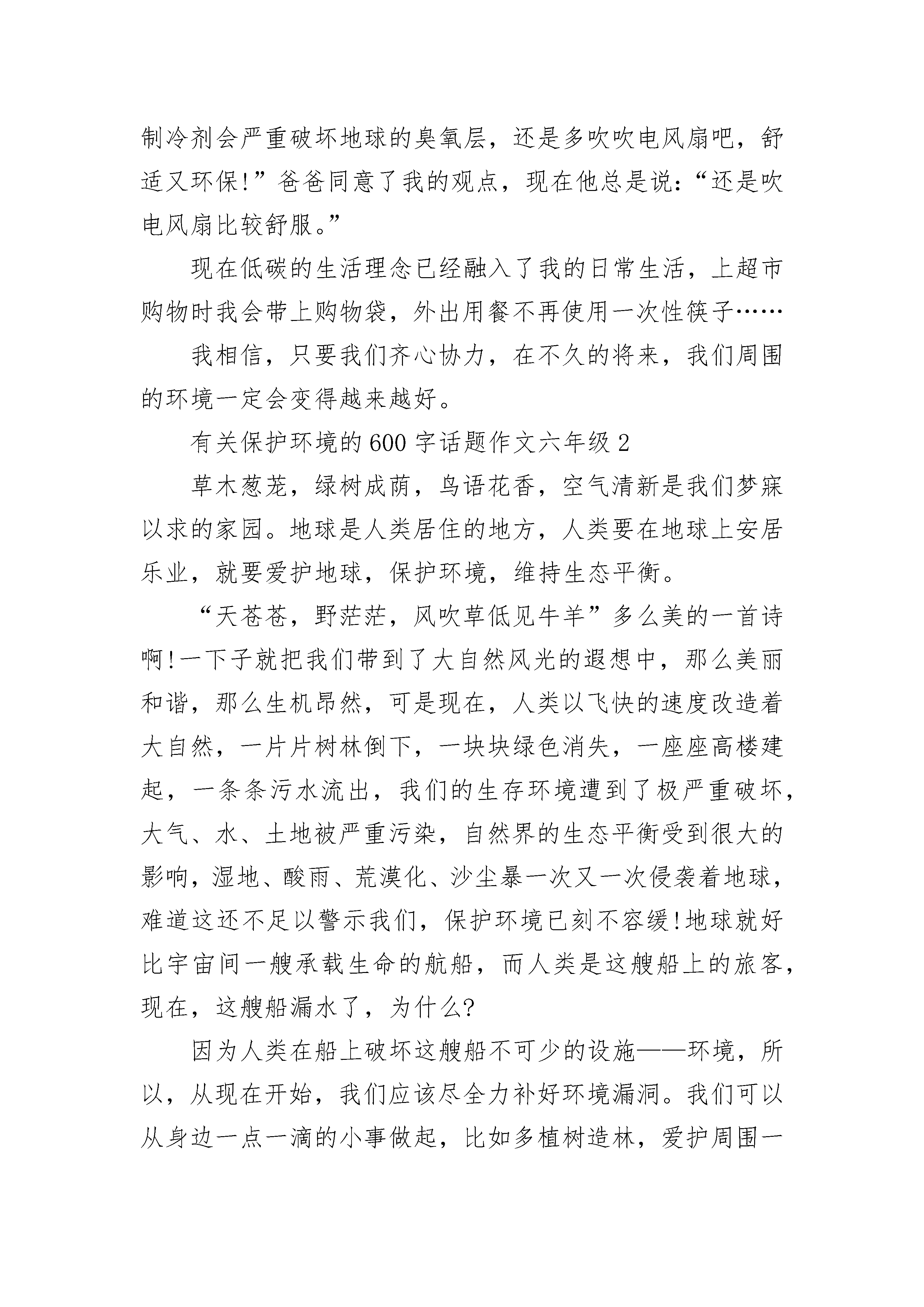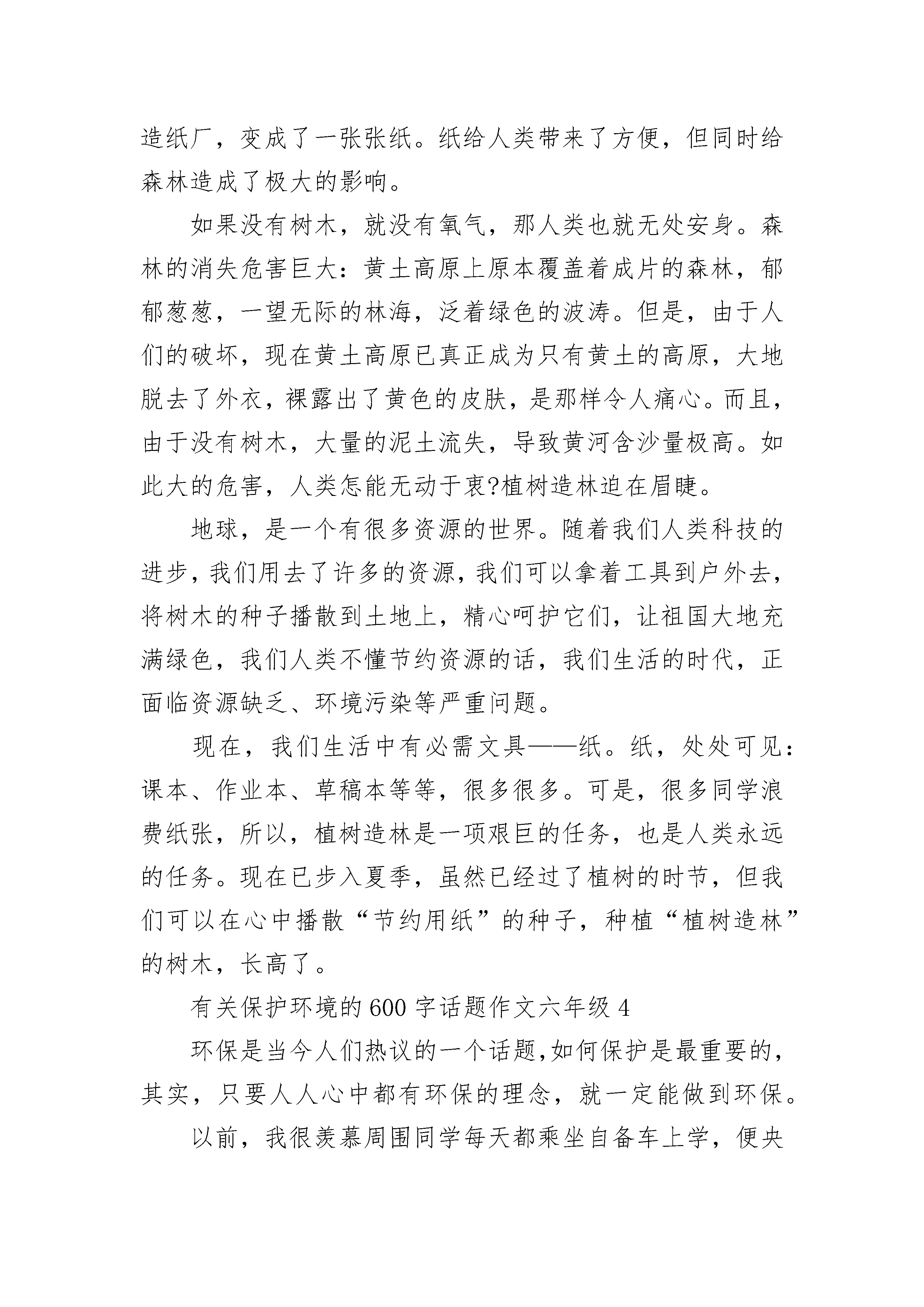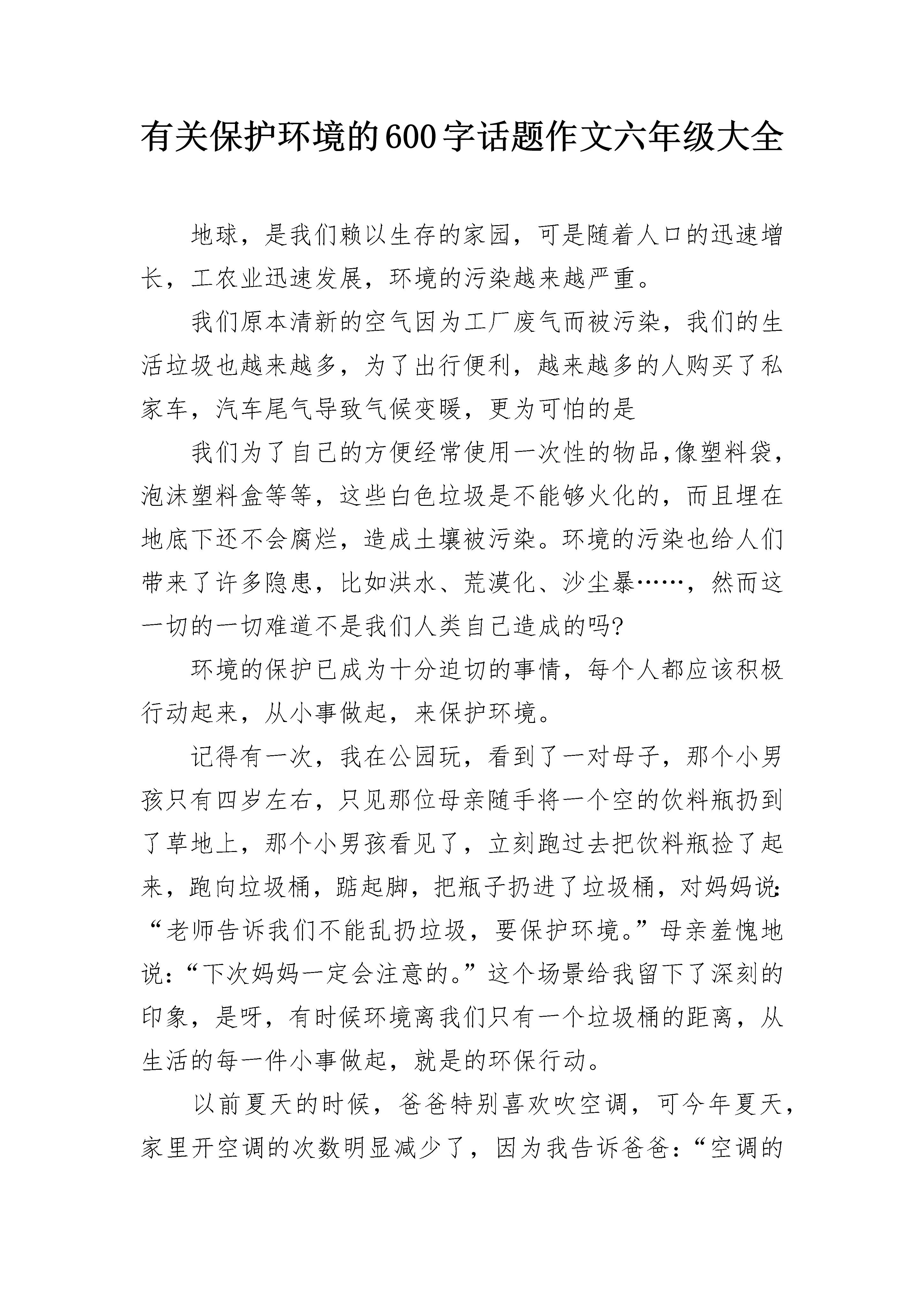 有关保护环境的600字话题作文六年级大全地球,是我们赖以生存的家园,可是随着人口的迅速增长,工农业迅速发展,环境的污染越来越严重。我们原本清新的空气因为工厂废气而被污染,我们的生活垃圾也越来越多,为了出行便利,越来越多的人购买了私家车,汽车尾气导致气候变暖,更为可怕的是我们为了自己的方便经常使用一次性的物品,像塑料袋,泡沫塑料盒等等,这些白色垃圾是不能够火化的,而且埋在地底下还不会腐烂,造成土壤被污染。环境的污染也给人们带来了许多隐患,比如洪水、荒漠化、沙尘暴……,然而这一切的一切难道不是我们人类自己造成的吗?环境的保护已成为十分迫切的事情,每个人都应该积极行动起来,从小事做起,来保护环境。记得有一次,我在公园玩,看到了一对母子,那个小男孩只有四岁左右,只见那位母亲随手将一个空的饮料瓶扔到了草地上,那个小男孩看见了,立刻跑过去把饮料瓶捡了起来,跑向垃圾桶,踮起脚,把瓶子扔进了垃圾桶,对妈妈说:“老师告诉我们不能乱扔垃圾,要保护环境。”母亲羞愧地说:“下次妈妈一定会注意的。”这个场景给我留下了深刻的印象,是呀,有时候环境离我们只有一个垃圾桶的距离,从生活的每一件小事做起,就是的环保行动。以前夏天的时候,爸爸特别喜欢吹空调,可今年夏天,家里开空调的次数明显减少了,因为我告诉爸爸:“空调的制冷剂会严重破坏地球的臭氧层,还是多吹吹电风扇吧,舒适又环保!”爸爸同意了我的观点,现在他总是说:“还是吹电风扇比较舒服。”现在低碳的生活理念已经融入了我的日常生活,上超市购物时我会带上购物袋,外出用餐不再使用一次性筷子……我相信,只要我们齐心协力,在不久的将来,我们周围的环境一定会变得越来越好。有关保护环境的600字话题作文六年级2草木葱茏,绿树成荫,鸟语花香,空气清新是我们梦寐以求的家园。地球是人类居住的地方,人类要在地球上安居乐业,就要爱护地球,保护环境,维持生态平衡。“天苍苍,野茫茫,风吹草低见牛羊”多么美的一首诗啊!一下子就把我们带到了大自然风光的遐想中,那么美丽和谐,那么生机昂然,可是现在,人类以飞快的速度改造着大自然,一片片树林倒下,一块块绿色消失,一座座高楼建起,一条条污水流出,我们的生存环境遭到了极严重破坏,大气、水、土地被严重污染,自然界的生态平衡受到很大的影响,湿地、酸雨、荒漠化、沙尘暴一次又一次侵袭着地球,难道这还不足以警示我们,保护环境已刻不容缓!地球就好比宇宙间一艘承载生命的航船,而人类是这艘船上的旅客,现在,这艘船漏水了,为什么?因为人类在船上破坏这艘船不可少的设施——环境,所以,从现在开始,我们应该尽全力补好环境漏洞。我们可以从身边一点一滴的小事做起,比如多植树造林,爱护周围一草一木,不捕猎小动物,见到垃圾就捡起来等。但这些光凭我们的努力还不够,还要号召我们身边的每一个人为保护环境而做出贡献。绿色是多么宝贵啊!它是生命、是希望、是安慰、是快乐。同学们,当你陷入挫折和失意的时候,当你烦恼的时候,回归大自然吧!拥抱大自然吧!大自然可以陶冶人的性情,平静人的情绪,在林间小路上走一走,在草丛中躺一躺,在大树旁靠一靠,拥抱蓝天绿水,闻一闻泥土的芳香,看看地上的蚂蚁不知疲倦的忙碌,一定可以让你的情绪渐渐平和,愁眉苦脸来,笑逐颜开回。保护环境,人人有责。让我们行动起来吧!只要努力,绿色一定会再次围绕在我们身旁!有关保护环境的600字话题作文六年级3从学习中到生活中,我们都离不开纸,而造纸的原材料主要是树皮等植物的纤维,但由于人们盲目的砍伐。每年的3月12日是“植树节”。这一天,许多人都拎着工具去植树。我国现在的森林覆盖率已上升。这是人类改过自省的结果,是令人欣慰的。现在树木也越来越少了,所以我们要节约用纸,人人有责,要从我们身边的小事做起。我们每个人每天都在用纸,用各种各样的不同类型的纸。你为了我们的生存环境、为了经济社会的可持续发展,节约、环保已迫在眉睫。我们每个人手里都紧握着珍贵的“资源”,掌握着中华民族发展的“命脉”。纸的发明是对人类文明的伟大贡献,目前我国生产的纸约有500种。一棵树往往需要长几十年才能被人类利用。人类是无情的,电锯声中,运往造纸厂,变成了一张张纸。纸给人类带来了方便,但同时给森林造成了极大的影响。如果没有树木,就没有氧气,那人类也就无处安身。森林的消失危害巨大:黄土高原上原本覆盖着成片的森林,郁郁葱葱,一望无际的林海,泛着绿色的波涛。但是,由于人们的破坏,现在黄土高原已真正成为只有黄土的高原,大地脱去了外衣,裸露出了黄色的皮肤,是那样令人痛心。而且,由于没有树木,大量的泥土流失,导致黄河含沙量极高。如此大的危害,人类怎能无动于衷?植树造林迫在眉睫。地球,是一个有很多资源的世界。随着我们人类科技的进步,我们用去了许多的资源,我们可以拿着工具到户外去,将树木的种子播散到土地上,精心呵护它们,让祖国大地充满