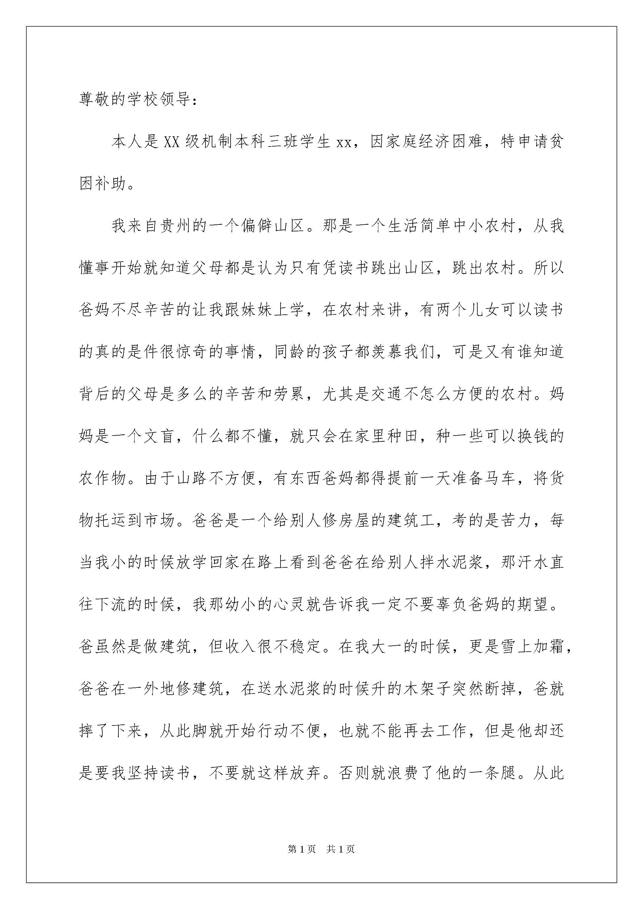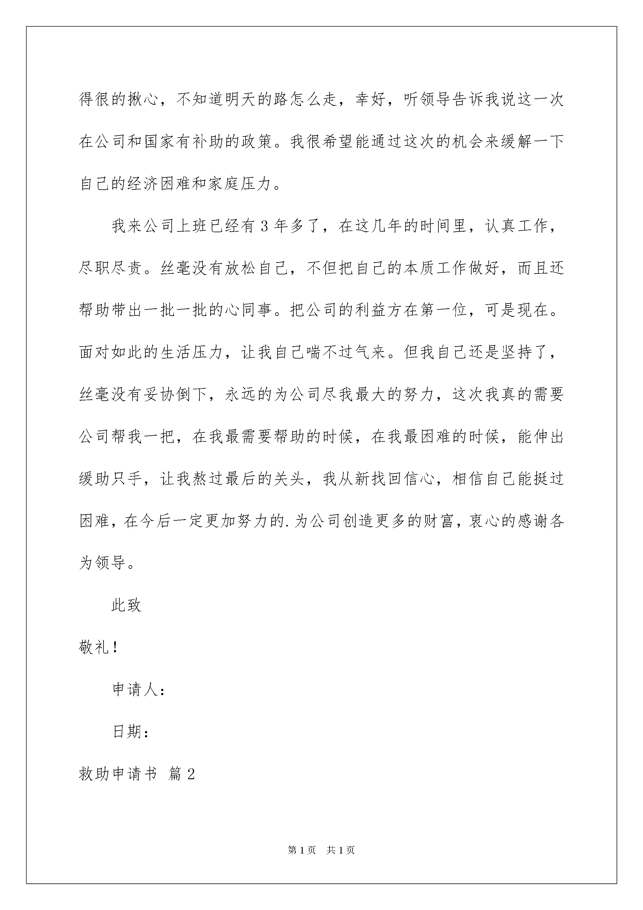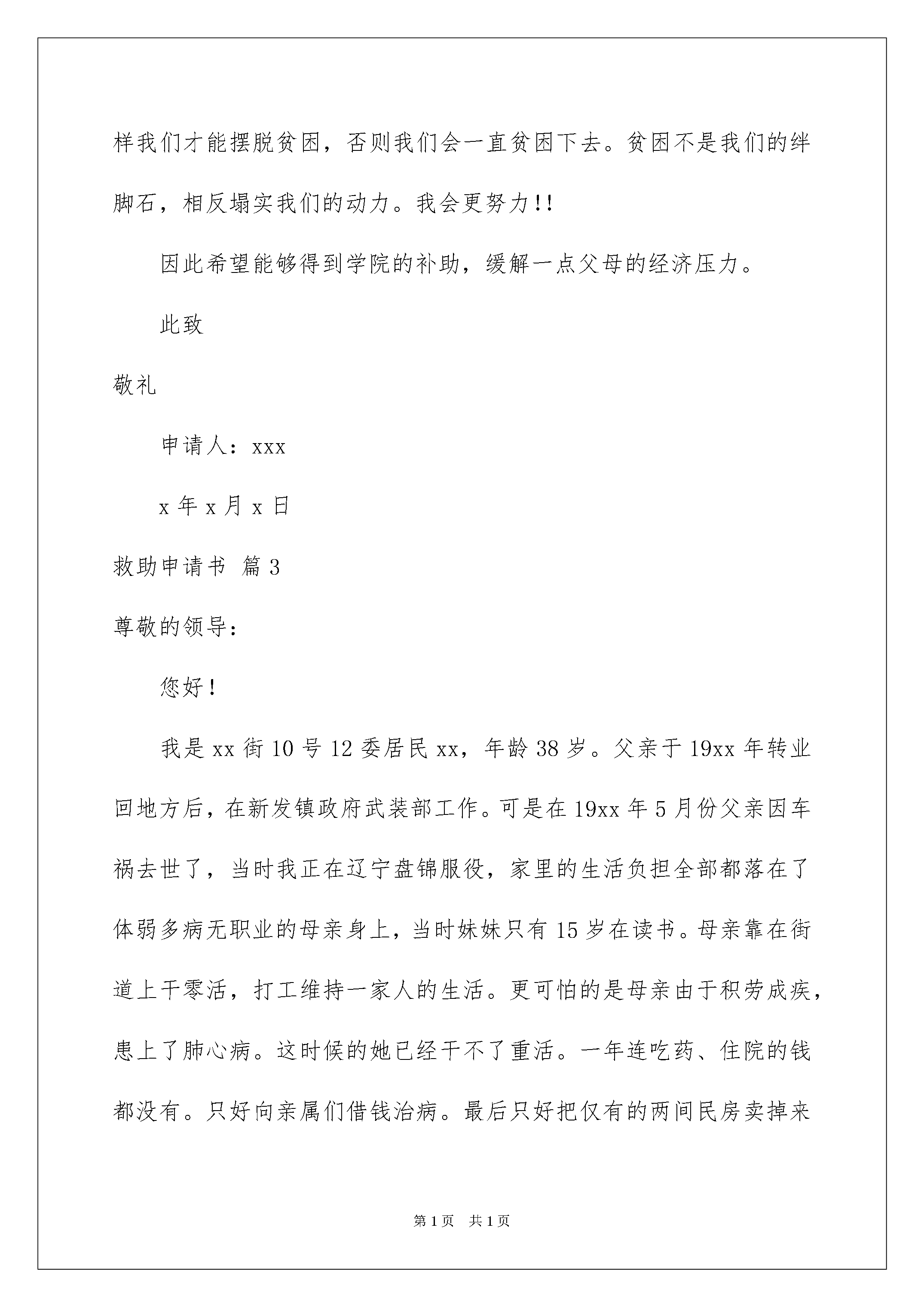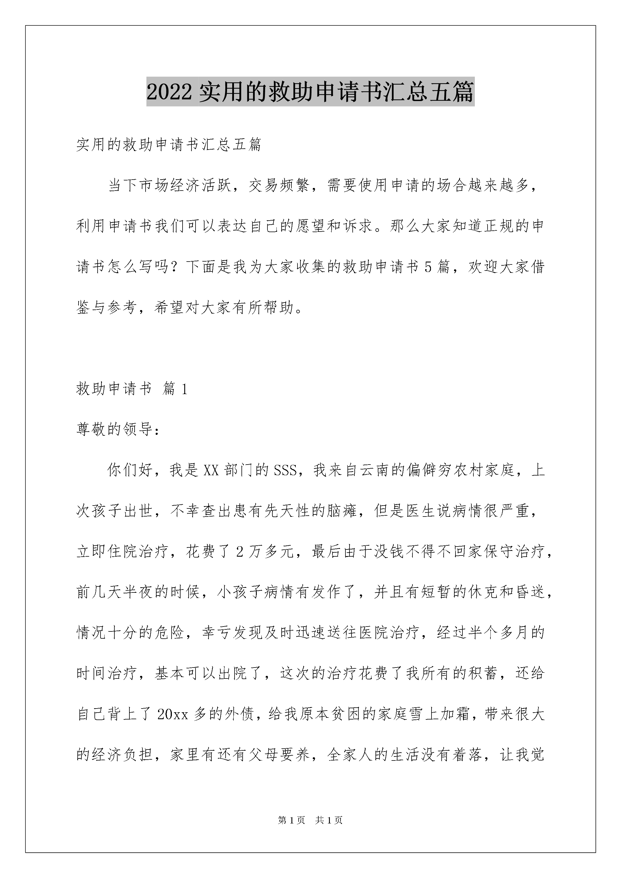 2022实用的救助申请书汇总五篇实用的救助申请书汇总五篇当下市场经济活跃,交易频繁,需要使用申请的场合越来越多,利用申请书我们可以表达自己的愿望和诉求。那么大家知道正规的申请书怎么写吗?下面是我为大家收集的救助申请书5篇,欢迎大家借鉴与参考,希望对大家有所帮助。救助申请书篇1尊敬的领导:你们好,我是XX部门的SSS,我来自云南的偏僻穷农村家庭,上次孩子出世,不幸查出患有先天性的脑瘫,但是医生说病情很严重,立即住院治疗,花费了2万多元,最后由于没钱不得不回家保守治疗,前几天半夜的时候,小孩子病情有发作了,并且有短暂的休克和昏迷,情况十分的危险,幸亏发现及时迅速送往医院治疗,经过半个多月的时间治疗,基本可以出院了,这次的治疗花费了我所有的积蓄,还给自己背上了20xx多的外债,给我原本贫困的家庭雪上加霜,带来很大的经济负担,家里有还有父母要养,全家人的生活没有着落,让我觉得很的揪心,不知道明天的路怎么走,幸好,听领导告诉我说这一次在公司和国家有补助的政策。我很希望能通过这次的机会来缓解一下自己的经济困难和家庭压力。我来公司上班已经有3年多了,在这几年的时间里,认真工作,尽职尽责。丝毫没有放松自己,不但把自己的本质工作做好,而且还帮助带出一批一批的心同事。把公司的利益方在第一位,可是现在。面对如此的生活压力,让我自己喘不过气来。但我自己还是坚持了,丝毫没有妥协倒下,永远的为公司尽我最大的努力,这次我真的需要公司帮我一把,在我最需要帮助的时候,在我最困难的时候,能伸出缓助只手,让我熬过最后的关头,我从新找回信心,相信自己能挺过困难,在今后一定更加努力的.为公司创造更多的财富,衷心的感谢各为领导。此致敬礼!申请人:日期:救助申请书篇2尊敬的学校领导:本人是XX级机制本科三班学生xx,因家庭经济困难,特申请贫困补助。我来自贵州的一个偏僻山区。那是一个生活简单中小农村,从我懂事开始就知道父母都是认为只有凭读书跳出山区,跳出农村。所以爸妈不尽辛苦的让我跟妹妹上学,在农村来讲,有两个儿女可以读书的真的是件很惊奇的事情,同龄的孩子都羡慕我们,可是又有谁知道背后的父母是多么的辛苦和劳累,尤其是交通不怎么方便的农村。妈妈是一个文盲,什么都不懂,就只会在家里种田,种一些可以换钱的农作物。由于山路不方便,有东西爸妈都得提前一天准备马车,将货物托运到市场。爸爸是一个给别人修房屋的建筑工,考的是苦力,每当我小的时候放学回家在路上看到爸爸在给别人拌水泥浆,那汗水直往下流的时候,我那幼小的心灵就告诉我一定不要辜负爸妈的期望。爸虽然是做建筑,但收入很不稳定。在我大一的时候,更是雪上加霜,爸爸在一外地修建筑,在送水泥浆的时候升的木架子突然断掉,爸就摔了下来,从此脚就开始行动不便,也就不能再去工作,但是他却还是要我坚持读书,不要就这样放弃。否则就浪费了他的一条腿。从此家里就只有妈妈了,妈妈比往常更累,而现在我妹妹正在处于高考阶段,营养是最重要的,而我在学校里也是时常做兼职,赚取生活费。村子里看到我家这样的环境,都让我和妹妹不要读书了,我爸爸却是死都不同意。就这样村里没有办法,也只能每年补助一些口粮。在校期间:我始终以“奉献学院,服务同学”为宗旨,真正做到为同学服务,代表同学们行使合法权益,为校园建设尽心尽力,工作中大胆创新,锐意进取,虚心向别人学习,做到有错就改,有好的意见就接受,同时坚持自己的原则;在学生利益的面前,我坚持以学校、大多数同学的利益为重,决不以公谋私。在班级,积极参和院里的各项活动。最终,我连续两年被授予“优秀团干部”荣誉称号,所在支部连续两年被授予“校先进团支部”荣誉称号。我们班的贫困生是比较多的,我想有贫困生也不是什么坏事,贫困能更磨练我们的意志。我是一名贫困生,我有我自己的经历,我的经历使我认识到,贫困不能给我们带来什么阻碍,我们最大的阻碍在我们心中,只有你克服了自己的贫困心理,你才能做的更好,”人穷志不穷”,‘穷且益坚”,这么一句古语已经告诉我们了,我想我自己不会被贫困击倒。而且会更加努力。来改变我们的现状,因为只有这样我们才能摆脱贫困,否则我们会一直贫困下去。贫困不是我们的绊脚石,相反塌实我们的动力。我会更努力!!因此希望能够得到学院的补助,缓解一点父母的经济压力。此致敬礼申请人:xxxx年x月x日救助申请书篇3尊敬的领导:您好!我是xx街10号12委居民xx,年龄38岁。父亲于19xx年转业回地方后,在新发镇政府武装部工作。可是在19xx年5月份父亲因车祸去世了,当时我正在辽宁盘锦服役,家里的生活负担全部都落在了体弱多病无职业的母亲身上,当时妹妹只有15岁在读书。母亲靠在街道上干零活,打工维持一家人的生活。更可怕