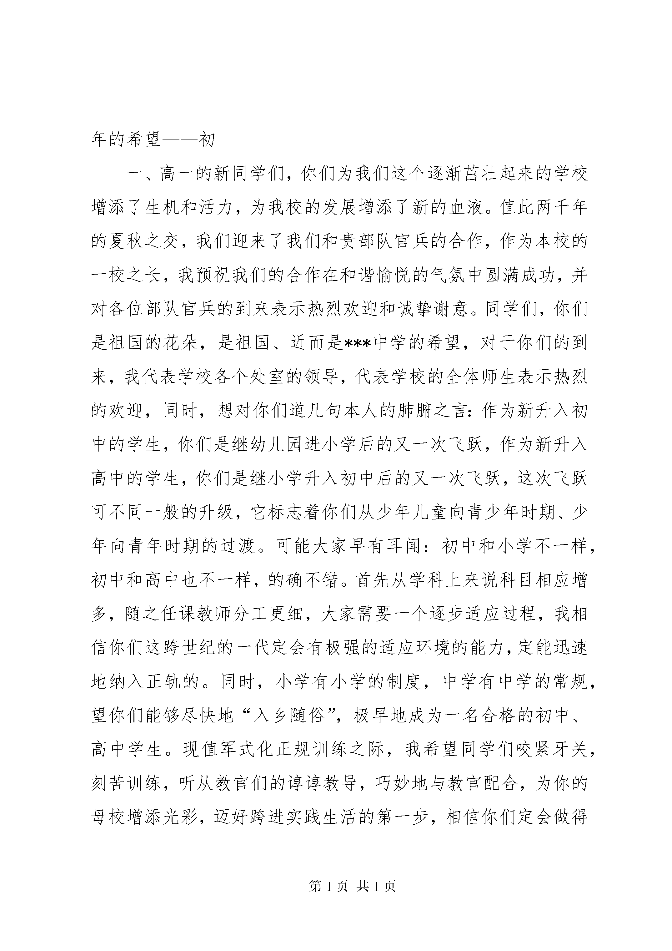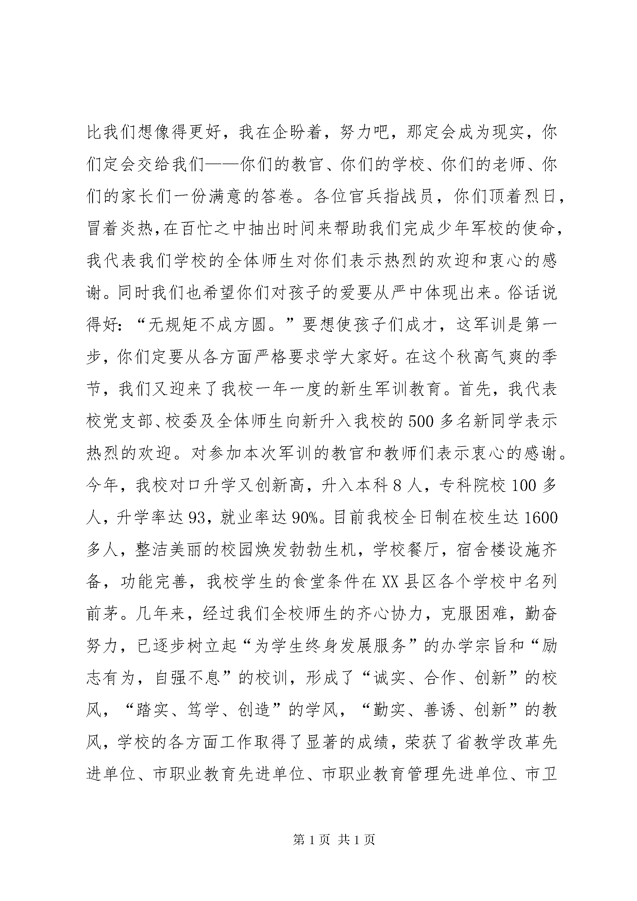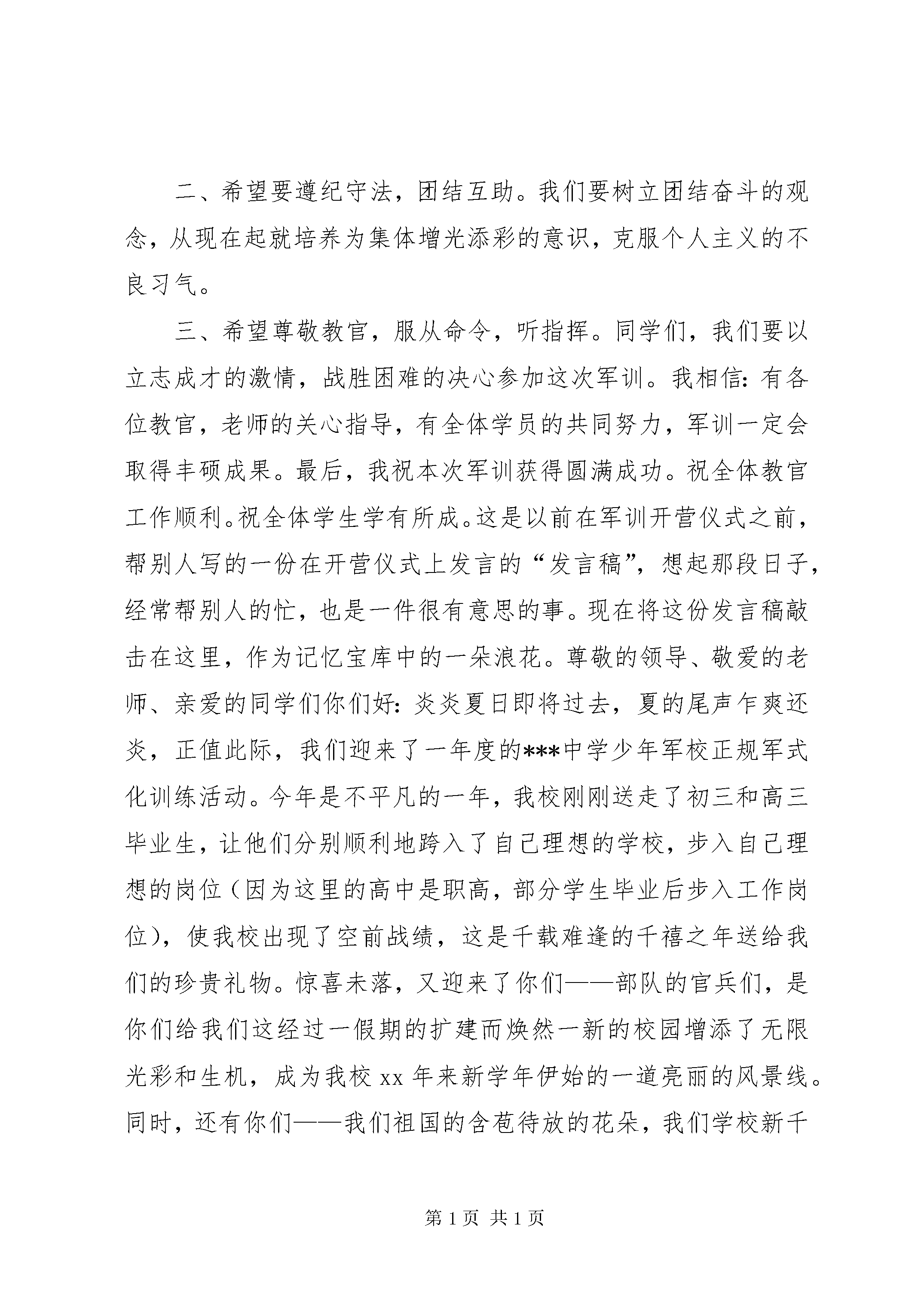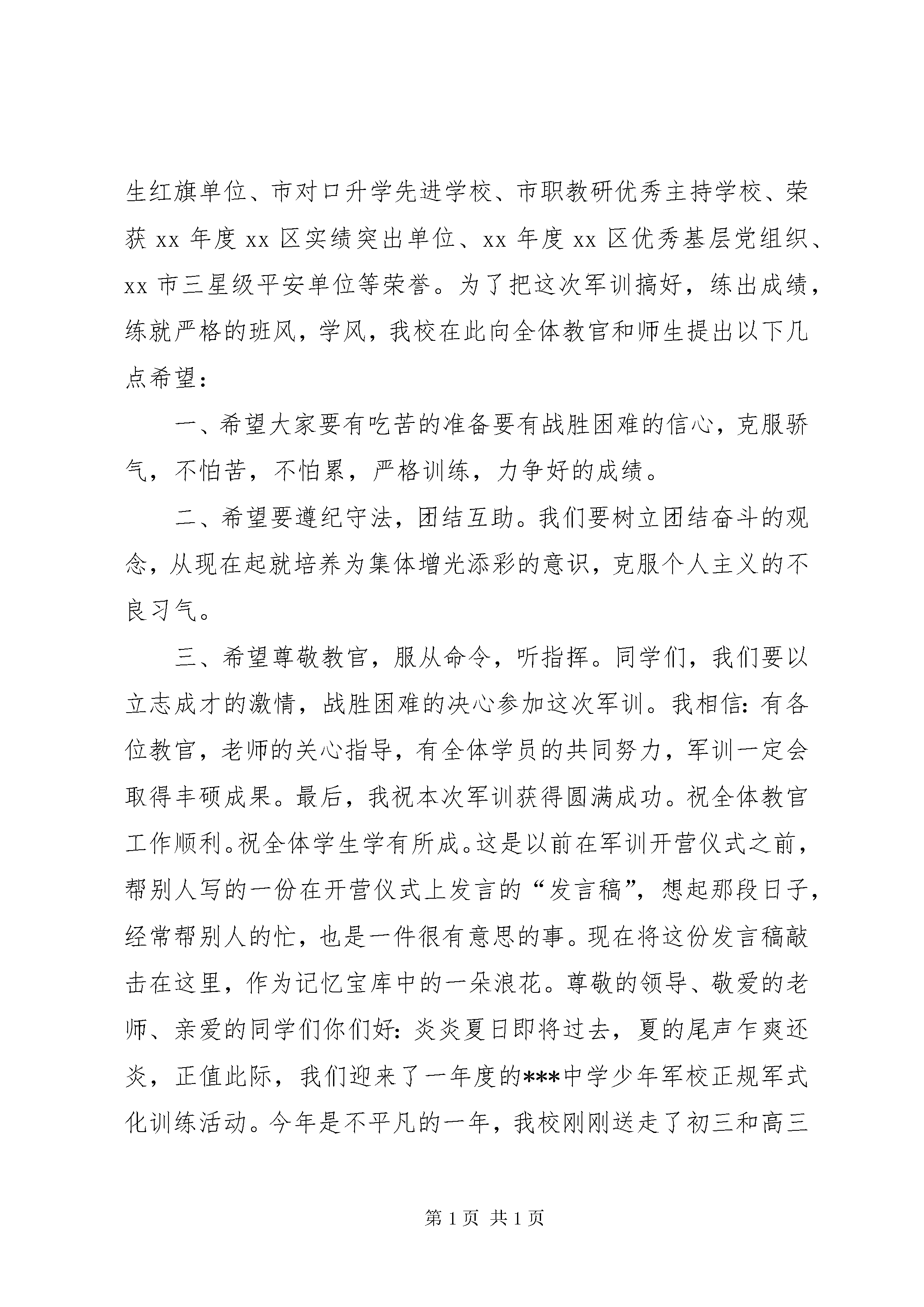 军训开营仪式演讲稿大家好。在这个秋高气爽的季节,我们又迎来了我校一年一度的新生军训教育。首先,我代表校党支部、校委及全体师生向新升入我校的500多名新同学表示热烈的欢迎。对参加本次军训的教官和教师们表示衷心的感谢。今年,我校对口升学又创新高,升入本科8人,专科院校100多人,升学率达93,就业率达90%。目前我校全日制在校生达1600多人,整洁美丽的校园焕发勃勃生机,学校餐厅,宿舍楼设施齐备,功能完善,我校学生的食堂条件在XX县区各个学校中名列前茅。几年来,经过我们全校师生的齐心协力,克服困难,勤奋努力,已逐步树立起“为学生终身发展服务”的办学宗旨和“励志有为,自强不息”的校训,形成了“诚实、合作、创新”的校风,“踏实、笃学、创造”的学风,“勤实、善诱、创新”的教风,学校的各方面工作取得了显著的成绩,荣获了省教学改革先进单位、市职业教育先进单位、市职业教育管理先进单位、市卫生红旗单位、市对口升学先进学校、市职教研优秀主持学校、荣获xx年度xx区实绩突出单位、xx年度xx区优秀基层党组织、xx市三星级平安单位等荣誉。为了把这次军训搞好,练出成绩,练就严格的班风,学风,我校在此向全体教官和师生提出以下几点希望:一、希望大家要有吃苦的准备要有战胜困难的信心,克服骄气,不怕苦,不怕累,严格训练,力争好的成绩。二、希望要遵纪守法,团结互助。我们要树立团结奋斗的观念,从现在起就培养为集体增光添彩的意识,克服个人主义的不良习气。三、希望尊敬教官,服从命令,听指挥。同学们,我们要以立志成才的激情,战胜困难的决心参加这次军训。我相信:有各位教官,老师的关心指导,有全体学员的共同努力,军训一定会取得丰硕成果。最后,我祝本次军训获得圆满成功。祝全体教官工作顺利。祝全体学生学有所成。这是以前在军训开营仪式之前,帮别人写的一份在开营仪式上发言的“发言稿”,想起那段日子,经常帮别人的忙,也是一件很有意思的事。现在将这份发言稿敲击在这里,作为记忆宝库中的一朵浪花。尊敬的领导、敬爱的老师、亲爱的同学们你们好:炎炎夏日即将过去,夏的尾声乍爽还炎,正值此际,我们迎来了一年度的***中学少年军校正规军式化训练活动。今年是不平凡的一年,我校刚刚送走了初三和高三毕业生,让他们分别顺利地跨入了自己理想的学校,步入自己理想的岗位(因为这里的高中是职高,部分学生毕业后步入工作岗位),使我校出现了空前战绩,这是千载难逢的千禧之年送给我们的珍贵礼物。惊喜未落,又迎来了你们——部队的官兵们,是你们给我们这经过一假期的扩建而焕然一新的校园增添了无限光彩和生机,成为我校xx年来新学年伊始的一道亮丽的风景线。同时,还有你们——我们祖国的含苞待放的花朵,我们学校新千年的希望——初一、高一的新同学们,你们为我们这个逐渐茁壮起来的学校增添了生机和活力,为我校的发展增添了新的血液。值此两千年的夏秋之交,我们迎来了我们和贵部队官兵的合作,作为本校的一校之长,我预祝我们的合作在和谐愉悦的气氛中圆满成功,并对各位部队官兵的到来表示热烈欢迎和诚挚谢意。同学们,你们是祖国的花朵,是祖国、近而是***中学的希望,对于你们的到来,我代表学校各个处室的领导,代表学校的全体师生表示热烈的欢迎,同时,想对你们道几句本人的肺腑之言:作为新升入初中的学生,你们是继幼儿园进小学后的又一次飞跃,作为新升入高中的学生,你们是继小学升入初中后的又一次飞跃,这次飞跃可不同一般的升级,它标志着你们从少年儿童向青少年时期、少年向青年时期的过渡。可能大家早有耳闻:初中和小学不一样,初中和高中也不一样,的确不错。首先从学科上来说科目相应增多,随之任课教师分工更细,大家需要一个逐步适应过程,我相信你们这跨世纪的一代定会有极强的适应环境的能力,定能迅速地纳入正轨的。同时,小学有小学的制度,中学有中学的常规,望你们能够尽快地“入乡随俗”,极早地成为一名合格的初中、高中学生。现值军式化正规训练之际,我希望同学们咬紧牙关,刻苦训练,听从教官们的谆谆教导,巧妙地与教官配合,为你的母校增添光彩,迈好跨进实践生活的第一步,相信你们定会做得比我们想像得更好,我在企盼着,努力吧,那定会成为现实,你们定会交给我们——你们的教官、你们的学校、你们的老师、你们的家长们一份满意的答卷。各位官兵指战员,你们顶着烈日,冒着炎热,在百忙之中抽出时间来帮助我们完成少年军校的使命,我代表我们学校的全体师生对你们表示热烈的欢迎和衷心的感谢。同时我们也希望你们对孩子的爱要从严中体现出来。俗话说得好:“无规矩不成方圆。”要想使孩子们成才,这军训是第一步,你们定要从各方面严格要求学大家好。在这个秋高气爽的季节,我们又迎来了我校一年一度的新生军训教育。首先,我代表校党支部、校委及全体师生向新升入我校的500多名新同学表示热烈的欢迎。对参加本次军训的教官和教师们表示衷心的
