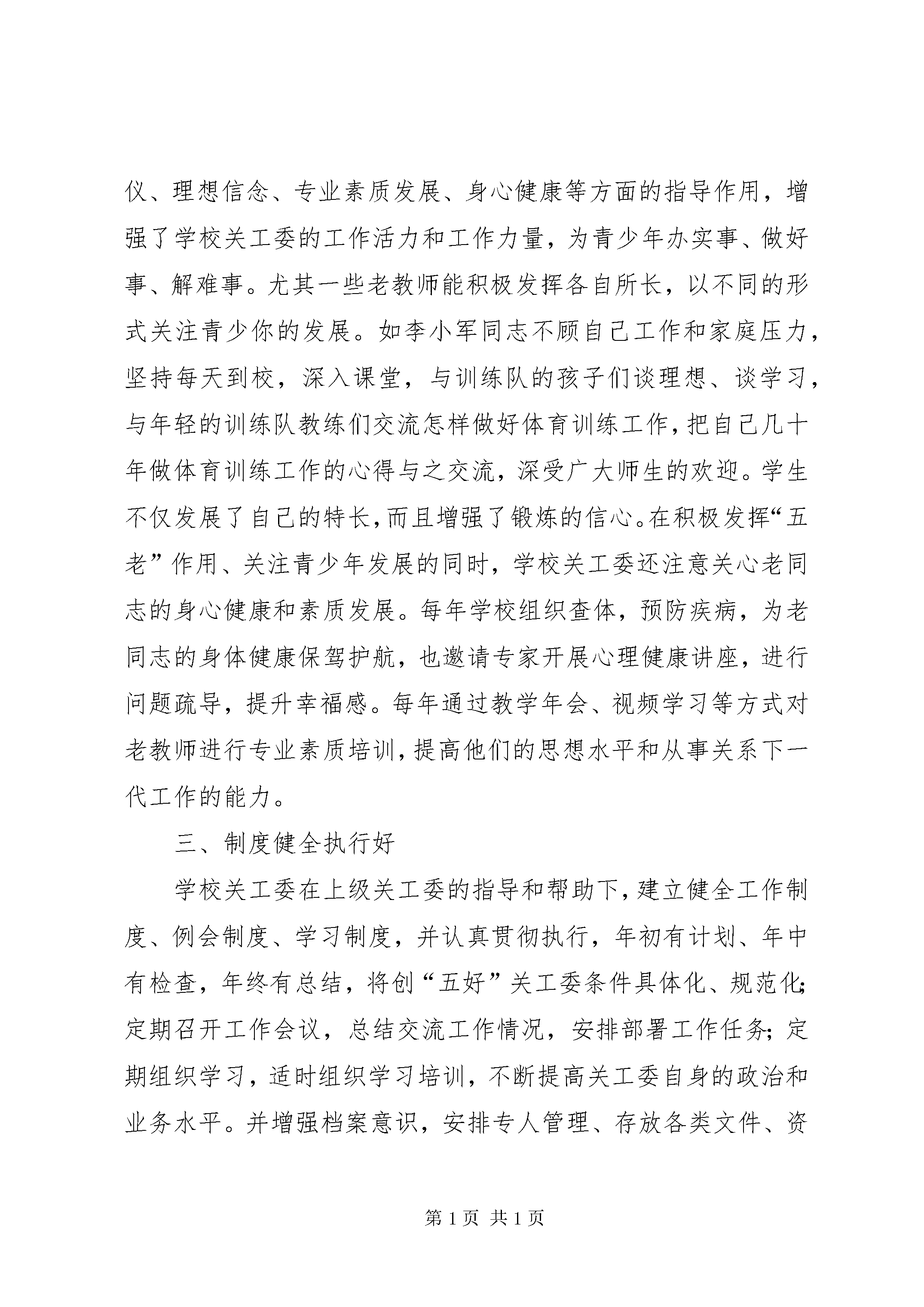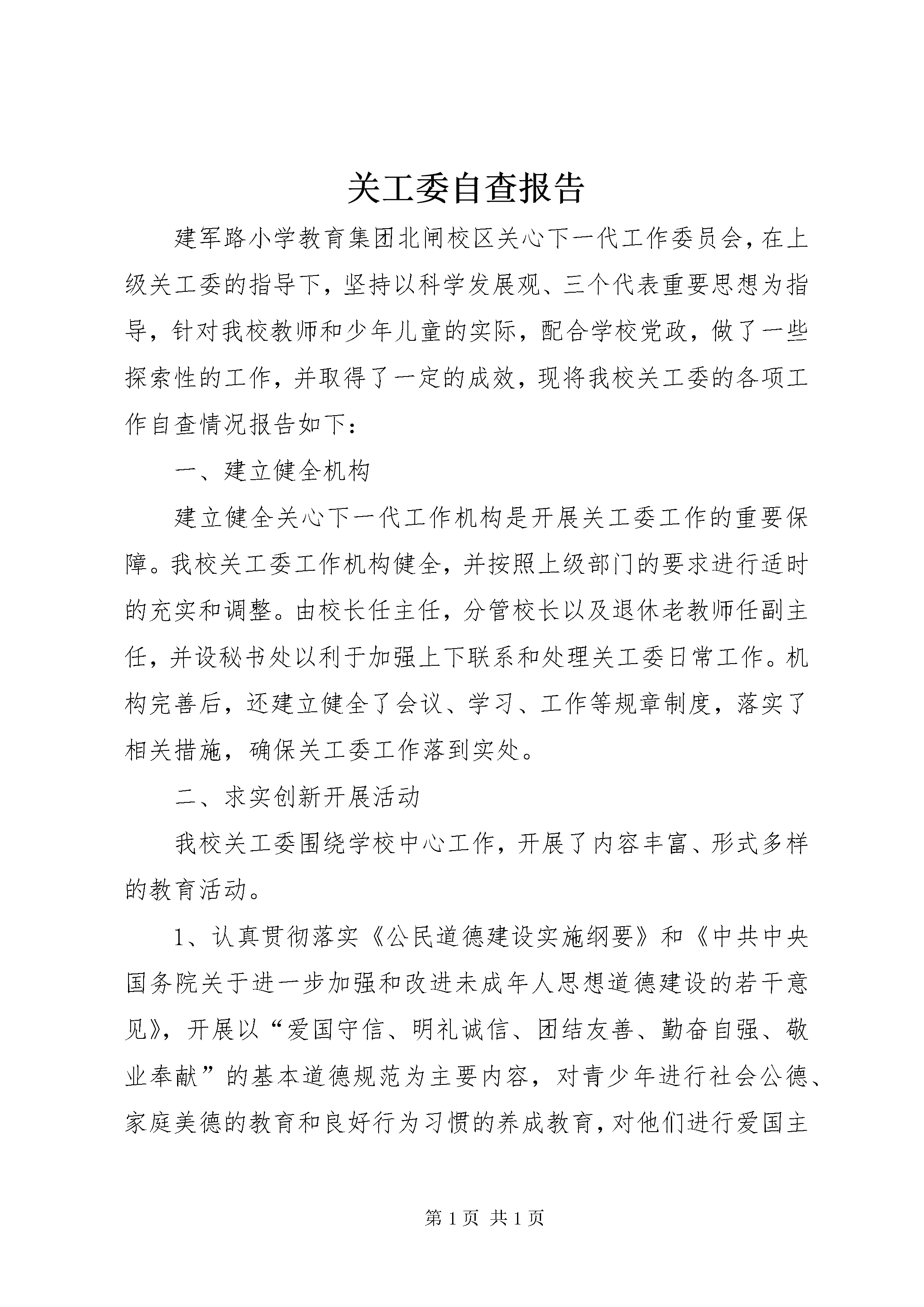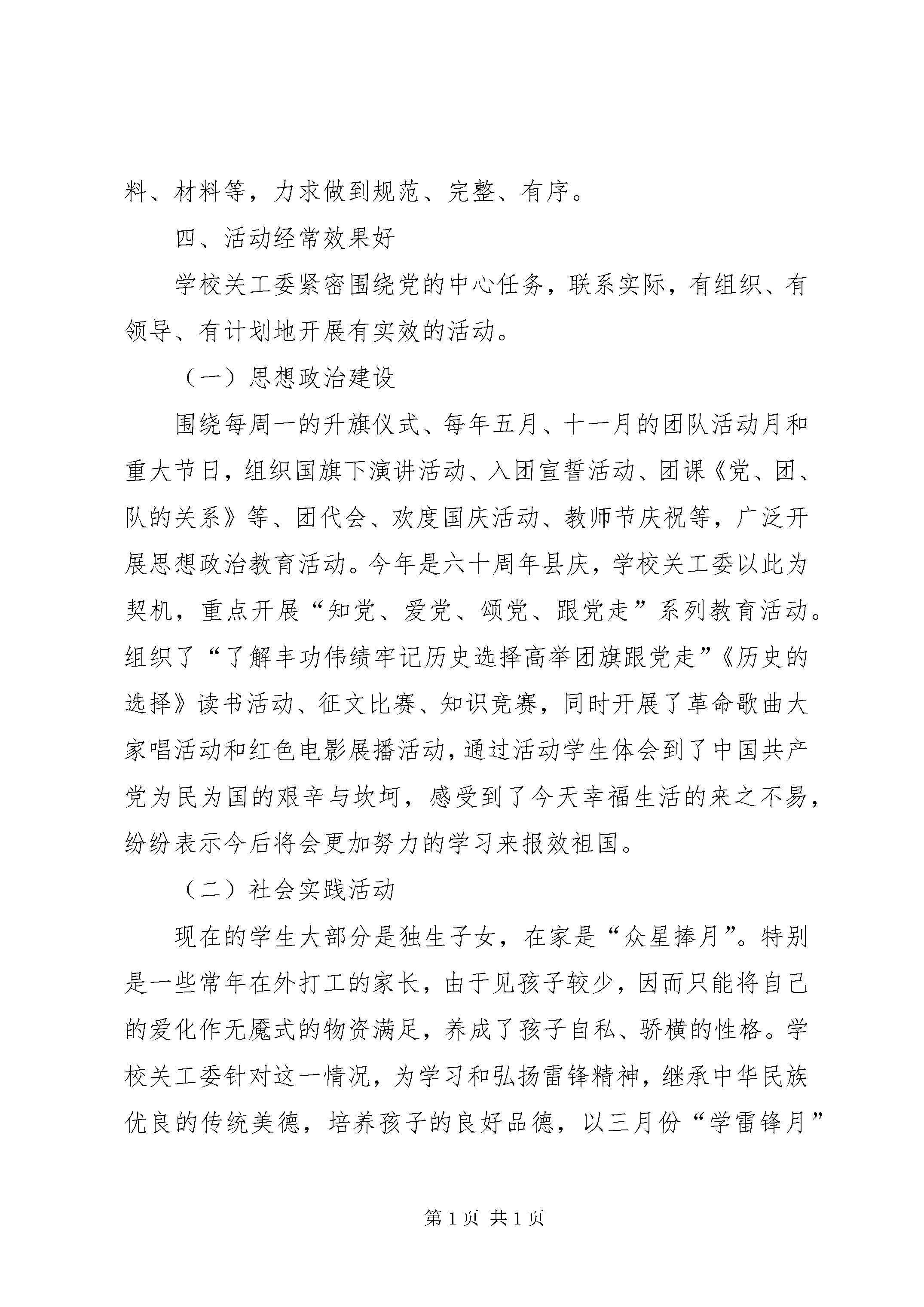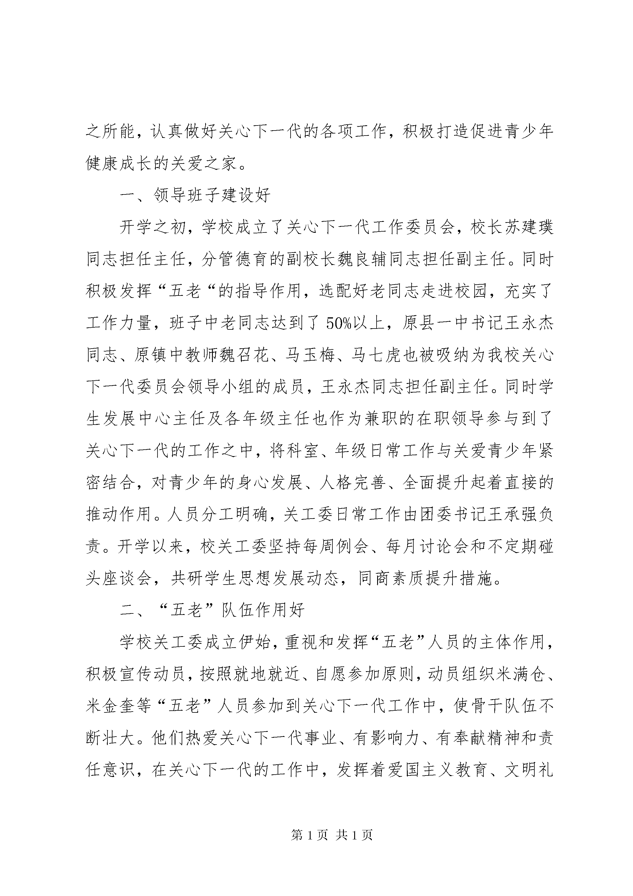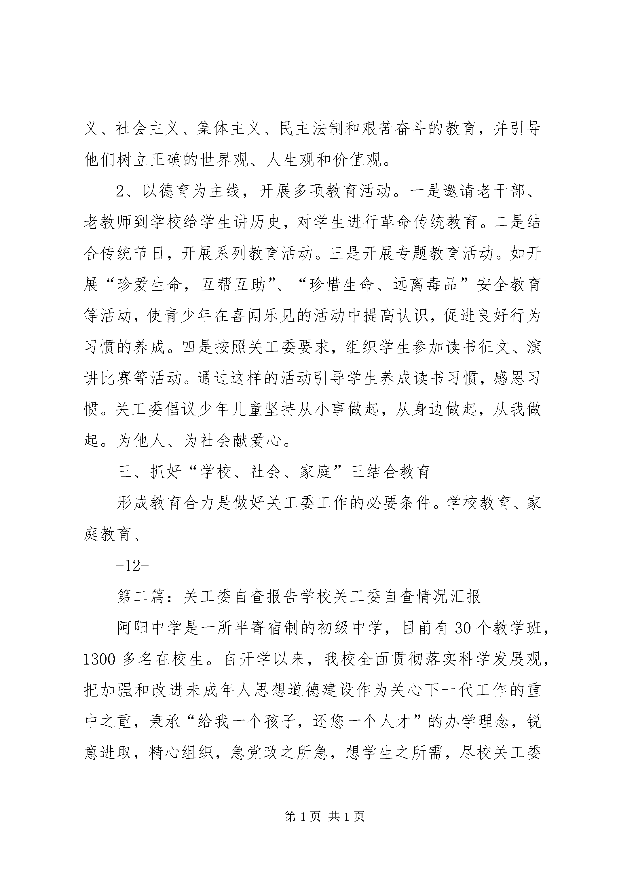 关工委自查报告建军路小学教育集团北闸校区关心下一代工作委员会,在上级关工委的指导下,坚持以科学发展观、三个代表重要思想为指导,针对我校教师和少年儿童的实际,配合学校党政,做了一些探索性的工作,并取得了一定的成效,现将我校关工委的各项工作自查情况报告如下:一、建立健全机构建立健全关心下一代工作机构是开展关工委工作的重要保障。我校关工委工作机构健全,并按照上级部门的要求进行适时的充实和调整。由校长任主任,分管校长以及退休老教师任副主任,并设秘书处以利于加强上下联系和处理关工委日常工作。机构完善后,还建立健全了会议、学习、工作等规章制度,落实了相关措施,确保关工委工作落到实处。二、求实创新开展活动我校关工委围绕学校中心工作,开展了内容丰富、形式多样的教育活动。1、认真贯彻落实《公民道德建设实施纲要》和《中共中央国务院关于进一步加强和改进未成年人思想道德建设的若干意见》,开展以“爱国守信、明礼诚信、团结友善、勤奋自强、敬业奉献”的基本道德规范为主要内容,对青少年进行社会公德、家庭美德的教育和良好行为习惯的养成教育,对他们进行爱国主义、社会主义、集体主义、民主法制和艰苦奋斗的教育,并引导他们树立正确的世界观、人生观和价值观。2、以德育为主线,开展多项教育活动。一是邀请老干部、老教师到学校给学生讲历史,对学生进行革命传统教育。二是结合传统节日,开展系列教育活动。三是开展专题教育活动。如开展“珍爱生命,互帮互助”、“珍惜生命、远离毒品”安全教育等活动,使青少年在喜闻乐见的活动中提高认识,促进良好行为习惯的养成。四是按照关工委要求,组织学生参加读书征文、演讲比赛等活动。通过这样的活动引导学生养成读书习惯,感恩习惯。关工委倡议少年儿童坚持从小事做起,从身边做起,从我做起。为他人、为社会献爱心。三、抓好“学校、社会、家庭”三结合教育形成教育合力是做好关工委工作的必要条件。学校教育、家庭教育、-12-第二篇:关工委自查报告学校关工委自查情况汇报阿阳中学是一所半寄宿制的初级中学,目前有30个教学班,1300多名在校生。自开学以来,我校全面贯彻落实科学发展观,把加强和改进未成年人思想道德建设作为关心下一代工作的重中之重,秉承“给我一个孩子,还您一个人才”的办学理念,锐意进取,精心组织,急党政之所急,想学生之所需,尽校关工委之所能,认真做好关心下一代的各项工作,积极打造促进青少年健康成长的关爱之家。一、领导班子建设好开学之初,学校成立了关心下一代工作委员会,校长苏建璞同志担任主任,分管德育的副校长魏良辅同志担任副主任。同时积极发挥“五老“的指导作用,选配好老同志走进校园,充实了工作力量,班子中老同志达到了50%以上,原县一中书记王永杰同志、原镇中教师魏召花、马玉梅、马七虎也被吸纳为我校关心下一代委员会领导小组的成员,王永杰同志担任副主任。同时学生发展中心主任及各年级主任也作为兼职的在职领导参与到了关心下一代的工作之中,将科室、年级日常工作与关爱青少年紧密结合,对青少年的身心发展、人格完善、全面提升起着直接的推动作用。人员分工明确,关工委日常工作由团委书记王承强负责。开学以来,校关工委坚持每周例会、每月讨论会和不定期碰头座谈会,共研学生思想发展动态,同商素质提升措施。二、“五老”队伍作用好学校关工委成立伊始,重视和发挥“五老”人员的主体作用,积极宣传动员,按照就地就近、自愿参加原则,动员组织米满仓、米金奎等“五老”人员参加到关心下一代工作中,使骨干队伍不断壮大。他们热爱关心下一代事业、有影响力、有奉献精神和责任意识,在关心下一代的工作中,发挥着爱国主义教育、文明礼仪、理想信念、专业素质发展、身心健康等方面的指导作用,增强了学校关工委的工作活力和工作力量,为青少年办实事、做好事、解难事。尤其一些老教师能积极发挥各自所长,以不同的形式关注青少你的发展。如李小军同志不顾自己工作和家庭压力,坚持每天到校,深入课堂,与训练队的孩子们谈理想、谈学习,与年轻的训练队教练们交流怎样做好体育训练工作,把自己几十年做体育训练工作的心得与之交流,深受广大师生的欢迎。学生不仅发展了自己的特长,而且增强了锻炼的信心。在积极发挥“五老”作用、关注青少年发展的同时,学校关工委还注意关心老同志的身心健康和素质发展。每年学校组织查体,预防疾病,为老同志的身体健康保驾护航,也邀请专家开展心理健康讲座,进行问题疏导,提升幸福感。每年通过教学年会、视频学习等方式对老教师进行专业素质培训,提高他们的思想水平和从事关系下一代工作的能力。三、制度健全执行好学校关工委在上级关工委的指导和帮助下,建立健全工作制度、例会制度、学习制度,并认真贯彻执行,年初有计划、年中有检查,年终有总结,将创“五好”关工委条件具体化、规范化;定期召开工作会议,总结交流工作情况,安排部署工作任务;定期组织学习,适时