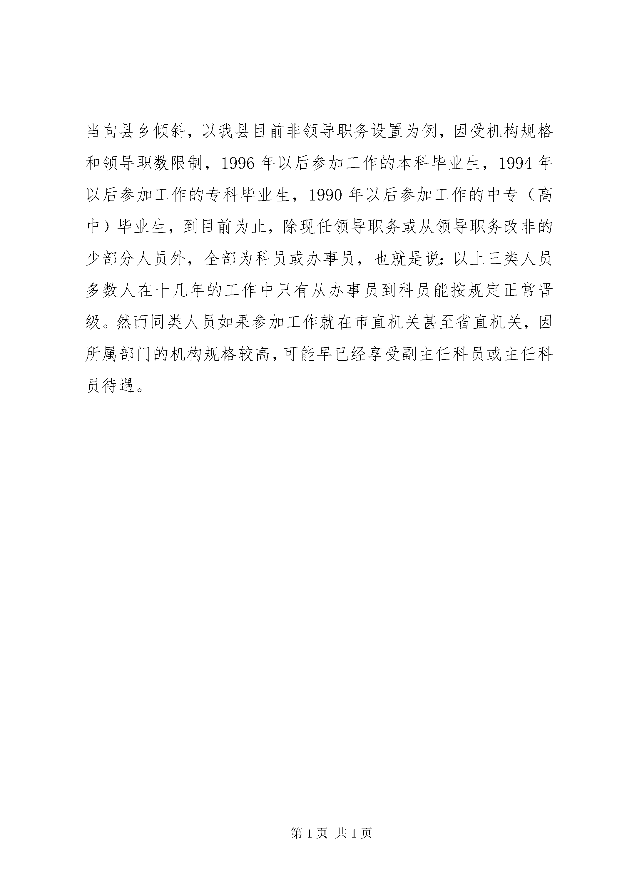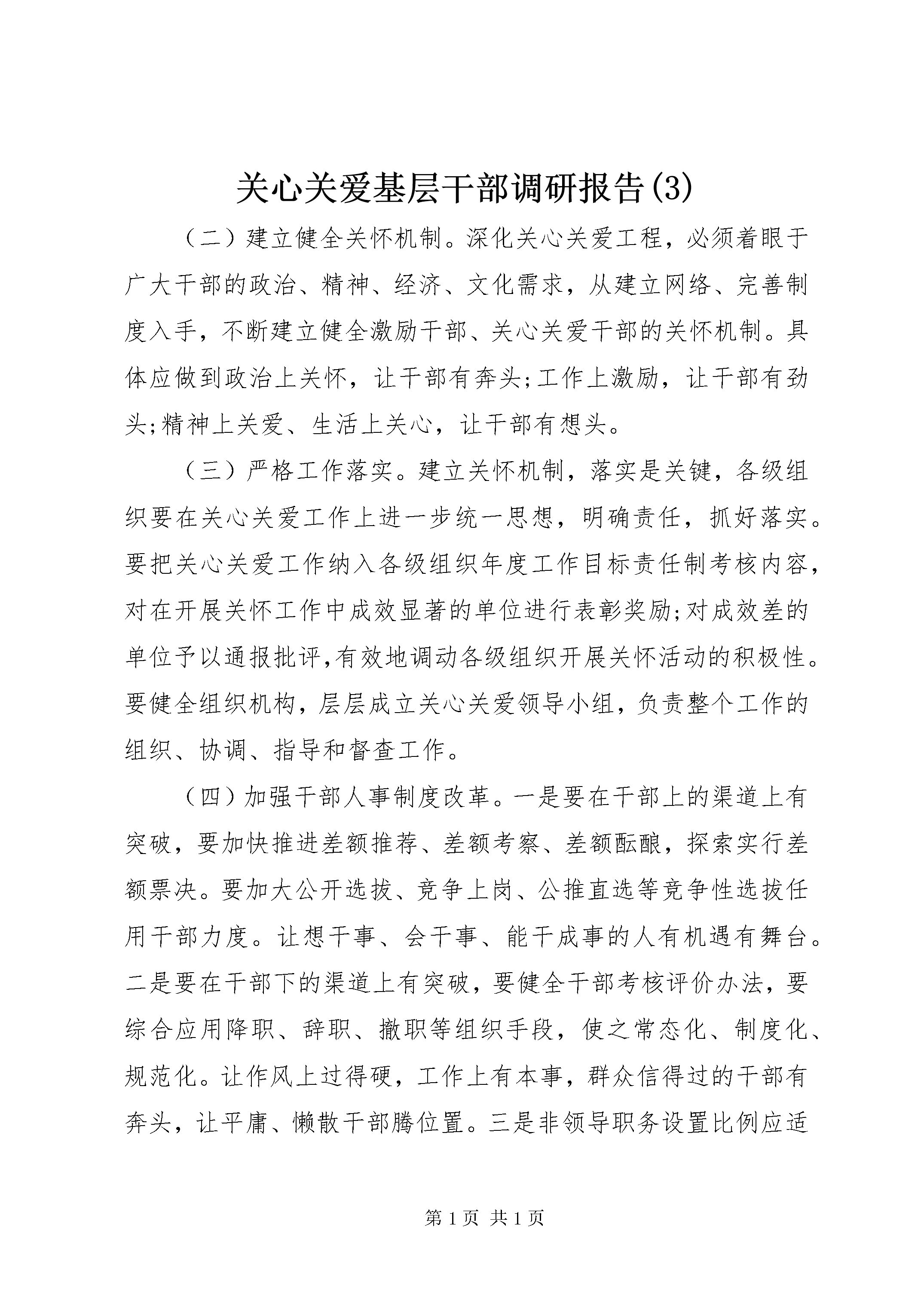 关心关爱基层干部调研报告(3)(二)建立健全关怀机制。深化关心关爱工程,必须着眼于广大干部的政治、精神、经济、文化需求,从建立网络、完善制度入手,不断建立健全激励干部、关心关爱干部的关怀机制。具体应做到政治上关怀,让干部有奔头;工作上激励,让干部有劲头;精神上关爱、生活上关心,让干部有想头。(三)严格工作落实。建立关怀机制,落实是关键,各级组织要在关心关爱工作上进一步统一思想,明确责任,抓好落实。要把关心关爱工作纳入各级组织年度工作目标责任制考核内容,对在开展关怀工作中成效显著的单位进行表彰奖励;对成效差的单位予以通报批评,有效地调动各级组织开展关怀活动的积极性。要健全组织机构,层层成立关心关爱领导小组,负责整个工作的组织、协调、指导和督查工作。(四)加强干部人事制度改革。一是要在干部上的渠道上有突破,要加快推进差额推荐、差额考察、差额酝酿,探索实行差额票决。要加大公开选拔、竞争上岗、公推直选等竞争性选拔任用干部力度。让想干事、会干事、能干成事的人有机遇有舞台。二是要在干部下的渠道上有突破,要健全干部考核评价办法,要综合应用降职、辞职、撤职等组织手段,使之常态化、制度化、规范化。让作风上过得硬,工作上有本事,群众信得过的干部有奔头,让平庸、懒散干部腾位置。三是非领导职务设置比例应适当向县乡倾斜,以我县目前非领导职务设置为例,因受机构规格和领导职数限制,1996年以后参加工作的本科毕业生,1994年以后参加工作的专科毕业生,1990年以后参加工作的中专(高中)毕业生,到目前为止,除现任领导职务或从领导职务改非的少部分人员外,全部为科员或办事员,也就是说:以上三类人员多数人在十几年的工作中只有从办事员到科员能按规定正常晋级。然而同类人员如果参加工作就在市直机关甚至省直机关,因所属部门的机构规格较高,可能早已经享受副主任科员或主任科员待遇。