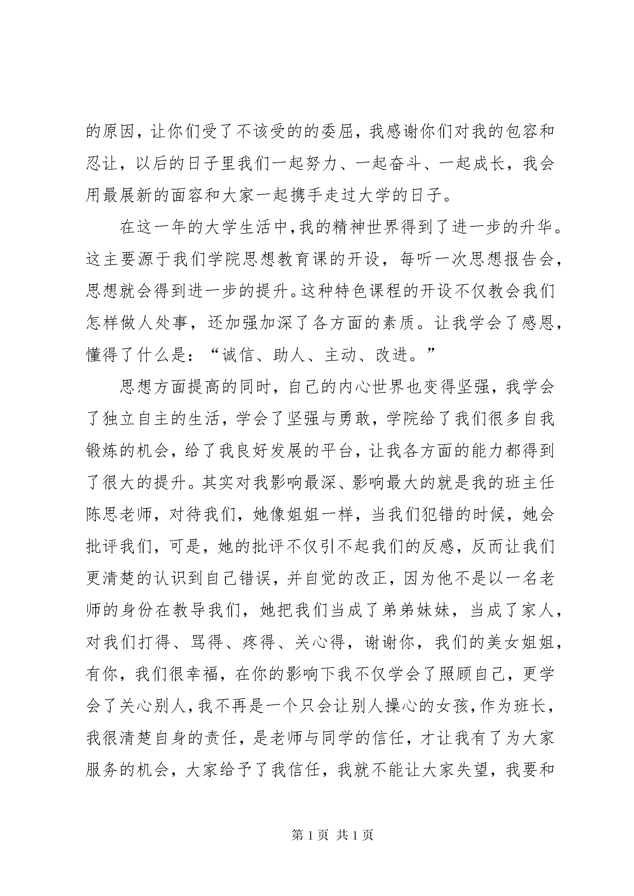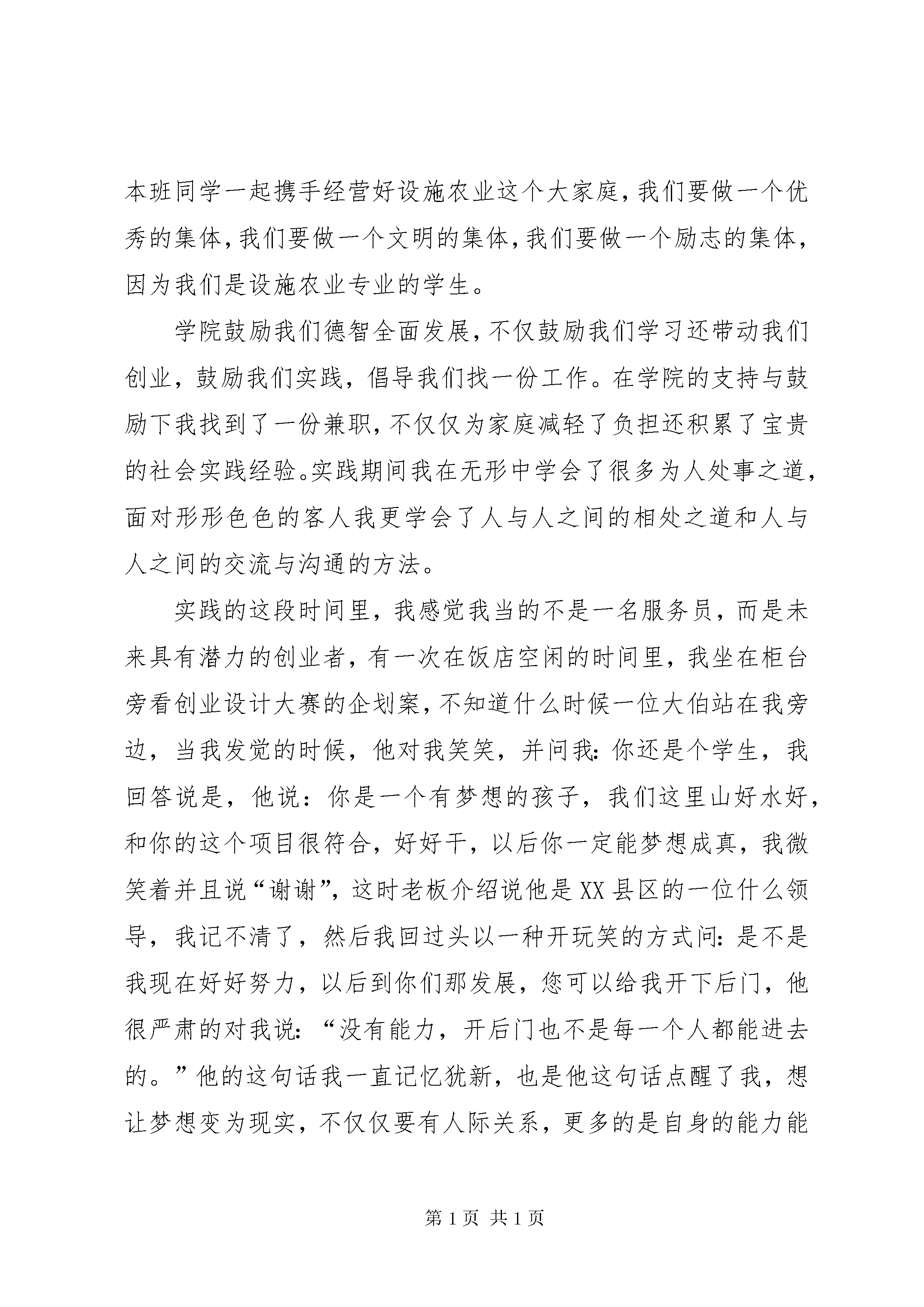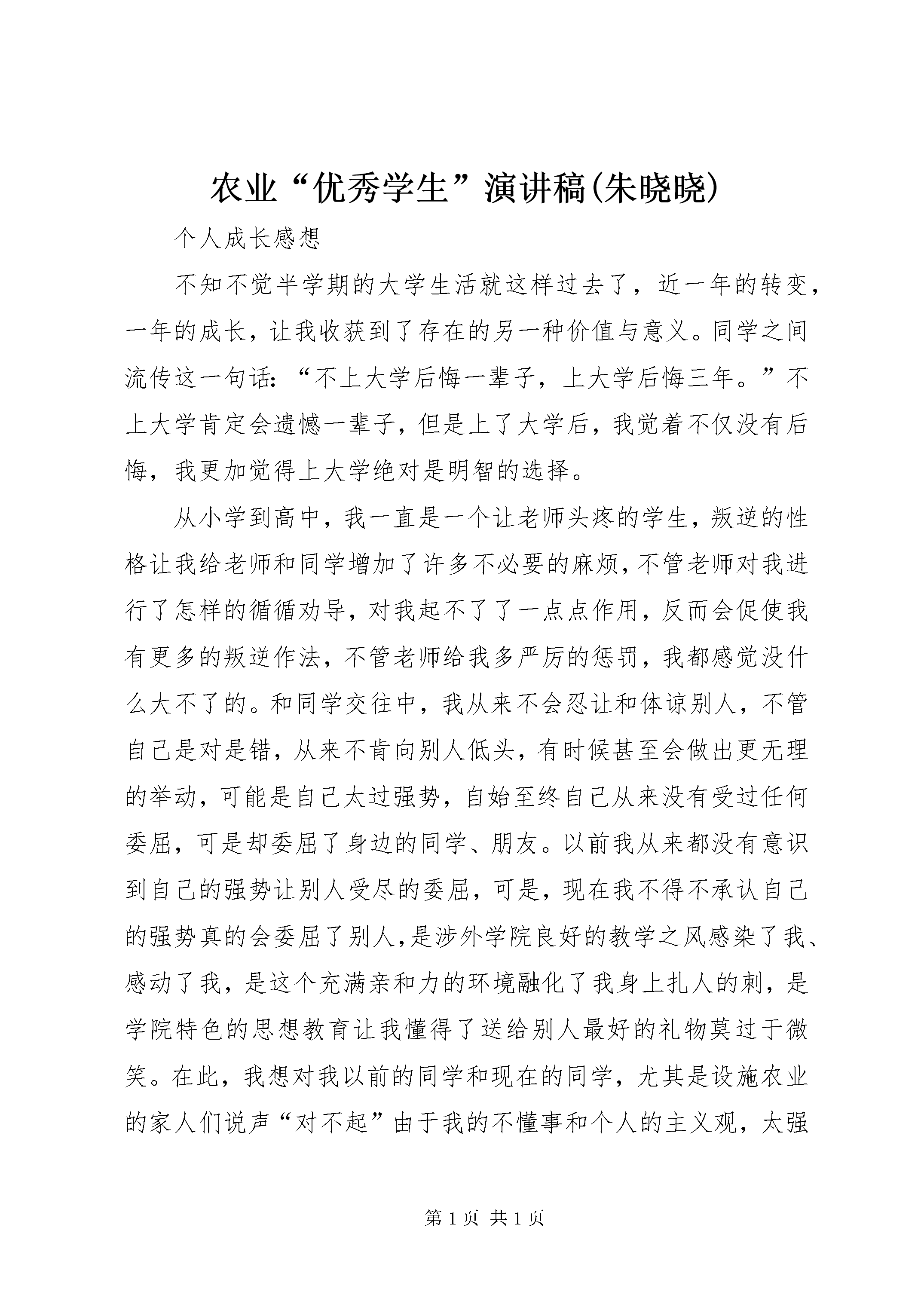 农业“优秀学生”演讲稿(朱晓晓)个人成长感想不知不觉半学期的大学生活就这样过去了,近一年的转变,一年的成长,让我收获到了存在的另一种价值与意义。同学之间流传这一句话:“不上大学后悔一辈子,上大学后悔三年。”不上大学肯定会遗憾一辈子,但是上了大学后,我觉着不仅没有后悔,我更加觉得上大学绝对是明智的选择。从小学到高中,我一直是一个让老师头疼的学生,叛逆的性格让我给老师和同学增加了许多不必要的麻烦,不管老师对我进行了怎样的循循劝导,对我起不了了一点点作用,反而会促使我有更多的叛逆作法,不管老师给我多严厉的惩罚,我都感觉没什么大不了的。和同学交往中,我从来不会忍让和体谅别人,不管自己是对是错,从来不肯向别人低头,有时候甚至会做出更无理的举动,可能是自己太过强势,自始至终自己从来没有受过任何委屈,可是却委屈了身边的同学、朋友。以前我从来都没有意识到自己的强势让别人受尽的委屈,可是,现在我不得不承认自己的强势真的会委屈了别人,是涉外学院良好的教学之风感染了我、感动了我,是这个充满亲和力的环境融化了我身上扎人的刺,是学院特色的思想教育让我懂得了送给别人最好的礼物莫过于微笑。在此,我想对我以前的同学和现在的同学,尤其是设施农业的家人们说声“对不起”由于我的不懂事和个人的主义观,太强的原因,让你们受了不该受的的委屈,我感谢你们对我的包容和忍让,以后的日子里我们一起努力、一起奋斗、一起成长,我会用最展新的面容和大家一起携手走过大学的日子。在这一年的大学生活中,我的精神世界得到了进一步的升华。这主要源于我们学院思想教育课的开设,每听一次思想报告会,思想就会得到进一步的提升。这种特色课程的开设不仅教会我们怎样做人处事,还加强加深了各方面的素质。让我学会了感恩,懂得了什么是:“诚信、助人、主动、改进。”思想方面提高的同时,自己的内心世界也变得坚强,我学会了独立自主的生活,学会了坚强与勇敢,学院给了我们很多自我锻炼的机会,给了我良好发展的平台,让我各方面的能力都得到了很大的提升。其实对我影响最深、影响最大的就是我的班主任陈思老师,对待我们,她像姐姐一样,当我们犯错的时候,她会批评我们,可是,她的批评不仅引不起我们的反感,反而让我们更清楚的认识到自己错误,并自觉的改正,因为他不是以一名老师的身份在教导我们,她把我们当成了弟弟妹妹,当成了家人,对我们打得、骂得、疼得、关心得,谢谢你,我们的美女姐姐,有你,我们很幸福,在你的影响下我不仅学会了照顾自己,更学会了关心别人,我不再是一个只会让别人操心的女孩,作为班长,我很清楚自身的责任,是老师与同学的信任,才让我有了为大家服务的机会,大家给予了我信任,我就不能让大家失望,我要和本班同学一起携手经营好设施农业这个大家庭,我们要做一个优秀的集体,我们要做一个文明的集体,我们要做一个励志的集体,因为我们是设施农业专业的学生。学院鼓励我们德智全面发展,不仅鼓励我们学习还带动我们创业,鼓励我们实践,倡导我们找一份工作。在学院的支持与鼓励下我找到了一份兼职,不仅仅为家庭减轻了负担还积累了宝贵的社会实践经验。实践期间我在无形中学会了很多为人处事之道,面对形形色色的客人我更学会了人与人之间的相处之道和人与人之间的交流与沟通的方法。实践的这段时间里,我感觉我当的不是一名服务员,而是未来具有潜力的创业者,有一次在饭店空闲的时间里,我坐在柜台旁看创业设计大赛的企划案,不知道什么时候一位大伯站在我旁边,当我发觉的时候,他对我笑笑,并问我:你还是个学生,我回答说是,他说:你是一个有梦想的孩子,我们这里山好水好,和你的这个项目很符合,好好干,以后你一定能梦想成真,我微笑着并且说“谢谢”,这时老板介绍说他是XX县区的一位什么领导,我记不清了,然后我回过头以一种开玩笑的方式问:是不是我现在好好努力,以后到你们那发展,您可以给我开下后门,他很严肃的对我说:“没有能力,开后门也不是每一个人都能进去的。”他的这句话我一直记忆犹新,也是他这句话点醒了我,想让梦想变为现实,不仅仅要有人际关系,更多的是自身的能力能否得到别人的肯定,能否让别人相信你并给予你支持,实践这段时间,每周都要写一份实践感想,刚开始我从心里上有些抵触,总是用一种很敷衍的态度对待,有一次我在整理书桌时,翻开每周的实践草稿看了一遍,我深深的感觉到这不仅仅是一份作业,一份感想,它更是我成长历程的记忆录,对我的内心有很大的启发与触动,那一刻起我发自内心的感谢学院领导和实践办的老师,谢谢你们的良苦用心。这一年的大学生活,给我的人生增添了别样的精彩,虽然只是短短的几个月,却给了我不一样的成长经历。我感谢学院对我的淳淳教导,我感恩每一位老师,我感谢每一位同学,因为有你们我大学的生活才那么的充实,那么的有意义。我以后一定要继续继承与发扬学院教书育人的良好精神,争取做到‘‘他人满意我愿成’’