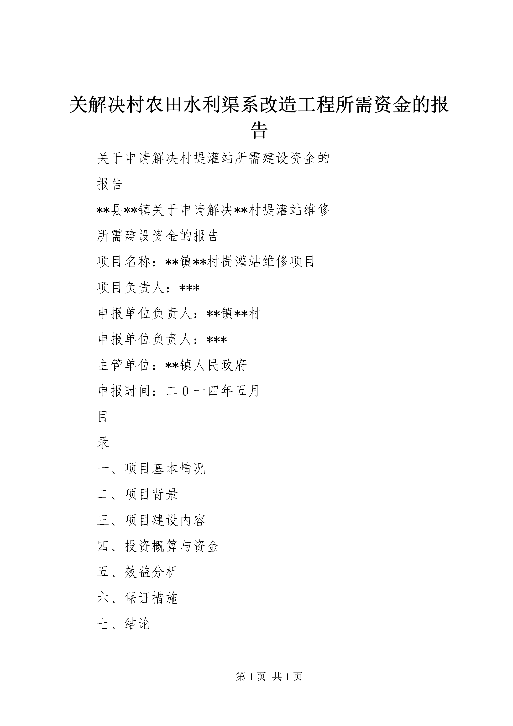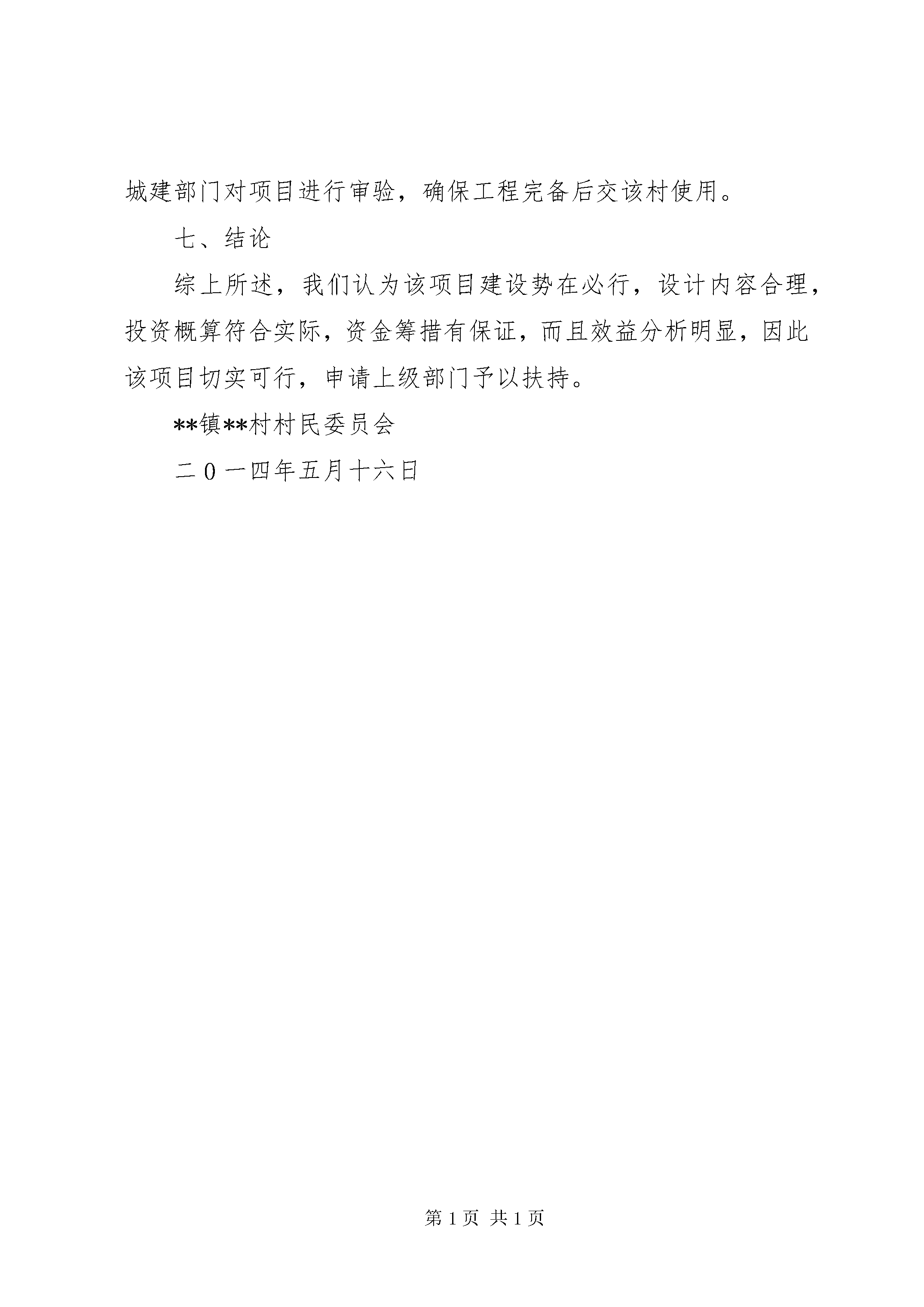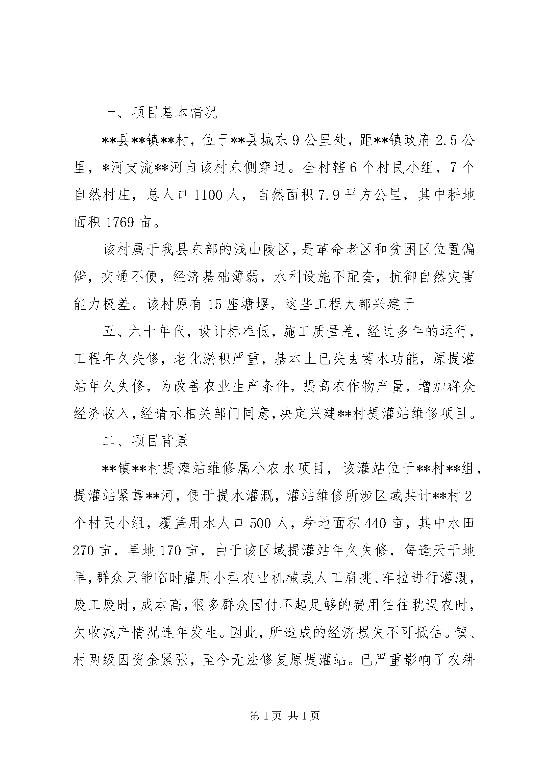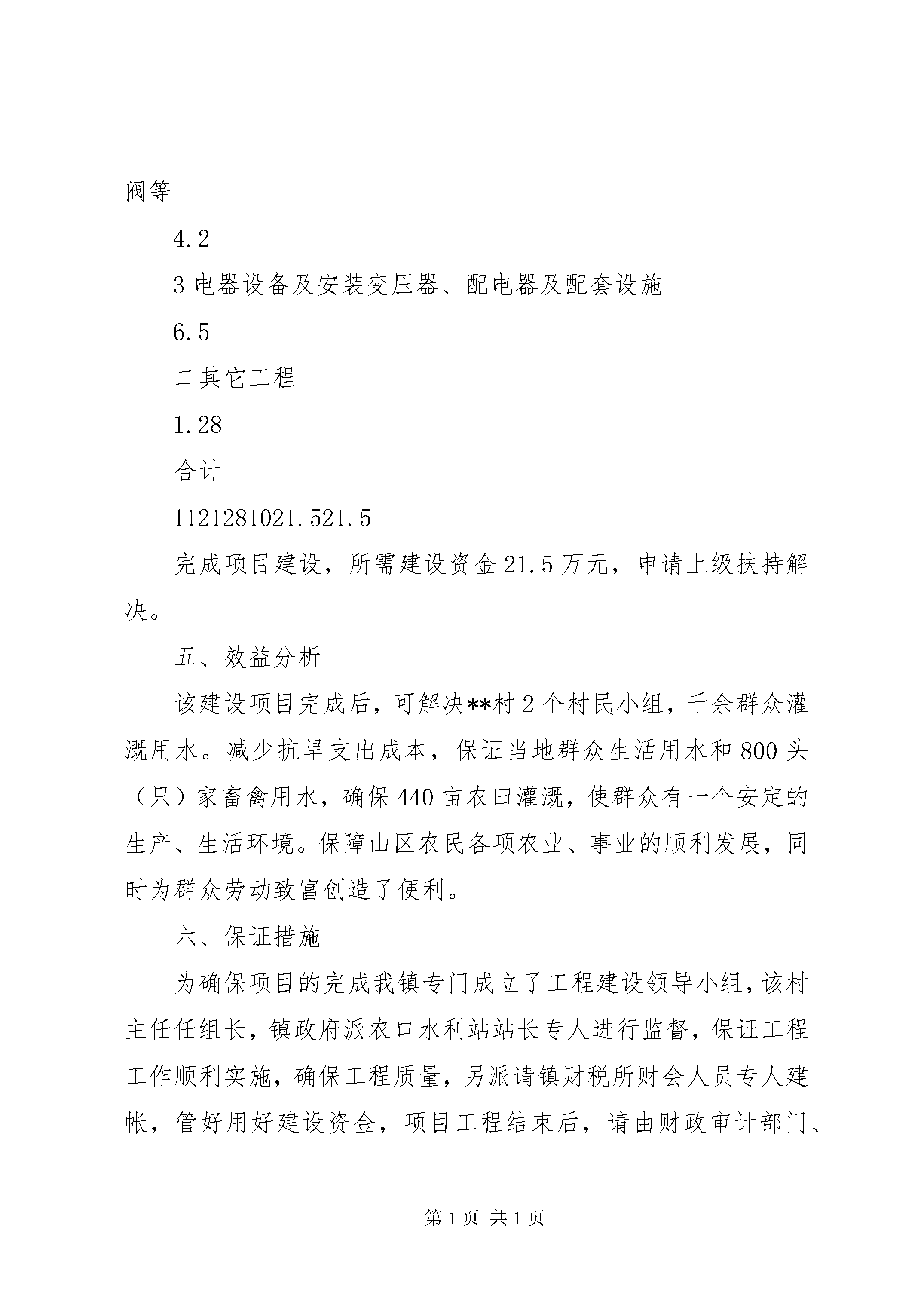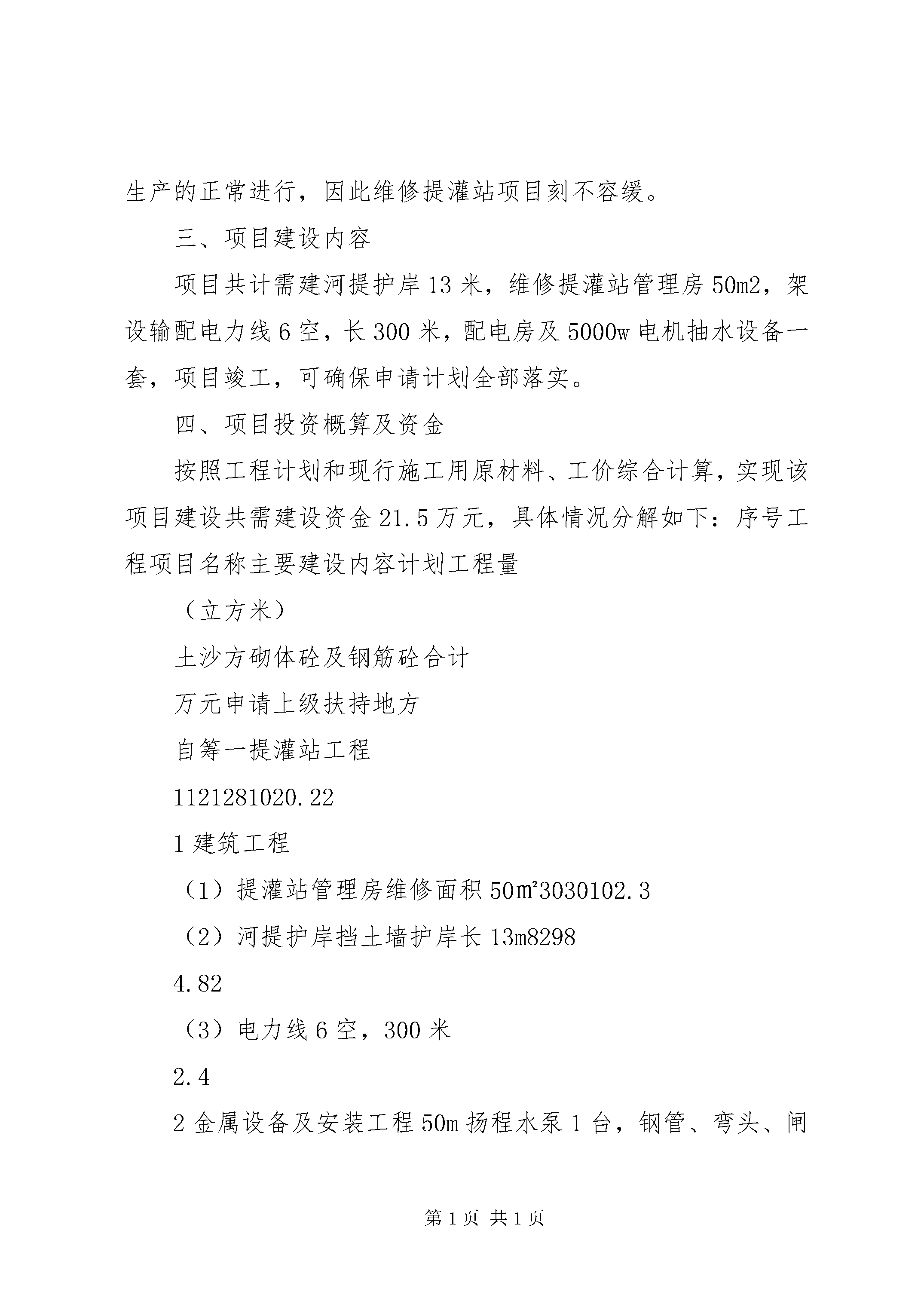 关解决村农田水利渠系改造工程所需资金的报告关于申请解决村提灌站所需建设资金的报告**县**镇关于申请解决**村提灌站维修所需建设资金的报告项目名称:**镇**村提灌站维修项目项目负责人:***申报单位负责人:**镇**村申报单位负责人:***主管单位:**镇人民政府申报时间:二0一四年五月目录一、项目基本情况二、项目背景三、项目建设内容四、投资概算与资金五、效益分析六、保证措施七、结论一、项目基本情况**县**镇**村,位于**县城东9公里处,距**镇政府2.5公里,*河支流**河自该村东侧穿过。全村辖6个村民小组,7个自然村庄,总人口1100人,自然面积7.9平方公里,其中耕地面积1769亩。该村属于我县东部的浅山陵区,是革命老区和贫困区位置偏僻,交通不便,经济基础薄弱,水利设施不配套,抗御自然灾害能力极差。该村原有15座塘堰,这些工程大都兴建于五、六十年代,设计标准低,施工质量差,经过多年的运行,工程年久失修,老化淤积严重,基本上已失去蓄水功能,原提灌站年久失修,为改善农业生产条件,提高农作物产量,增加群众经济收入,经请示相关部门同意,决定兴建**村提灌站维修项目。二、项目背景**镇**村提灌站维修属小农水项目,该灌站位于**村**组,提灌站紧靠**河,便于提水灌溉,灌站维修所涉区域共计**村2个村民小组,覆盖用水人口500人,耕地面积440亩,其中水田270亩,旱地170亩,由于该区域提灌站年久失修,每逢天干地旱,群众只能临时雇用小型农业机械或人工肩挑、车拉进行灌溉,废工废时,成本高,很多群众因付不起足够的费用往往耽误农时,欠收减产情况连年发生。因此,所造成的经济损失不可抵估。镇、村两级因资金紧张,至今无法修复原提灌站。已严重影响了农耕生产的正常进行,因此维修提灌站项目刻不容缓。三、项目建设内容项目共计需建河提护岸13米,维修提灌站管理房50m2,架设输配电力线6空,长300米,配电房及5000w电机抽水设备一套,项目竣工,可确保申请计划全部落实。四、项目投资概算及资金按照工程计划和现行施工用原材料、工价综合计算,实现该项目建设共需建设资金21.5万元,具体情况分解如下:序号工程项目名称主要建设内容计划工程量(立方米)土沙方砌体砼及钢筋砼合计万元申请上级扶持地方自筹一提灌站工程1121281020.221建筑工程(1)提灌站管理房维修面积50㎡3030102.3(2)河提护岸挡土墙护岸长13m82984.82(3)电力线6空,300米2.42金属设备及安装工程50m扬程水泵1台,钢管、弯头、闸阀等4.23电器设备及安装变压器、配电器及配套设施6.5二其它工程1.28合计1121281021.521.5完成项目建设,所需建设资金21.5万元,申请上级扶持解决。五、效益分析该建设项目完成后,可解决**村2个村民小组,千余群众灌溉用水。减少抗旱支出成本,保证当地群众生活用水和800头(只)家畜禽用水,确保440亩农田灌溉,使群众有一个安定的生产、生活环境。保障山区农民各项农业、事业的顺利发展,同时为群众劳动致富创造了便利。六、保证措施为确保项目的完成我镇专门成立了工程建设领导小组,该村主任任组长,镇政府派农口水利站站长专人进行监督,保证工程工作顺利实施,确保工程质量,另派请镇财税所财会人员专人建帐,管好用好建设资金,项目工程结束后,请由财政审计部门、城建部门对项目进行审验,确保工程完备后交该村使用。七、结论综上所述,我们认为该项目建设势在必行,设计内容合理,投资概算符合实际,资金筹措有保证,而且效益分析明显,因此该项目切实可行,申请上级部门予以扶持。**镇**村村民委员会二0一四年五月十六日