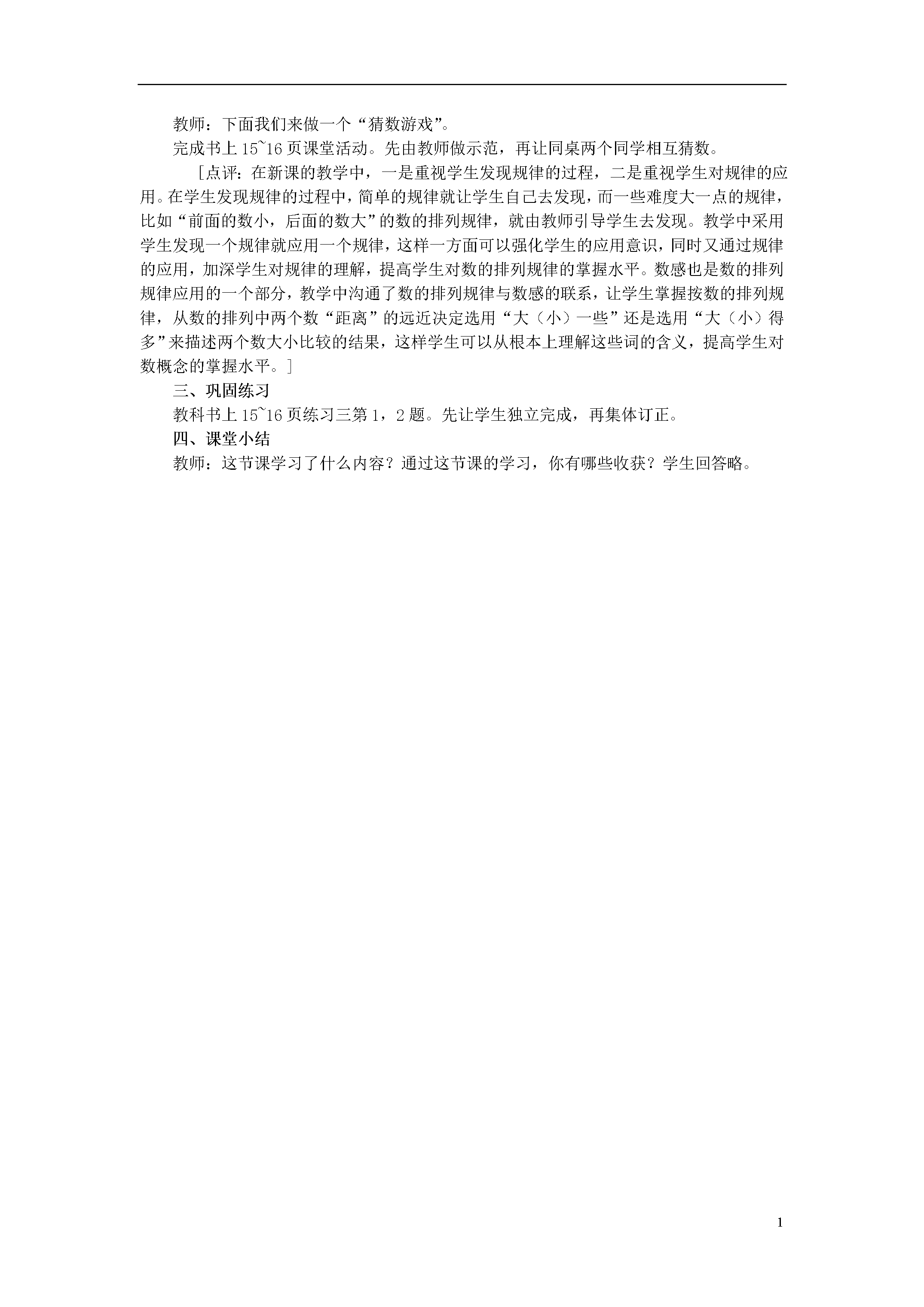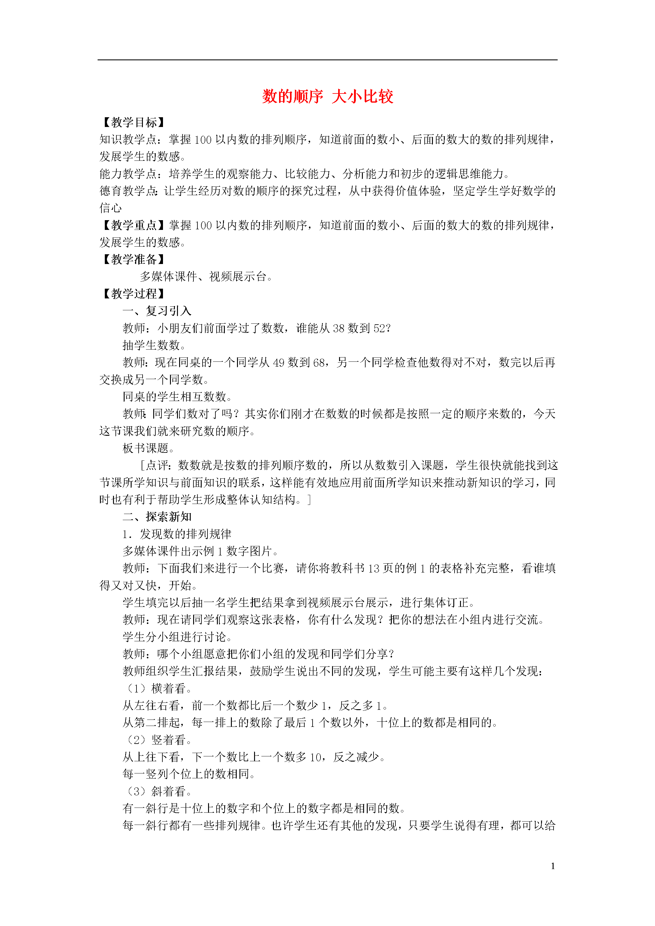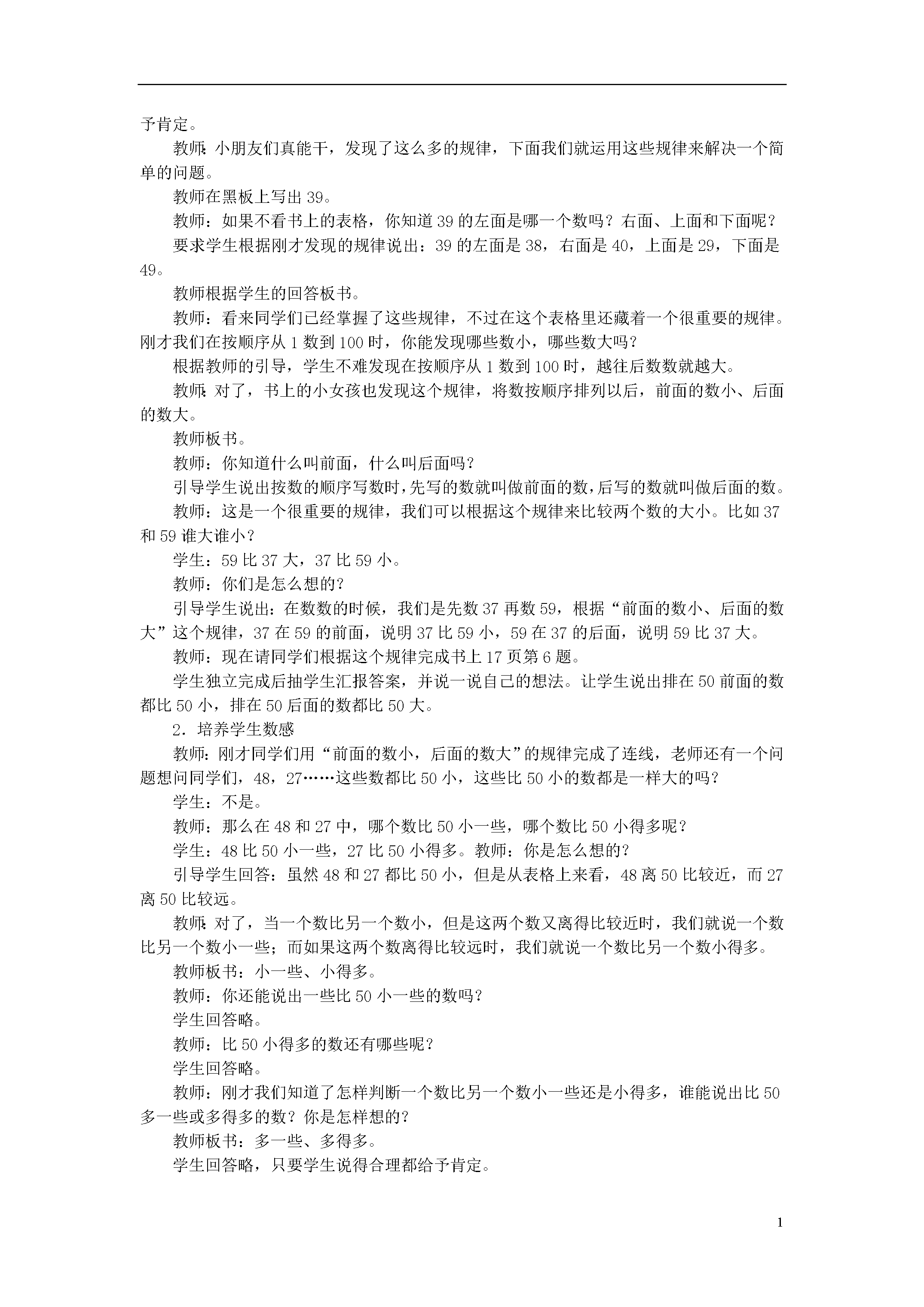 1数的顺序大小比较【教学目标】知识教学点:掌握100以内数的排列顺序,知道前面的数小、后面的数大的数的排列规律,发展学生的数感。能力教学点:培养学生的观察能力、比较能力、分析能力和初步的逻辑思维能力。德育教学点:让学生经历对数的顺序的探究过程,从中获得价值体验,坚定学生学好数学的信心【教学重点】掌握100以内数的排列顺序,知道前面的数小、后面的数大的数的排列规律,发展学生的数感。【教学准备】多媒体课件、视频展示台。【教学过程】一、复习引入教师:小朋友们前面学过了数数,谁能从38数到52?抽学生数数。教师:现在同桌的一个同学从49数到68,另一个同学检查他数得对不对,数完以后再交换成另一个同学数。同桌的学生相互数数。教师:同学们数对了吗?其实你们刚才在数数的时候都是按照一定的顺序来数的,今天这节课我们就来研究数的顺序。板书课题。[点评:数数就是按数的排列顺序数的,所以从数数引入课题,学生很快就能找到这节课所学知识与前面知识的联系,这样能有效地应用前面所学知识来推动新知识的学习,同时也有利于帮助学生形成整体认知结构。]二、探索新知1.发现数的排列规律多媒体课件出示例1数字图片。教师:下面我们来进行一个比赛,请你将教科书13页的例1的表格补充完整,看谁填得又对又快,开始。学生填完以后抽一名学生把结果拿到视频展示台展示,进行集体订正。教师:现在请同学们观察这张表格,你有什么发现?把你的想法在小组内进行交流。学生分小组进行讨论。教师:哪个小组愿意把你们小组的发现和同学们分享?教师组织学生汇报结果,鼓励学生说出不同的发现,学生可能主要有这样几个发现:(1)横着看。从左往右看,前一个数都比后一个数少1,反之多1。从第二排起,每一排上的数除了最后1个数以外,十位上的数都是相同的。(2)竖着看。从上往下看,下一个数比上一个数多10,反之减少。每一竖列个位上的数相同。(3)斜着看。有一斜行是十位上的数字和个位上的数字都是相同的数。每一斜行都有一些排列规律。也许学生还有其他的发现,只要学生说得有理,都可以给予肯定。教师:小朋友们真能干,发现了这么多的规律,下面我们就运用这些规律来解决一个简单的问题。教师在黑板上写出39。教师:如果不看书上的表格,你知道39的左面是哪一个数吗?右面、上面和下面呢?要求学生根据刚才发现的规律说出:39的左面是38,右面是40,上面是29,下面是49。教师根据学生的回答板书。教师:看来同学们已经掌握了这些规律,不过在这个表格里还藏着一个很重要的规律。刚才我们在按顺序从1数到100时,你能发现哪些数小,哪些数大吗?根据教师的引导,学生不难发现在按顺序从1数到100时,越往后数数就越大。教师:对了,书上的小女孩也发现这个规律,将数按顺序排列以后,前面的数小、后面的数大。教师板书。教师:你知道什么叫前面,什么叫后面吗?引导学生说出按数的顺序写数时,先写的数就叫做前面的数,后写的数就叫做后面的数。教师:这是一个很重要的规律,我们可以根据这个规律来比较两个数的大小。比如37和59谁大谁小?学生:59比37大,37比59小。教师:你们是怎么想的?引导学生说出:在数数的时候,我们是先数37再数59,根据“前面的数小、后面的数大”这个规律,37在59的前面,说明37比59小,59在37的后面,说明59比37大。教师:现在请同学们根据这个规律完成书上17页第6题。学生独立完成后抽学生汇报答案,并说一说自己的想法。让学生说出排在50前面的数都比50小,排在50后面的数都比50大。2.培养学生数感教师:刚才同学们用“前面的数小,后面的数大”的规律完成了连线,老师还有一个问题想问同学们,48,27……这些数都比50小,这些比50小的数都是一样大的吗?学生:不是。教师:那么在48和27中,哪个数比50小一些,哪个数比50小得多呢?学生:48比50小一些,27比50小得多。教师:你是怎么想的?引导学生回答:虽然48和27都比50小,但是从表格上来看,48离50比较近,而27离50比较远。教师:对了,当一个数比另一个数小,但是这两个数又离得比较近时,我们就说一个数比另一个数小一些;而如果这两个数离得比较远时,我们就说一个数比另一个数小得多。教师板书:小一些、小得多。教师:你还能说出一些比50小一些的数吗?学生回答略。教师:比50小得多的数还有哪些呢?学生回答略。教师:刚才我们知道了怎样判断一个数比另一个数小一些还是小得多,谁能说出比50多一些或多得多的数?你是怎样想的?教师板书:多一些、多得多。学生回答略,只要学生说得合理都给予肯定。教师:下面我们来做一个“猜数游戏”。完成书上15~16页课堂活动。先由教师做示范,再让同桌两个同学相互猜数。[点评:在新课的教学中,一是重视学生发现规律的过程,二是重视学生对规律的应用。在学生发现规律的过程中,简单的规律