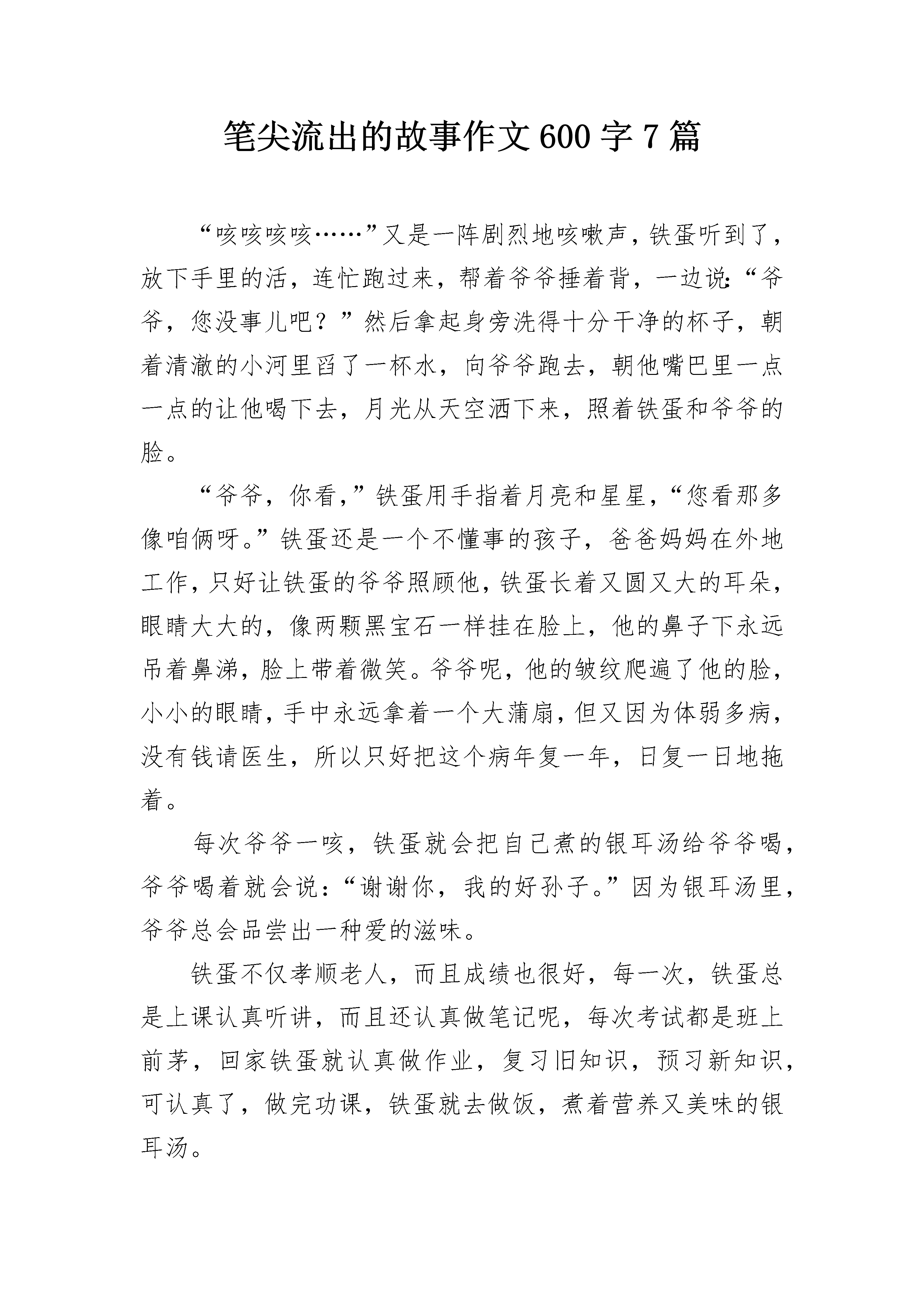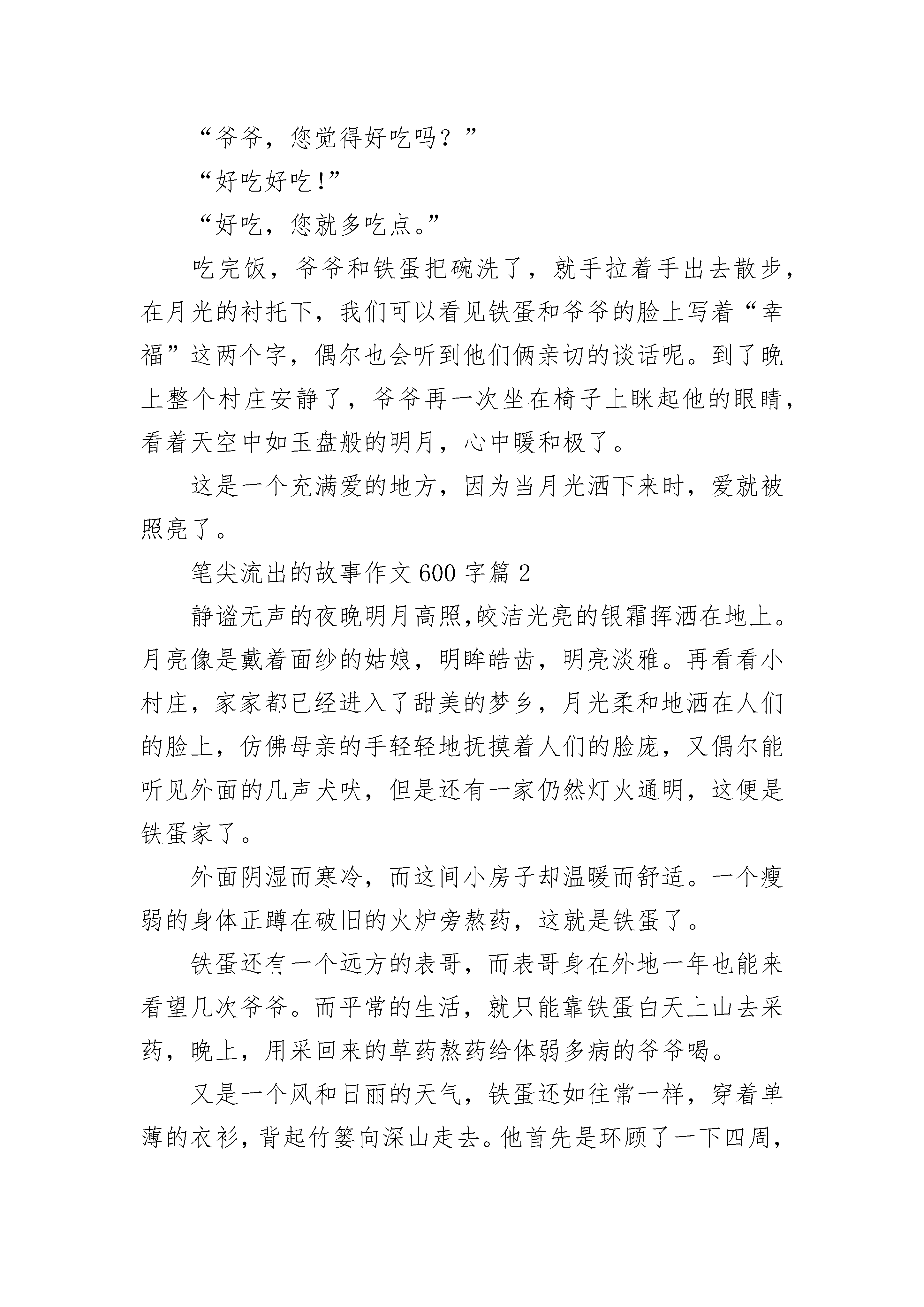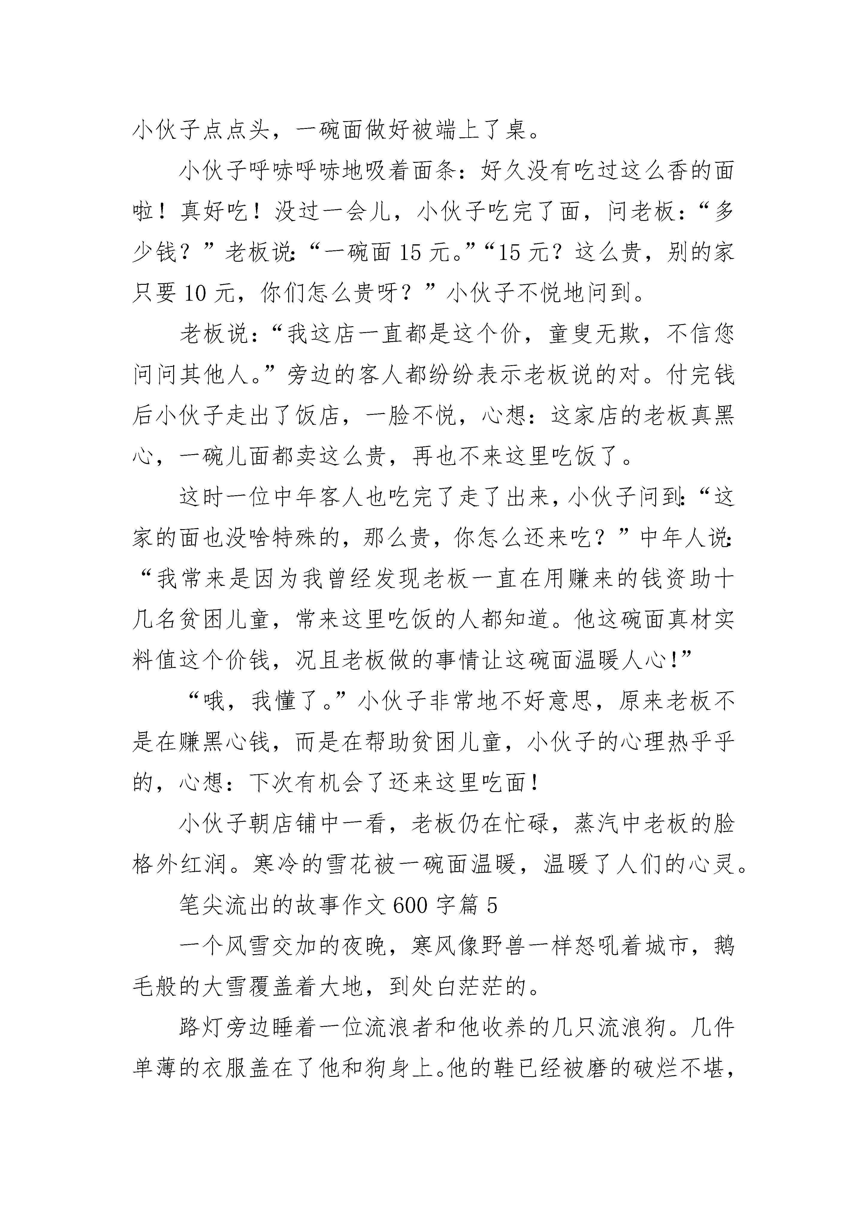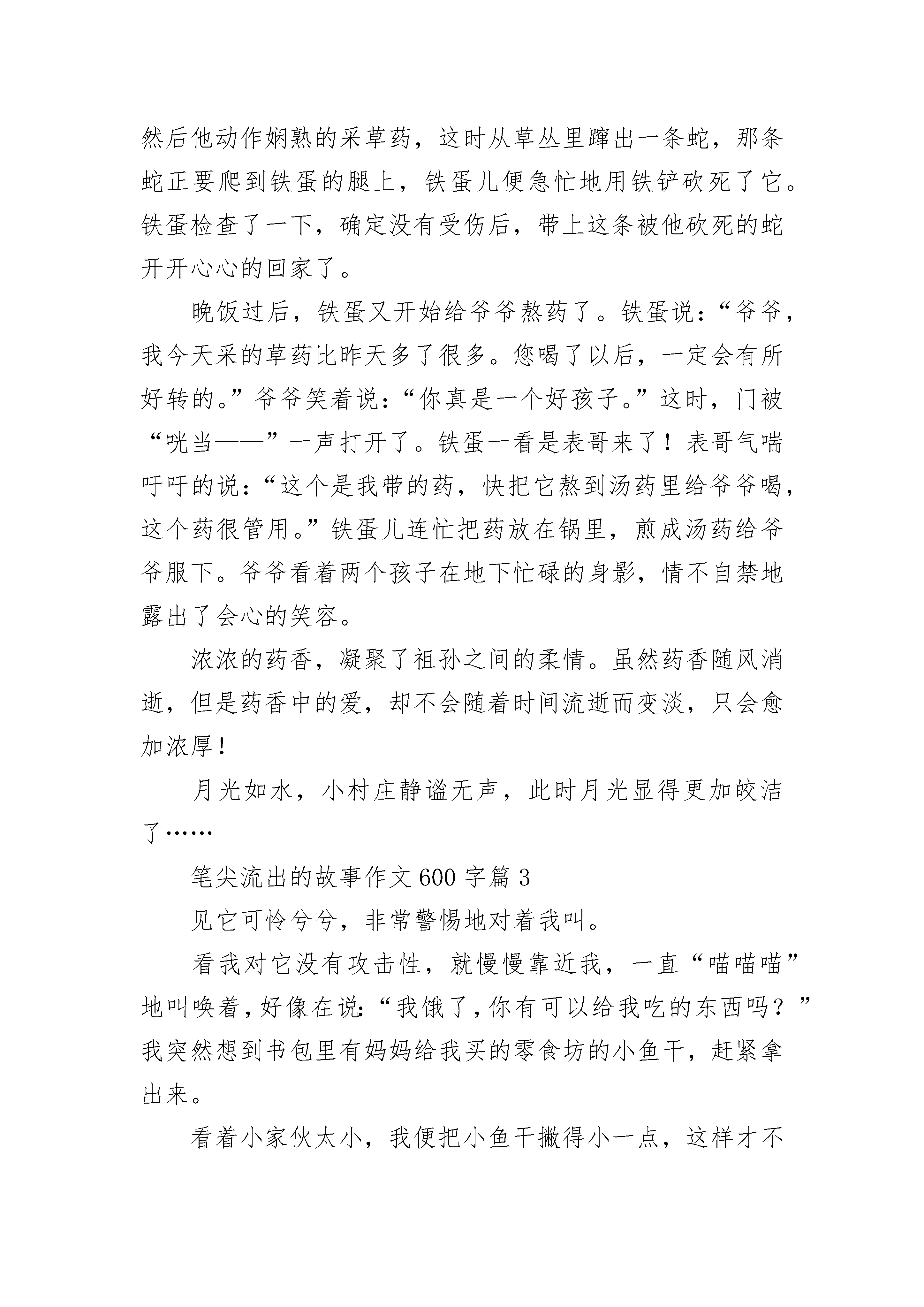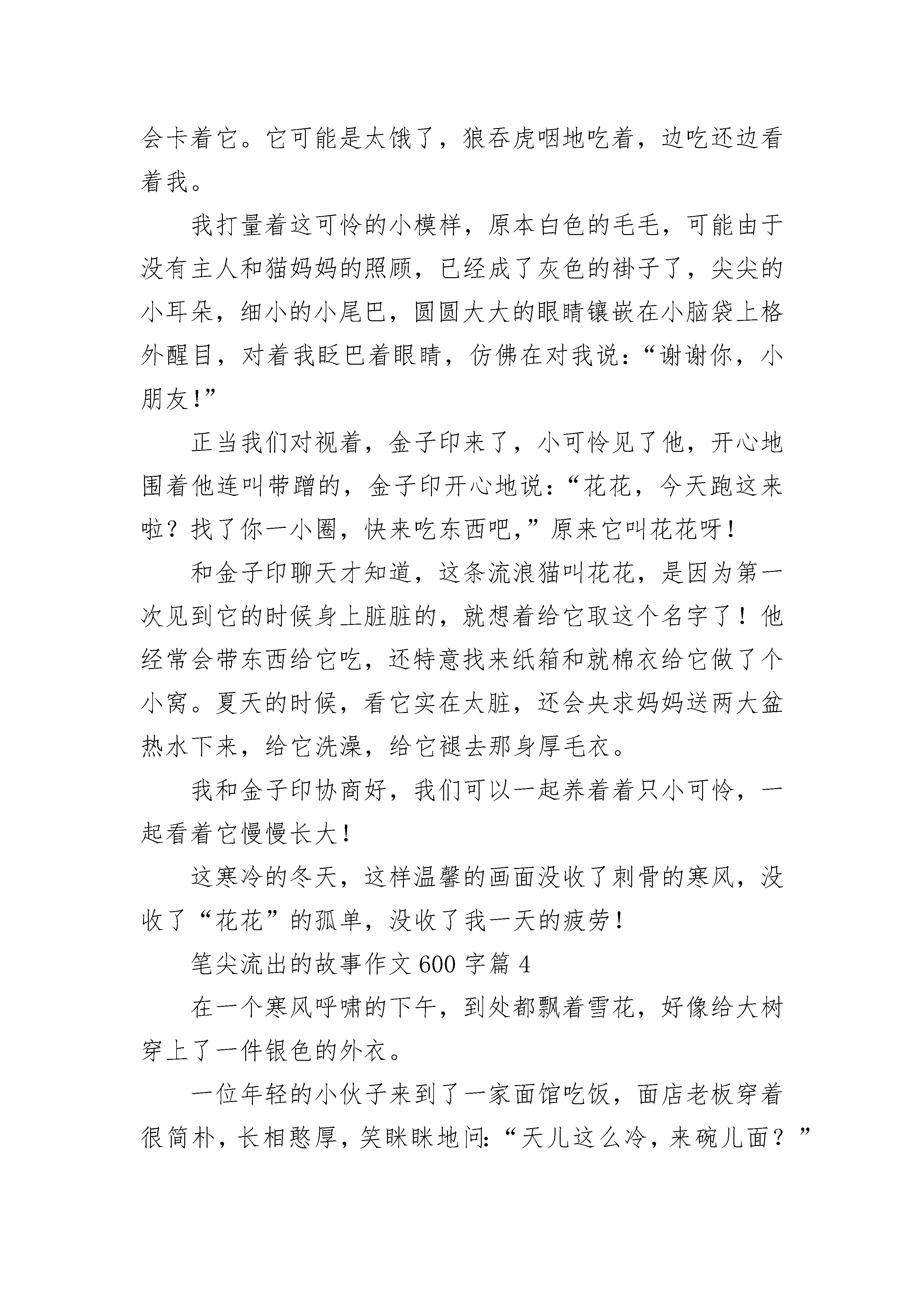 笔尖流出的故事作文600字7篇“咳咳咳咳……”又是一阵剧烈地咳嗽声,铁蛋听到了,放下手里的活,连忙跑过来,帮着爷爷捶着背,一边说:“爷爷,您没事儿吧?”然后拿起身旁洗得十分干净的杯子,朝着清澈的小河里舀了一杯水,向爷爷跑去,朝他嘴巴里一点一点的让他喝下去,月光从天空洒下来,照着铁蛋和爷爷的脸。“爷爷,你看,”铁蛋用手指着月亮和星星,“您看那多像咱俩呀。”铁蛋还是一个不懂事的孩子,爸爸妈妈在外地工作,只好让铁蛋的爷爷照顾他,铁蛋长着又圆又大的耳朵,眼睛大大的,像两颗黑宝石一样挂在脸上,他的鼻子下永远吊着鼻涕,脸上带着微笑。爷爷呢,他的皱纹爬遍了他的脸,小小的眼睛,手中永远拿着一个大蒲扇,但又因为体弱多病,没有钱请医生,所以只好把这个病年复一年,日复一日地拖着。每次爷爷一咳,铁蛋就会把自己煮的银耳汤给爷爷喝,爷爷喝着就会说:“谢谢你,我的好孙子。”因为银耳汤里,爷爷总会品尝出一种爱的滋味。铁蛋不仅孝顺老人,而且成绩也很好,每一次,铁蛋总是上课认真听讲,而且还认真做笔记呢,每次考试都是班上前茅,回家铁蛋就认真做作业,复习旧知识,预习新知识,可认真了,做完功课,铁蛋就去做饭,煮着营养又美味的银耳汤。“爷爷,您觉得好吃吗?”“好吃好吃!”“好吃,您就多吃点。”吃完饭,爷爷和铁蛋把碗洗了,就手拉着手出去散步,在月光的衬托下,我们可以看见铁蛋和爷爷的脸上写着“幸福”这两个字,偶尔也会听到他们俩亲切的谈话呢。到了晚上整个村庄安静了,爷爷再一次坐在椅子上眯起他的眼睛,看着天空中如玉盘般的明月,心中暖和极了。这是一个充满爱的地方,因为当月光洒下来时,爱就被照亮了。笔尖流出的故事作文600字篇2静谧无声的夜晚明月高照,皎洁光亮的银霜挥洒在地上。月亮像是戴着面纱的姑娘,明眸皓齿,明亮淡雅。再看看小村庄,家家都已经进入了甜美的梦乡,月光柔和地洒在人们的脸上,仿佛母亲的手轻轻地抚摸着人们的脸庞,又偶尔能听见外面的几声犬吠,但是还有一家仍然灯火通明,这便是铁蛋家了。外面阴湿而寒冷,而这间小房子却温暖而舒适。一个瘦弱的身体正蹲在破旧的火炉旁熬药,这就是铁蛋了。铁蛋还有一个远方的表哥,而表哥身在外地一年也能来看望几次爷爷。而平常的生活,就只能靠铁蛋白天上山去采药,晚上,用采回来的草药熬药给体弱多病的爷爷喝。又是一个风和日丽的天气,铁蛋还如往常一样,穿着单薄的衣衫,背起竹篓向深山走去。他首先是环顾了一下四周,然后他动作娴熟的采草药,这时从草丛里蹿出一条蛇,那条蛇正要爬到铁蛋的腿上,铁蛋儿便急忙地用铁铲砍死了它。铁蛋检查了一下,确定没有受伤后,带上这条被他砍死的蛇开开心心的回家了。晚饭过后,铁蛋又开始给爷爷熬药了。铁蛋说:“爷爷,我今天采的草药比昨天多了很多。您喝了以后,一定会有所好转的。”爷爷笑着说:“你真是一个好孩子。”这时,门被“咣当——”一声打开了。铁蛋一看是表哥来了!表哥气喘吁吁的说:“这个是我带的药,快把它熬到汤药里给爷爷喝,这个药很管用。”铁蛋儿连忙把药放在锅里,煎成汤药给爷爷服下。爷爷看着两个孩子在地下忙碌的身影,情不自禁地露出了会心的笑容。浓浓的药香,凝聚了祖孙之间的柔情。虽然药香随风消逝,但是药香中的爱,却不会随着时间流逝而变淡,只会愈加浓厚!月光如水,小村庄静谧无声,此时月光显得更加皎洁了……笔尖流出的故事作文600字篇3见它可怜兮兮,非常警惕地对着我叫。看我对它没有攻击性,就慢慢靠近我,一直“喵喵喵”地叫唤着,好像在说:“我饿了,你有可以给我吃的东西吗?”我突然想到书包里有妈妈给我买的零食坊的小鱼干,赶紧拿出来。看着小家伙太小,我便把小鱼干撇得小一点,这样才不会卡着它。它可能是太饿了,狼吞虎咽地吃着,边吃还边看着我。我打量着这可怜的小模样,原本白色的毛毛,可能由于没有主人和猫妈妈的照顾,已经成了灰色的褂子了,尖尖的小耳朵,细小的小尾巴,圆圆大大的眼睛镶嵌在小脑袋上格外醒目,对着我眨巴着眼睛,仿佛在对我说:“谢谢你,小朋友!”正当我们对视着,金子印来了,小可怜见了他,开心地围着他连叫带蹭的,金子印开心地说:“花花,今天跑这来啦?找了你一小圈,快来吃东西吧,”原来它叫花花呀!和金子印聊天才知道,这条流浪猫叫花花,是因为第一次见到它的时候身上脏脏的,就想着给它取这个名字了!他经常会带东西给它吃,还特意找来纸箱和就棉衣给它做了个小窝。夏天的时候,看它实在太脏,还会央求妈妈送两大盆热水下来,给它洗澡,给它褪去那身厚毛衣。我和金子印协商好,我们可以一起养着着只小可怜,一起看着它慢慢长大!这寒冷的冬天,这样温馨的画面没收了刺骨的寒风,没收了“花花”的孤单,没收了我一天的疲劳!笔尖流出的故事作文600字篇4在一个寒风呼啸的下午,到处都飘着雪花,好像给大树穿上了一件银色的外衣。一位年轻的小伙子来到了一家面馆吃饭,面店老板穿着很简朴,长相憨厚,笑眯眯地问: