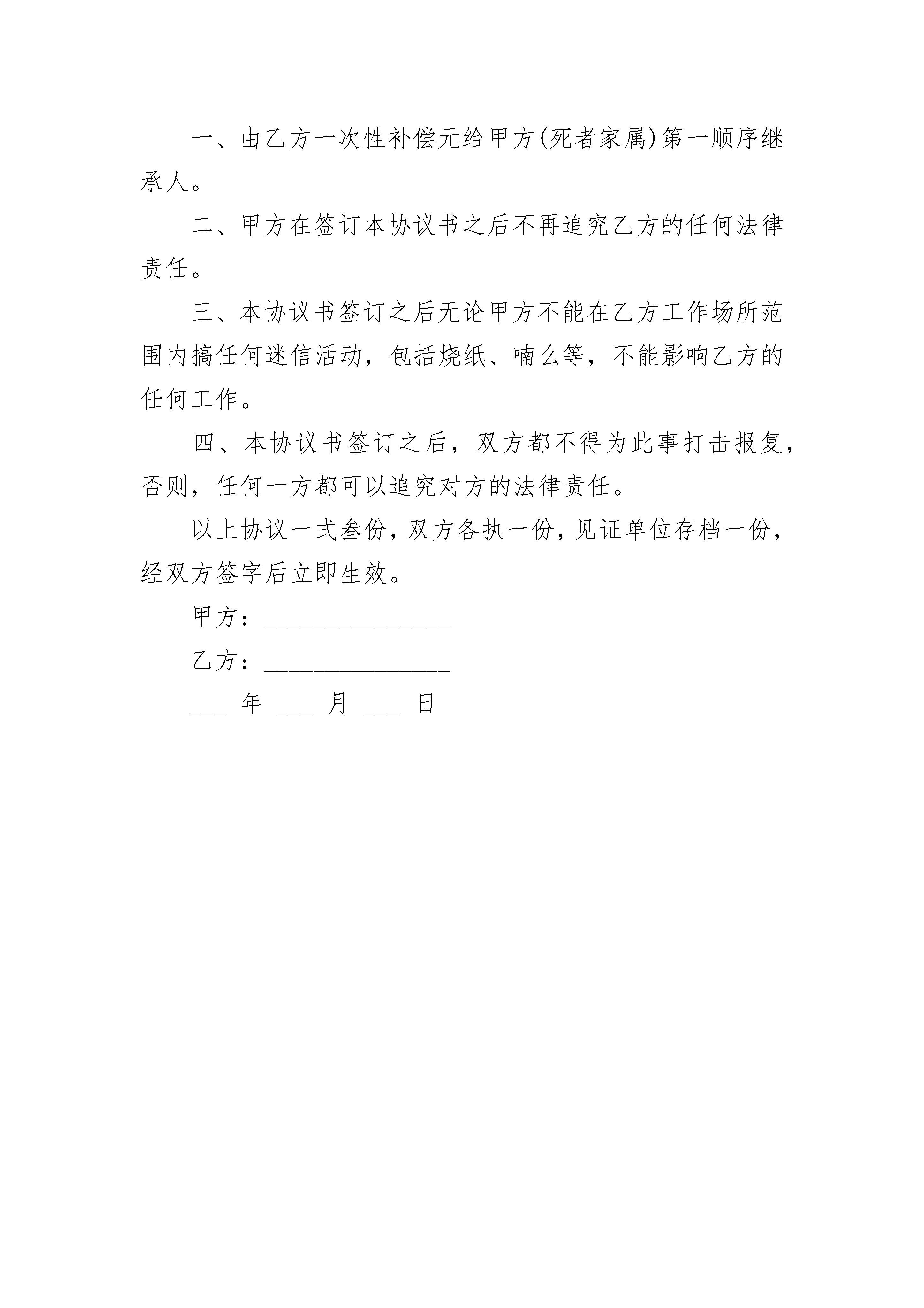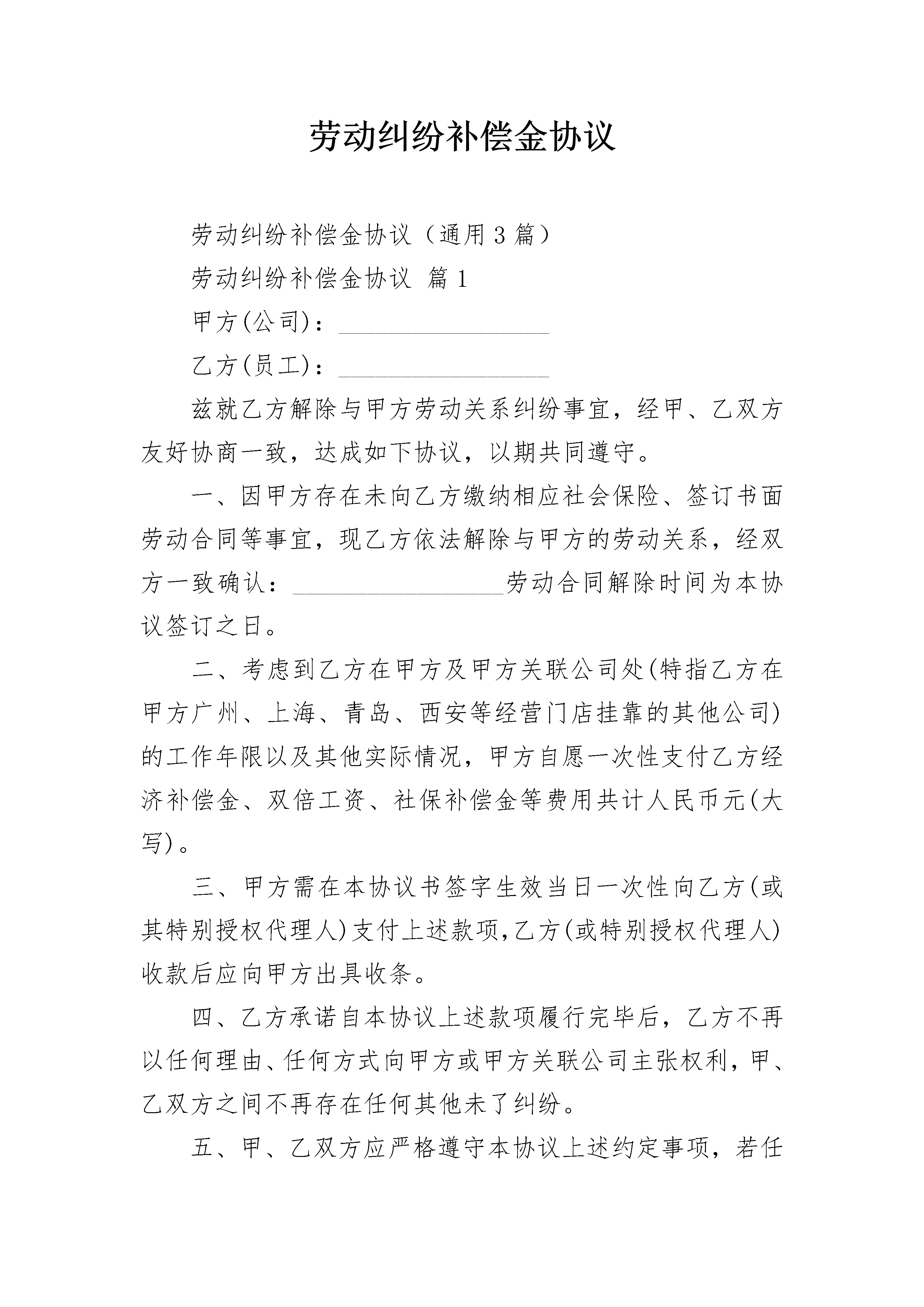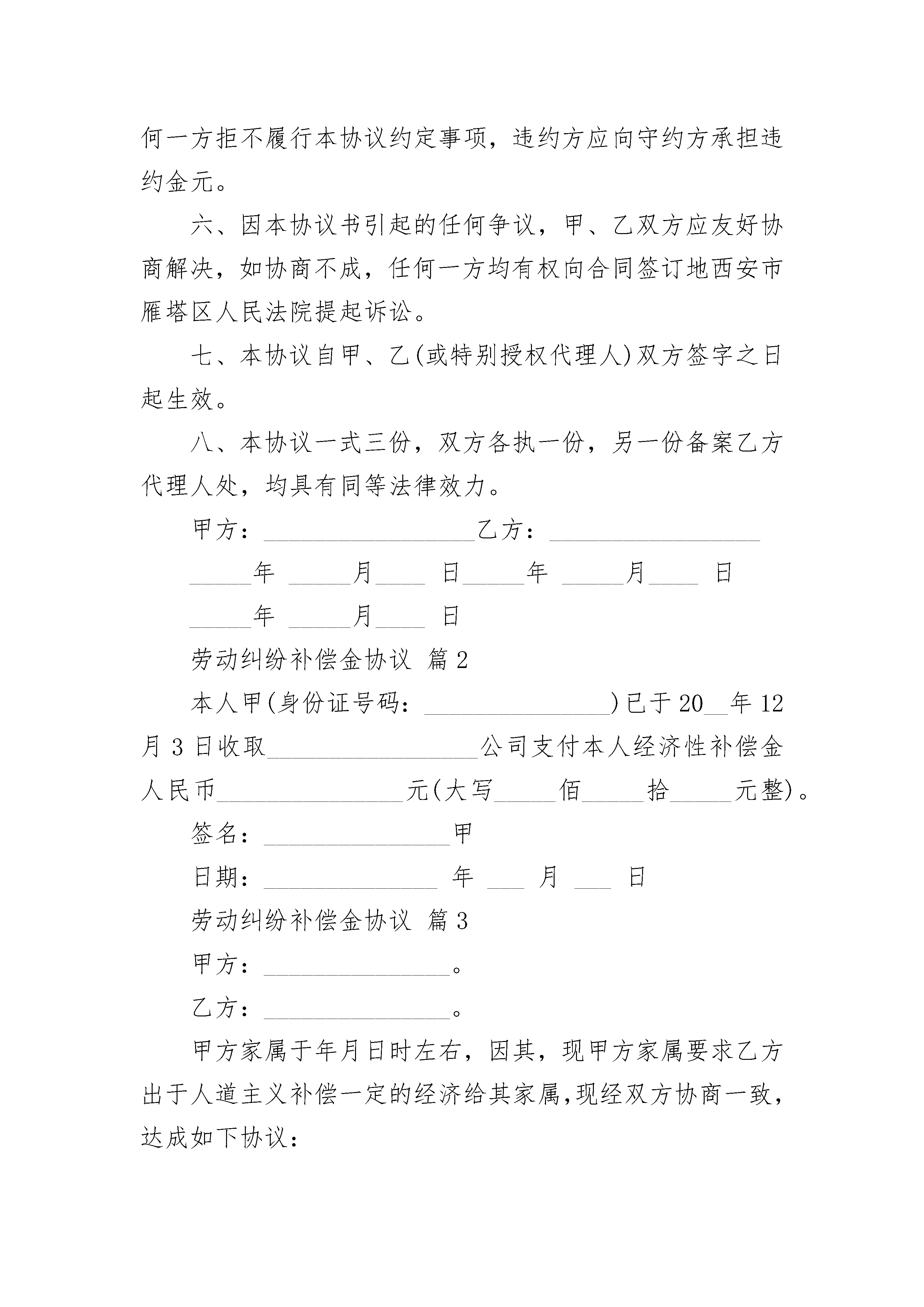 劳动纠纷补偿金协议劳动纠纷补偿金协议(通用3篇)劳动纠纷补偿金协议篇1甲方(公司):_________________乙方(员工):_________________兹就乙方解除与甲方劳动关系纠纷事宜,经甲、乙双方友好协商一致,达成如下协议,以期共同遵守。一、因甲方存在未向乙方缴纳相应社会保险、签订书面劳动合同等事宜,现乙方依法解除与甲方的劳动关系,经双方一致确认:_________________劳动合同解除时间为本协议签订之日。二、考虑到乙方在甲方及甲方关联公司处(特指乙方在甲方广州、上海、青岛、西安等经营门店挂靠的其他公司)的工作年限以及其他实际情况,甲方自愿一次性支付乙方经济补偿金、双倍工资、社保补偿金等费用共计人民币元(大写)。三、甲方需在本协议书签字生效当日一次性向乙方(或其特别授权代理人)支付上述款项,乙方(或特别授权代理人)收款后应向甲方出具收条。四、乙方承诺自本协议上述款项履行完毕后,乙方不再以任何理由、任何方式向甲方或甲方关联公司主张权利,甲、乙双方之间不再存在任何其他未了纠纷。五、甲、乙双方应严格遵守本协议上述约定事项,若任何一方拒不履行本协议约定事项,违约方应向守约方承担违约金元。六、因本协议书引起的任何争议,甲、乙双方应友好协商解决,如协商不成,任何一方均有权向合同签订地西安市雁塔区人民法院提起诉讼。七、本协议自甲、乙(或特别授权代理人)双方签字之日起生效。八、本协议一式三份,双方各执一份,另一份备案乙方代理人处,均具有同等法律效力。甲方:_________________乙方:______________________年_____月____日_____年_____月____日_____年_____月____日劳动纠纷补偿金协议篇2本人甲(身份证号码:_______________)已于20__年12月3日收取_________________公司支付本人经济性补偿金人民币_______________元(大写_____佰_____拾_____元整)。签名:_______________甲日期:______________年___月___日劳动纠纷补偿金协议篇3甲方:_______________。乙方:_______________。甲方家属于年月日时左右,因其,现甲方家属要求乙方出于人道主义补偿一定的经济给其家属,现经双方协商一致,达成如下协议:一、由乙方一次性补偿元给甲方(死者家属)第一顺序继承人。二、甲方在签订本协议书之后不再追究乙方的任何法律责任。三、本协议书签订之后无论甲方不能在乙方工作场所范围内搞任何迷信活动,包括烧纸、喃么等,不能影响乙方的任何工作。四、本协议书签订之后,双方都不得为此事打击报复,否则,任何一方都可以追究对方的法律责任。以上协议一式叁份,双方各执一份,见证单位存档一份,经双方签字后立即生效。甲方:_______________乙方:__________________年___月___日