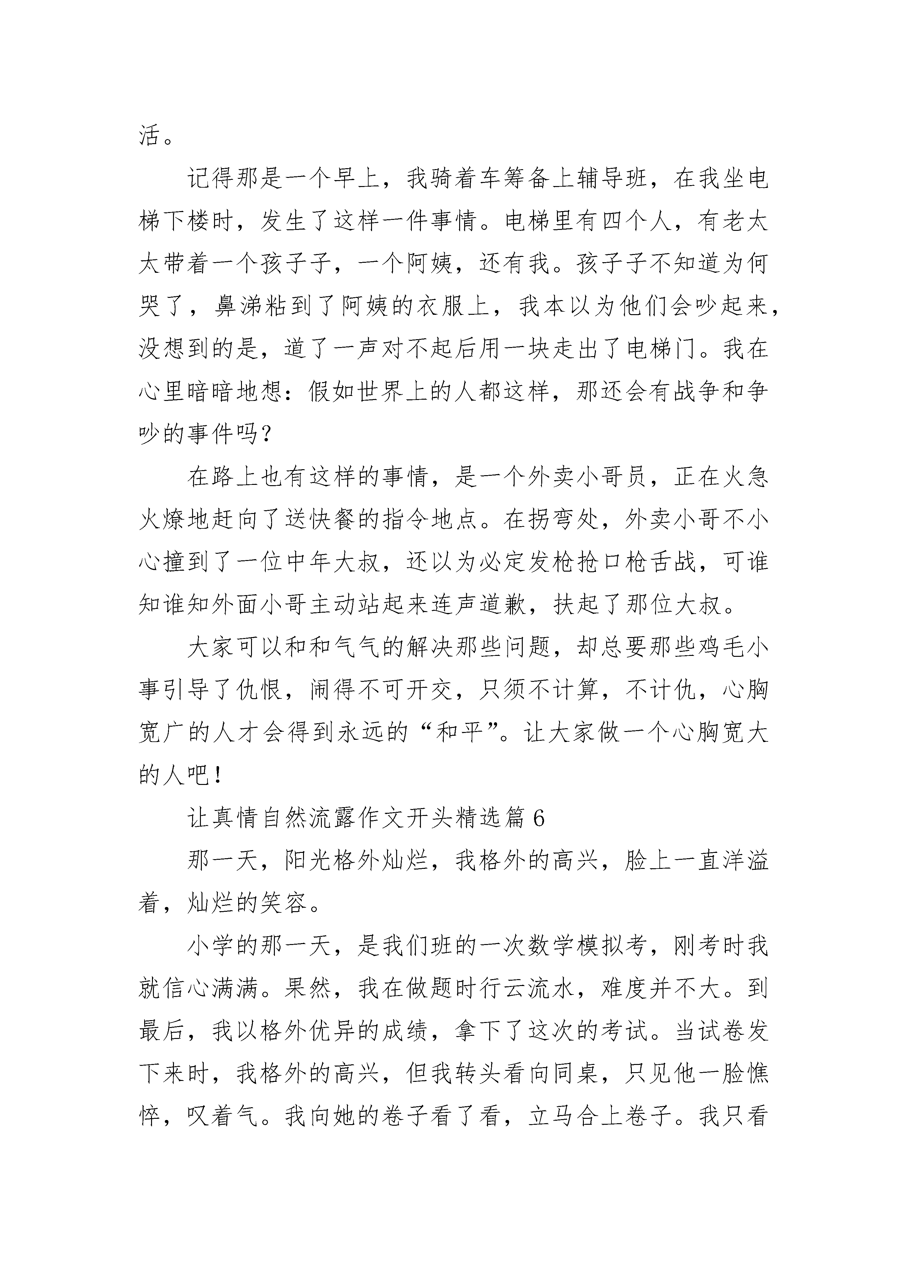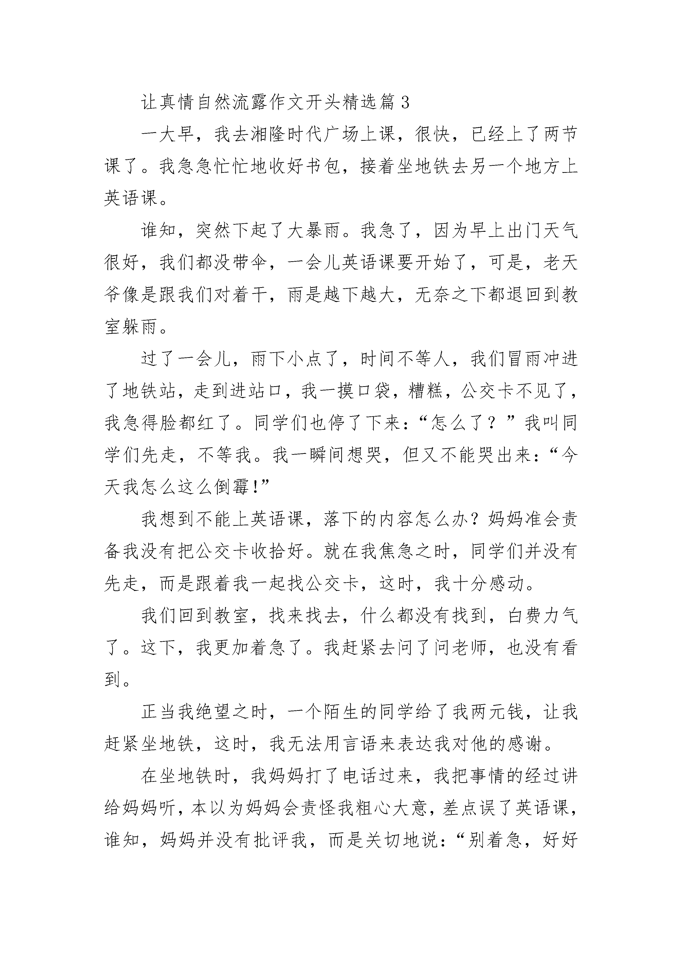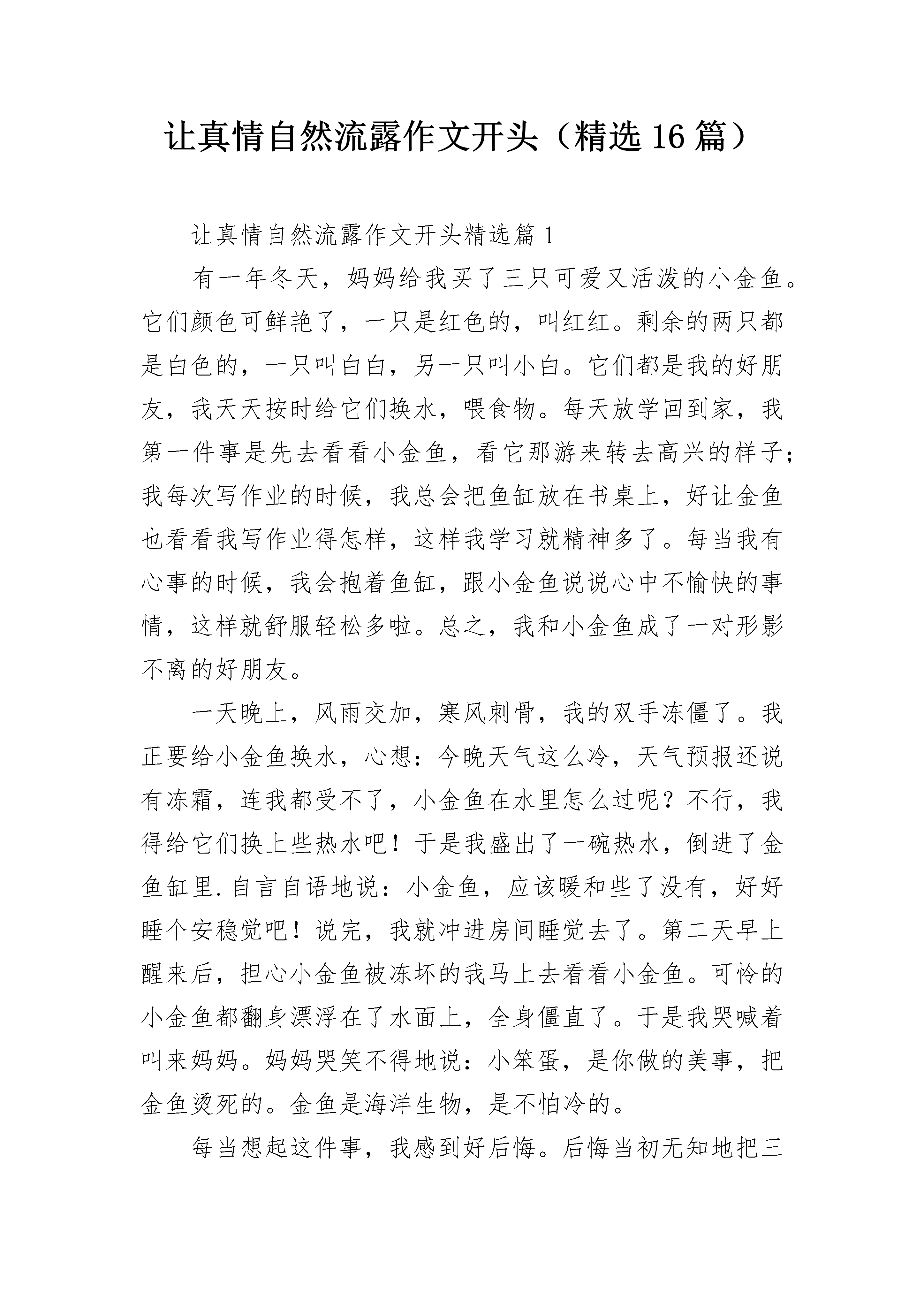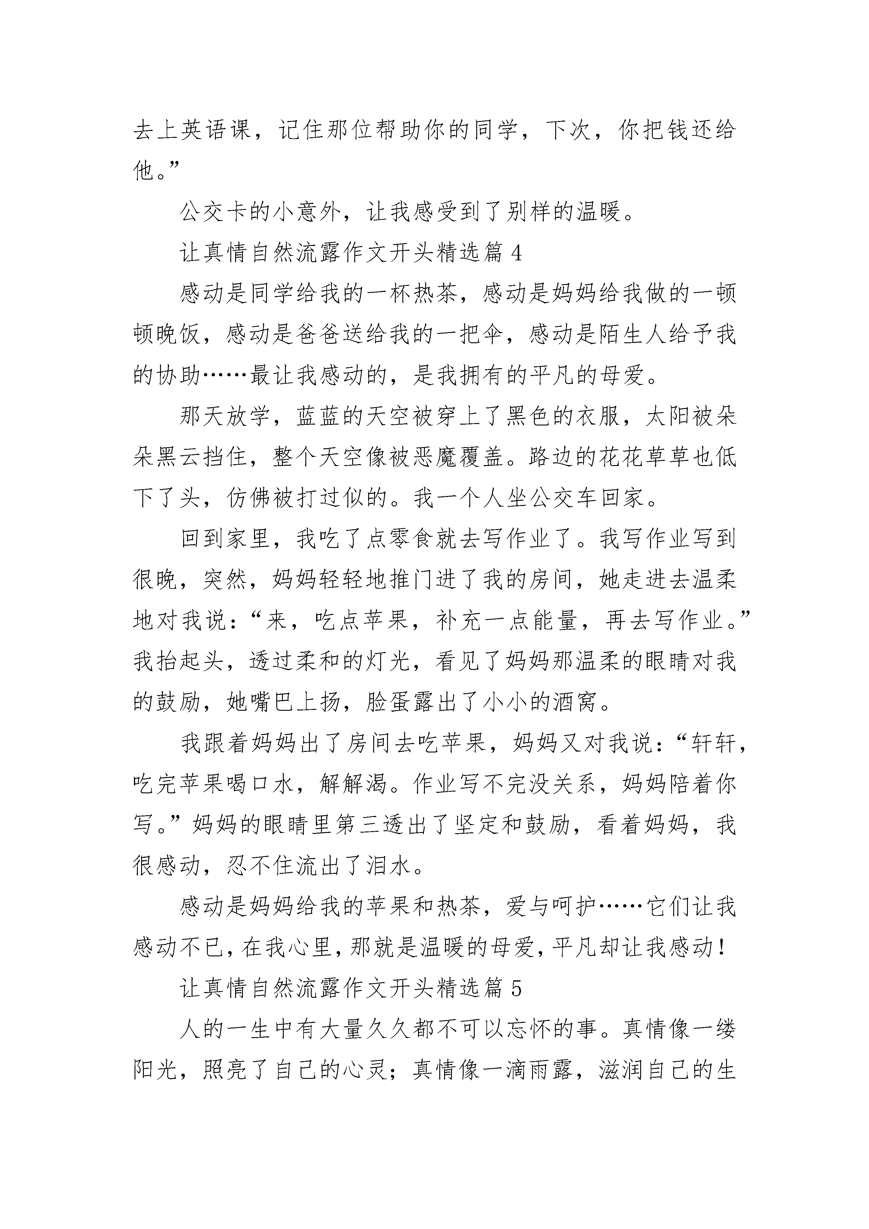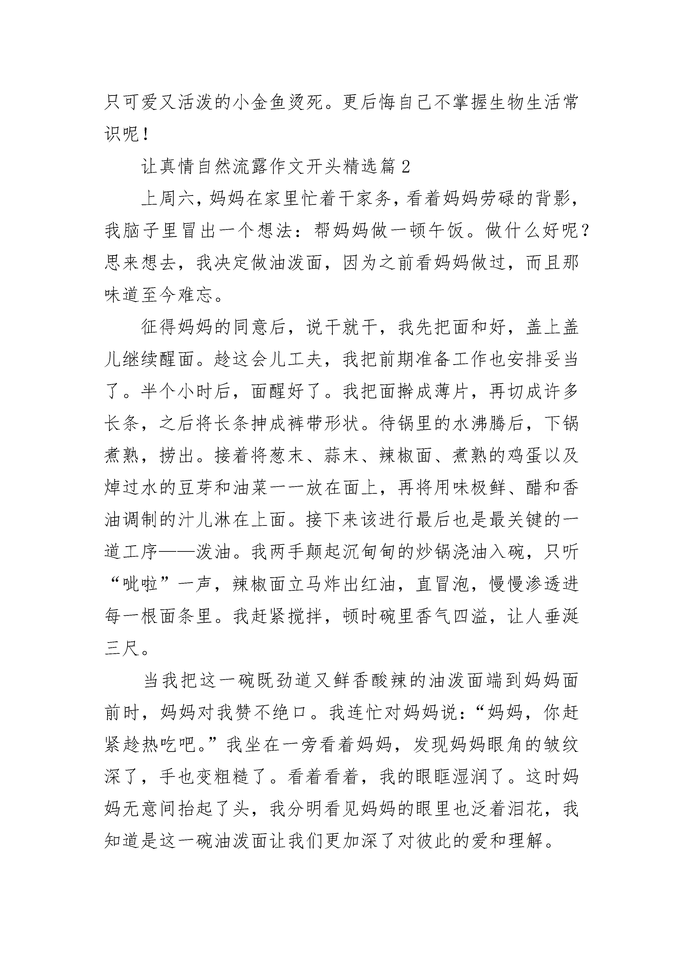 让真情自然流露作文开头(精选16篇)让真情自然流露作文开头精选篇1有一年冬天,妈妈给我买了三只可爱又活泼的小金鱼。它们颜色可鲜艳了,一只是红色的,叫红红。剩余的两只都是白色的,一只叫白白,另一只叫小白。它们都是我的好朋友,我天天按时给它们换水,喂食物。每天放学回到家,我第一件事是先去看看小金鱼,看它那游来转去高兴的样子;我每次写作业的时候,我总会把鱼缸放在书桌上,好让金鱼也看看我写作业得怎样,这样我学习就精神多了。每当我有心事的时候,我会抱着鱼缸,跟小金鱼说说心中不愉快的事情,这样就舒服轻松多啦。总之,我和小金鱼成了一对形影不离的好朋友。一天晚上,风雨交加,寒风刺骨,我的双手冻僵了。我正要给小金鱼换水,心想:今晚天气这么冷,天气预报还说有冻霜,连我都受不了,小金鱼在水里怎么过呢?不行,我得给它们换上些热水吧!于是我盛出了一碗热水,倒进了金鱼缸里.自言自语地说:小金鱼,应该暖和些了没有,好好睡个安稳觉吧!说完,我就冲进房间睡觉去了。第二天早上醒来后,担心小金鱼被冻坏的我马上去看看小金鱼。可怜的小金鱼都翻身漂浮在了水面上,全身僵直了。于是我哭喊着叫来妈妈。妈妈哭笑不得地说:小笨蛋,是你做的美事,把金鱼烫死的。金鱼是海洋生物,是不怕冷的。每当想起这件事,我感到好后悔。后悔当初无知地把三只可爱又活泼的小金鱼烫死。更后悔自己不掌握生物生活常识呢!让真情自然流露作文开头精选篇2上周六,妈妈在家里忙着干家务,看着妈妈劳碌的背影,我脑子里冒出一个想法:帮妈妈做一顿午饭。做什么好呢?思来想去,我决定做油泼面,因为之前看妈妈做过,而且那味道至今难忘。征得妈妈的同意后,说干就干,我先把面和好,盖上盖儿继续醒面。趁这会儿工夫,我把前期准备工作也安排妥当了。半个小时后,面醒好了。我把面擀成薄片,再切成许多长条,之后将长条抻成裤带形状。待锅里的水沸腾后,下锅煮熟,捞出。接着将葱末、蒜末、辣椒面、煮熟的鸡蛋以及焯过水的豆芽和油菜一一放在面上,再将用味极鲜、醋和香油调制的汁儿淋在上面。接下来该进行最后也是最关键的一道工序——泼油。我两手颠起沉甸甸的炒锅浇油入碗,只听“呲啦”一声,辣椒面立马炸出红油,直冒泡,慢慢渗透进每一根面条里。我赶紧搅拌,顿时碗里香气四溢,让人垂涎三尺。当我把这一碗既劲道又鲜香酸辣的油泼面端到妈妈面前时,妈妈对我赞不绝口。我连忙对妈妈说:“妈妈,你赶紧趁热吃吧。”我坐在一旁看着妈妈,发现妈妈眼角的皱纹深了,手也变粗糙了。看着看着,我的眼眶湿润了。这时妈妈无意间抬起了头,我分明看见妈妈的眼里也泛着泪花,我知道是这一碗油泼面让我们更加深了对彼此的爱和理解。让真情自然流露作文开头精选篇3一大早,我去湘隆时代广场上课,很快,已经上了两节课了。我急急忙忙地收好书包,接着坐地铁去另一个地方上英语课。谁知,突然下起了大暴雨。我急了,因为早上出门天气很好,我们都没带伞,一会儿英语课要开始了,可是,老天爷像是跟我们对着干,雨是越下越大,无奈之下都退回到教室躲雨。过了一会儿,雨下小点了,时间不等人,我们冒雨冲进了地铁站,走到进站口,我一摸口袋,糟糕,公交卡不见了,我急得脸都红了。同学们也停了下来:“怎么了?”我叫同学们先走,不等我。我一瞬间想哭,但又不能哭出来:“今天我怎么这么倒霉!”我想到不能上英语课,落下的内容怎么办?妈妈准会责备我没有把公交卡收拾好。就在我焦急之时,同学们并没有先走,而是跟着我一起找公交卡,这时,我十分感动。我们回到教室,找来找去,什么都没有找到,白费力气了。这下,我更加着急了。我赶紧去问了问老师,也没有看到。正当我绝望之时,一个陌生的同学给了我两元钱,让我赶紧坐地铁,这时,我无法用言语来表达我对他的感谢。在坐地铁时,我妈妈打了电话过来,我把事情的经过讲给妈妈听,本以为妈妈会责怪我粗心大意,差点误了英语课,谁知,妈妈并没有批评我,而是关切地说:“别着急,好好去上英语课,记住那位帮助你的同学,下次,你把钱还给他。”公交卡的小意外,让我感受到了别样的温暖。让真情自然流露作文开头精选篇4感动是同学给我的一杯热茶,感动是妈妈给我做的一顿顿晚饭,感动是爸爸送给我的一把伞,感动是陌生人给予我的协助……最让我感动的,是我拥有的平凡的母爱。那天放学,蓝蓝的天空被穿上了黑色的衣服,太阳被朵朵黑云挡住,整个天空像被恶魔覆盖。路边的花花草草也低下了头,仿佛被打过似的。我一个人坐公交车回家。回到家里,我吃了点零食就去写作业了。我写作业写到很晚,突然,妈妈轻轻地推门进了我的房间,她走进去温柔地对我说:“来,吃点苹果,补充一点能量,再去写作业。”我抬起头,透过柔和的灯光,看见了妈妈那温柔的眼睛对我的鼓励,她嘴巴上扬,脸蛋露出了小小的酒窝。我跟着妈妈出了房间去吃苹果,妈妈又对我说:“轩轩,吃完苹果喝口水,解解渴。作业写不完没关系,妈妈陪着你写。”妈妈的眼睛里第三