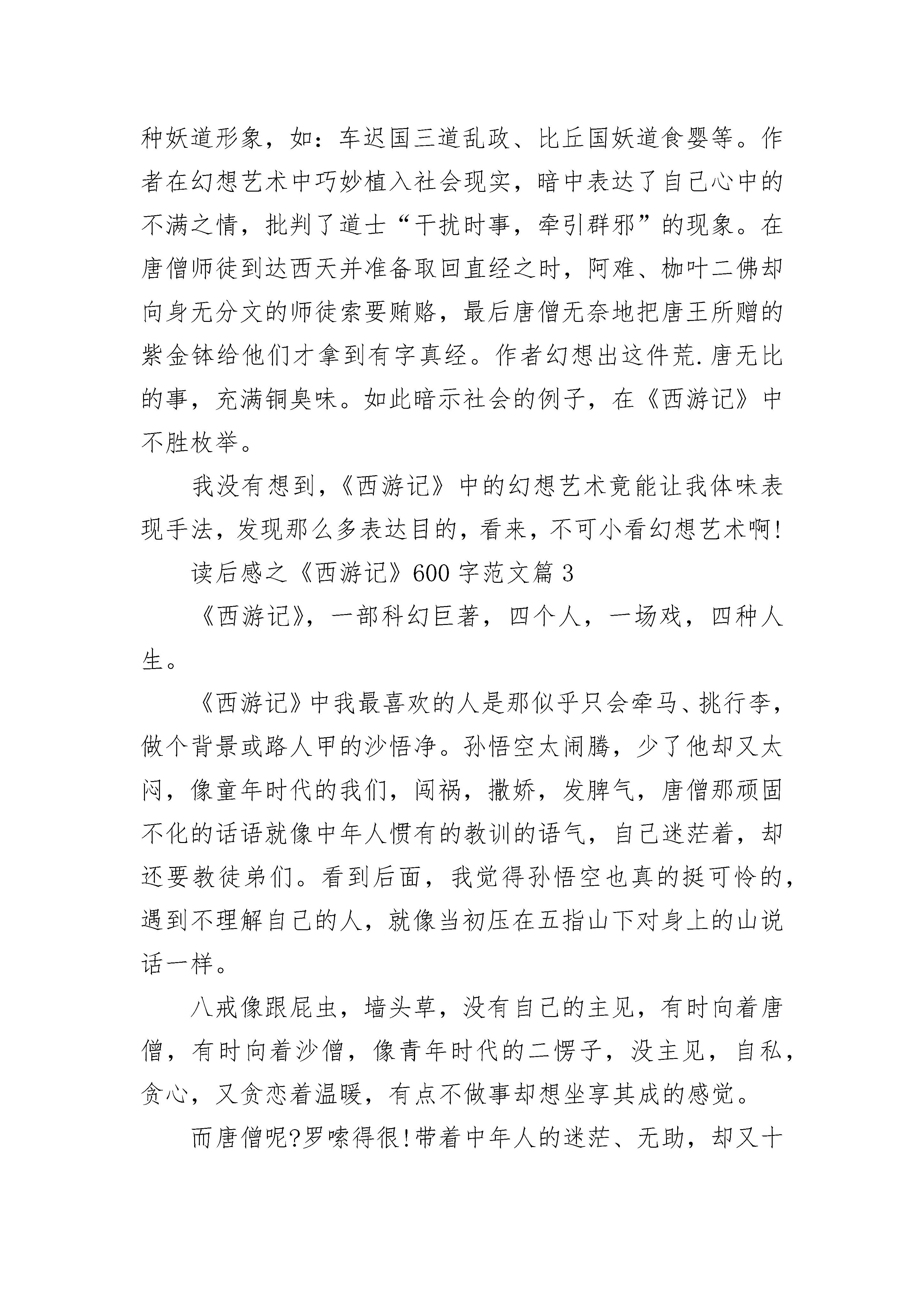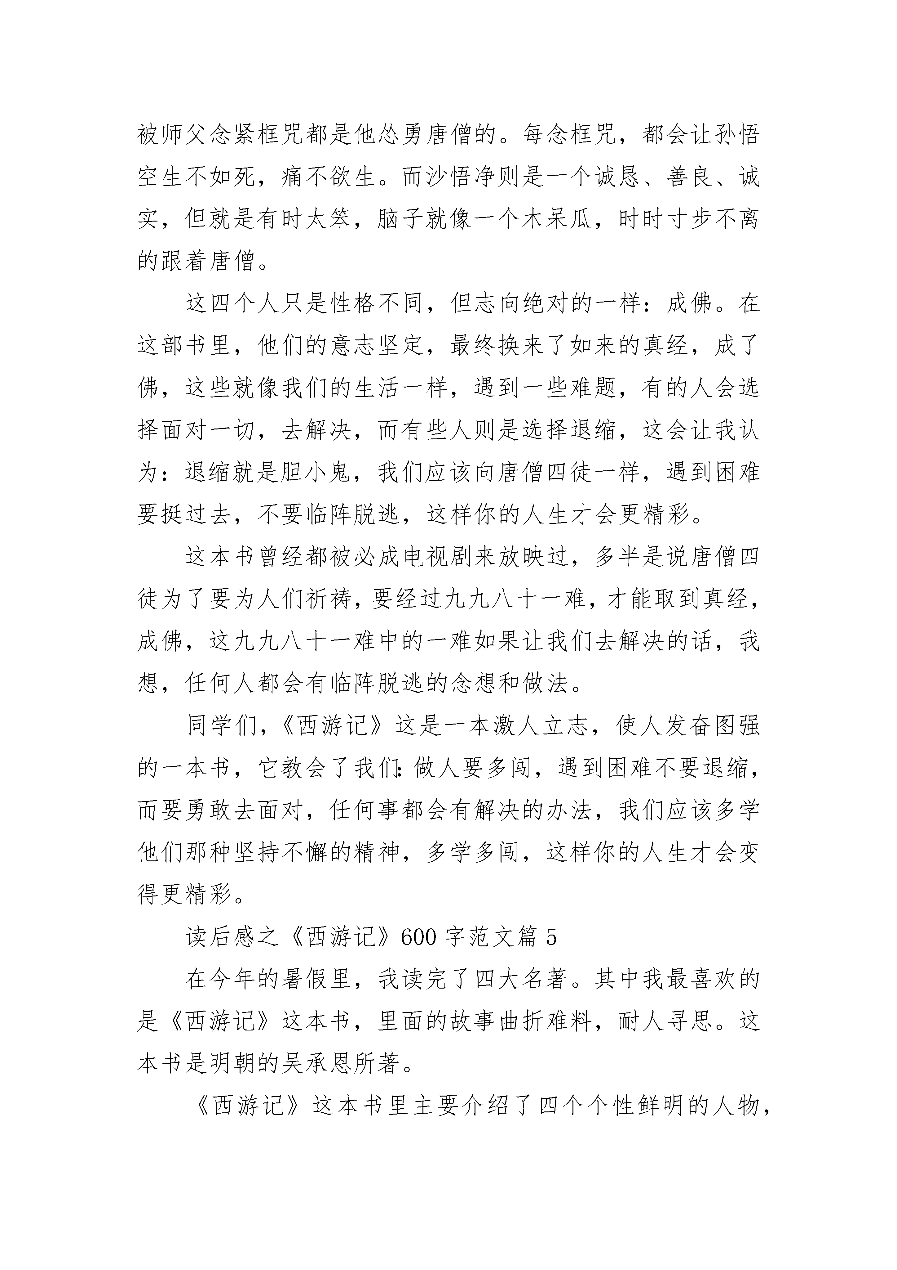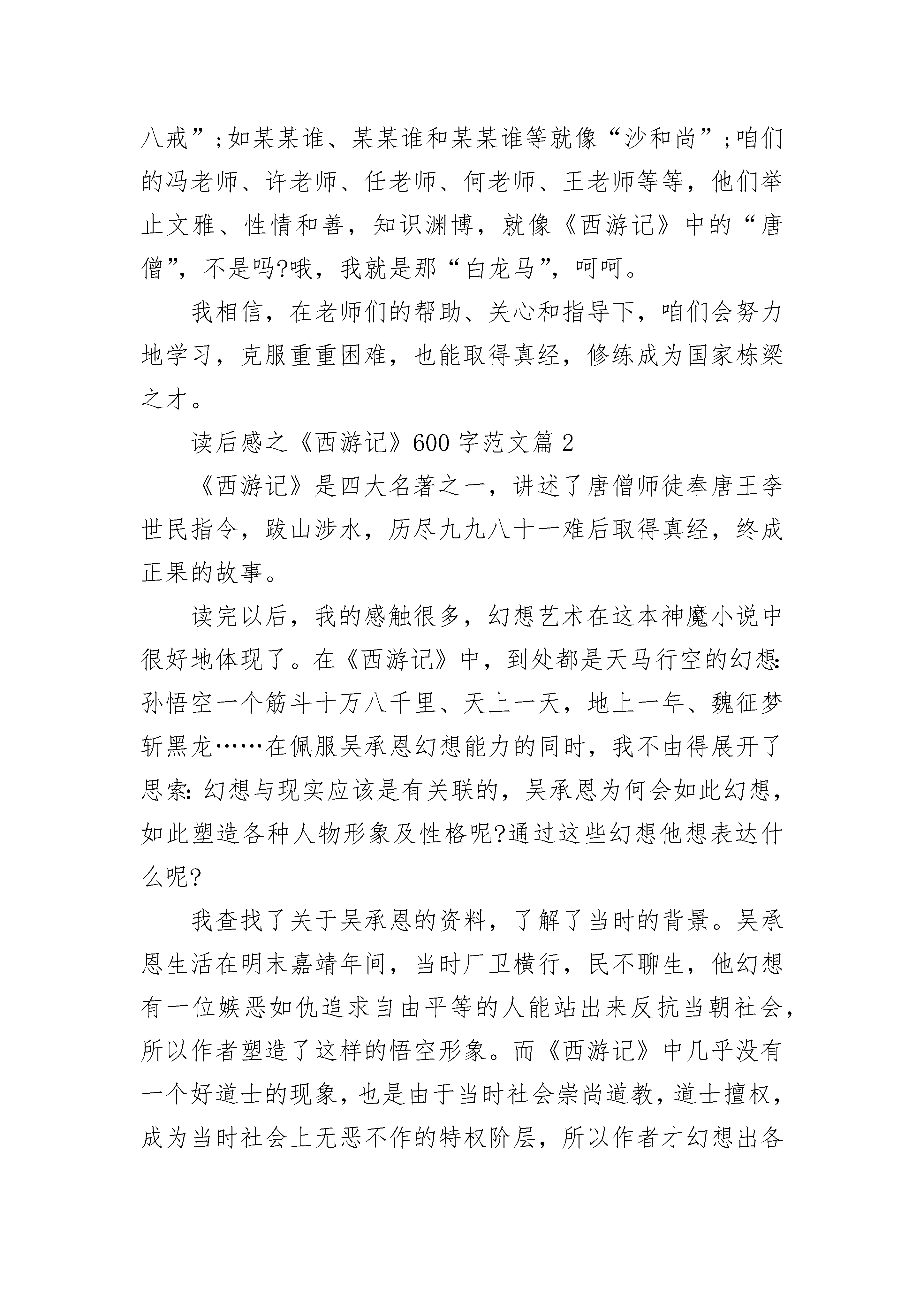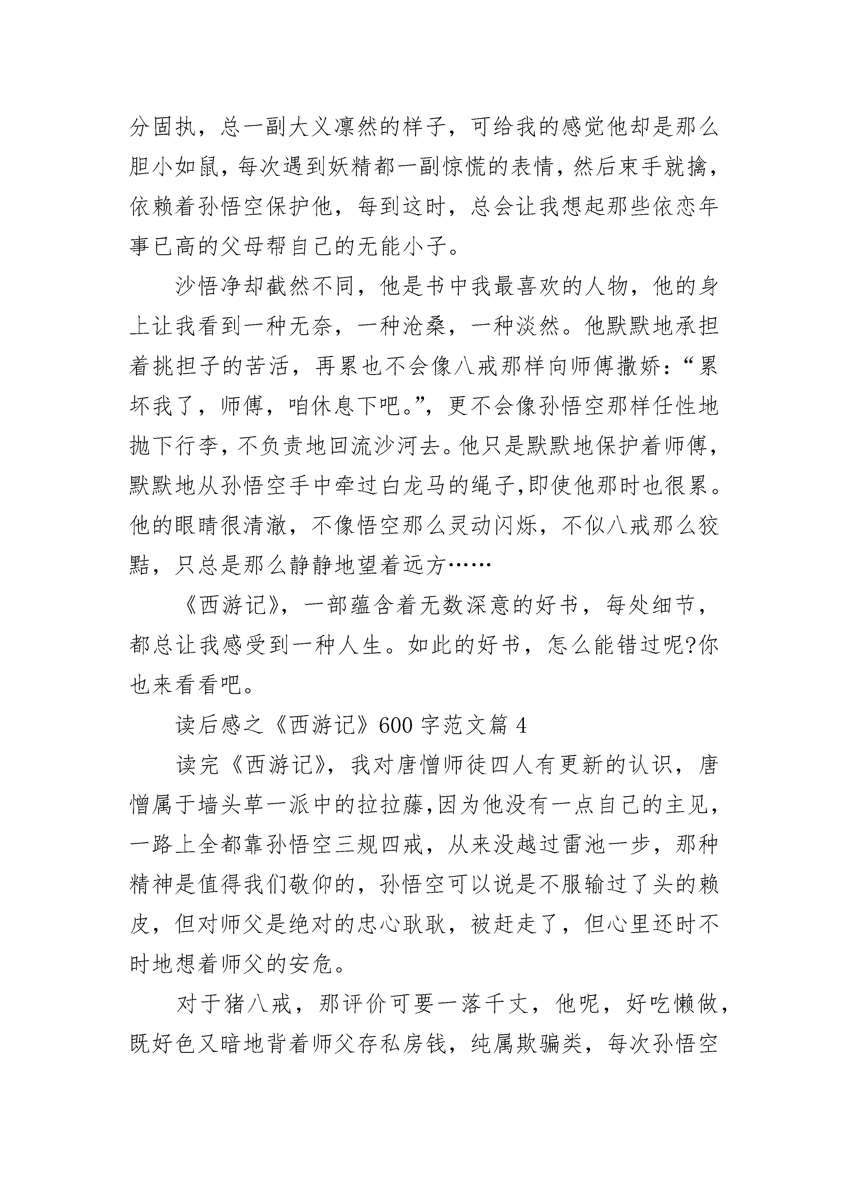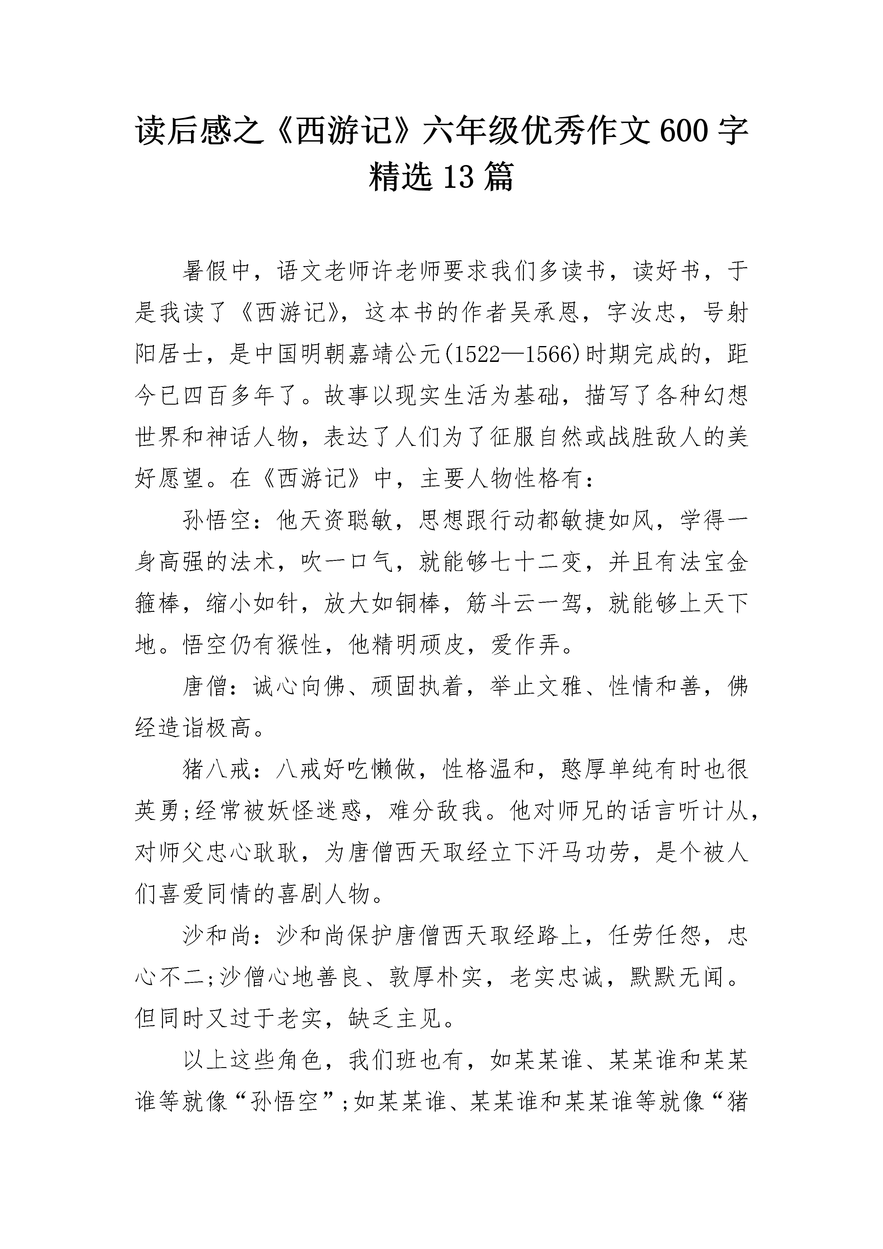 读后感之《西游记》六年级优秀作文600字精选13篇暑假中,语文老师许老师要求我们多读书,读好书,于是我读了《西游记》,这本书的作者吴承恩,字汝忠,号射阳居士,是中国明朝嘉靖公元(1522—1566)时期完成的,距今已四百多年了。故事以现实生活为基础,描写了各种幻想世界和神话人物,表达了人们为了征服自然或战胜敌人的美好愿望。在《西游记》中,主要人物性格有:孙悟空:他天资聪敏,思想跟行动都敏捷如风,学得一身高强的法术,吹一口气,就能够七十二变,并且有法宝金箍棒,缩小如针,放大如铜棒,筋斗云一驾,就能够上天下地。悟空仍有猴性,他精明顽皮,爱作弄。唐僧:诚心向佛、顽固执着,举止文雅、性情和善,佛经造诣极高。猪八戒:八戒好吃懒做,性格温和,憨厚单纯有时也很英勇;经常被妖怪迷惑,难分敌我。他对师兄的话言听计从,对师父忠心耿耿,为唐僧西天取经立下汗马功劳,是个被人们喜爱同情的喜剧人物。沙和尚:沙和尚保护唐僧西天取经路上,任劳任怨,忠心不二;沙僧心地善良、敦厚朴实,老实忠诚,默默无闻。但同时又过于老实,缺乏主见。以上这些角色,我们班也有,如某某谁、某某谁和某某谁等就像“孙悟空”;如某某谁、某某谁和某某谁等就像“猪八戒”;如某某谁、某某谁和某某谁等就像“沙和尚”;咱们的冯老师、许老师、任老师、何老师、王老师等等,他们举止文雅、性情和善,知识渊博,就像《西游记》中的“唐僧”,不是吗?哦,我就是那“白龙马”,呵呵。我相信,在老师们的帮助、关心和指导下,咱们会努力地学习,克服重重困难,也能取得真经,修练成为国家栋梁之才。读后感之《西游记》600字范文篇2《西游记》是四大名著之一,讲述了唐僧师徒奉唐王李世民指令,跋山涉水,历尽九九八十一难后取得真经,终成正果的故事。读完以后,我的感触很多,幻想艺术在这本神魔小说中很好地体现了。在《西游记》中,到处都是天马行空的幻想:孙悟空一个筋斗十万八千里、天上一天,地上一年、魏征梦斩黑龙……在佩服吴承恩幻想能力的同时,我不由得展开了思索:幻想与现实应该是有关联的,吴承恩为何会如此幻想,如此塑造各种人物形象及性格呢?通过这些幻想他想表达什么呢?我查找了关于吴承恩的资料,了解了当时的背景。吴承恩生活在明末嘉靖年间,当时厂卫横行,民不聊生,他幻想有一位嫉恶如仇追求自由平等的人能站出来反抗当朝社会,所以作者塑造了这样的悟空形象。而《西游记》中几乎没有一个好道士的现象,也是由于当时社会崇尚道教,道士擅权,成为当时社会上无恶不作的特权阶层,所以作者才幻想出各种妖道形象,如:车迟国三道乱政、比丘国妖道食婴等。作者在幻想艺术中巧妙植入社会现实,暗中表达了自己心中的不满之情,批判了道士“干扰时事,牵引群邪”的现象。在唐僧师徒到达西天并准备取回直经之时,阿难、枷叶二佛却向身无分文的师徒索要贿赂,最后唐僧无奈地把唐王所赠的紫金钵给他们才拿到有字真经。作者幻想出这件荒.唐无比的事,充满铜臭味。如此暗示社会的例子,在《西游记》中不胜枚举。我没有想到,《西游记》中的幻想艺术竟能让我体味表现手法,发现那么多表达目的,看来,不可小看幻想艺术啊!读后感之《西游记》600字范文篇3《西游记》,一部科幻巨著,四个人,一场戏,四种人生。《西游记》中我最喜欢的人是那似乎只会牵马、挑行李,做个背景或路人甲的沙悟净。孙悟空太闹腾,少了他却又太闷,像童年时代的我们,闯祸,撒娇,发脾气,唐僧那顽固不化的话语就像中年人惯有的教训的语气,自己迷茫着,却还要教徒弟们。看到后面,我觉得孙悟空也真的挺可怜的,遇到不理解自己的人,就像当初压在五指山下对身上的山说话一样。八戒像跟屁虫,墙头草,没有自己的主见,有时向着唐僧,有时向着沙僧,像青年时代的二愣子,没主见,自私,贪心,又贪恋着温暖,有点不做事却想坐享其成的感觉。而唐僧呢?罗嗦得很!带着中年人的迷茫、无助,却又十分固执,总一副大义凛然的样子,可给我的感觉他却是那么胆小如鼠,每次遇到妖精都一副惊慌的表情,然后束手就擒,依赖着孙悟空保护他,每到这时,总会让我想起那些依恋年事已高的父母帮自己的无能小子。沙悟净却截然不同,他是书中我最喜欢的人物,他的身上让我看到一种无奈,一种沧桑,一种淡然。他默默地承担着挑担子的苦活,再累也不会像八戒那样向师傅撒娇:“累坏我了,师傅,咱休息下吧。”,更不会像孙悟空那样任性地抛下行李,不负责地回流沙河去。他只是默默地保护着师傅,默默地从孙悟空手中牵过白龙马的绳子,即使他那时也很累。他的眼睛很清澈,不像悟空那么灵动闪烁,不似八戒那么狡黠,只总是那么静静地望着远方……《西游记》,一部蕴含着无数深意的好书,每处细节,都总让我感受到一种人生。如此的好书,怎么能错过呢?你也来看看吧。读后感之《西游记》600字范文篇4读完《西游记》,我对唐憎师徒四人有更新的认识,唐憎属于墙头草一派中的拉拉藤,因为他没有一点自