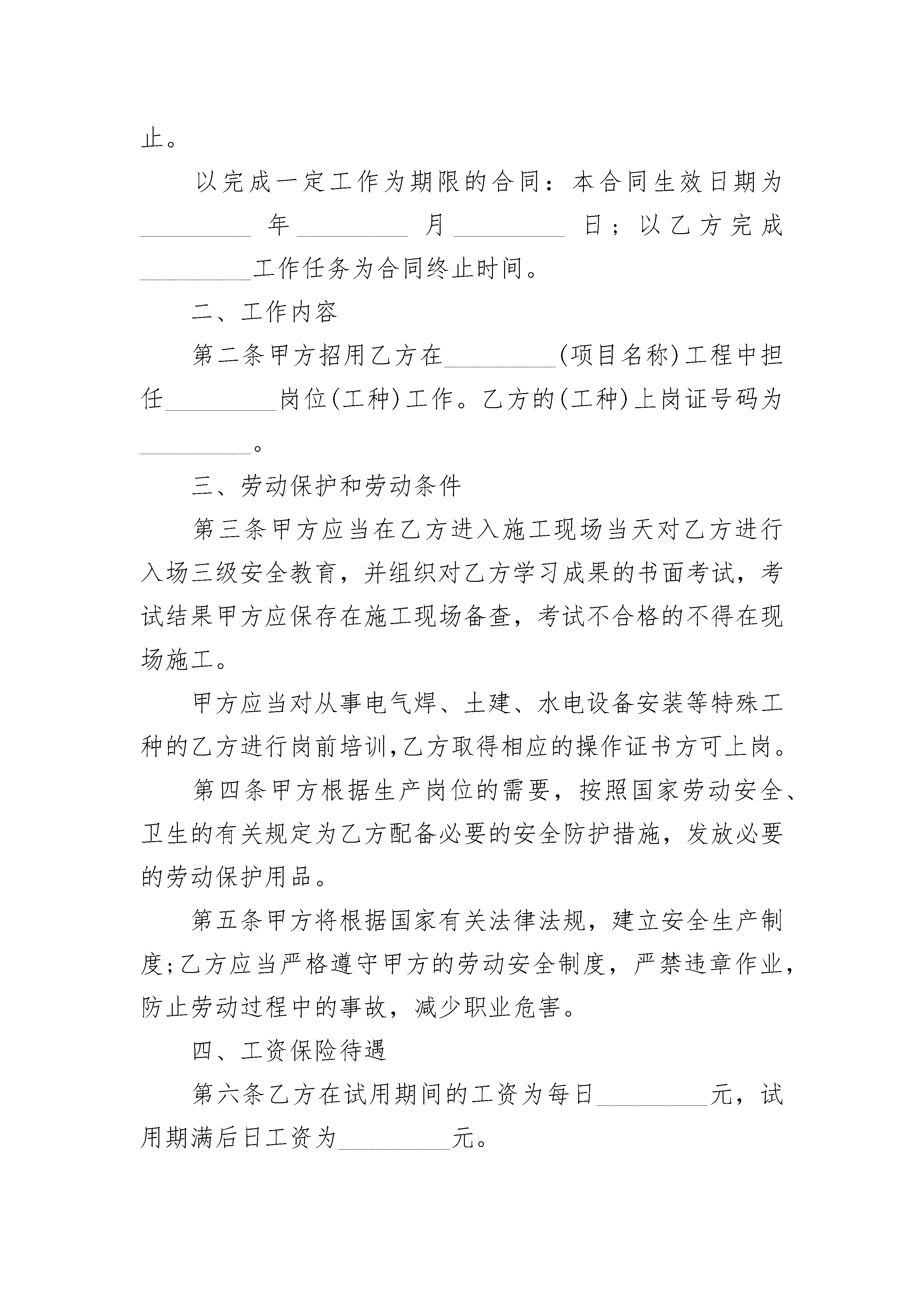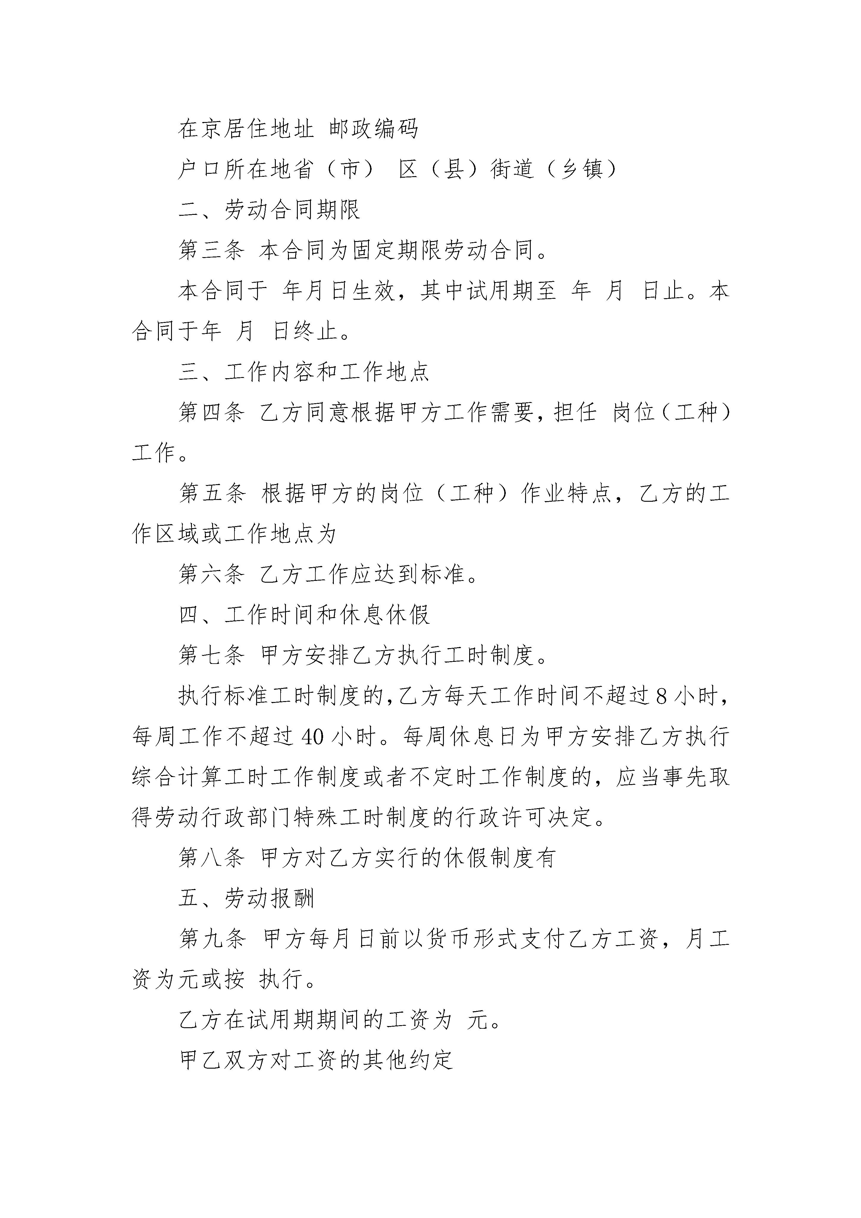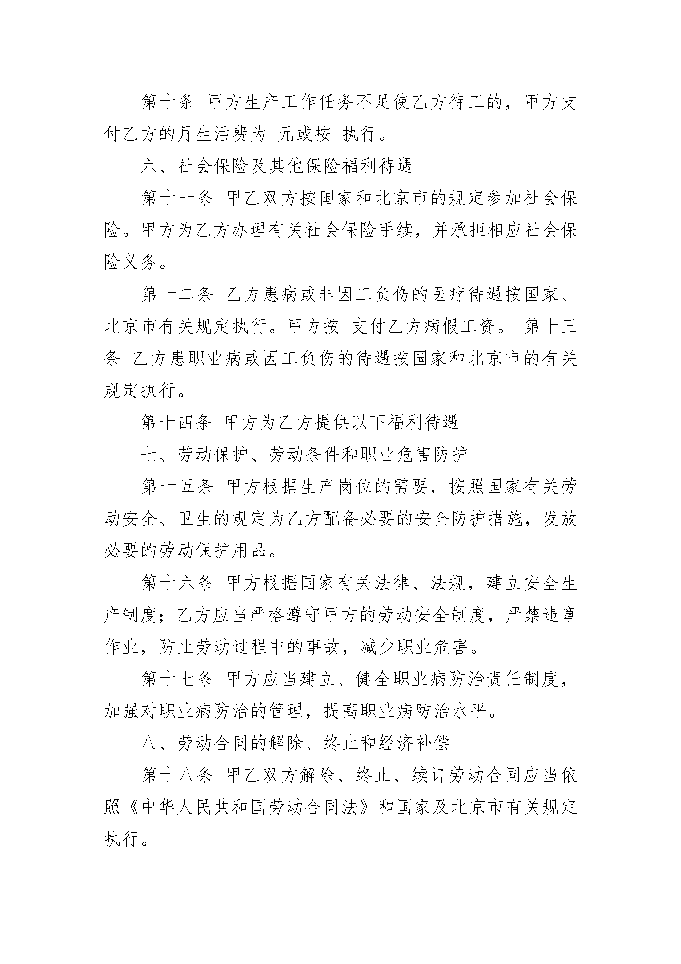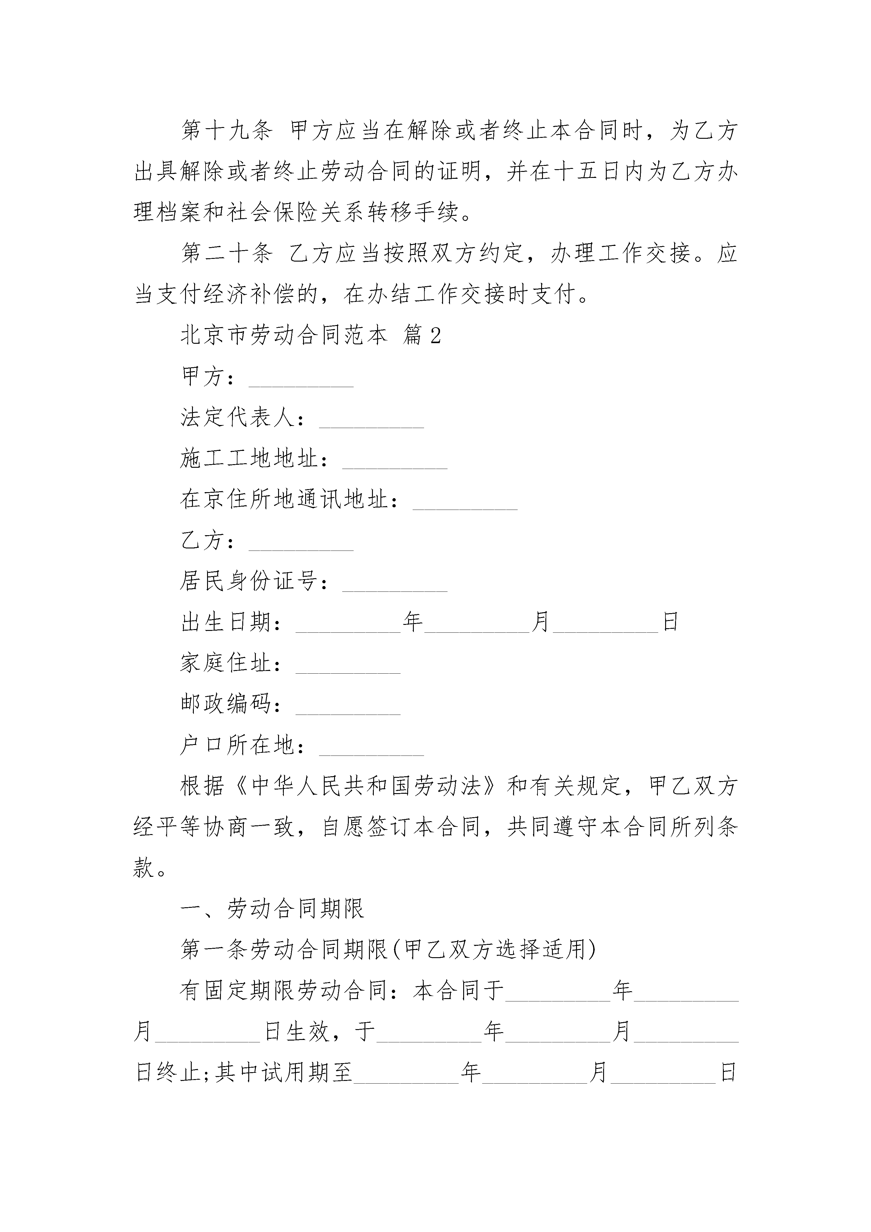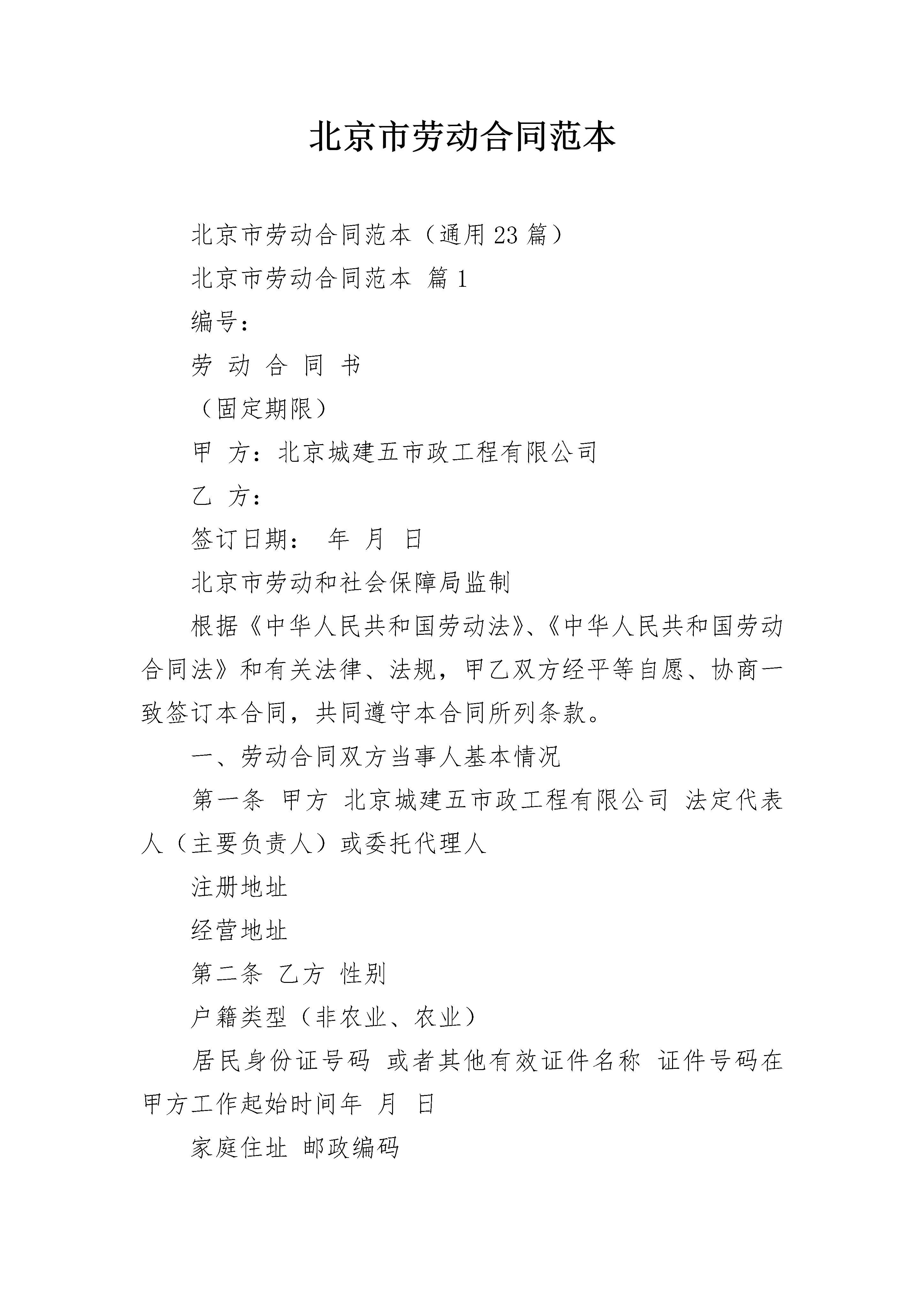 北京市劳动合同范本北京市劳动合同范本(通用23篇)北京市劳动合同范本篇1编号:劳动合同书(固定期限)甲方:北京城建五市政工程有限公司乙方:签订日期:年月日北京市劳动和社会保障局监制根据《中华人民共和国劳动法》、《中华人民共和国劳动合同法》和有关法律、法规,甲乙双方经平等自愿、协商一致签订本合同,共同遵守本合同所列条款。一、劳动合同双方当事人基本情况第一条甲方北京城建五市政工程有限公司法定代表人(主要负责人)或委托代理人注册地址经营地址第二条乙方性别户籍类型(非农业、农业)居民身份证号码或者其他有效证件名称证件号码在甲方工作起始时间年月日家庭住址邮政编码在京居住地址邮政编码户口所在地省(市)区(县)街道(乡镇)二、劳动合同期限第三条本合同为固定期限劳动合同。本合同于年月日生效,其中试用期至年月日止。本合同于年月日终止。三、工作内容和工作地点第四条乙方同意根据甲方工作需要,担任岗位(工种)工作。第五条根据甲方的岗位(工种)作业特点,乙方的工作区域或工作地点为第六条乙方工作应达到标准。四、工作时间和休息休假第七条甲方安排乙方执行工时制度。执行标准工时制度的,乙方每天工作时间不超过8小时,每周工作不超过40小时。每周休息日为甲方安排乙方执行综合计算工时工作制度或者不定时工作制度的,应当事先取得劳动行政部门特殊工时制度的行政许可决定。第八条甲方对乙方实行的休假制度有五、劳动报酬第九条甲方每月日前以货币形式支付乙方工资,月工资为元或按执行。乙方在试用期期间的工资为元。甲乙双方对工资的其他约定第十条甲方生产工作任务不足使乙方待工的,甲方支付乙方的月生活费为元或按执行。六、社会保险及其他保险福利待遇第十一条甲乙双方按国家和北京市的规定参加社会保险。甲方为乙方办理有关社会保险手续,并承担相应社会保险义务。第十二条乙方患病或非因工负伤的医疗待遇按国家、北京市有关规定执行。甲方按支付乙方病假工资。第十三条乙方患职业病或因工负伤的待遇按国家和北京市的有关规定执行。第十四条甲方为乙方提供以下福利待遇七、劳动保护、劳动条件和职业危害防护第十五条甲方根据生产岗位的需要,按照国家有关劳动安全、卫生的规定为乙方配备必要的安全防护措施,发放必要的劳动保护用品。第十六条甲方根据国家有关法律、法规,建立安全生产制度;乙方应当严格遵守甲方的劳动安全制度,严禁违章作业,防止劳动过程中的事故,减少职业危害。第十七条甲方应当建立、健全职业病防治责任制度,加强对职业病防治的管理,提高职业病防治水平。八、劳动合同的解除、终止和经济补偿第十八条甲乙双方解除、终止、续订劳动合同应当依照《中华人民共和国劳动合同法》和国家及北京市有关规定执行。第十九条甲方应当在解除或者终止本合同时,为乙方出具解除或者终止劳动合同的证明,并在十五日内为乙方办理档案和社会保险关系转移手续。第二十条乙方应当按照双方约定,办理工作交接。应当支付经济补偿的,在办结工作交接时支付。北京市劳动合同范本篇2甲方:_________法定代表人:_________施工工地地址:_________在京住所地通讯地址:_________乙方:_________居民身份证号:_________出生日期:_________年_________月_________日家庭住址:_________邮政编码:_________户口所在地:_________根据《中华人民共和国劳动法》和有关规定,甲乙双方经平等协商一致,自愿签订本合同,共同遵守本合同所列条款。一、劳动合同期限第一条劳动合同期限(甲乙双方选择适用)有固定期限劳动合同:本合同于_________年_________月_________日生效,于_________年_________月_________日终止;其中试用期至_________年_________月_________日止。以完成一定工作为期限的合同:本合同生效日期为_________年_________月_________日;以乙方完成_________工作任务为合同终止时间。二、工作内容第二条甲方招用乙方在_________(项目名称)工程中担任_________岗位(工种)工作。乙方的(工种)上岗证号码为_________。三、劳动保护和劳动条件第三条甲方应当在乙方进入施工现场当天对乙方进行入场三级安全教育,并组织对乙方学习成果的书面考试,考试结果甲方应保存在施工现场备查,考试不合格的不得在现场施工。甲方应当对从事电气焊、土建、水电设备安装等特殊工种的乙方进行岗前培训,乙方取得相应的操作证书方可上岗。第四条甲方根据生产岗位的需要,按照国家劳动安全、卫生的有关规定为乙方配备必要的安全防护措施,发放必要的劳动保护用品。第五条甲方将根据国家有关法律法规,建立安全生产制度;乙方应当严格遵守甲方的劳动安全制度,严禁违
