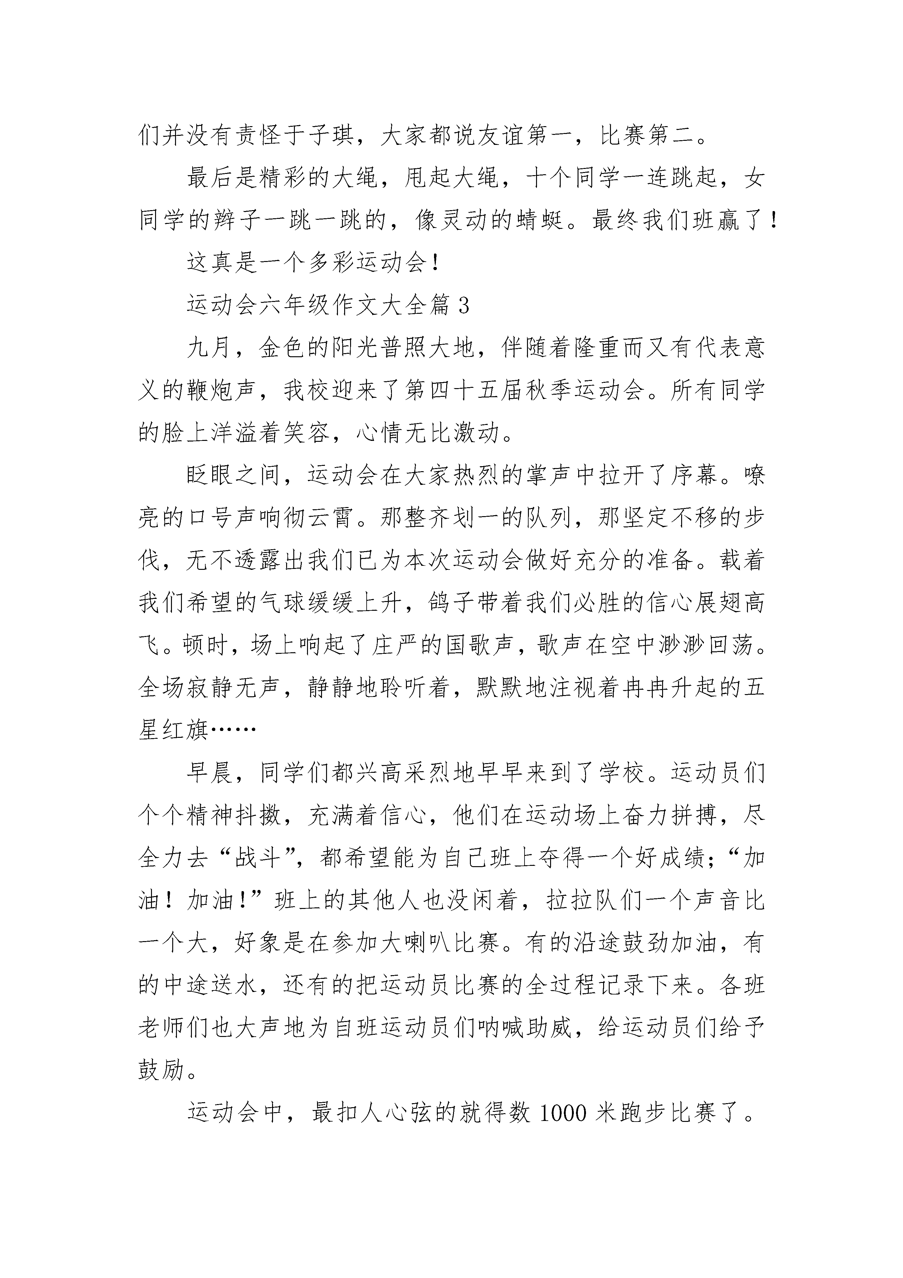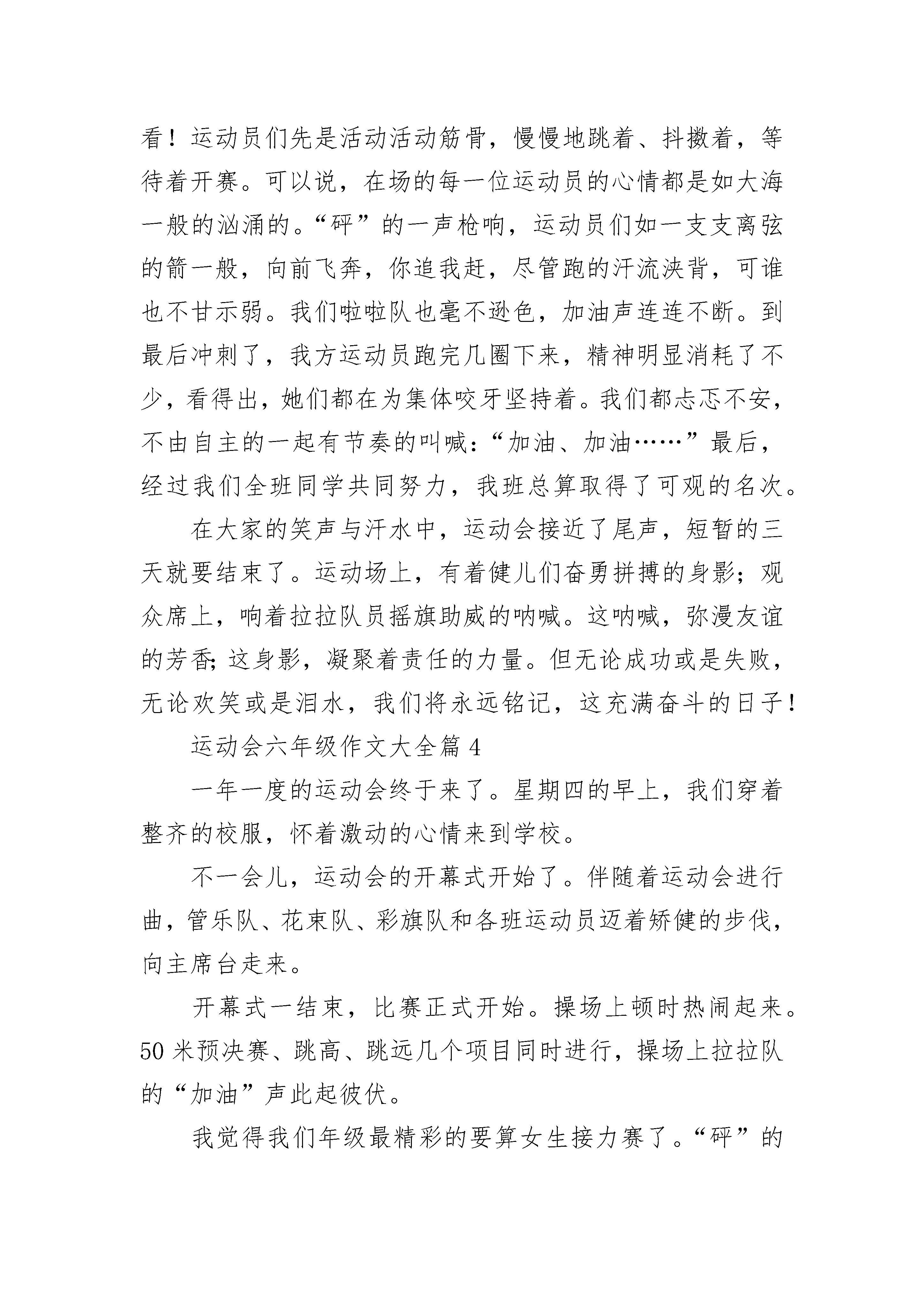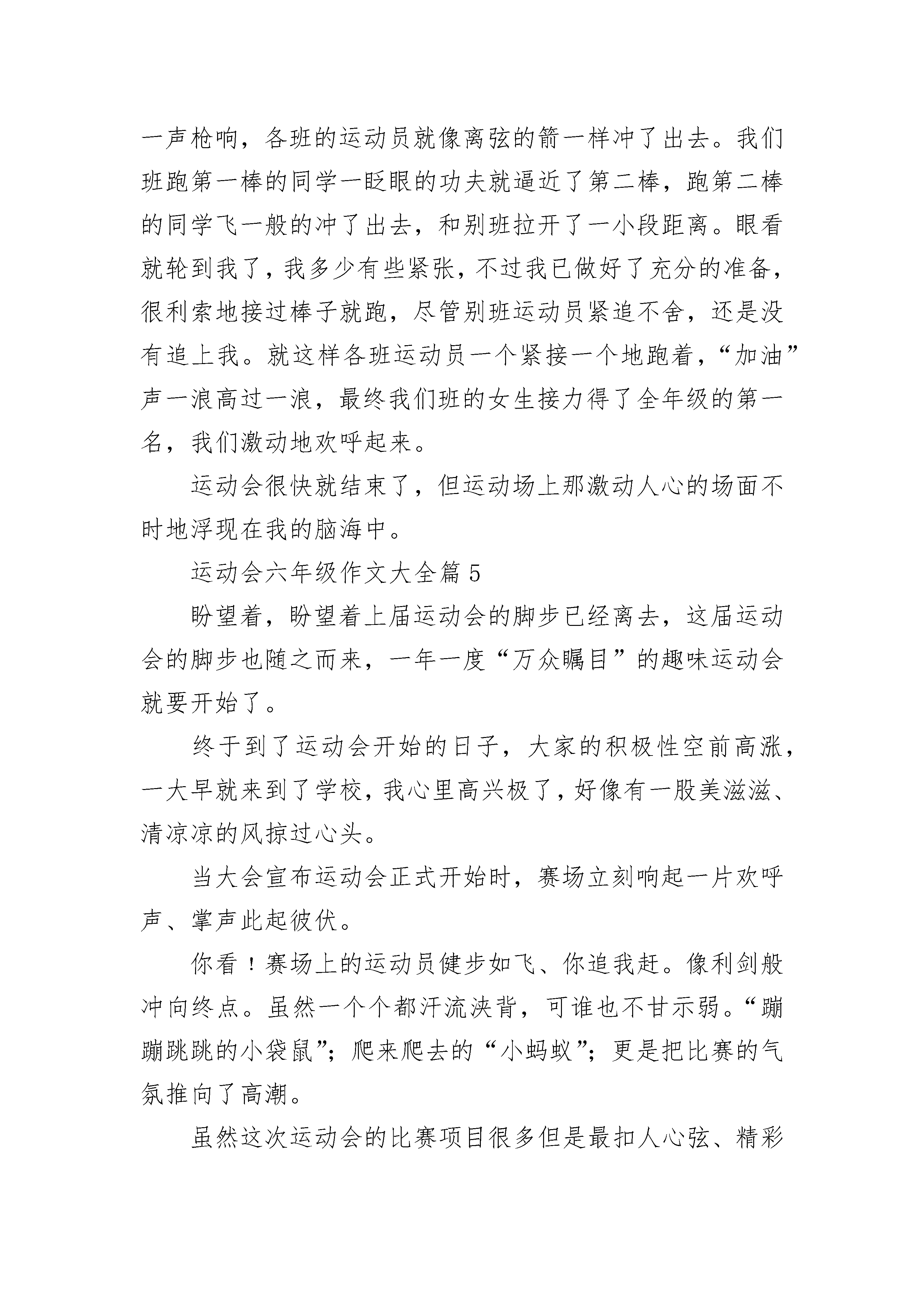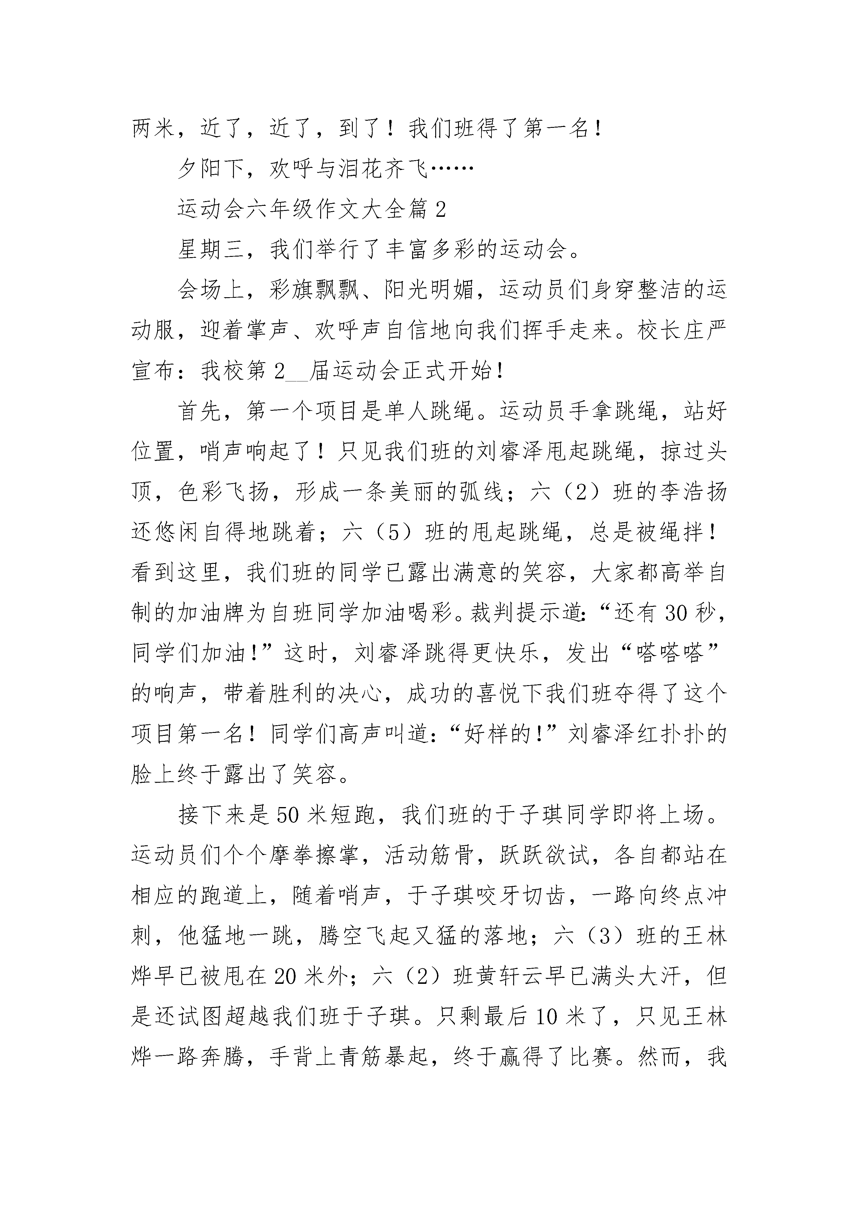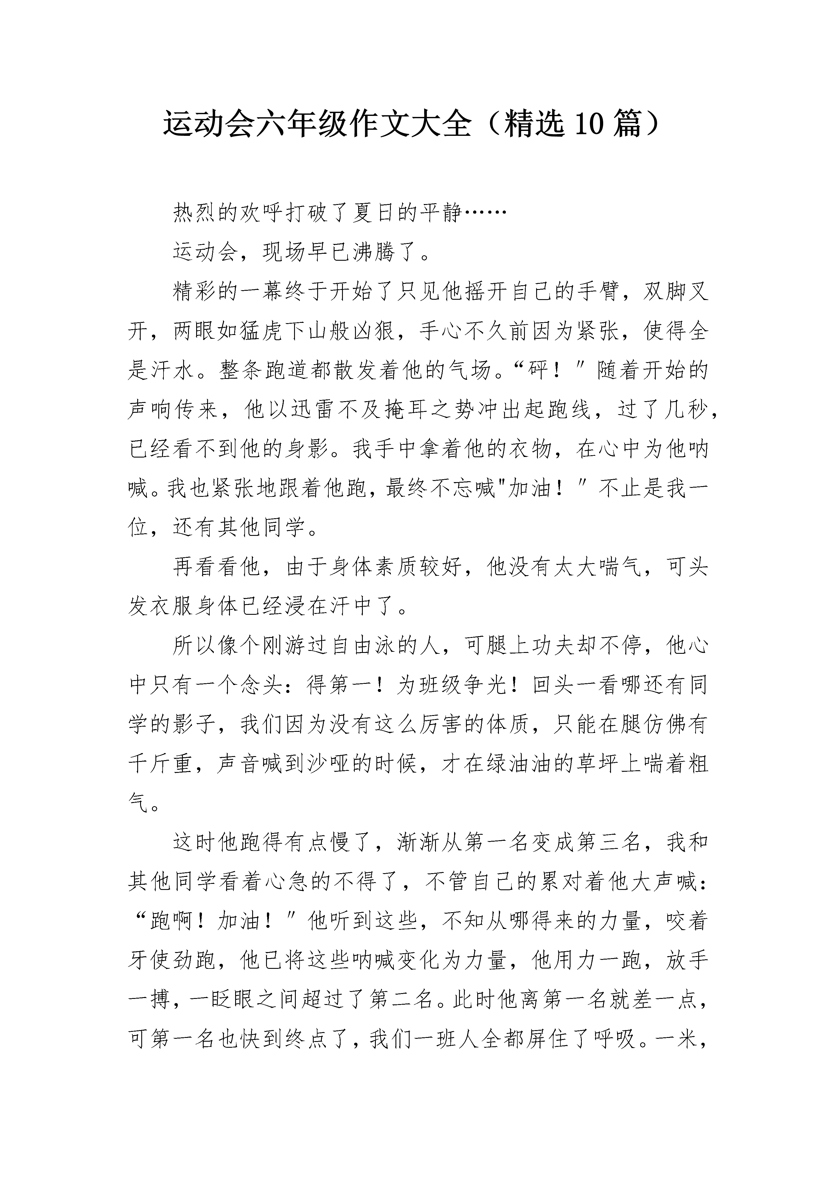 运动会六年级作文大全(精选10篇)热烈的欢呼打破了夏日的平静……运动会,现场早已沸腾了。精彩的一幕终于开始了只见他摇开自己的手臂,双脚叉开,两眼如猛虎下山般凶狠,手心不久前因为紧张,使得全是汗水。整条跑道都散发着他的气场。“砰!″随着开始的声响传来,他以迅雷不及掩耳之势冲出起跑线,过了几秒,已经看不到他的身影。我手中拿着他的衣物,在心中为他呐喊。我也紧张地跟着他跑,最终不忘喊"加油!″不止是我一位,还有其他同学。再看看他,由于身体素质较好,他没有太大喘气,可头发衣服身体已经浸在汗中了。所以像个刚游过自由泳的人,可腿上功夫却不停,他心中只有一个念头:得第一!为班级争光!回头一看哪还有同学的影子,我们因为没有这么厉害的体质,只能在腿仿佛有千斤重,声音喊到沙哑的时候,才在绿油油的草坪上喘着粗气。这时他跑得有点慢了,渐渐从第一名变成第三名,我和其他同学看着心急的不得了,不管自己的累对着他大声喊:“跑啊!加油!″他听到这些,不知从哪得来的力量,咬着牙使劲跑,他已将这些呐喊变化为力量,他用力一跑,放手一搏,一眨眼之间超过了第二名。此时他离第一名就差一点,可第一名也快到终点了,我们一班人全都屏住了呼吸。一米,两米,近了,近了,到了!我们班得了第一名!夕阳下,欢呼与泪花齐飞……运动会六年级作文大全篇2星期三,我们举行了丰富多彩的运动会。会场上,彩旗飘飘、阳光明媚,运动员们身穿整洁的运动服,迎着掌声、欢呼声自信地向我们挥手走来。校长庄严宣布:我校第2__届运动会正式开始!首先,第一个项目是单人跳绳。运动员手拿跳绳,站好位置,哨声响起了!只见我们班的刘睿泽甩起跳绳,掠过头顶,色彩飞扬,形成一条美丽的弧线;六(2)班的李浩扬还悠闲自得地跳着;六(5)班的甩起跳绳,总是被绳拌!看到这里,我们班的同学已露出满意的笑容,大家都高举自制的加油牌为自班同学加油喝彩。裁判提示道:“还有30秒,同学们加油!”这时,刘睿泽跳得更快乐,发出“嗒嗒嗒”的响声,带着胜利的决心,成功的喜悦下我们班夺得了这个项目第一名!同学们高声叫道:“好样的!”刘睿泽红扑扑的脸上终于露出了笑容。接下来是50米短跑,我们班的于子琪同学即将上场。运动员们个个摩拳擦掌,活动筋骨,跃跃欲试,各自都站在相应的跑道上,随着哨声,于子琪咬牙切齿,一路向终点冲刺,他猛地一跳,腾空飞起又猛的落地;六(3)班的王林烨早已被甩在20米外;六(2)班黄轩云早已满头大汗,但是还试图超越我们班于子琪。只剩最后10米了,只见王林烨一路奔腾,手背上青筋暴起,终于赢得了比赛。然而,我们并没有责怪于子琪,大家都说友谊第一,比赛第二。最后是精彩的大绳,甩起大绳,十个同学一连跳起,女同学的辫子一跳一跳的,像灵动的蜻蜓。最终我们班赢了!这真是一个多彩运动会!运动会六年级作文大全篇3九月,金色的阳光普照大地,伴随着隆重而又有代表意义的鞭炮声,我校迎来了第四十五届秋季运动会。所有同学的脸上洋溢着笑容,心情无比激动。眨眼之间,运动会在大家热烈的掌声中拉开了序幕。嘹亮的口号声响彻云霄。那整齐划一的队列,那坚定不移的步伐,无不透露出我们已为本次运动会做好充分的准备。载着我们希望的气球缓缓上升,鸽子带着我们必胜的信心展翅高飞。顿时,场上响起了庄严的国歌声,歌声在空中渺渺回荡。全场寂静无声,静静地聆听着,默默地注视着冉冉升起的五星红旗……早晨,同学们都兴高采烈地早早来到了学校。运动员们个个精神抖擞,充满着信心,他们在运动场上奋力拼搏,尽全力去“战斗”,都希望能为自己班上夺得一个好成绩;“加油!加油!”班上的其他人也没闲着,拉拉队们一个声音比一个大,好象是在参加大喇叭比赛。有的沿途鼓劲加油,有的中途送水,还有的把运动员比赛的全过程记录下来。各班老师们也大声地为自班运动员们呐喊助威,给运动员们给予鼓励。运动会中,最扣人心弦的就得数1000米跑步比赛了。看!运动员们先是活动活动筋骨,慢慢地跳着、抖擞着,等待着开赛。可以说,在场的每一位运动员的心情都是如大海一般的汹涌的。“砰”的一声枪响,运动员们如一支支离弦的箭一般,向前飞奔,你追我赶,尽管跑的汗流浃背,可谁也不甘示弱。我们啦啦队也毫不逊色,加油声连连不断。到最后冲刺了,我方运动员跑完几圈下来,精神明显消耗了不少,看得出,她们都在为集体咬牙坚持着。我们都忐忑不安,不由自主的一起有节奏的叫喊:“加油、加油……”最后,经过我们全班同学共同努力,我班总算取得了可观的名次。在大家的笑声与汗水中,运动会接近了尾声,短暂的三天就要结束了。运动场上,有着健儿们奋勇拼搏的身影;观众席上,响着拉拉队员摇旗助威的呐喊。这呐喊,弥漫友谊的芳香;这身影,凝聚着责任的力量。但无论成功或是失败,无论欢笑或是泪水,我们将永远铭记,这充满奋斗的日子!运动会六年级作文大全篇4一年一度的运动会终于来了。星期四的早上,我们穿着整齐的