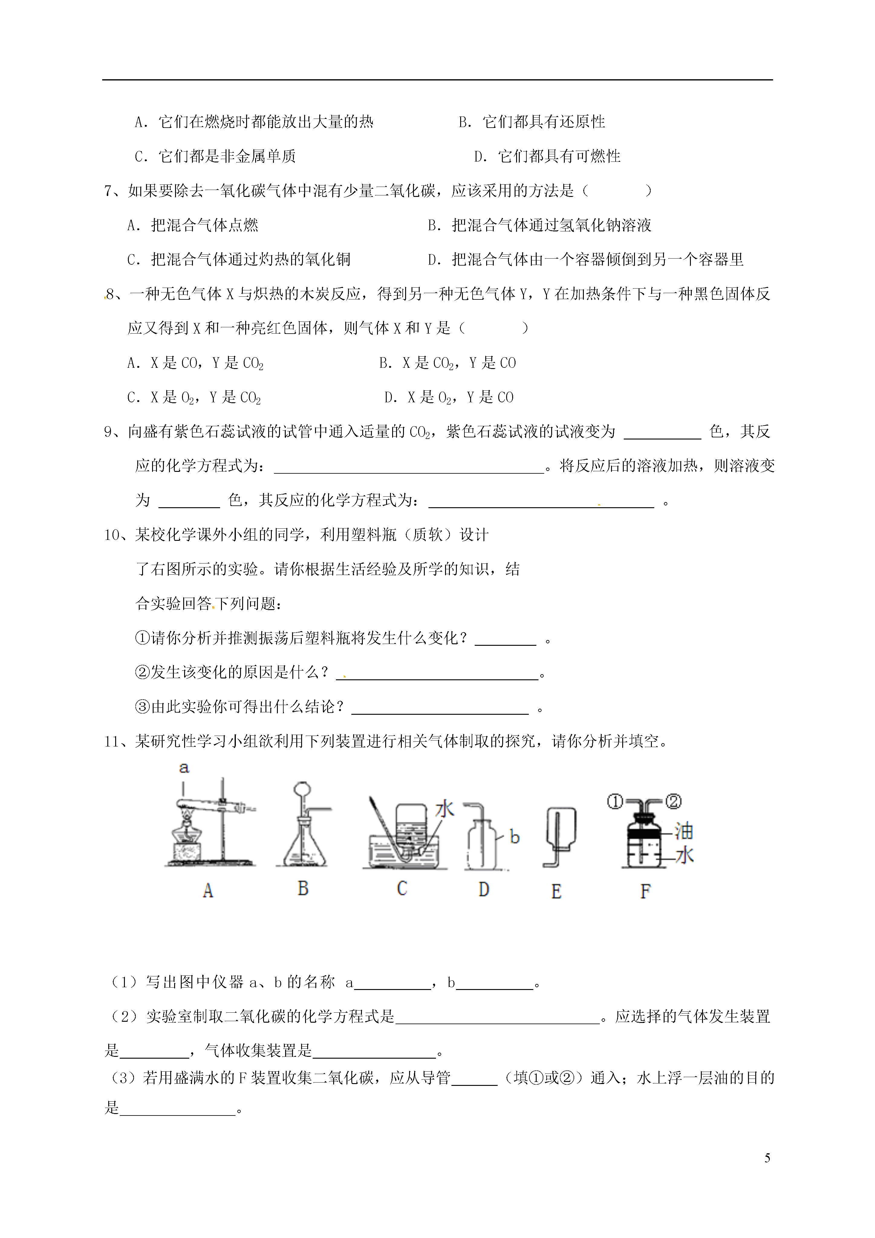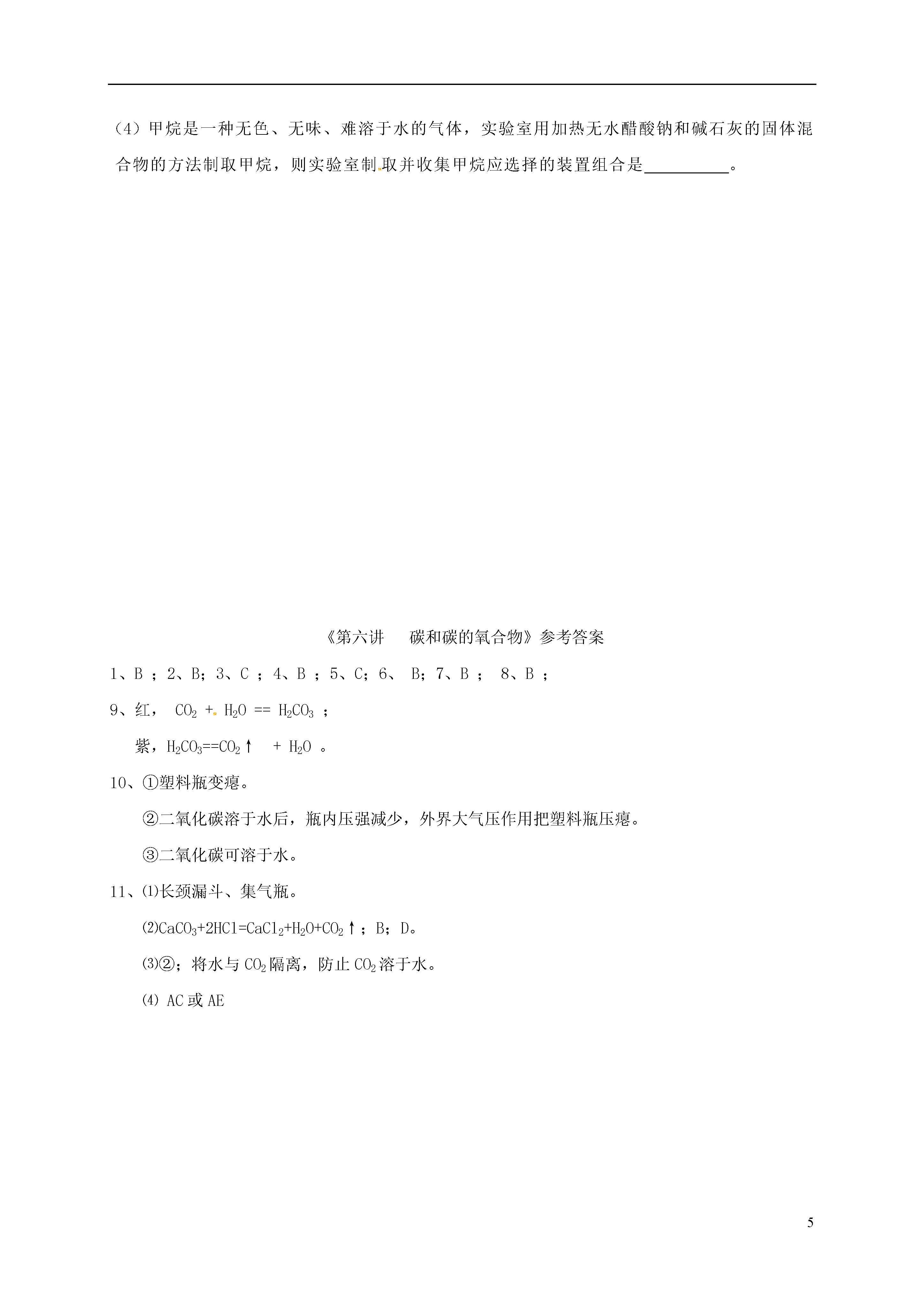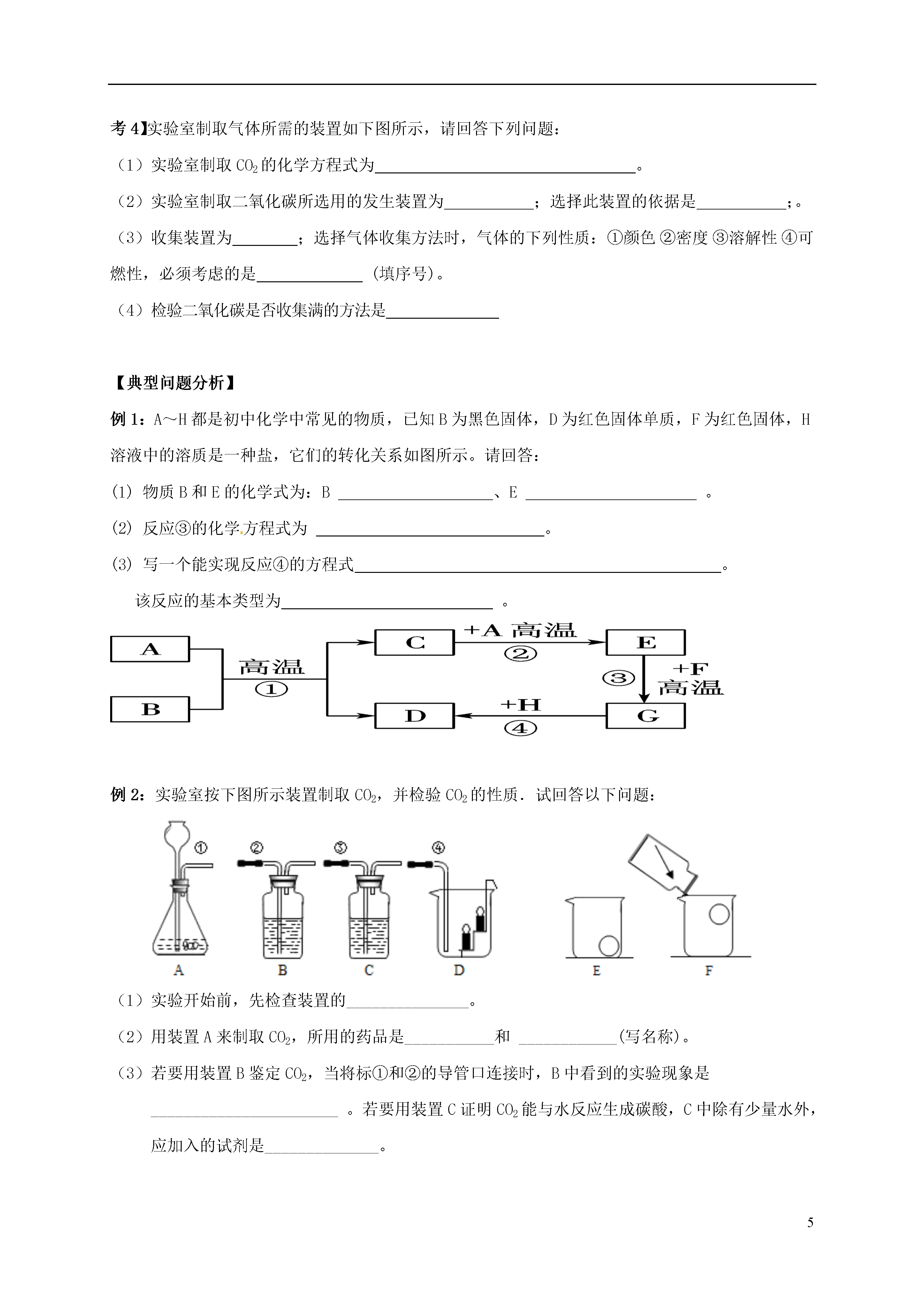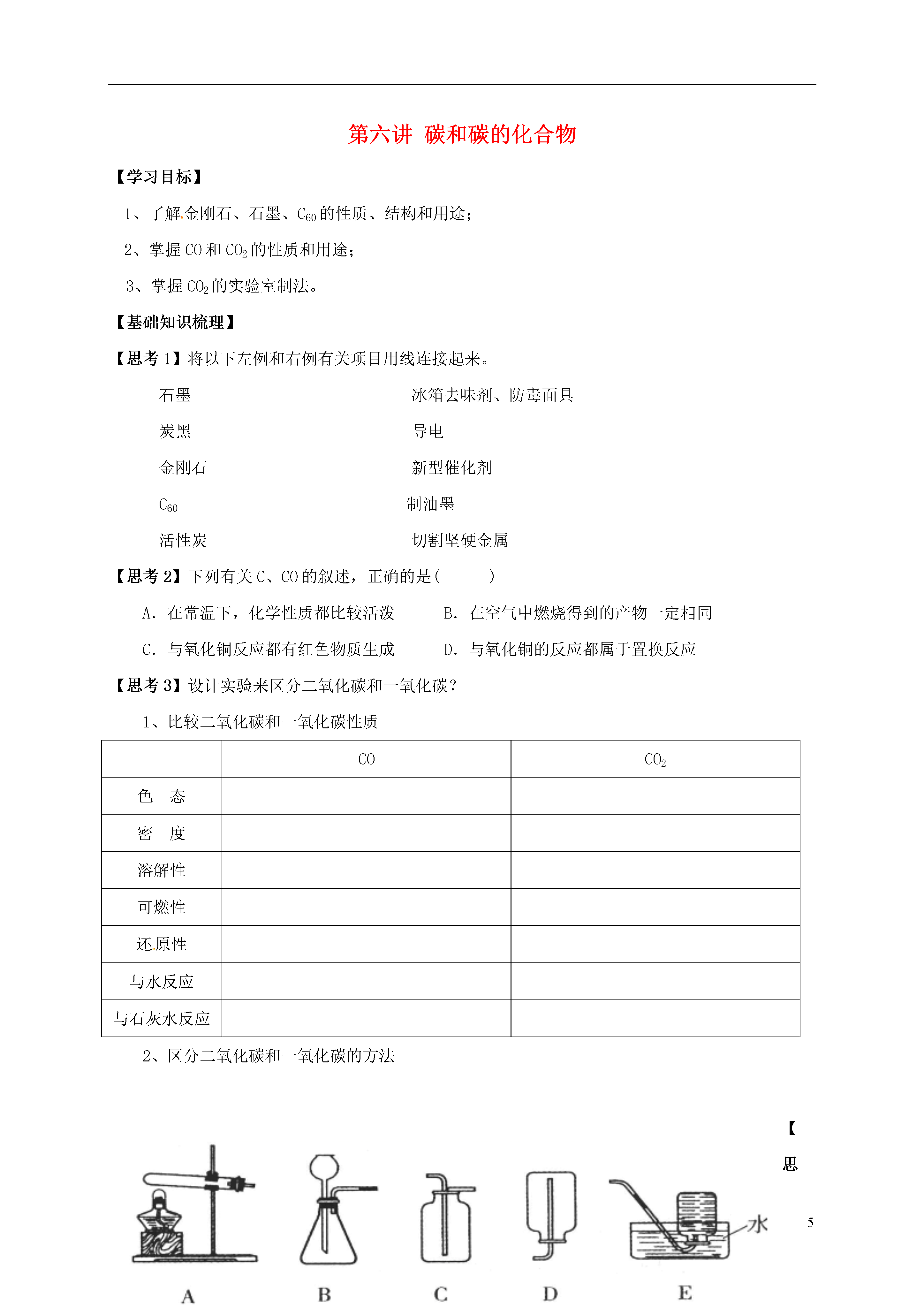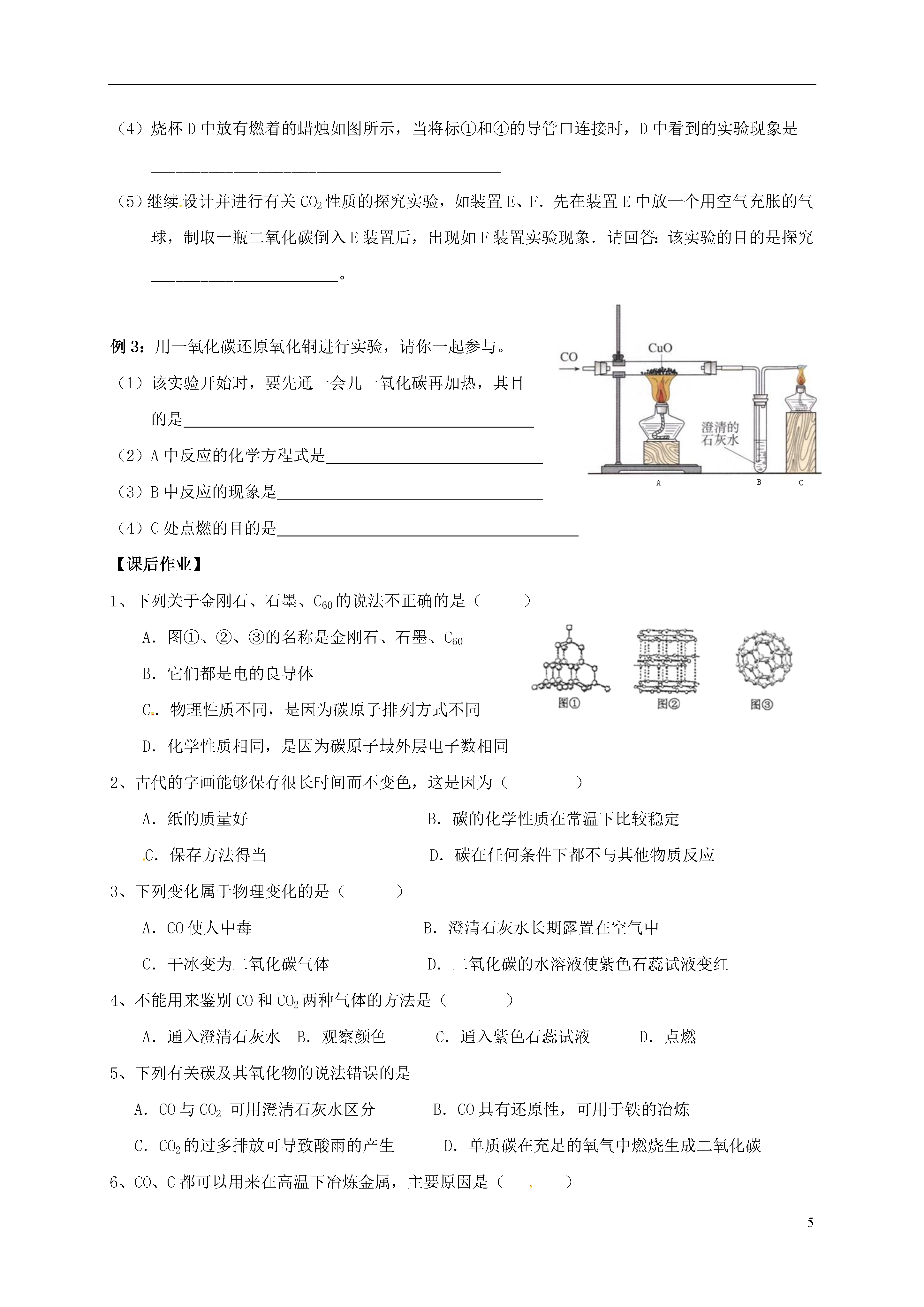 5第六讲碳和碳的化合物【学习目标】1、了解金刚石、石墨、C60的性质、结构和用途;2、掌握CO和CO2的性质和用途;3、掌握CO2的实验室制法。【基础知识梳理】【思考1】将以下左例和右例有关项目用线连接起来。石墨冰箱去味剂、防毒面具炭黑导电金刚石新型催化剂C60制油墨活性炭切割坚硬金属【思考2】下列有关C、CO的叙述,正确的是()A.在常温下,化学性质都比较活泼B.在空气中燃烧得到的产物一定相同C.与氧化铜反应都有红色物质生成D.与氧化铜的反应都属于置换反应【思考3】设计实验来区分二氧化碳和一氧化碳?1、比较二氧化碳和一氧化碳性质COCO2色态密度溶解性可燃性还原性与水反应与石灰水反应2、区分二氧化碳和一氧化碳的方法【思考4】实验室制取气体所需的装置如下图所示,请回答下列问题:(1)实验室制取CO2的化学方程式为。(2)实验室制取二氧化碳所选用的发生装置为;选择此装置的依据是;。(3)收集装置为;选择气体收集方法时,气体的下列性质:①颜色②密度③溶解性④可燃性,必须考虑的是(填序号)。(4)检验二氧化碳是否收集满的方法是【典型问题分析】例1:A~H都是初中化学中常见的物质,已知B为黑色固体,D为红色固体单质,F为红色固体,H溶液中的溶质是一种盐,它们的转化关系如图所示。请回答:(1)物质B和E的化学式为:B、E。(2)反应③的化学方程式为。(3)写一个能实现反应④的方程式。该反应的基本类型为。例2:实验室按下图所示装置制取CO2,并检验CO2的性质.试回答以下问题:(1)实验开始前,先检查装置的_______________。(2)用装置A来制取CO2,所用的药品是___________和____________(写名称)。(3)若要用装置B鉴定CO2,当将标①和②的导管口连接时,B中看到的实验现象是_______________________。若要用装置C证明CO2能与水反应生成碳酸,C中除有少量水外,应加入的试剂是______________。(4)烧杯D中放有燃着的蜡烛如图所示,当将标①和④的导管口连接时,D中看到的实验现象是___________________________________________(5)继续设计并进行有关CO2性质的探究实验,如装置E、F.先在装置E中放一个用空气充胀的气球,制取一瓶二氧化碳倒入E装置后,出现如F装置实验现象.请回答:该实验的目的是探究_______________________。例3:用一氧化碳还原氧化铜进行实验,请你一起参与。(1)该实验开始时,要先通一会儿一氧化碳再加热,其目的是(2)A中反应的化学方程式是(3)B中反应的现象是(4)C处点燃的目的是【课后作业】1、下列关于金刚石、石墨、C60的说法不正确的是()A.图①、②、③的名称是金刚石、石墨、C60B.它们都是电的良导体C.物理性质不同,是因为碳原子排列方式不同D.化学性质相同,是因为碳原子最外层电子数相同2、古代的字画能够保存很长时间而不变色,这是因为()A.纸的质量好B.碳的化学性质在常温下比较稳定C.保存方法得当D.碳在任何条件下都不与其他物质反应3、下列变化属于物理变化的是()A.CO使人中毒B.澄清石灰水长期露置在空气中C.干冰变为二氧化碳气体D.二氧化碳的水溶液使紫色石蕊试液变红4、不能用来鉴别CO和CO2两种气体的方法是()A.通入澄清石灰水B.观察颜色C.通入紫色石蕊试液D.点燃5、下列有关碳及其氧化物的说法错误的是A.CO与CO2可用澄清石灰水区分B.CO具有还原性,可用于铁的冶炼C.CO2的过多排放可导致酸雨的产生D.单质碳在充足的氧气中燃烧生成二氧化碳6、CO、C都可以用来在高温下冶炼金属,主要原因是()A.它们在燃烧时都能放出大量的热B.它们都具有还原性C.它们都是非金属单质D.它们都具有可燃性7、如果要除去一氧化碳气体中混有少量二氧化碳,应该采用的方法是()A.把混合气体点燃B.把混合气体通过氢氧化钠溶液C.把混合气体通过灼热的氧化铜D.把混合气体由一个容器倾倒到另一个容器里8、一种无色气体X与炽热的木炭反应,得到另一种无色气体Y,Y在加热条件下与一种黑色固体反应又得到X和一种亮红色固体,则气体X和Y是()A.X是CO,Y是CO2B.X是CO2,Y是COC.X是O2,Y是CO2D.X是O2,Y是CO9、向盛有紫色石蕊试液的试管中通入适量的CO2,紫色石蕊试液的试液变为色,其反应的化学方程式为:。将反应后的溶液加热,则溶液变为色,其反应的化学方程式为:。10、某校化学课外小组的同学,利用塑料瓶(质软)设计了