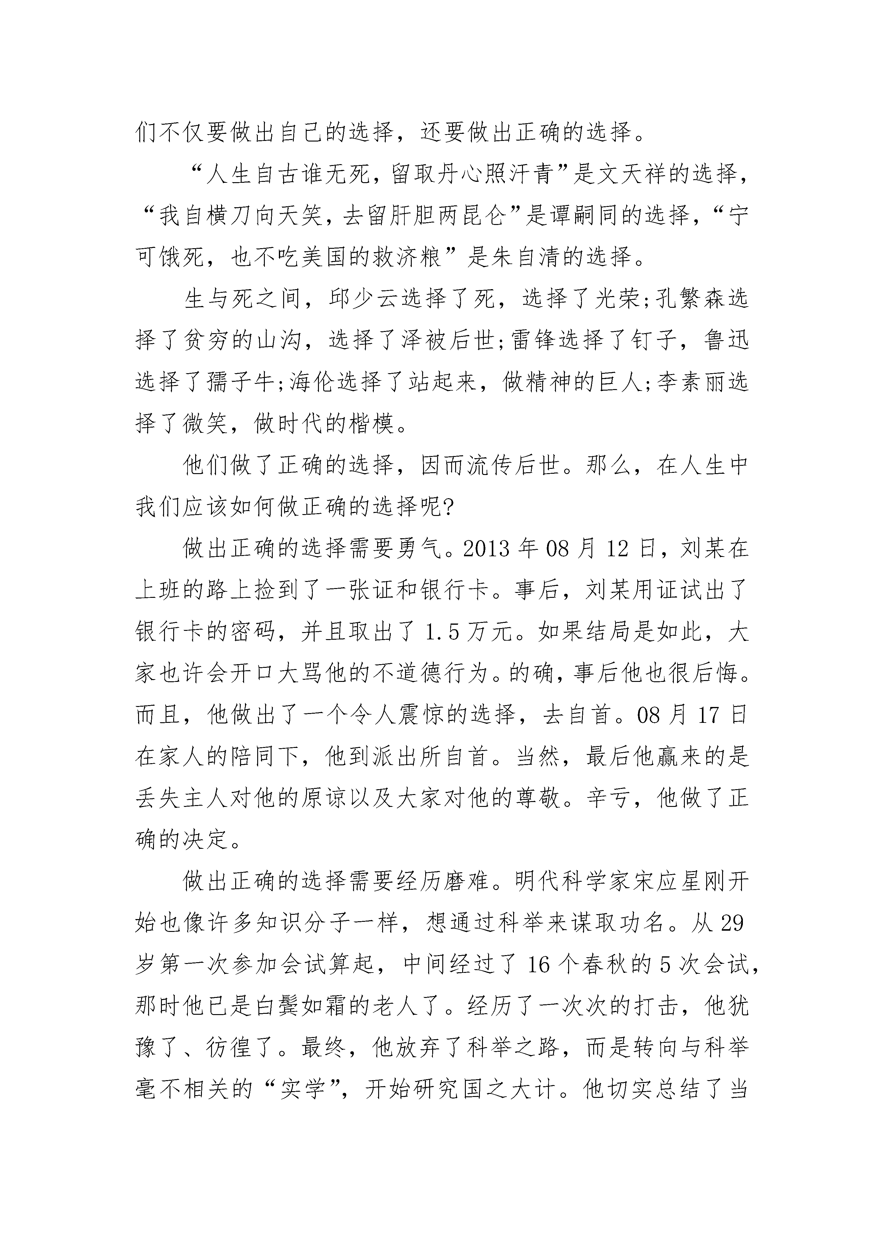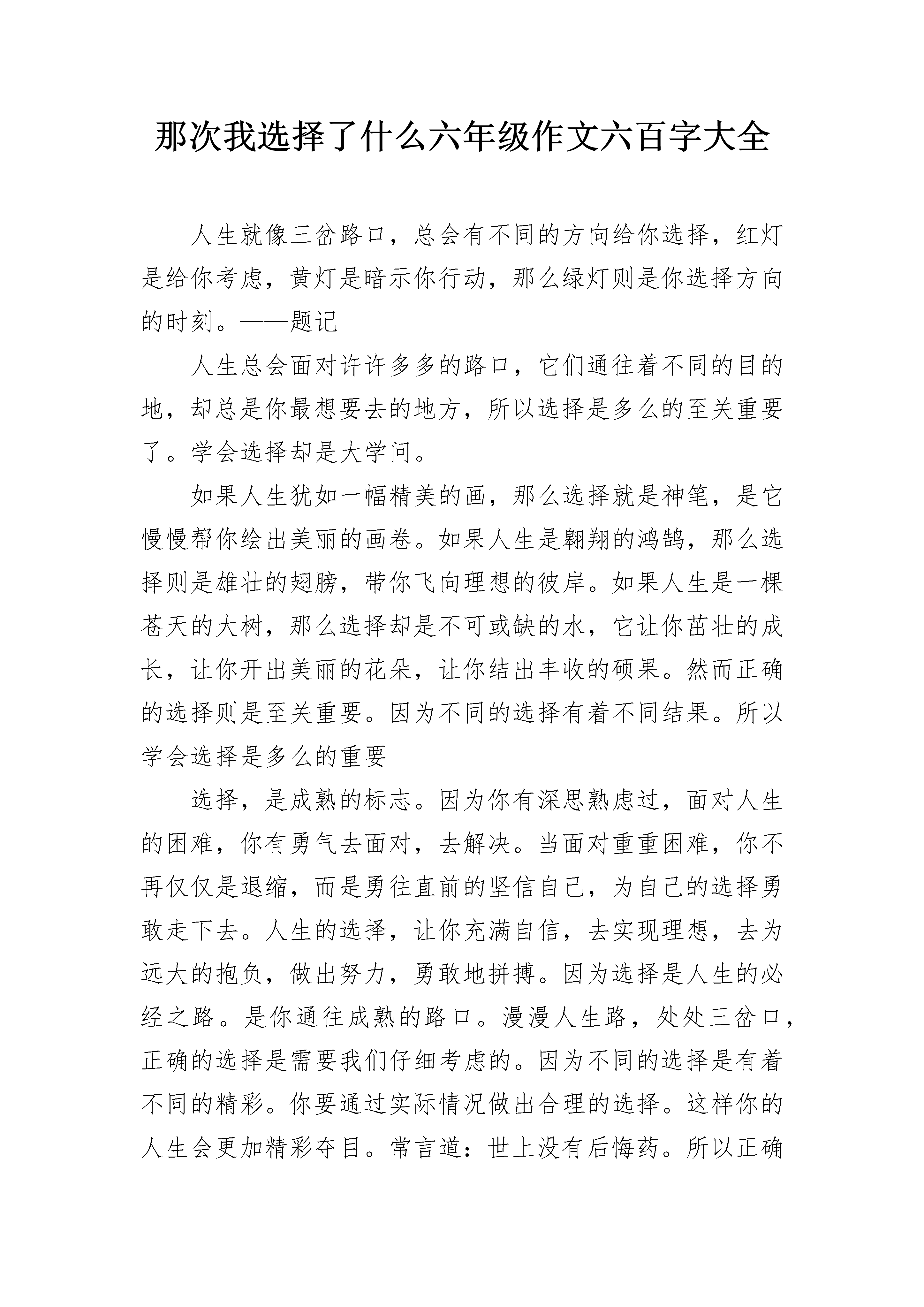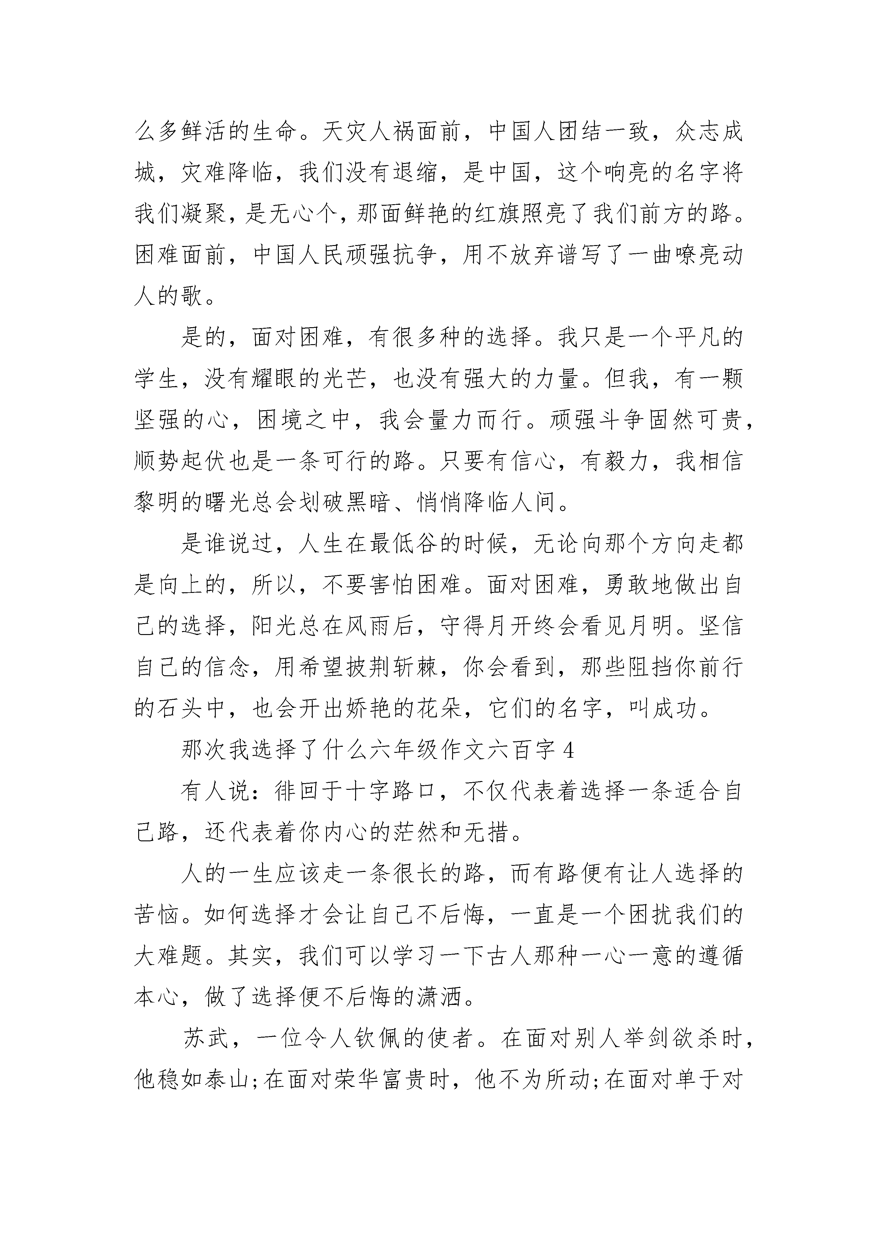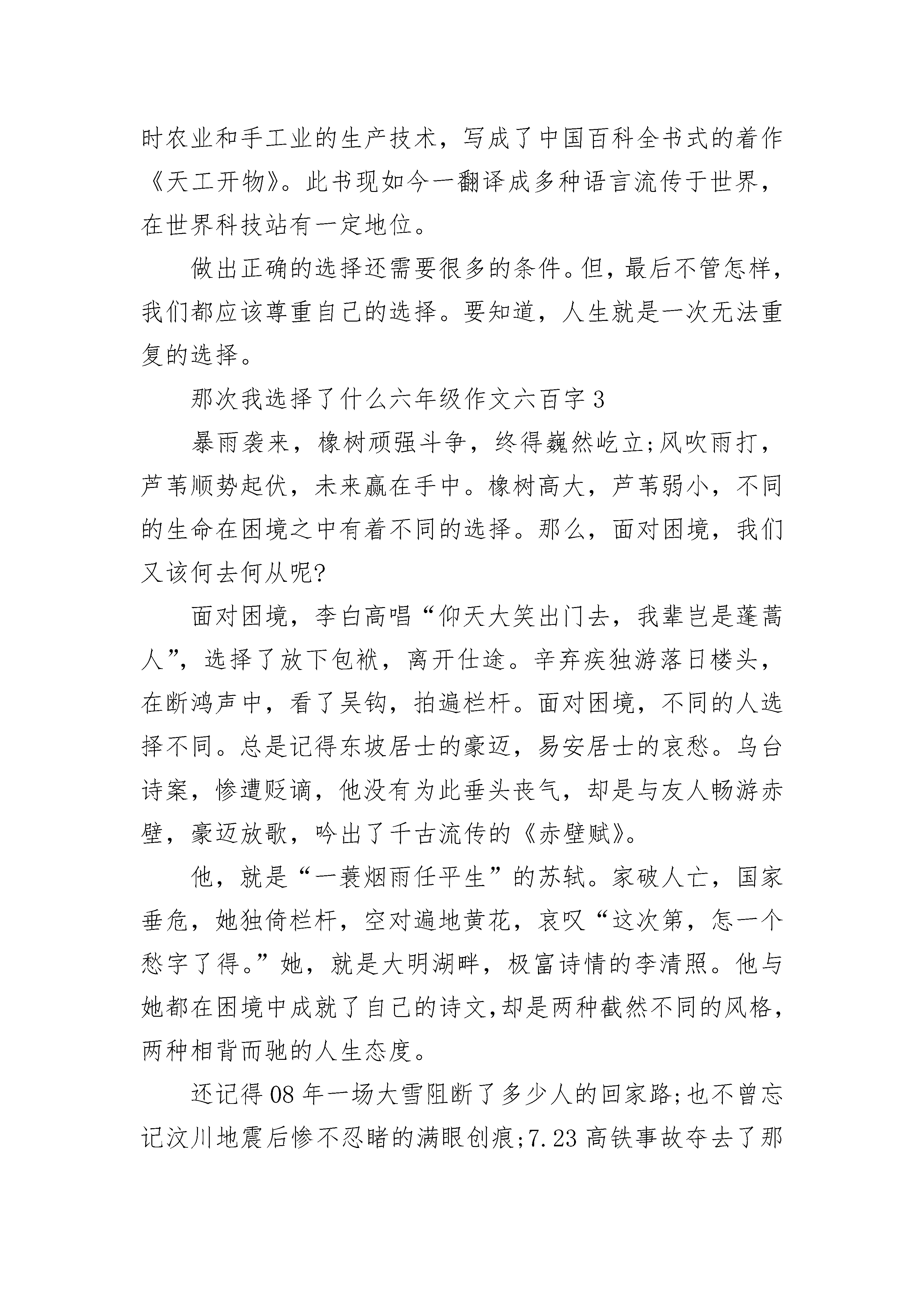 那次我选择了什么六年级作文六百字大全人生就像三岔路口,总会有不同的方向给你选择,红灯是给你考虑,黄灯是暗示你行动,那么绿灯则是你选择方向的时刻。——题记人生总会面对许许多多的路口,它们通往着不同的目的地,却总是你最想要去的地方,所以选择是多么的至关重要了。学会选择却是大学问。如果人生犹如一幅精美的画,那么选择就是神笔,是它慢慢帮你绘出美丽的画卷。如果人生是翱翔的鸿鹄,那么选择则是雄壮的翅膀,带你飞向理想的彼岸。如果人生是一棵苍天的大树,那么选择却是不可或缺的水,它让你茁壮的成长,让你开出美丽的花朵,让你结出丰收的硕果。然而正确的选择则是至关重要。因为不同的选择有着不同结果。所以学会选择是多么的重要选择,是成熟的标志。因为你有深思熟虑过,面对人生的困难,你有勇气去面对,去解决。当面对重重困难,你不再仅仅是退缩,而是勇往直前的坚信自己,为自己的选择勇敢走下去。人生的选择,让你充满自信,去实现理想,去为远大的抱负,做出努力,勇敢地拼搏。因为选择是人生的必经之路。是你通往成熟的路口。漫漫人生路,处处三岔口,正确的选择是需要我们仔细考虑的。因为不同的选择是有着不同的精彩。你要通过实际情况做出合理的选择。这样你的人生会更加精彩夺目。常言道:世上没有后悔药。所以正确的选择,让你可以少走一些弯路。学会选择,是留给有准备的人。选择正确的人生,会让我们的人生更加精彩,也许人生之旅会少不了披茎之路,少不了攀岩之峰,少不了波涛汹涌的海潮。但都会一一被我们征服。因为我们有正确地选择人生的三岔口。在面对困难时有着勇往直前的力量。有着自信成熟的勇气,有着拼搏努力的尽头。学会选择,是留给充满自信的人,因为自信的人知道他们想要什么,追求什么。当面对选择时他们不会束手无策。因为心中早已扬起了船帆,眺望了彼岸。这样他们才不会“迷路”。才能成功的到达理想的港湾。请扬起自信的船帆勇敢的前行。学会选择,人生会更加丰富多姿。学会选择,人生会自信延绵千年。学会选择,总有直挂云帆济沧海。那次我选择了什么六年级作文六百字2莫尔曾说过:“人生中最困难者,莫过于选择。”但人生长途漫漫,谁不会碰到难以抉择的事呢。这时,我们就应该做出自己的选择。“东窗密谋莫须有,风波冤狱天也哭”,这是秦桧的选择。不顾“痛哭六军具缟素”,只会“冲冠一怒为红颜”,这是吴三桂的选择。本“包羞忍耻是男儿”,却“不肯过江东”,这是项羽的选择。这些人虽然做出选择,但人生却以失败告终。可见,我们不仅要做出自己的选择,还要做出正确的选择。“人生自古谁无死,留取丹心照汗青”是文天祥的选择,“我自横刀向天笑,去留肝胆两昆仑”是谭嗣同的选择,“宁可饿死,也不吃美国的救济粮”是朱自清的选择。生与死之间,邱少云选择了死,选择了光荣;孔繁森选择了贫穷的山沟,选择了泽被后世;雷锋选择了钉子,鲁迅选择了孺子牛;海伦选择了站起来,做精神的巨人;李素丽选择了微笑,做时代的楷模。他们做了正确的选择,因而流传后世。那么,在人生中我们应该如何做正确的选择呢?做出正确的选择需要勇气。2013年08月12日,刘某在上班的路上捡到了一张证和银行卡。事后,刘某用证试出了银行卡的密码,并且取出了1.5万元。如果结局是如此,大家也许会开口大骂他的不道德行为。的确,事后他也很后悔。而且,他做出了一个令人震惊的选择,去自首。08月17日在家人的陪同下,他到派出所自首。当然,最后他赢来的是丢失主人对他的原谅以及大家对他的尊敬。辛亏,他做了正确的决定。做出正确的选择需要经历磨难。明代科学家宋应星刚开始也像许多知识分子一样,想通过科举来谋取功名。从29岁第一次参加会试算起,中间经过了16个春秋的5次会试,那时他已是白鬓如霜的老人了。经历了一次次的打击,他犹豫了、彷徨了。最终,他放弃了科举之路,而是转向与科举毫不相关的“实学”,开始研究国之大计。他切实总结了当时农业和手工业的生产技术,写成了中国百科全书式的着作《天工开物》。此书现如今一翻译成多种语言流传于世界,在世界科技站有一定地位。做出正确的选择还需要很多的条件。但,最后不管怎样,我们都应该尊重自己的选择。要知道,人生就是一次无法重复的选择。那次我选择了什么六年级作文六百字3暴雨袭来,橡树顽强斗争,终得巍然屹立;风吹雨打,芦苇顺势起伏,未来赢在手中。橡树高大,芦苇弱小,不同的生命在困境之中有着不同的选择。那么,面对困境,我们又该何去何从呢?面对困境,李白高唱“仰天大笑出门去,我辈岂是蓬蒿人”,选择了放下包袱,离开仕途。辛弃疾独游落日楼头,在断鸿声中,看了吴钩,拍遍栏杆。面对困境,不同的人选择不同。总是记得东坡居士的豪迈,易安居士的哀愁。乌台诗案,惨遭贬谪,他没有为此垂头丧气,却是与友人畅游赤壁,豪迈放歌,吟出了千古流传的《赤壁赋》。他,就是“一蓑烟雨任平生”的苏轼。家破人亡,国家垂危,她独倚栏杆,空对遍地黄花