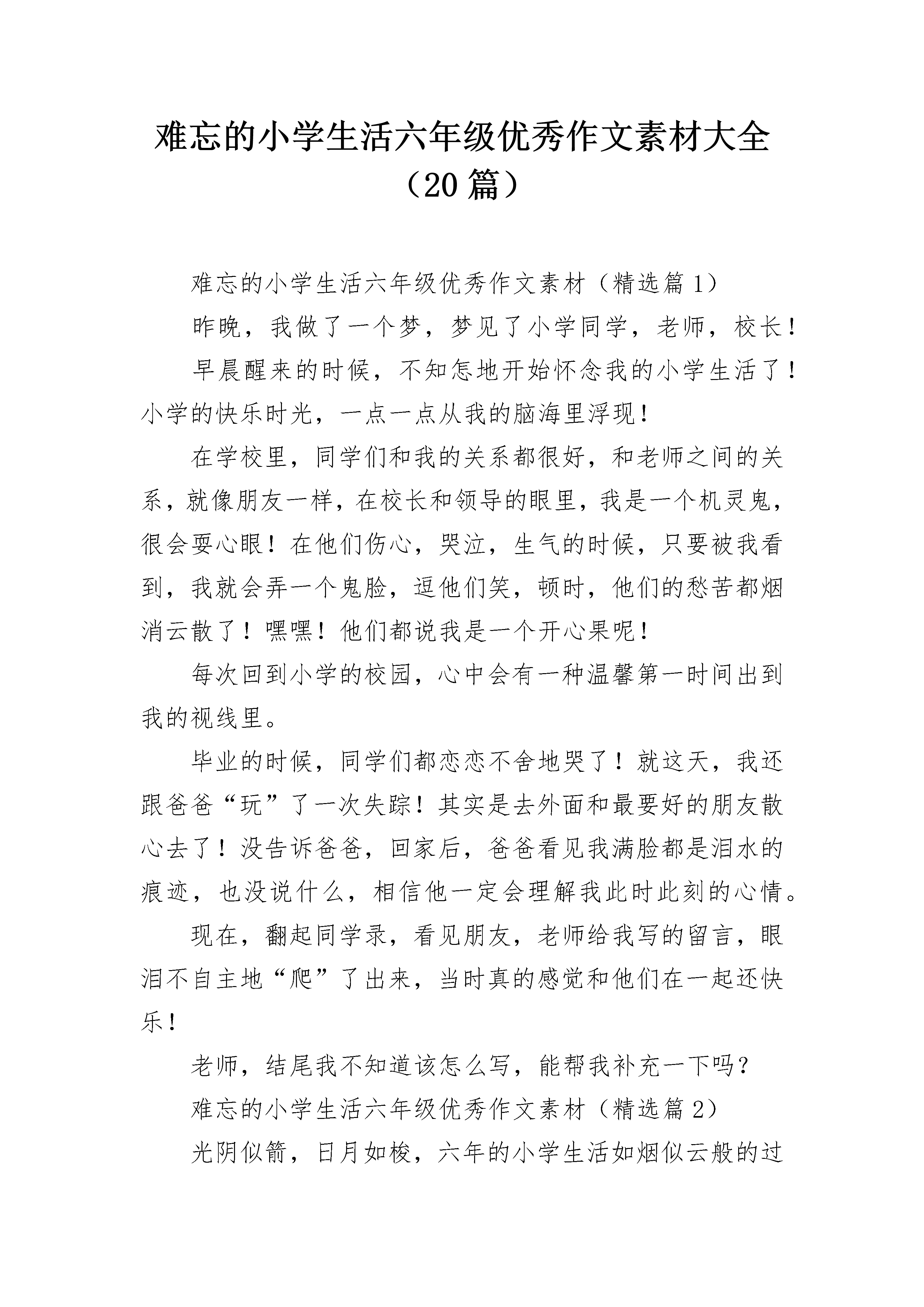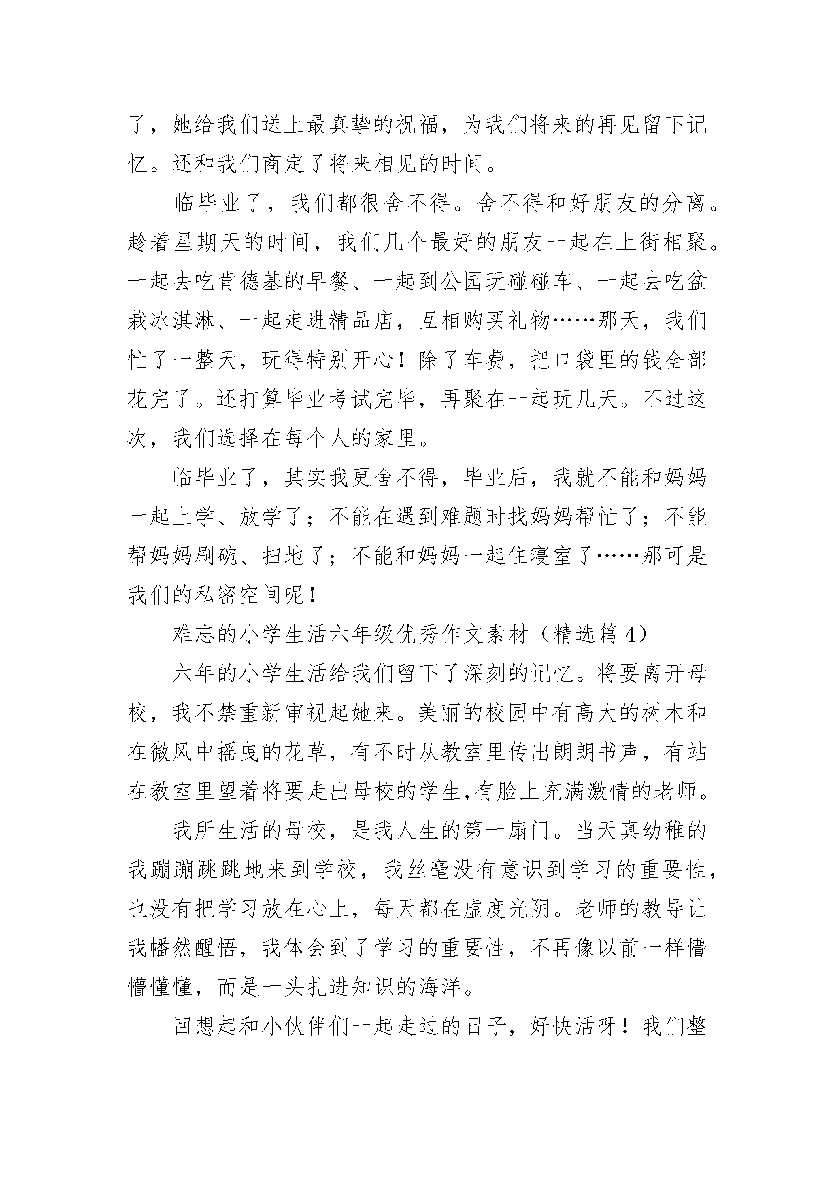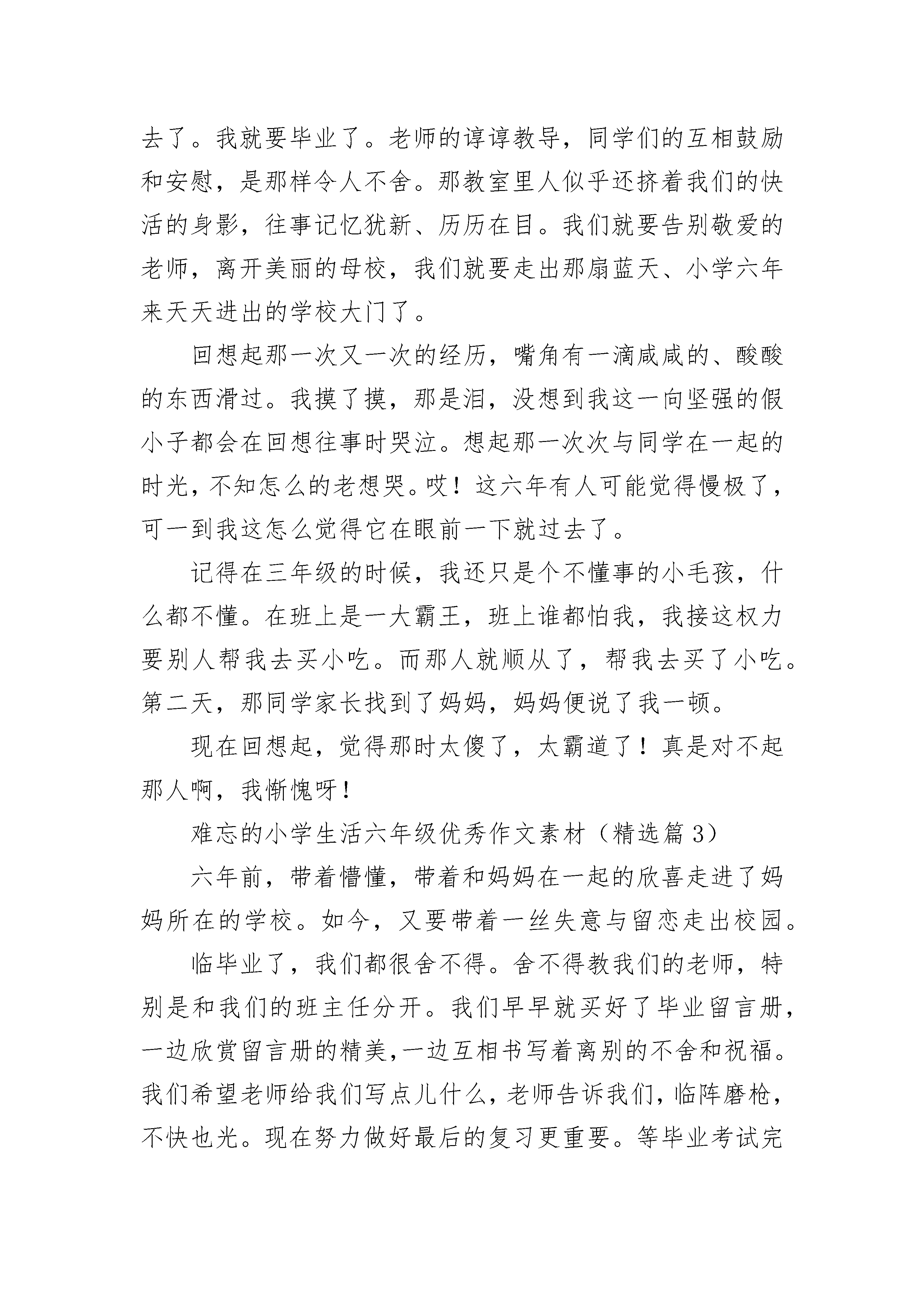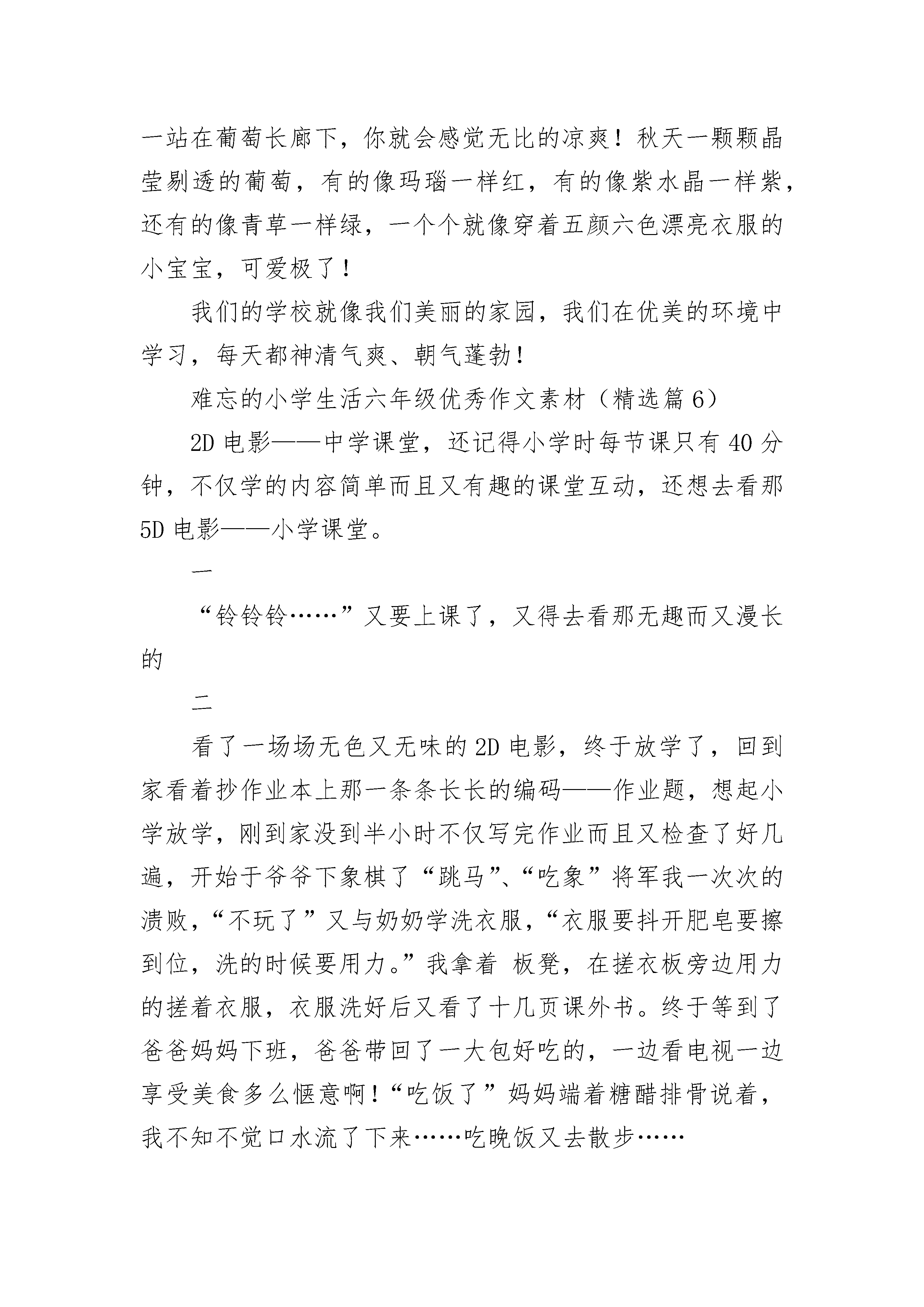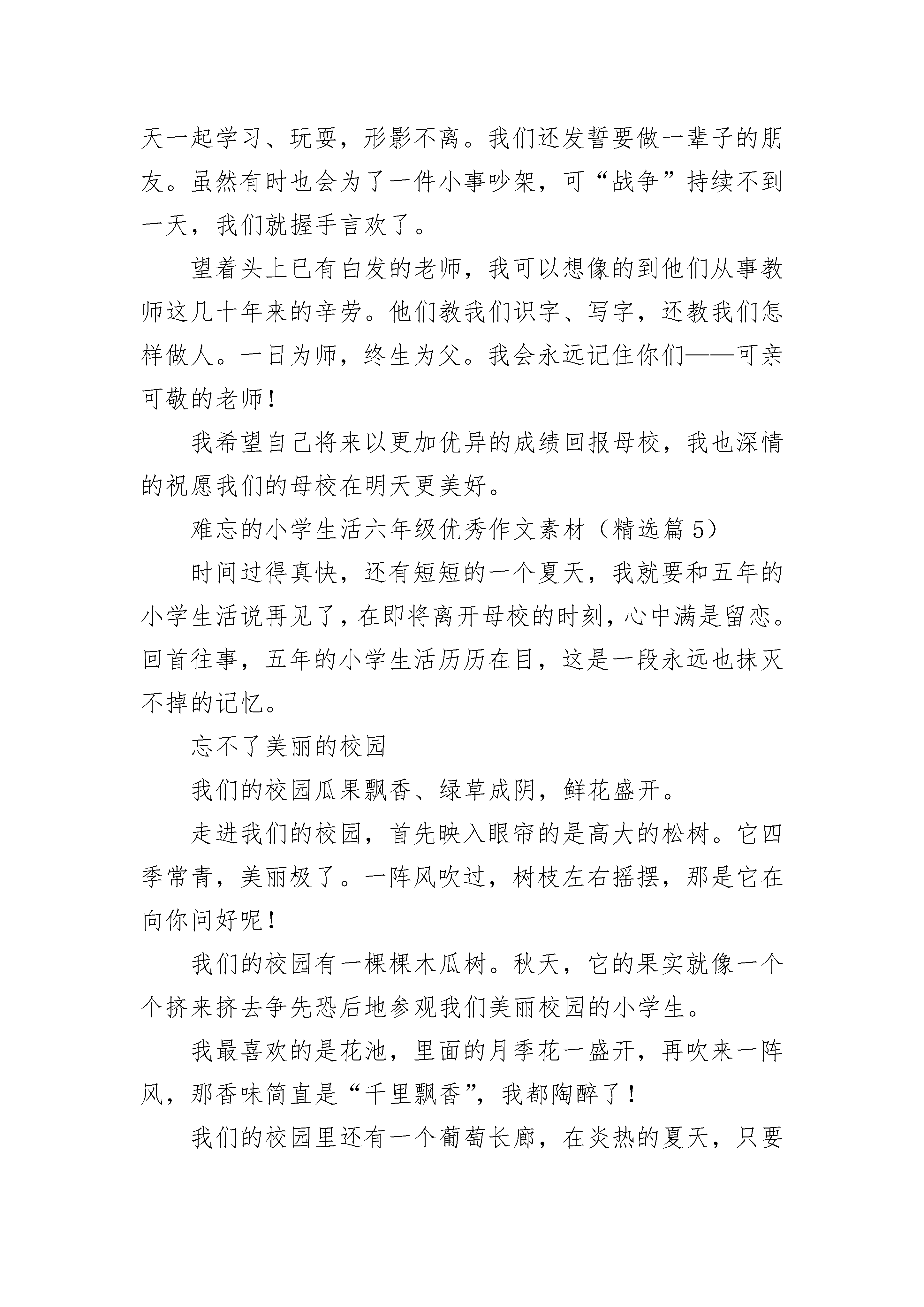 难忘的小学生活六年级优秀作文素材大全(20篇)难忘的小学生活六年级优秀作文素材(精选篇1)昨晚,我做了一个梦,梦见了小学同学,老师,校长!早晨醒来的时候,不知怎地开始怀念我的小学生活了!小学的快乐时光,一点一点从我的脑海里浮现!在学校里,同学们和我的关系都很好,和老师之间的关系,就像朋友一样,在校长和领导的眼里,我是一个机灵鬼,很会耍心眼!在他们伤心,哭泣,生气的时候,只要被我看到,我就会弄一个鬼脸,逗他们笑,顿时,他们的愁苦都烟消云散了!嘿嘿!他们都说我是一个开心果呢!每次回到小学的校园,心中会有一种温馨第一时间出到我的视线里。毕业的时候,同学们都恋恋不舍地哭了!就这天,我还跟爸爸“玩”了一次失踪!其实是去外面和最要好的朋友散心去了!没告诉爸爸,回家后,爸爸看见我满脸都是泪水的痕迹,也没说什么,相信他一定会理解我此时此刻的心情。现在,翻起同学录,看见朋友,老师给我写的留言,眼泪不自主地“爬”了出来,当时真的感觉和他们在一起还快乐!老师,结尾我不知道该怎么写,能帮我补充一下吗?难忘的小学生活六年级优秀作文素材(精选篇2)光阴似箭,日月如梭,六年的小学生活如烟似云般的过去了。我就要毕业了。老师的谆谆教导,同学们的互相鼓励和安慰,是那样令人不舍。那教室里人似乎还挤着我们的快活的身影,往事记忆犹新、历历在目。我们就要告别敬爱的老师,离开美丽的母校,我们就要走出那扇蓝天、小学六年来天天进出的学校大门了。回想起那一次又一次的经历,嘴角有一滴咸咸的、酸酸的东西滑过。我摸了摸,那是泪,没想到我这一向坚强的假小子都会在回想往事时哭泣。想起那一次次与同学在一起的时光,不知怎么的老想哭。哎!这六年有人可能觉得慢极了,可一到我这怎么觉得它在眼前一下就过去了。记得在三年级的时候,我还只是个不懂事的小毛孩,什么都不懂。在班上是一大霸王,班上谁都怕我,我接这权力要别人帮我去买小吃。而那人就顺从了,帮我去买了小吃。第二天,那同学家长找到了妈妈,妈妈便说了我一顿。现在回想起,觉得那时太傻了,太霸道了!真是对不起那人啊,我惭愧呀!难忘的小学生活六年级优秀作文素材(精选篇3)六年前,带着懵懂,带着和妈妈在一起的欣喜走进了妈妈所在的学校。如今,又要带着一丝失意与留恋走出校园。临毕业了,我们都很舍不得。舍不得教我们的老师,特别是和我们的班主任分开。我们早早就买好了毕业留言册,一边欣赏留言册的精美,一边互相书写着离别的不舍和祝福。我们希望老师给我们写点儿什么,老师告诉我们,临阵磨枪,不快也光。现在努力做好最后的复习更重要。等毕业考试完了,她给我们送上最真挚的祝福,为我们将来的再见留下记忆。还和我们商定了将来相见的时间。临毕业了,我们都很舍不得。舍不得和好朋友的分离。趁着星期天的时间,我们几个最好的朋友一起在上街相聚。一起去吃肯德基的早餐、一起到公园玩碰碰车、一起去吃盆栽冰淇淋、一起走进精品店,互相购买礼物……那天,我们忙了一整天,玩得特别开心!除了车费,把口袋里的钱全部花完了。还打算毕业考试完毕,再聚在一起玩几天。不过这次,我们选择在每个人的家里。临毕业了,其实我更舍不得,毕业后,我就不能和妈妈一起上学、放学了;不能在遇到难题时找妈妈帮忙了;不能帮妈妈刷碗、扫地了;不能和妈妈一起住寝室了……那可是我们的私密空间呢!难忘的小学生活六年级优秀作文素材(精选篇4)六年的小学生活给我们留下了深刻的记忆。将要离开母校,我不禁重新审视起她来。美丽的校园中有高大的树木和在微风中摇曳的花草,有不时从教室里传出朗朗书声,有站在教室里望着将要走出母校的学生,有脸上充满激情的老师。我所生活的母校,是我人生的第一扇门。当天真幼稚的我蹦蹦跳跳地来到学校,我丝毫没有意识到学习的重要性,也没有把学习放在心上,每天都在虚度光阴。老师的教导让我幡然醒悟,我体会到了学习的重要性,不再像以前一样懵懵懂懂,而是一头扎进知识的海洋。回想起和小伙伴们一起走过的日子,好快活呀!我们整天一起学习、玩耍,形影不离。我们还发誓要做一辈子的朋友。虽然有时也会为了一件小事吵架,可“战争”持续不到一天,我们就握手言欢了。望着头上已有白发的老师,我可以想像的到他们从事教师这几十年来的辛劳。他们教我们识字、写字,还教我们怎样做人。一日为师,终生为父。我会永远记住你们——可亲可敬的老师!我希望自己将来以更加优异的成绩回报母校,我也深情的祝愿我们的母校在明天更美好。难忘的小学生活六年级优秀作文素材(精选篇5)时间过得真快,还有短短的一个夏天,我就要和五年的小学生活说再见了,在即将离开母校的时刻,心中满是留恋。回首往事,五年的小学生活历历在目,这是一段永远也抹灭不掉的记忆。忘不了美丽的校园我们的校园瓜果飘香、绿草成阴,鲜花盛开。走进我们的校园,首先映入眼帘的是高大的松树。它四季常青,美丽极了。一阵风吹过,树枝左右摇摆,那是它在向你