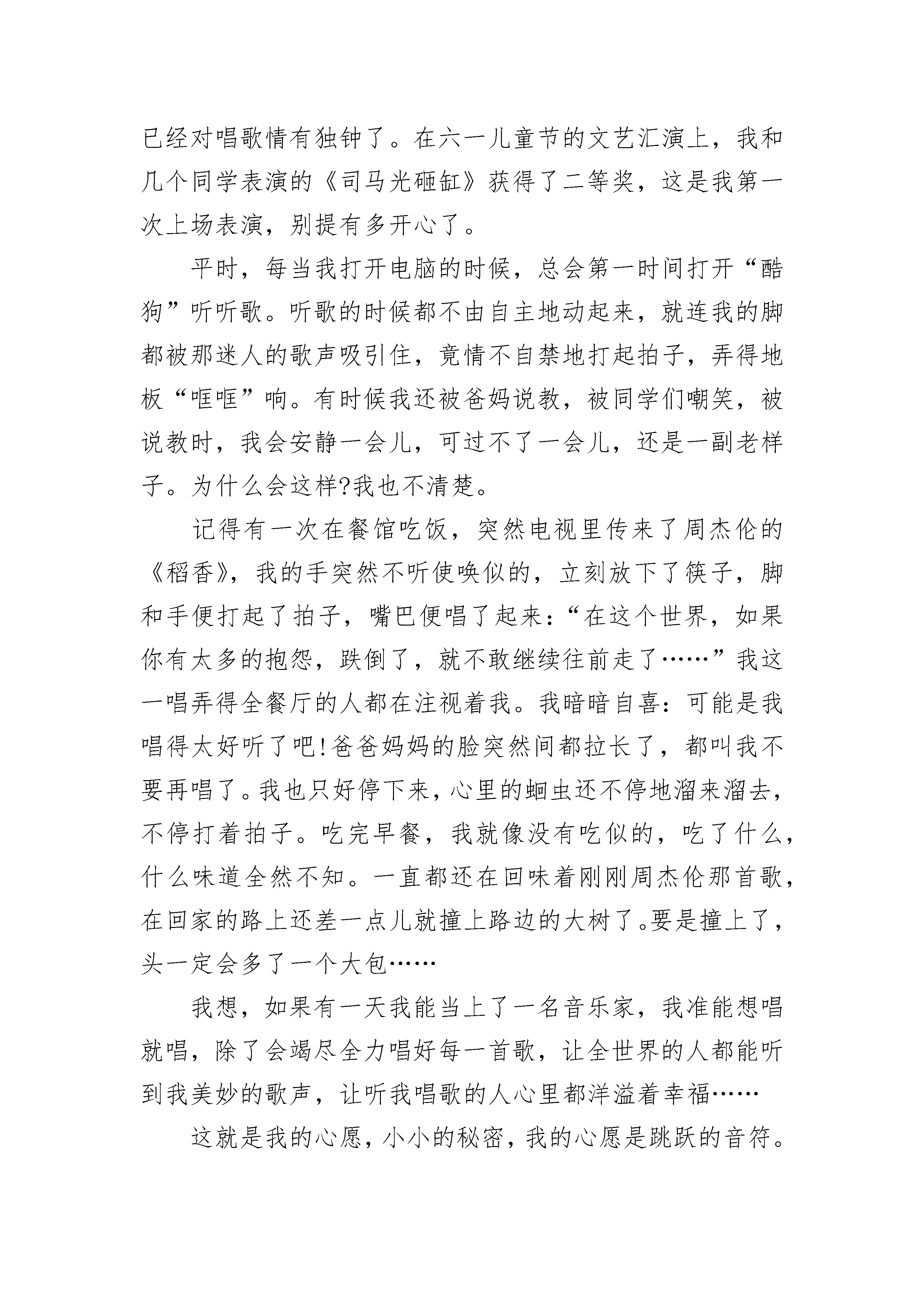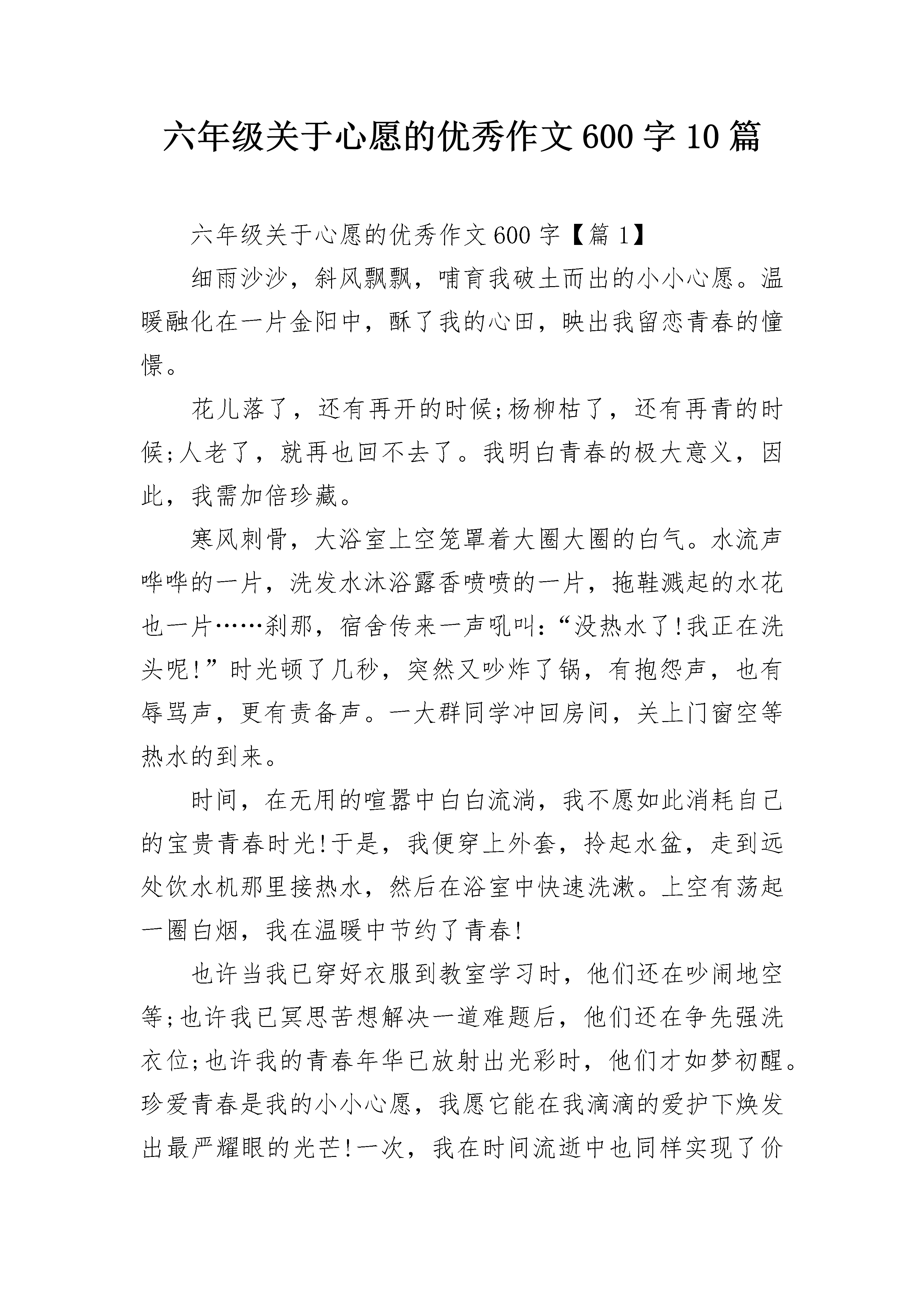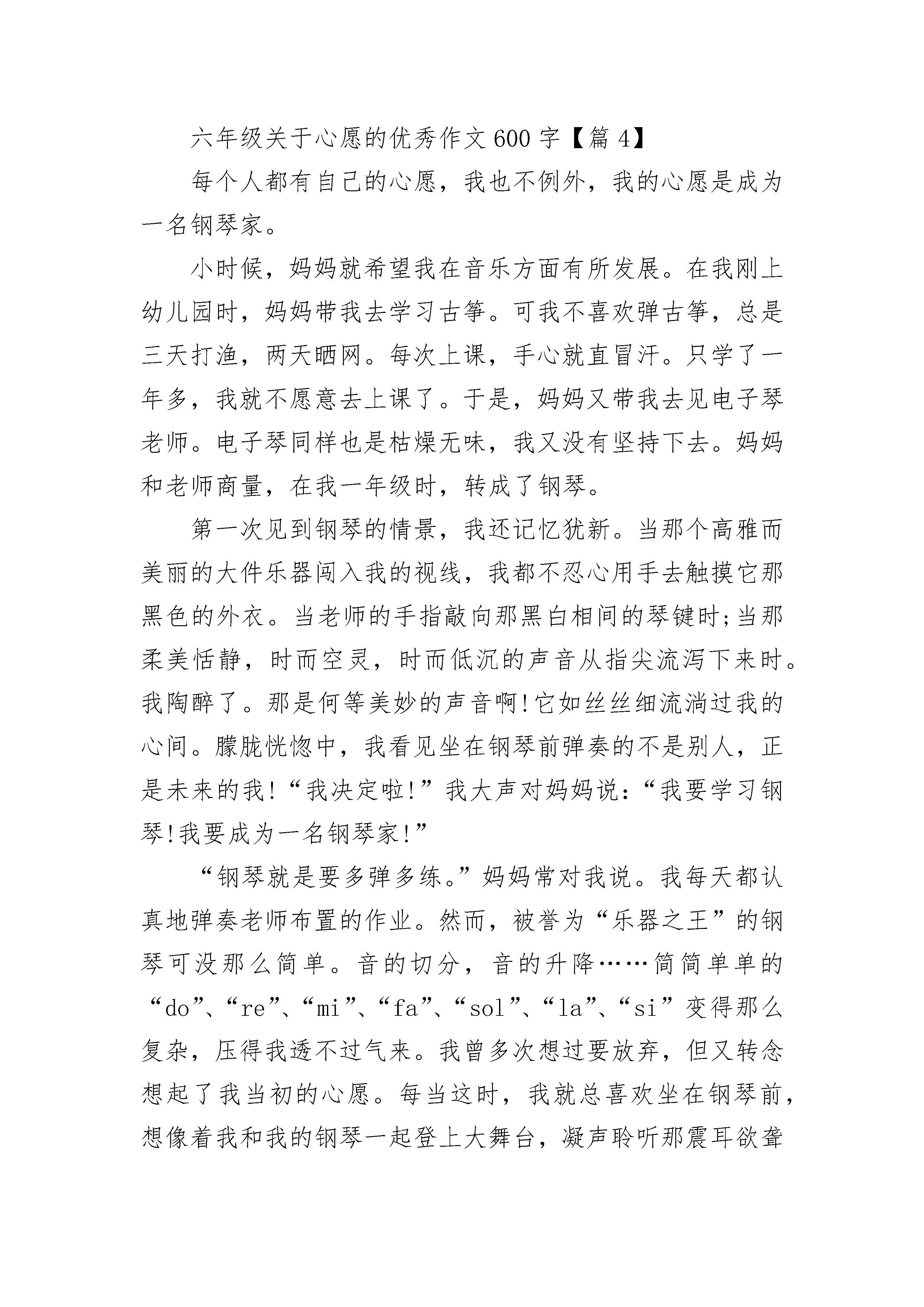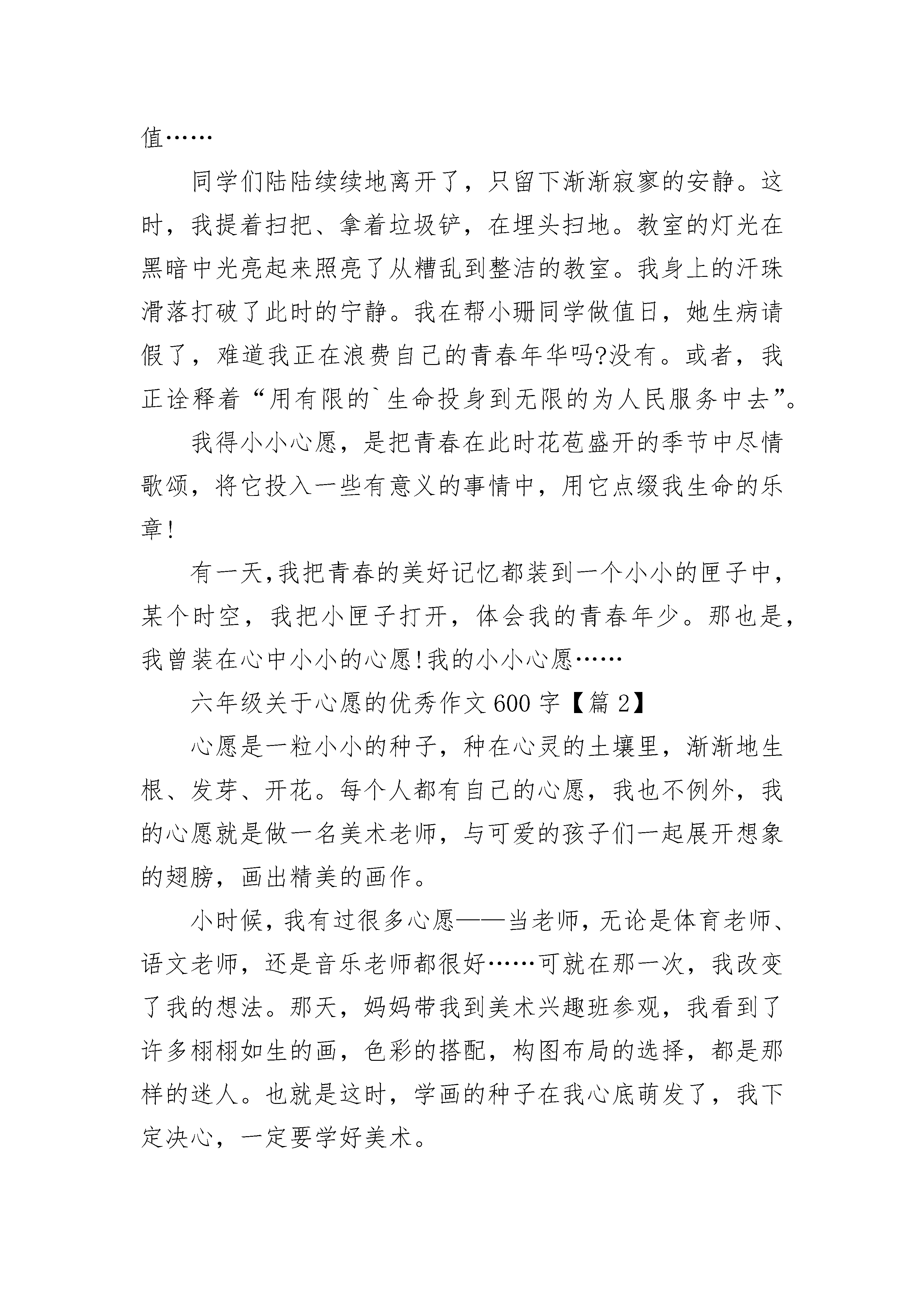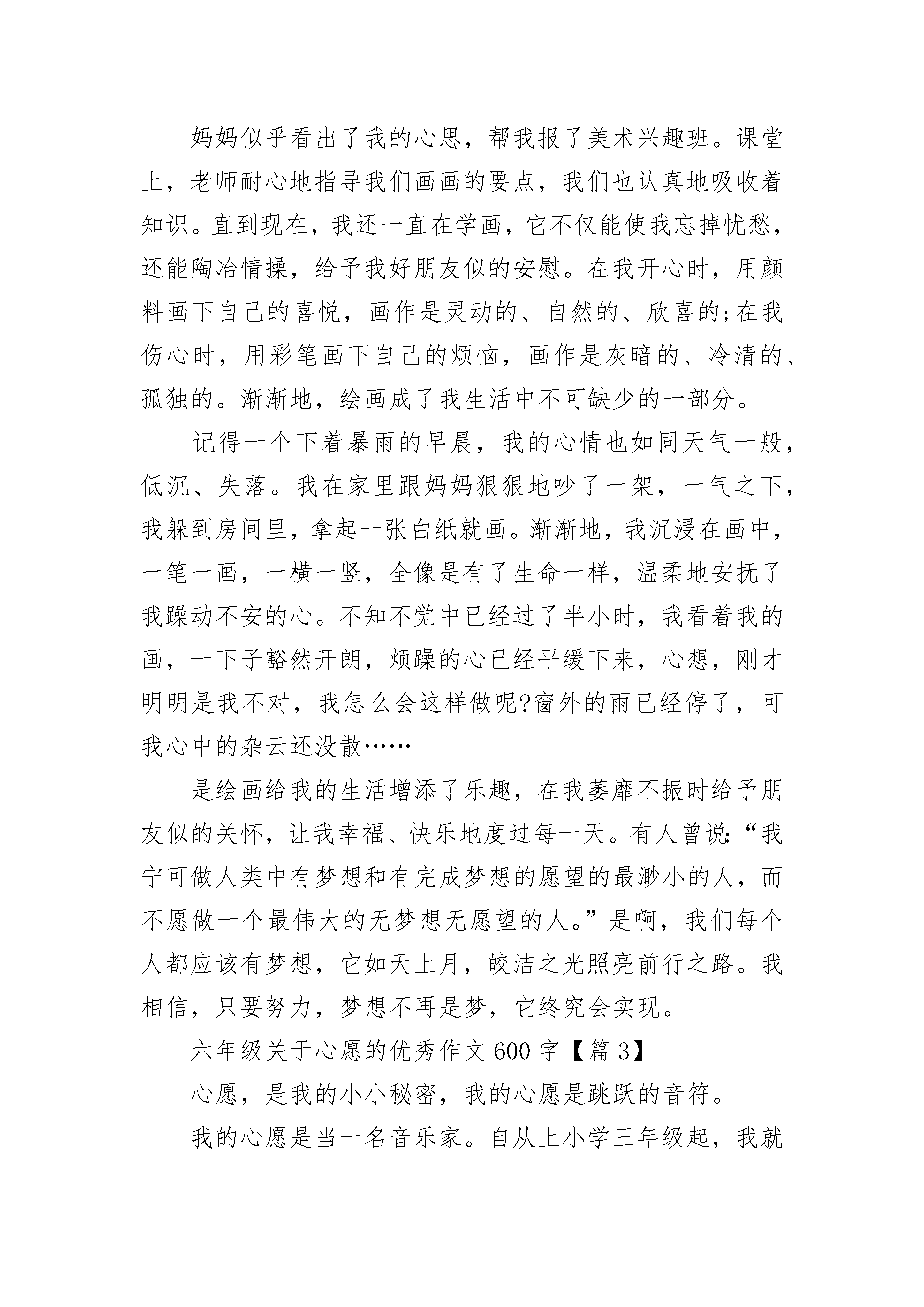六年级关于心愿的优秀作文600字10篇六年级关于心愿的优秀作文600字【篇1】细雨沙沙,斜风飘飘,哺育我破土而出的小小心愿。温暖融化在一片金阳中,酥了我的心田,映出我留恋青春的憧憬。花儿落了,还有再开的时候;杨柳枯了,还有再青的时候;人老了,就再也回不去了。我明白青春的极大意义,因此,我需加倍珍藏。寒风刺骨,大浴室上空笼罩着大圈大圈的白气。水流声哗哗的一片,洗发水沐浴露香喷喷的一片,拖鞋溅起的水花也一片……刹那,宿舍传来一声吼叫:“没热水了!我正在洗头呢!”时光顿了几秒,突然又吵炸了锅,有抱怨声,也有辱骂声,更有责备声。一大群同学冲回房间,关上门窗空等热水的到来。时间,在无用的喧嚣中白白流淌,我不愿如此消耗自己的宝贵青春时光!于是,我便穿上外套,拎起水盆,走到远处饮水机那里接热水,然后在浴室中快速洗漱。上空有荡起一圈白烟,我在温暖中节约了青春!也许当我已穿好衣服到教室学习时,他们还在吵闹地空等;也许我已冥思苦想解决一道难题后,他们还在争先强洗衣位;也许我的青春年华已放射出光彩时,他们才如梦初醒。珍爱青春是我的小小心愿,我愿它能在我滴滴的爱护下焕发出最严耀眼的光芒!一次,我在时间流逝中也同样实现了价值……同学们陆陆续续地离开了,只留下渐渐寂寥的安静。这时,我提着扫把、拿着垃圾铲,在埋头扫地。教室的灯光在黑暗中光亮起来照亮了从糟乱到整洁的教室。我身上的汗珠滑落打破了此时的宁静。我在帮小珊同学做值日,她生病请假了,难道我正在浪费自己的青春年华吗?没有。或者,我正诠释着“用有限的`生命投身到无限的为人民服务中去”。我得小小心愿,是把青春在此时花苞盛开的季节中尽情歌颂,将它投入一些有意义的事情中,用它点缀我生命的乐章!有一天,我把青春的美好记忆都装到一个小小的匣子中,某个时空,我把小匣子打开,体会我的青春年少。那也是,我曾装在心中小小的心愿!我的小小心愿……六年级关于心愿的优秀作文600字【篇2】心愿是一粒小小的种子,种在心灵的土壤里,渐渐地生根、发芽、开花。每个人都有自己的心愿,我也不例外,我的心愿就是做一名美术老师,与可爱的孩子们一起展开想象的翅膀,画出精美的画作。小时候,我有过很多心愿——当老师,无论是体育老师、语文老师,还是音乐老师都很好……可就在那一次,我改变了我的想法。那天,妈妈带我到美术兴趣班参观,我看到了许多栩栩如生的画,色彩的搭配,构图布局的选择,都是那样的迷人。也就是这时,学画的种子在我心底萌发了,我下定决心,一定要学好美术。妈妈似乎看出了我的心思,帮我报了美术兴趣班。课堂上,老师耐心地指导我们画画的要点,我们也认真地吸收着知识。直到现在,我还一直在学画,它不仅能使我忘掉忧愁,还能陶冶情操,给予我好朋友似的安慰。在我开心时,用颜料画下自己的喜悦,画作是灵动的、自然的、欣喜的;在我伤心时,用彩笔画下自己的烦恼,画作是灰暗的、冷清的、孤独的。渐渐地,绘画成了我生活中不可缺少的一部分。记得一个下着暴雨的早晨,我的心情也如同天气一般,低沉、失落。我在家里跟妈妈狠狠地吵了一架,一气之下,我躲到房间里,拿起一张白纸就画。渐渐地,我沉浸在画中,一笔一画,一横一竖,全像是有了生命一样,温柔地安抚了我躁动不安的心。不知不觉中已经过了半小时,我看着我的画,一下子豁然开朗,烦躁的心已经平缓下来,心想,刚才明明是我不对,我怎么会这样做呢?窗外的雨已经停了,可我心中的杂云还没散……是绘画给我的生活增添了乐趣,在我萎靡不振时给予朋友似的关怀,让我幸福、快乐地度过每一天。有人曾说:“我宁可做人类中有梦想和有完成梦想的愿望的最渺小的人,而不愿做一个最伟大的无梦想无愿望的人。”是啊,我们每个人都应该有梦想,它如天上月,皎洁之光照亮前行之路。我相信,只要努力,梦想不再是梦,它终究会实现。六年级关于心愿的优秀作文600字【篇3】心愿,是我的小小秘密,我的心愿是跳跃的音符。我的心愿是当一名音乐家。自从上小学三年级起,我就已经对唱歌情有独钟了。在六一儿童节的文艺汇演上,我和几个同学表演的《司马光砸缸》获得了二等奖,这是我第一次上场表演,别提有多开心了。平时,每当我打开电脑的时候,总会第一时间打开“酷狗”听听歌。听歌的时候都不由自主地动起来,就连我的脚都被那迷人的歌声吸引住,竟情不自禁地打起拍子,弄得地板“哐哐”响。有时候我还被爸妈说教,被同学们嘲笑,被说教时,我会安静一会儿,可过不了一会儿,还是一副老样子。为什么会这样?我也不清楚。记得有一次在餐馆吃饭,突然电视里传来了周杰伦的《稻香》,我的手突然不听使唤似的,立刻放下了筷子,脚和手便打起了拍子,嘴巴便唱了起来:“在这个世界,如果你有太多的抱怨,跌倒了,就不敢继续往前走了……”我这一唱弄得全餐厅的人都在注视着我。我暗暗自喜:可能是我唱得太好听了吧!爸爸妈妈的脸突然间都拉长了,都叫我不要再唱了。我也只好停下