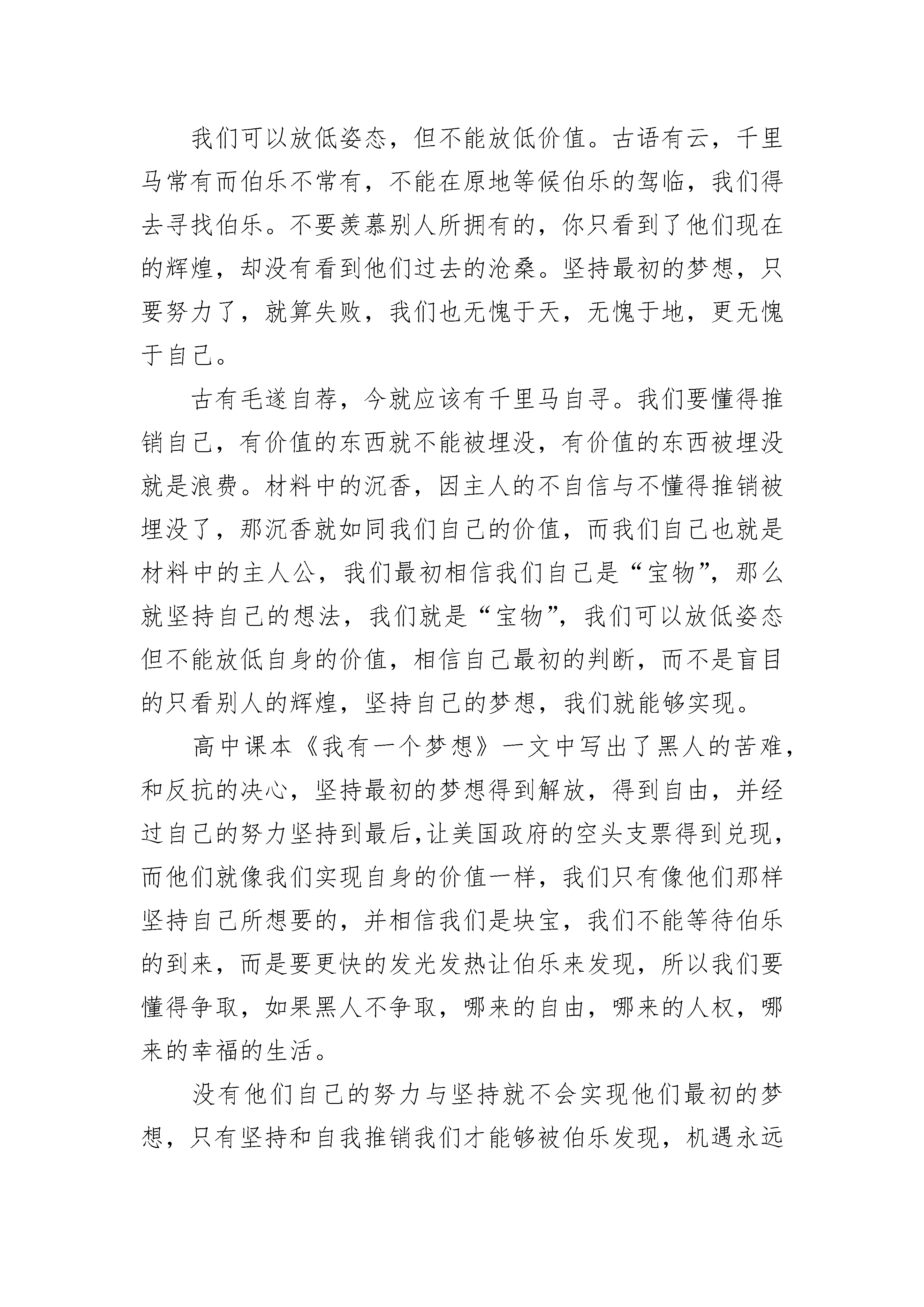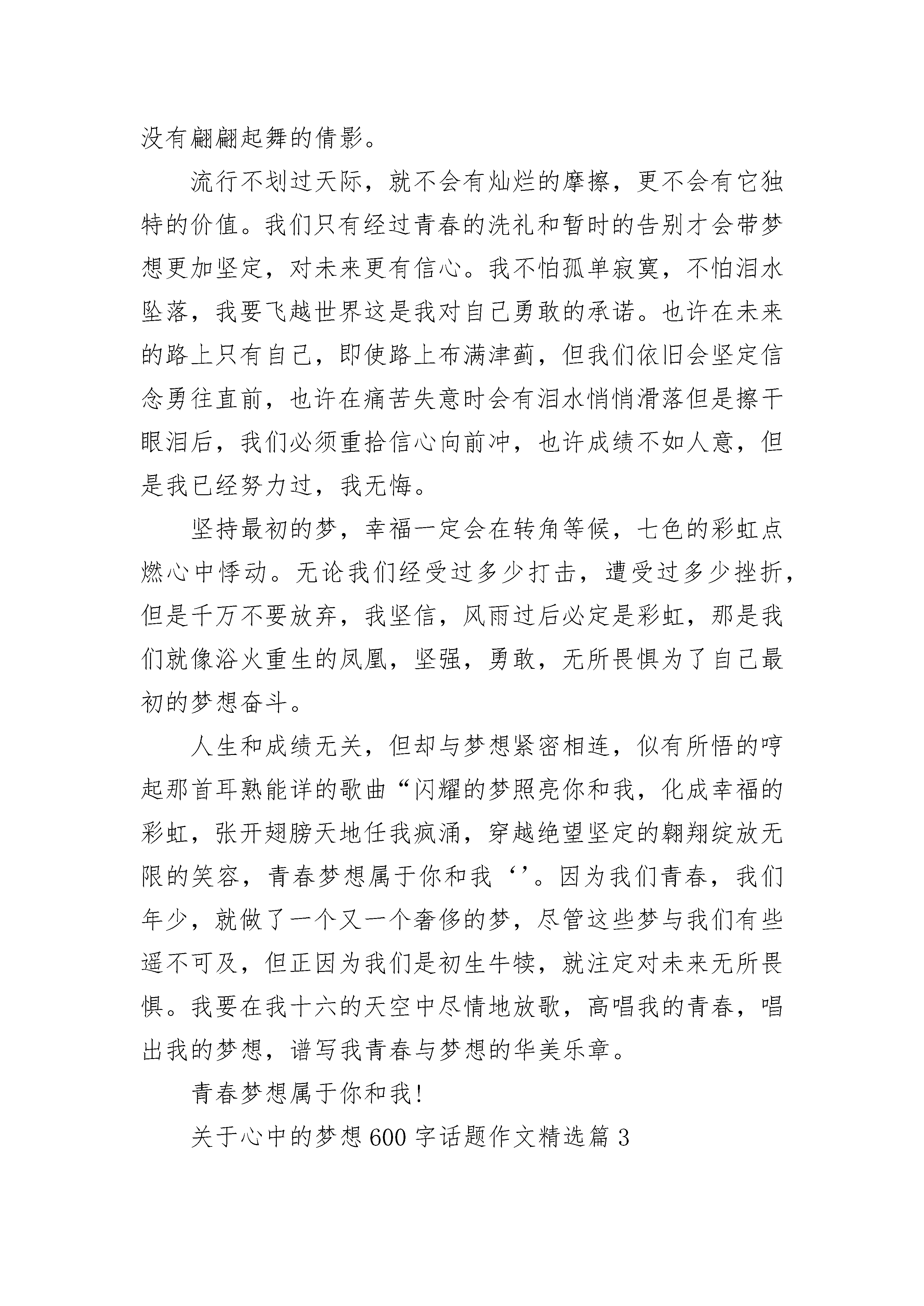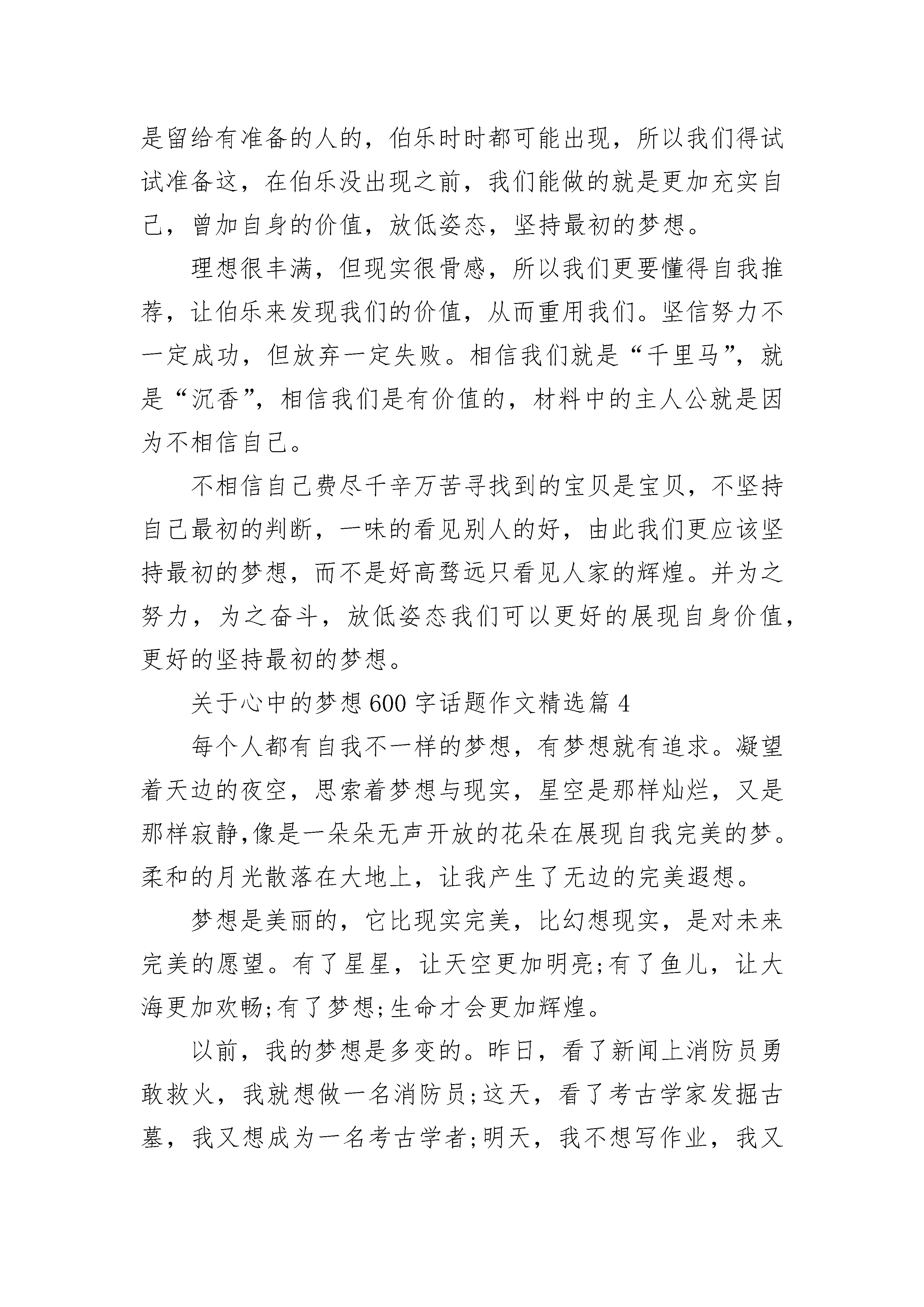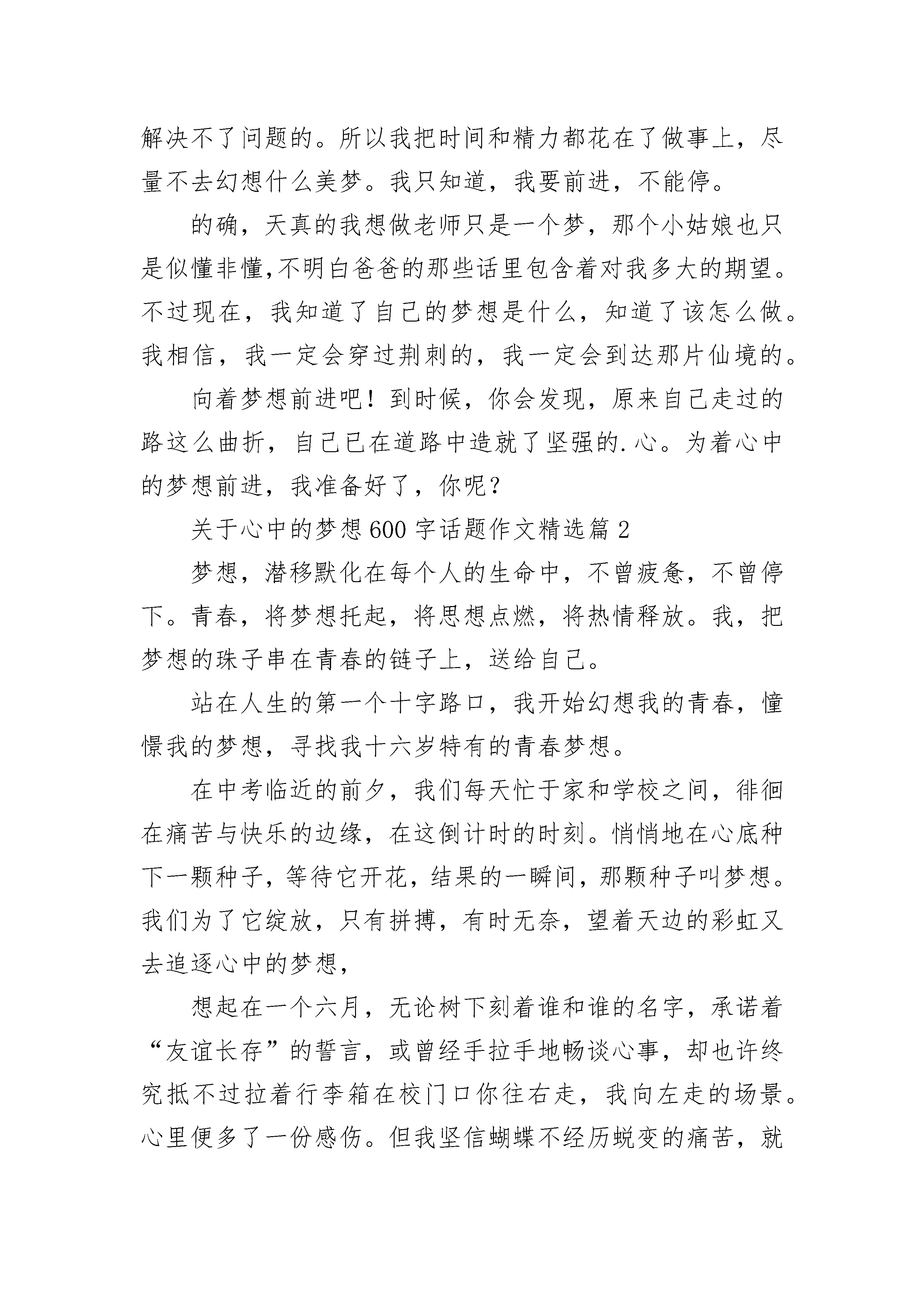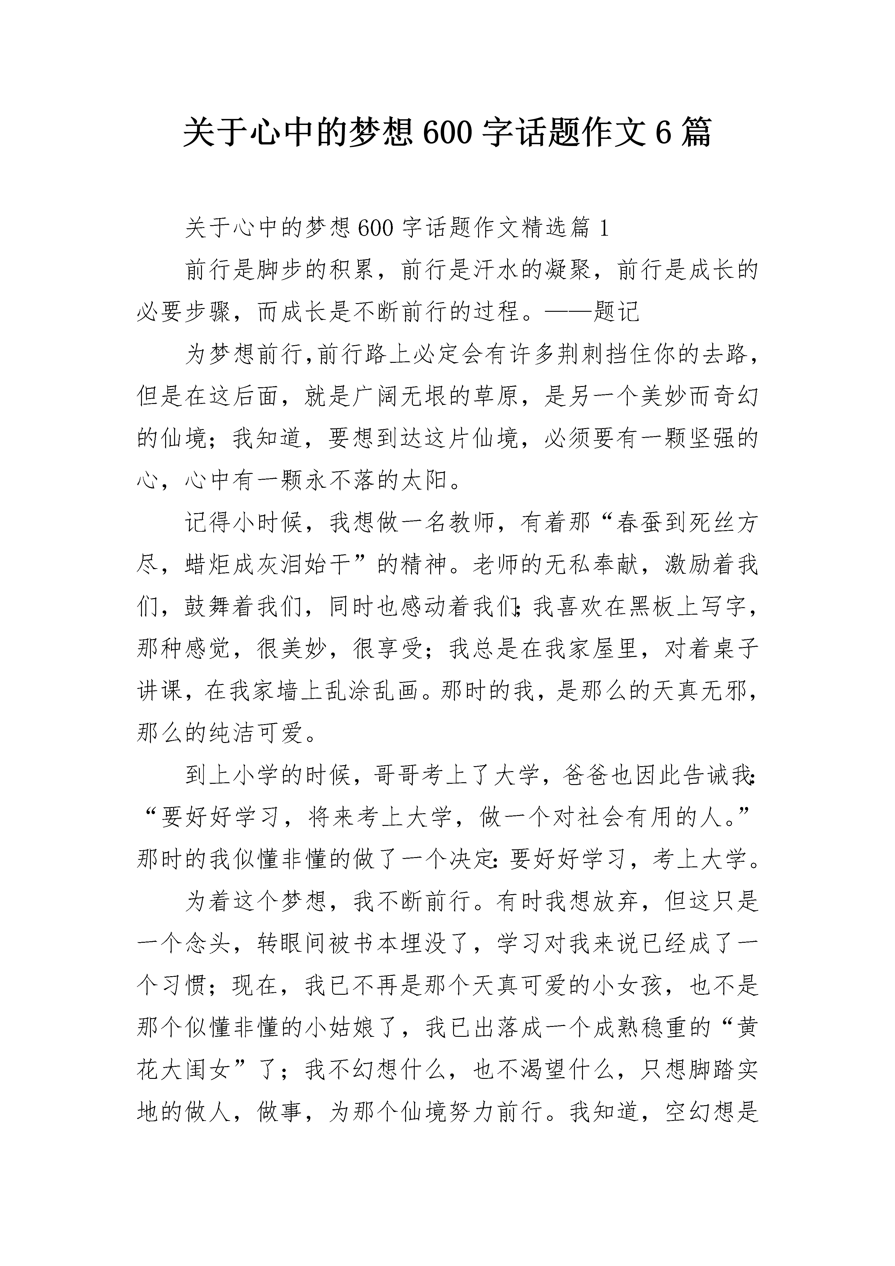 关于心中的梦想600字话题作文6篇关于心中的梦想600字话题作文精选篇1前行是脚步的积累,前行是汗水的凝聚,前行是成长的必要步骤,而成长是不断前行的过程。——题记为梦想前行,前行路上必定会有许多荆刺挡住你的去路,但是在这后面,就是广阔无垠的草原,是另一个美妙而奇幻的仙境;我知道,要想到达这片仙境,必须要有一颗坚强的心,心中有一颗永不落的太阳。记得小时候,我想做一名教师,有着那“春蚕到死丝方尽,蜡炬成灰泪始干”的精神。老师的无私奉献,激励着我们,鼓舞着我们,同时也感动着我们;我喜欢在黑板上写字,那种感觉,很美妙,很享受;我总是在我家屋里,对着桌子讲课,在我家墙上乱涂乱画。那时的我,是那么的天真无邪,那么的纯洁可爱。到上小学的时候,哥哥考上了大学,爸爸也因此告诫我:“要好好学习,将来考上大学,做一个对社会有用的人。”那时的我似懂非懂的做了一个决定:要好好学习,考上大学。为着这个梦想,我不断前行。有时我想放弃,但这只是一个念头,转眼间被书本埋没了,学习对我来说已经成了一个习惯;现在,我已不再是那个天真可爱的小女孩,也不是那个似懂非懂的小姑娘了,我已出落成一个成熟稳重的“黄花大闺女”了;我不幻想什么,也不渴望什么,只想脚踏实地的做人,做事,为那个仙境努力前行。我知道,空幻想是解决不了问题的。所以我把时间和精力都花在了做事上,尽量不去幻想什么美梦。我只知道,我要前进,不能停。的确,天真的我想做老师只是一个梦,那个小姑娘也只是似懂非懂,不明白爸爸的那些话里包含着对我多大的期望。不过现在,我知道了自己的梦想是什么,知道了该怎么做。我相信,我一定会穿过荆刺的,我一定会到达那片仙境的。向着梦想前进吧!到时候,你会发现,原来自己走过的路这么曲折,自己已在道路中造就了坚强的.心。为着心中的梦想前进,我准备好了,你呢?关于心中的梦想600字话题作文精选篇2梦想,潜移默化在每个人的生命中,不曾疲惫,不曾停下。青春,将梦想托起,将思想点燃,将热情释放。我,把梦想的珠子串在青春的链子上,送给自己。站在人生的第一个十字路口,我开始幻想我的青春,憧憬我的梦想,寻找我十六岁特有的青春梦想。在中考临近的前夕,我们每天忙于家和学校之间,徘徊在痛苦与快乐的边缘,在这倒计时的时刻。悄悄地在心底种下一颗种子,等待它开花,结果的一瞬间,那颗种子叫梦想。我们为了它绽放,只有拼搏,有时无奈,望着天边的彩虹又去追逐心中的梦想,想起在一个六月,无论树下刻着谁和谁的名字,承诺着“友谊长存”的誓言,或曾经手拉手地畅谈心事,却也许终究抵不过拉着行李箱在校门口你往右走,我向左走的场景。心里便多了一份感伤。但我坚信蝴蝶不经历蜕变的痛苦,就没有翩翩起舞的倩影。流行不划过天际,就不会有灿烂的摩擦,更不会有它独特的价值。我们只有经过青春的洗礼和暂时的告别才会带梦想更加坚定,对未来更有信心。我不怕孤单寂寞,不怕泪水坠落,我要飞越世界这是我对自己勇敢的承诺。也许在未来的路上只有自己,即使路上布满津蓟,但我们依旧会坚定信念勇往直前,也许在痛苦失意时会有泪水悄悄滑落但是擦干眼泪后,我们必须重拾信心向前冲,也许成绩不如人意,但是我已经努力过,我无悔。坚持最初的梦,幸福一定会在转角等候,七色的彩虹点燃心中悸动。无论我们经受过多少打击,遭受过多少挫折,但是千万不要放弃,我坚信,风雨过后必定是彩虹,那是我们就像浴火重生的凤凰,坚强,勇敢,无所畏惧为了自己最初的梦想奋斗。人生和成绩无关,但却与梦想紧密相连,似有所悟的哼起那首耳熟能详的歌曲“闪耀的梦照亮你和我,化成幸福的彩虹,张开翅膀天地任我疯涌,穿越绝望坚定的翱翔绽放无限的笑容,青春梦想属于你和我‘’。因为我们青春,我们年少,就做了一个又一个奢侈的梦,尽管这些梦与我们有些遥不可及,但正因为我们是初生牛犊,就注定对未来无所畏惧。我要在我十六的天空中尽情地放歌,高唱我的青春,唱出我的梦想,谱写我青春与梦想的华美乐章。青春梦想属于你和我!关于心中的梦想600字话题作文精选篇3我们可以放低姿态,但不能放低价值。古语有云,千里马常有而伯乐不常有,不能在原地等候伯乐的驾临,我们得去寻找伯乐。不要羡慕别人所拥有的,你只看到了他们现在的辉煌,却没有看到他们过去的沧桑。坚持最初的梦想,只要努力了,就算失败,我们也无愧于天,无愧于地,更无愧于自己。古有毛遂自荐,今就应该有千里马自寻。我们要懂得推销自己,有价值的东西就不能被埋没,有价值的东西被埋没就是浪费。材料中的沉香,因主人的不自信与不懂得推销被埋没了,那沉香就如同我们自己的价值,而我们自己也就是材料中的主人公,我们最初相信我们自己是“宝物”,那么就坚持自己的想法,我们就是“宝物”,我们可以放低姿态但不能放低自身的价值,相信自己最初的判断,而不是盲目的只看别人的辉煌,坚持自己的梦想,我们就能够实现。高中课本《我有一个梦想》一文中