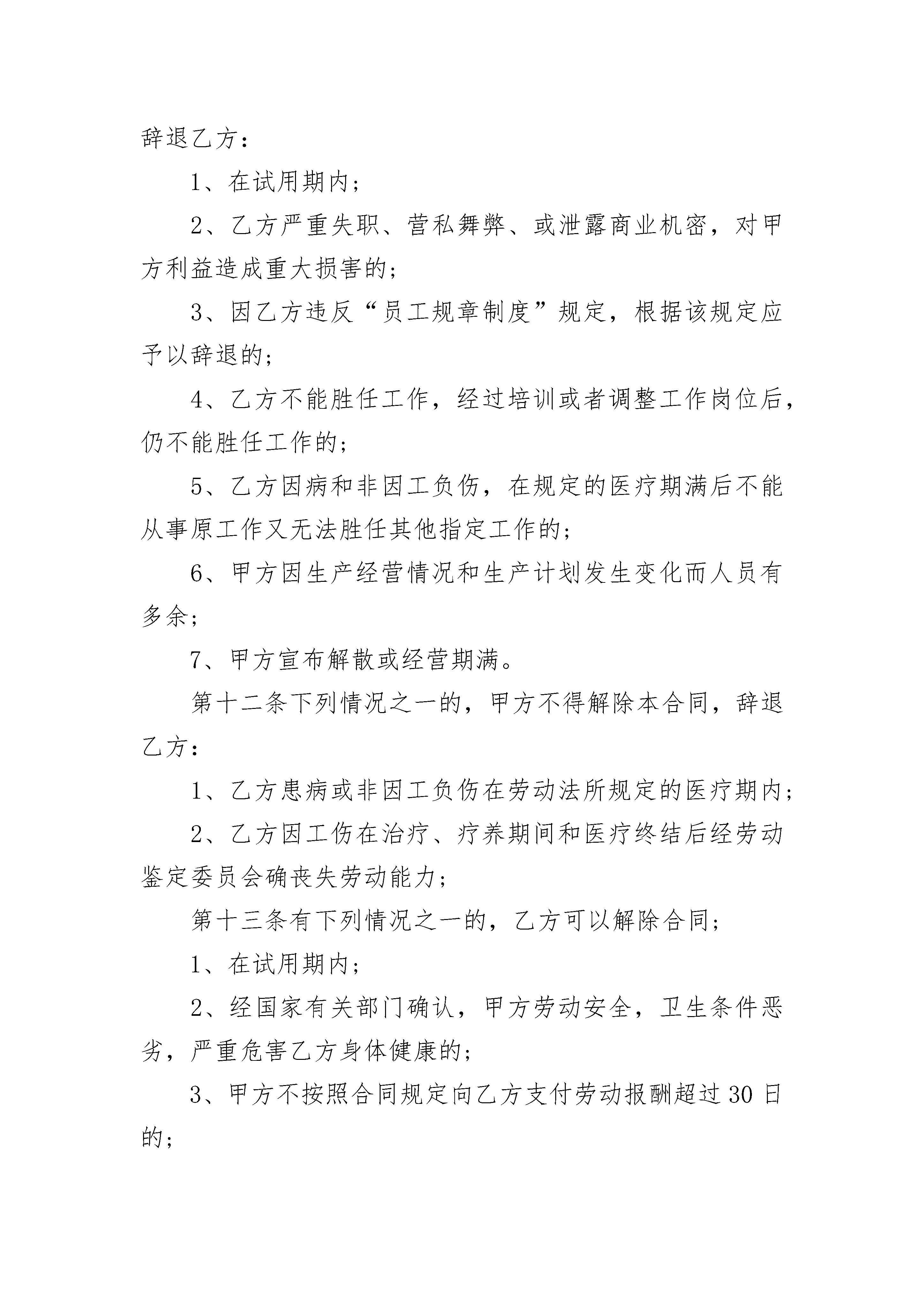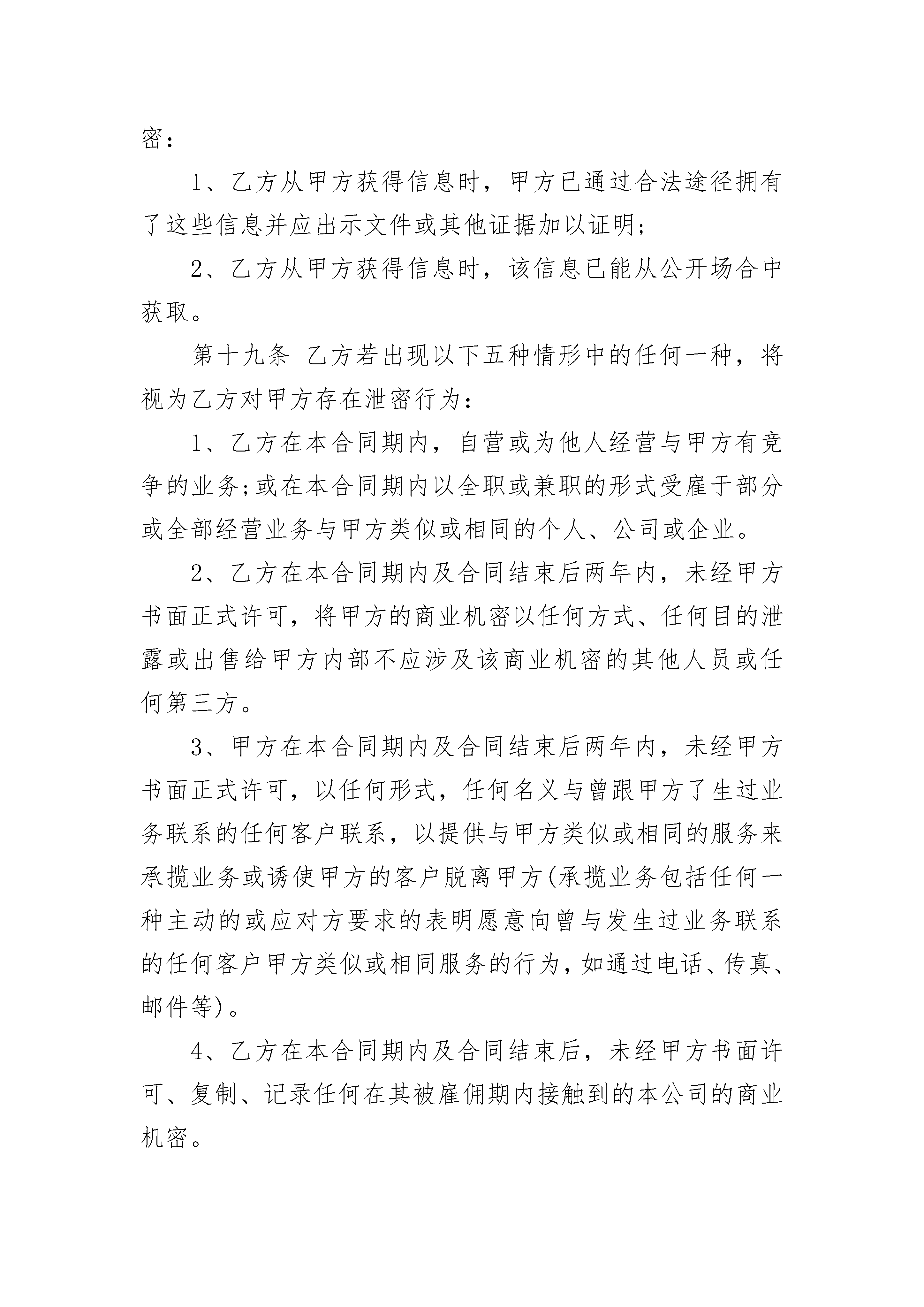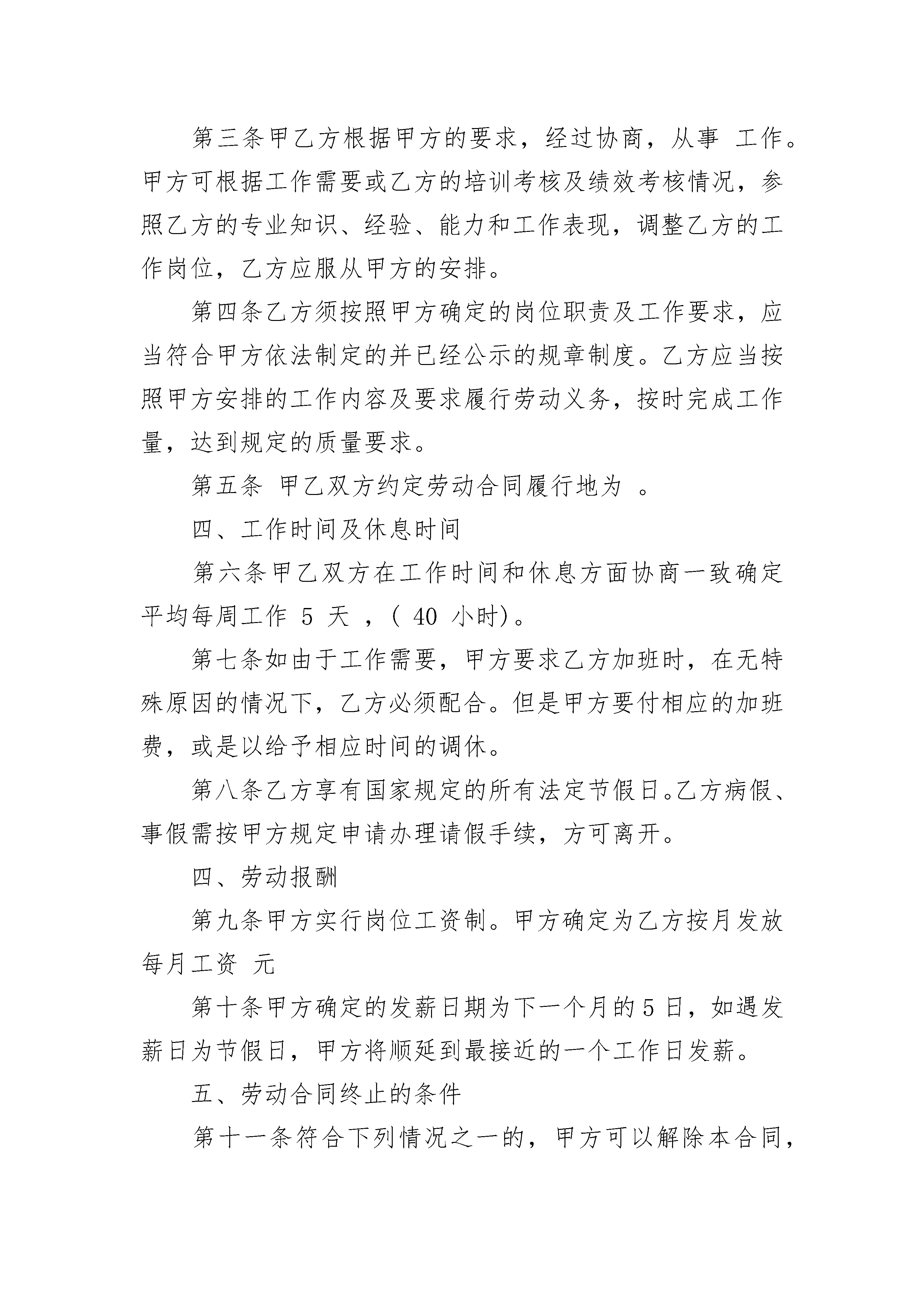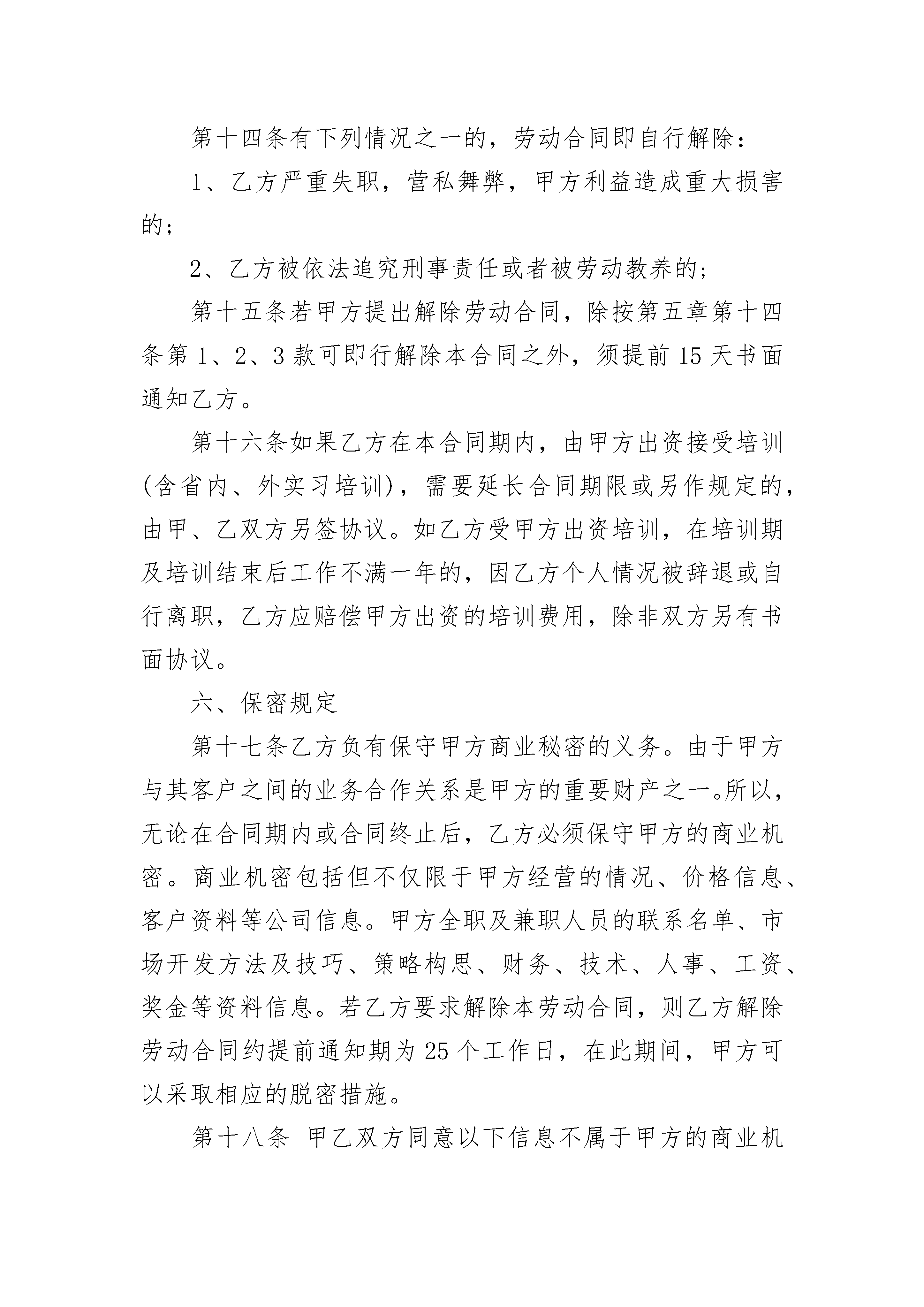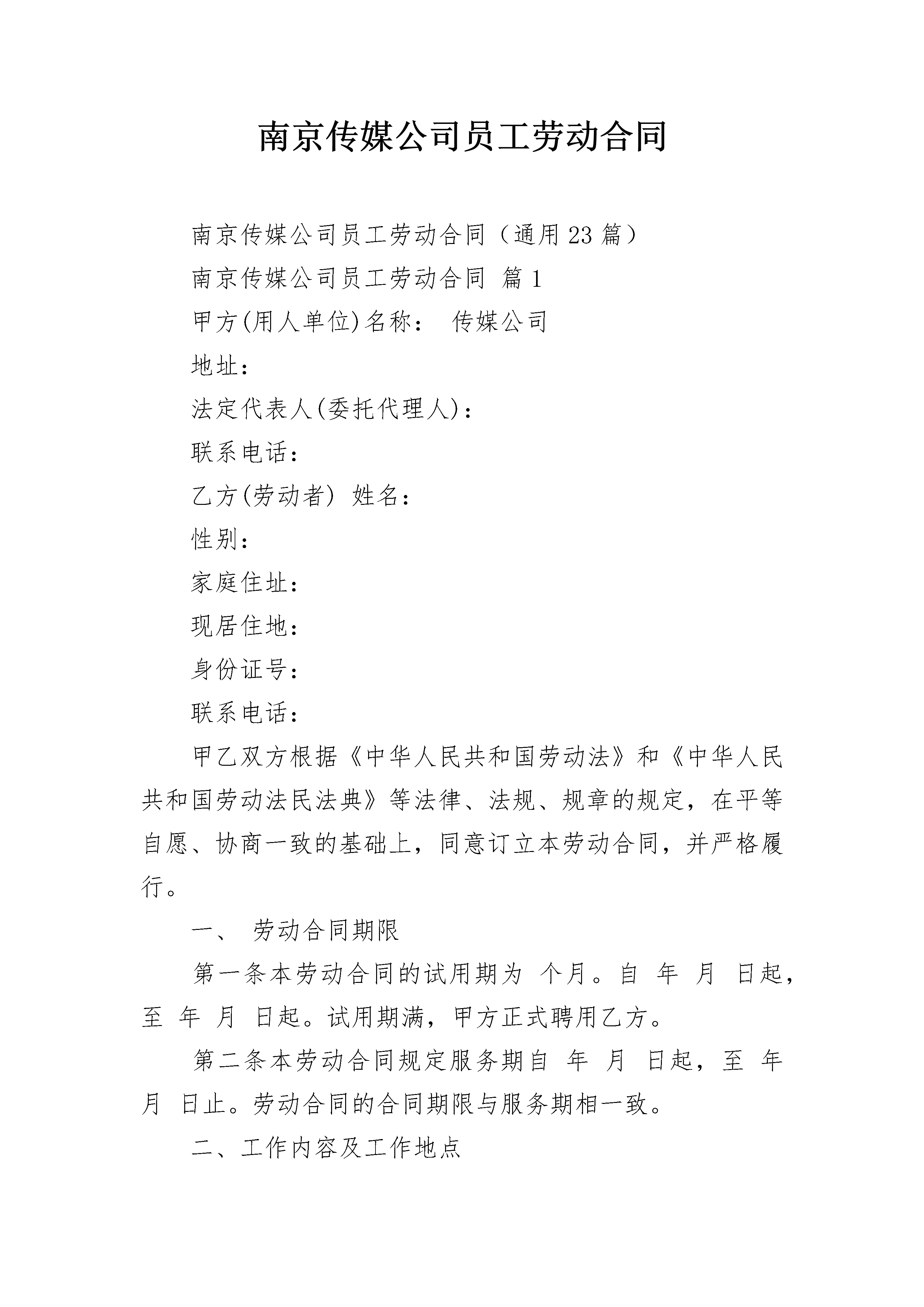 南京传媒公司员工劳动合同南京传媒公司员工劳动合同(通用23篇)南京传媒公司员工劳动合同篇1甲方(用人单位)名称:传媒公司地址:法定代表人(委托代理人):联系电话:乙方(劳动者)姓名:性别:家庭住址:现居住地:身份证号:联系电话:甲乙双方根据《中华人民共和国劳动法》和《中华人民共和国劳动法民法典》等法律、法规、规章的规定,在平等自愿、协商一致的基础上,同意订立本劳动合同,并严格履行。一、劳动合同期限第一条本劳动合同的试用期为个月。自年月日起,至年月日起。试用期满,甲方正式聘用乙方。第二条本劳动合同规定服务期自年月日起,至年月日止。劳动合同的合同期限与服务期相一致。二、工作内容及工作地点第三条甲乙方根据甲方的要求,经过协商,从事工作。甲方可根据工作需要或乙方的培训考核及绩效考核情况,参照乙方的专业知识、经验、能力和工作表现,调整乙方的工作岗位,乙方应服从甲方的安排。第四条乙方须按照甲方确定的岗位职责及工作要求,应当符合甲方依法制定的并已经公示的规章制度。乙方应当按照甲方安排的工作内容及要求履行劳动义务,按时完成工作量,达到规定的质量要求。第五条甲乙双方约定劳动合同履行地为。四、工作时间及休息时间第六条甲乙双方在工作时间和休息方面协商一致确定平均每周工作5天,(40小时)。第七条如由于工作需要,甲方要求乙方加班时,在无特殊原因的情况下,乙方必须配合。但是甲方要付相应的加班费,或是以给予相应时间的调休。第八条乙方享有国家规定的所有法定节假日。乙方病假、事假需按甲方规定申请办理请假手续,方可离开。四、劳动报酬第九条甲方实行岗位工资制。甲方确定为乙方按月发放每月工资元第十条甲方确定的发薪日期为下一个月的5日,如遇发薪日为节假日,甲方将顺延到最接近的一个工作日发薪。五、劳动合同终止的条件第十一条符合下列情况之一的,甲方可以解除本合同,辞退乙方:1、在试用期内;2、乙方严重失职、营私舞弊、或泄露商业机密,对甲方利益造成重大损害的;3、因乙方违反“员工规章制度”规定,根据该规定应予以辞退的;4、乙方不能胜任工作,经过培训或者调整工作岗位后,仍不能胜任工作的;5、乙方因病和非因工负伤,在规定的医疗期满后不能从事原工作又无法胜任其他指定工作的;6、甲方因生产经营情况和生产计划发生变化而人员有多余;7、甲方宣布解散或经营期满。第十二条下列情况之一的,甲方不得解除本合同,辞退乙方:1、乙方患病或非因工负伤在劳动法所规定的医疗期内;2、乙方因工伤在治疗、疗养期间和医疗终结后经劳动鉴定委员会确丧失劳动能力;第十三条有下列情况之一的,乙方可以解除合同;1、在试用期内;2、经国家有关部门确认,甲方劳动安全,卫生条件恶劣,严重危害乙方身体健康的;3、甲方不按照合同规定向乙方支付劳动报酬超过30日的;第十四条有下列情况之一的,劳动合同即自行解除:1、乙方严重失职,营私舞弊,甲方利益造成重大损害的;2、乙方被依法追究刑事责任或者被劳动教养的;第十五条若甲方提出解除劳动合同,除按第五章第十四条第1、2、3款可即行解除本合同之外,须提前15天书面通知乙方。第十六条如果乙方在本合同期内,由甲方出资接受培训(含省内、外实习培训),需要延长合同期限或另作规定的,由甲、乙双方另签协议。如乙方受甲方出资培训,在培训期及培训结束后工作不满一年的,因乙方个人情况被辞退或自行离职,乙方应赔偿甲方出资的培训费用,除非双方另有书面协议。六、保密规定第十七条乙方负有保守甲方商业秘密的义务。由于甲方与其客户之间的业务合作关系是甲方的重要财产之一。所以,无论在合同期内或合同终止后,乙方必须保守甲方的商业机密。商业机密包括但不仅限于甲方经营的情况、价格信息、客户资料等公司信息。甲方全职及兼职人员的联系名单、市场开发方法及技巧、策略构思、财务、技术、人事、工资、奖金等资料信息。若乙方要求解除本劳动合同,则乙方解除劳动合同约提前通知期为25个工作日,在此期间,甲方可以采取相应的脱密措施。第十八条甲乙双方同意以下信息不属于甲方的商业机密:1、乙方从甲方获得信息时,甲方已通过合法途径拥有了这些信息并应出示文件或其他证据加以证明;2、乙方从甲方获得信息时,该信息已能从公开场合中获取。第十九条乙方若出现以下五种情形中的任何一种,将视为乙方对甲方存在泄密行为:1、乙方在本合同期内,自营或为他人经营与甲方有竞争的业务;或在本合同期内以全职或兼职的形式受雇于部分或全部经营业务与甲方类似或相同的个人、公司或企业。2、乙方在本合同期内及合同结束后两年内,未经甲方书面正式许可,将甲方的商业机密以任何方式、任何目的泄露或出售给甲方内部不应涉及该商业机密的其他人员或任何第三方。3、甲方在本合同期内及合同结束后两年内,未经甲方书面正式许可,以任何形式,任何名义与曾跟甲方了生过业务联系的任何客户联系,以提供与甲方类似或相同的