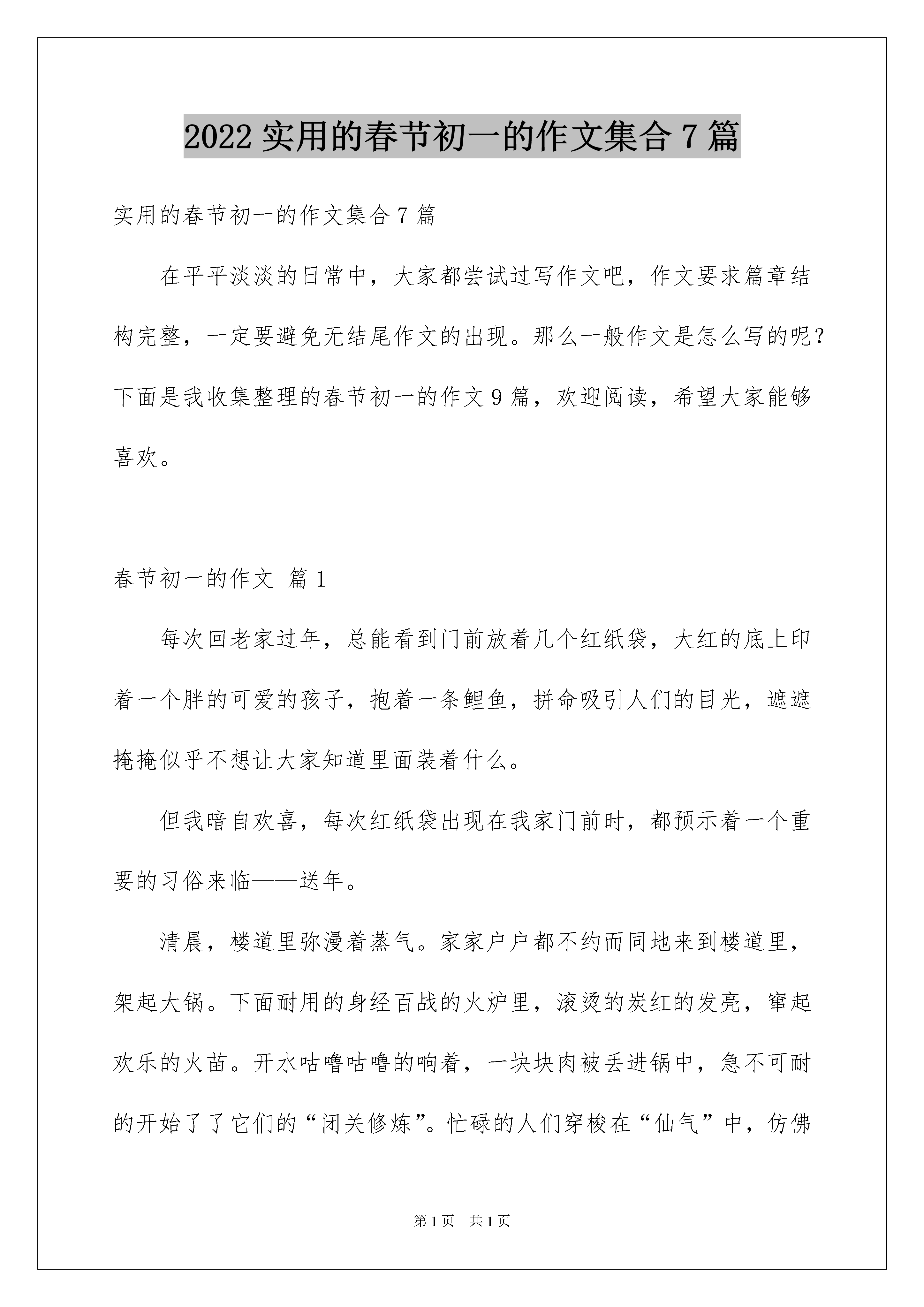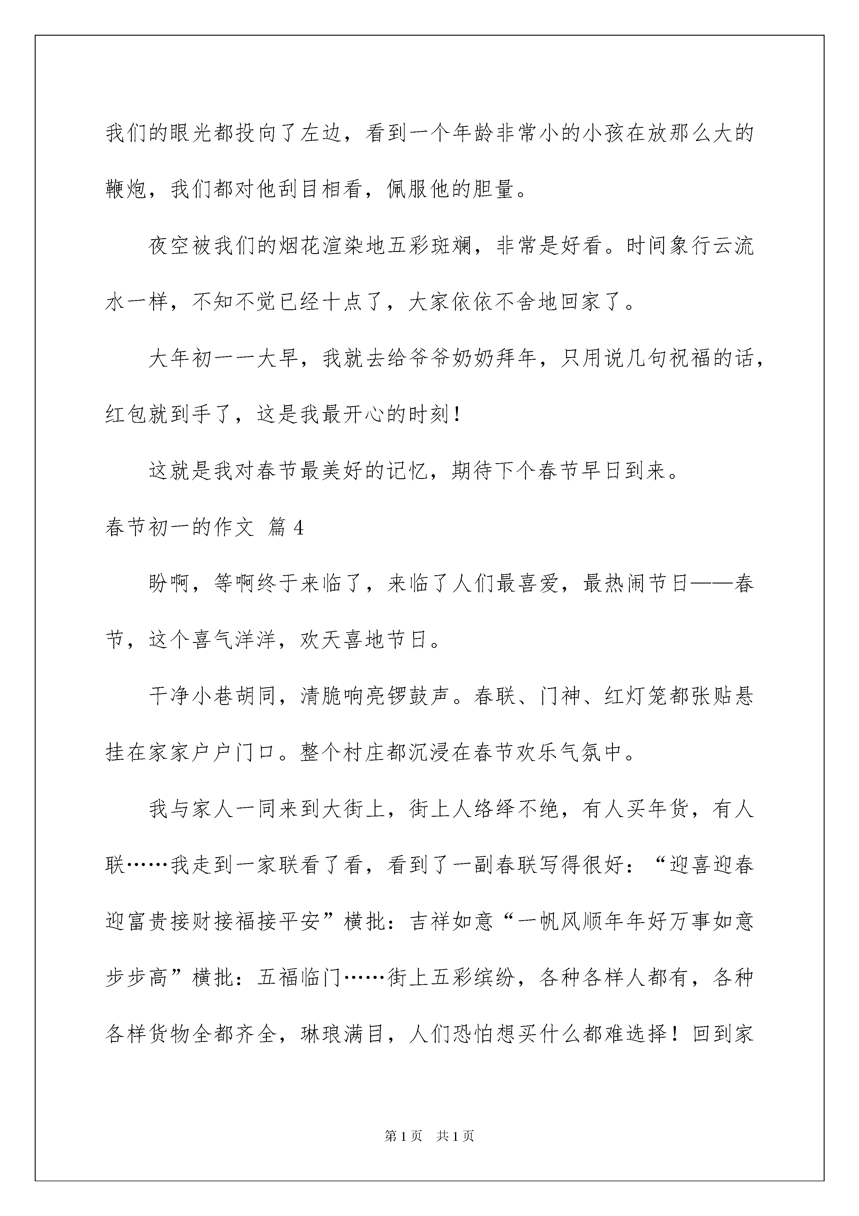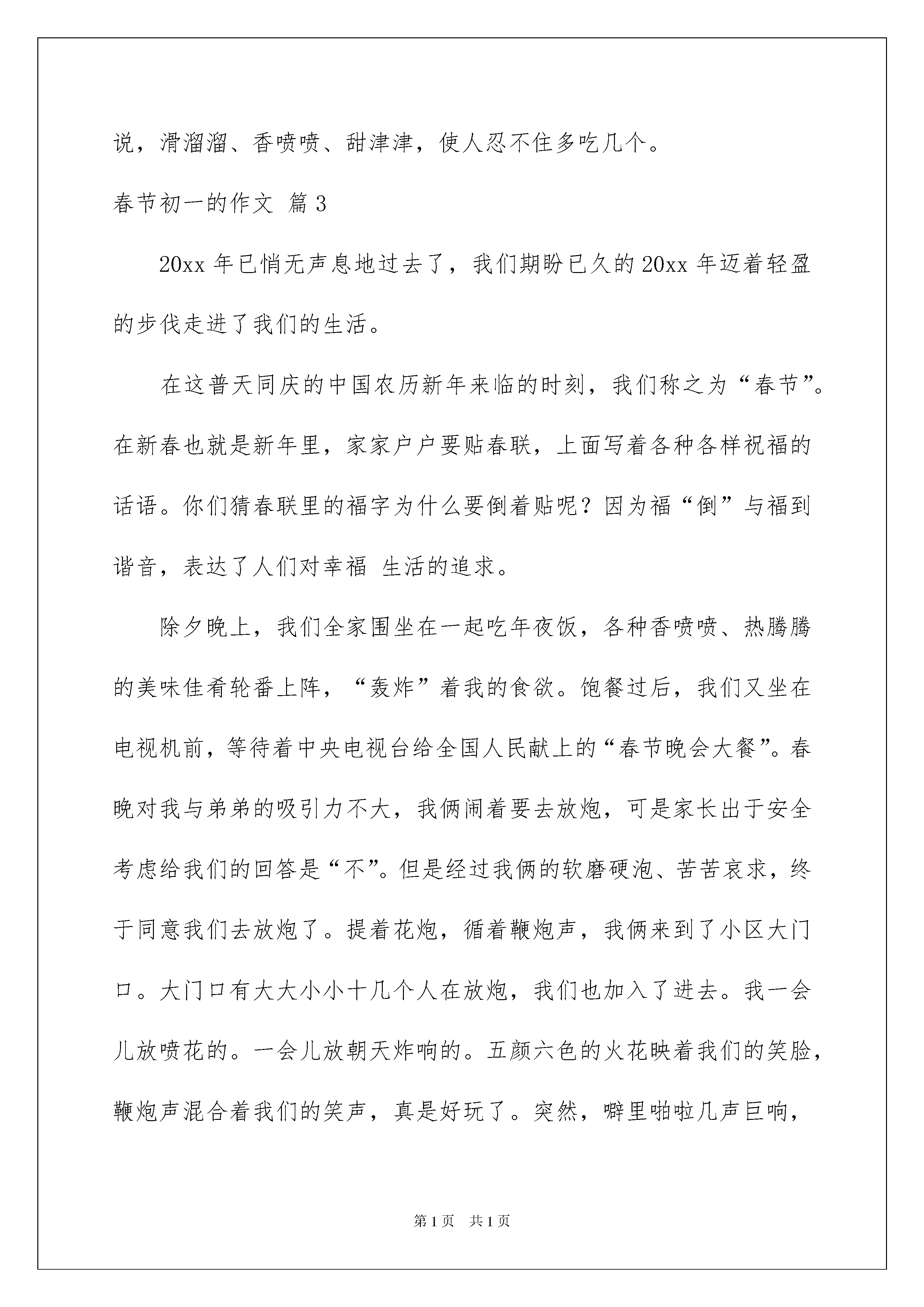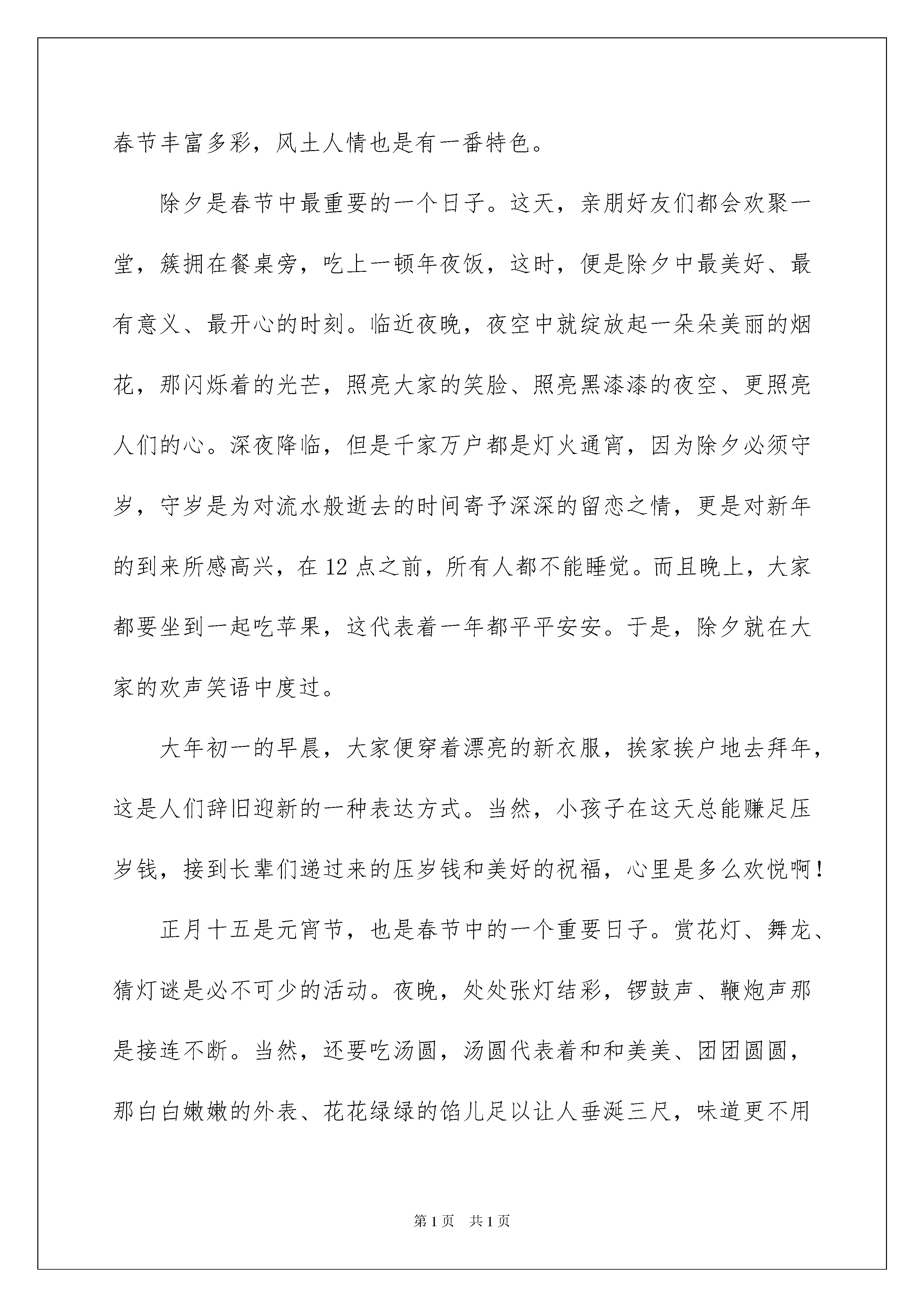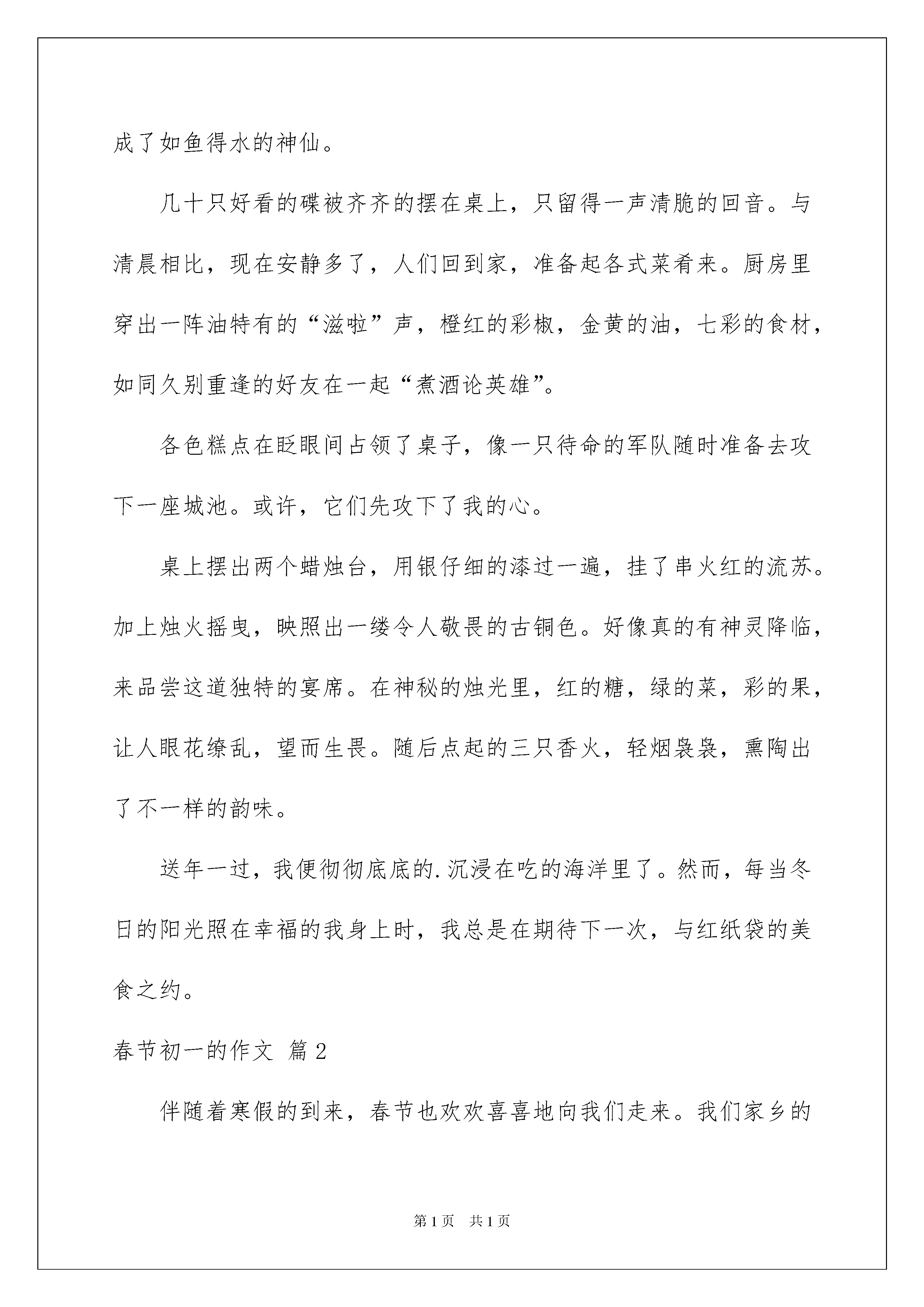 2022实用的春节初一的作文集合7篇实用的春节初一的作文集合7篇在平平淡淡的日常中,大家都尝试过写作文吧,作文要求篇章结构完整,一定要避免无结尾作文的出现。那么一般作文是怎么写的呢?下面是我收集整理的春节初一的作文9篇,欢迎阅读,希望大家能够喜欢。春节初一的作文篇1每次回老家过年,总能看到门前放着几个红纸袋,大红的底上印着一个胖的可爱的孩子,抱着一条鲤鱼,拼命吸引人们的目光,遮遮掩掩似乎不想让大家知道里面装着什么。但我暗自欢喜,每次红纸袋出现在我家门前时,都预示着一个重要的习俗来临——送年。清晨,楼道里弥漫着蒸气。家家户户都不约而同地来到楼道里,架起大锅。下面耐用的身经百战的火炉里,滚烫的炭红的发亮,窜起欢乐的火苗。开水咕噜咕噜的响着,一块块肉被丢进锅中,急不可耐的开始了了它们的“闭关修炼”。忙碌的人们穿梭在“仙气”中,仿佛成了如鱼得水的神仙。几十只好看的碟被齐齐的摆在桌上,只留得一声清脆的回音。与清晨相比,现在安静多了,人们回到家,准备起各式菜肴来。厨房里穿出一阵油特有的“滋啦”声,橙红的彩椒,金黄的油,七彩的食材,如同久别重逢的好友在一起“煮酒论英雄”。各色糕点在眨眼间占领了桌子,像一只待命的军队随时准备去攻下一座城池。或许,它们先攻下了我的心。桌上摆出两个蜡烛台,用银仔细的漆过一遍,挂了串火红的流苏。加上烛火摇曳,映照出一缕令人敬畏的古铜色。好像真的有神灵降临,来品尝这道独特的宴席。在神秘的烛光里,红的糖,绿的菜,彩的果,让人眼花缭乱,望而生畏。随后点起的三只香火,轻烟袅袅,熏陶出了不一样的韵味。送年一过,我便彻彻底底的.沉浸在吃的海洋里了。然而,每当冬日的阳光照在幸福的我身上时,我总是在期待下一次,与红纸袋的美食之约。春节初一的作文篇2伴随着寒假的到来,春节也欢欢喜喜地向我们走来。我们家乡的春节丰富多彩,风土人情也是有一番特色。除夕是春节中最重要的一个日子。这天,亲朋好友们都会欢聚一堂,簇拥在餐桌旁,吃上一顿年夜饭,这时,便是除夕中最美好、最有意义、最开心的时刻。临近夜晚,夜空中就绽放起一朵朵美丽的烟花,那闪烁着的光芒,照亮大家的笑脸、照亮黑漆漆的夜空、更照亮人们的心。深夜降临,但是千家万户都是灯火通宵,因为除夕必须守岁,守岁是为对流水般逝去的时间寄予深深的留恋之情,更是对新年的到来所感高兴,在12点之前,所有人都不能睡觉。而且晚上,大家都要坐到一起吃苹果,这代表着一年都平平安安。于是,除夕就在大家的欢声笑语中度过。大年初一的早晨,大家便穿着漂亮的新衣服,挨家挨户地去拜年,这是人们辞旧迎新的一种表达方式。当然,小孩子在这天总能赚足压岁钱,接到长辈们递过来的压岁钱和美好的祝福,心里是多么欢悦啊!正月十五是元宵节,也是春节中的一个重要日子。赏花灯、舞龙、猜灯谜是必不可少的活动。夜晚,处处张灯结彩,锣鼓声、鞭炮声那是接连不断。当然,还要吃汤圆,汤圆代表着和和美美、团团圆圆,那白白嫩嫩的外表、花花绿绿的馅儿足以让人垂涎三尺,味道更不用说,滑溜溜、香喷喷、甜津津,使人忍不住多吃几个。春节初一的作文篇320xx年已悄无声息地过去了,我们期盼已久的20xx年迈着轻盈的步伐走进了我们的生活。在这普天同庆的中国农历新年来临的时刻,我们称之为“春节”。在新春也就是新年里,家家户户要贴春联,上面写着各种各样祝福的话语。你们猜春联里的福字为什么要倒着贴呢?因为福“倒”与福到谐音,表达了人们对幸福生活的追求。除夕晚上,我们全家围坐在一起吃年夜饭,各种香喷喷、热腾腾的美味佳肴轮番上阵,“轰炸”着我的食欲。饱餐过后,我们又坐在电视机前,等待着中央电视台给全国人民献上的“春节晚会大餐”。春晚对我与弟弟的吸引力不大,我俩闹着要去放炮,可是家长出于安全考虑给我们的回答是“不”。但是经过我俩的软磨硬泡、苦苦哀求,终于同意我们去放炮了。提着花炮,循着鞭炮声,我俩来到了小区大门口。大门口有大大小小十几个人在放炮,我们也加入了进去。我一会儿放喷花的。一会儿放朝天炸响的。五颜六色的火花映着我们的笑脸,鞭炮声混合着我们的笑声,真是好玩了。突然,噼里啪啦几声巨响,我们的眼光都投向了左边,看到一个年龄非常小的小孩在放那么大的鞭炮,我们都对他刮目相看,佩服他的胆量。夜空被我们的烟花渲染地五彩斑斓,非常是好看。时间象行云流水一样,不知不觉已经十点了,大家依依不舍地回家了。大年初一一大早,我就去给爷爷奶奶拜年,只用说几句祝福的话,红包就到手了,这是我最开心的时刻!这就是我对春节最美好的记忆,期待下个春节早日到来。春节初一的作文篇4盼啊,等啊终于来临了,来临了人们最喜爱,最热闹节日——春节,这个喜气洋洋,欢天喜地节日。干净