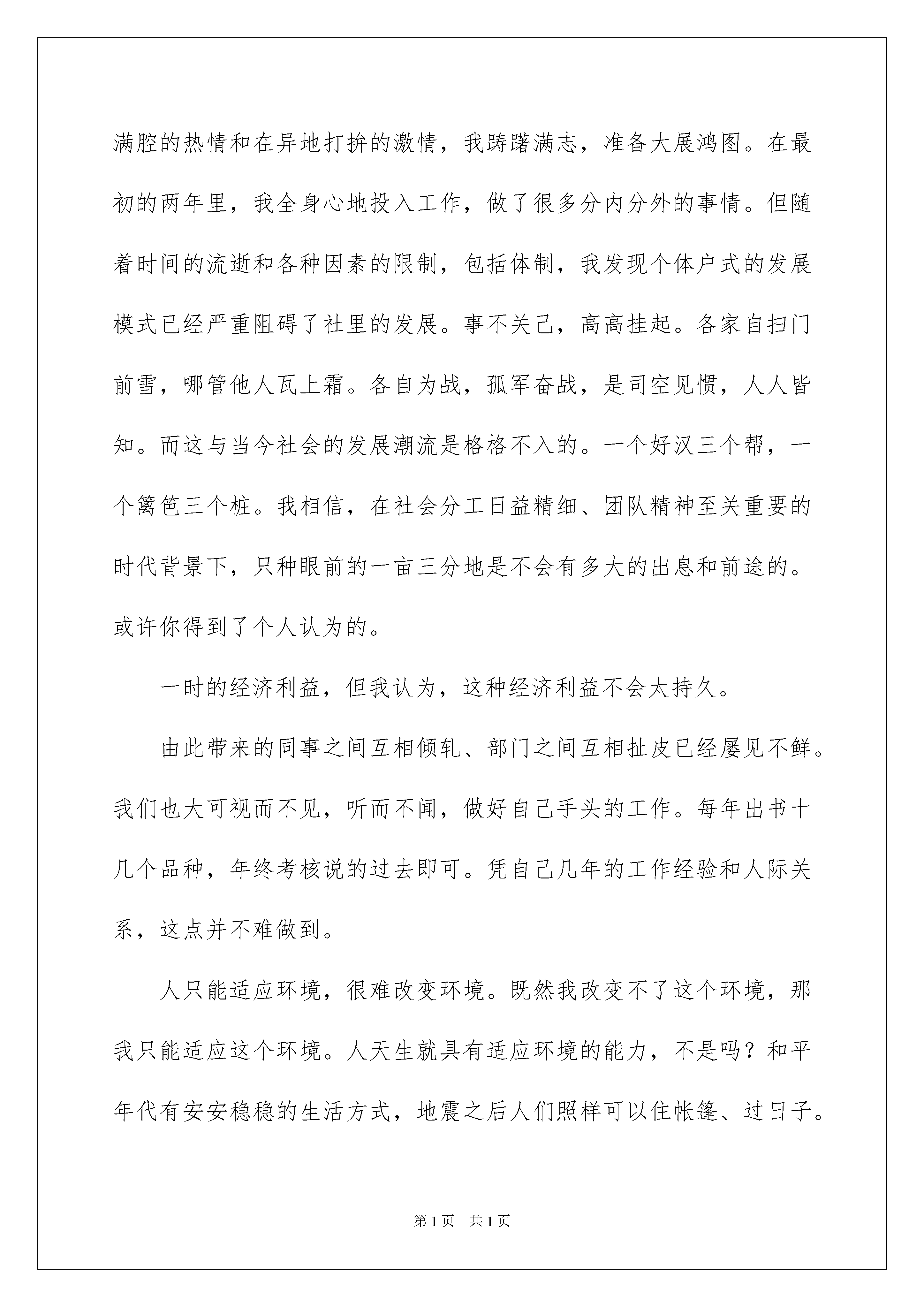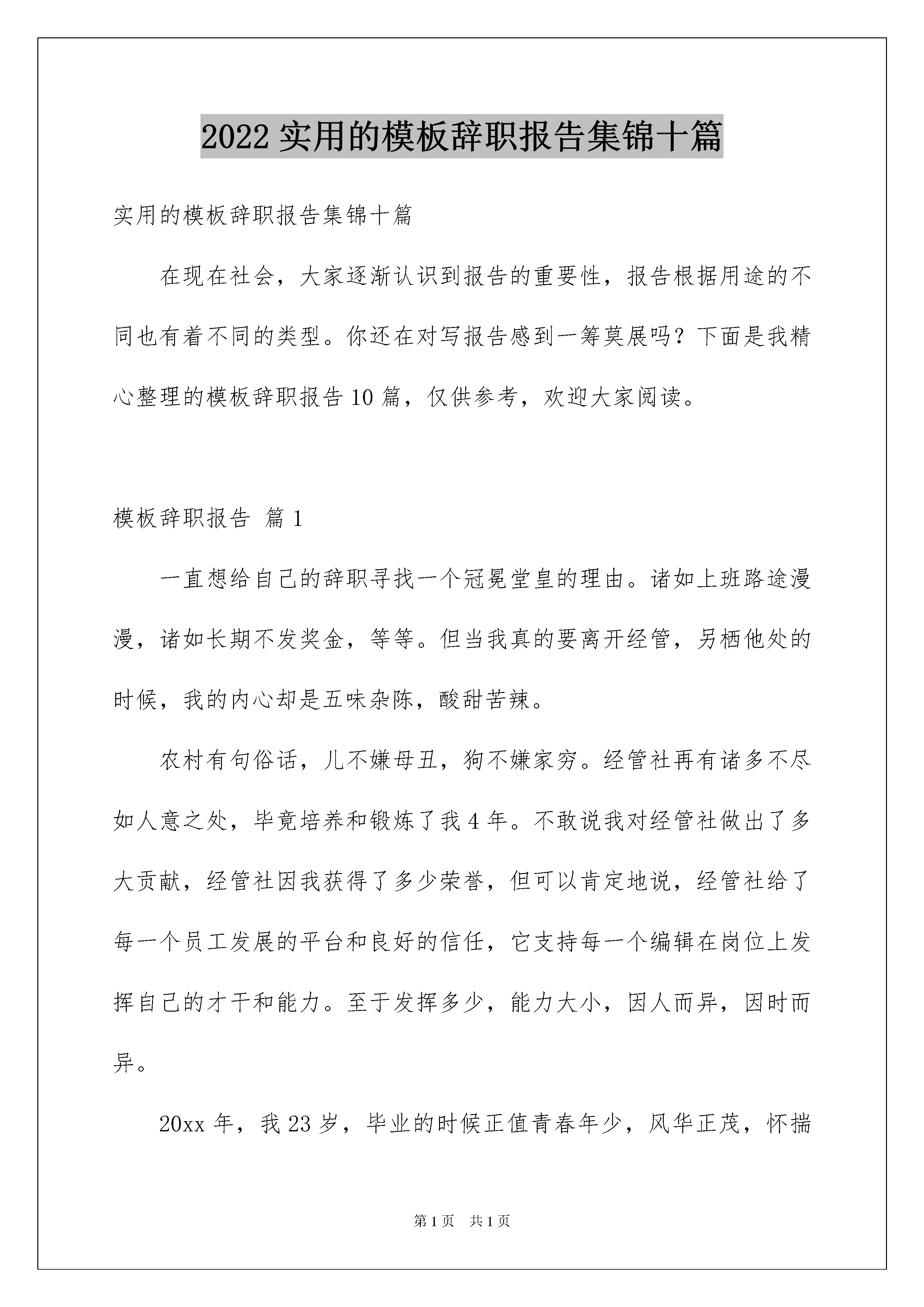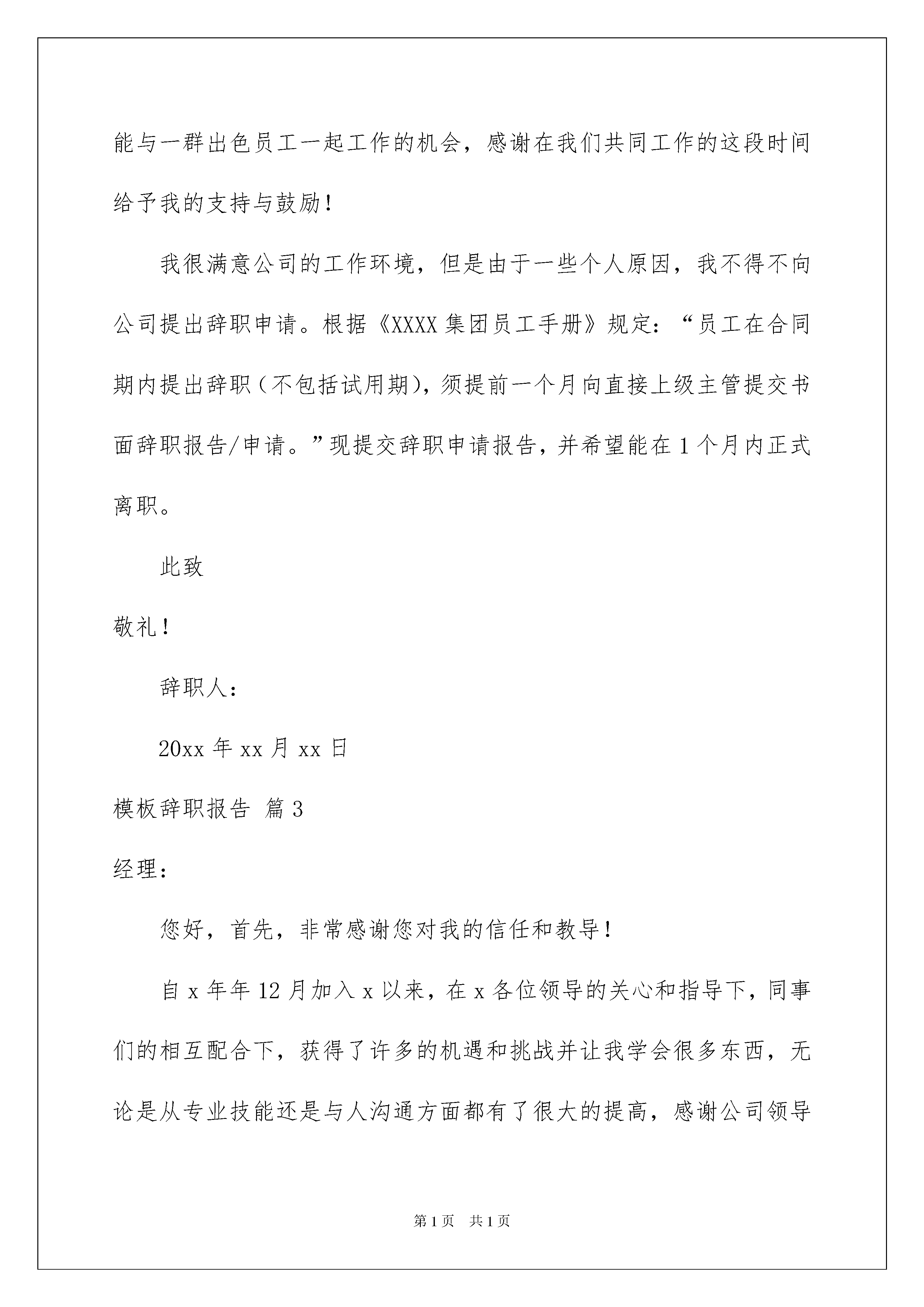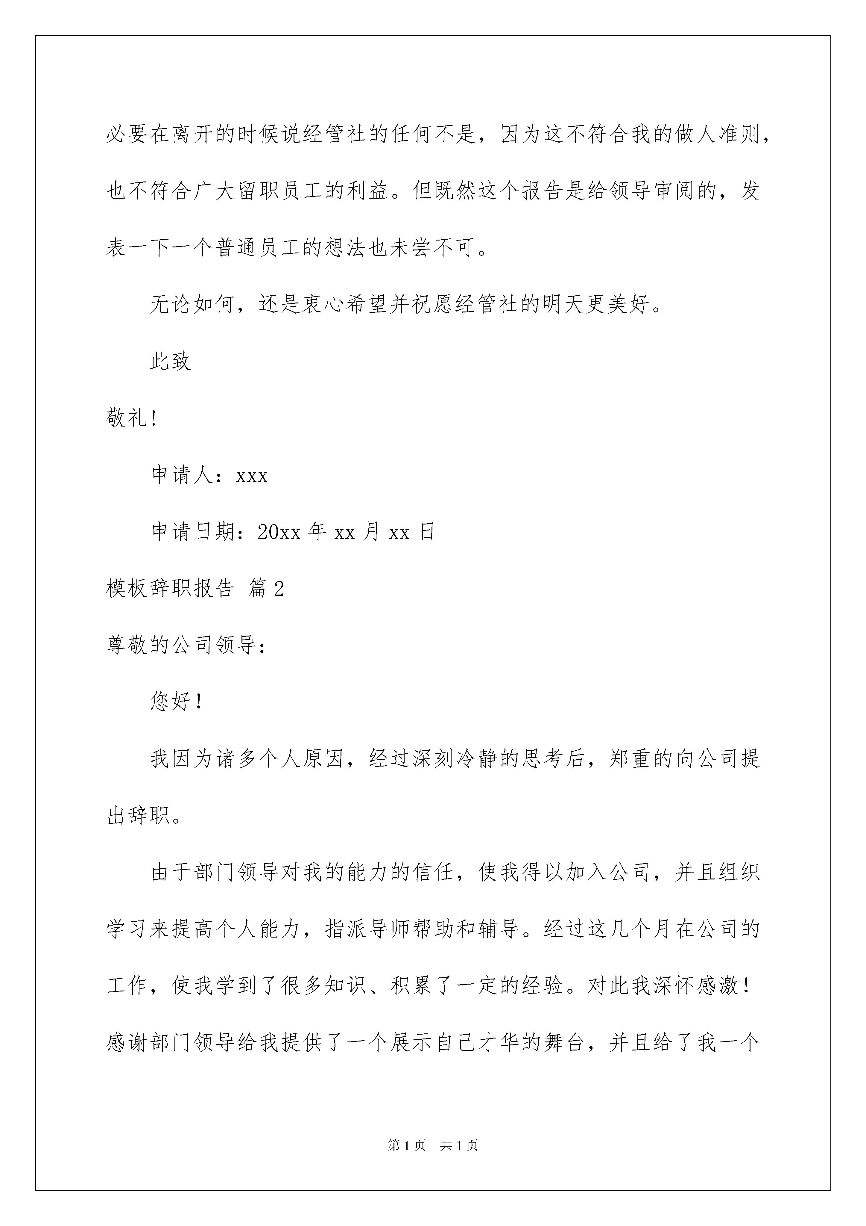 2022实用的模板辞职报告集锦十篇实用的模板辞职报告集锦十篇在现在社会,大家逐渐认识到报告的重要性,报告根据用途的不同也有着不同的类型。你还在对写报告感到一筹莫展吗?下面是我精心整理的模板辞职报告10篇,仅供参考,欢迎大家阅读。模板辞职报告篇1一直想给自己的辞职寻找一个冠冕堂皇的理由。诸如上班路途漫漫,诸如长期不发奖金,等等。但当我真的要离开经管,另栖他处的时候,我的内心却是五味杂陈,酸甜苦辣。农村有句俗话,儿不嫌母丑,狗不嫌家穷。经管社再有诸多不尽如人意之处,毕竟培养和锻炼了我4年。不敢说我对经管社做出了多大贡献,经管社因我获得了多少荣誉,但可以肯定地说,经管社给了每一个员工发展的平台和良好的信任,它支持每一个编辑在岗位上发挥自己的才干和能力。至于发挥多少,能力大小,因人而异,因时而异。20xx年,我23岁,毕业的时候正值青春年少,风华正茂,怀揣满腔的热情和在异地打拚的激情,我踌躇满志,准备大展鸿图。在最初的两年里,我全身心地投入工作,做了很多分内分外的事情。但随着时间的流逝和各种因素的限制,包括体制,我发现个体户式的发展模式已经严重阻碍了社里的发展。事不关己,高高挂起。各家自扫门前雪,哪管他人瓦上霜。各自为战,孤军奋战,是司空见惯,人人皆知。而这与当今社会的发展潮流是格格不入的。一个好汉三个帮,一个篱笆三个桩。我相信,在社会分工日益精细、团队精神至关重要的时代背景下,只种眼前的一亩三分地是不会有多大的出息和前途的。或许你得到了个人认为的。一时的经济利益,但我认为,这种经济利益不会太持久。由此带来的同事之间互相倾轧、部门之间互相扯皮已经屡见不鲜。我们也大可视而不见,听而不闻,做好自己手头的工作。每年出书十几个品种,年终考核说的过去即可。凭自己几年的工作经验和人际关系,这点并不难做到。人只能适应环境,很难改变环境。既然我改变不了这个环境,那我只能适应这个环境。人天生就具有适应环境的能力,不是吗?和平年代有安安稳稳的生活方式,地震之后人们照样可以住帐篷、过日子。然而,有一天,我发现适应这个环境、满足于现状只能让自己裹足不前的时候,我想逃离这个环境,我想选择一个广阔的、展翅翱翔的环境。良禽择木而栖,讲的就是这个意思吧。也许有人会说,你这完全是学生气、书呆子气。人家某某某不是干的很好吗,人家不是没走吗。确实,一个单位总有留下的、总有离开的。留下的有留下的道理,离开的有离开的理由。那么多同事,总有干的很好的,总有干的较差的。干的好的有其特定的背景和条件,干的差的存在自身的不足和缺点。我不去贬低别人、自抬身价,也不去妄自菲薄、甘拜下风。也许会有老同志讲,你还太年轻,不懂人情世故。体制问题全中国都有,任何体制都有问题,不要把事情想得太简单。的确如此,完美得无懈可击的制度是不存在的。世界上不存在绝对公平,哪种激励机制和分配制度都存在瑕疵。优秀的企业文化,合理的管理制度,诸如此类的东西,只能相比较而言。毛主席他老人家说过,牢骚太盛防肠断,风物长宜放眼量。我们不应整天抱怨和埋怨制度和环境不合理、不恰当,而应脚踏实地、勤勤恳恳地做好本职工作。我很认同这个观点。从人情上来说,我没有必要在离开的时候说经管社的任何不是,因为这不符合我的做人准则,也不符合广大留职员工的利益。但既然这个报告是给领导审阅的,发表一下一个普通员工的想法也未尝不可。无论如何,还是衷心希望并祝愿经管社的明天更美好。此致敬礼!申请人:xxx申请日期:20xx年xx月xx日模板辞职报告篇2尊敬的公司领导:您好!我因为诸多个人原因,经过深刻冷静的思考后,郑重的向公司提出辞职。由于部门领导对我的能力的信任,使我得以加入公司,并且组织学习来提高个人能力,指派导师帮助和辅导。经过这几个月在公司的工作,使我学到了很多知识、积累了一定的经验。对此我深怀感激!感谢部门领导给我提供了一个展示自己才华的舞台,并且给了我一个能与一群出色员工一起工作的机会,感谢在我们共同工作的这段时间给予我的支持与鼓励!我很满意公司的工作环境,但是由于一些个人原因,我不得不向公司提出辞职申请。根据《XXXX集团员工手册》规定:“员工在合同期内提出辞职(不包括试用期),须提前一个月向直接上级主管提交书面辞职报告/申请。”现提交辞职申请报告,并希望能在1个月内正式离职。此致敬礼!辞职人:20xx年xx月xx日模板辞职报告篇3经理:您好,首先,非常感谢您对我的信任和教导!自x年年12月加入x以来,在x各位领导的关心和指导下,同事们的相互配合下,获得了许多的机遇和挑战并让我学会很多东西,无论是从专业技能还是与人沟通方面都有了很大的提高,感谢公司领导对我的关心和培养,来到x工