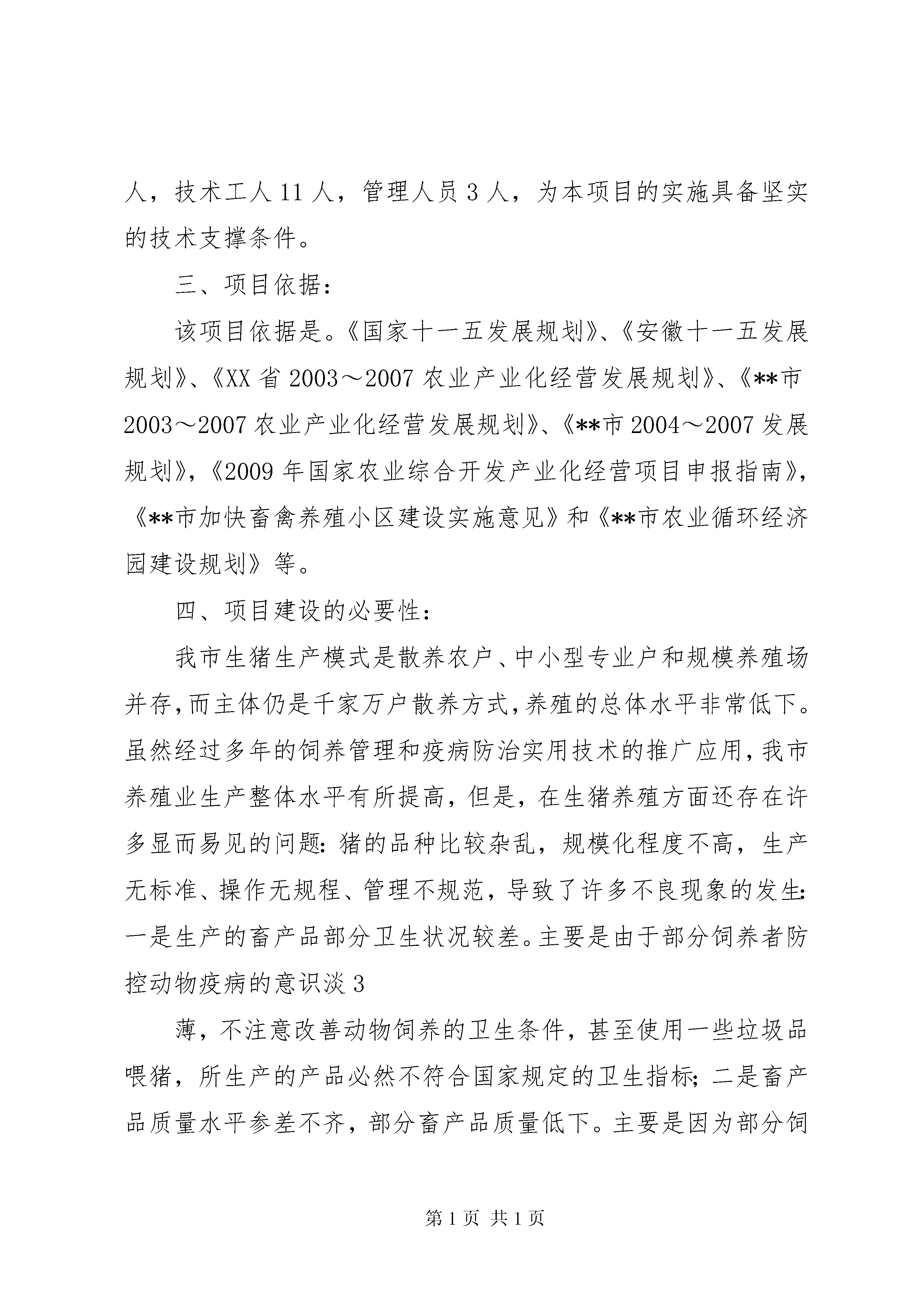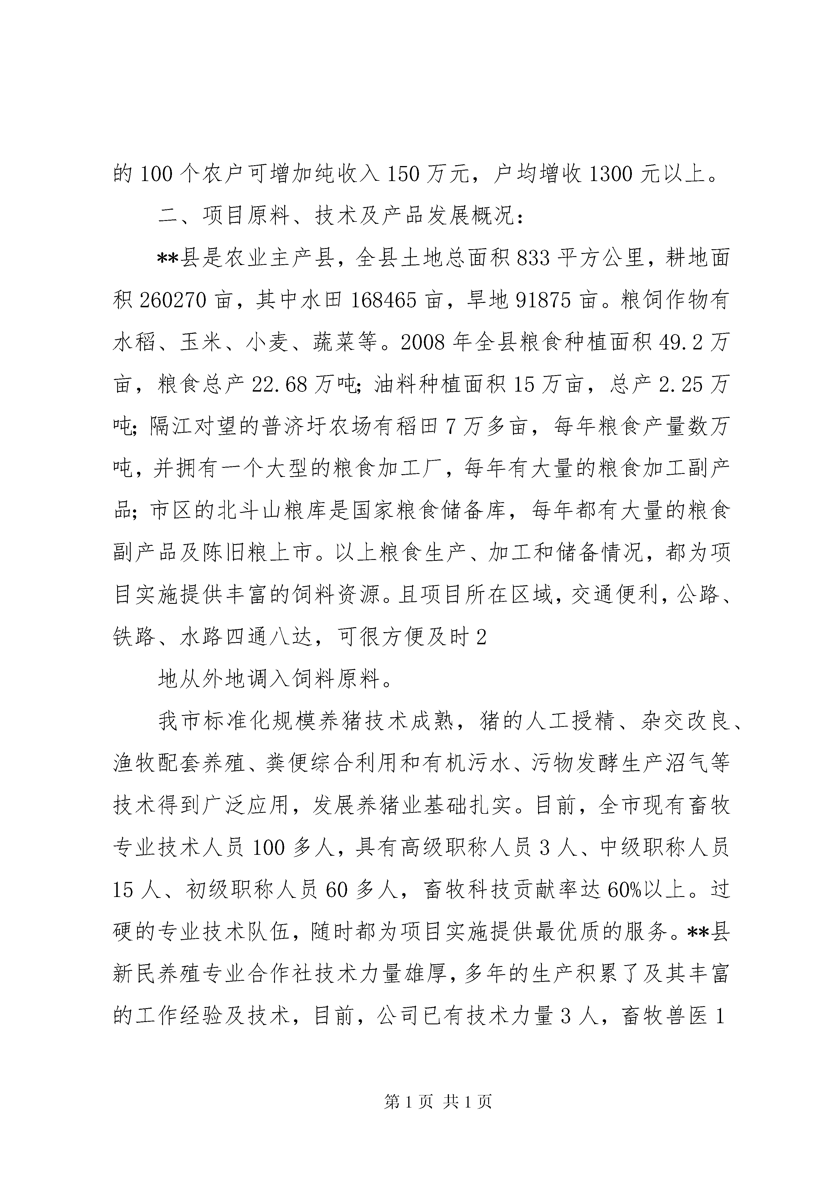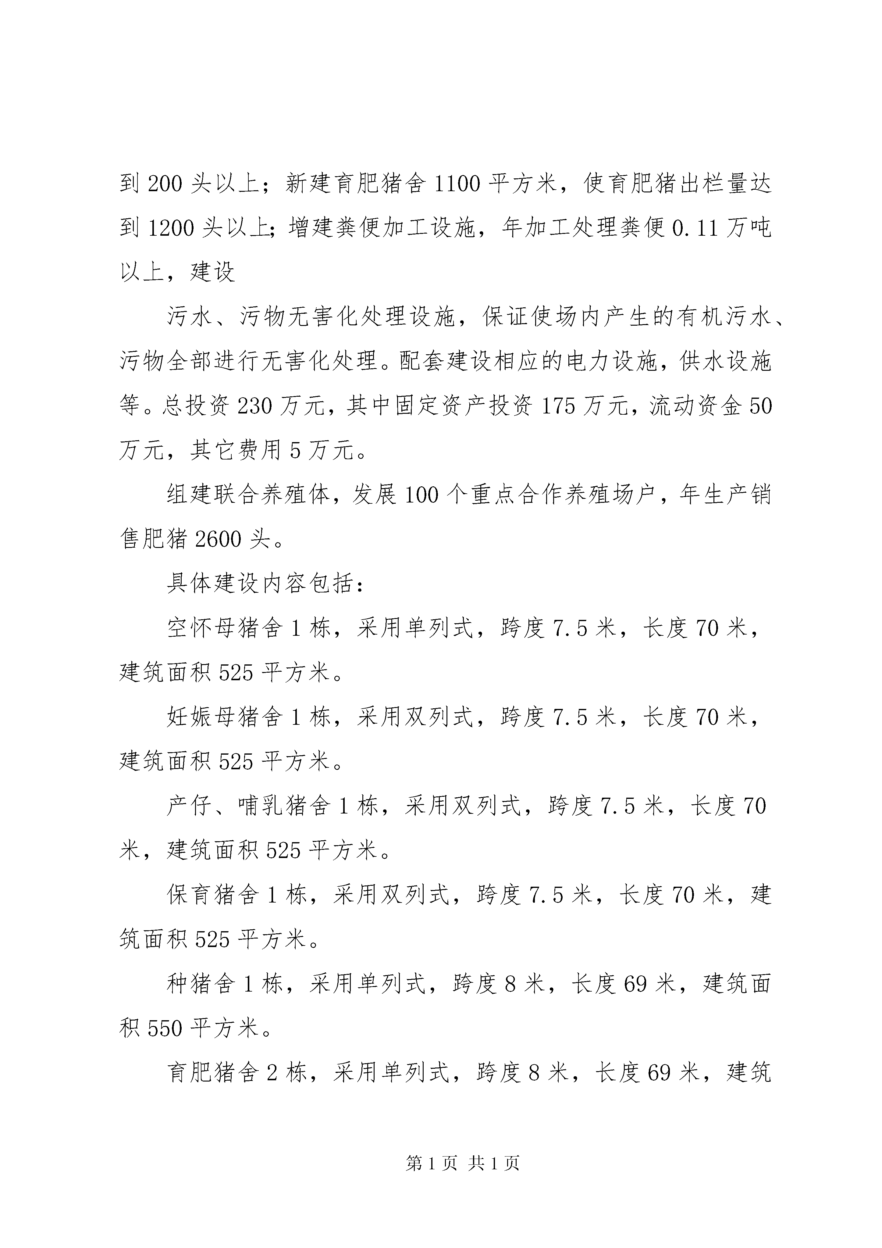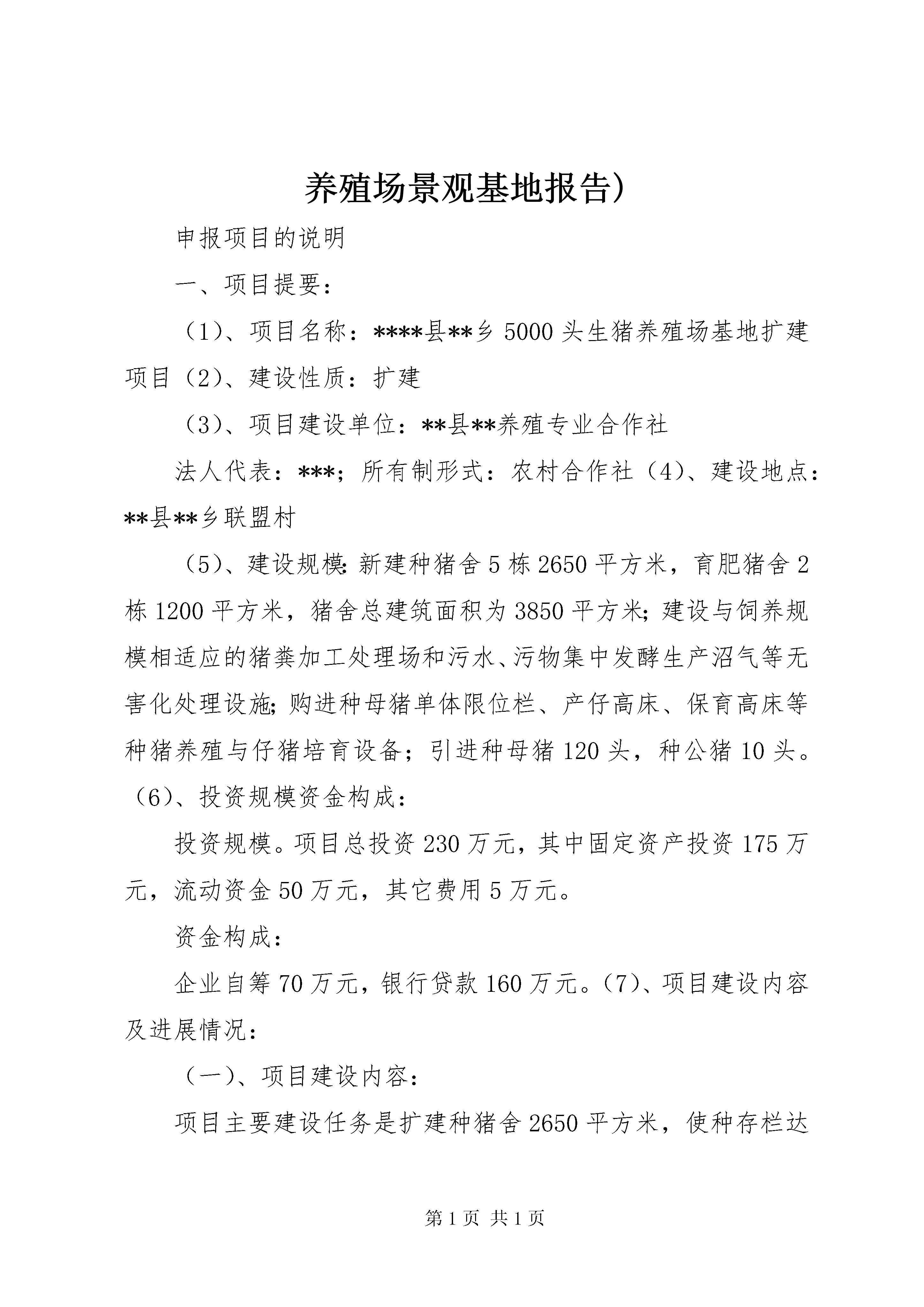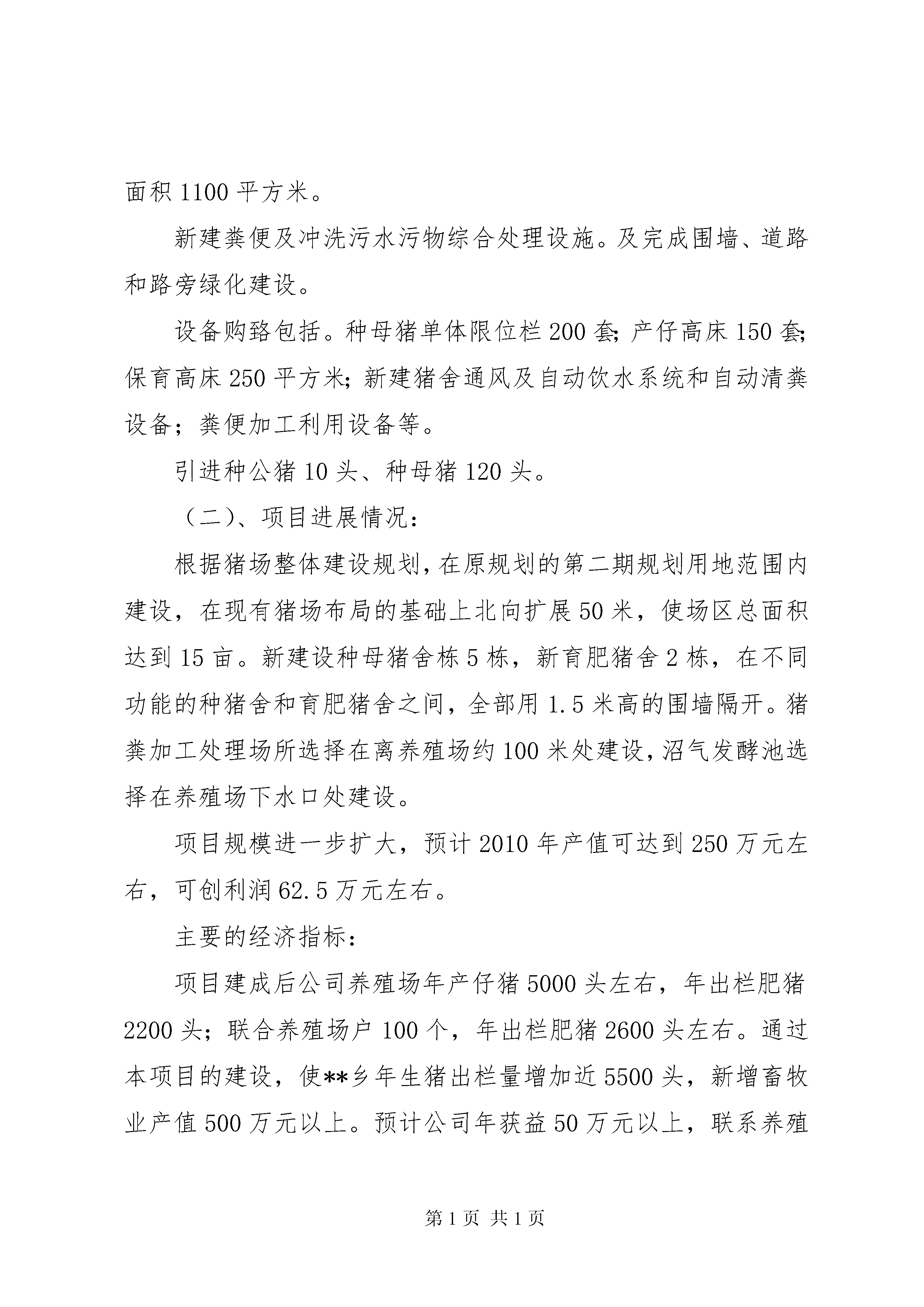养殖场景观基地报告)申报项目的说明一、项目提要:(1)、项目名称:****县**乡5000头生猪养殖场基地扩建项目(2)、建设性质:扩建(3)、项目建设单位:**县**养殖专业合作社法人代表:***;所有制形式:农村合作社(4)、建设地点:**县**乡联盟村(5)、建设规模:新建种猪舍5栋2650平方米,育肥猪舍2栋1200平方米,猪舍总建筑面积为3850平方米;建设与饲养规模相适应的猪粪加工处理场和污水、污物集中发酵生产沼气等无害化处理设施;购进种母猪单体限位栏、产仔高床、保育高床等种猪养殖与仔猪培育设备;引进种母猪120头,种公猪10头。(6)、投资规模资金构成:投资规模。项目总投资230万元,其中固定资产投资175万元,流动资金50万元,其它费用5万元。资金构成:企业自筹70万元,银行贷款160万元。(7)、项目建设内容及进展情况:(一)、项目建设内容:项目主要建设任务是扩建种猪舍2650平方米,使种存栏达到200头以上;新建育肥猪舍1100平方米,使育肥猪出栏量达到1200头以上;增建粪便加工设施,年加工处理粪便0.11万吨以上,建设污水、污物无害化处理设施,保证使场内产生的有机污水、污物全部进行无害化处理。配套建设相应的电力设施,供水设施等。总投资230万元,其中固定资产投资175万元,流动资金50万元,其它费用5万元。组建联合养殖体,发展100个重点合作养殖场户,年生产销售肥猪2600头。具体建设内容包括:空怀母猪舍1栋,采用单列式,跨度7.5米,长度70米,建筑面积525平方米。妊娠母猪舍1栋,采用双列式,跨度7.5米,长度70米,建筑面积525平方米。产仔、哺乳猪舍1栋,采用双列式,跨度7.5米,长度70米,建筑面积525平方米。保育猪舍1栋,采用双列式,跨度7.5米,长度70米,建筑面积525平方米。种猪舍1栋,采用单列式,跨度8米,长度69米,建筑面积550平方米。育肥猪舍2栋,采用单列式,跨度8米,长度69米,建筑面积1100平方米。新建粪便及冲洗污水污物综合处理设施。及完成围墙、道路和路旁绿化建设。设备购臵包括。种母猪单体限位栏200套;产仔高床150套;保育高床250平方米;新建猪舍通风及自动饮水系统和自动清粪设备;粪便加工利用设备等。引进种公猪10头、种母猪120头。(二)、项目进展情况:根据猪场整体建设规划,在原规划的第二期规划用地范围内建设,在现有猪场布局的基础上北向扩展50米,使场区总面积达到15亩。新建设种母猪舍栋5栋,新育肥猪舍2栋,在不同功能的种猪舍和育肥猪舍之间,全部用1.5米高的围墙隔开。猪粪加工处理场所选择在离养殖场约100米处建设,沼气发酵池选择在养殖场下水口处建设。项目规模进一步扩大,预计2010年产值可达到250万元左右,可创利润62.5万元左右。主要的经济指标:项目建成后公司养殖场年产仔猪5000头左右,年出栏肥猪2200头;联合养殖场户100个,年出栏肥猪2600头左右。通过本项目的建设,使**乡年生猪出栏量增加近5500头,新增畜牧业产值500万元以上。预计公司年获益50万元以上,联系养殖的100个农户可增加纯收入150万元,户均增收1300元以上。二、项目原料、技术及产品发展概况:**县是农业主产县,全县土地总面积833平方公里,耕地面积260270亩,其中水田168465亩,旱地91875亩。粮饲作物有水稻、玉米、小麦、蔬菜等。2008年全县粮食种植面积49.2万亩,粮食总产22.68万吨;油料种植面积15万亩,总产2.25万吨;隔江对望的普济圩农场有稻田7万多亩,每年粮食产量数万吨,并拥有一个大型的粮食加工厂,每年有大量的粮食加工副产品;市区的北斗山粮库是国家粮食储备库,每年都有大量的粮食副产品及陈旧粮上市。以上粮食生产、加工和储备情况,都为项目实施提供丰富的饲料资源。且项目所在区域,交通便利,公路、铁路、水路四通八达,可很方便及时2地从外地调入饲料原料。我市标准化规模养猪技术成熟,猪的人工授精、杂交改良、渔牧配套养殖、粪便综合利用和有机污水、污物发酵生产沼气等技术得到广泛应用,发展养猪业基础扎实。目前,全市现有畜牧专业技术人员100多人,具有高级职称人员3人、中级职称人员15人、初级职称人员60多人,畜牧科技贡献率达60%以上。过硬的专业技术队伍,随时都为项目实施提供最优质的服务。**县新民养殖专业合作社技术力量雄厚,多年的生产积累了及其丰富的工作经验及技术,目前,公司已有技术力量3人,畜牧兽医1人,技术工人11人,管理人员3人,为本项目的实施具备坚实的技术支撑条件。三、项目依据:该项目依据是。《国家十一五发展规划》、《安徽十一五发展规划》、《XX省2003~2007农业产业化经营发展规划》、《**市2003~2007农业产业化经营发展