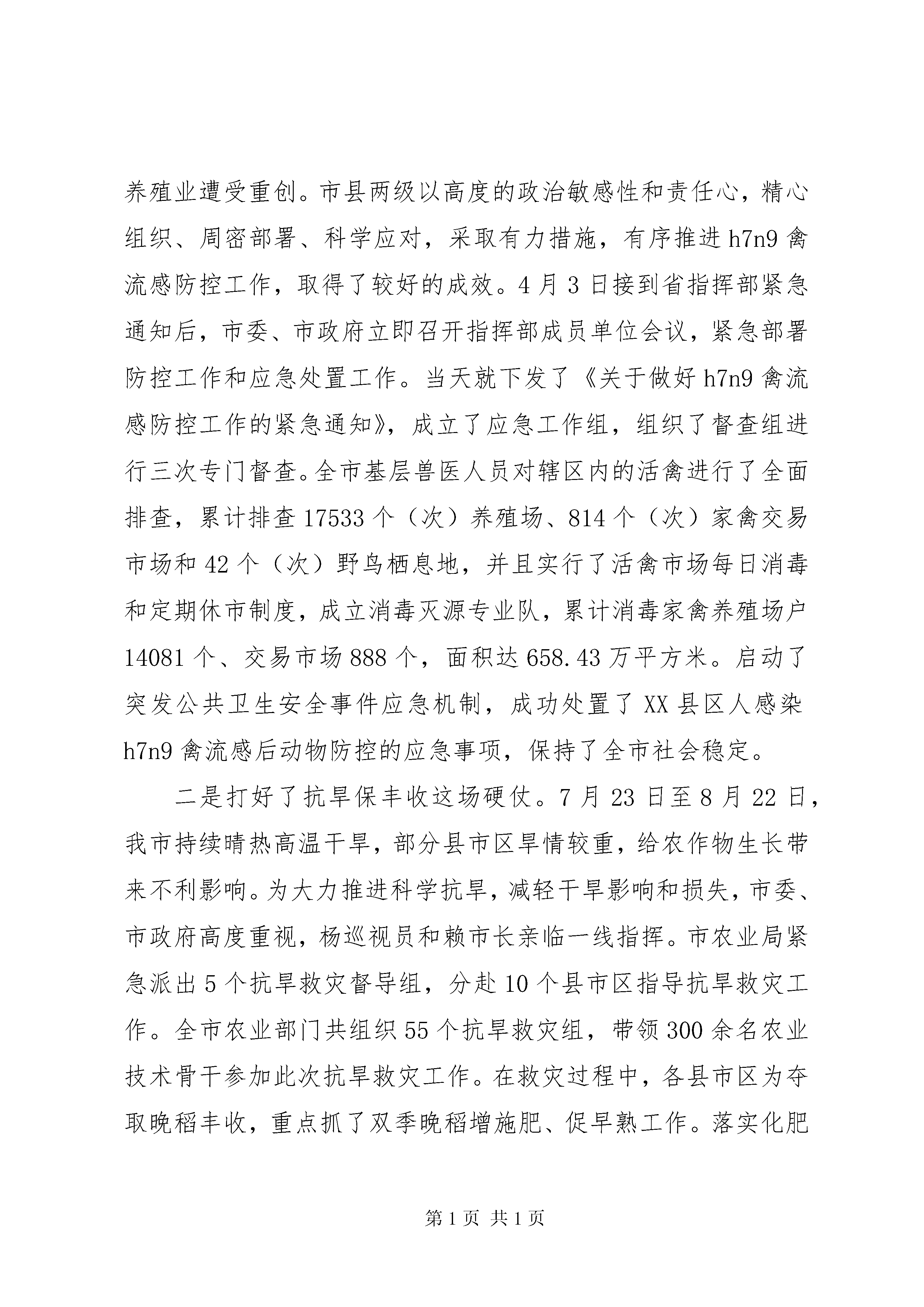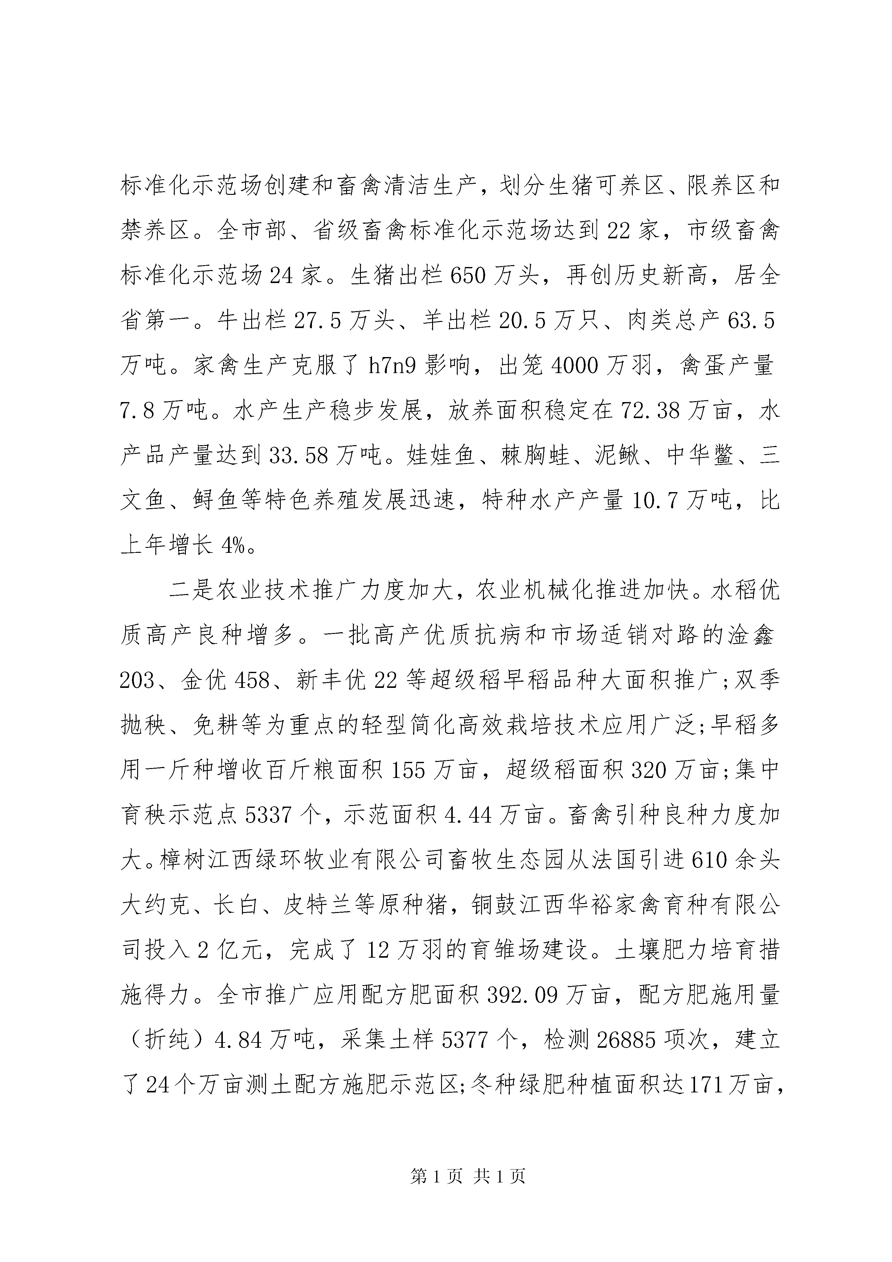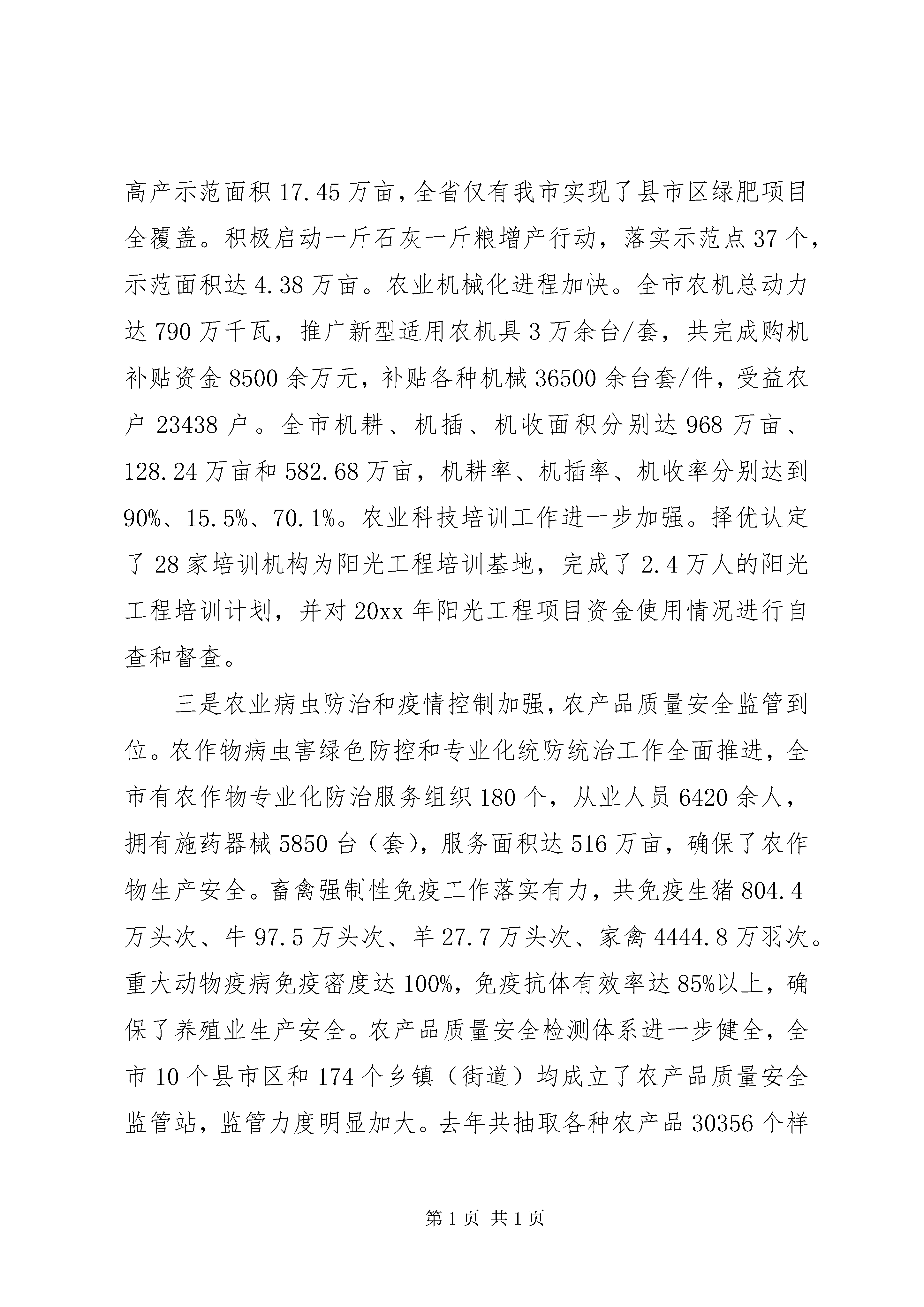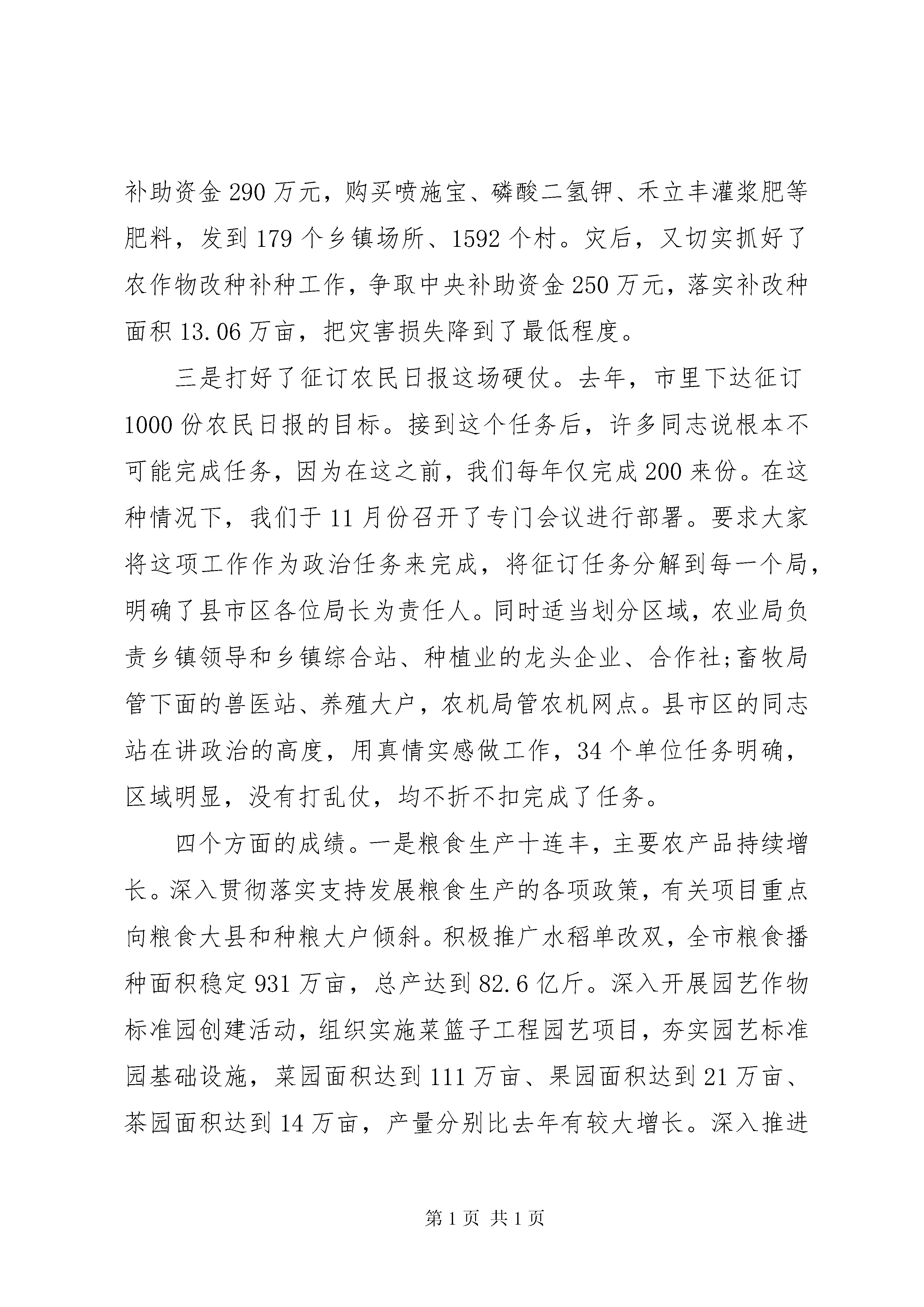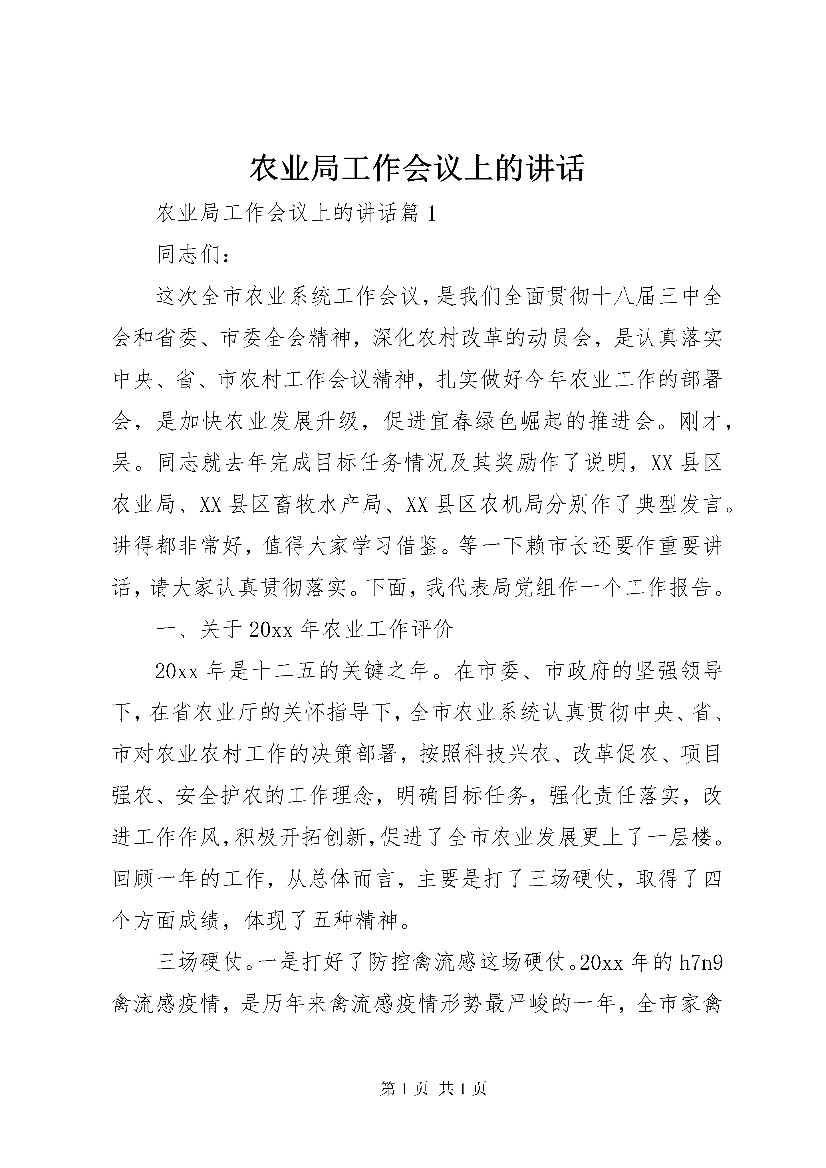 农业局工作会议上的讲话农业局工作会议上的讲话篇1同志们:这次全市农业系统工作会议,是我们全面贯彻十八届三中全会和省委、市委全会精神,深化农村改革的动员会,是认真落实中央、省、市农村工作会议精神,扎实做好今年农业工作的部署会,是加快农业发展升级,促进宜春绿色崛起的推进会。刚才,吴。同志就去年完成目标任务情况及其奖励作了说明,XX县区农业局、XX县区畜牧水产局、XX县区农机局分别作了典型发言。讲得都非常好,值得大家学习借鉴。等一下赖市长还要作重要讲话,请大家认真贯彻落实。下面,我代表局党组作一个工作报告。一、关于20xx年农业工作评价20xx年是十二五的关键之年。在市委、市政府的坚强领导下,在省农业厅的关怀指导下,全市农业系统认真贯彻中央、省、市对农业农村工作的决策部署,按照科技兴农、改革促农、项目强农、安全护农的工作理念,明确目标任务,强化责任落实,改进工作作风,积极开拓创新,促进了全市农业发展更上了一层楼。回顾一年的工作,从总体而言,主要是打了三场硬仗,取得了四个方面成绩,体现了五种精神。三场硬仗。一是打好了防控禽流感这场硬仗。20xx年的h7n9禽流感疫情,是历年来禽流感疫情形势最严峻的一年,全市家禽养殖业遭受重创。市县两级以高度的政治敏感性和责任心,精心组织、周密部署、科学应对,采取有力措施,有序推进h7n9禽流感防控工作,取得了较好的成效。4月3日接到省指挥部紧急通知后,市委、市政府立即召开指挥部成员单位会议,紧急部署防控工作和应急处置工作。当天就下发了《关于做好h7n9禽流感防控工作的紧急通知》,成立了应急工作组,组织了督查组进行三次专门督查。全市基层兽医人员对辖区内的活禽进行了全面排查,累计排查17533个(次)养殖场、814个(次)家禽交易市场和42个(次)野鸟栖息地,并且实行了活禽市场每日消毒和定期休市制度,成立消毒灭源专业队,累计消毒家禽养殖场户14081个、交易市场888个,面积达658.43万平方米。启动了突发公共卫生安全事件应急机制,成功处置了XX县区人感染h7n9禽流感后动物防控的应急事项,保持了全市社会稳定。二是打好了抗旱保丰收这场硬仗。7月23日至8月22日,我市持续晴热高温干旱,部分县市区旱情较重,给农作物生长带来不利影响。为大力推进科学抗旱,减轻干旱影响和损失,市委、市政府高度重视,杨巡视员和赖市长亲临一线指挥。市农业局紧急派出5个抗旱救灾督导组,分赴10个县市区指导抗旱救灾工作。全市农业部门共组织55个抗旱救灾组,带领300余名农业技术骨干参加此次抗旱救灾工作。在救灾过程中,各县市区为夺取晚稻丰收,重点抓了双季晚稻增施肥、促早熟工作。落实化肥补助资金290万元,购买喷施宝、磷酸二氢钾、禾立丰灌浆肥等肥料,发到179个乡镇场所、1592个村。灾后,又切实抓好了农作物改种补种工作,争取中央补助资金250万元,落实补改种面积13.06万亩,把灾害损失降到了最低程度。三是打好了征订农民日报这场硬仗。去年,市里下达征订1000份农民日报的目标。接到这个任务后,许多同志说根本不可能完成任务,因为在这之前,我们每年仅完成200来份。在这种情况下,我们于11月份召开了专门会议进行部署。要求大家将这项工作作为政治任务来完成,将征订任务分解到每一个局,明确了县市区各位局长为责任人。同时适当划分区域,农业局负责乡镇领导和乡镇综合站、种植业的龙头企业、合作社;畜牧局管下面的兽医站、养殖大户,农机局管农机网点。县市区的同志站在讲政治的高度,用真情实感做工作,34个单位任务明确,区域明显,没有打乱仗,均不折不扣完成了任务。四个方面的成绩。一是粮食生产十连丰,主要农产品持续增长。深入贯彻落实支持发展粮食生产的各项政策,有关项目重点向粮食大县和种粮大户倾斜。积极推广水稻单改双,全市粮食播种面积稳定931万亩,总产达到82.6亿斤。深入开展园艺作物标准园创建活动,组织实施菜篮子工程园艺项目,夯实园艺标准园基础设施,菜园面积达到111万亩、果园面积达到21万亩、茶园面积达到14万亩,产量分别比去年有较大增长。深入推进标准化示范场创建和畜禽清洁生产,划分生猪可养区、限养区和禁养区。全市部、省级畜禽标准化示范场达到22家,市级畜禽标准化示范场24家。生猪出栏650万头,再创历史新高,居全省第一。牛出栏27.5万头、羊出栏20.5万只、肉类总产63.5万吨。家禽生产克服了h7n9影响,出笼4000万羽,禽蛋产量7.8万吨。水产生产稳步发展,放养面积稳定在72.38万亩,水产品产量达到33.58万吨。娃娃鱼、棘胸蛙、泥鳅、中华鳖、三文鱼、鲟鱼等特色养殖发展迅速,特种水产产量10.7万吨,比上年增长4%。二是农业技术推广力度加大,农业机械化推进加快。水稻优质高产良种增多。一批高产优质抗病和市场适销对路的淦鑫203