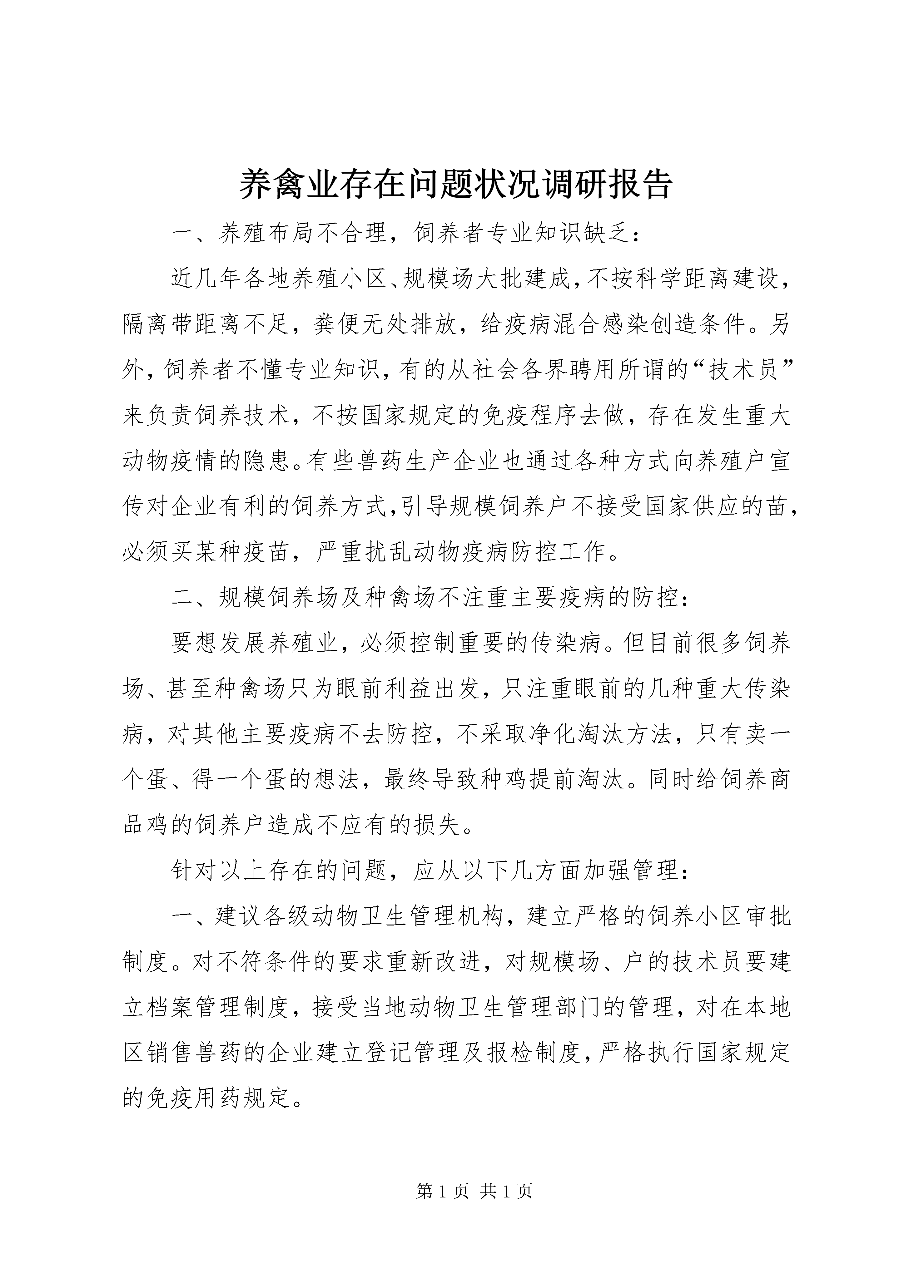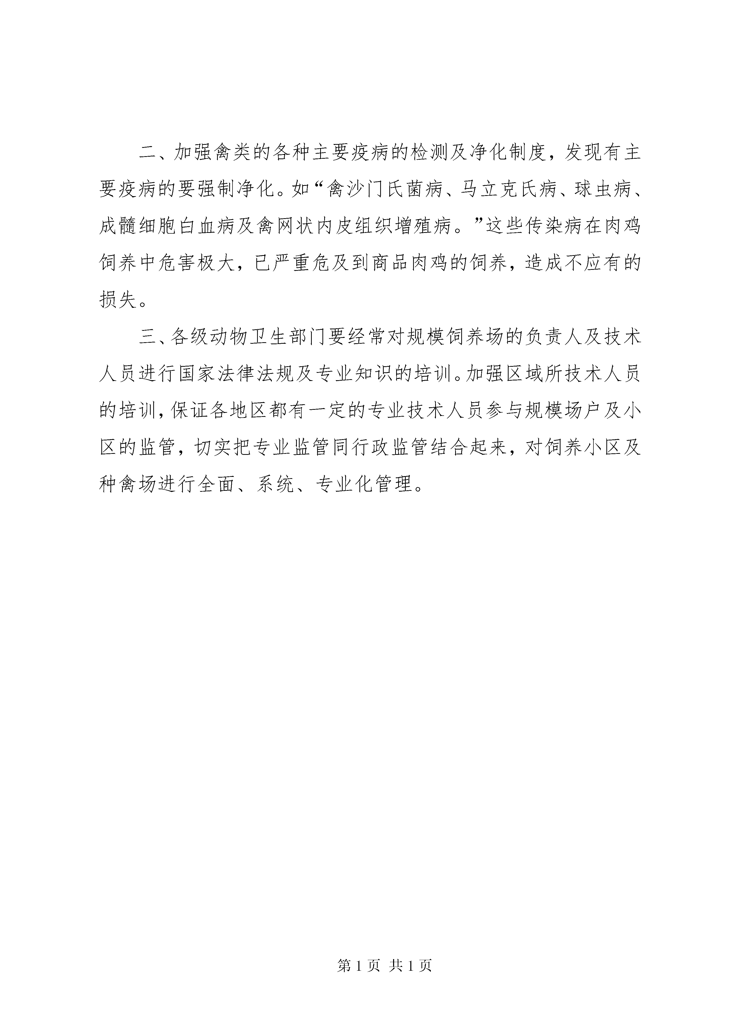 养禽业存在问题状况调研报告一、养殖布局不合理,饲养者专业知识缺乏:近几年各地养殖小区、规模场大批建成,不按科学距离建设,隔离带距离不足,粪便无处排放,给疫病混合感染创造条件。另外,饲养者不懂专业知识,有的从社会各界聘用所谓的“技术员”来负责饲养技术,不按国家规定的免疫程序去做,存在发生重大动物疫情的隐患。有些兽药生产企业也通过各种方式向养殖户宣传对企业有利的饲养方式,引导规模饲养户不接受国家供应的苗,必须买某种疫苗,严重扰乱动物疫病防控工作。二、规模饲养场及种禽场不注重主要疫病的防控:要想发展养殖业,必须控制重要的传染病。但目前很多饲养场、甚至种禽场只为眼前利益出发,只注重眼前的几种重大传染病,对其他主要疫病不去防控,不采取净化淘汰方法,只有卖一个蛋、得一个蛋的想法,最终导致种鸡提前淘汰。同时给饲养商品鸡的饲养户造成不应有的损失。针对以上存在的问题,应从以下几方面加强管理:一、建议各级动物卫生管理机构,建立严格的饲养小区审批制度。对不符条件的要求重新改进,对规模场、户的技术员要建立档案管理制度,接受当地动物卫生管理部门的管理,对在本地区销售兽药的企业建立登记管理及报检制度,严格执行国家规定的免疫用药规定。二、加强禽类的各种主要疫病的检测及净化制度,发现有主要疫病的要强制净化。如“禽沙门氏菌病、马立克氏病、球虫病、成髓细胞白血病及禽网状内皮组织增殖病。”这些传染病在肉鸡饲养中危害极大,已严重危及到商品肉鸡的饲养,造成不应有的损失。三、各级动物卫生部门要经常对规模饲养场的负责人及技术人员进行国家法律法规及专业知识的培训。加强区域所技术人员的培训,保证各地区都有一定的专业技术人员参与规模场户及小区的监管,切实把专业监管同行政监管结合起来,对饲养小区及种禽场进行全面、系统、专业化管理。