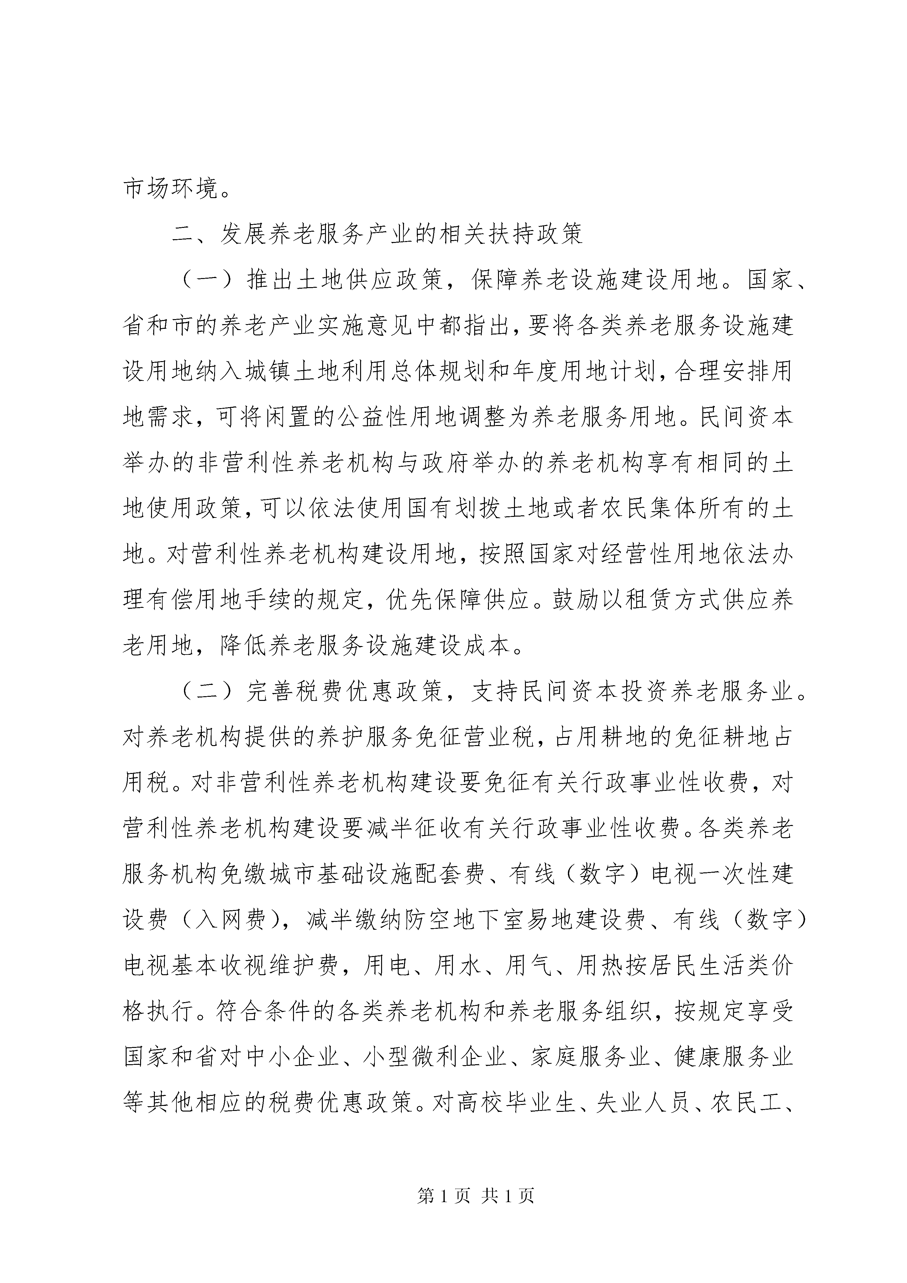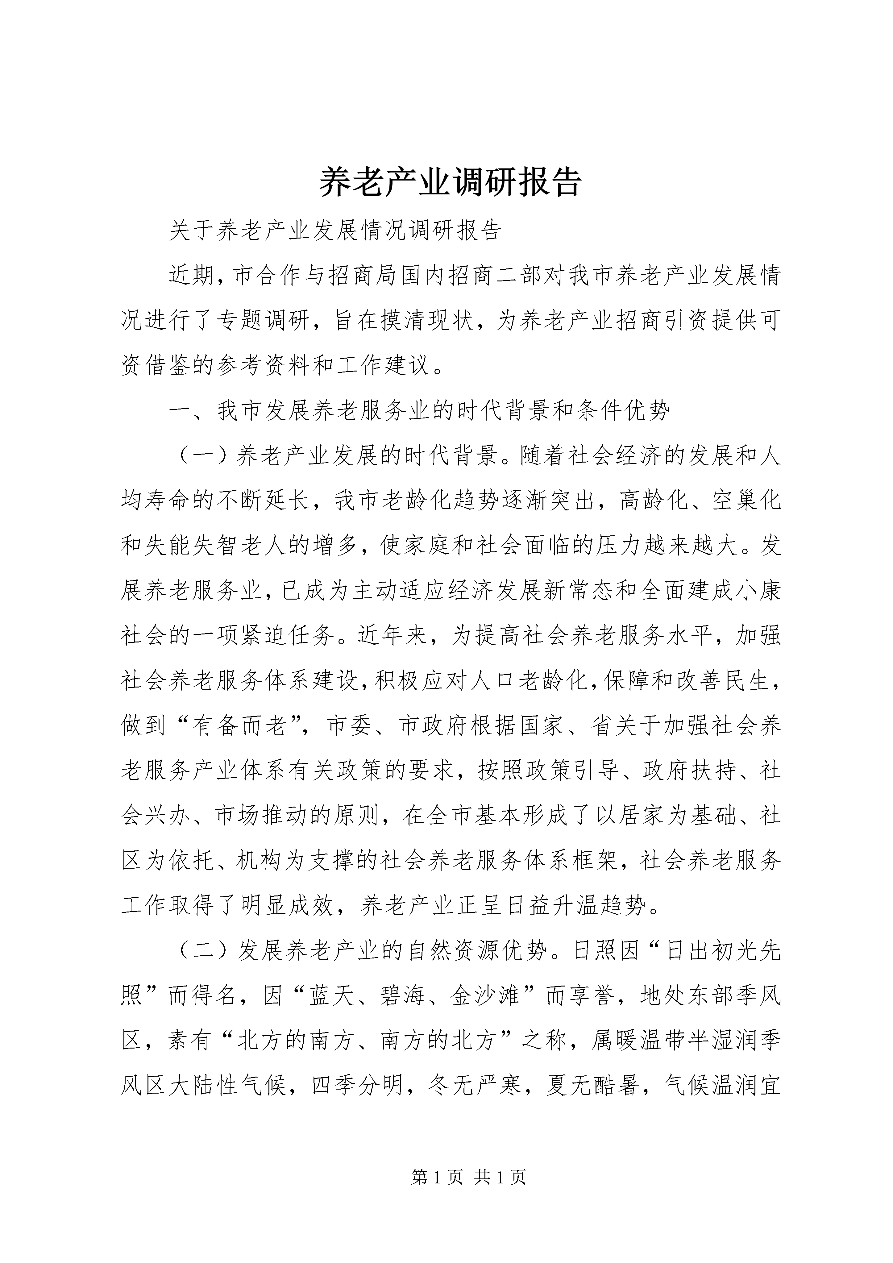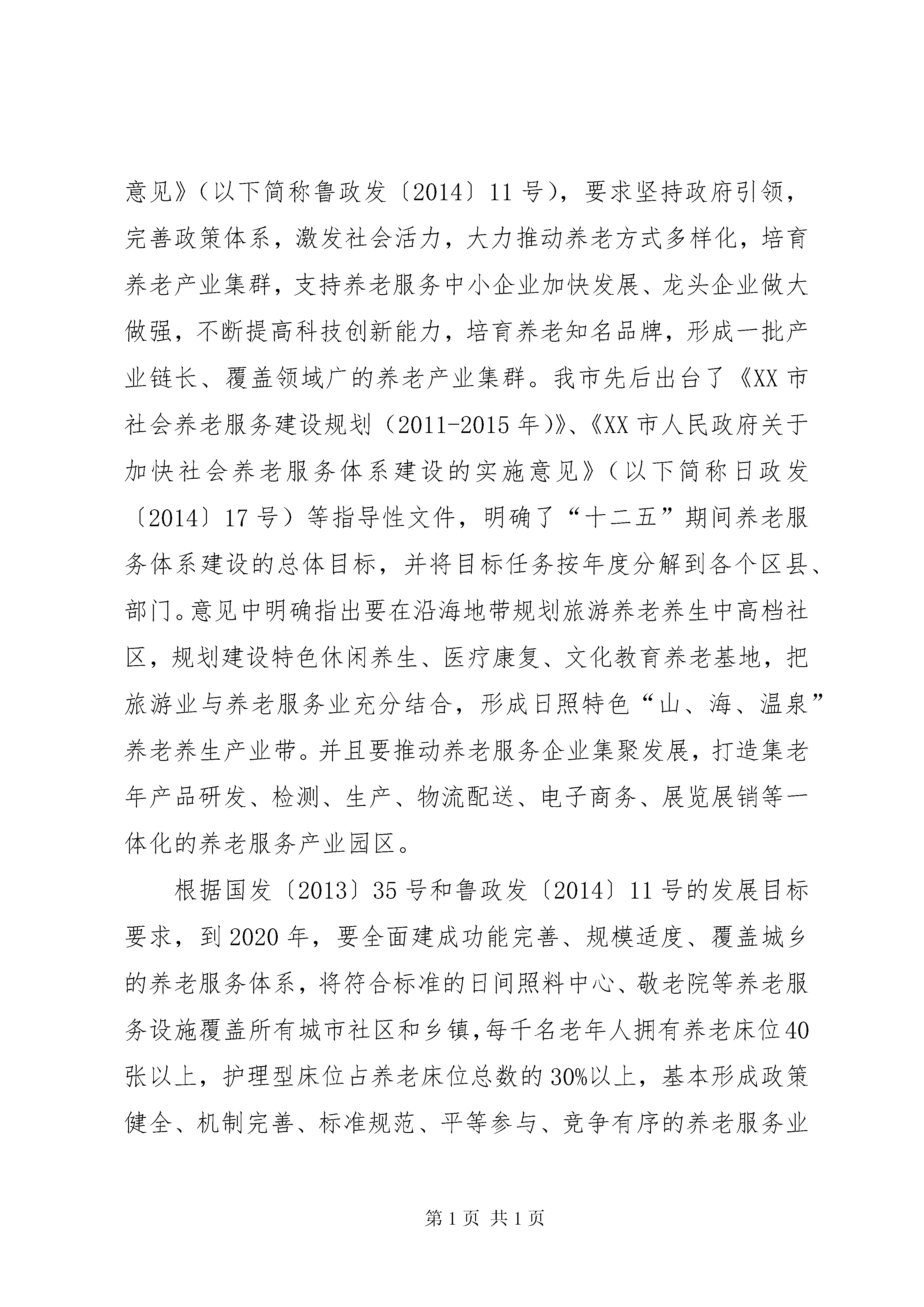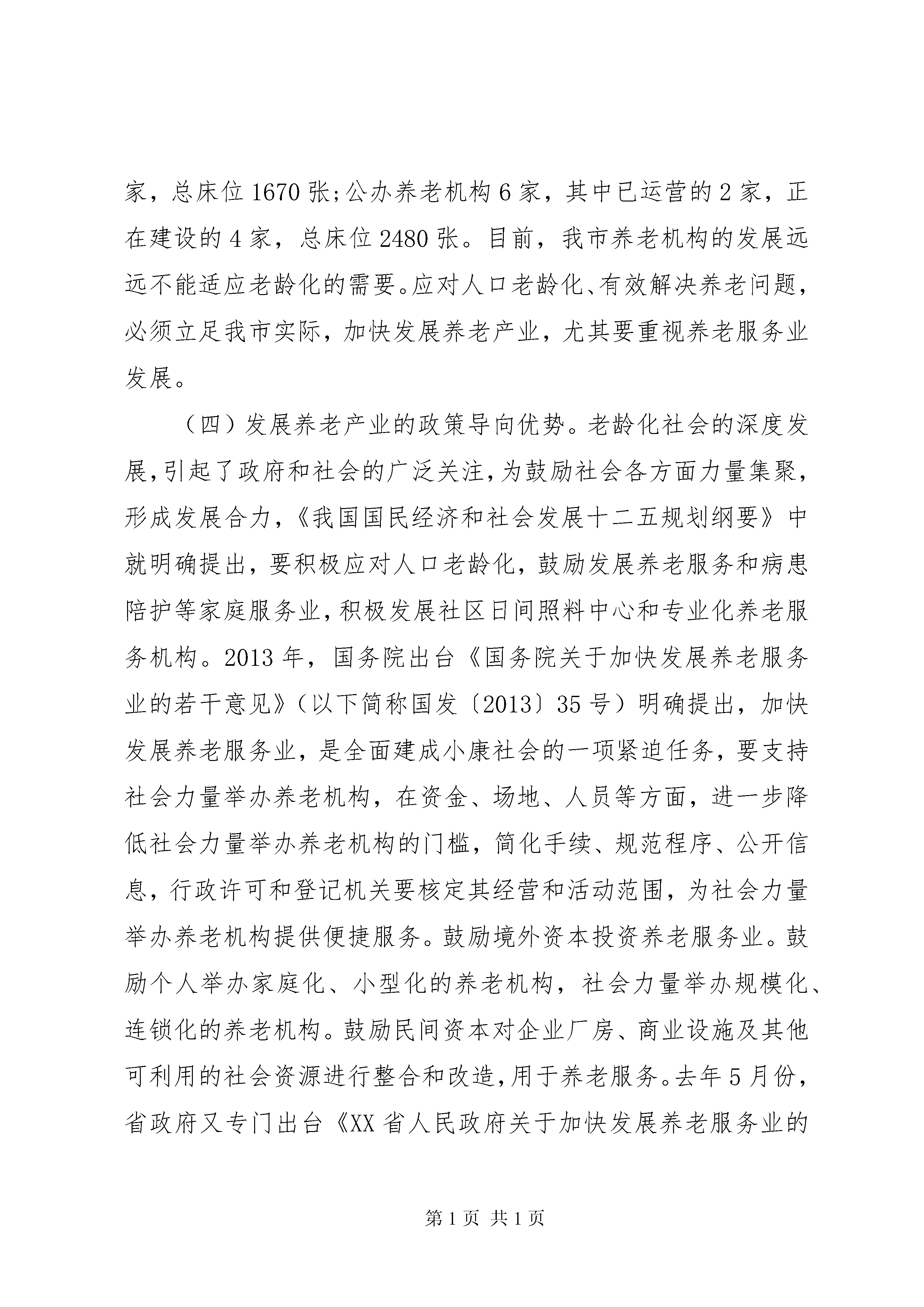 养老产业调研报告关于养老产业发展情况调研报告近期,市合作与招商局国内招商二部对我市养老产业发展情况进行了专题调研,旨在摸清现状,为养老产业招商引资提供可资借鉴的参考资料和工作建议。一、我市发展养老服务业的时代背景和条件优势(一)养老产业发展的时代背景。随着社会经济的发展和人均寿命的不断延长,我市老龄化趋势逐渐突出,高龄化、空巢化和失能失智老人的增多,使家庭和社会面临的压力越来越大。发展养老服务业,已成为主动适应经济发展新常态和全面建成小康社会的一项紧迫任务。近年来,为提高社会养老服务水平,加强社会养老服务体系建设,积极应对人口老龄化,保障和改善民生,做到“有备而老”,市委、市政府根据国家、省关于加强社会养老服务产业体系有关政策的要求,按照政策引导、政府扶持、社会兴办、市场推动的原则,在全市基本形成了以居家为基础、社区为依托、机构为支撑的社会养老服务体系框架,社会养老服务工作取得了明显成效,养老产业正呈日益升温趋势。(二)发展养老产业的自然资源优势。日照因“日出初光先照”而得名,因“蓝天、碧海、金沙滩”而享誉,地处东部季风区,素有“北方的南方、南方的北方”之称,属暖温带半湿润季风区大陆性气候,四季分明,冬无严寒,夏无酷暑,气候温润宜人,风景秀丽,生态良好,是我国沿海不可多得的度假胜地。2009年我市因出色的人居环境和生态环境规划而获得全球人居领域的最高荣誉——联合国人居奖。我市发展面向全国各地的休闲养老养生产业前景广阔、潜力巨大,要充分发挥和利用其“山海兼备”的优势自然资源,建设面向全国的高端养老养生休闲项目,打造具有特色的养老服务产业体系。(三)发展养老产业的市场优势。目前,中国老年人口已突破2亿,2015年末老年人数量将增至2.21亿,占比将达到16%;2025年老年人口将达到3亿,占比将达到约20%。作为全国老年人口第一大省,截至去年年底全省60岁以上老年人口达到1800万。我市目前也已进入中度老龄化阶段,截至去年年底全市60岁以上老年人已超过53万,占总人口的比例达到18.27%,远超过全国平均水平。预计到2020年,60岁以上老年人将达到60万,约占总人口的20%,其中,80岁以上高龄老年人比例接近11%,而该部分老年人也基本进入半自理和不能自理状态。同时,随着第一代独生子女进入中年,家庭结构日趋小型化,城市家庭子女外出求学、工作、出国定居,农村家庭子女外出打工、到城镇定居等原因,城乡空巢老年家庭数量快速增加,亟需照看护理。因此,社会老龄化的现实为养老产业奠定了雄厚的市场基础。我市民办养老服务机构从2003年开始起步,经过10余年的持续发展,至2014年底,全市累计投入运营民办养老服务机构10家,总床位1670张;公办养老机构6家,其中已运营的2家,正在建设的4家,总床位2480张。目前,我市养老机构的发展远远不能适应老龄化的需要。应对人口老龄化、有效解决养老问题,必须立足我市实际,加快发展养老产业,尤其要重视养老服务业发展。(四)发展养老产业的政策导向优势。老龄化社会的深度发展,引起了政府和社会的广泛关注,为鼓励社会各方面力量集聚,形成发展合力,《我国国民经济和社会发展十二五规划纲要》中就明确提出,要积极应对人口老龄化,鼓励发展养老服务和病患陪护等家庭服务业,积极发展社区日间照料中心和专业化养老服务机构。2013年,国务院出台《国务院关于加快发展养老服务业的若干意见》(以下简称国发〔2013〕35号)明确提出,加快发展养老服务业,是全面建成小康社会的一项紧迫任务,要支持社会力量举办养老机构,在资金、场地、人员等方面,进一步降低社会力量举办养老机构的门槛,简化手续、规范程序、公开信息,行政许可和登记机关要核定其经营和活动范围,为社会力量举办养老机构提供便捷服务。鼓励境外资本投资养老服务业。鼓励个人举办家庭化、小型化的养老机构,社会力量举办规模化、连锁化的养老机构。鼓励民间资本对企业厂房、商业设施及其他可利用的社会资源进行整合和改造,用于养老服务。去年5月份,省政府又专门出台《XX省人民政府关于加快发展养老服务业的意见》(以下简称鲁政发〔2014〕11号),要求坚持政府引领,完善政策体系,激发社会活力,大力推动养老方式多样化,培育养老产业集群,支持养老服务中小企业加快发展、龙头企业做大做强,不断提高科技创新能力,培育养老知名品牌,形成一批产业链长、覆盖领域广的养老产业集群。我市先后出台了《XX市社会养老服务建设规划(2011-2015年)》、《XX市人民政府关于加快社会养老服务体系建设的实施意见》(以下简称日政发〔2014〕17号)等指导性文件,明确了“十二五”期间养老服务体系建设的总体目标,并将目标任务按年度分解到各个区县、部门。意见中明确指出要在沿海地带规划旅游养老养生中高档社区,规划建设特