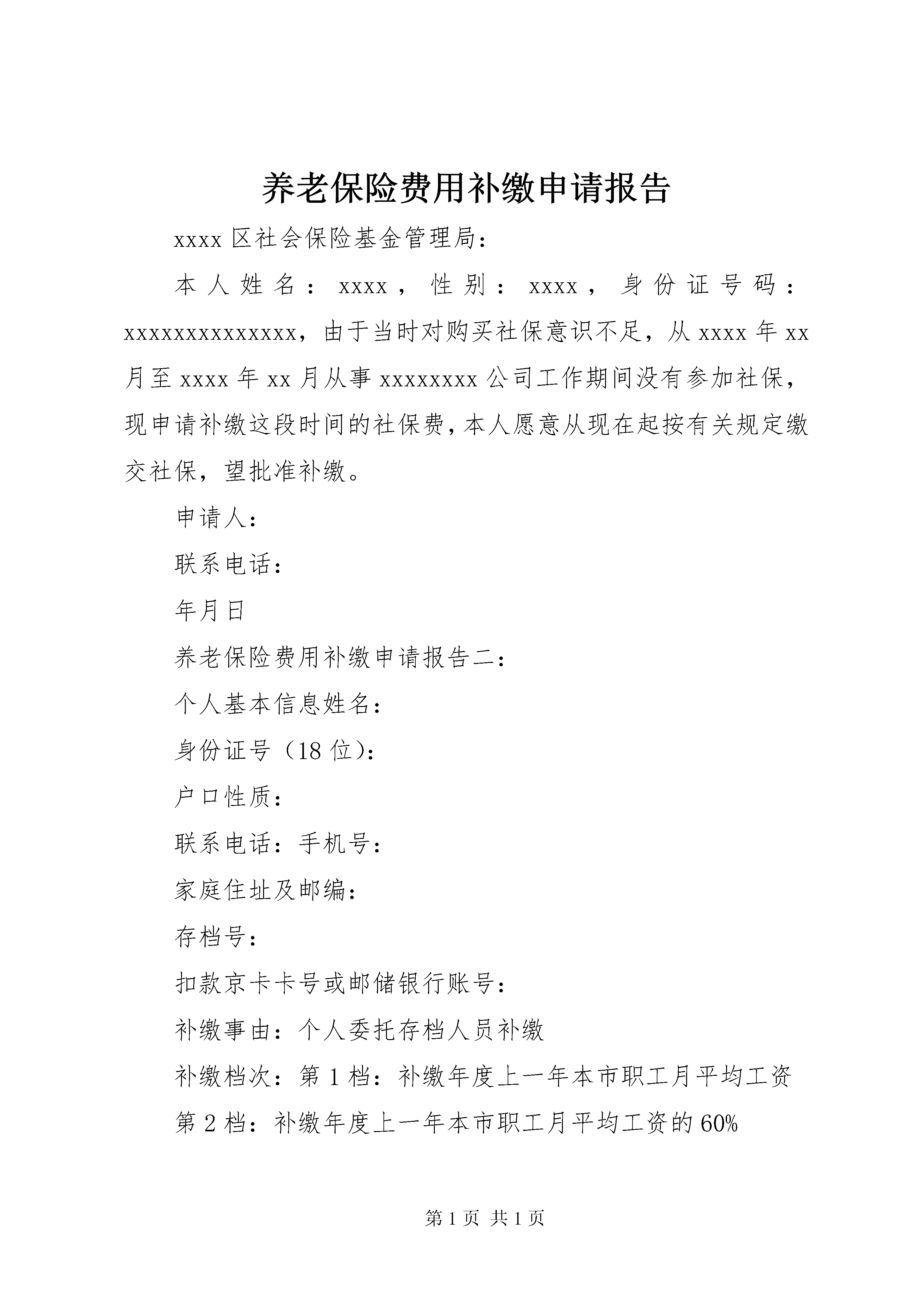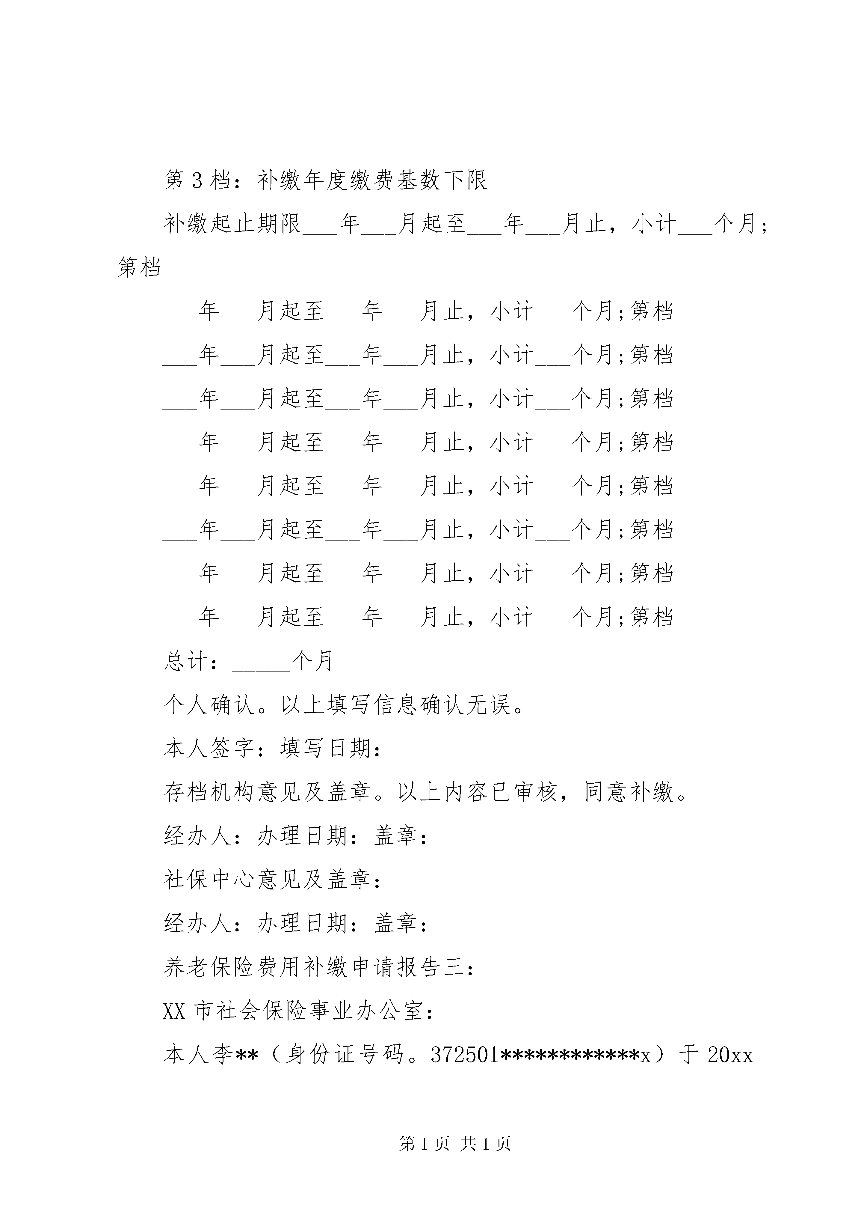 养老保险费用补缴申请报告xxxx区社会保险基金管理局:本人姓名:xxxx,性别:xxxx,身份证号码:xxxxxxxxxxxxxx,由于当时对购买社保意识不足,从xxxx年xx月至xxxx年xx月从事xxxxxxxx公司工作期间没有参加社保,现申请补缴这段时间的社保费,本人愿意从现在起按有关规定缴交社保,望批准补缴。申请人:联系电话:年月日养老保险费用补缴申请报告二:个人基本信息姓名:身份证号(18位):户口性质:联系电话:手机号:家庭住址及邮编:存档号:扣款京卡卡号或邮储银行账号:补缴事由:个人委托存档人员补缴补缴档次:第1档:补缴年度上一年本市职工月平均工资第2档:补缴年度上一年本市职工月平均工资的60%第3档:补缴年度缴费基数下限补缴起止期限___年___月起至___年___月止,小计___个月;第档___年___月起至___年___月止,小计___个月;第档___年___月起至___年___月止,小计___个月;第档___年___月起至___年___月止,小计___个月;第档___年___月起至___年___月止,小计___个月;第档___年___月起至___年___月止,小计___个月;第档___年___月起至___年___月止,小计___个月;第档___年___月起至___年___月止,小计___个月;第档___年___月起至___年___月止,小计___个月;第档总计:_____个月个人确认。以上填写信息确认无误。本人签字:填写日期:存档机构意见及盖章。以上内容已审核,同意补缴。经办人:办理日期:盖章:社保中心意见及盖章:经办人:办理日期:盖章:养老保险费用补缴申请报告三:XX市社会保险事业办公室:本人李**(身份证号码。372501************x)于20xx年06月---20xx年12月在XX市XX县区新宇生产服务公司工作,单位并未为我办理缴纳职工养老保险,因原单位已经倒闭多年,加之本人家庭条件困难,所以,本人自愿放弃补缴20xx年6月20xx年12月中断的职工养老保险。申请人:(签章)年月日