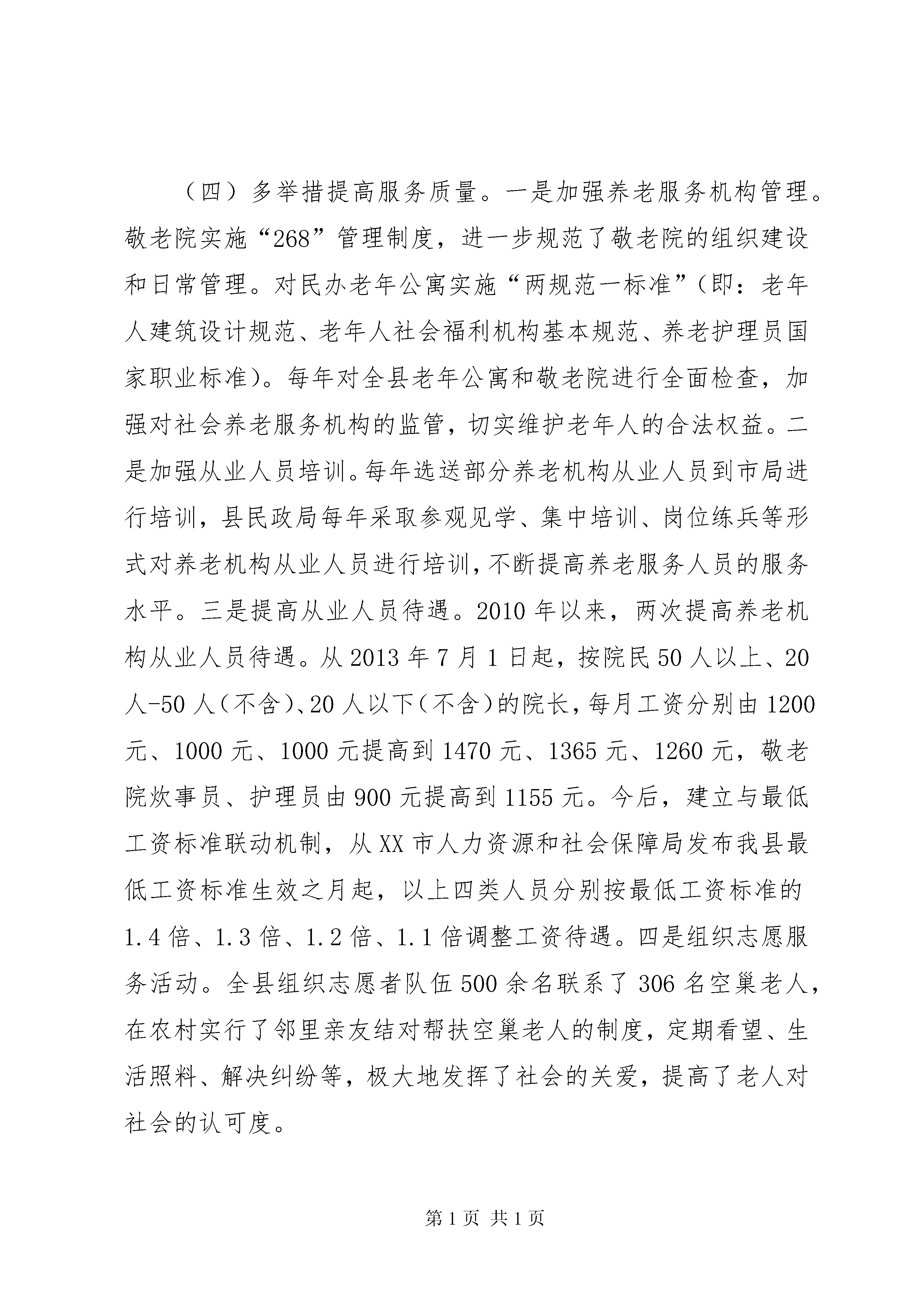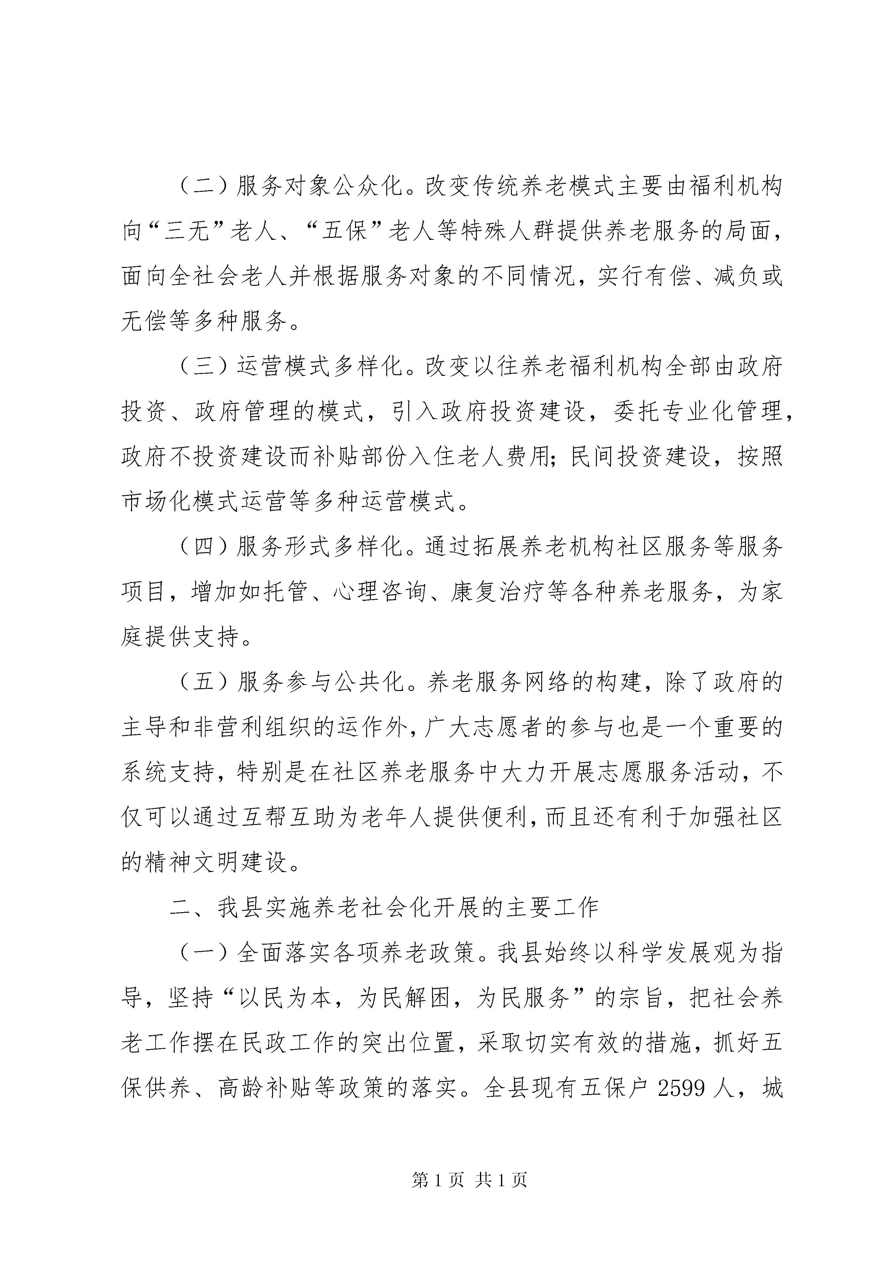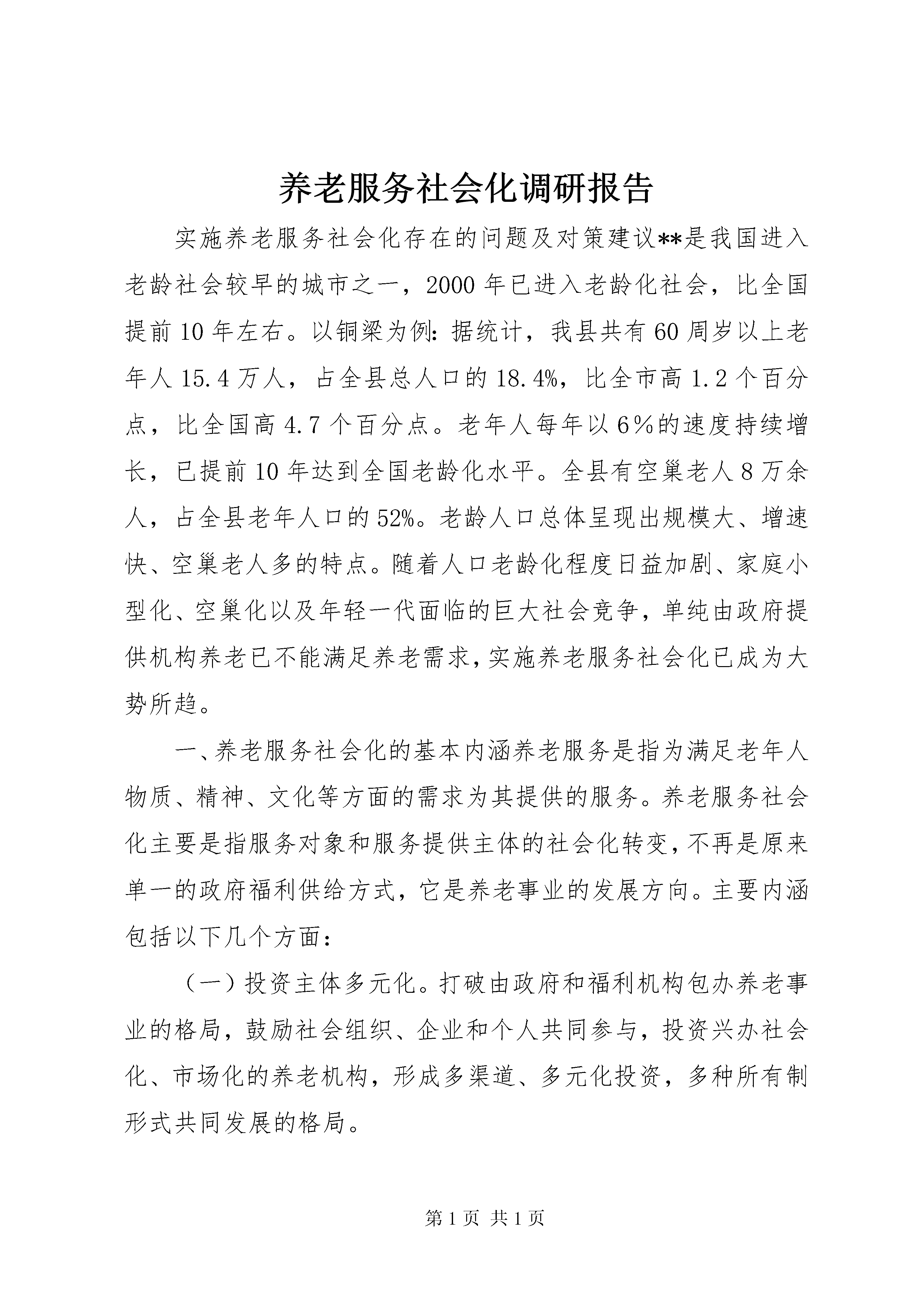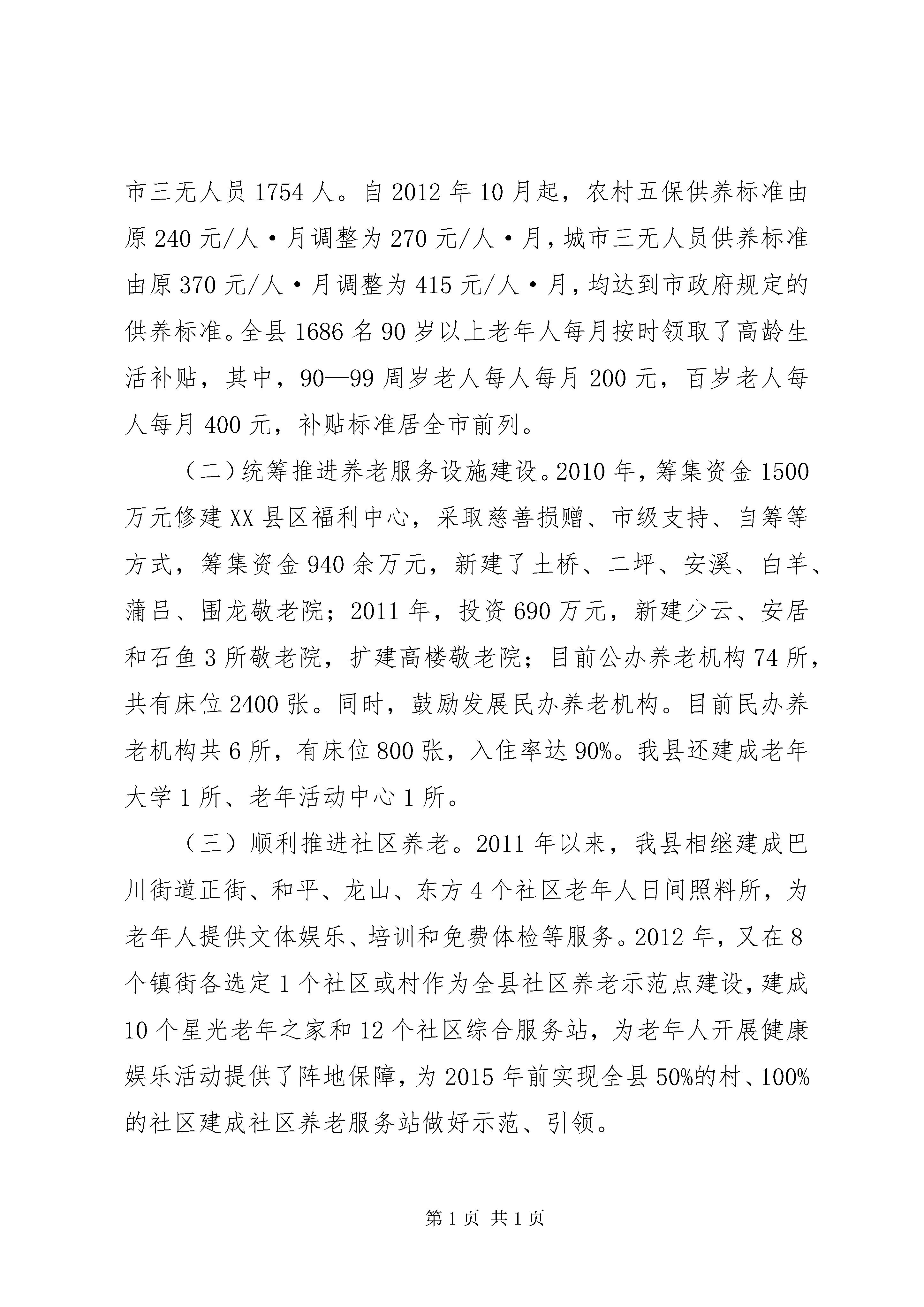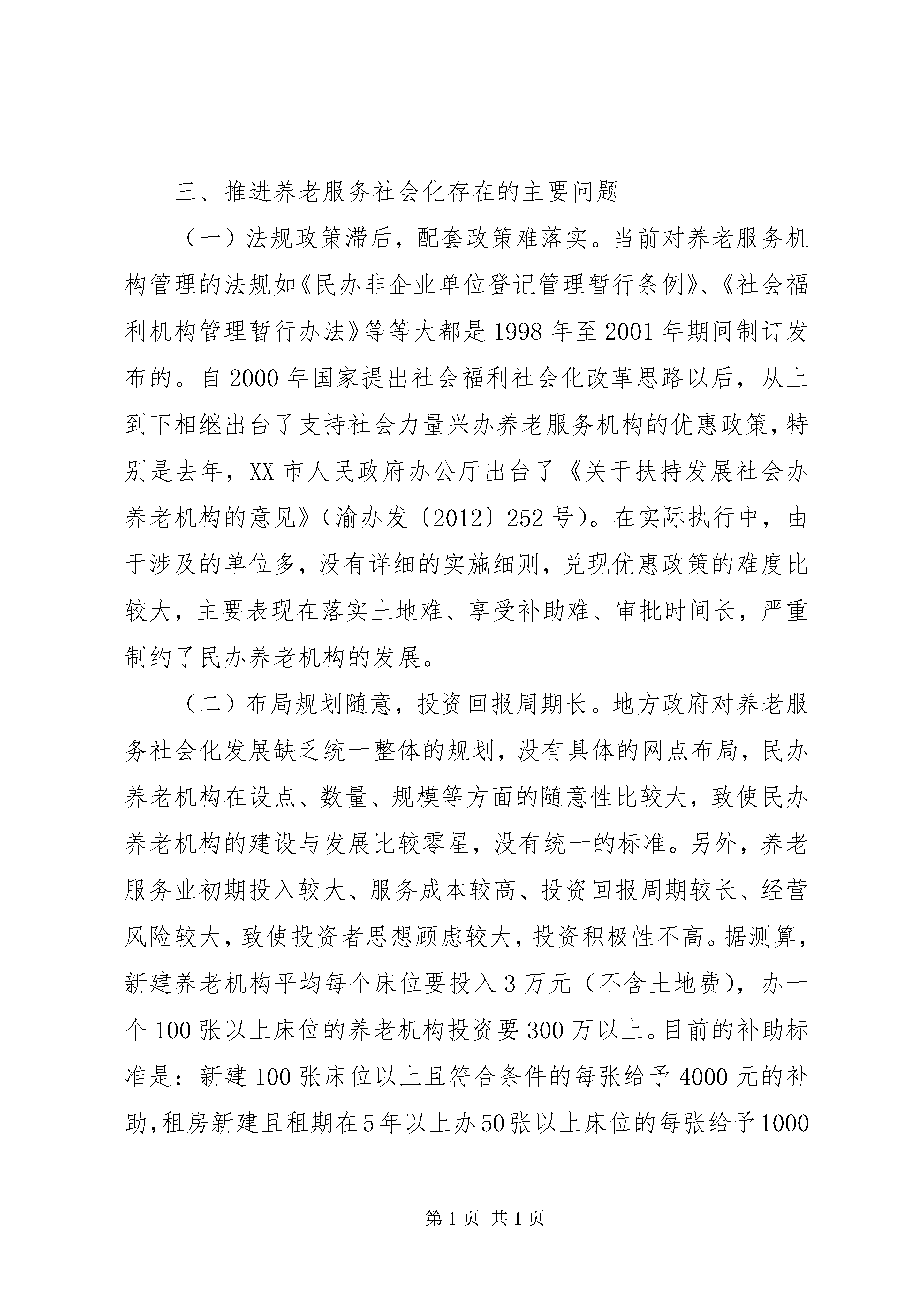 养老服务社会化调研报告实施养老服务社会化存在的问题及对策建议**是我国进入老龄社会较早的城市之一,2000年已进入老龄化社会,比全国提前10年左右。以铜梁为例:据统计,我县共有60周岁以上老年人15.4万人,占全县总人口的18.4%,比全市高1.2个百分点,比全国高4.7个百分点。老年人每年以6%的速度持续增长,已提前10年达到全国老龄化水平。全县有空巢老人8万余人,占全县老年人口的52%。老龄人口总体呈现出规模大、增速快、空巢老人多的特点。随着人口老龄化程度日益加剧、家庭小型化、空巢化以及年轻一代面临的巨大社会竞争,单纯由政府提供机构养老已不能满足养老需求,实施养老服务社会化已成为大势所趋。一、养老服务社会化的基本内涵养老服务是指为满足老年人物质、精神、文化等方面的需求为其提供的服务。养老服务社会化主要是指服务对象和服务提供主体的社会化转变,不再是原来单一的政府福利供给方式,它是养老事业的发展方向。主要内涵包括以下几个方面:(一)投资主体多元化。打破由政府和福利机构包办养老事业的格局,鼓励社会组织、企业和个人共同参与,投资兴办社会化、市场化的养老机构,形成多渠道、多元化投资,多种所有制形式共同发展的格局。(二)服务对象公众化。改变传统养老模式主要由福利机构向“三无”老人、“五保”老人等特殊人群提供养老服务的局面,面向全社会老人并根据服务对象的不同情况,实行有偿、减负或无偿等多种服务。(三)运营模式多样化。改变以往养老福利机构全部由政府投资、政府管理的模式,引入政府投资建设,委托专业化管理,政府不投资建设而补贴部份入住老人费用;民间投资建设,按照市场化模式运营等多种运营模式。(四)服务形式多样化。通过拓展养老机构社区服务等服务项目,增加如托管、心理咨询、康复治疗等各种养老服务,为家庭提供支持。(五)服务参与公共化。养老服务网络的构建,除了政府的主导和非营利组织的运作外,广大志愿者的参与也是一个重要的系统支持,特别是在社区养老服务中大力开展志愿服务活动,不仅可以通过互帮互助为老年人提供便利,而且还有利于加强社区的精神文明建设。二、我县实施养老社会化开展的主要工作(一)全面落实各项养老政策。我县始终以科学发展观为指导,坚持“以民为本,为民解困,为民服务”的宗旨,把社会养老工作摆在民政工作的突出位置,采取切实有效的措施,抓好五保供养、高龄补贴等政策的落实。全县现有五保户2599人,城市三无人员1754人。自2012年10月起,农村五保供养标准由原240元/人·月调整为270元/人·月,城市三无人员供养标准由原370元/人·月调整为415元/人·月,均达到市政府规定的供养标准。全县1686名90岁以上老年人每月按时领取了高龄生活补贴,其中,90—99周岁老人每人每月200元,百岁老人每人每月400元,补贴标准居全市前列。(二)统筹推进养老服务设施建设。2010年,筹集资金1500万元修建XX县区福利中心,采取慈善损赠、市级支持、自筹等方式,筹集资金940余万元,新建了土桥、二坪、安溪、白羊、蒲吕、围龙敬老院;2011年,投资690万元,新建少云、安居和石鱼3所敬老院,扩建高楼敬老院;目前公办养老机构74所,共有床位2400张。同时,鼓励发展民办养老机构。目前民办养老机构共6所,有床位800张,入住率达90%。我县还建成老年大学1所、老年活动中心1所。(三)顺利推进社区养老。2011年以来,我县相继建成巴川街道正街、和平、龙山、东方4个社区老年人日间照料所,为老年人提供文体娱乐、培训和免费体检等服务。2012年,又在8个镇街各选定1个社区或村作为全县社区养老示范点建设,建成10个星光老年之家和12个社区综合服务站,为老年人开展健康娱乐活动提供了阵地保障,为2015年前实现全县50%的村、100%的社区建成社区养老服务站做好示范、引领。(四)多举措提高服务质量。一是加强养老服务机构管理。敬老院实施“268”管理制度,进一步规范了敬老院的组织建设和日常管理。对民办老年公寓实施“两规范一标准”(即:老年人建筑设计规范、老年人社会福利机构基本规范、养老护理员国家职业标准)。每年对全县老年公寓和敬老院进行全面检查,加强对社会养老服务机构的监管,切实维护老年人的合法权益。二是加强从业人员培训。每年选送部分养老机构从业人员到市局进行培训,县民政局每年采取参观见学、集中培训、岗位练兵等形式对养老机构从业人员进行培训,不断提高养老服务人员的服务水平。三是提高从业人员待遇。2010年以来,两次提高养老机构从业人员待遇。从2013年7月1日起,按院民50人以上、20人-50人(不含)、20人以下(不含)的院长,每月工资分别由1200元、1000元、1000元提高到1470元、1365元、1260元,敬老院炊事员、护理员由900元提高