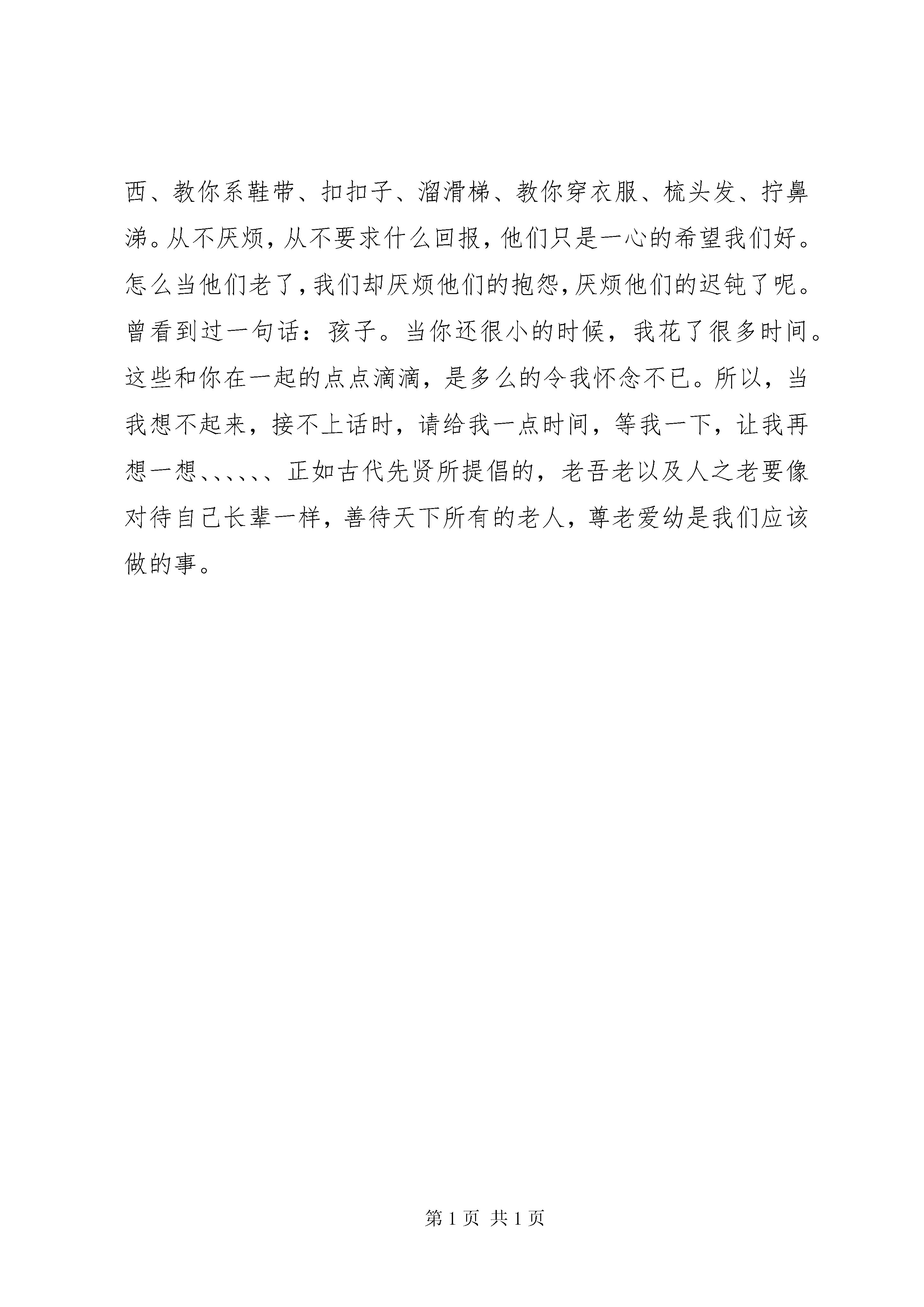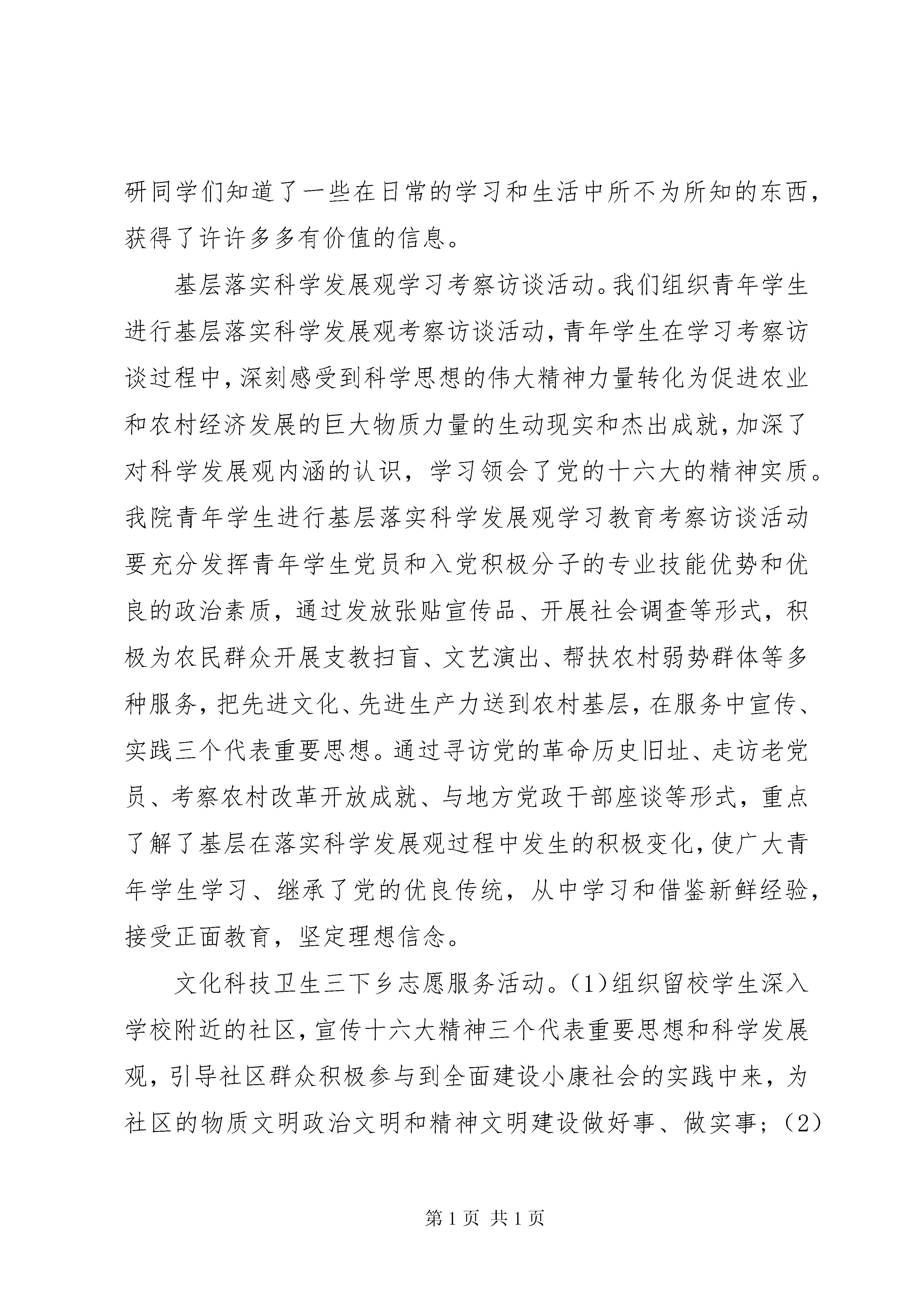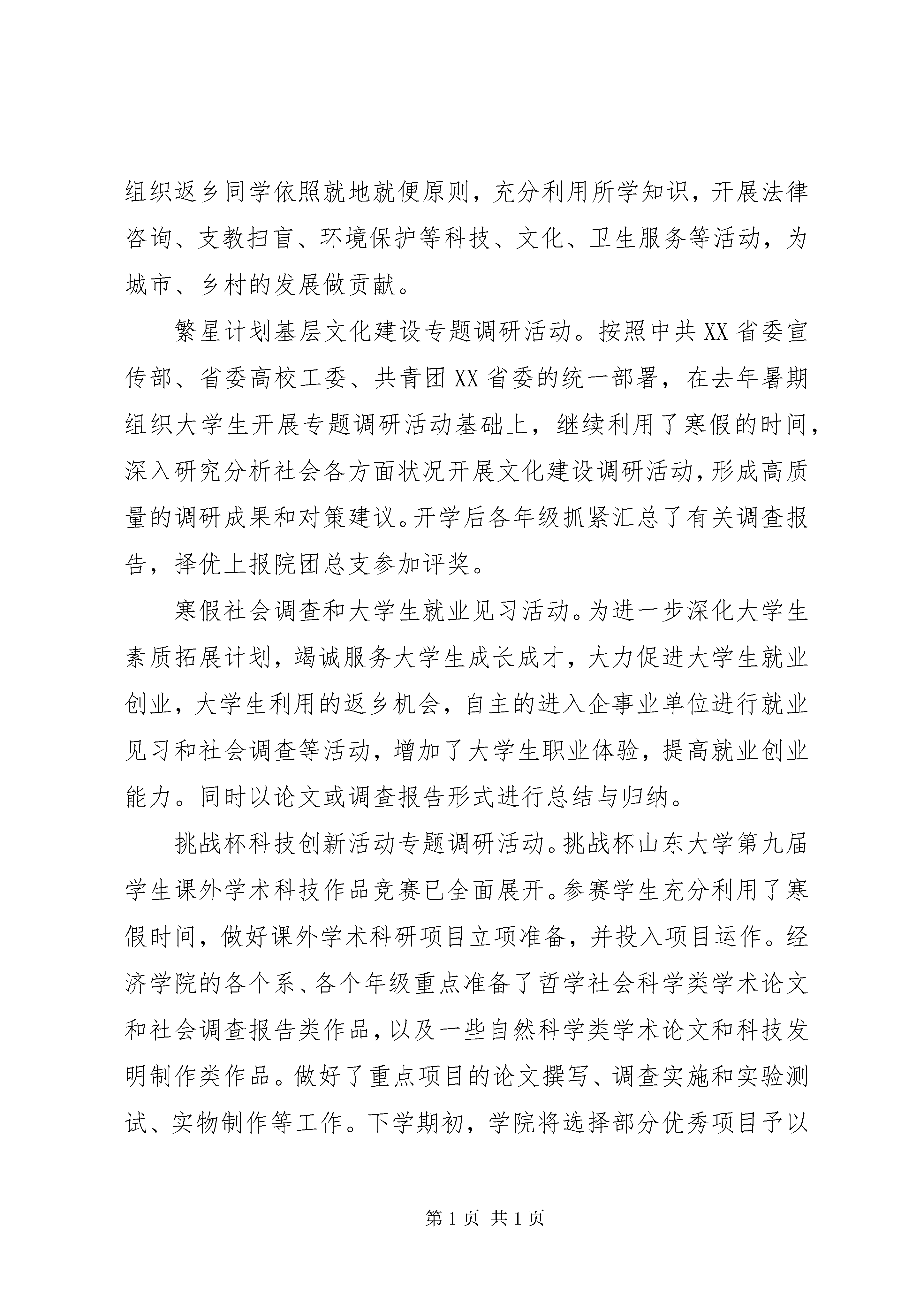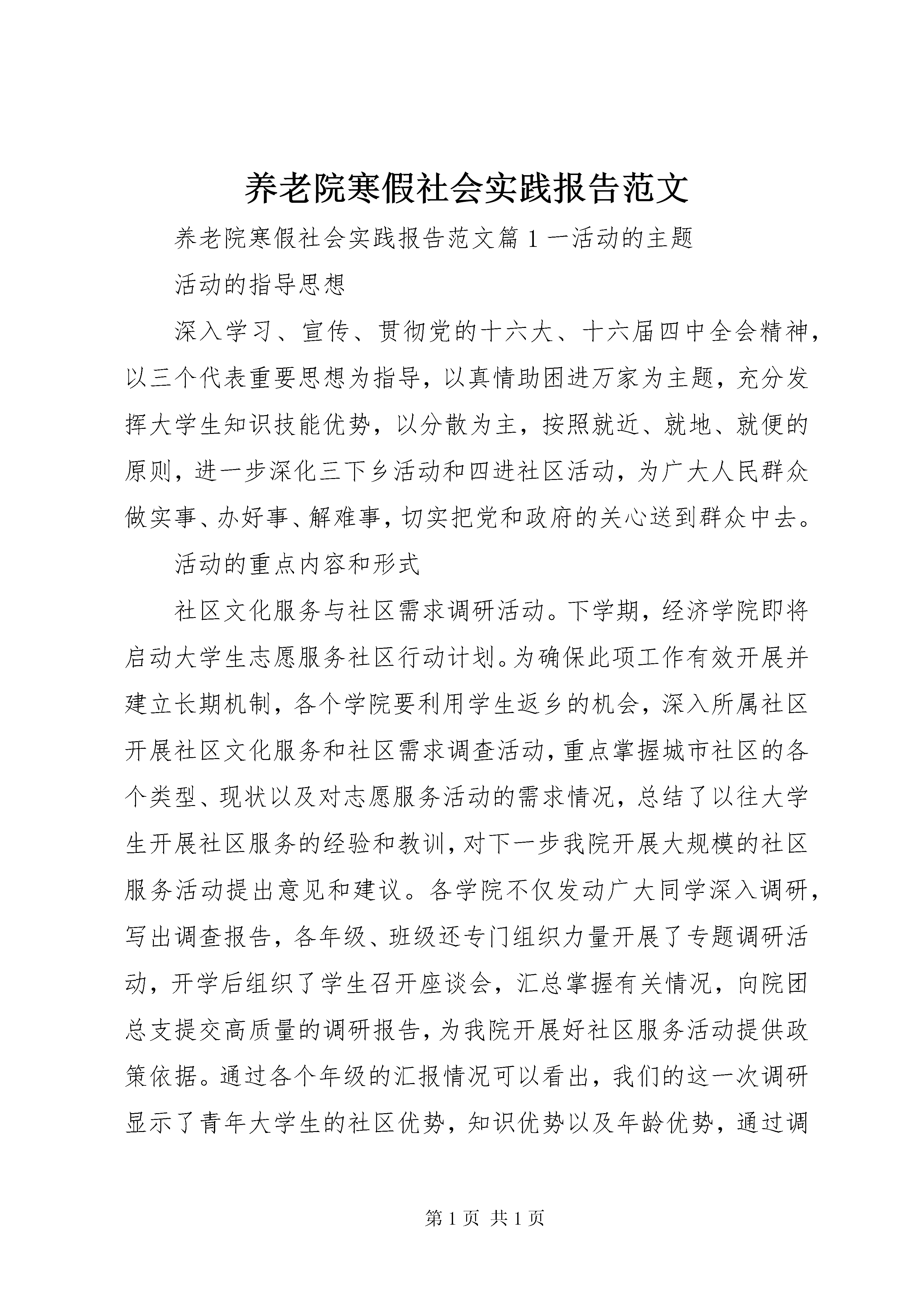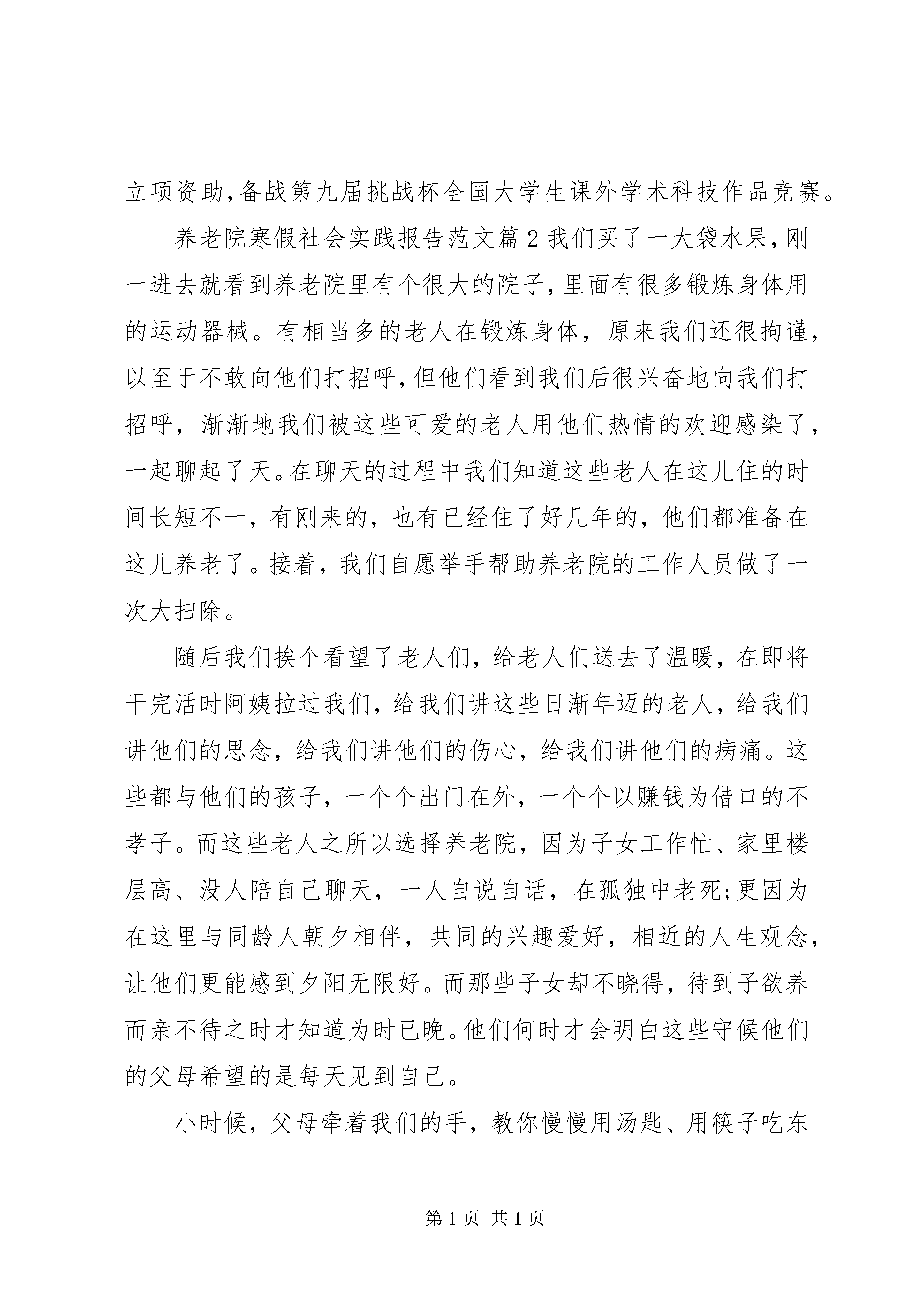 养老院寒假社会实践报告范文养老院寒假社会实践报告范文篇1一活动的主题活动的指导思想深入学习、宣传、贯彻党的十六大、十六届四中全会精神,以三个代表重要思想为指导,以真情助困进万家为主题,充分发挥大学生知识技能优势,以分散为主,按照就近、就地、就便的原则,进一步深化三下乡活动和四进社区活动,为广大人民群众做实事、办好事、解难事,切实把党和政府的关心送到群众中去。活动的重点内容和形式社区文化服务与社区需求调研活动。下学期,经济学院即将启动大学生志愿服务社区行动计划。为确保此项工作有效开展并建立长期机制,各个学院要利用学生返乡的机会,深入所属社区开展社区文化服务和社区需求调查活动,重点掌握城市社区的各个类型、现状以及对志愿服务活动的需求情况,总结了以往大学生开展社区服务的经验和教训,对下一步我院开展大规模的社区服务活动提出意见和建议。各学院不仅发动广大同学深入调研,写出调查报告,各年级、班级还专门组织力量开展了专题调研活动,开学后组织了学生召开座谈会,汇总掌握有关情况,向院团总支提交高质量的调研报告,为我院开展好社区服务活动提供政策依据。通过各个年级的汇报情况可以看出,我们的这一次调研显示了青年大学生的社区优势,知识优势以及年龄优势,通过调研同学们知道了一些在日常的学习和生活中所不为所知的东西,获得了许许多多有价值的信息。基层落实科学发展观学习考察访谈活动。我们组织青年学生进行基层落实科学发展观考察访谈活动,青年学生在学习考察访谈过程中,深刻感受到科学思想的伟大精神力量转化为促进农业和农村经济发展的巨大物质力量的生动现实和杰出成就,加深了对科学发展观内涵的认识,学习领会了党的十六大的精神实质。我院青年学生进行基层落实科学发展观学习教育考察访谈活动要充分发挥青年学生党员和入党积极分子的专业技能优势和优良的政治素质,通过发放张贴宣传品、开展社会调查等形式,积极为农民群众开展支教扫盲、文艺演出、帮扶农村弱势群体等多种服务,把先进文化、先进生产力送到农村基层,在服务中宣传、实践三个代表重要思想。通过寻访党的革命历史旧址、走访老党员、考察农村改革开放成就、与地方党政干部座谈等形式,重点了解了基层在落实科学发展观过程中发生的积极变化,使广大青年学生学习、继承了党的优良传统,从中学习和借鉴新鲜经验,接受正面教育,坚定理想信念。文化科技卫生三下乡志愿服务活动。(1)组织留校学生深入学校附近的社区,宣传十六大精神三个代表重要思想和科学发展观,引导社区群众积极参与到全面建设小康社会的实践中来,为社区的物质文明政治文明和精神文明建设做好事、做实事;(2)组织返乡同学依照就地就便原则,充分利用所学知识,开展法律咨询、支教扫盲、环境保护等科技、文化、卫生服务等活动,为城市、乡村的发展做贡献。繁星计划基层文化建设专题调研活动。按照中共XX省委宣传部、省委高校工委、共青团XX省委的统一部署,在去年暑期组织大学生开展专题调研活动基础上,继续利用了寒假的时间,深入研究分析社会各方面状况开展文化建设调研活动,形成高质量的调研成果和对策建议。开学后各年级抓紧汇总了有关调查报告,择优上报院团总支参加评奖。寒假社会调查和大学生就业见习活动。为进一步深化大学生素质拓展计划,竭诚服务大学生成长成才,大力促进大学生就业创业,大学生利用的返乡机会,自主的进入企事业单位进行就业见习和社会调查等活动,增加了大学生职业体验,提高就业创业能力。同时以论文或调查报告形式进行总结与归纳。挑战杯科技创新活动专题调研活动。挑战杯山东大学第九届学生课外学术科技作品竞赛已全面展开。参赛学生充分利用了寒假时间,做好课外学术科研项目立项准备,并投入项目运作。经济学院的各个系、各个年级重点准备了哲学社会科学类学术论文和社会调查报告类作品,以及一些自然科学类学术论文和科技发明制作类作品。做好了重点项目的论文撰写、调查实施和实验测试、实物制作等工作。下学期初,学院将选择部分优秀项目予以立项资助,备战第九届挑战杯全国大学生课外学术科技作品竞赛。养老院寒假社会实践报告范文篇2我们买了一大袋水果,刚一进去就看到养老院里有个很大的院子,里面有很多锻炼身体用的运动器械。有相当多的老人在锻炼身体,原来我们还很拘谨,以至于不敢向他们打招呼,但他们看到我们后很兴奋地向我们打招呼,渐渐地我们被这些可爱的老人用他们热情的欢迎感染了,一起聊起了天。在聊天的过程中我们知道这些老人在这儿住的时间长短不一,有刚来的,也有已经住了好几年的,他们都准备在这儿养老了。接着,我们自愿举手帮助养老院的工作人员做了一次大扫除。随后我们挨个看望了老人们,给老人们送去了温暖,在即将干完活时阿姨拉过我们,给我们讲这些日渐年迈的老人,给我们讲他们的思念,给我们讲他们的伤心,给我们讲他们的病痛。这些都与他们的孩子,一个个出门在外,一个个