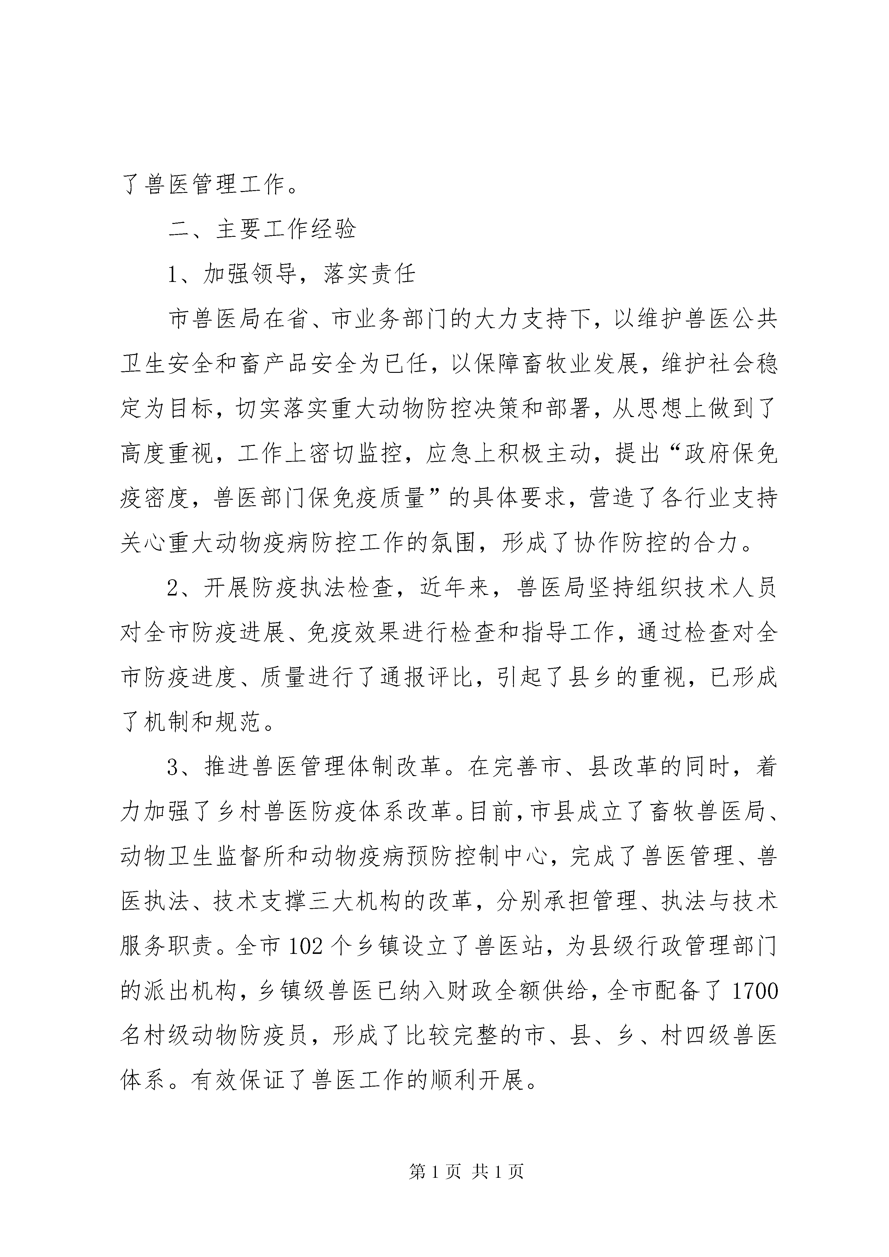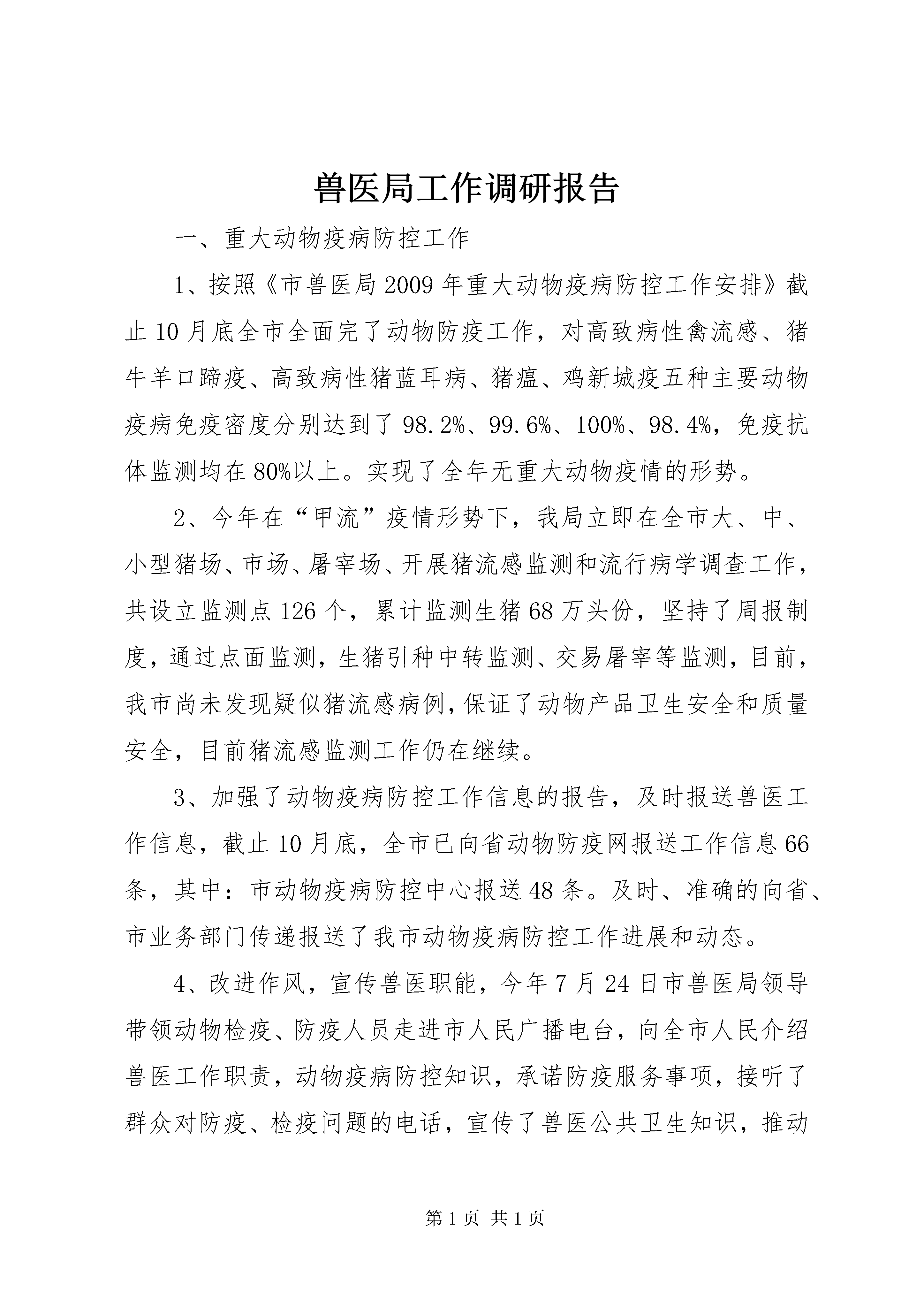 兽医局工作调研报告一、重大动物疫病防控工作1、按照《市兽医局2009年重大动物疫病防控工作安排》截止10月底全市全面完了动物防疫工作,对高致病性禽流感、猪牛羊口蹄疫、高致病性猪蓝耳病、猪瘟、鸡新城疫五种主要动物疫病免疫密度分别达到了98.2%、99.6%、100%、98.4%,免疫抗体监测均在80%以上。实现了全年无重大动物疫情的形势。2、今年在“甲流”疫情形势下,我局立即在全市大、中、小型猪场、市场、屠宰场、开展猪流感监测和流行病学调查工作,共设立监测点126个,累计监测生猪68万头份,坚持了周报制度,通过点面监测,生猪引种中转监测、交易屠宰等监测,目前,我市尚未发现疑似猪流感病例,保证了动物产品卫生安全和质量安全,目前猪流感监测工作仍在继续。3、加强了动物疫病防控工作信息的报告,及时报送兽医工作信息,截止10月底,全市已向省动物防疫网报送工作信息66条,其中:市动物疫病防控中心报送48条。及时、准确的向省、市业务部门传递报送了我市动物疫病防控工作进展和动态。4、改进作风,宣传兽医职能,今年7月24日市兽医局领导带领动物检疫、防疫人员走进市人民广播电台,向全市人民介绍兽医工作职责,动物疫病防控知识,承诺防疫服务事项,接听了群众对防疫、检疫问题的电话,宣传了兽医公共卫生知识,推动了兽医管理工作。二、主要工作经验1、加强领导,落实责任市兽医局在省、市业务部门的大力支持下,以维护兽医公共卫生安全和畜产品安全为已任,以保障畜牧业发展,维护社会稳定为目标,切实落实重大动物防控决策和部署,从思想上做到了高度重视,工作上密切监控,应急上积极主动,提出“政府保免疫密度,兽医部门保免疫质量”的具体要求,营造了各行业支持关心重大动物疫病防控工作的氛围,形成了协作防控的合力。2、开展防疫执法检查,近年来,兽医局坚持组织技术人员对全市防疫进展、免疫效果进行检查和指导工作,通过检查对全市防疫进度、质量进行了通报评比,引起了县乡的重视,已形成了机制和规范。3、推进兽医管理体制改革。在完善市、县改革的同时,着力加强了乡村兽医防疫体系改革。目前,市县成立了畜牧兽医局、动物卫生监督所和动物疫病预防控制中心,完成了兽医管理、兽医执法、技术支撑三大机构的改革,分别承担管理、执法与技术服务职责。全市102个乡镇设立了兽医站,为县级行政管理部门的派出机构,乡镇级兽医已纳入财政全额供给,全市配备了1700名村级动物防疫员,形成了比较完整的市、县、乡、村四级兽医体系。有效保证了兽医工作的顺利开展。4、加强了兽医队伍建设。针对各级管理、执法、技术人员实际工作能力和水平现状,我们在全市先后开展了大规模的培训,共举办饲料兽药管理及经营业主培训班8期500名;对全市200多名乡站兽医和1700名村级防疫员进行了疫病防控技术培训,和平凉农校联合开设了兽医专业学历教育班,对在职的各级人员开展学历教育,从根本上提高专业知识水平。5、全面完成了乡镇兽医站项目建设共104个。其中新建69个,改建35个,全面夯实了基层兽医站基础建设。