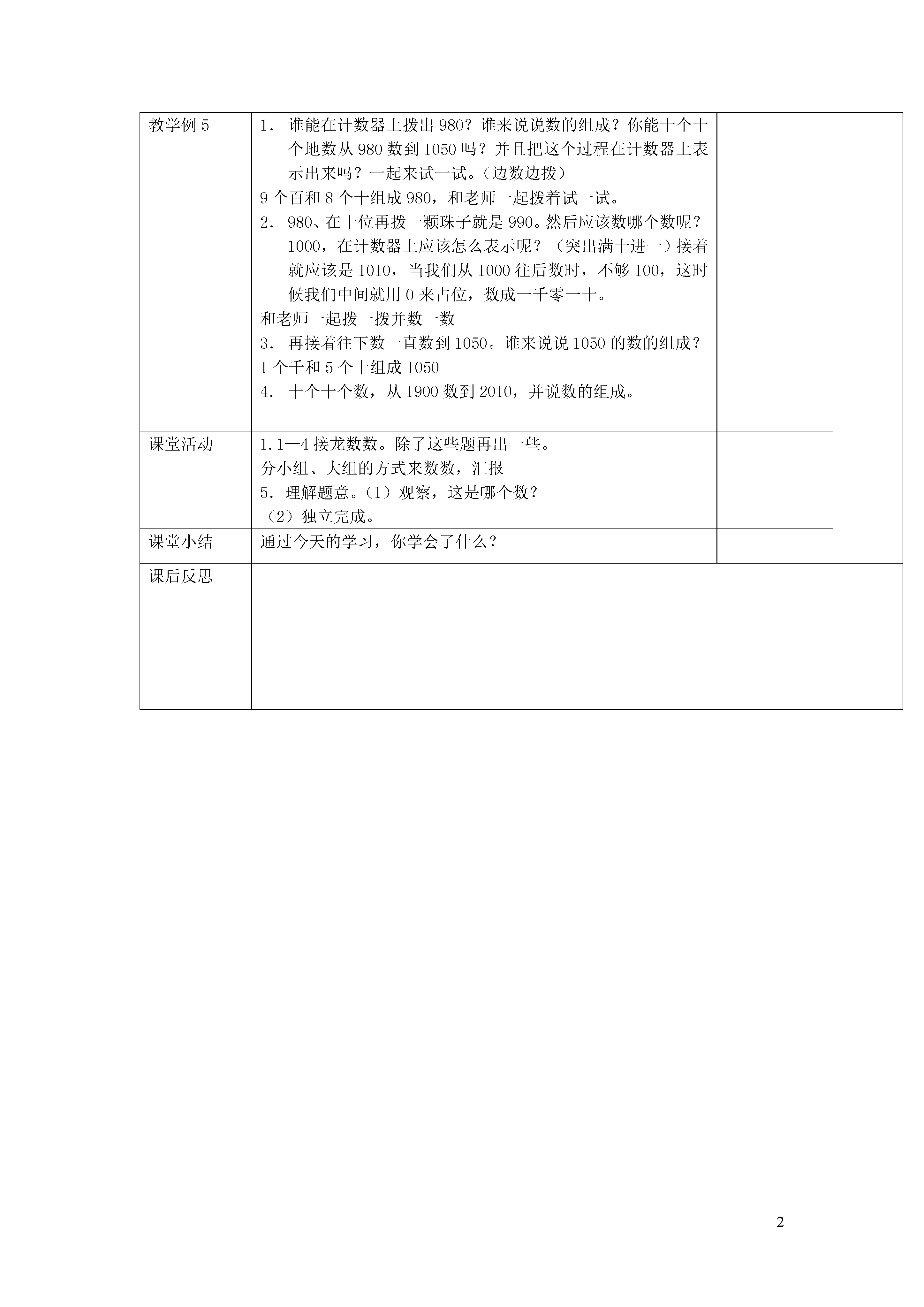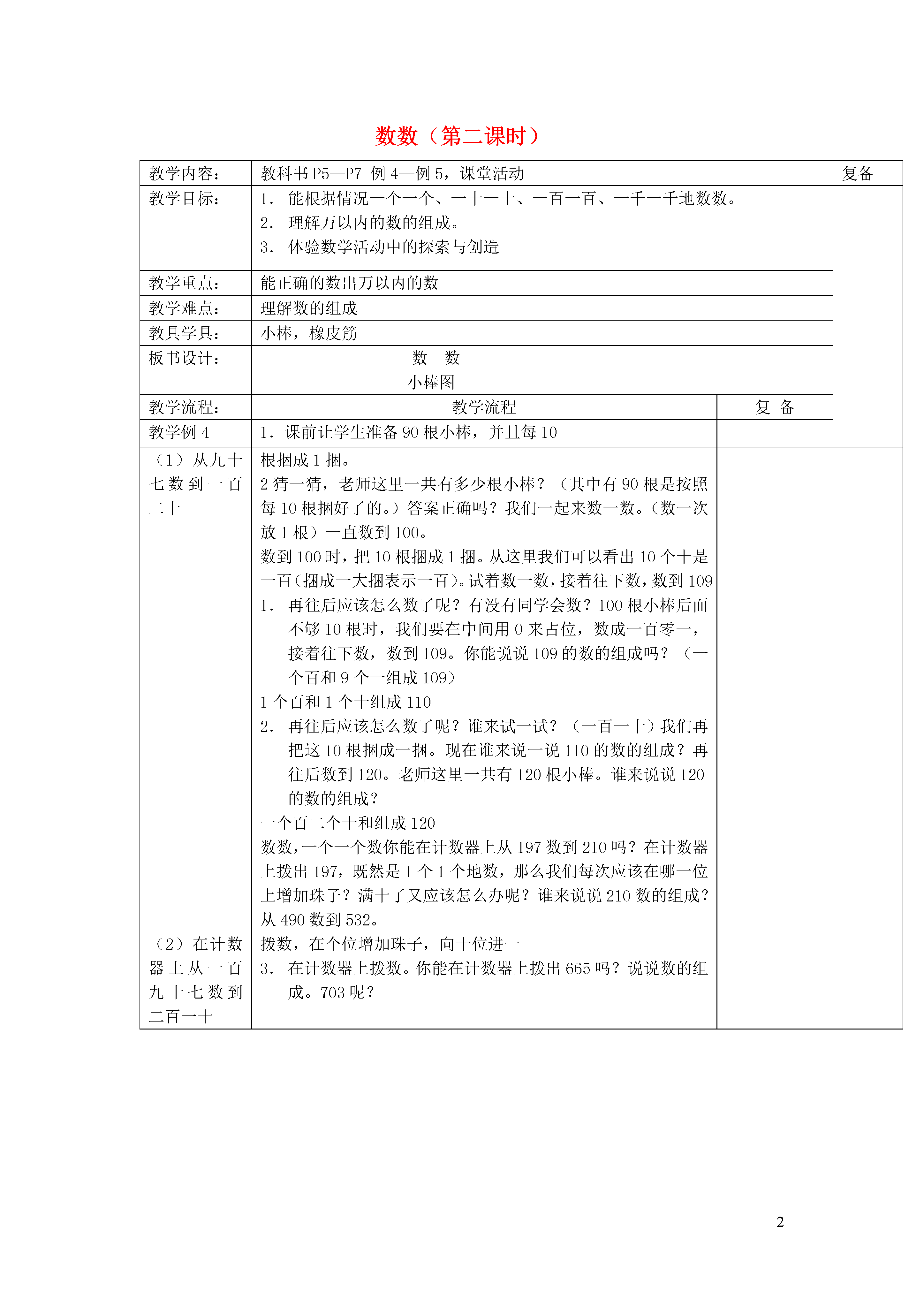 2数数(第二课时)教学内容:教科书P5—P7例4—例5,课堂活动复备教学目标:能根据情况一个一个、一十一十、一百一百、一千一千地数数。理解万以内的数的组成。体验数学活动中的探索与创造教学重点:能正确的数出万以内的数教学难点:理解数的组成教具学具:小棒,橡皮筋板书设计:数数小棒图教学流程:教学流程复备教学例41.课前让学生准备90根小棒,并且每10(1)从九十七数到一百二十(2)在计数器上从一百九十七数到二百一十根捆成1捆。2猜一猜,老师这里一共有多少根小棒?(其中有90根是按照每10根捆好了的。)答案正确吗?我们一起来数一数。(数一次放1根)一直数到100。数到100时,把10根捆成1捆。从这里我们可以看出10个十是一百(捆成一大捆表示一百)。试着数一数,接着往下数,数到109再往后应该怎么数了呢?有没有同学会数?100根小棒后面不够10根时,我们要在中间用0来占位,数成一百零一,接着往下数,数到109。你能说说109的数的组成吗?(一个百和9个一组成109)1个百和1个十组成110再往后应该怎么数了呢?谁来试一试?(一百一十)我们再把这10根捆成一捆。现在谁来说一说110的数的组成?再往后数到120。老师这里一共有120根小棒。谁来说说120的数的组成?一个百二个十和组成120数数,一个一个数你能在计数器上从197数到210吗?在计数器上拨出197,既然是1个1个地数,那么我们每次应该在哪一位上增加珠子?满十了又应该怎么办呢?谁来说说210数的组成?从490数到532。拨数,在个位增加珠子,向十位进一在计数器上拨数。你能在计数器上拨出665吗?说说数的组成。703呢?教学例5谁能在计数器上拨出980?谁来说说数的组成?你能十个十个地数从980数到1050吗?并且把这个过程在计数器上表示出来吗?一起来试一试。(边数边拨)9个百和8个十组成980,和老师一起拨着试一试。980、在十位再拨一颗珠子就是990。然后应该数哪个数呢?1000,在计数器上应该怎么表示呢?(突出满十进一)接着就应该是1010,当我们从1000往后数时,不够100,这时候我们中间就用0来占位,数成一千零一十。和老师一起拨一拨并数一数再接着往下数一直数到1050。谁来说说1050的数的组成?1个千和5个十组成1050十个十个数,从1900数到2010,并说数的组成。课堂活动1.1—4接龙数数。除了这些题再出一些。分小组、大组的方式来数数,汇报5.理解题意。(1)观察,这是哪个数?(2)独立完成。课堂小结通过今天的学习,你学会了什么?课后反思