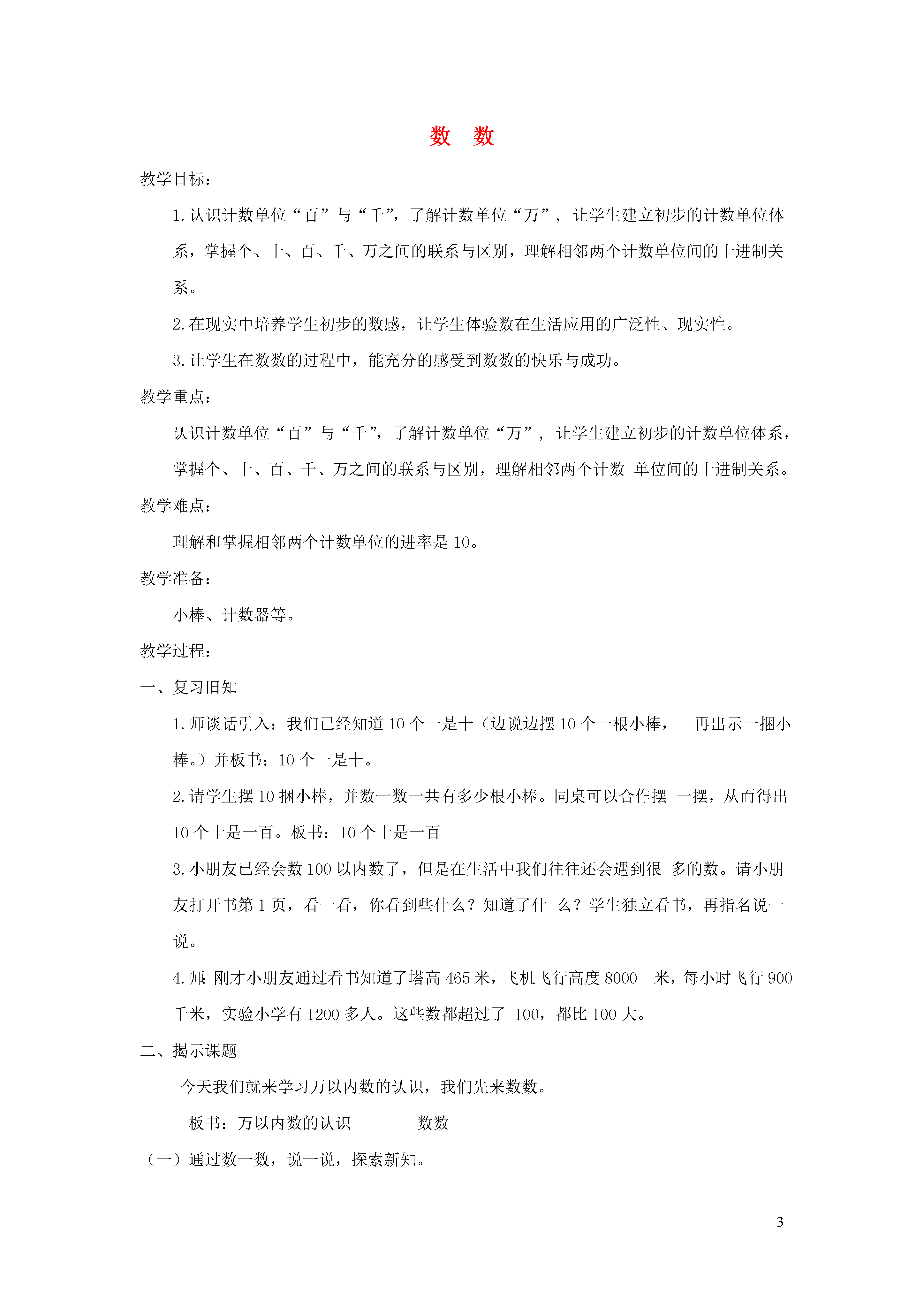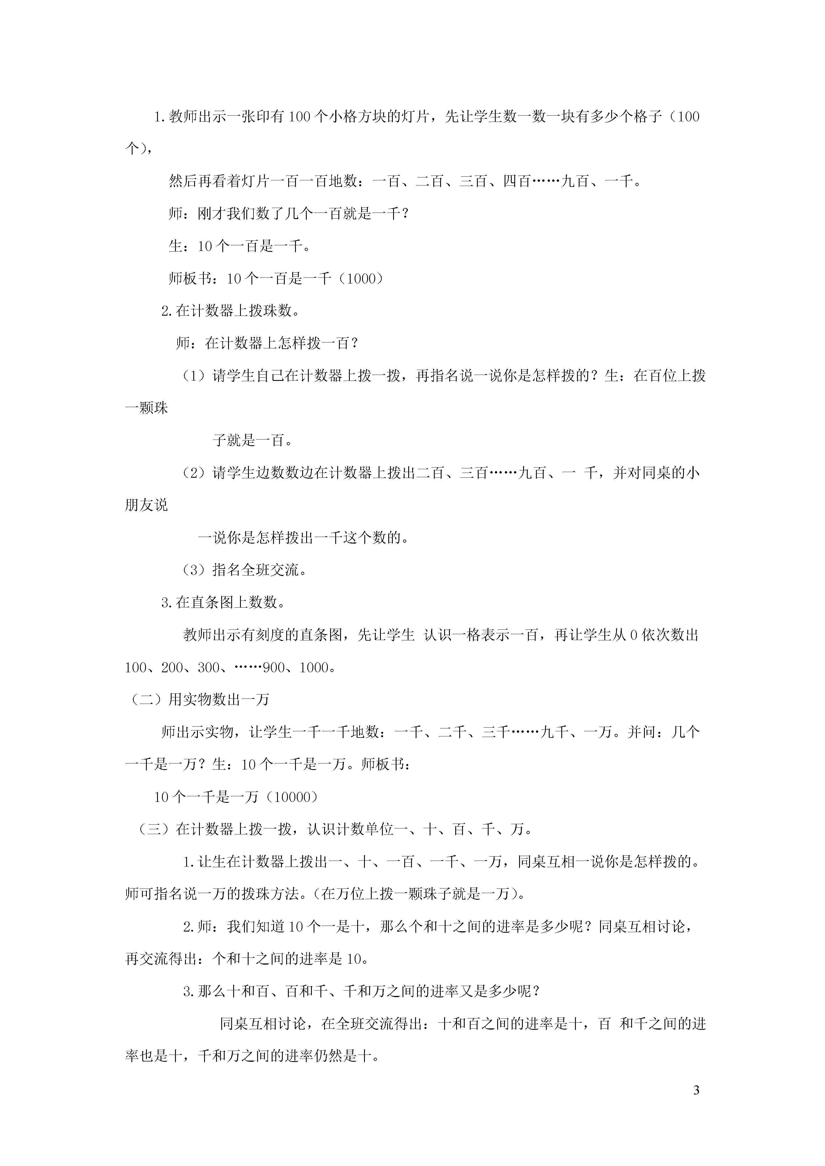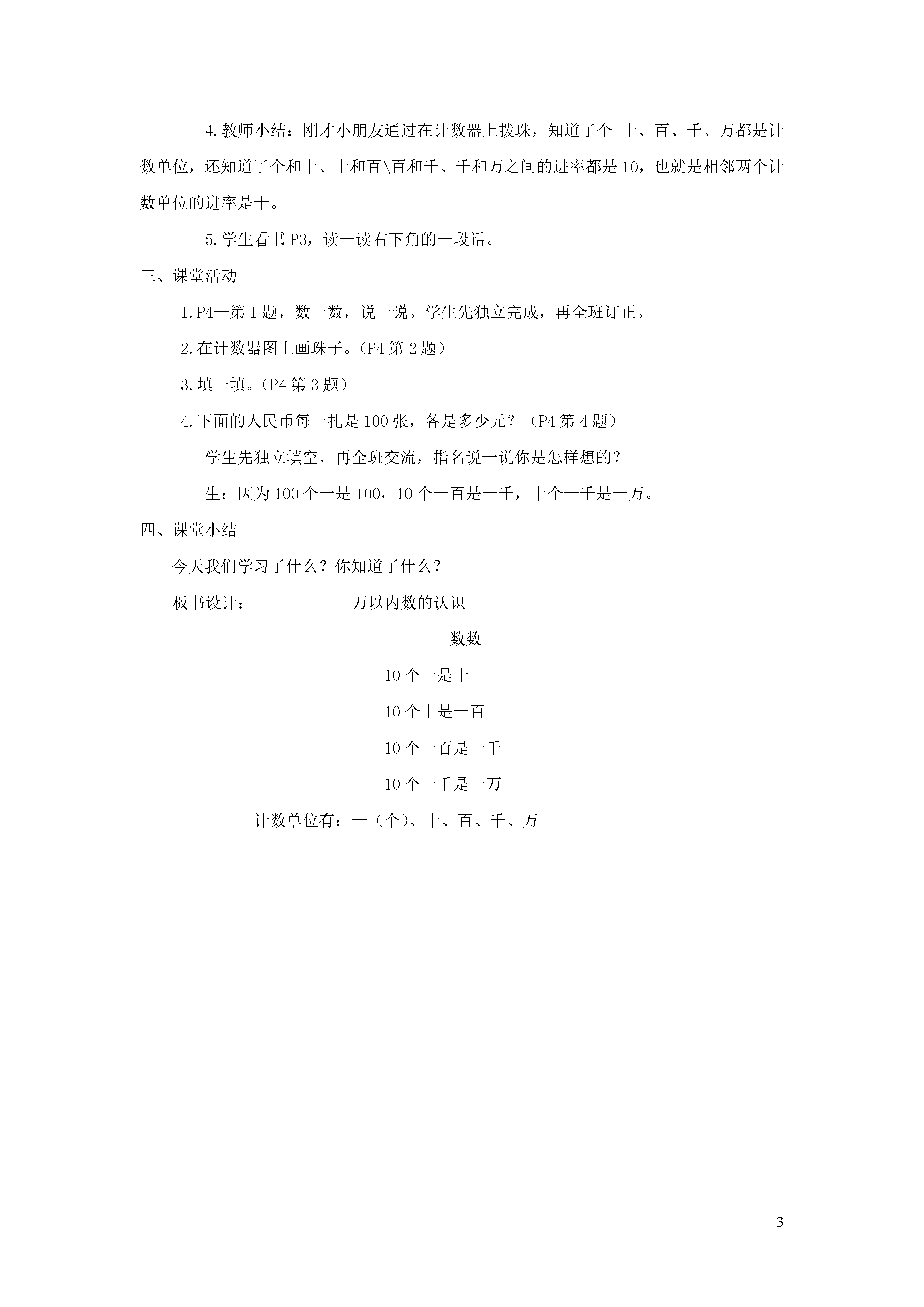 3数数教学目标:1.认识计数单位“百”与“千”,了解计数单位“万”,让学生建立初步的计数单位体系,掌握个、十、百、千、万之间的联系与区别,理解相邻两个计数单位间的十进制关系。2.在现实中培养学生初步的数感,让学生体验数在生活应用的广泛性、现实性。3.让学生在数数的过程中,能充分的感受到数数的快乐与成功。教学重点:认识计数单位“百”与“千”,了解计数单位“万”,让学生建立初步的计数单位体系,掌握个、十、百、千、万之间的联系与区别,理解相邻两个计数单位间的十进制关系。教学难点:理解和掌握相邻两个计数单位的进率是10。教学准备:小棒、计数器等。教学过程:一、复习旧知1.师谈话引入:我们已经知道10个一是十(边说边摆10个一根小棒,再出示一捆小棒。)并板书:10个一是十。2.请学生摆10捆小棒,并数一数一共有多少根小棒。同桌可以合作摆一摆,从而得出10个十是一百。板书:10个十是一百3.小朋友已经会数100以内数了,但是在生活中我们往往还会遇到很多的数。请小朋友打开书,看一看,你看到些什么?知道了什么?学生独立看书,再指名说一说。4.师:刚才小朋友通过看书知道了塔高465米,飞机飞行高度8000米,每小时飞行900千米,实验小学有1200多人。这些数都超过了100,都比100大。二、揭示课题今天我们就来学习万以内数的认识,我们先来数数。板书:万以内数的认识数数(一)通过数一数,说一说,探索新知。1.教师出示一张印有100个小格方块的灯片,先让学生数一数一块有多少个格子(100个),然后再看着灯片一百一百地数:一百、二百、三百、四百……九百、一千。师:刚才我们数了几个一百就是一千?生:10个一百是一千。师板书:10个一百是一千(1000)2.在计数器上拨珠数。师:在计数器上怎样拨一百?(1)请学生自己在计数器上拨一拨,再指名说一说你是怎样拨的?生:在百位上拨一颗珠子就是一百。(2)请学生边数数边在计数器上拨出二百、三百……九百、一千,并对同桌的小朋友说一说你是怎样拨出一千这个数的。(3)指名全班交流。3.在直条图上数数。教师出示有刻度的直条图,先让学生认识一格表示一百,再让学生从0依次数出100、200、300、……900、1000。(二)用实物数出一万师出示实物,让学生一千一千地数:一千、二千、三千……九千、一万。并问:几个一千是一万?生:10个一千是一万。师板书:10个一千是一万(10000)(三)在计数器上拨一拨,认识计数单位一、十、百、千、万。1.让生在计数器上拨出一、十、一百、一千、一万,同桌互相一说你是怎样拨的。师可指名说一万的拨珠方法。(在万位上拨一颗珠子就是一万)。2.师:我们知道10个一是十,那么个和十之间的进率是多少呢?同桌互相讨论,再交流得出:个和十之间的进率是10。3.那么十和百、百和千、千和万之间的进率又是多少呢?同桌互相讨论,在全班交流得出:十和百之间的进率是十,百和千之间的进率也是十,千和万之间的进率仍然是十。4.教师小结:刚才小朋友通过在计数器上拨珠,知道了个十、百、千、万都是计数单位,还知道了个和十、十和百\百和千、千和万之间的进率都是10,也就是相邻两个计数单位的进率是十。5.学生看书P3,读一读右下角的一段话。三、课堂活动1.P4—第1题,数一数,说一说。学生先独立完成,再全班订正。2.在计数器图上画珠子。(P4第2题)3.填一填。(P4第3题)4.下面的人民币每一扎是100张,各是多少元?(P4第4题)学生先独立填空,再全班交流,指名说一说你是怎样想的?生:因为100个一是100,10个一百是一千,十个一千是一万。四、课堂小结今天我们学习了什么?你知道了什么?板书设计:万以内数的认识数数10个一是十10个十是一百10个一百是一千10个一千是一万计数单位有:一(个)、十、百、千、万