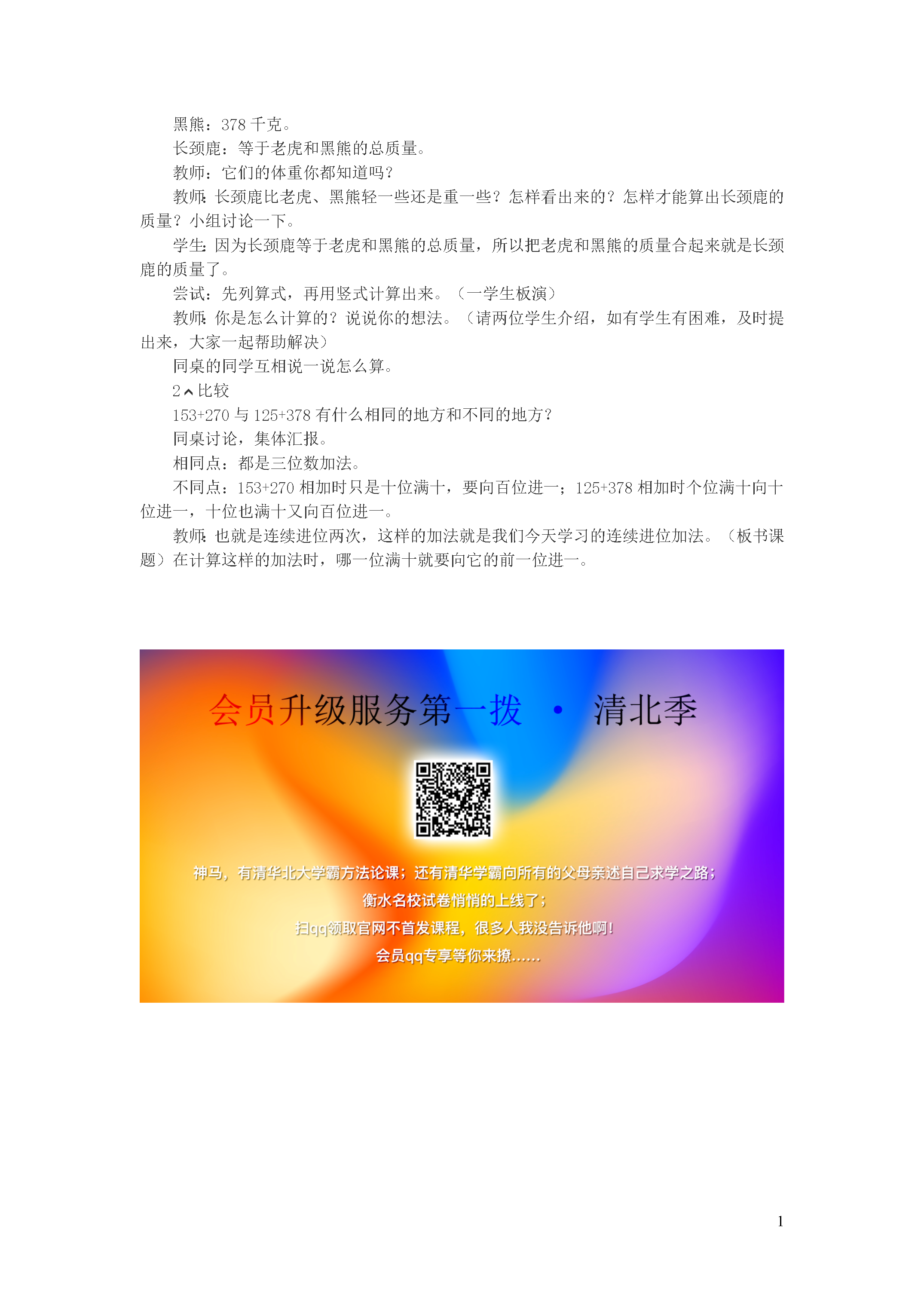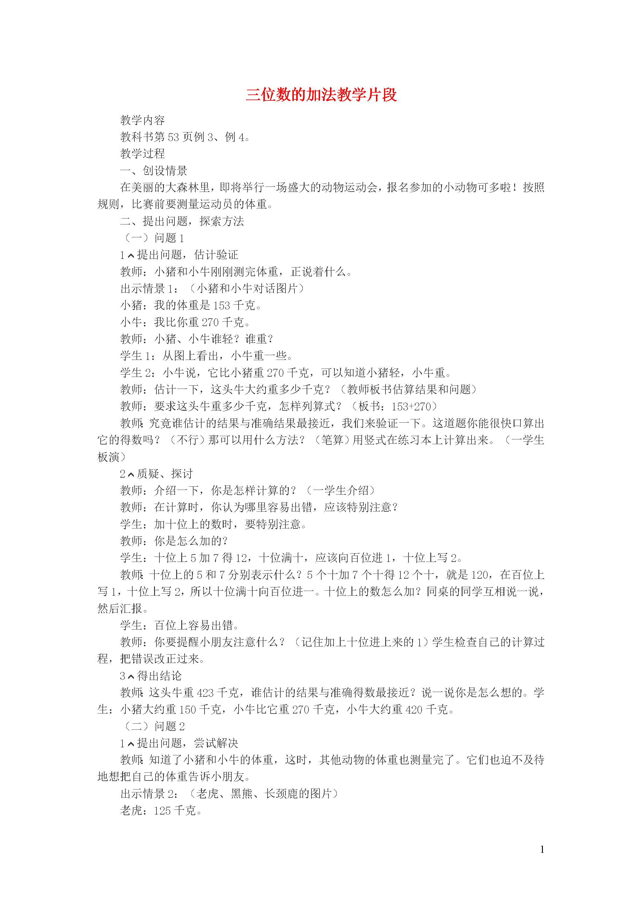 1三位数的加法教学片段教学内容教科书例3、例4。教学过程一、创设情景在美丽的大森林里,即将举行一场盛大的动物运动会,报名参加的小动物可多啦!按照规则,比赛前要测量运动员的体重。二、提出问题,探索方法(一)问题11提出问题,估计验证教师:小猪和小牛刚刚测完体重,正说着什么。出示情景1:(小猪和小牛对话图片)小猪:我的体重是153千克。小牛:我比你重270千克。教师:小猪、小牛谁轻?谁重?学生1:从图上看出,小牛重一些。学生2:小牛说,它比小猪重270千克,可以知道小猪轻,小牛重。教师:估计一下,这头牛大约重多少千克?(教师板书估算结果和问题)教师:要求这头牛重多少千克,怎样列算式?(板书:153+270)教师:究竟谁估计的结果与准确结果最接近,我们来验证一下。这道题你能很快口算出它的得数吗?(不行)那可以用什么方法?(笔算)用竖式在练习本上计算出来。(一学生板演)2质疑、探讨教师:介绍一下,你是怎样计算的?(一学生介绍)教师:在计算时,你认为哪里容易出错,应该特别注意?学生:加十位上的数时,要特别注意。教师:你是怎么加的?学生:十位上5加7得12,十位满十,应该向百位进1,十位上写2。教师:十位上的5和7分别表示什么?5个十加7个十得12个十,就是120,在百位上写1,十位上写2,所以十位满十向百位进一。十位上的数怎么加?同桌的同学互相说一说,然后汇报。学生:百位上容易出错。教师:你要提醒小朋友注意什么?(记住加上十位进上来的1)学生检查自己的计算过程,把错误改正过来。3得出结论教师:这头牛重423千克,谁估计的结果与准确得数最接近?说一说你是怎么想的。学生:小猪大约重150千克,小牛比它重270千克,小牛大约重420千克。(二)问题21提出问题,尝试解决教师:知道了小猪和小牛的体重,这时,其他动物的体重也测量完了。它们也迫不及待地想把自己的体重告诉小朋友。出示情景2:(老虎、黑熊、长颈鹿的图片)老虎:125千克。黑熊:378千克。长颈鹿:等于老虎和黑熊的总质量。教师:它们的体重你都知道吗?教师:长颈鹿比老虎、黑熊轻一些还是重一些?怎样看出来的?怎样才能算出长颈鹿的质量?小组讨论一下。学生:因为长颈鹿等于老虎和黑熊的总质量,所以把老虎和黑熊的质量合起来就是长颈鹿的质量了。尝试:先列算式,再用竖式计算出来。(一学生板演)教师:你是怎么计算的?说说你的想法。(请两位学生介绍,如有学生有困难,及时提出来,大家一起帮助解决)同桌的同学互相说一说怎么算。2比较153+270与125+378有什么相同的地方和不同的地方?同桌讨论,集体汇报。相同点:都是三位数加法。不同点:153+270相加时只是十位满十,要向百位进一;125+378相加时个位满十向十位进一,十位也满十又向百位进一。教师:也就是连续进位两次,这样的加法就是我们今天学习的连续进位加法。(板书课题)在计算这样的加法时,哪一位满十就要向它的前一位进一。