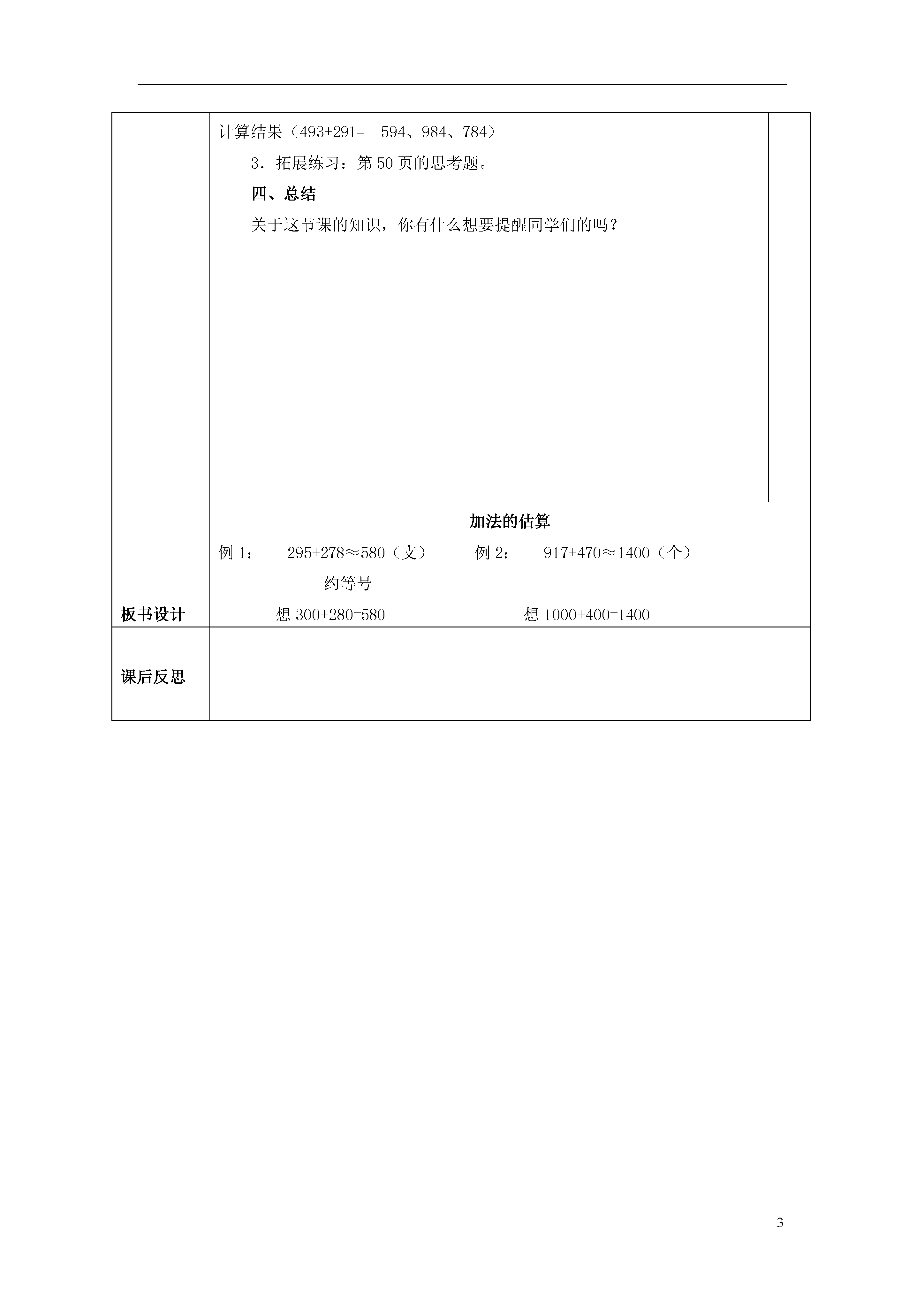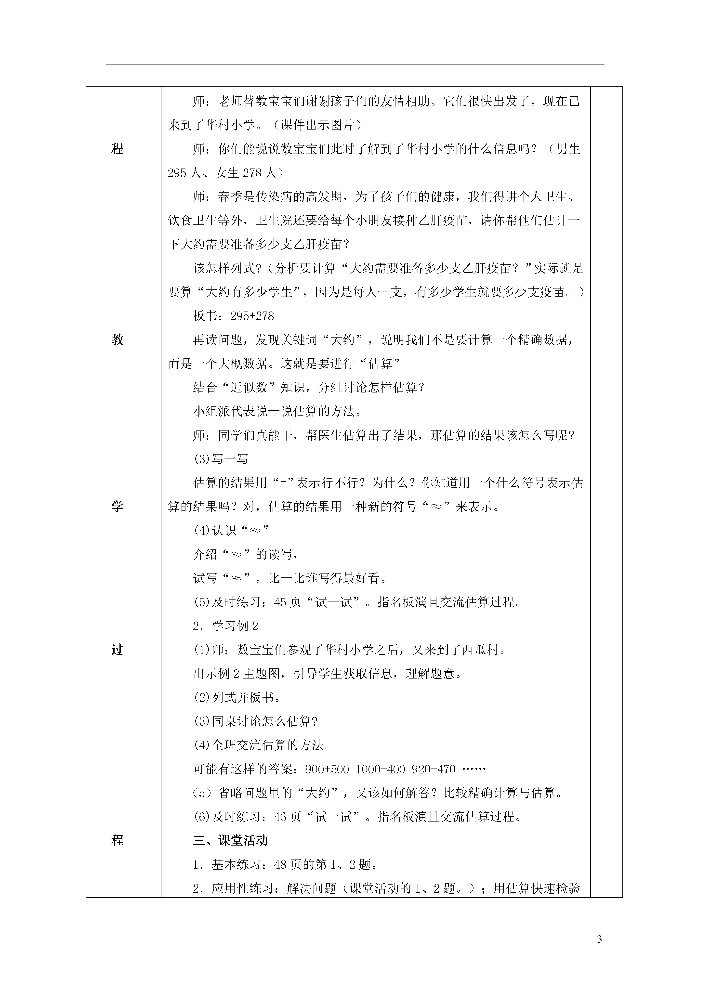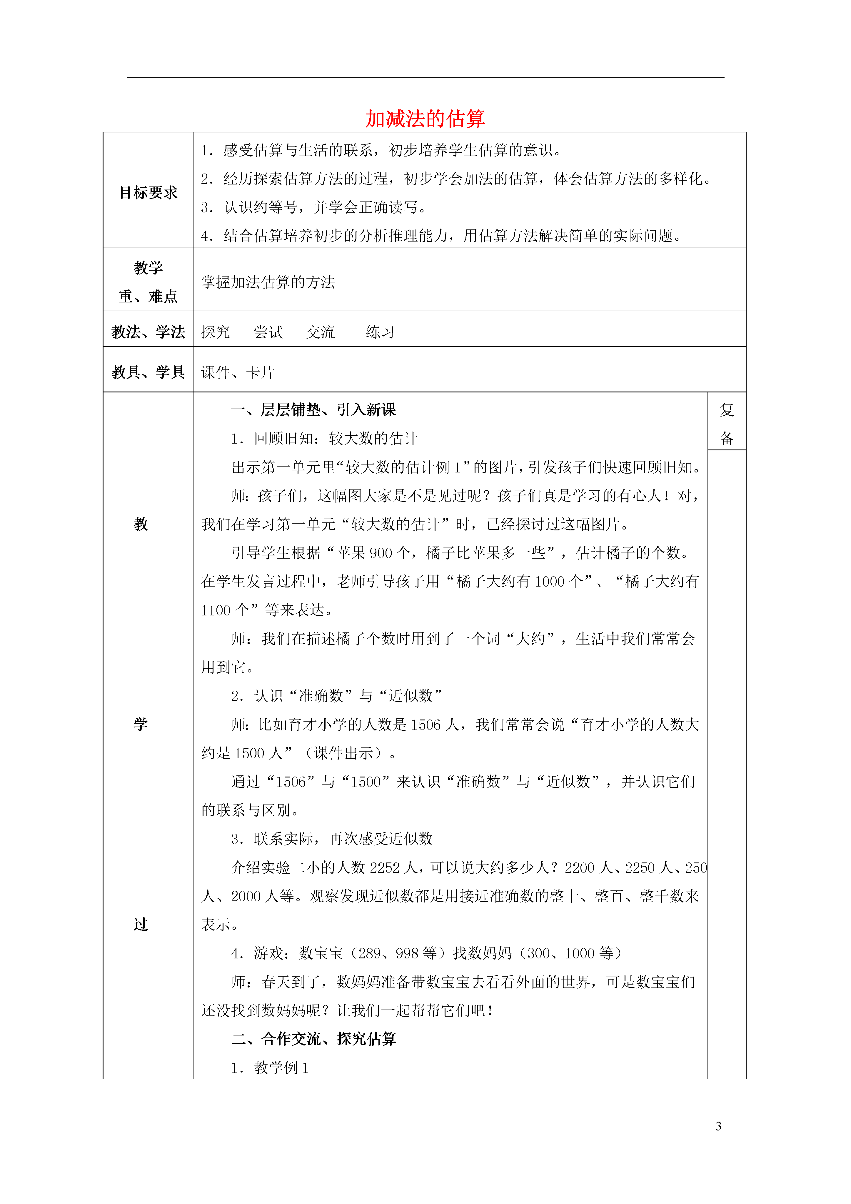 3加减法的估算目标要求1.感受估算与生活的联系,初步培养学生估算的意识。2.经历探索估算方法的过程,初步学会加法的估算,体会估算方法的多样化。3.认识约等号,并学会正确读写。4.结合估算培养初步的分析推理能力,用估算方法解决简单的实际问题。教学重、难点掌握加法估算的方法教法、学法探究尝试交流练习教具、学具课件、卡片教学过程教学过程一、层层铺垫、引入新课1.回顾旧知:较大数的估计出示第一单元里“较大数的估计例1”的图片,引发孩子们快速回顾旧知。师:孩子们,这幅图大家是不是见过呢?孩子们真是学习的有心人!对,我们在学习第一单元“较大数的估计”时,已经探讨过这幅图片。引导学生根据“苹果900个,橘子比苹果多一些”,估计橘子的个数。在学生发言过程中,老师引导孩子用“橘子大约有1000个”、“橘子大约有1100个”等来表达。师:我们在描述橘子个数时用到了一个词“大约”,生活中我们常常会用到它。2.认识“准确数”与“近似数”师:比如育才小学的人数是1506人,我们常常会说“育才小学的人数大约是1500人”(课件出示)。通过“1506”与“1500”来认识“准确数”与“近似数”,并认识它们的联系与区别。3.联系实际,再次感受近似数介绍实验二小的人数2252人,可以说大约多少人?2200人、2250人、2500人、2000人等。观察发现近似数都是用接近准确数的整十、整百、整千数来表示。4.游戏:数宝宝(289、998等)找数妈妈(300、1000等)师:春天到了,数妈妈准备带数宝宝去看看外面的世界,可是数宝宝们还没找到数妈妈呢?让我们一起帮帮它们吧!二、合作交流、探究估算1.教学例1师:老师替数宝宝们谢谢孩子们的友情相助。它们很快出发了,现在已来到了华村小学。(课件出示图片)师:你们能说说数宝宝们此时了解到了华村小学的什么信息吗?(男生295人、女生278人)师:春季是传染病的高发期,为了孩子们的健康,我们得讲个人卫生、饮食卫生等外,卫生院还要给每个小朋友接种乙肝疫苗,请你帮他们估计一下大约需要准备多少支乙肝疫苗?该怎样列式?(分析要计算“大约需要准备多少支乙肝疫苗?”实际就是要算“大约有多少学生”,因为是每人一支,有多少学生就要多少支疫苗。)板书:295+278再读问题,发现关键词“大约”,说明我们不是要计算一个精确数据,而是一个大概数据。这就是要进行“估算”结合“近似数”知识,分组讨论怎样估算?小组派代表说一说估算的方法。师:同学们真能干,帮医生估算出了结果,那估算的结果该怎么写呢?(3)写一写估算的结果用“=”表示行不行?为什么?你知道用一个什么符号表示估算的结果吗?对,估算的结果用一种新的符号“≈”来表示。(4)认识“≈”介绍“≈”的读写,试写“≈”,比一比谁写得最好看。(5)及时练习:45页“试一试”。指名板演且交流估算过程。2.学习例2(1)师:数宝宝们参观了华村小学之后,又来到了西瓜村。出示例2主题图,引导学生获取信息,理解题意。(2)列式并板书。(3)同桌讨论怎么估算?(4)全班交流估算的方法。可能有这样的答案:900+5001000+400920+470……(5)省略问题里的“大约”,又该如何解答?比较精确计算与估算。(6)及时练习:46页“试一试”。指名板演且交流估算过程。三、课堂活动1.基本练习:48页的第1、2题。2.应用性练习:解决问题(课堂活动的1、2题。);用估算快速检验计算结果(493+291=594、984、784)3.拓展练习:的思考题。四、总结关于这节课的知识,你有什么想要提醒同学们的吗?复备板书设计加法的估算例1:295+278≈580(支)例2:917+470≈1400(个)约等号想300+280=580想1000+400=1400课后反思