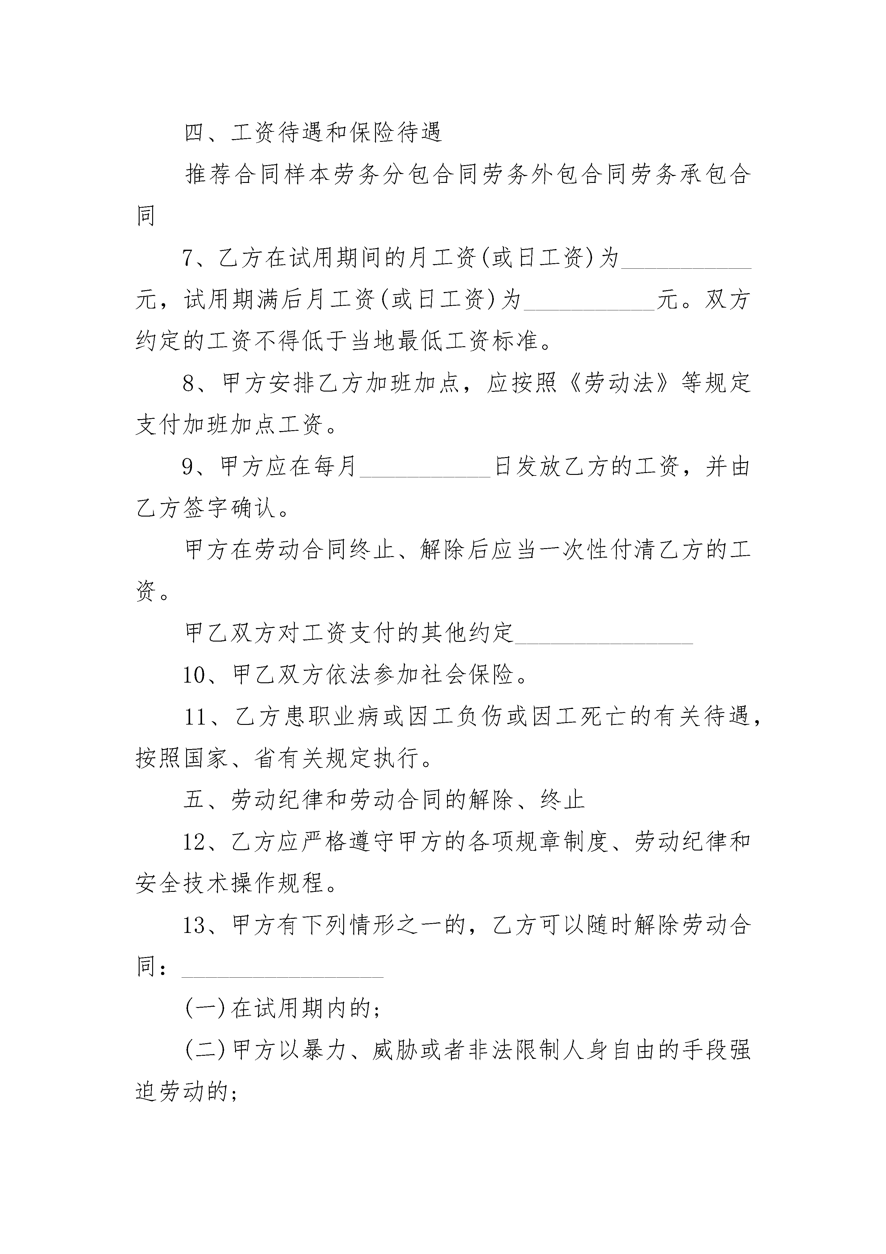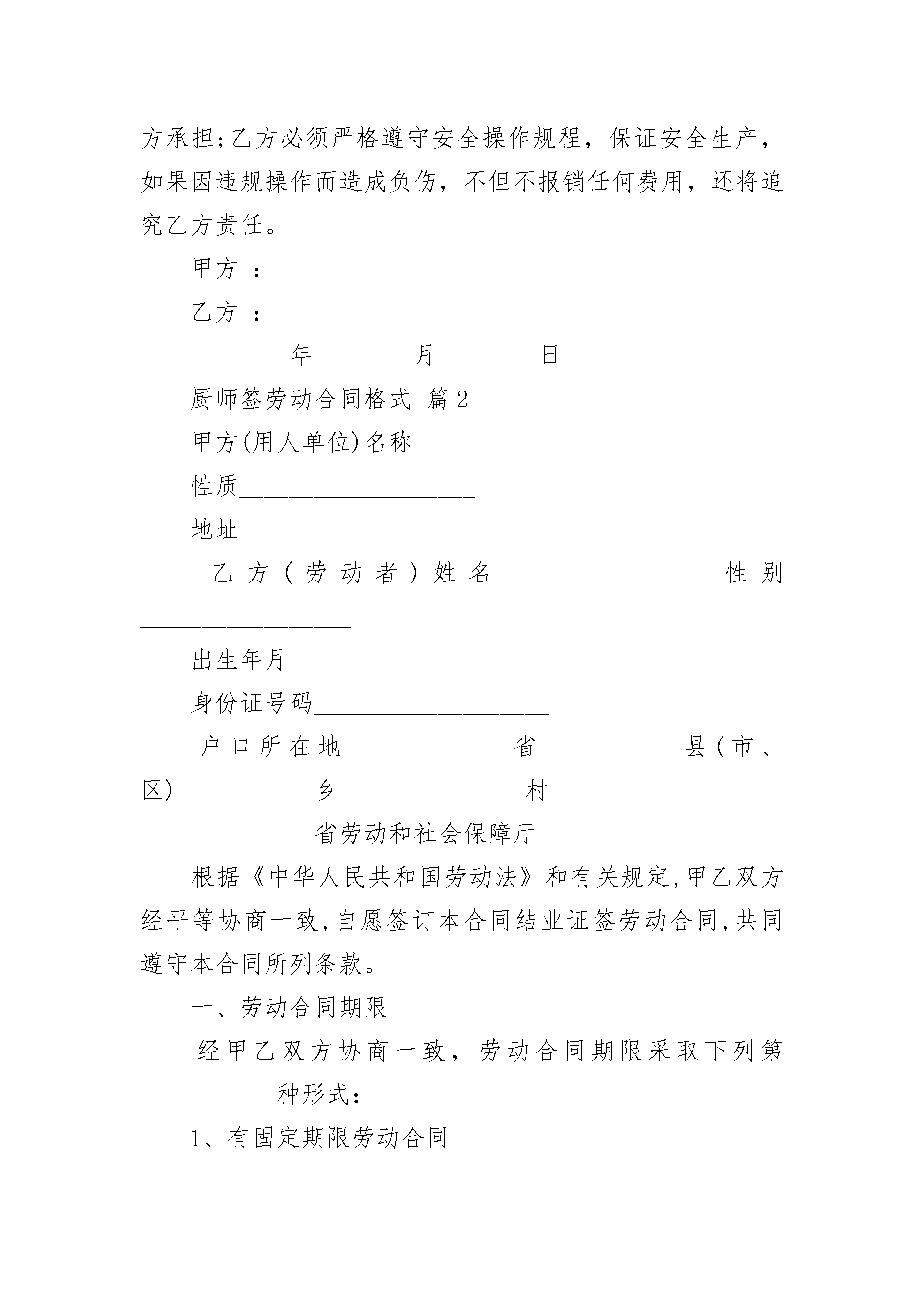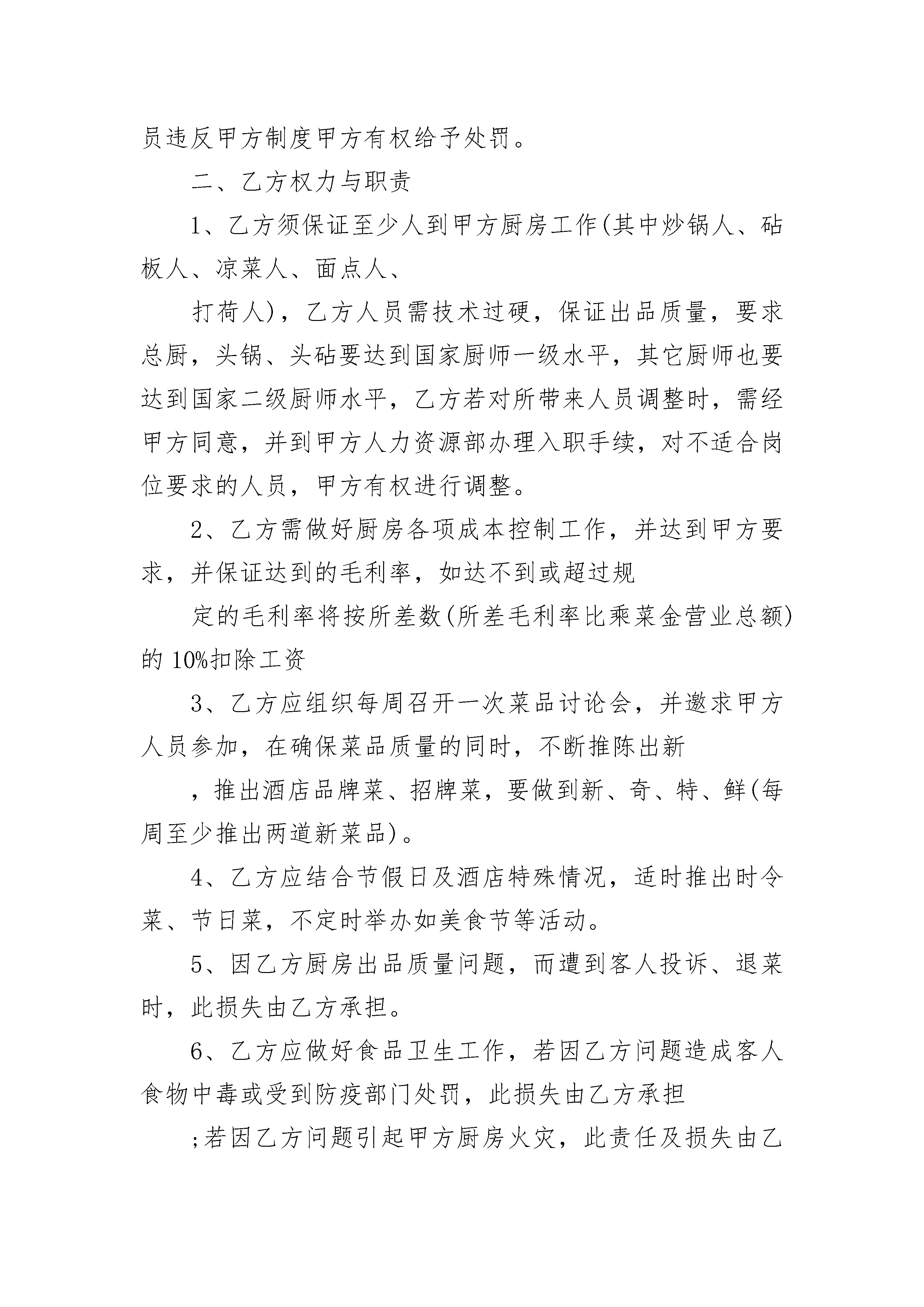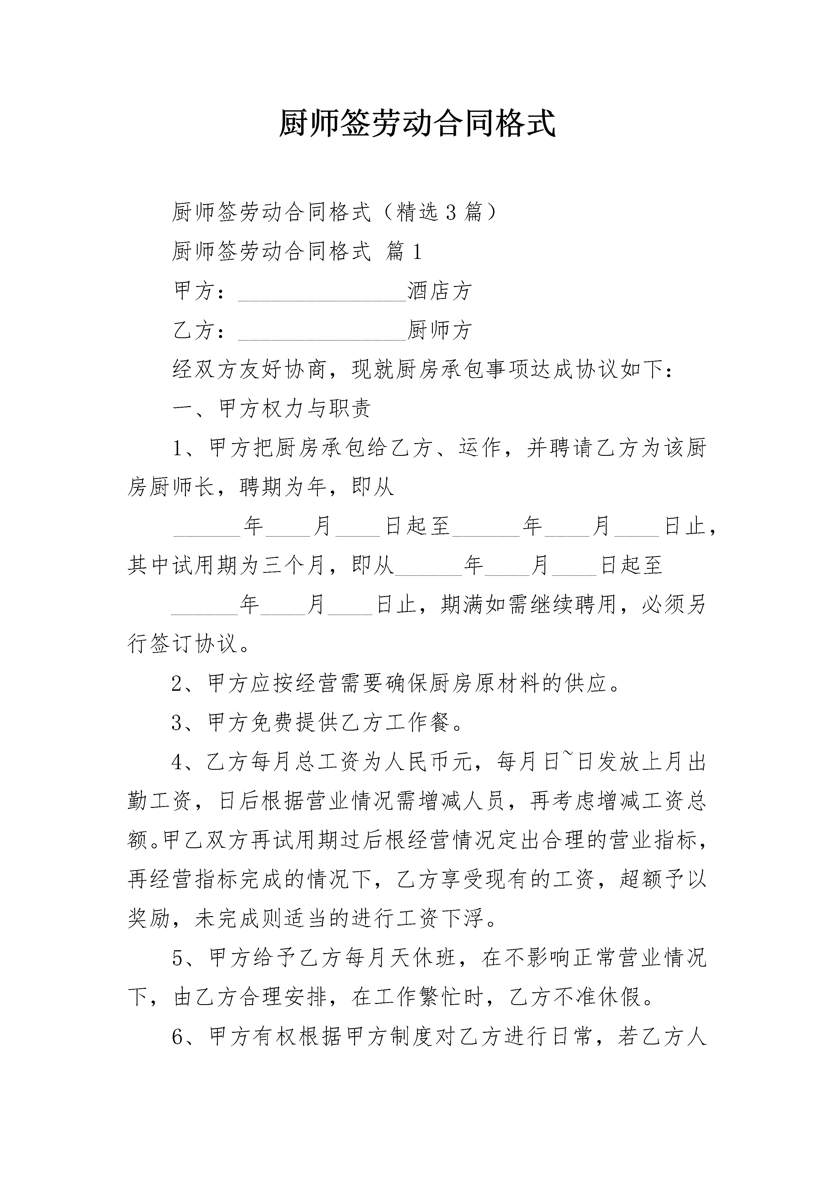 厨师签劳动合同格式厨师签劳动合同格式(精选3篇)厨师签劳动合同格式篇1甲方:_______________酒店方乙方:_______________厨师方经双方友好协商,现就厨房承包事项达成协议如下:一、甲方权力与职责1、甲方把厨房承包给乙方、运作,并聘请乙方为该厨房厨师长,聘期为年,即从______年____月____日起至______年____月____日止,其中试用期为三个月,即从______年____月____日起至______年____月____日止,期满如需继续聘用,必须另行签订协议。2、甲方应按经营需要确保厨房原材料的供应。3、甲方免费提供乙方工作餐。4、乙方每月总工资为人民币元,每月日~日发放上月出勤工资,日后根据营业情况需增减人员,再考虑增减工资总额。甲乙双方再试用期过后根经营情况定出合理的营业指标,再经营指标完成的情况下,乙方享受现有的工资,超额予以奖励,未完成则适当的进行工资下浮。5、甲方给予乙方每月天休班,在不影响正常营业情况下,由乙方合理安排,在工作繁忙时,乙方不准休假。6、甲方有权根据甲方制度对乙方进行日常,若乙方人员违反甲方制度甲方有权给予处罚。二、乙方权力与职责1、乙方须保证至少人到甲方厨房工作(其中炒锅人、砧板人、凉菜人、面点人、打荷人),乙方人员需技术过硬,保证出品质量,要求总厨,头锅、头砧要达到国家厨师一级水平,其它厨师也要达到国家二级厨师水平,乙方若对所带来人员调整时,需经甲方同意,并到甲方人力资源部办理入职手续,对不适合岗位要求的人员,甲方有权进行调整。2、乙方需做好厨房各项成本控制工作,并达到甲方要求,并保证达到的毛利率,如达不到或超过规定的毛利率将按所差数(所差毛利率比乘菜金营业总额)的10%扣除工资3、乙方应组织每周召开一次菜品讨论会,并邀求甲方人员参加,在确保菜品质量的同时,不断推陈出新,推出酒店品牌菜、招牌菜,要做到新、奇、特、鲜(每周至少推出两道新菜品)。4、乙方应结合节假日及酒店特殊情况,适时推出时令菜、节日菜,不定时举办如美食节等活动。5、因乙方厨房出品质量问题,而遭到客人投诉、退菜时,此损失由乙方承担。6、乙方应做好食品卫生工作,若因乙方问题造成客人食物中毒或受到防疫部门处罚,此损失由乙方承担;若因乙方问题引起甲方厨房火灾,此责任及损失由乙方承担;乙方必须严格遵守安全操作规程,保证安全生产,如果因违规操作而造成负伤,不但不报销任何费用,还将追究乙方责任。甲方:___________乙方:___________________年________月________日厨师签劳动合同格式篇2甲方(用人单位)名称___________________性质___________________地址___________________乙方(劳动者)姓名_________________性别_________________出生年月___________________身份证号码___________________户口所在地_____________省___________县(市、区)___________乡_______________村__________省劳动和社会保障厅根据《中华人民共和国劳动法》和有关规定,甲乙双方经平等协商一致,自愿签订本合同结业证签劳动合同,共同遵守本合同所列条款。一、劳动合同期限经甲乙双方协商一致,劳动合同期限采取下列第___________种形式:_________________1、有固定期限劳动合同本合同于___________年___________月___________日生效,于___________年___________月__________日终止。其中试用期自___________年___________月___________日始,至___________年___________月___________日止。2、无固定期限。其中试用期自___________年___________月___________日始,至___________年___________月___________日止。3、以完成一定工作为期限。本合同生效日期为_______________年__________月__________日;以乙方完成___________________工作(任务)为合同终止时间。二、工作内容和工作时间3、甲方招用乙方担任___________________岗位(工种)工作。乙方的上岗证号码为________________。三、劳动保护和劳动条件4、甲方应当在乙方上岗前进行安全生产教育,对从事电气焊、土建、水电设备安装等特殊工种的乙方进行岗前培训,乙方取得相应的操作证书方可上岗。5、甲方根据生产岗位的需要,按照国家劳动安全