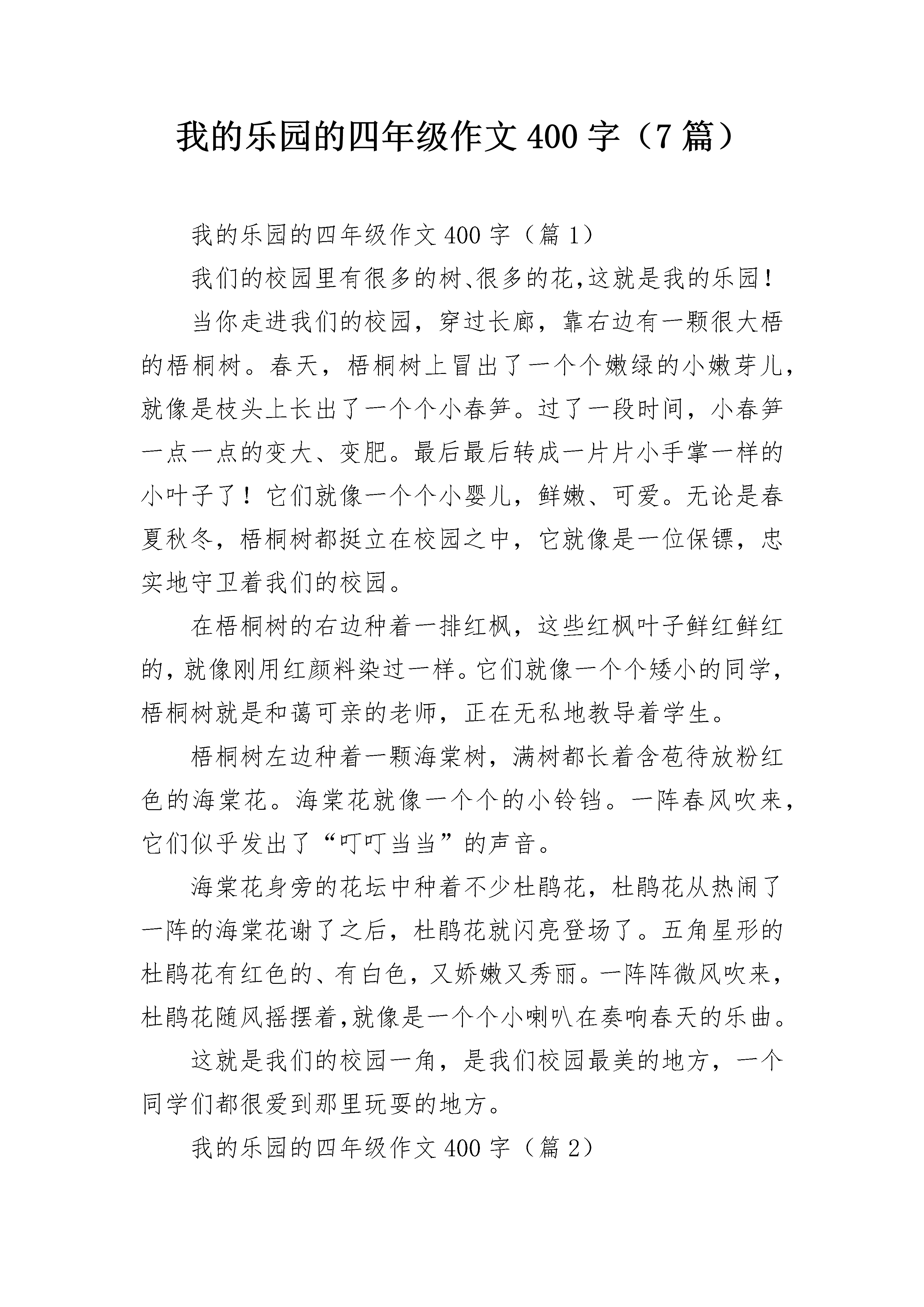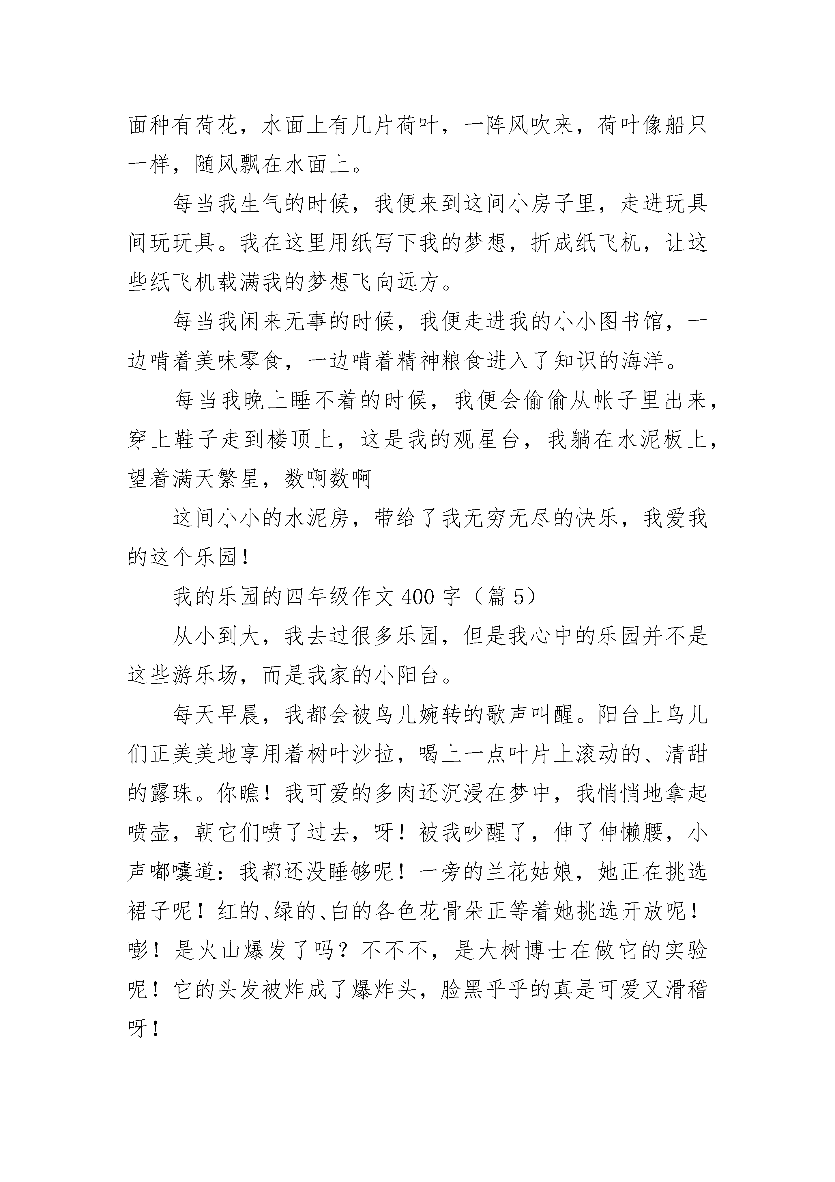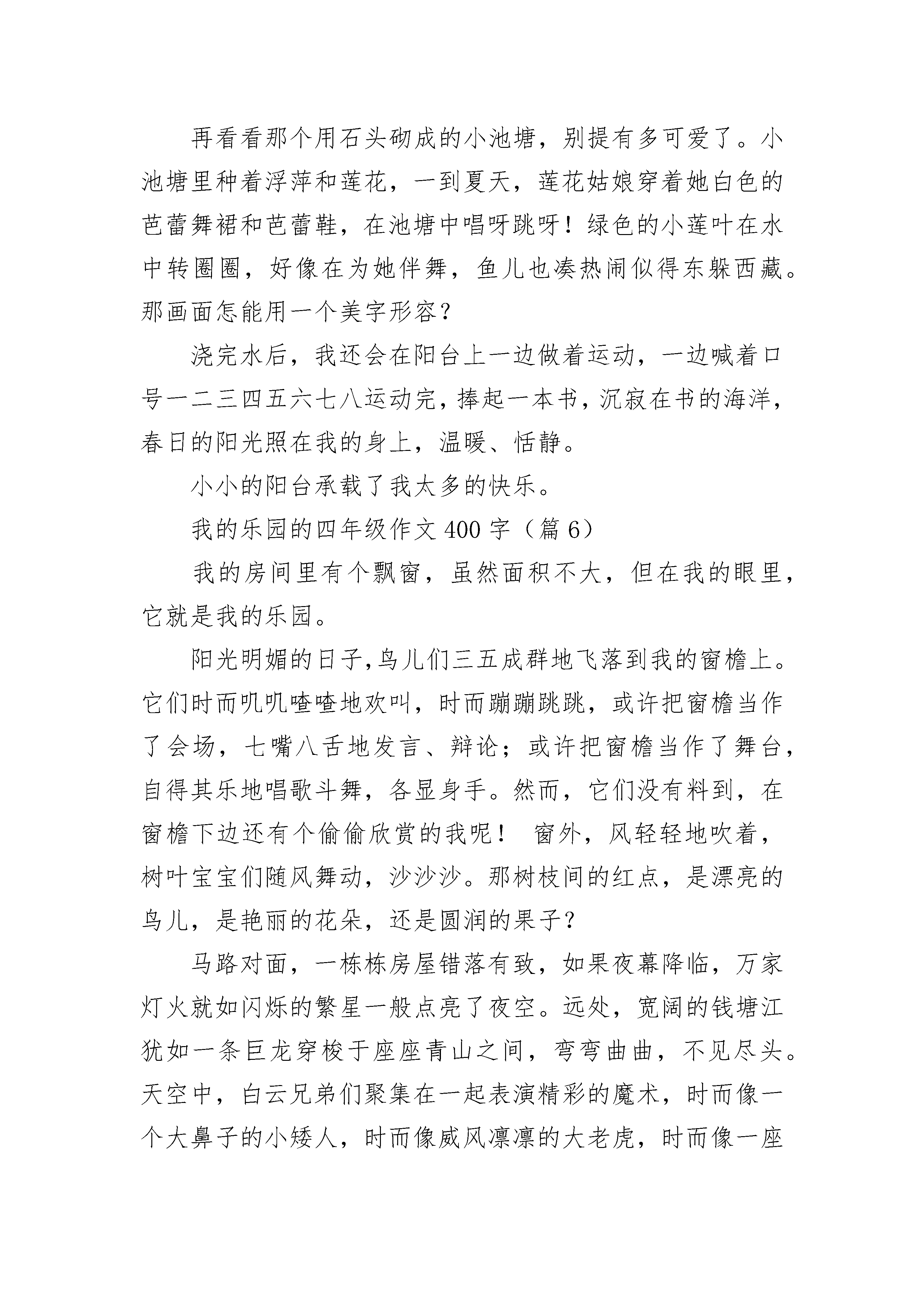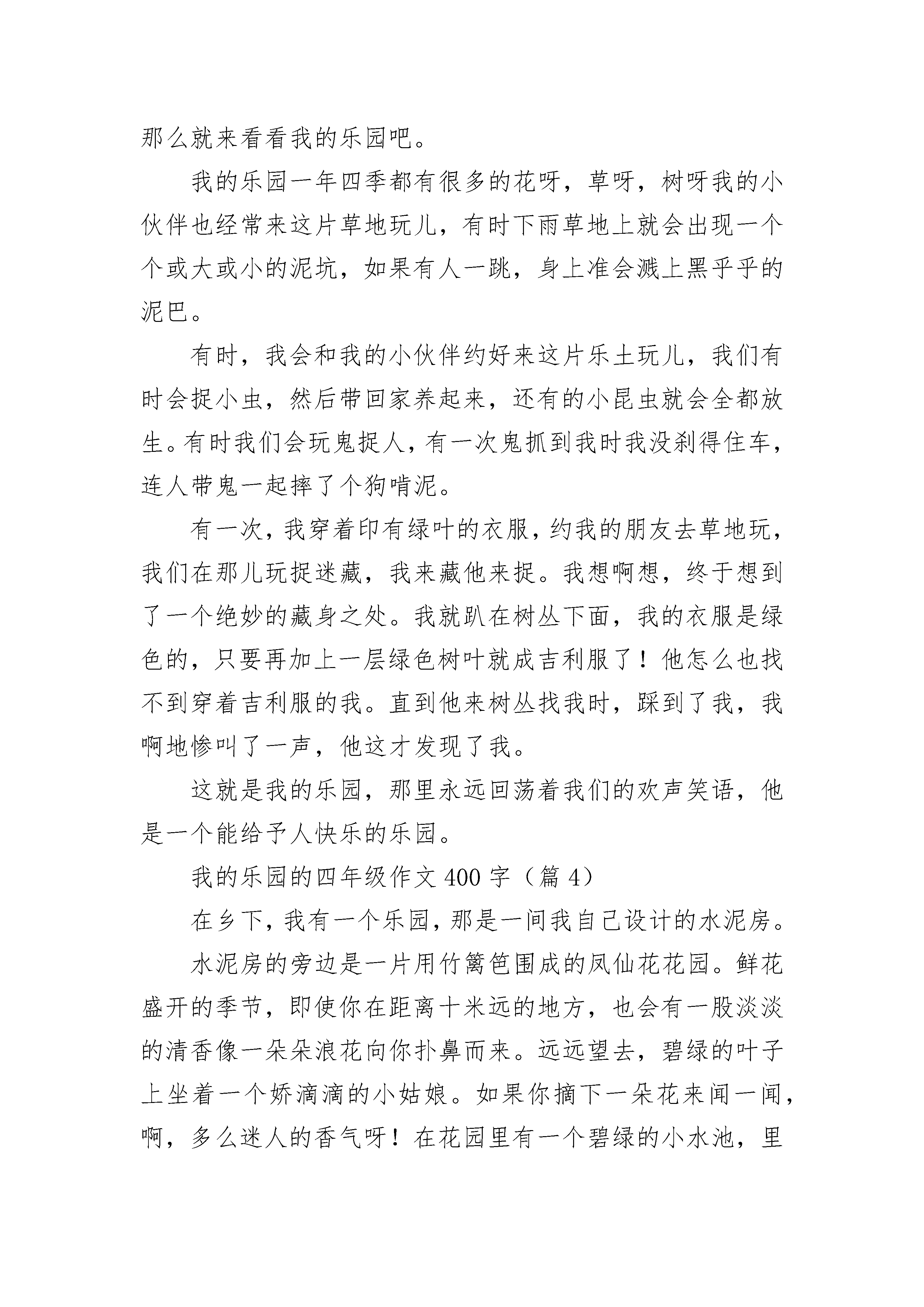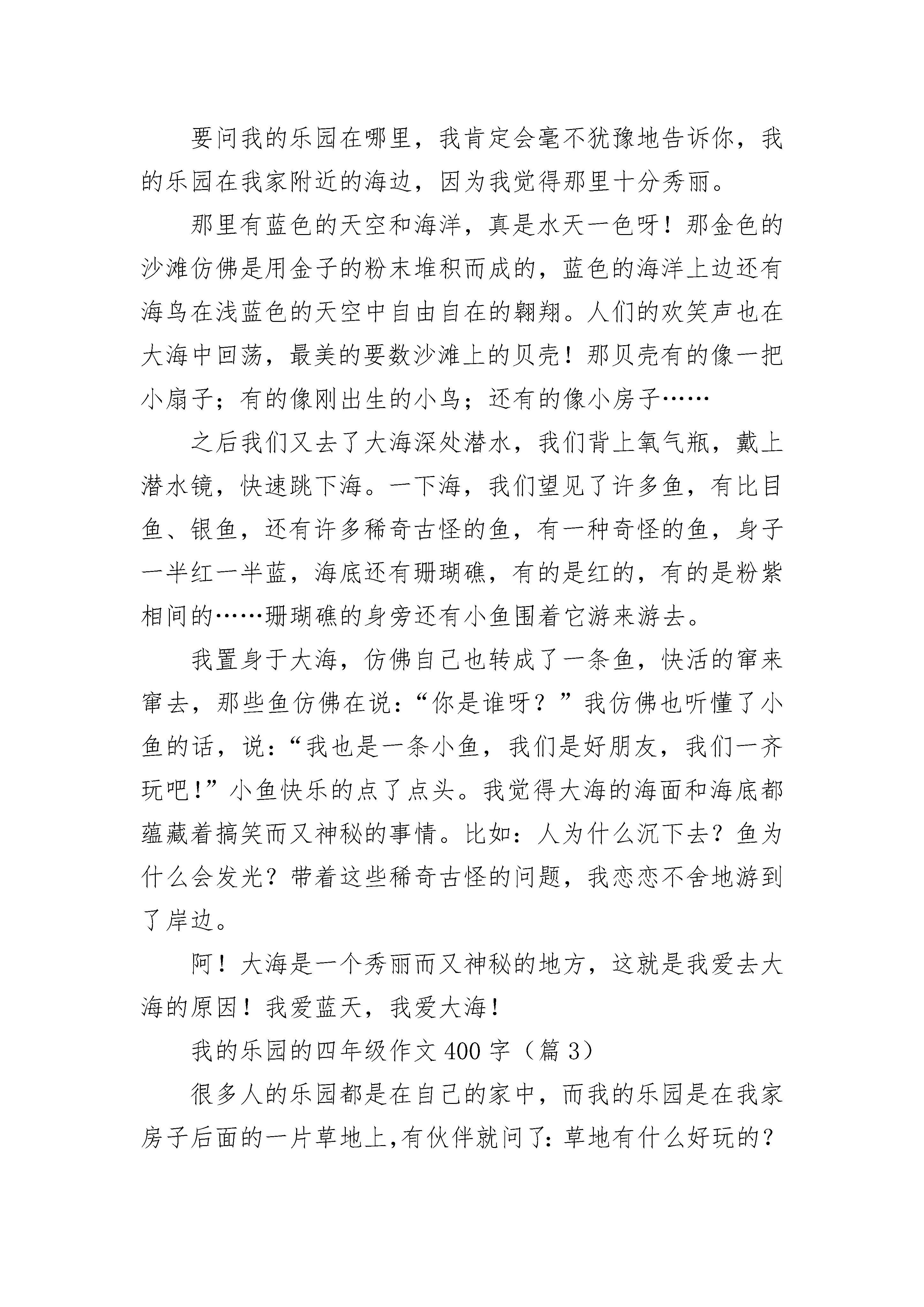 我的乐园的四年级作文400字(7篇)我的乐园的四年级作文400字(篇1)我们的校园里有很多的树、很多的花,这就是我的乐园!当你走进我们的校园,穿过长廊,靠右边有一颗很大梧的梧桐树。春天,梧桐树上冒出了一个个嫩绿的小嫩芽儿,就像是枝头上长出了一个个小春笋。过了一段时间,小春笋一点一点的变大、变肥。最后最后转成一片片小手掌一样的小叶子了!它们就像一个个小婴儿,鲜嫩、可爱。无论是春夏秋冬,梧桐树都挺立在校园之中,它就像是一位保镖,忠实地守卫着我们的校园。在梧桐树的右边种着一排红枫,这些红枫叶子鲜红鲜红的,就像刚用红颜料染过一样。它们就像一个个矮小的同学,梧桐树就是和蔼可亲的老师,正在无私地教导着学生。梧桐树左边种着一颗海棠树,满树都长着含苞待放粉红色的海棠花。海棠花就像一个个的小铃铛。一阵春风吹来,它们似乎发出了“叮叮当当”的声音。海棠花身旁的花坛中种着不少杜鹃花,杜鹃花从热闹了一阵的海棠花谢了之后,杜鹃花就闪亮登场了。五角星形的杜鹃花有红色的、有白色,又娇嫩又秀丽。一阵阵微风吹来,杜鹃花随风摇摆着,就像是一个个小喇叭在奏响春天的乐曲。这就是我们的校园一角,是我们校园最美的地方,一个同学们都很爱到那里玩耍的地方。我的乐园的四年级作文400字(篇2)要问我的乐园在哪里,我肯定会毫不犹豫地告诉你,我的乐园在我家附近的海边,因为我觉得那里十分秀丽。那里有蓝色的天空和海洋,真是水天一色呀!那金色的沙滩仿佛是用金子的粉末堆积而成的,蓝色的海洋上边还有海鸟在浅蓝色的天空中自由自在的翱翔。人们的欢笑声也在大海中回荡,最美的要数沙滩上的贝壳!那贝壳有的像一把小扇子;有的像刚出生的小鸟;还有的像小房子……之后我们又去了大海深处潜水,我们背上氧气瓶,戴上潜水镜,快速跳下海。一下海,我们望见了许多鱼,有比目鱼、银鱼,还有许多稀奇古怪的鱼,有一种奇怪的鱼,身子一半红一半蓝,海底还有珊瑚礁,有的是红的,有的是粉紫相间的……珊瑚礁的身旁还有小鱼围着它游来游去。我置身于大海,仿佛自己也转成了一条鱼,快活的窜来窜去,那些鱼仿佛在说:“你是谁呀?”我仿佛也听懂了小鱼的话,说:“我也是一条小鱼,我们是好朋友,我们一齐玩吧!”小鱼快乐的点了点头。我觉得大海的海面和海底都蕴藏着搞笑而又神秘的事情。比如:人为什么沉下去?鱼为什么会发光?带着这些稀奇古怪的问题,我恋恋不舍地游到了岸边。阿!大海是一个秀丽而又神秘的地方,这就是我爱去大海的原因!我爱蓝天,我爱大海!我的乐园的四年级作文400字(篇3)很多人的乐园都是在自己的家中,而我的乐园是在我家房子后面的一片草地上,有伙伴就问了:草地有什么好玩的?那么就来看看我的乐园吧。我的乐园一年四季都有很多的花呀,草呀,树呀我的小伙伴也经常来这片草地玩儿,有时下雨草地上就会出现一个个或大或小的泥坑,如果有人一跳,身上准会溅上黑乎乎的泥巴。有时,我会和我的小伙伴约好来这片乐土玩儿,我们有时会捉小虫,然后带回家养起来,还有的小昆虫就会全都放生。有时我们会玩鬼捉人,有一次鬼抓到我时我没刹得住车,连人带鬼一起摔了个狗啃泥。有一次,我穿着印有绿叶的衣服,约我的朋友去草地玩,我们在那儿玩捉迷藏,我来藏他来捉。我想啊想,终于想到了一个绝妙的藏身之处。我就趴在树丛下面,我的衣服是绿色的,只要再加上一层绿色树叶就成吉利服了!他怎么也找不到穿着吉利服的我。直到他来树丛找我时,踩到了我,我啊地惨叫了一声,他这才发现了我。这就是我的乐园,那里永远回荡着我们的欢声笑语,他是一个能给予人快乐的乐园。我的乐园的四年级作文400字(篇4)在乡下,我有一个乐园,那是一间我自己设计的水泥房。水泥房的旁边是一片用竹篱笆围成的凤仙花花园。鲜花盛开的季节,即使你在距离十米远的地方,也会有一股淡淡的清香像一朵朵浪花向你扑鼻而来。远远望去,碧绿的叶子上坐着一个娇滴滴的小姑娘。如果你摘下一朵花来闻一闻,啊,多么迷人的香气呀!在花园里有一个碧绿的小水池,里面种有荷花,水面上有几片荷叶,一阵风吹来,荷叶像船只一样,随风飘在水面上。每当我生气的时候,我便来到这间小房子里,走进玩具间玩玩具。我在这里用纸写下我的梦想,折成纸飞机,让这些纸飞机载满我的梦想飞向远方。每当我闲来无事的时候,我便走进我的小小图书馆,一边啃着美味零食,一边啃着精神粮食进入了知识的海洋。每当我晚上睡不着的时候,我便会偷偷从帐子里出来,穿上鞋子走到楼顶上,这是我的观星台,我躺在水泥板上,望着满天繁星,数啊数啊这间小小的水泥房,带给了我无穷无尽的快乐,我爱我的这个乐园!我的乐园的四年级作文400字(篇5)从小到大,我去过很多乐园,但是我心中的乐园并不是这些游乐场,而是我家的小阳台。每天早晨,我都会被鸟儿婉转的歌声叫醒。阳台上鸟儿们正美美地享用着树叶沙拉,喝上一点叶片上滚动的、清甜的露珠。你瞧!我可爱的多肉还沉浸在梦中,我悄
