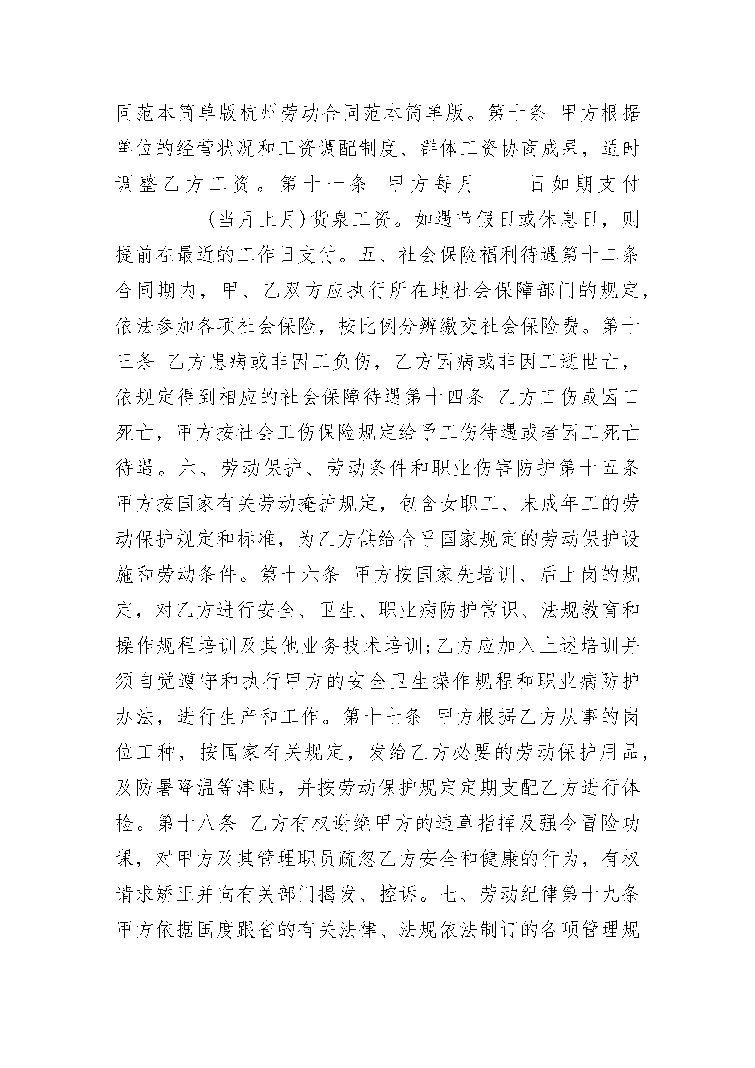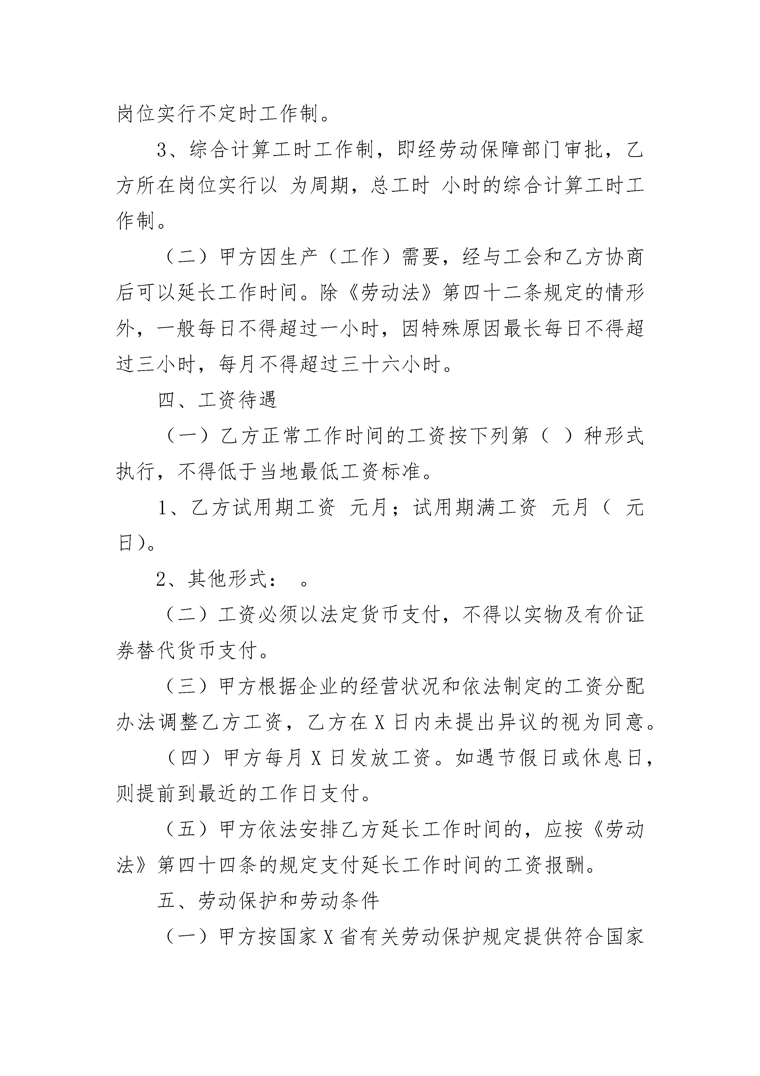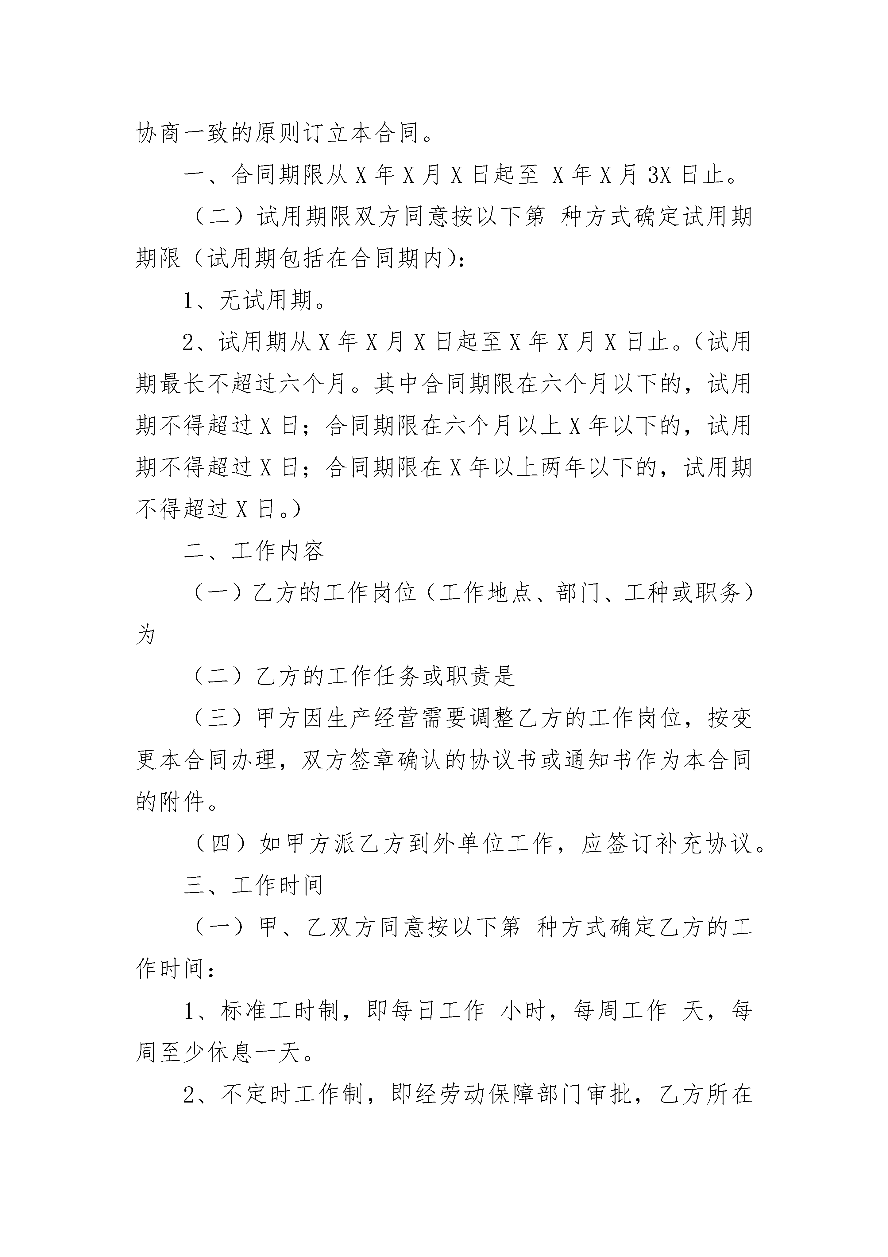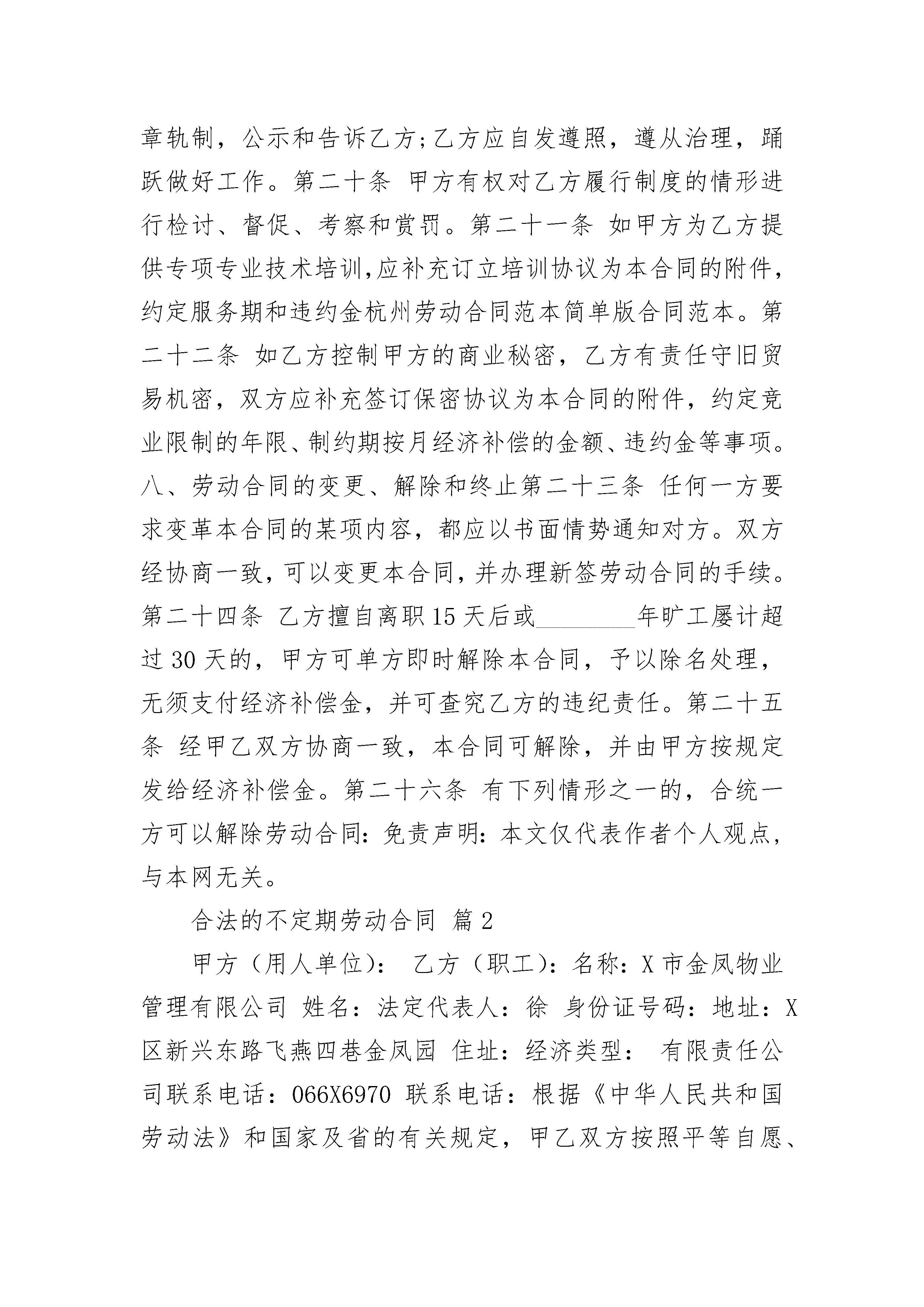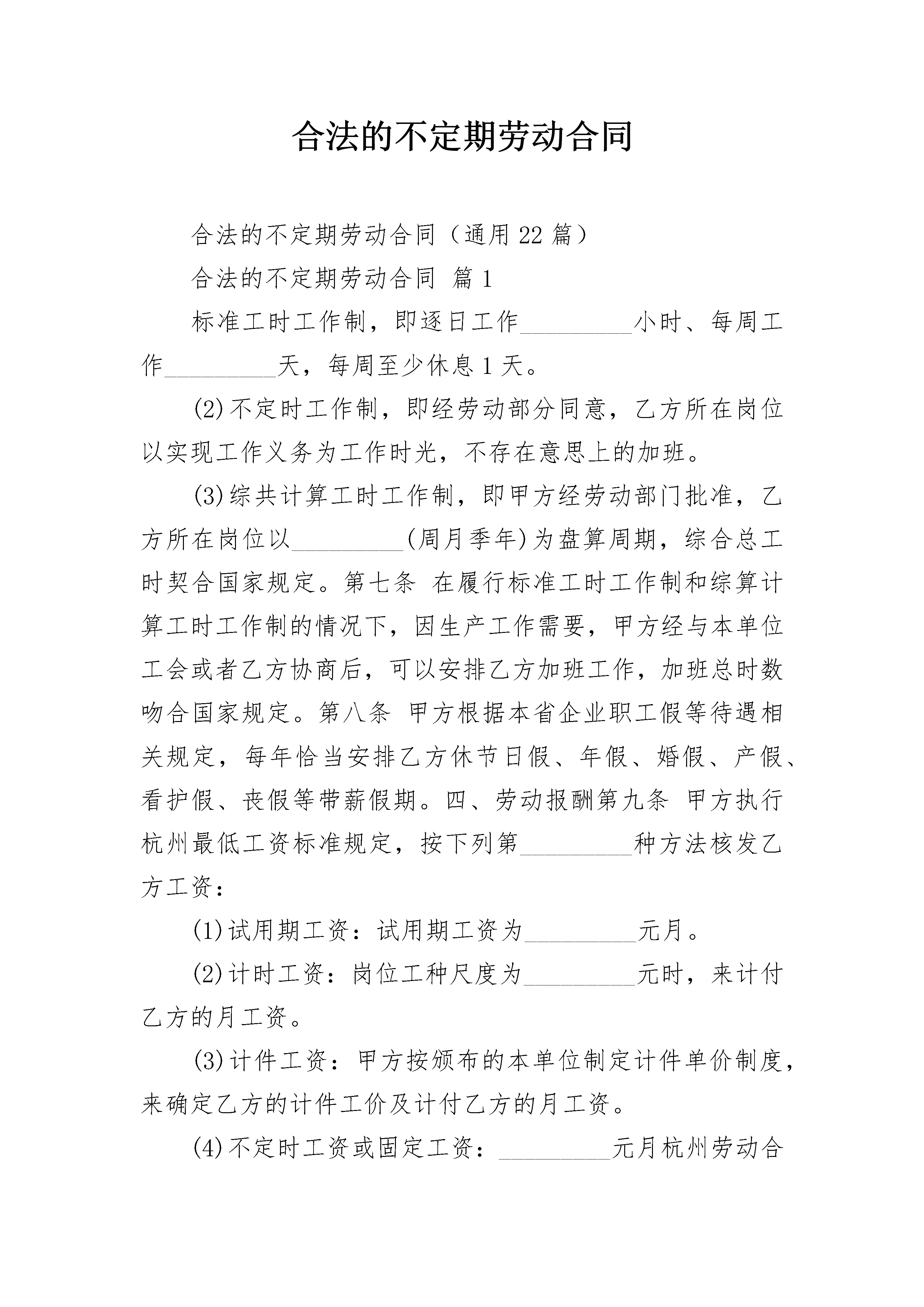合法的不定期劳动合同合法的不定期劳动合同(通用22篇)合法的不定期劳动合同篇1标准工时工作制,即逐日工作_________小时、每周工作_________天,每周至少休息1天。(2)不定时工作制,即经劳动部分同意,乙方所在岗位以实现工作义务为工作时光,不存在意思上的加班。(3)综共计算工时工作制,即甲方经劳动部门批准,乙方所在岗位以_________(周月季年)为盘算周期,综合总工时契合国家规定。第七条在履行标准工时工作制和综算计算工时工作制的情况下,因生产工作需要,甲方经与本单位工会或者乙方协商后,可以安排乙方加班工作,加班总时数吻合国家规定。第八条甲方根据本省企业职工假等待遇相关规定,每年恰当安排乙方休节日假、年假、婚假、产假、看护假、丧假等带薪假期。四、劳动报酬第九条甲方执行杭州最低工资标准规定,按下列第_________种方法核发乙方工资:(1)试用期工资:试用期工资为_________元月。(2)计时工资:岗位工种尺度为_________元时,来计付乙方的月工资。(3)计件工资:甲方按颁布的本单位制定计件单价制度,来确定乙方的计件工价及计付乙方的月工资。(4)不定时工资或固定工资:_________元月杭州劳动合同范本简单版杭州劳动合同范本简单版。第十条甲方根据单位的经营状况和工资调配制度、群体工资协商成果,适时调整乙方工资。第十一条甲方每月____日如期支付_________(当月上月)货泉工资。如遇节假日或休息日,则提前在最近的工作日支付。五、社会保险福利待遇第十二条合同期内,甲、乙双方应执行所在地社会保障部门的规定,依法参加各项社会保险,按比例分辨缴交社会保险费。第十三条乙方患病或非因工负伤,乙方因病或非因工逝世亡,依规定得到相应的社会保障待遇第十四条乙方工伤或因工死亡,甲方按社会工伤保险规定给予工伤待遇或者因工死亡待遇。六、劳动保护、劳动条件和职业伤害防护第十五条甲方按国家有关劳动掩护规定,包含女职工、未成年工的劳动保护规定和标准,为乙方供给合乎国家规定的劳动保护设施和劳动条件。第十六条甲方按国家先培训、后上岗的规定,对乙方进行安全、卫生、职业病防护常识、法规教育和操作规程培训及其他业务技术培训;乙方应加入上述培训并须自觉遵守和执行甲方的安全卫生操作规程和职业病防护办法,进行生产和工作。第十七条甲方根据乙方从事的岗位工种,按国家有关规定,发给乙方必要的劳动保护用品,及防暑降温等津贴,并按劳动保护规定定期支配乙方进行体检。第十八条乙方有权谢绝甲方的违章指挥及强令冒险功课,对甲方及其管理职员疏忽乙方安全和健康的行为,有权请求矫正并向有关部门揭发、控诉。七、劳动纪律第十九条甲方依据国度跟省的有关法律、法规依法制订的各项管理规章轨制,公示和告诉乙方;乙方应自发遵照,遵从治理,踊跃做好工作。第二十条甲方有权对乙方履行制度的情形进行检讨、督促、考察和赏罚。第二十一条如甲方为乙方提供专项专业技术培训,应补充订立培训协议为本合同的附件,约定服务期和违约金杭州劳动合同范本简单版合同范本。第二十二条如乙方控制甲方的商业秘密,乙方有责任守旧贸易机密,双方应补充签订保密协议为本合同的附件,约定竞业限制的年限、制约期按月经济补偿的金额、违约金等事项。八、劳动合同的变更、解除和终止第二十三条任何一方要求变革本合同的某项内容,都应以书面情势通知对方。双方经协商一致,可以变更本合同,并办理新签劳动合同的手续。第二十四条乙方擅自离职15天后或________年旷工屡计超过30天的,甲方可单方即时解除本合同,予以除名处理,无须支付经济补偿金,并可查究乙方的违纪责任。第二十五条经甲乙双方协商一致,本合同可解除,并由甲方按规定发给经济补偿金。第二十六条有下列情形之一的,合统一方可以解除劳动合同:免责声明:本文仅代表作者个人观点,与本网无关。合法的不定期劳动合同篇2甲方(用人单位):乙方(职工):名称:X市金凤物业管理有限公司姓名:法定代表人:徐身份证号码:地址:X区新兴东路飞燕四巷金凤园住址:经济类型:有限责任公司联系电话:066X6970联系电话:根据《中华人民共和国劳动法》和国家及省的有关规定,甲乙双方按照平等自愿、协商一致的原则订立本合同。一、合同期限从X年X月X日起至X年X月3X日止。(二)试用期限双方同意按以下第种方式确定试用期期限(试用期包括在合同期内):1、无试用期。2、试用期从X年X月X日起至X年X月X日止。(试用期最长不超过六个月。其中合同期限在六个月以下的,试用期不得超过X日;合同期限在六个月以上X年以下的,试用期不得超过X日;合同期限在X年以上两年以下的,试用期不得超过X日。)二、工作内容(一)乙方的工作岗位(工作地点、部门、工种或职务)为(二)乙方的工作任务或职责是(三)甲方因生产经营需要调整乙方的工作岗位,按变更本合同