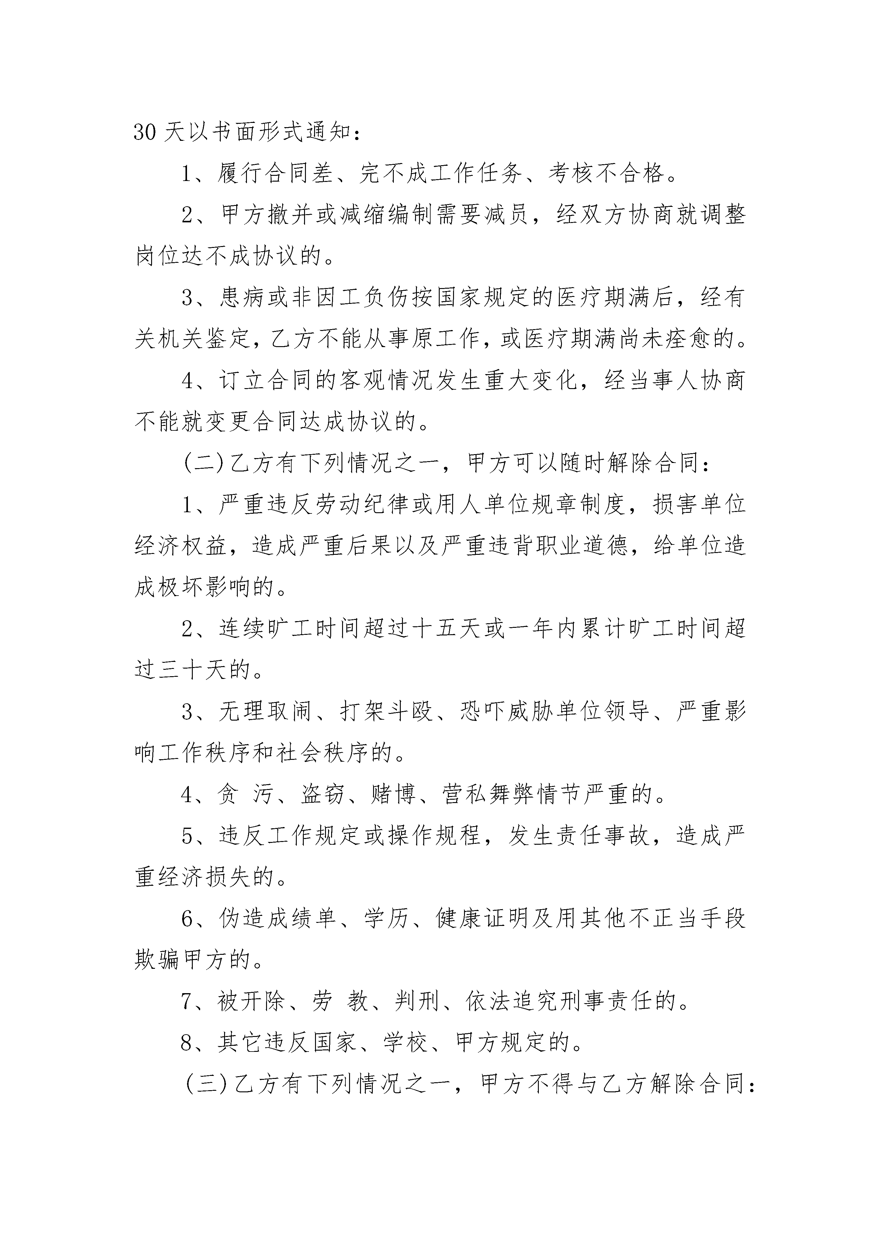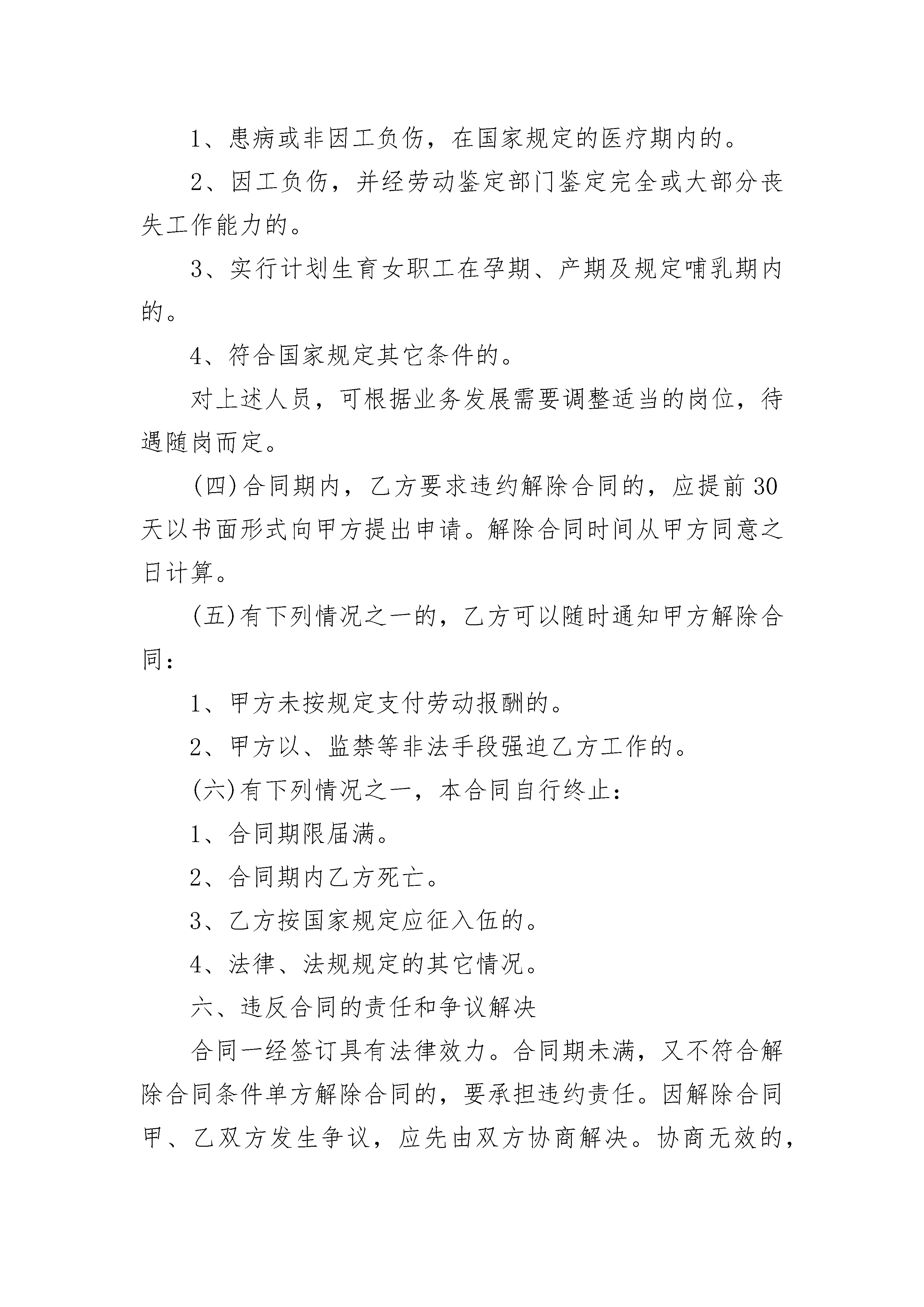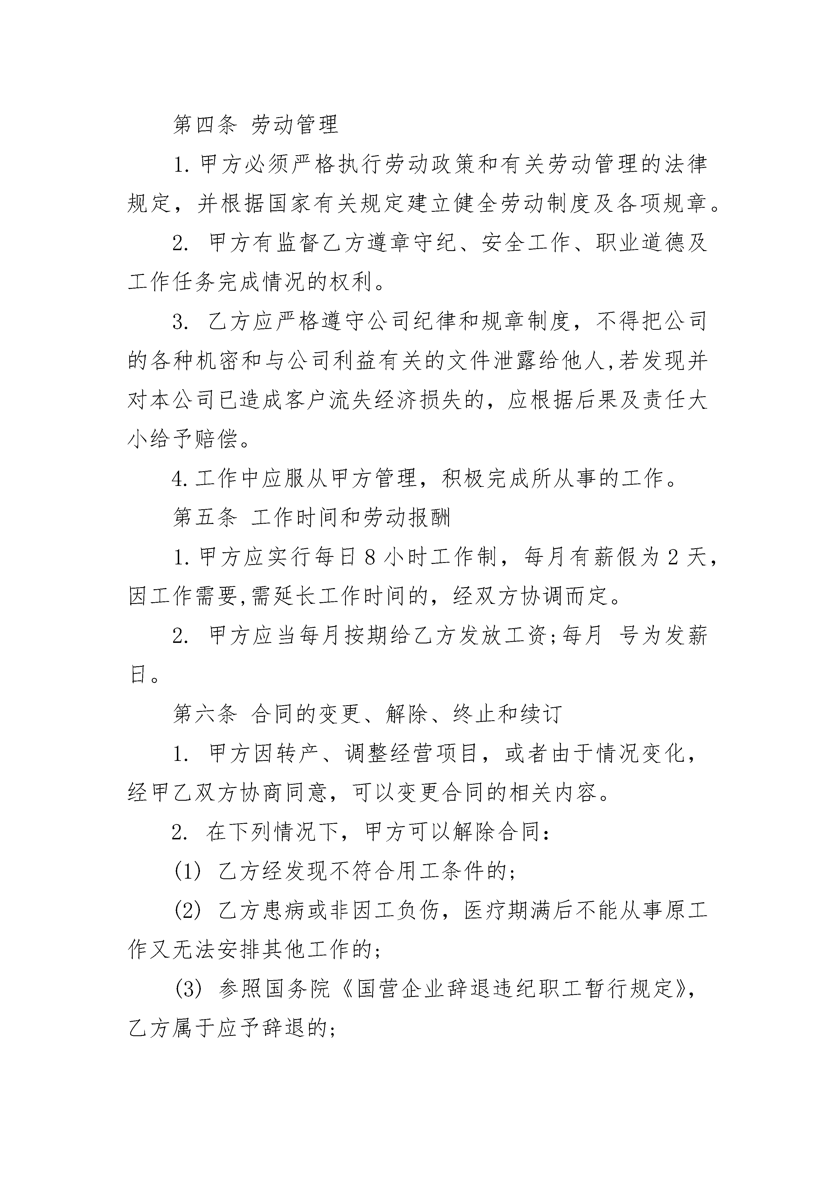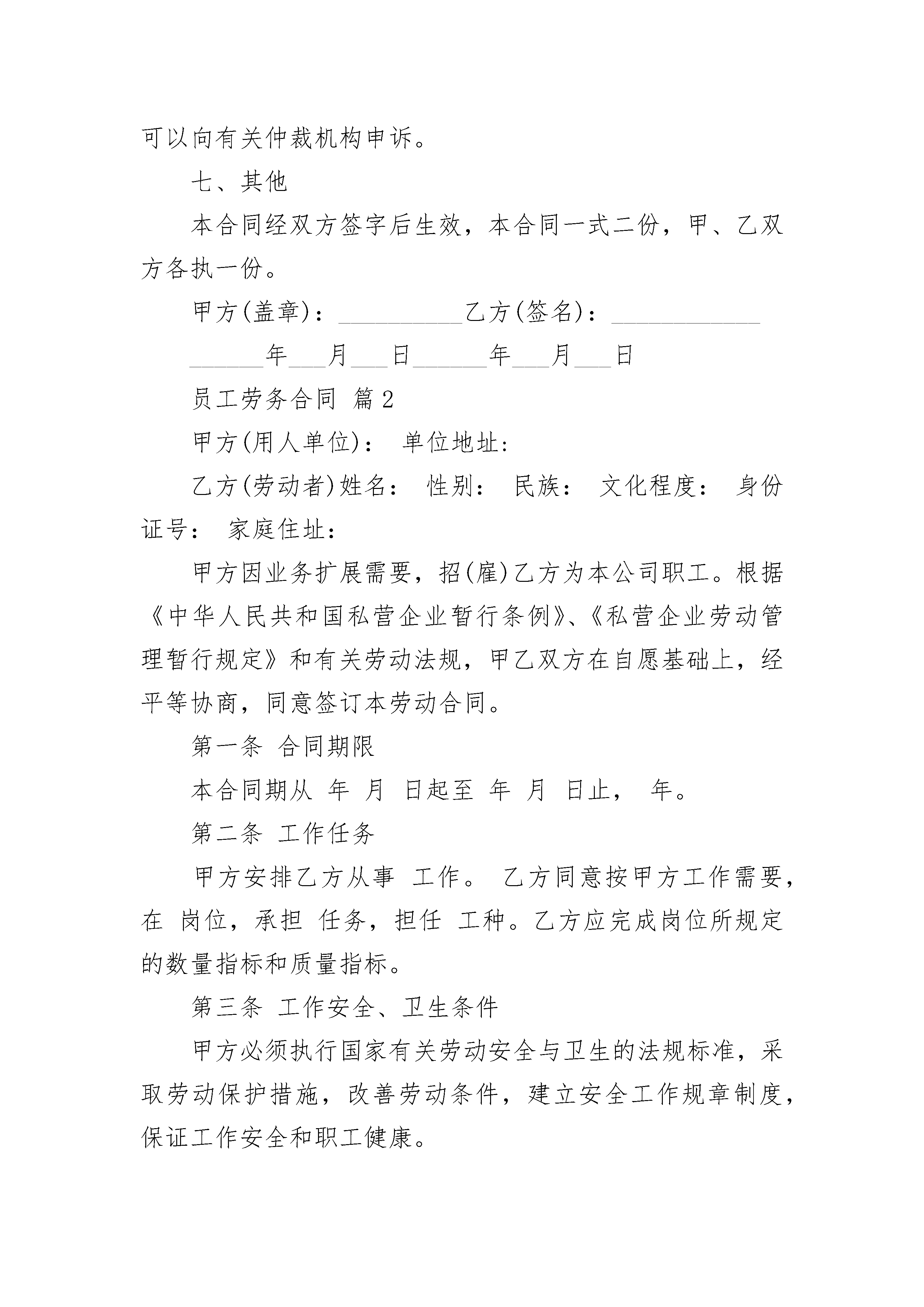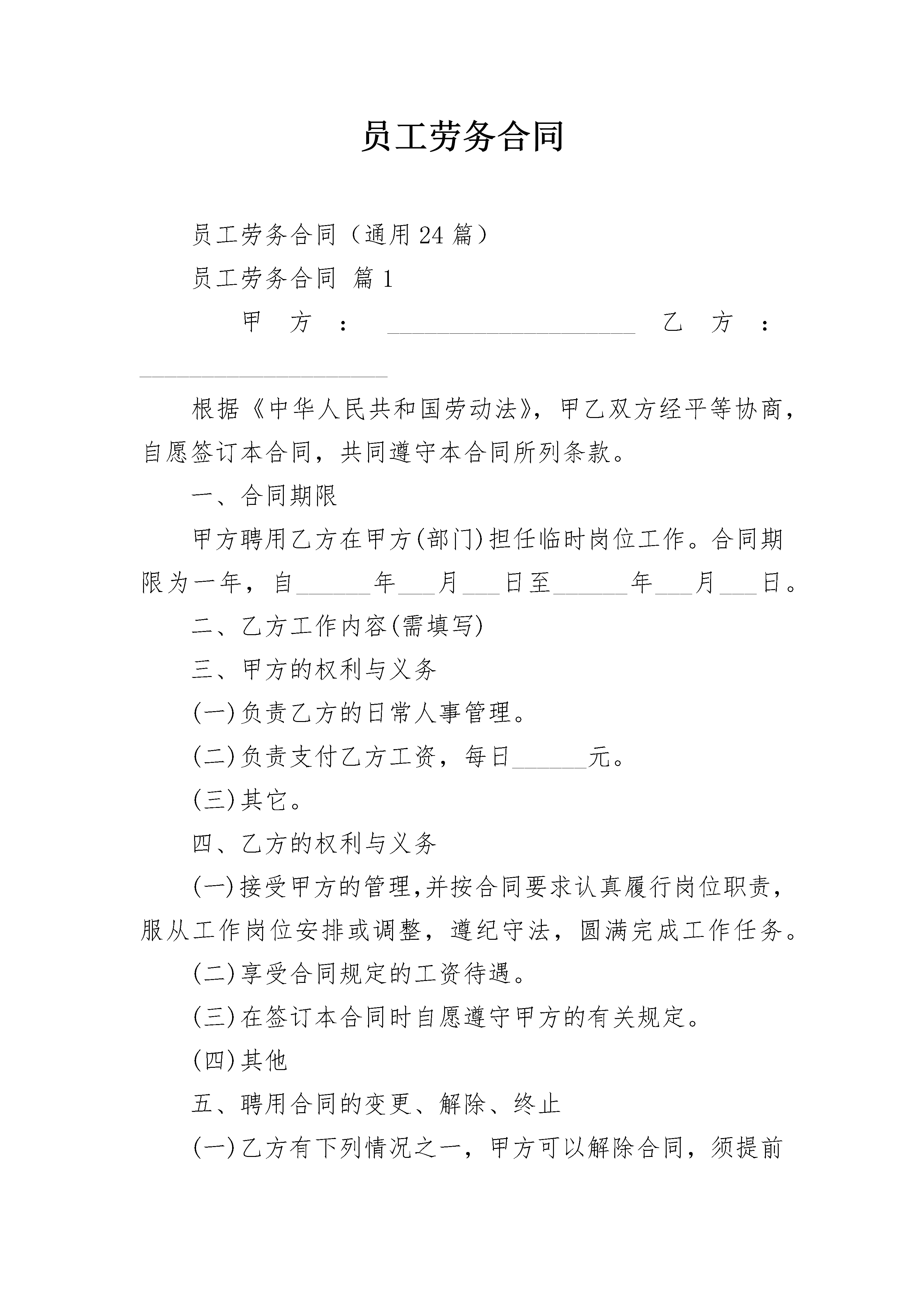 员工劳务合同员工劳务合同(通用24篇)员工劳务合同篇1甲方:____________________乙方:____________________根据《中华人民共和国劳动法》,甲乙双方经平等协商,自愿签订本合同,共同遵守本合同所列条款。一、合同期限甲方聘用乙方在甲方(部门)担任临时岗位工作。合同期限为一年,自______年___月___日至______年___月___日。二、乙方工作内容(需填写)三、甲方的权利与义务(一)负责乙方的日常人事管理。(二)负责支付乙方工资,每日______元。(三)其它。四、乙方的权利与义务(一)接受甲方的管理,并按合同要求认真履行岗位职责,服从工作岗位安排或调整,遵纪守法,圆满完成工作任务。(二)享受合同规定的工资待遇。(三)在签订本合同时自愿遵守甲方的有关规定。(四)其他五、聘用合同的变更、解除、终止(一)乙方有下列情况之一,甲方可以解除合同,须提前30天以书面形式通知:1、履行合同差、完不成工作任务、考核不合格。2、甲方撤并或减缩编制需要减员,经双方协商就调整岗位达不成协议的。3、患病或非因工负伤按国家规定的医疗期满后,经有关机关鉴定,乙方不能从事原工作,或医疗期满尚未痊愈的。4、订立合同的客观情况发生重大变化,经当事人协商不能就变更合同达成协议的。(二)乙方有下列情况之一,甲方可以随时解除合同:1、严重违反劳动纪律或用人单位规章制度,损害单位经济权益,造成严重后果以及严重违背职业道德,给单位造成极坏影响的。2、连续旷工时间超过十五天或一年内累计旷工时间超过三十天的。3、无理取闹、打架斗殴、恐吓威胁单位领导、严重影响工作秩序和社会秩序的。4、贪污、盗窃、赌博、营私舞弊情节严重的。5、违反工作规定或操作规程,发生责任事故,造成严重经济损失的。6、伪造成绩单、学历、健康证明及用其他不正当手段欺骗甲方的。7、被开除、劳教、判刑、依法追究刑事责任的。8、其它违反国家、学校、甲方规定的。(三)乙方有下列情况之一,甲方不得与乙方解除合同:1、患病或非因工负伤,在国家规定的医疗期内的。2、因工负伤,并经劳动鉴定部门鉴定完全或大部分丧失工作能力的。3、实行计划生育女职工在孕期、产期及规定哺乳期内的。4、符合国家规定其它条件的。对上述人员,可根据业务发展需要调整适当的岗位,待遇随岗而定。(四)合同期内,乙方要求违约解除合同的,应提前30天以书面形式向甲方提出申请。解除合同时间从甲方同意之日计算。(五)有下列情况之一的,乙方可以随时通知甲方解除合同:1、甲方未按规定支付劳动报酬的。2、甲方以、监禁等非法手段强迫乙方工作的。(六)有下列情况之一,本合同自行终止:1、合同期限届满。2、合同期内乙方死亡。3、乙方按国家规定应征入伍的。4、法律、法规规定的其它情况。六、违反合同的责任和争议解决合同一经签订具有法律效力。合同期未满,又不符合解除合同条件单方解除合同的,要承担违约责任。因解除合同甲、乙双方发生争议,应先由双方协商解决。协商无效的,可以向有关仲裁机构申诉。七、其他本合同经双方签字后生效,本合同一式二份,甲、乙双方各执一份。甲方(盖章):__________乙方(签名):__________________年___月___日______年___月___日员工劳务合同篇2甲方(用人单位):单位地址:乙方(劳动者)姓名:性别:民族:文化程度:身份证号:家庭住址:甲方因业务扩展需要,招(雇)乙方为本公司职工。根据《中华人民共和国私营企业暂行条例》、《私营企业劳动管理暂行规定》和有关劳动法规,甲乙双方在自愿基础上,经平等协商,同意签订本劳动合同。第一条合同期限本合同期从年月日起至年月日止,年。第二条工作任务甲方安排乙方从事工作。乙方同意按甲方工作需要,在岗位,承担任务,担任工种。乙方应完成岗位所规定的数量指标和质量指标。第三条工作安全、卫生条件甲方必须执行国家有关劳动安全与卫生的法规标准,采取劳动保护措施,改善劳动条件,建立安全工作规章制度,保证工作安全和职工健康。第四条劳动管理1.甲方必须严格执行劳动政策和有关劳动管理的法律规定,并根据国家有关规定建立健全劳动制度及各项规章。2.甲方有监督乙方遵章守纪、安全工作、职业道德及工作任务完成情况的权利。3.乙方应严格遵守公司纪律和规章制度,不得把公司的各种机密和与公司利益有关的文件泄露给他人,若发现并对本公司已造成客户流失经济损失的,应根据后果及责任大小给予赔偿。4.工作中应服从甲方管理,积极完成所从事的工作。第五条工作时间和劳动报酬1.甲方应实行每日8小时工作制,每月有薪假为2天,因工作需要,需延长工作时间的,经双方协调而定。2.甲方应当每月按期给乙方发放工资;每月号为发薪日。第六条合同的变更、解除、终止和续订1.甲方因转产、调整经营项目,或者由于情况变化,经甲乙双方