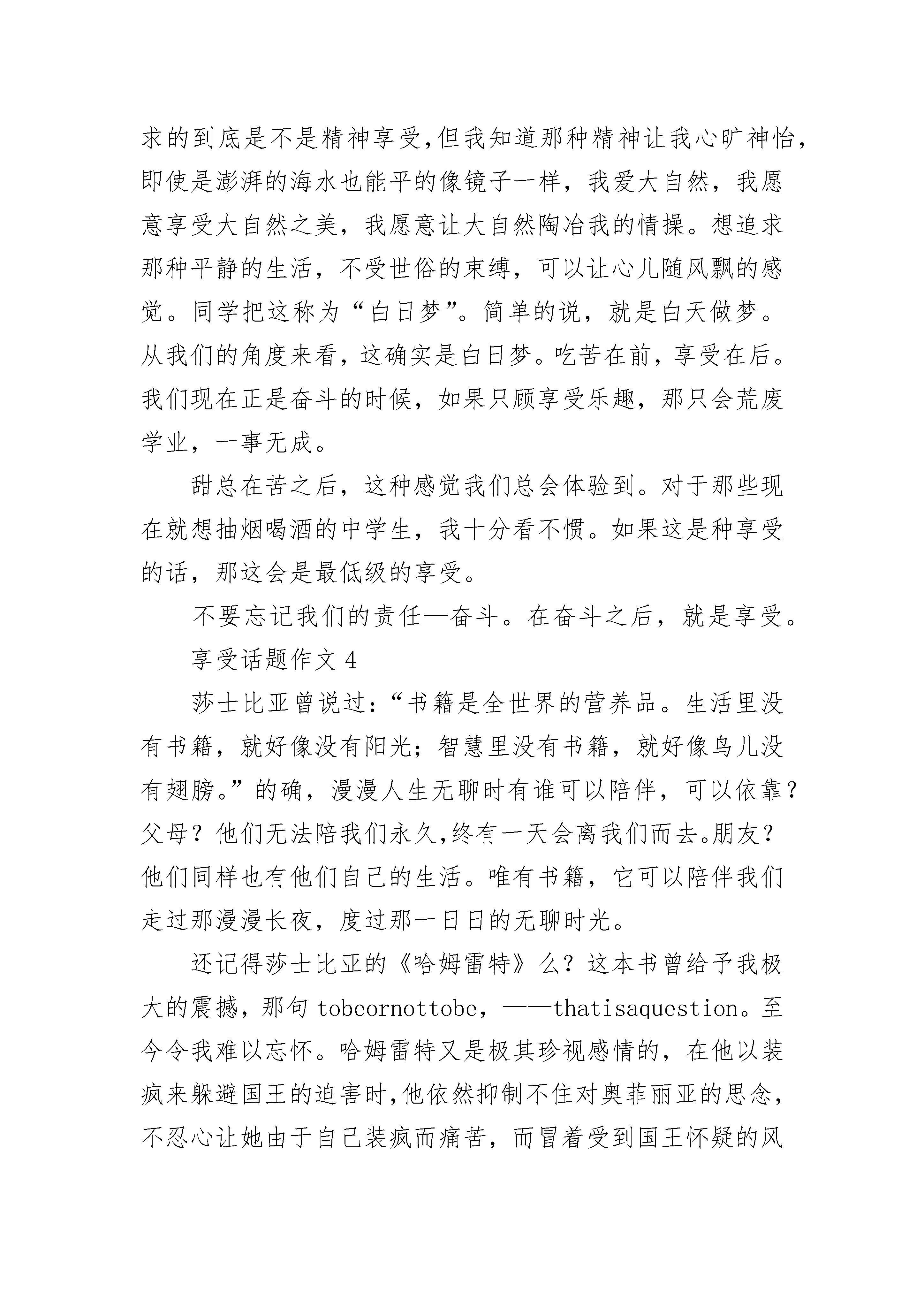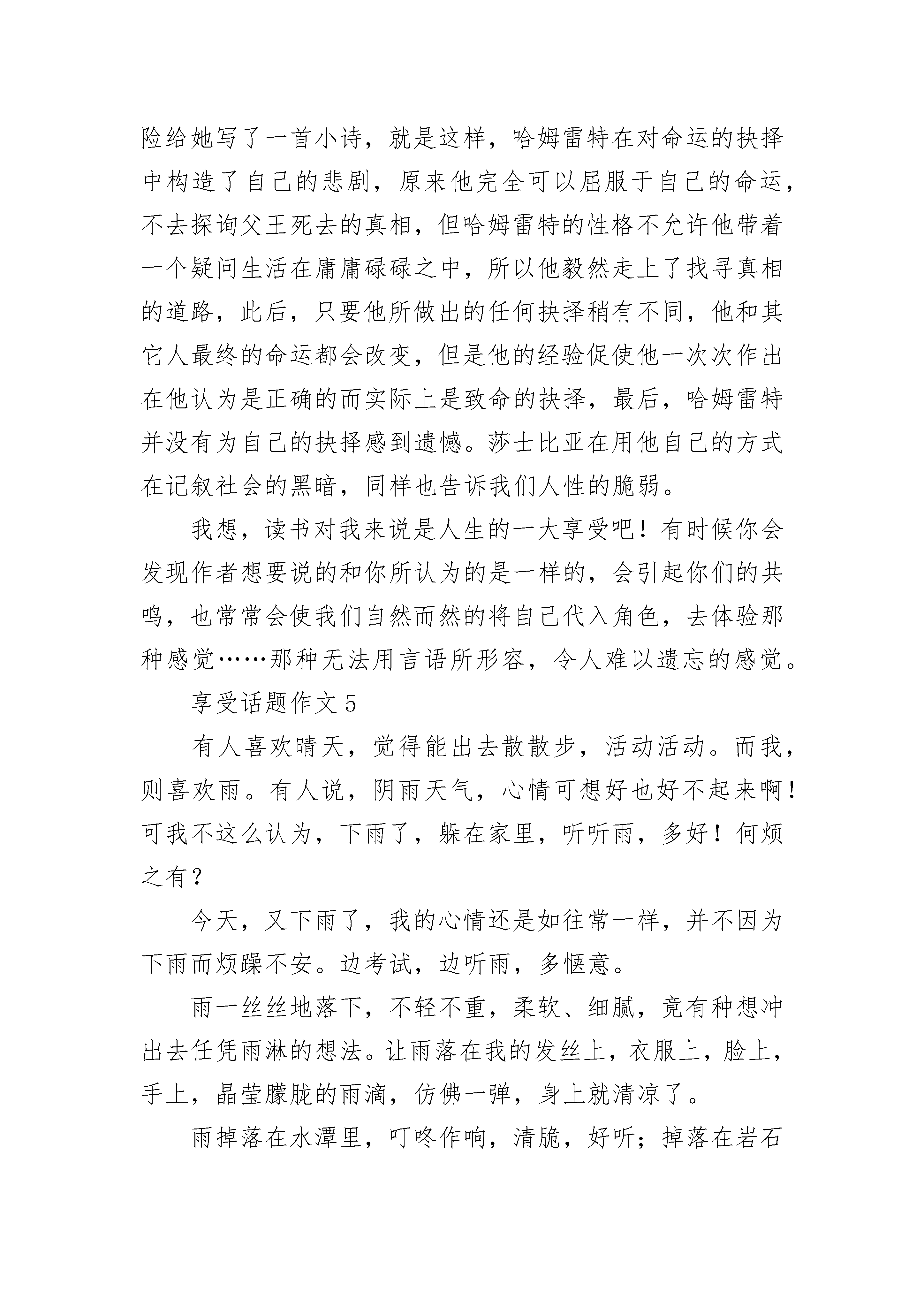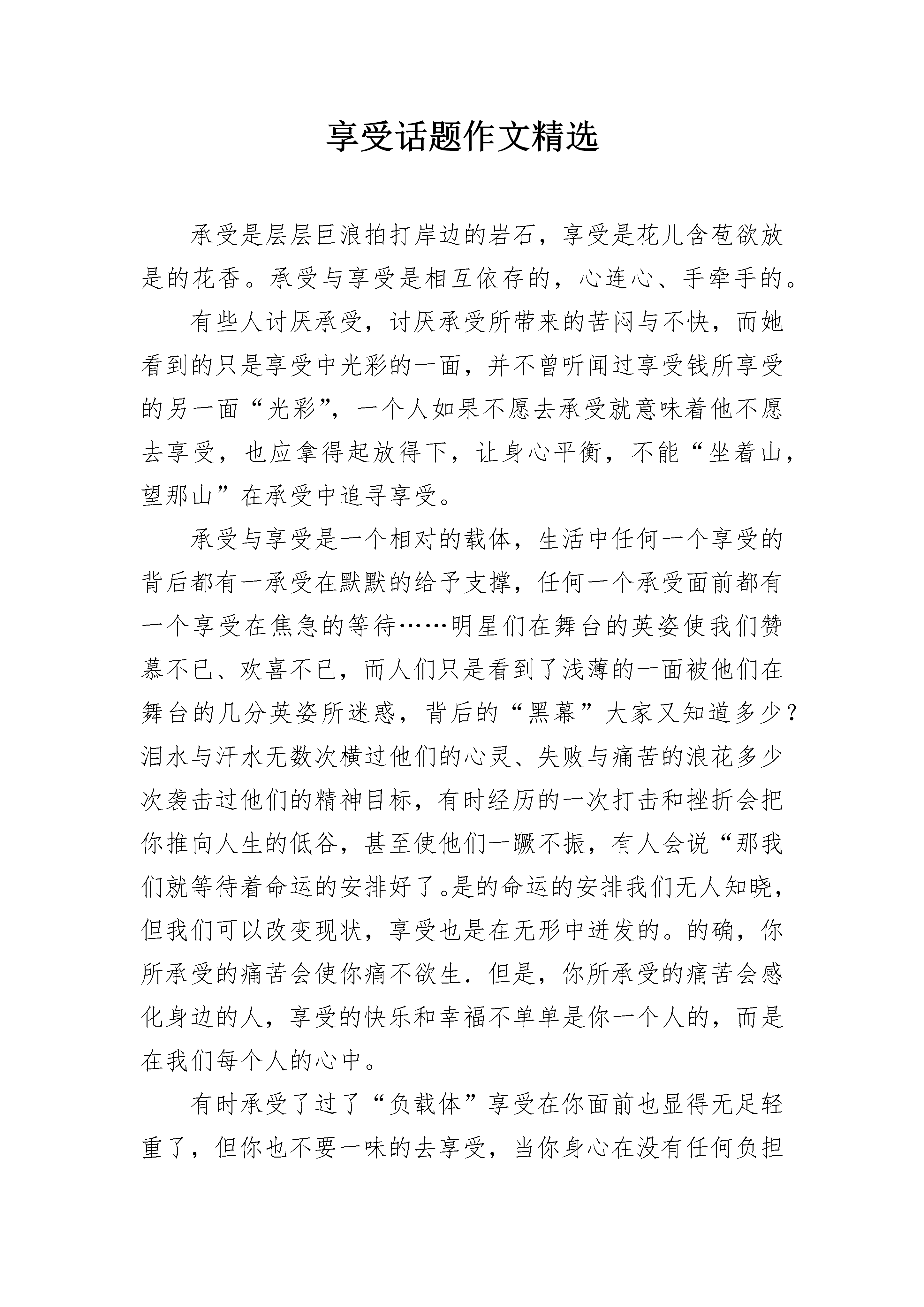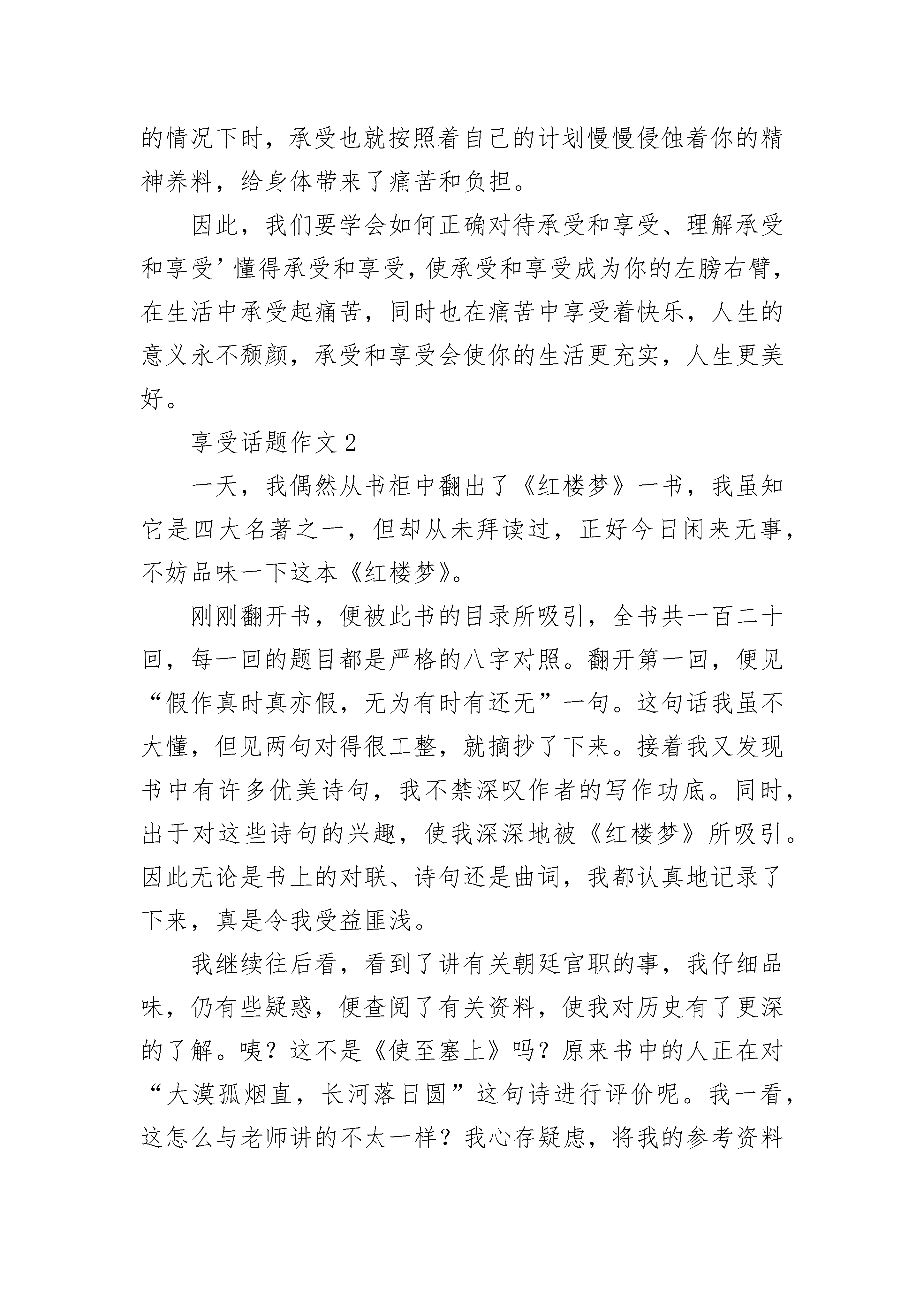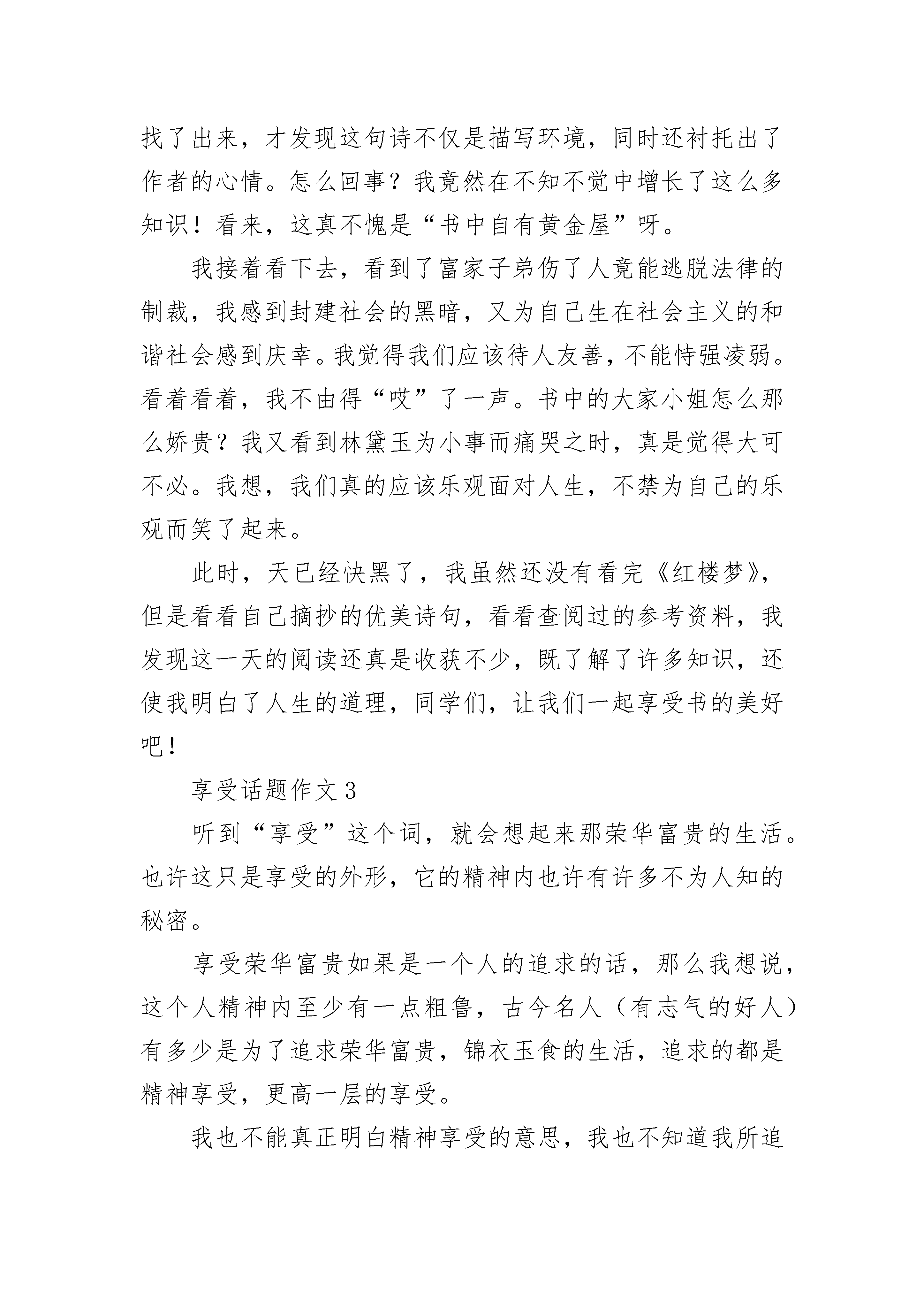 享受话题作文精选承受是层层巨浪拍打岸边的岩石,享受是花儿含苞欲放是的花香。承受与享受是相互依存的,心连心、手牵手的。有些人讨厌承受,讨厌承受所带来的苦闷与不快,而她看到的只是享受中光彩的一面,并不曾听闻过享受钱所享受的另一面“光彩”,一个人如果不愿去承受就意味着他不愿去享受,也应拿得起放得下,让身心平衡,不能“坐着山,望那山”在承受中追寻享受。承受与享受是一个相对的载体,生活中任何一个享受的背后都有一承受在默默的给予支撑,任何一个承受面前都有一个享受在焦急的等待……明星们在舞台的英姿使我们赞慕不已、欢喜不已,而人们只是看到了浅薄的一面被他们在舞台的几分英姿所迷惑,背后的“黑幕”大家又知道多少?泪水与汗水无数次横过他们的心灵、失败与痛苦的浪花多少次袭击过他们的精神目标,有时经历的一次打击和挫折会把你推向人生的低谷,甚至使他们一蹶不振,有人会说“那我们就等待着命运的安排好了。是的命运的安排我们无人知晓,但我们可以改变现状,享受也是在无形中迸发的。的确,你所承受的痛苦会使你痛不欲生.但是,你所承受的痛苦会感化身边的人,享受的快乐和幸福不单单是你一个人的,而是在我们每个人的心中。有时承受了过了“负载体”享受在你面前也显得无足轻重了,但你也不要一味的去享受,当你身心在没有任何负担的情况下时,承受也就按照着自己的计划慢慢侵蚀着你的精神养料,给身体带来了痛苦和负担。因此,我们要学会如何正确对待承受和享受、理解承受和享受’懂得承受和享受,使承受和享受成为你的左膀右臂,在生活中承受起痛苦,同时也在痛苦中享受着快乐,人生的意义永不颓颜,承受和享受会使你的生活更充实,人生更美好。享受话题作文2一天,我偶然从书柜中翻出了《红楼梦》一书,我虽知它是四大名著之一,但却从未拜读过,正好今日闲来无事,不妨品味一下这本《红楼梦》。刚刚翻开书,便被此书的目录所吸引,全书共一百二十回,每一回的题目都是严格的八字对照。翻开第一回,便见“假作真时真亦假,无为有时有还无”一句。这句话我虽不大懂,但见两句对得很工整,就摘抄了下来。接着我又发现书中有许多优美诗句,我不禁深叹作者的写作功底。同时,出于对这些诗句的兴趣,使我深深地被《红楼梦》所吸引。因此无论是书上的对联、诗句还是曲词,我都认真地记录了下来,真是令我受益匪浅。我继续往后看,看到了讲有关朝廷官职的事,我仔细品味,仍有些疑惑,便查阅了有关资料,使我对历史有了更深的了解。咦?这不是《使至塞上》吗?原来书中的人正在对“大漠孤烟直,长河落日圆”这句诗进行评价呢。我一看,这怎么与老师讲的不太一样?我心存疑虑,将我的参考资料找了出来,才发现这句诗不仅是描写环境,同时还衬托出了作者的心情。怎么回事?我竟然在不知不觉中增长了这么多知识!看来,这真不愧是“书中自有黄金屋”呀。我接着看下去,看到了富家子弟伤了人竟能逃脱法律的制裁,我感到封建社会的黑暗,又为自己生在社会主义的和谐社会感到庆幸。我觉得我们应该待人友善,不能恃强凌弱。看着看着,我不由得“哎”了一声。书中的大家小姐怎么那么娇贵?我又看到林黛玉为小事而痛哭之时,真是觉得大可不必。我想,我们真的应该乐观面对人生,不禁为自己的乐观而笑了起来。此时,天已经快黑了,我虽然还没有看完《红楼梦》,但是看看自己摘抄的优美诗句,看看查阅过的参考资料,我发现这一天的阅读还真是收获不少,既了解了许多知识,还使我明白了人生的道理,同学们,让我们一起享受书的美好吧!享受话题作文3听到“享受”这个词,就会想起来那荣华富贵的生活。也许这只是享受的外形,它的精神内也许有许多不为人知的秘密。享受荣华富贵如果是一个人的追求的话,那么我想说,这个人精神内至少有一点粗鲁,古今名人(有志气的好人)有多少是为了追求荣华富贵,锦衣玉食的生活,追求的都是精神享受,更高一层的享受。我也不能真正明白精神享受的意思,我也不知道我所追求的到底是不是精神享受,但我知道那种精神让我心旷神怡,即使是澎湃的海水也能平的像镜子一样,我爱大自然,我愿意享受大自然之美,我愿意让大自然陶冶我的情操。想追求那种平静的生活,不受世俗的束缚,可以让心儿随风飘的感觉。同学把这称为“白日梦”。简单的说,就是白天做梦。从我们的角度来看,这确实是白日梦。吃苦在前,享受在后。我们现在正是奋斗的时候,如果只顾享受乐趣,那只会荒废学业,一事无成。甜总在苦之后,这种感觉我们总会体验到。对于那些现在就想抽烟喝酒的中学生,我十分看不惯。如果这是种享受的话,那这会是最低级的享受。不要忘记我们的责任—奋斗。在奋斗之后,就是享受。享受话题作文4莎士比亚曾说过:“书籍是全世界的营养品。生活里没有书籍,就好像没有阳光;智慧里没有书籍,就好像鸟儿没有翅膀。”的确,漫漫人生无聊时有谁可以陪伴,可以依靠?父母?他们无法陪我们永久,终有一天会离我们而去。朋友?他们同样也有他们自己的生活